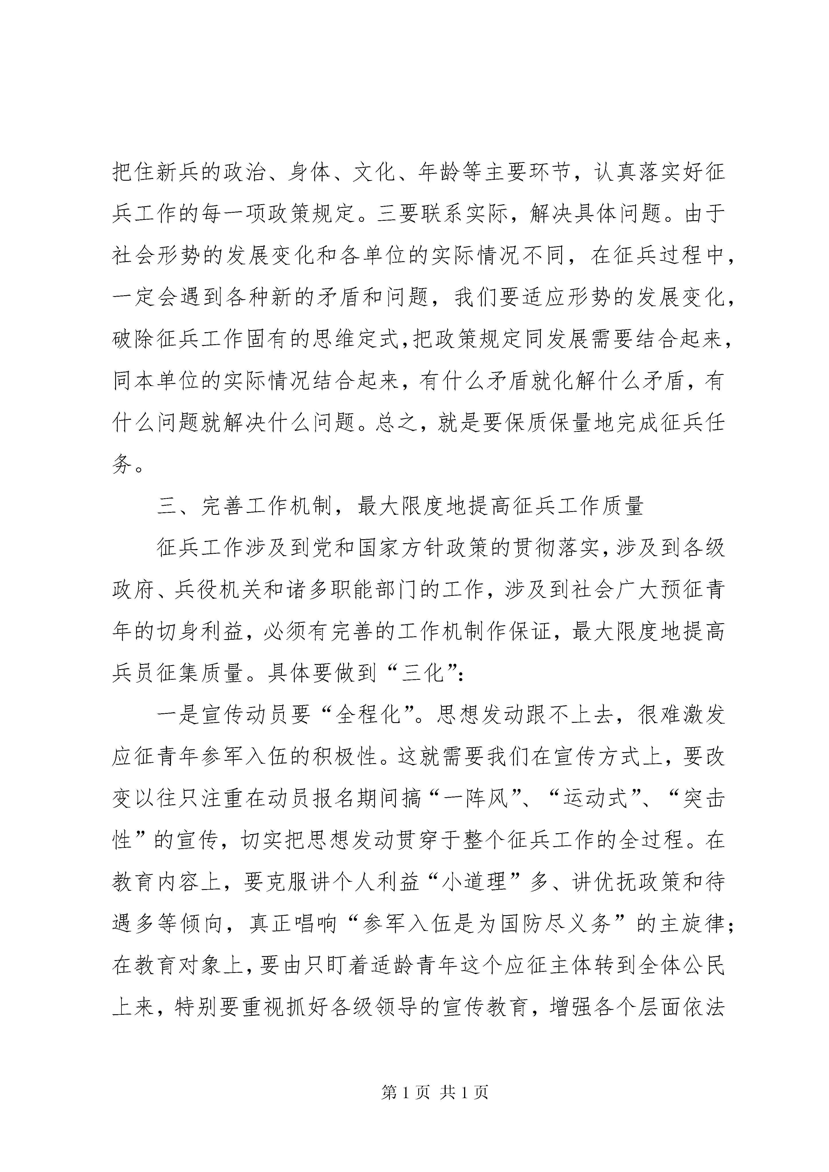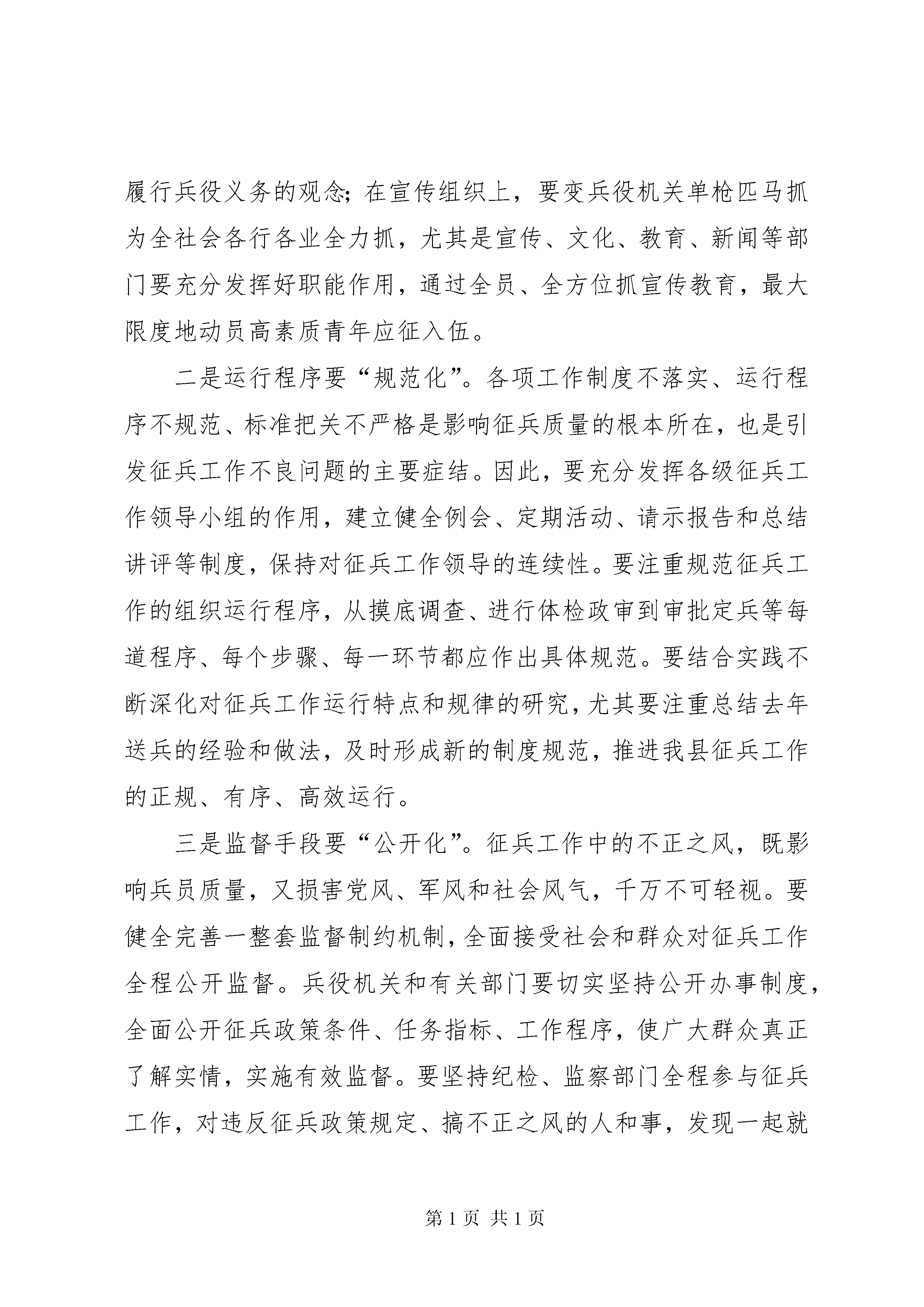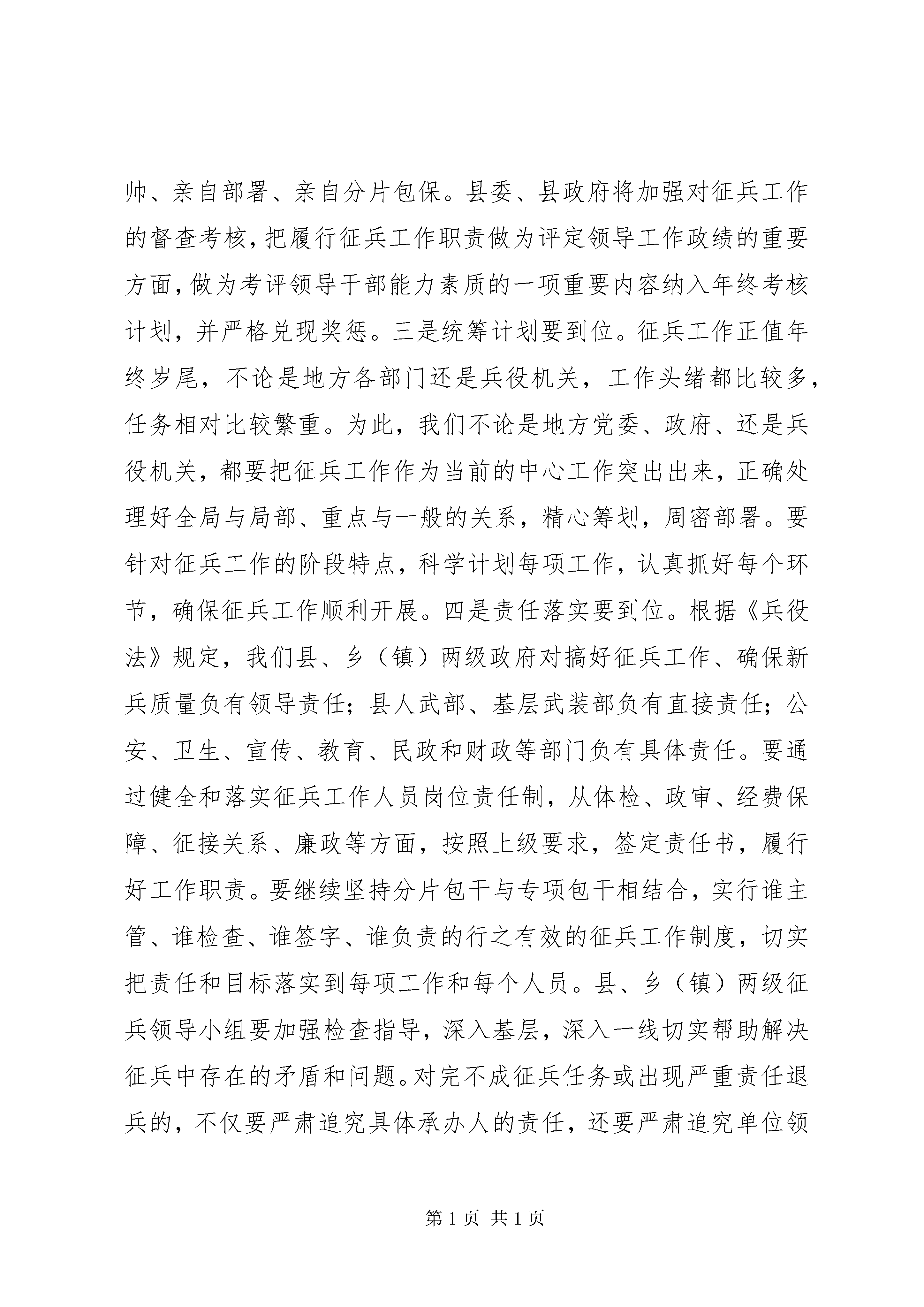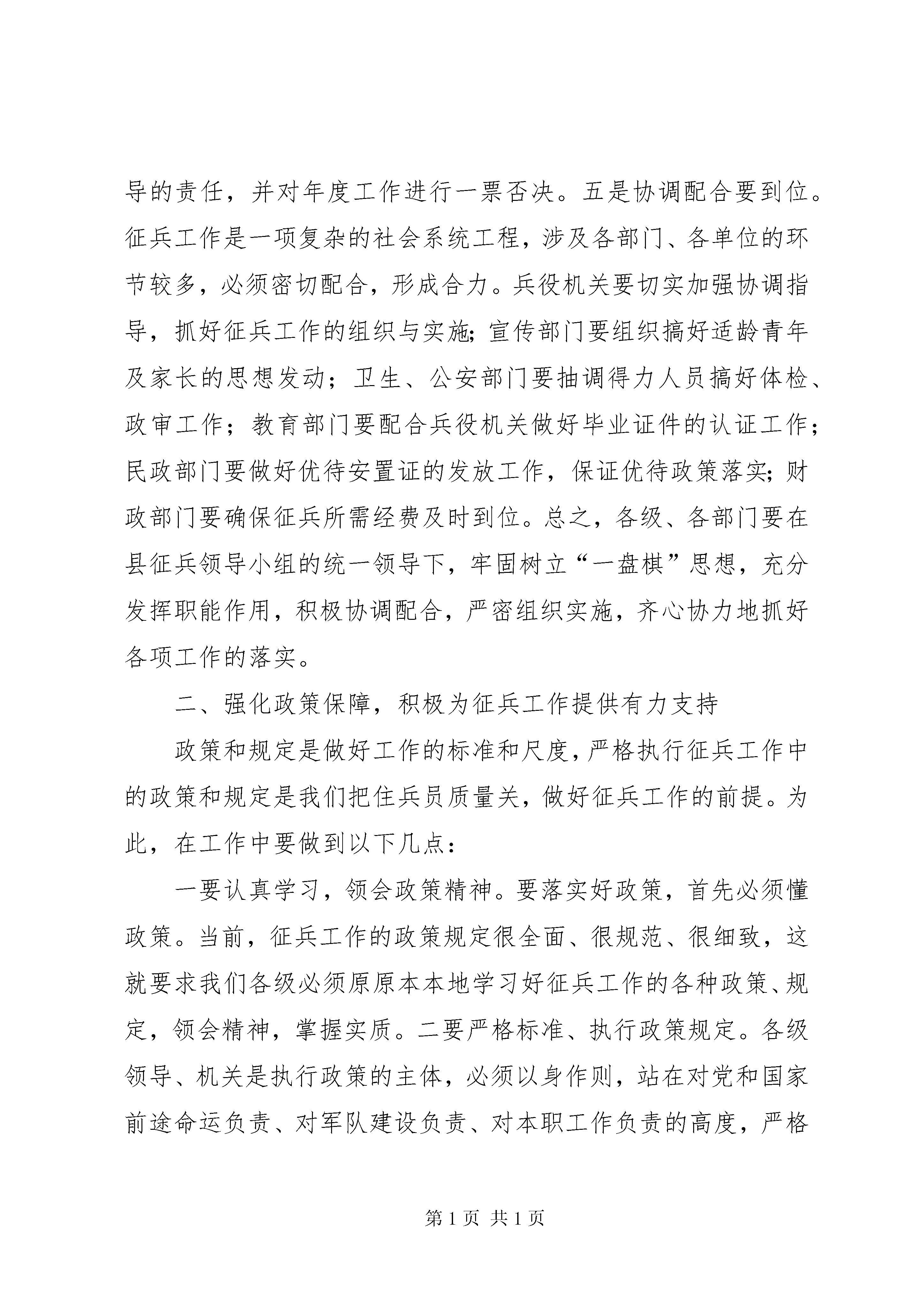 县征兵小组工作会议上的讲话同志们:一、要认清形势任务,切实增强做好征兵工作的责任感军队的基础在士兵,士兵的基础在新兵,做好征兵工作,向部队输送高素质兵员,事关国家和军队现代化建设的长治久安。各乡镇、各部门一定充分认识新形势下做好征兵工作的重大意义,切实增强做好征兵工作的责任感和使命感。具体做到“五个到位”:一是思想认识要到位。思想重视的程度决定着工作落实的力度。全县各级领导干部一定要从保障全面建设和谐社会目标的高度,从保证军队履行新的历史使命的高度,从做好反“台独”军事斗争准备的高度,全面深刻认识新形势下征兵工作的重大意义,明确做好征兵工作是各级政府和兵役机关义不容辞的政治责任,是不允许摆困难、讲条件、随意降低标准的政治任务,是必须严肃对待并高标准抓好落实的政治要求,切实把思想和行动统一到上级的安排部署上来,统一会议的要求上来。二是履行职责要到位。做好征兵工作,是《国防法》和《兵役法》赋予地方政府与兵役机关的重要职责和任务,必须按级负责,齐抓共管。要进一步增强责任意识,军地各级领导和有关部门要主动靠前指挥,积极想对策、做工作、抓落实。要继续落实主要领导亲自抓,分管领导全力抓,机关部门合力抓的工作责任制,把征兵工作切实纳入重要工作日程,摆上突出位置。特别是乡镇党委书记要亲自挂帅、亲自部署、亲自分片包保。县委、县政府将加强对征兵工作的督查考核,把履行征兵工作职责做为评定领导工作政绩的重要方面,做为考评领导干部能力素质的一项重要内容纳入年终考核计划,并严格兑现奖惩。三是统筹计划要到位。征兵工作正值年终岁尾,不论是地方各部门还是兵役机关,工作头绪都比较多,任务相对比较繁重。为此,我们不论是地方党委、政府、还是兵役机关,都要把征兵工作作为当前的中心工作突出出来,正确处理好全局与局部、重点与一般的关系,精心筹划,周密部署。要针对征兵工作的阶段特点,科学计划每项工作,认真抓好每个环节,确保征兵工作顺利开展。四是责任落实要到位。根据《兵役法》规定,我们县、乡(镇)两级政府对搞好征兵工作、确保新兵质量负有领导责任;县人武部、基层武装部负有直接责任;公安、卫生、宣传、教育、民政和财政等部门负有具体责任。要通过健全和落实征兵工作人员岗位责任制,从体检、政审、经费保障、征接关系、廉政等方面,按照上级要求,签定责任书,履行好工作职责。要继续坚持分片包干与专项包干相结合,实行谁主管、谁检查、谁签字、谁负责的行之有效的征兵工作制度,切实把责任和目标落实到每项工作和每个人员。县、乡(镇)两级征兵领导小组要加强检查指导,深入基层,深入一线切实帮助解决征兵中存在的矛盾和问题。对完不成征兵任务或出现严重责任退兵的,不仅要严肃追究具体承办人的责任,还要严肃追究单位领导的责任,并对年度工作进行一票否决。五是协调配合要到位。征兵工作是一项复杂的社会系统工程,涉及各部门、各单位的环节较多,必须密切配合,形成合力。兵役机关要切实加强协调指导,抓好征兵工作的组织与实施;宣传部门要组织搞好适龄青年及家长的思想发动;卫生、公安部门要抽调得力人员搞好体检、政审工作;教育部门要配合兵役机关做好毕业证件的认证工作;民政部门要做好优待安置证的发放工作,保证优待政策落实;财政部门要确保征兵所需经费及时到位。总之,各级、各部门要在县征兵领导小组的统一领导下,牢固树立“一盘棋”思想,充分发挥职能作用,积极协调配合,严密组织实施,齐心协力地抓好各项工作的落实。二、强化政策保障,积极为征兵工作提供有力支持政策和规定是做好工作的标准和尺度,严格执行征兵工作中的政策和规定是我们把住兵员质量关,做好征兵工作的前提。为此,在工作中要做到以下几点:一要认真学习,领会政策精神。要落实好政策,首先必须懂政策。当前,征兵工作的政策规定很全面、很规范、很细致,这就要求我们各级必须原原本本地学习好征兵工作的各种政策、规定,领会精神,掌握实质。二要严格标准、执行政策规定。各级领导、机关是执行政策的主体,必须以身作则,站在对党和国家前途命运负责、对军队建设负责、对本职工作负责的高度,严格把住新兵的政治、身体、文化、年龄等主要环节,认真落实好征兵工作的每一项政策规定。三要联系实际,解决具体问题。由于社会形势的发展变化和各单位的实际情况不同,在征兵过程中,一定会遇到各种新的矛盾和问题,我们要适应形势的发展变化,破除征兵工作固有的思维定式,把政策规定同发展需要结合起来,同本单位的实际情况结合起来,有什么矛盾就化解什么矛盾,有什么问题就解决什么问题。总之,就是要保质保量地完成征兵任务。三、完善工作机制,最大限度地提高征兵工作质量征兵工作涉及到党和国家方针政策的贯彻落实,涉及到各级政府、兵役机关和诸多职能部门的工作,涉及到社会广大预征青年的切身利益,必须有完善的工作机制作保证,最大限度地提高兵员征集质量。