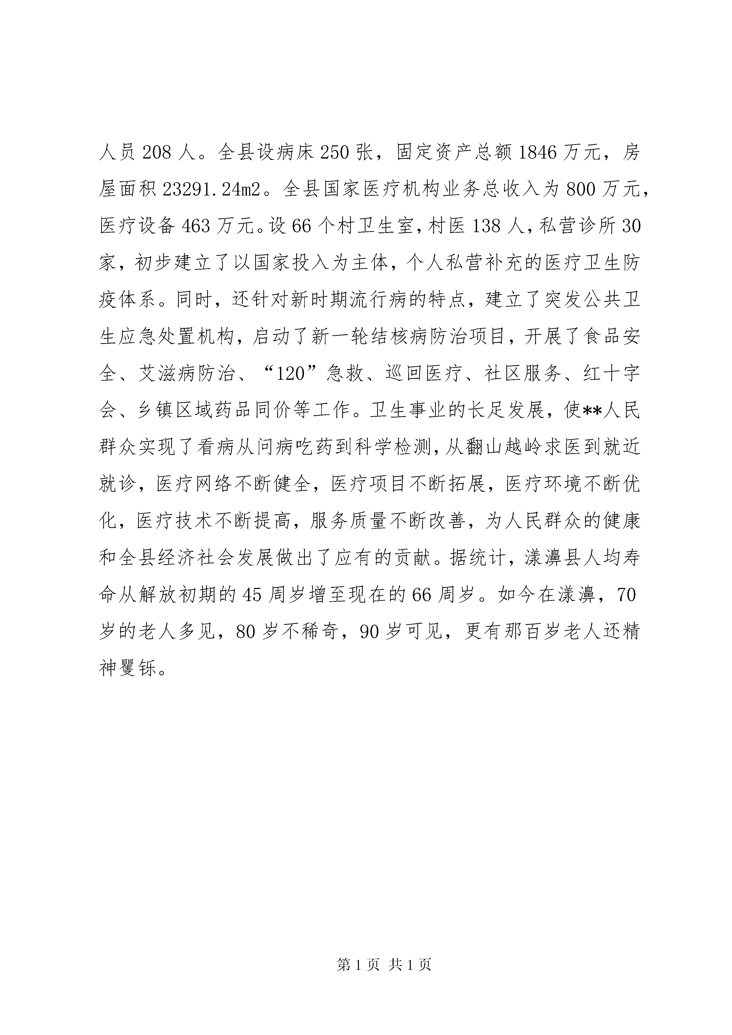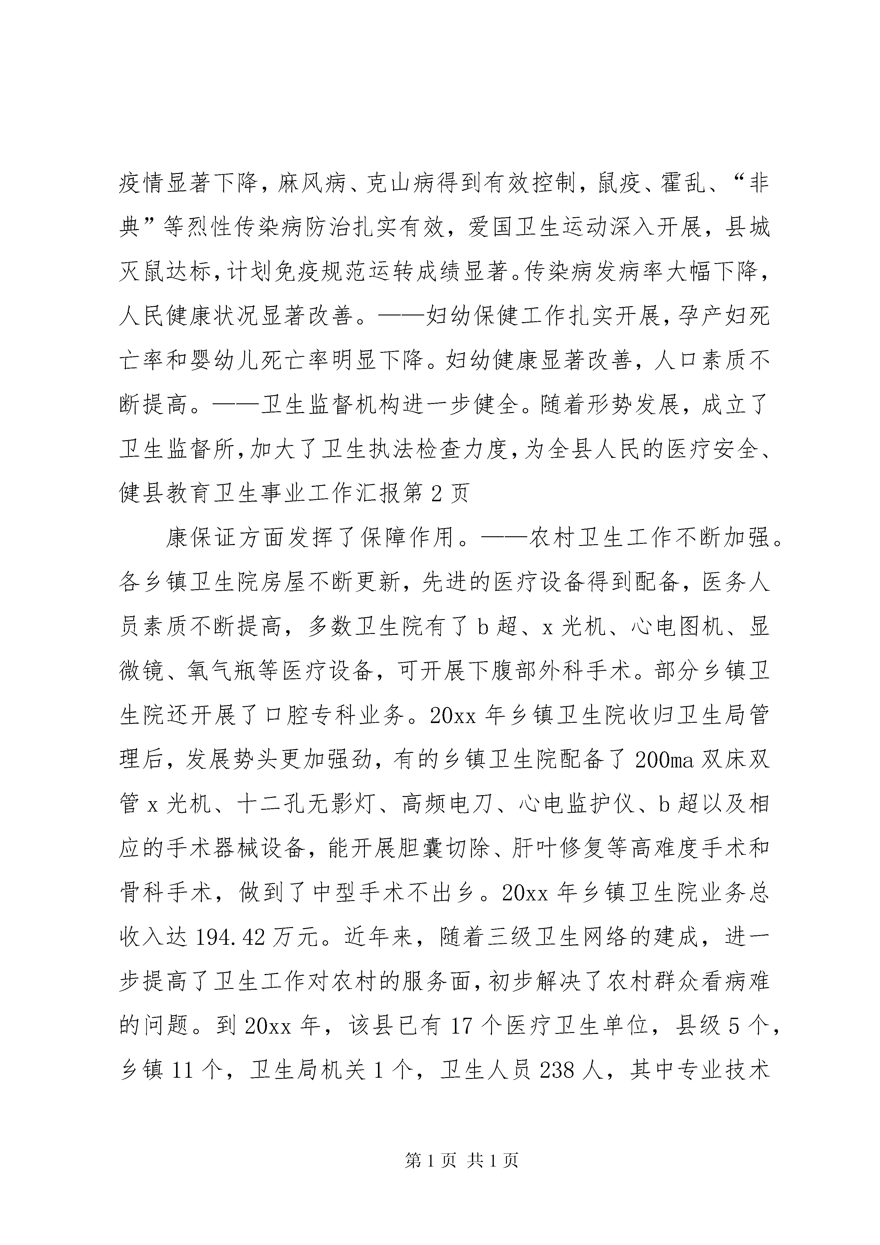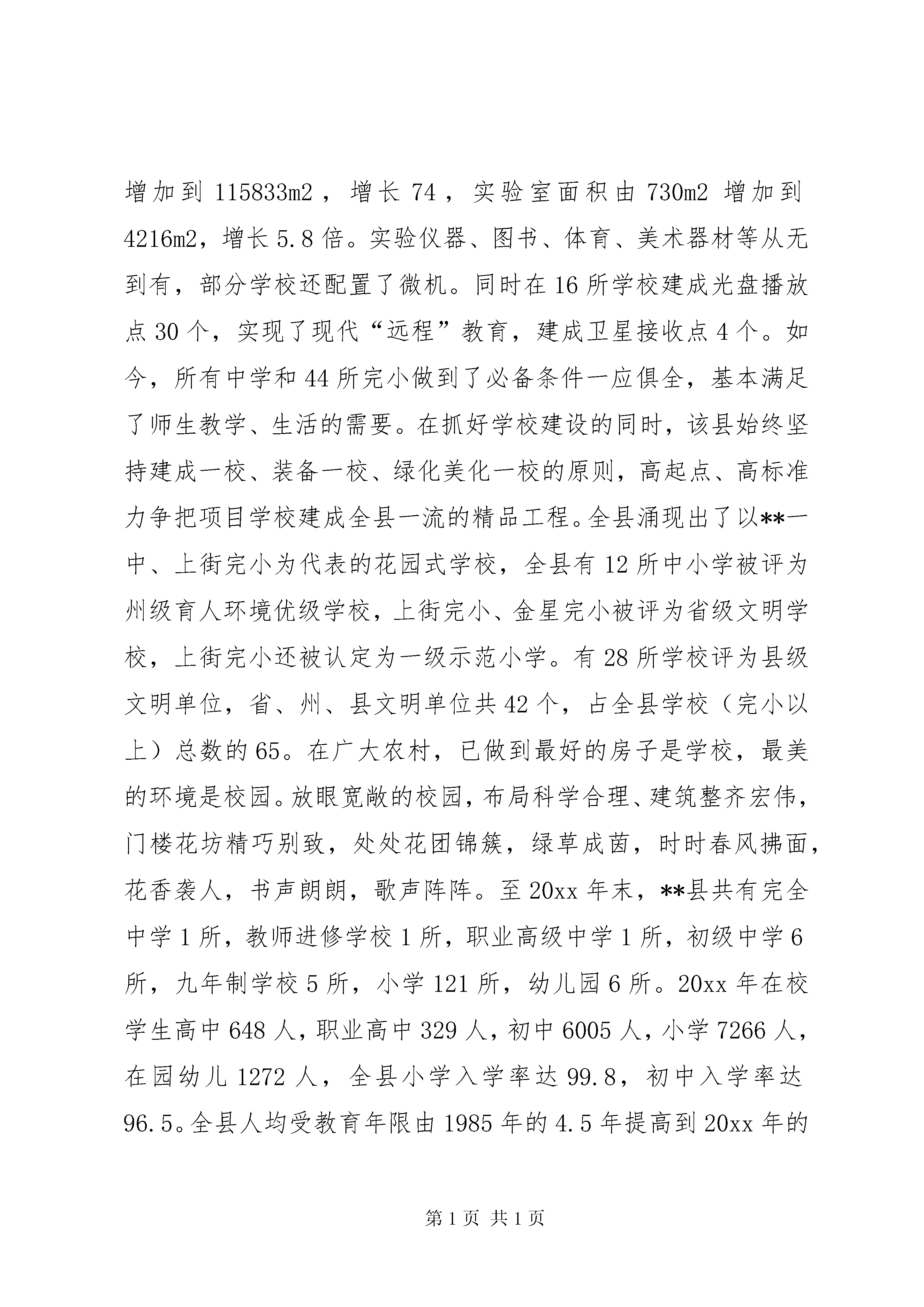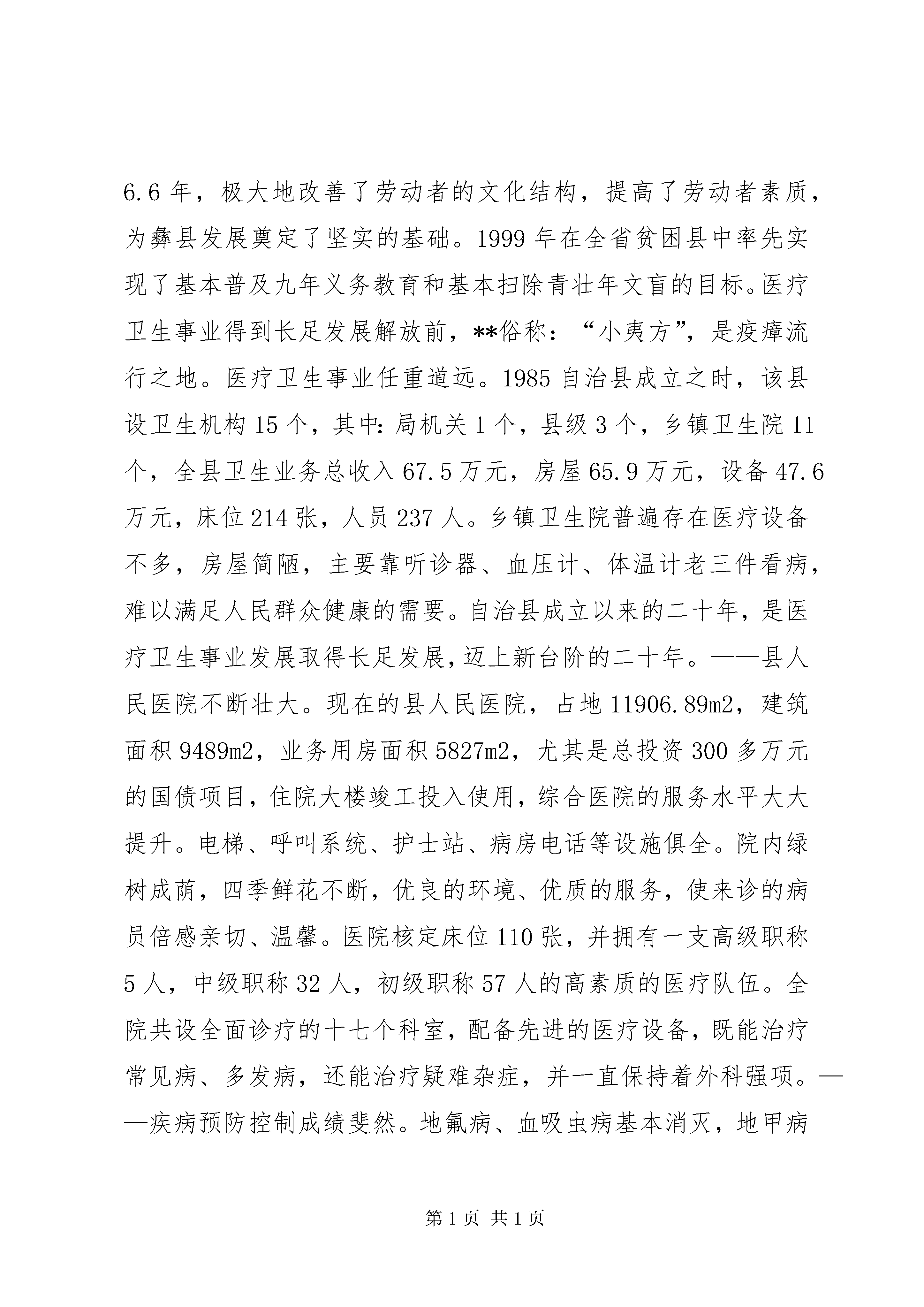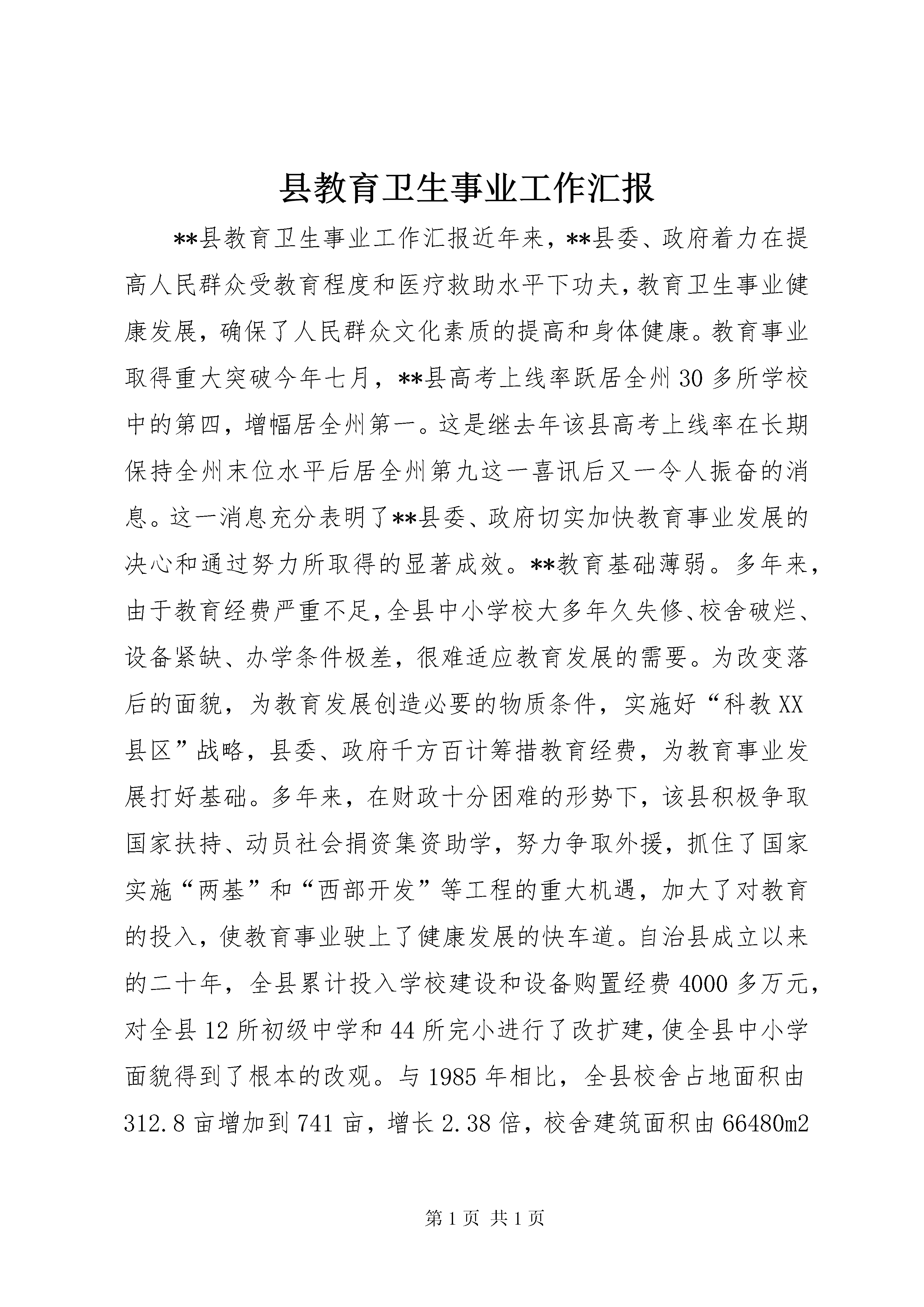 县教育卫生事业工作汇报**县教育卫生事业工作汇报近年来,**县委、政府着力在提高人民群众受教育程度和医疗救助水平下功夫,教育卫生事业健康发展,确保了人民群众文化素质的提高和身体健康。教育事业取得重大突破今年七月,**县高考上线率跃居全州30多所学校中的第四,增幅居全州第一。这是继去年该县高考上线率在长期保持全州末位水平后居全州第九这一喜讯后又一令人振奋的消息。这一消息充分表明了**县委、政府切实加快教育事业发展的决心和通过努力所取得的显著成效。**教育基础薄弱。多年来,由于教育经费严重不足,全县中小学校大多年久失修、校舍破烂、设备紧缺、办学条件极差,很难适应教育发展的需要。为改变落后的面貌,为教育发展创造必要的物质条件,实施好“科教XX县区”战略,县委、政府千方百计筹措教育经费,为教育事业发展打好基础。多年来,在财政十分困难的形势下,该县积极争取国家扶持、动员社会捐资集资助学,努力争取外援,抓住了国家实施“两基”和“西部开发”等工程的重大机遇,加大了对教育的投入,使教育事业驶上了健康发展的快车道。自治县成立以来的二十年,全县累计投入学校建设和设备购置经费4000多万元,对全县12所初级中学和44所完小进行了改扩建,使全县中小学面貌得到了根本的改观。与1985年相比,全县校舍占地面积由312.8亩增加到741亩,增长2.38倍,校舍建筑面积由66480m2增加到115833m2,增长74,实验室面积由730m2增加到4216m2,增长5.8倍。实验仪器、图书、体育、美术器材等从无到有,部分学校还配置了微机。同时在16所学校建成光盘播放点30个,实现了现代“远程”教育,建成卫星接收点4个。如今,所有中学和44所完小做到了必备条件一应俱全,基本满足了师生教学、生活的需要。在抓好学校建设的同时,该县始终坚持建成一校、装备一校、绿化美化一校的原则,高起点、高标准力争把项目学校建成全县一流的精品工程。全县涌现出了以**一中、上街完小为代表的花园式学校,全县有12所中小学被评为州级育人环境优级学校,上街完小、金星完小被评为省级文明学校,上街完小还被认定为一级示范小学。有28所学校评为县级文明单位,省、州、县文明单位共42个,占全县学校(完小以上)总数的65。在广大农村,已做到最好的房子是学校,最美的环境是校园。放眼宽敞的校园,布局科学合理、建筑整齐宏伟,门楼花坊精巧别致,处处花团锦簇,绿草成茵,时时春风拂面,花香袭人,书声朗朗,歌声阵阵。至20xx年末,**县共有完全中学1所,教师进修学校1所,职业高级中学1所,初级中学6所,九年制学校5所,小学121所,幼儿园6所。20xx年在校学生高中648人,职业高中329人,初中6005人,小学7266人,在园幼儿1272人,全县小学入学率达99.8,初中入学率达96.5。全县人均受教育年限由1985年的4.5年提高到20xx年的6.6年,极大地改善了劳动者的文化结构,提高了劳动者素质,为彝县发展奠定了坚实的基础。1999年在全省贫困县中率先实现了基本普及九年义务教育和基本扫除青壮年文盲的目标。医疗卫生事业得到长足发展解放前,**俗称:“小夷方”,是疫瘴流行之地。医疗卫生事业任重道远。1985自治县成立之时,该县设卫生机构15个,其中:局机关1个,县级3个,乡镇卫生院11个,全县卫生业务总收入67.5万元,房屋65.9万元,设备47.6万元,床位214张,人员237人。乡镇卫生院普遍存在医疗设备不多,房屋简陋,主要靠听诊器、血压计、体温计老三件看病,难以满足人民群众健康的需要。自治县成立以来的二十年,是医疗卫生事业发展取得长足发展,迈上新台阶的二十年。——县人民医院不断壮大。现在的县人民医院,占地11906.89m2,建筑面积9489m2,业务用房面积5827m2,尤其是总投资300多万元的国债项目,住院大楼竣工投入使用,综合医院的服务水平大大提升。电梯、呼叫系统、护士站、病房电话等设施俱全。院内绿树成荫,四季鲜花不断,优良的环境、优质的服务,使来诊的病员倍感亲切、温馨。医院核定床位110张,并拥有一支高级职称5人,中级职称32人,初级职称57人的高素质的医疗队伍。全院共设全面诊疗的十七个科室,配备先进的医疗设备,既能治疗常见病、多发病,还能治疗疑难杂症,并一直保持着外科强项。——疾病预防控制成绩斐然。地氟病、血吸虫病基本消灭,地甲病疫情显著下降,麻风病、克山病得到有效控制,鼠疫、霍乱、“非典”等烈性传染病防治扎实有效,爱国卫生运动深入开展,县城灭鼠达标,计划免疫规范运转成绩显著。传染病发病率大幅下降,人民健康状况显著改善。——妇幼保健工作扎实开展,孕产妇死亡率和婴幼儿死亡率明显下降。妇幼健康显著改善,人口素质不断提高。——卫生监督机构进一步健全。随着形势发展,成立了卫生监