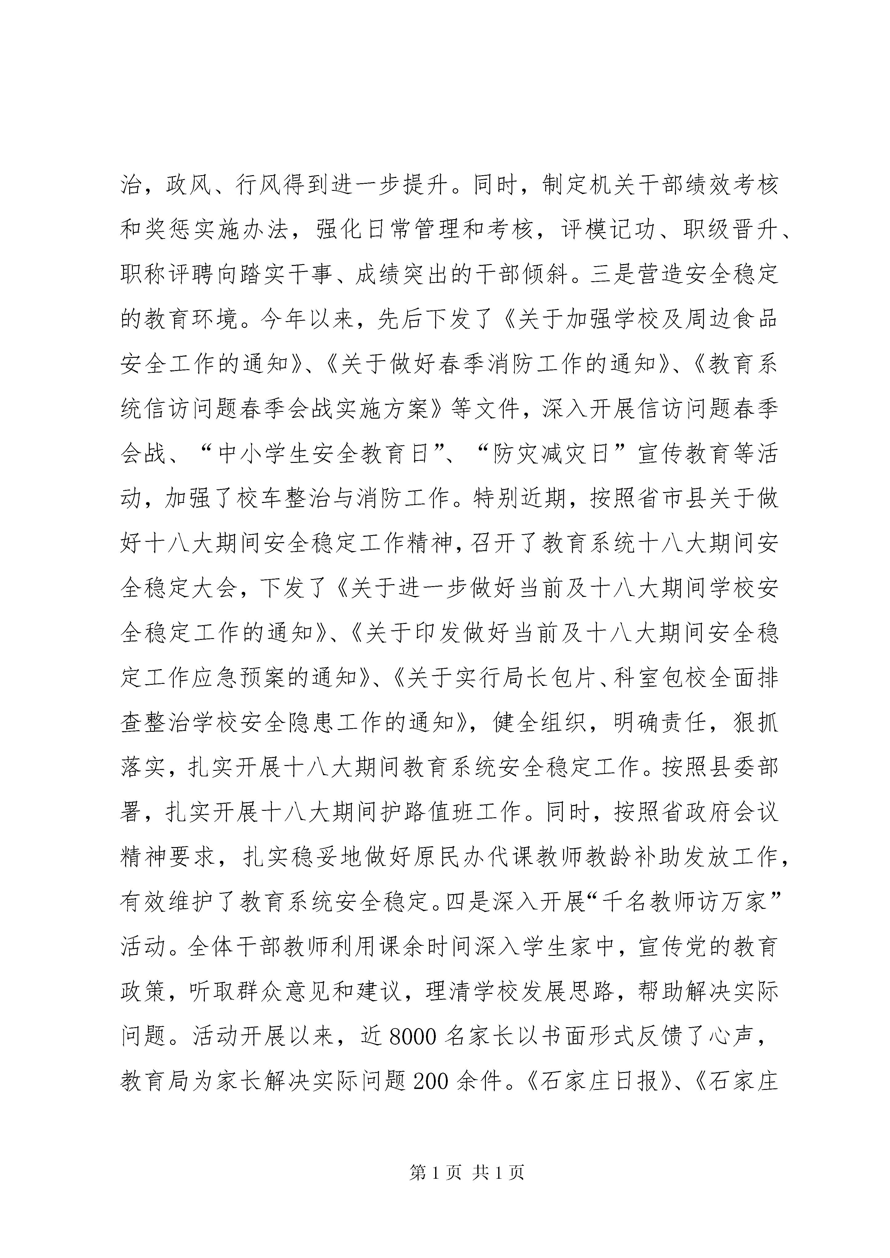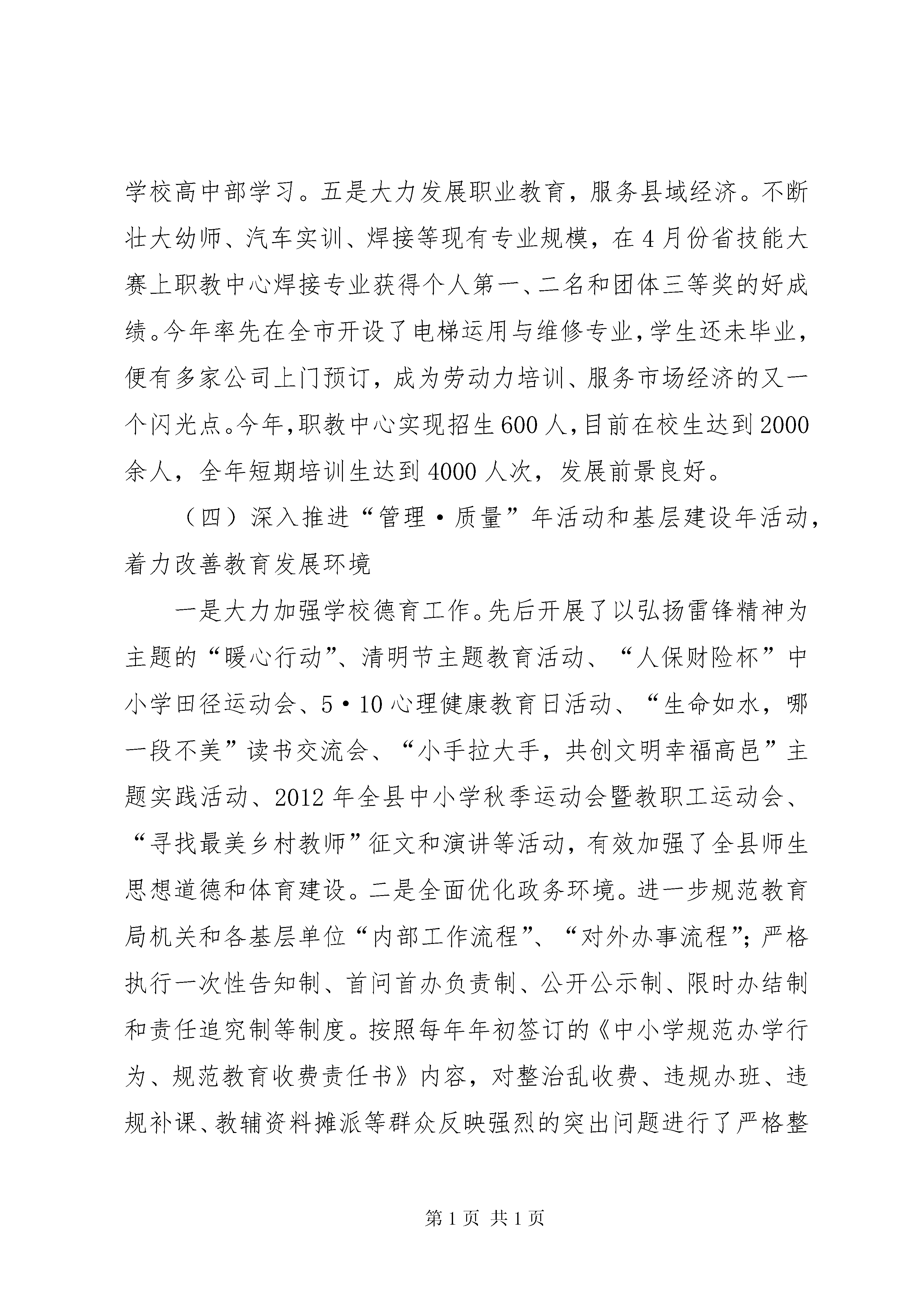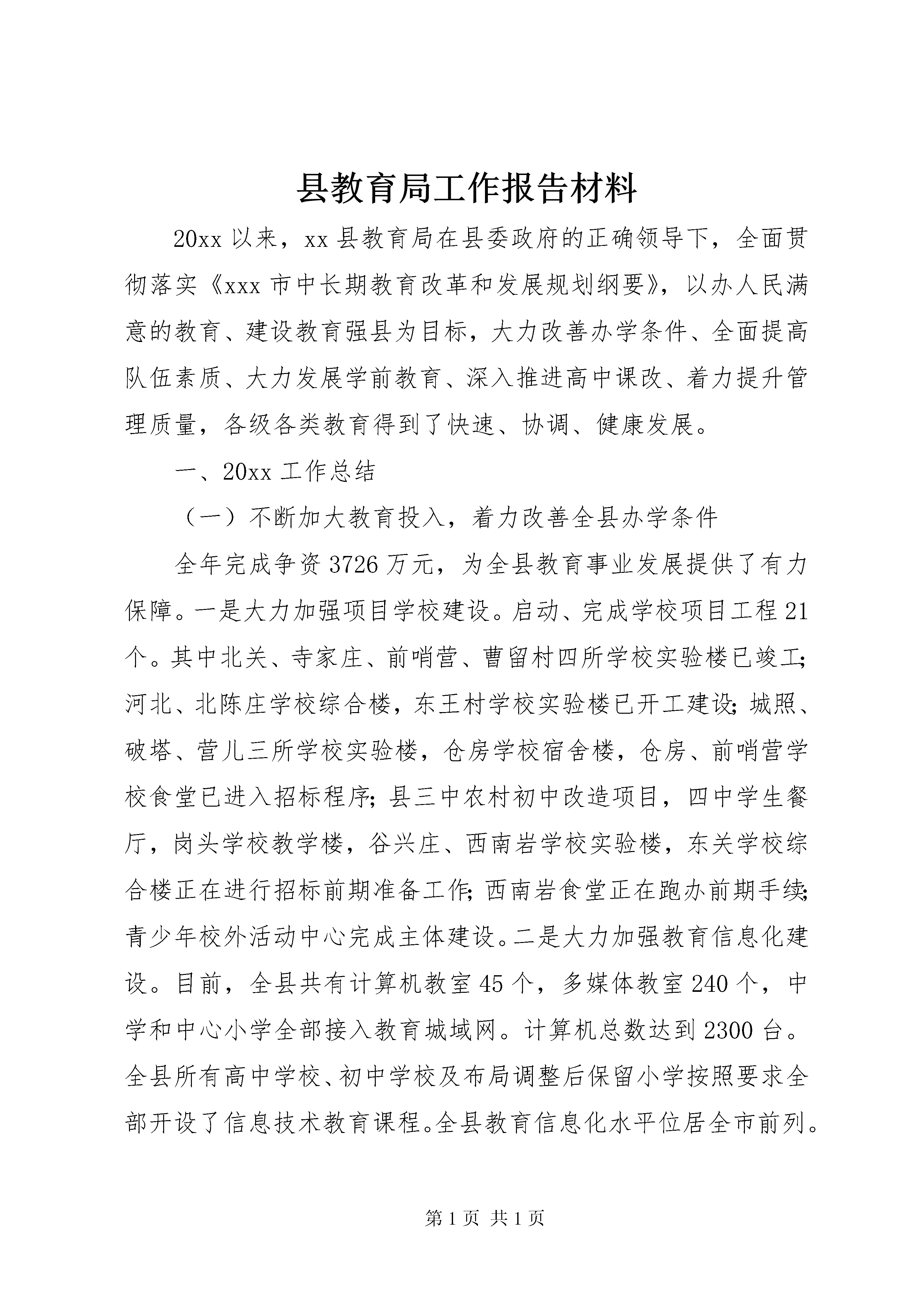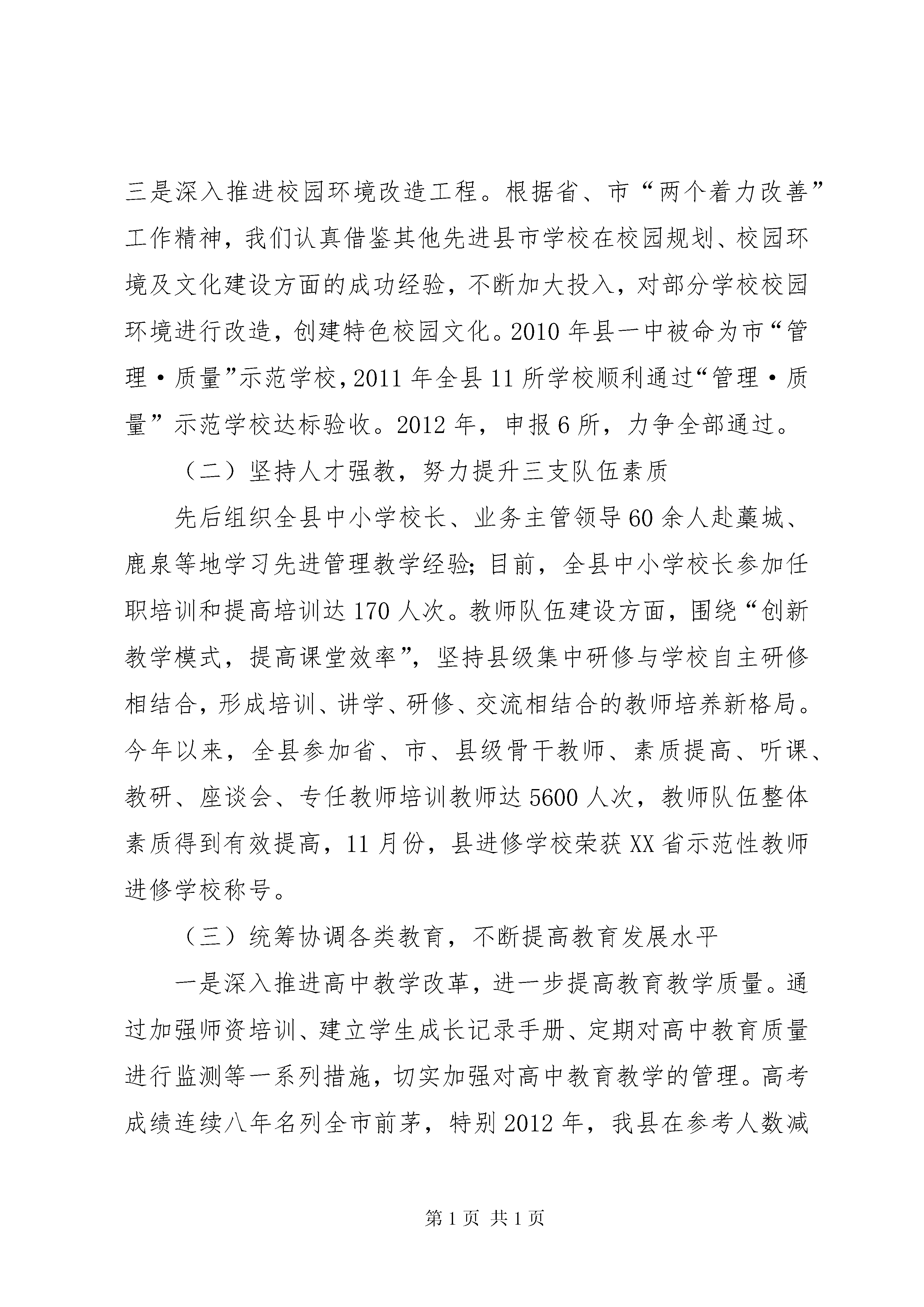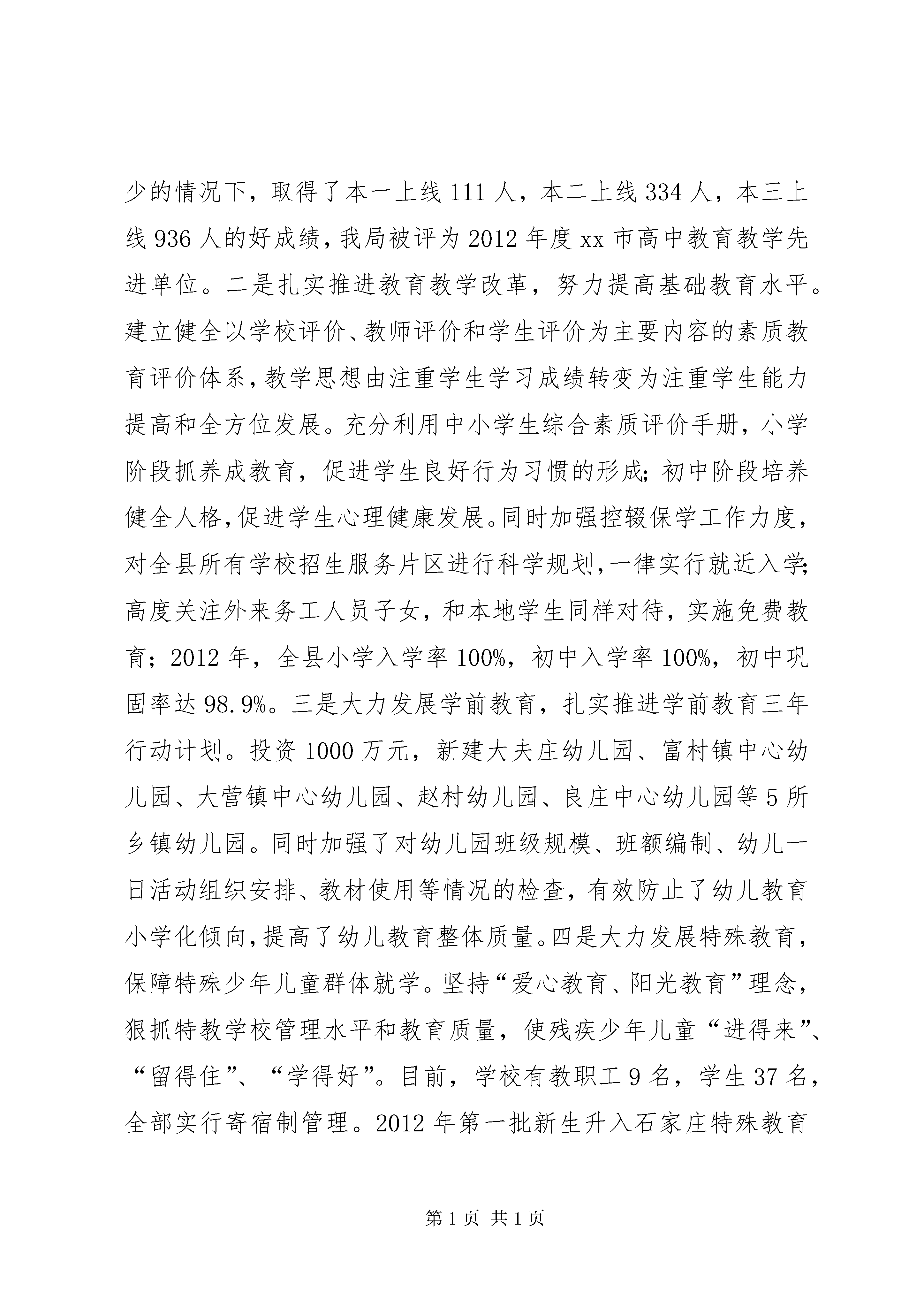 县教育局工作报告材料20xx以来,xx县教育局在县委政府的正确领导下,全面贯彻落实《xxx市中长期教育改革和发展规划纲要》,以办人民满意的教育、建设教育强县为目标,大力改善办学条件、全面提高队伍素质、大力发展学前教育、深入推进高中课改、着力提升管理质量,各级各类教育得到了快速、协调、健康发展。一、20xx工作总结(一)不断加大教育投入,着力改善全县办学条件全年完成争资3726万元,为全县教育事业发展提供了有力保障。一是大力加强项目学校建设。启动、完成学校项目工程21个。其中北关、寺家庄、前哨营、曹留村四所学校实验楼已竣工;河北、北陈庄学校综合楼,东王村学校实验楼已开工建设;城照、破塔、营儿三所学校实验楼,仓房学校宿舍楼,仓房、前哨营学校食堂已进入招标程序;县三中农村初中改造项目,四中学生餐厅,岗头学校教学楼,谷兴庄、西南岩学校实验楼,东关学校综合楼正在进行招标前期准备工作;西南岩食堂正在跑办前期手续;青少年校外活动中心完成主体建设。二是大力加强教育信息化建设。目前,全县共有计算机教室45个,多媒体教室240个,中学和中心小学全部接入教育城域网。计算机总数达到2300台。全县所有高中学校、初中学校及布局调整后保留小学按照要求全部开设了信息技术教育课程。全县教育信息化水平位居全市前列。三是深入推进校园环境改造工程。根据省、市“两个着力改善”工作精神,我们认真借鉴其他先进县市学校在校园规划、校园环境及文化建设方面的成功经验,不断加大投入,对部分学校校园环境进行改造,创建特色校园文化。2010年县一中被命为市“管理·质量”示范学校,2011年全县11所学校顺利通过“管理·质量”示范学校达标验收。2012年,申报6所,力争全部通过。(二)坚持人才强教,努力提升三支队伍素质先后组织全县中小学校长、业务主管领导60余人赴藁城、鹿泉等地学习先进管理教学经验;目前,全县中小学校长参加任职培训和提高培训达170人次。教师队伍建设方面,围绕“创新教学模式,提高课堂效率”,坚持县级集中研修与学校自主研修相结合,形成培训、讲学、研修、交流相结合的教师培养新格局。今年以来,全县参加省、市、县级骨干教师、素质提高、听课、教研、座谈会、专任教师培训教师达5600人次,教师队伍整体素质得到有效提高,11月份,县进修学校荣获XX省示范性教师进修学校称号。(三)统筹协调各类教育,不断提高教育发展水平一是深入推进高中教学改革,进一步提高教育教学质量。通过加强师资培训、建立学生成长记录手册、定期对高中教育质量进行监测等一系列措施,切实加强对高中教育教学的管理。高考成绩连续八年名列全市前茅,特别2012年,我县在参考人数减少的情况下,取得了本一上线111人,本二上线334人,本三上线936人的好成绩,我局被评为2012年度xx市高中教育教学先进单位。二是扎实推进教育教学改革,努力提高基础教育水平。建立健全以学校评价、教师评价和学生评价为主要内容的素质教育评价体系,教学思想由注重学生学习成绩转变为注重学生能力提高和全方位发展。充分利用中小学生综合素质评价手册,小学阶段抓养成教育,促进学生良好行为习惯的形成;初中阶段培养健全人格,促进学生心理健康发展。同时加强控辍保学工作力度,对全县所有学校招生服务片区进行科学规划,一律实行就近入学;高度关注外来务工人员子女,和本地学生同样对待,实施免费教育;2012年,全县小学入学率100%,初中入学率100%,初中巩固率达98.9%。三是大力发展学前教育,扎实推进学前教育三年行动计划。投资1000万元,新建大夫庄幼儿园、富村镇中心幼儿园、大营镇中心幼儿园、赵村幼儿园、良庄中心幼儿园等5所乡镇幼儿园。同时加强了对幼儿园班级规模、班额编制、幼儿一日活动组织安排、教材使用等情况的检查,有效防止了幼儿教育小学化倾向,提高了幼儿教育整体质量。四是大力发展特殊教育,保障特殊少年儿童群体就学。坚持“爱心教育、阳光教育”理念,狠抓特教学校管理水平和教育质量,使残疾少年儿童“进得来”、“留得住”、“学得好”。目前,学校有教职工9名,学生37名,全部实行寄宿制管理。2012年第一批新生升入石家庄特殊教育学校高中部学习。五是大力发展职业教育,服务县域经济。不断壮大幼师、汽车实训、焊接等现有专业规模,在4月份省技能大赛上职教中心焊接专业获得个人第一、二名和团体三等奖的好成绩。今年率先在全市开设了电梯运用与维修专业,学生还未毕业,便有多家公司上门预订,成为劳动力培训、服务市场经济的又一个闪光点。今年,职教中心实现招生600人,目前在校生达到2000余人,全年短期培训生达到4000人次,发展前景良好。(四)深入推进“管理·质量”年活动和基层建设年活动,着力改善教育发展环境一是大力加强学校德育工作。先后开展了以弘扬雷锋精神为主题的“暖心行动