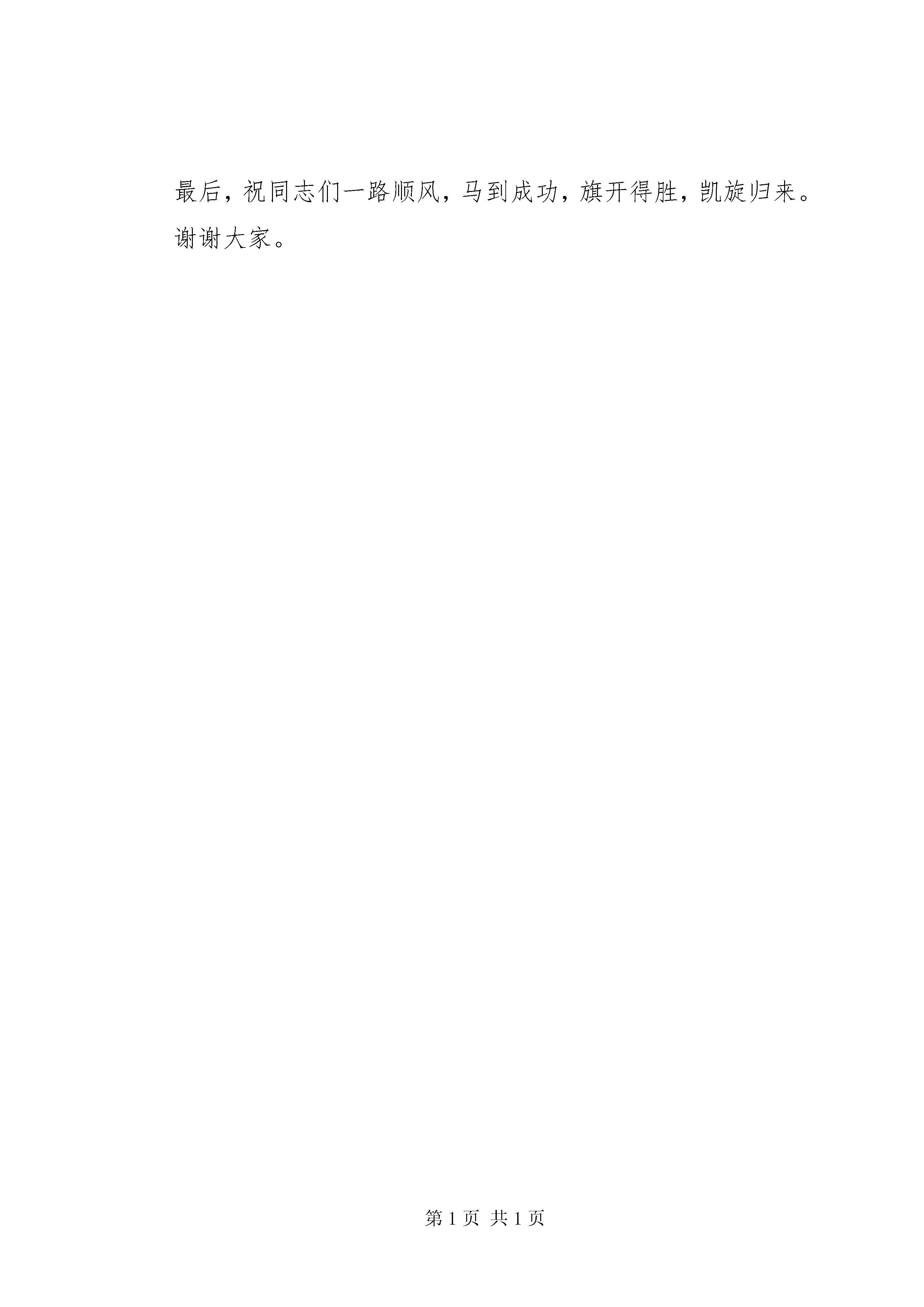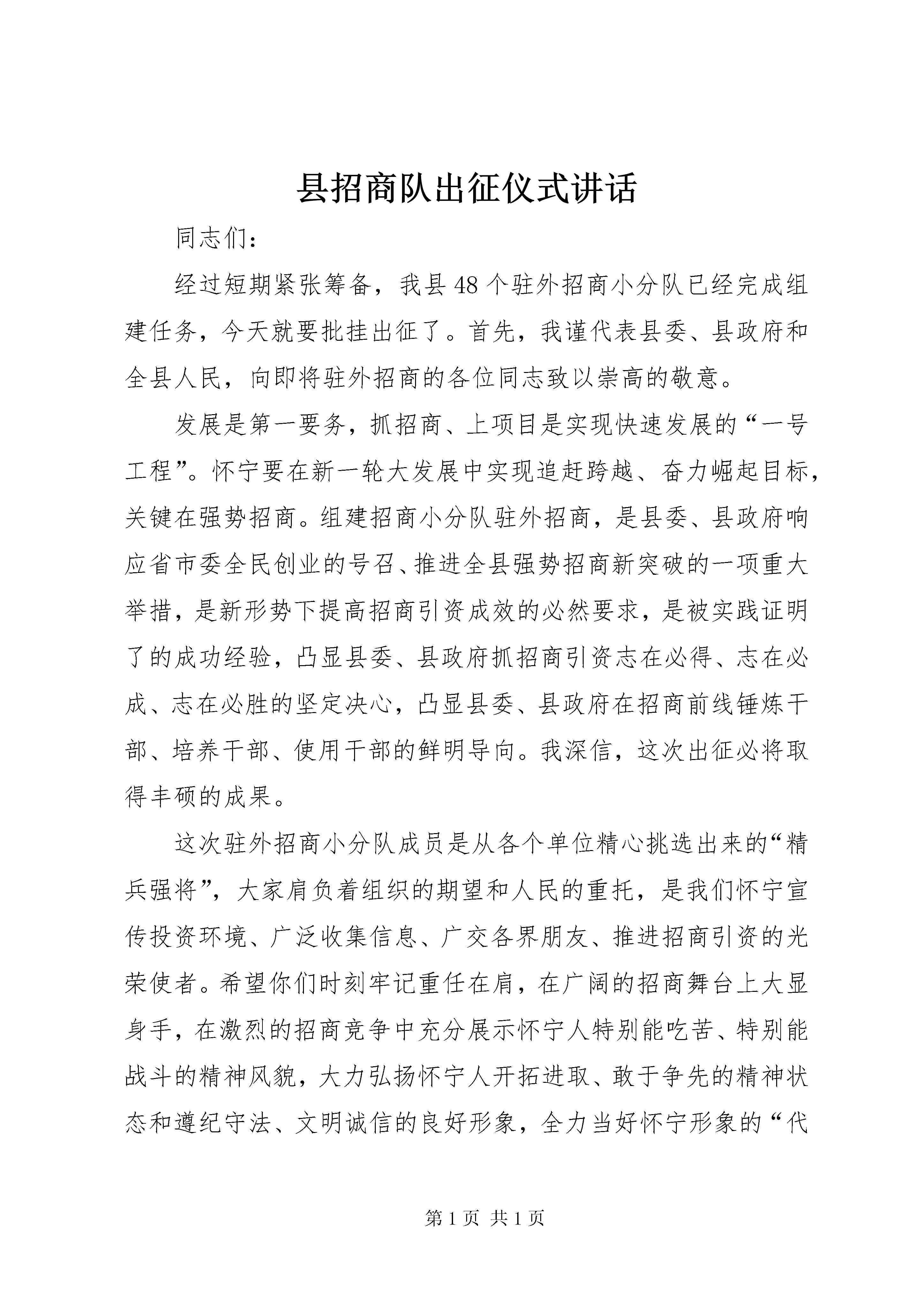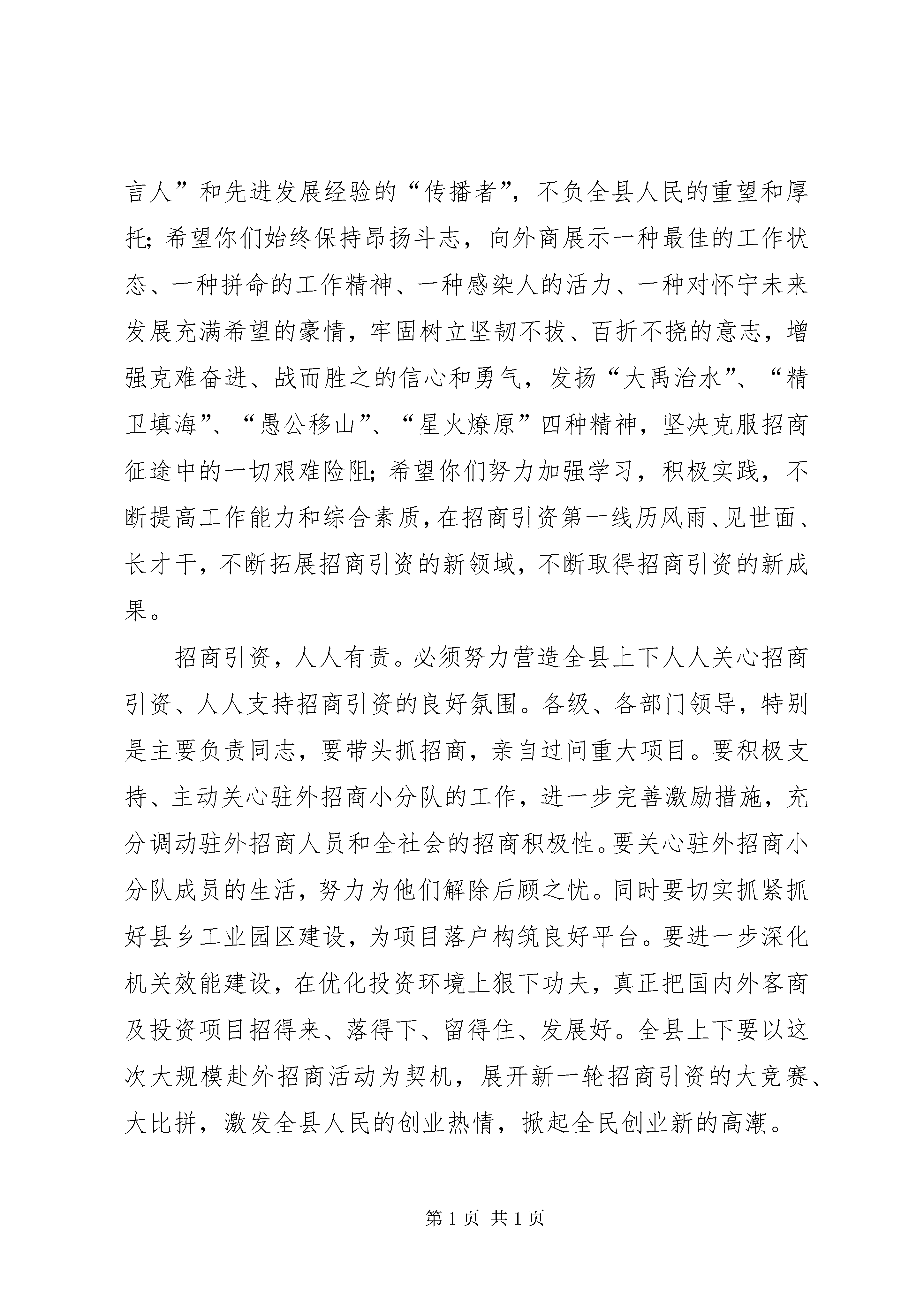 县招商队出征仪式讲话同志们:经过短期紧张筹备,我县48个驻外招商小分队已经完成组建任务,今天就要批挂出征了。首先,我谨代表县委、县政府和全县人民,向即将驻外招商的各位同志致以崇高的敬意。发展是第一要务,抓招商、上项目是实现快速发展的“一号工程”。怀宁要在新一轮大发展中实现追赶跨越、奋力崛起目标,关键在强势招商。组建招商小分队驻外招商,是县委、县政府响应省市委全民创业的号召、推进全县强势招商新突破的一项重大举措,是新形势下提高招商引资成效的必然要求,是被实践证明了的成功经验,凸显县委、县政府抓招商引资志在必得、志在必成、志在必胜的坚定决心,凸显县委、县政府在招商前线锤炼干部、培养干部、使用干部的鲜明导向。我深信,这次出征必将取得丰硕的成果。这次驻外招商小分队成员是从各个单位精心挑选出来的“精兵强将”,大家肩负着组织的期望和人民的重托,是我们怀宁宣传投资环境、广泛收集信息、广交各界朋友、推进招商引资的光荣使者。希望你们时刻牢记重任在肩,在广阔的招商舞台上大显身手,在激烈的招商竞争中充分展示怀宁人特别能吃苦、特别能战斗的精神风貌,大力弘扬怀宁人开拓进取、敢于争先的精神状态和遵纪守法、文明诚信的良好形象,全力当好怀宁形象的“代言人”和先进发展经验的“传播者”,不负全县人民的重望和厚托;希望你们始终保持昂扬斗志,向外商展示一种最佳的工作状态、一种拼命的工作精神、一种感染人的活力、一种对怀宁未来发展充满希望的豪情,牢固树立坚韧不拔、百折不挠的意志,增强克难奋进、战而胜之的信心和勇气,发扬“大禹治水”、“精卫填海”、“愚公移山”、“星火燎原”四种精神,坚决克服招商征途中的一切艰难险阻;希望你们努力加强学习,积极实践,不断提高工作能力和综合素质,在招商引资第一线历风雨、见世面、长才干,不断拓展招商引资的新领域,不断取得招商引资的新成果。招商引资,人人有责。必须努力营造全县上下人人关心招商引资、人人支持招商引资的良好氛围。各级、各部门领导,特别是主要负责同志,要带头抓招商,亲自过问重大项目。要积极支持、主动关心驻外招商小分队的工作,进一步完善激励措施,充分调动驻外招商人员和全社会的招商积极性。要关心驻外招商小分队成员的生活,努力为他们解除后顾之忧。同时要切实抓紧抓好县乡工业园区建设,为项目落户构筑良好平台。要进一步深化机关效能建设,在优化投资环境上狠下功夫,真正把国内外客商及投资项目招得来、落得下、留得住、发展好。全县上下要以这次大规模赴外招商活动为契机,展开新一轮招商引资的大竞赛、大比拼,激发全县人民的创业热情,掀起全民创业新的高潮。最后,祝同志们一路顺风,马到成功,旗开得胜,凯旋归来。谢谢大家。