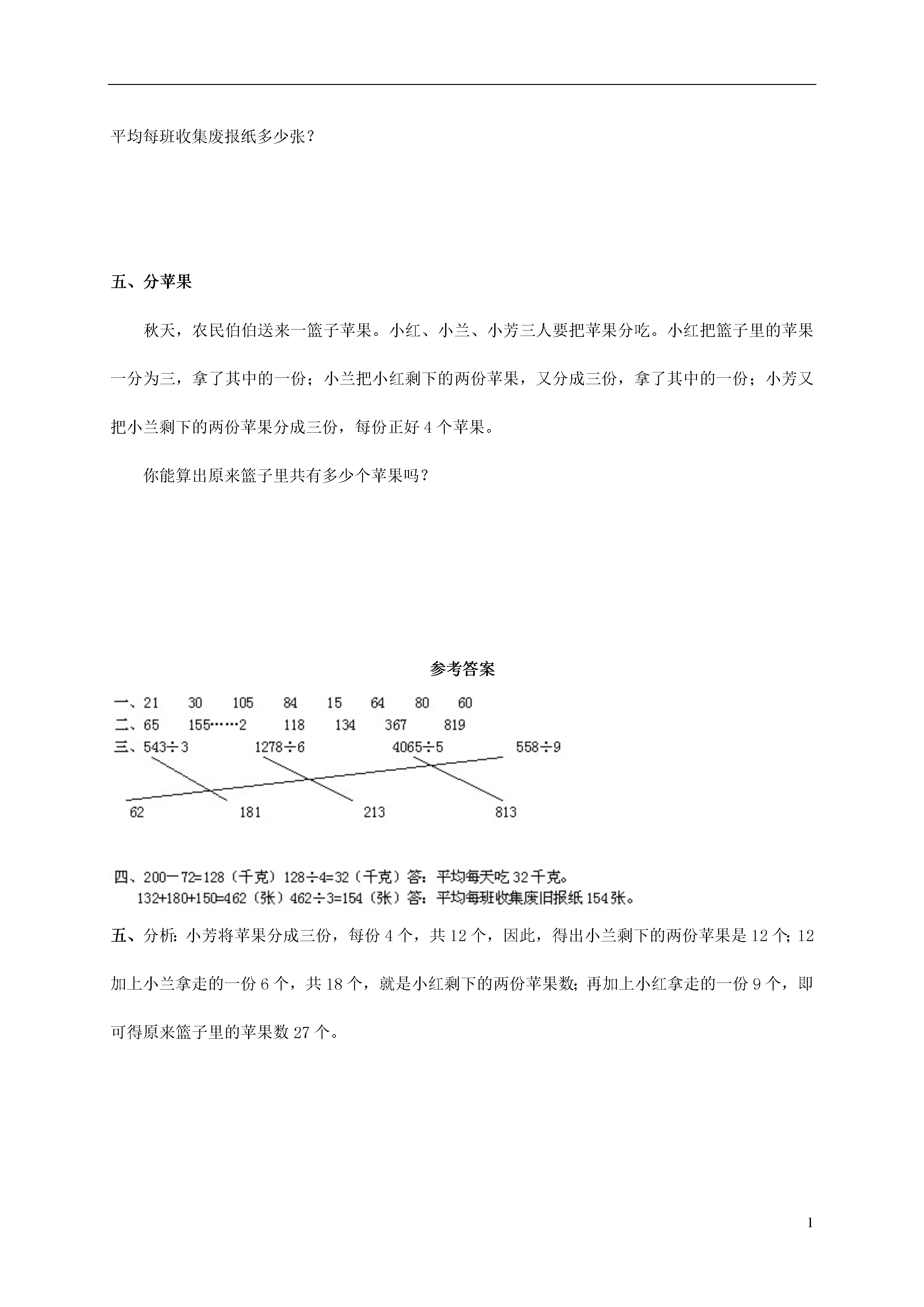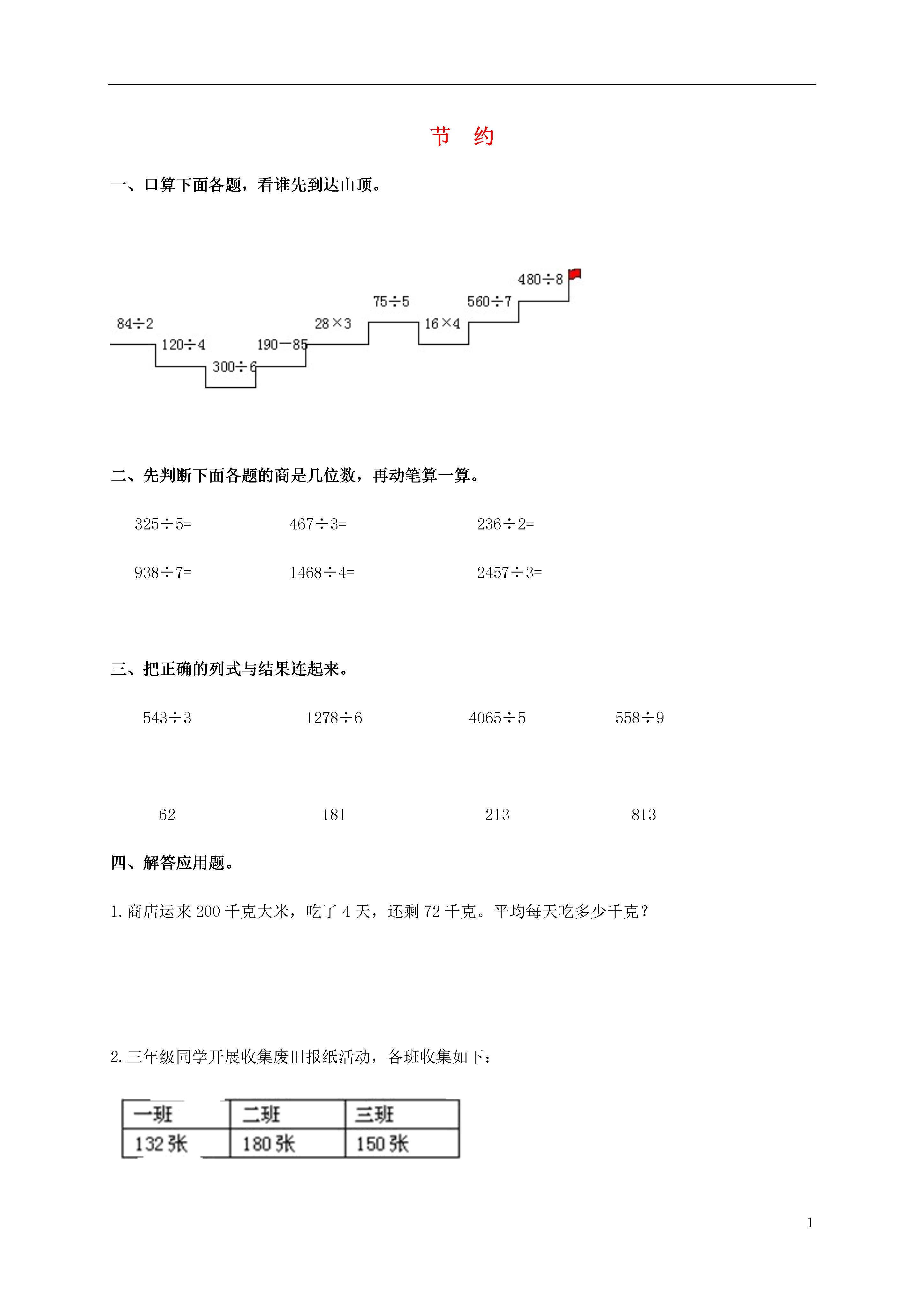 1节约一、口算下面各题,看谁先到达山顶。二、先判断下面各题的商是几位数,再动笔算一算。325÷5=467÷3=236÷2=938÷7=1468÷4=2457÷3=三、把正确的列式与结果连起来。543÷31278÷64065÷5558÷962181213813四、解答应用题。1.商店运来200千克大米,吃了4天,还剩72千克。平均每天吃多少千克?2.三年级同学开展收集废旧报纸活动,各班收集如下:平均每班收集废报纸多少张?五、分苹果秋天,农民伯伯送来一篮子苹果。小红、小兰、小芳三人要把苹果分吃。小红把篮子里的苹果一分为三,拿了其中的一份;小兰把小红剩下的两份苹果,又分成三份,拿了其中的一份;小芳又把小兰剩下的两份苹果分成三份,每份正好4个苹果。你能算出原来篮子里共有多少个苹果吗?参考答案五、分析:小芳将苹果分成三份,每份4个,共12个,因此,得出小兰剩下的两份苹果是12个;12加上小兰拿走的一份6个,共18个,就是小红剩下的两份苹果数;再加上小红拿走的一份9个,即可得原来篮子里的苹果数27个。