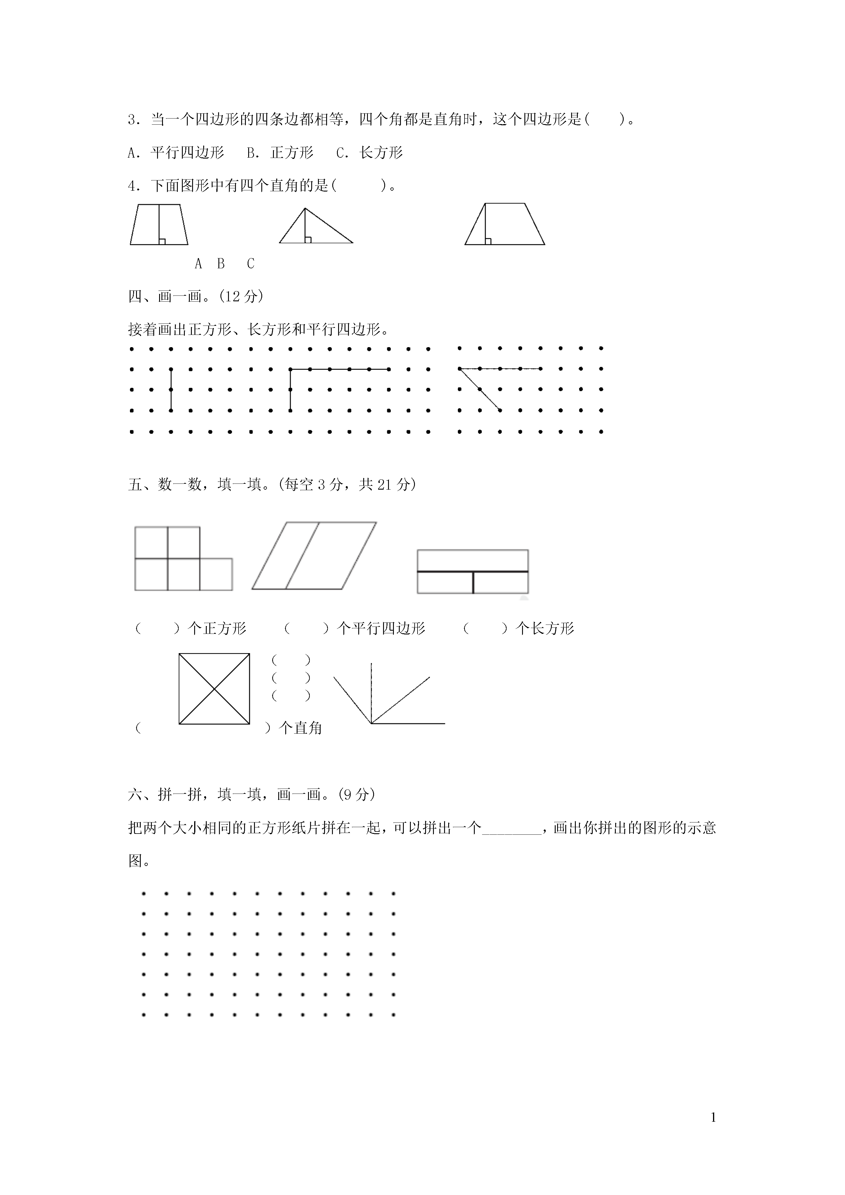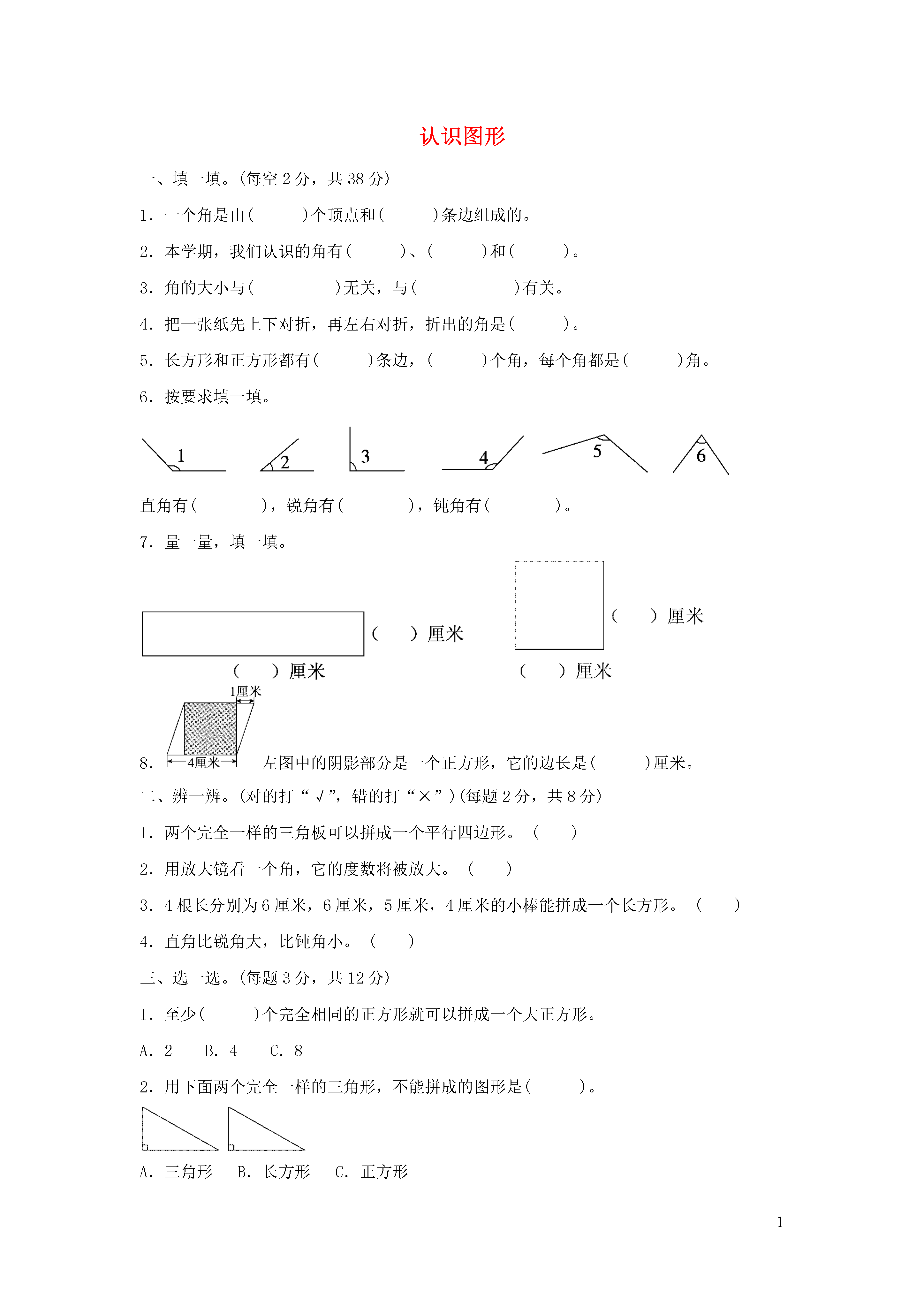 1认识图形一、填一填。(每空2分,共38分)1.一个角是由()个顶点和()条边组成的。2.本学期,我们认识的角有()、()和()。3.角的大小与()无关,与()有关。4.把一张纸先上下对折,再左右对折,折出的角是()。5.长方形和正方形都有()条边,()个角,每个角都是()角。6.按要求填一填。直角有(),锐角有(),钝角有()。7.量一量,填一填。8.左图中的阴影部分是一个正方形,它的边长是()厘米。二、辨一辨。(对的打“√”,错的打“×”)(每题2分,共8分)1.两个完全一样的三角板可以拼成一个平行四边形。()2.用放大镜看一个角,它的度数将被放大。()3.4根长分别为6厘米,6厘米,5厘米,4厘米的小棒能拼成一个长方形。()4.直角比锐角大,比钝角小。()三、选一选。(每题3分,共12分)1.至少()个完全相同的正方形就可以拼成一个大正方形。A.2B.4C.82.用下面两个完全一样的三角形,不能拼成的图形是()。A.三角形B.长方形C.正方形3.当一个四边形的四条边都相等,四个角都是直角时,这个四边形是()。A.平行四边形B.正方形C.长方形4.下面图形中有四个直角的是()。ABC四、画一画。(12分)接着画出正方形、长方形和平行四边形。五、数一数,填一填。(每空3分,共21分)()个正方形()个平行四边形()个长方形eq\a\vs4\al()eq\a\vs4\al(()个锐角,()个钝角,()个直角)()个直角六、拼一拼,填一填,画一画。(9分)把两个大小相同的正方形纸片拼在一起,可以拼出一个________,画出你拼出的图形的示意图。参考答案一、1.122.锐角直角钝角3.两边的长短角的两边张开的大小4.直角5.44直6.∠3∠2.∠6∠1.∠4.∠57.51228.3二、1.√2.×3.×4.√四、1.B2.C3.B4.A五、略六、6358312七、长方形示意图略