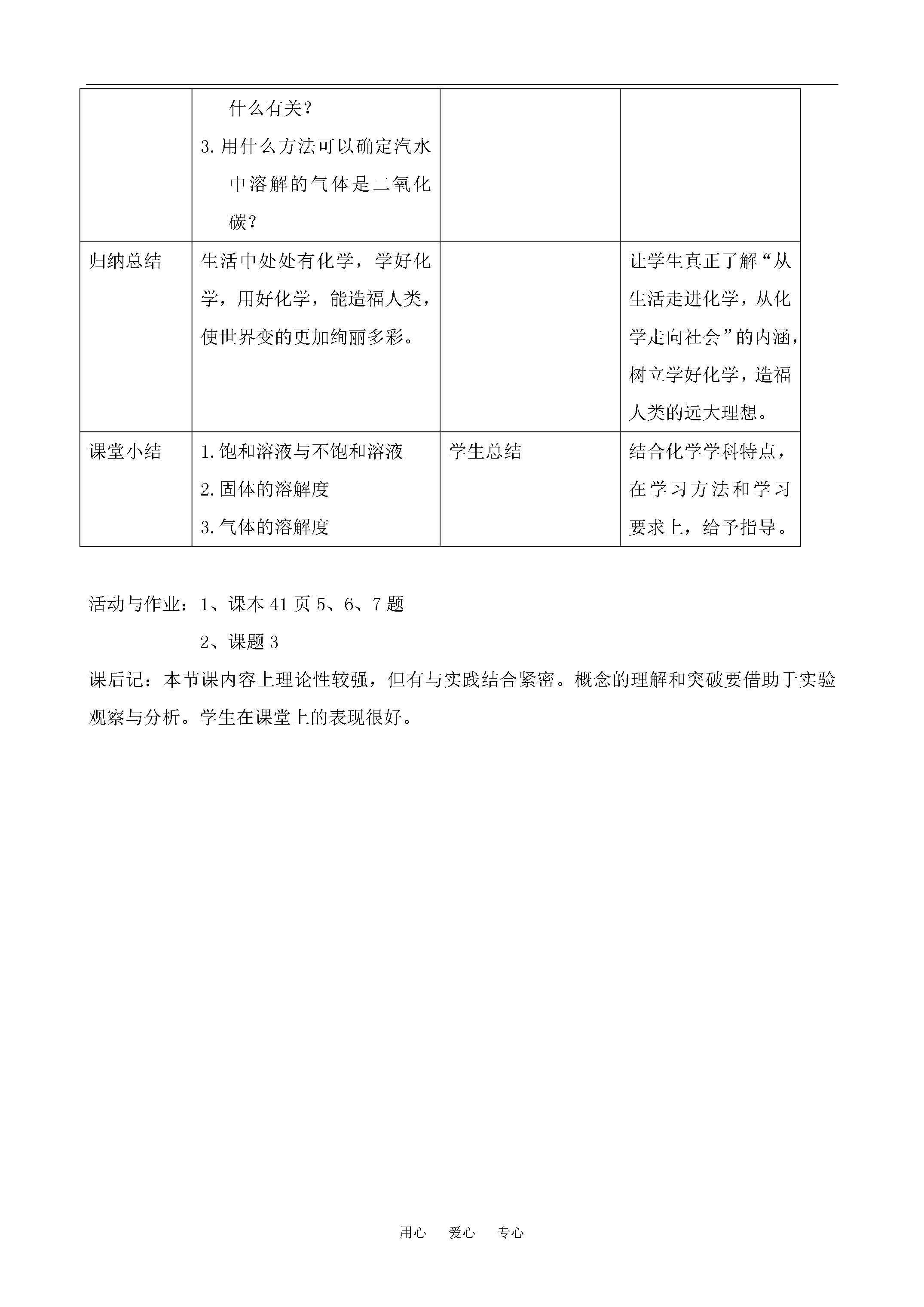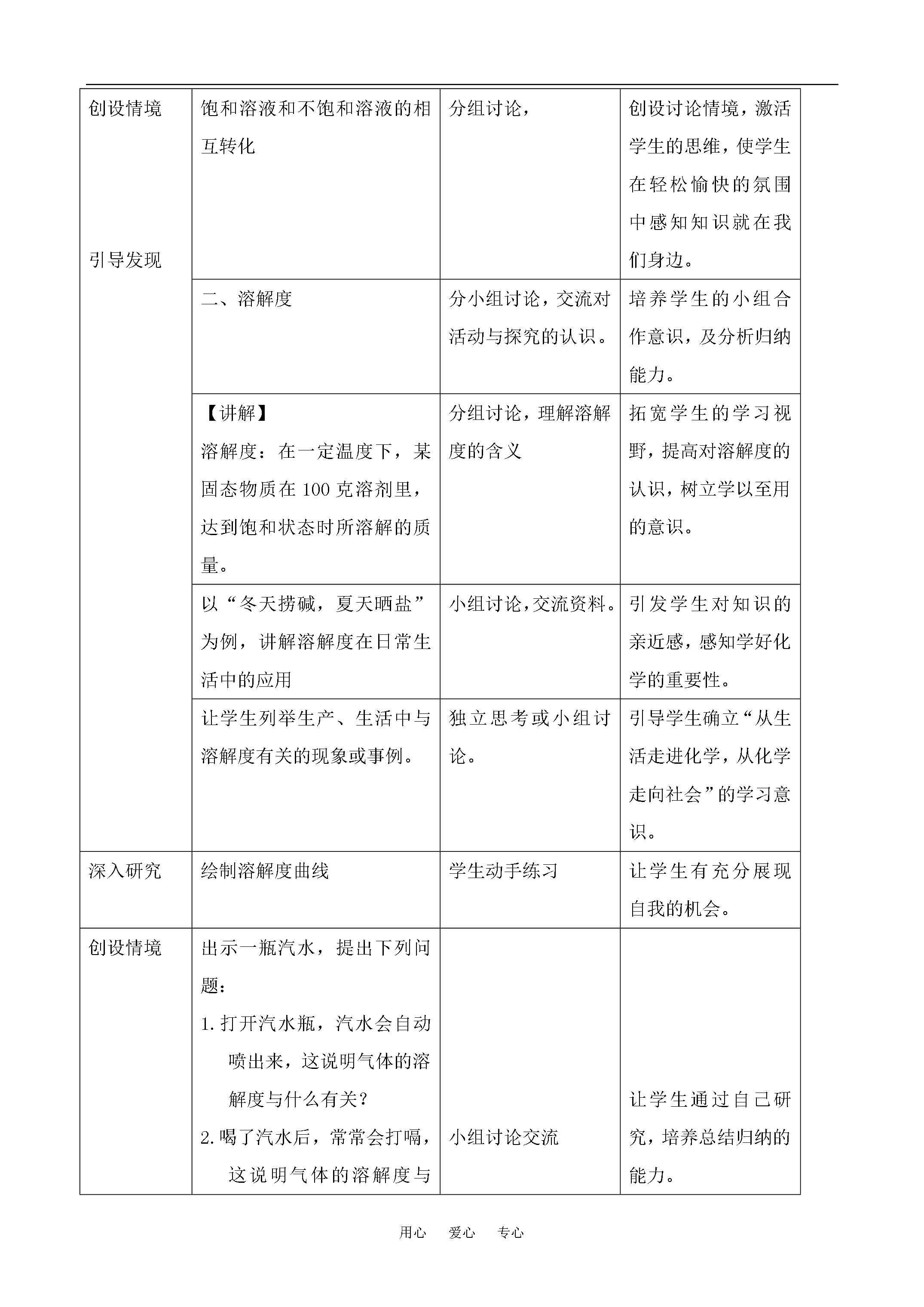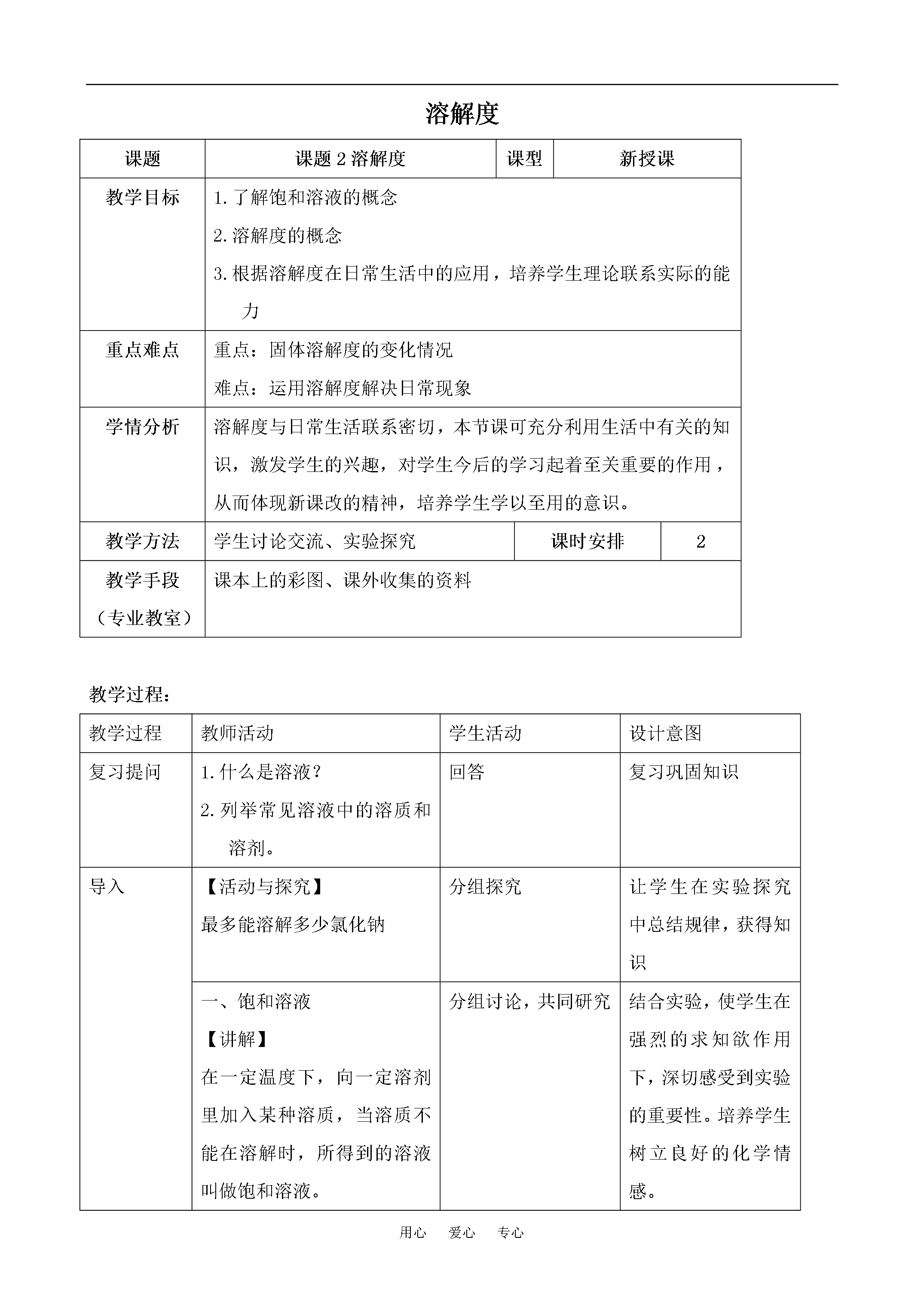 用心爱心专心溶解度课题课题2溶解度课型新授课教学目标1.了解饱和溶液的概念2.溶解度的概念3.根据溶解度在日常生活中的应用,培养学生理论联系实际的能力重点难点重点:固体溶解度的变化情况难点:运用溶解度解决日常现象学情分析溶解度与日常生活联系密切,本节课可充分利用生活中有关的知识,激发学生的兴趣,对学生今后的学习起着至关重要的作用,从而体现新课改的精神,培养学生学以至用的意识。教学方法学生讨论交流、实验探究课时安排2教学手段(专业教室)课本上的彩图、课外收集的资料教学过程:教学过程教师活动学生活动设计意图复习提问1.什么是溶液?2.列举常见溶液中的溶质和溶剂。回答复习巩固知识导入【活动与探究】最多能溶解多少氯化钠分组探究让学生在实验探究中总结规律,获得知识一、饱和溶液【讲解】在一定温度下,向一定溶剂里加入某种溶质,当溶质不能在溶解时,所得到的溶液叫做饱和溶液。分组讨论,共同研究结合实验,使学生在强烈的求知欲作用下,深切感受到实验的重要性。培养学生树立良好的化学情感。创设情境引导发现饱和溶液和不饱和溶液的相互转化分组讨论,创设讨论情境,激活学生的思维,使学生在轻松愉快的氛围中感知知识就在我们身边。二、溶解度分小组讨论,交流对活动与探究的认识。培养学生的小组合作意识,及分析归纳能力。【讲解】溶解度:在一定温度下,某固态物质在100克溶剂里,达到饱和状态时所溶解的质量。分组讨论,理解溶解度的含义拓宽学生的学习视野,提高对溶解度的认识,树立学以至用的意识。以“冬天捞碱,夏天晒盐”为例,讲解溶解度在日常生活中的应用小组讨论,交流资料。引发学生对知识的亲近感,感知学好化学的重要性。让学生列举生产、生活中与溶解度有关的现象或事例。独立思考或小组讨论。引导学生确立“从生活走进化学,从化学走向社会”的学习意识。深入研究绘制溶解度曲线学生动手练习让学生有充分展现自我的机会。创设情境出示一瓶汽水,提出下列问题:1.打开汽水瓶,汽水会自动喷出来,这说明气体的溶解度与什么有关?2.喝了汽水后,常常会打嗝,这说明气体的溶解度与什么有关?3.用什么方法可以确定汽水中溶解的气体是二氧化碳?小组讨论交流让学生通过自己研究,培养总结归纳的能力。归纳总结生活中处处有化学,学好化学,用好化学,能造福人类,使世界变的更加绚丽多彩。让学生真正了解“从生活走进化学,从化学走向社会”的内涵,树立学好化学,造福人类的远大理想。课堂小结1.饱和溶液与不饱和溶液2.固体的溶解度3.气体的溶解度学生总结结合化学学科特点,在学习方法和学习要求上,给予指导。活动与作业:1、课本41页5、6、7题2、课题3课后记:本节课内容上理论性较强,但有与实践结合紧密。概念的理解和突破要借助于实验观察与分析。学生在课堂上的表现很好。