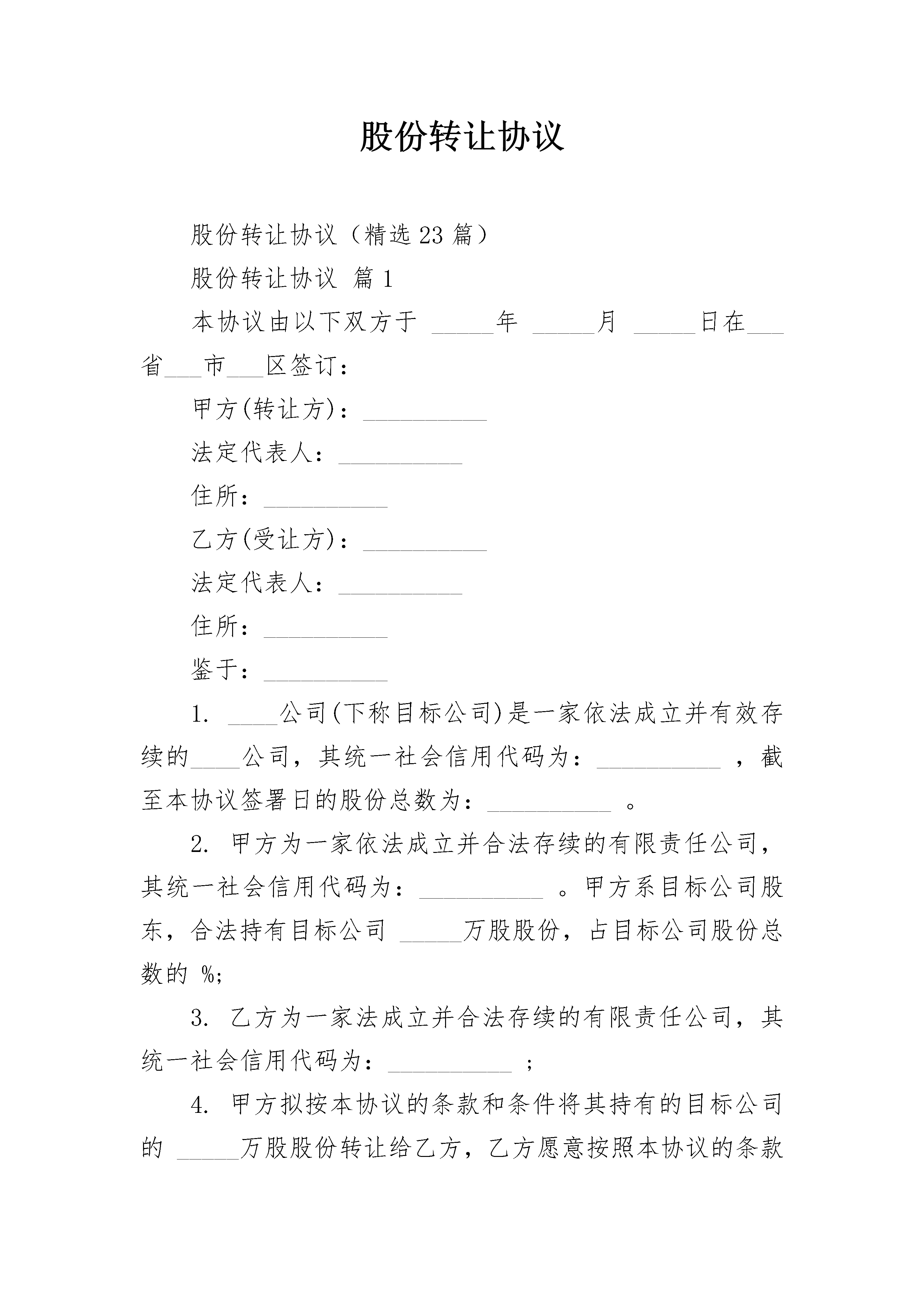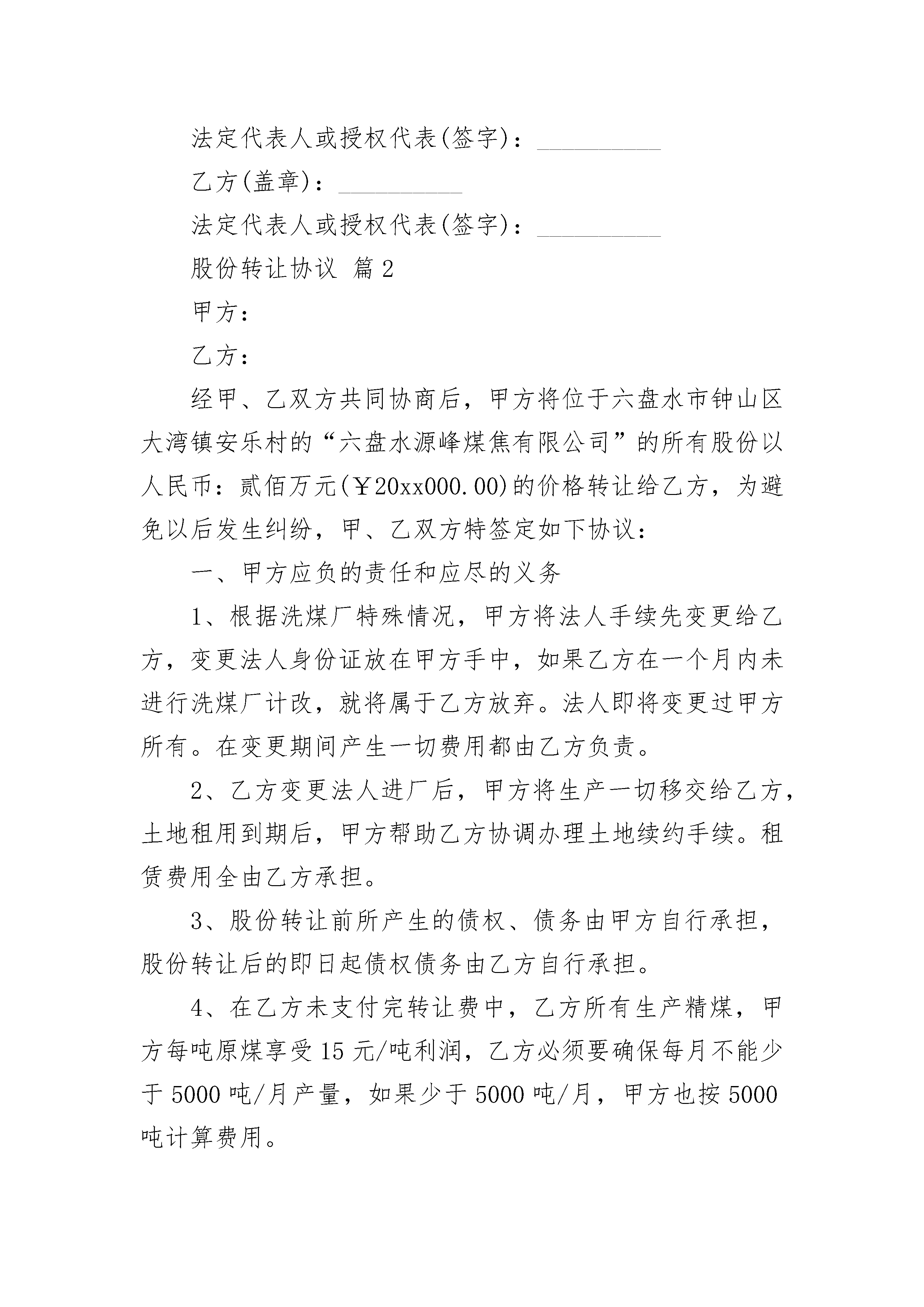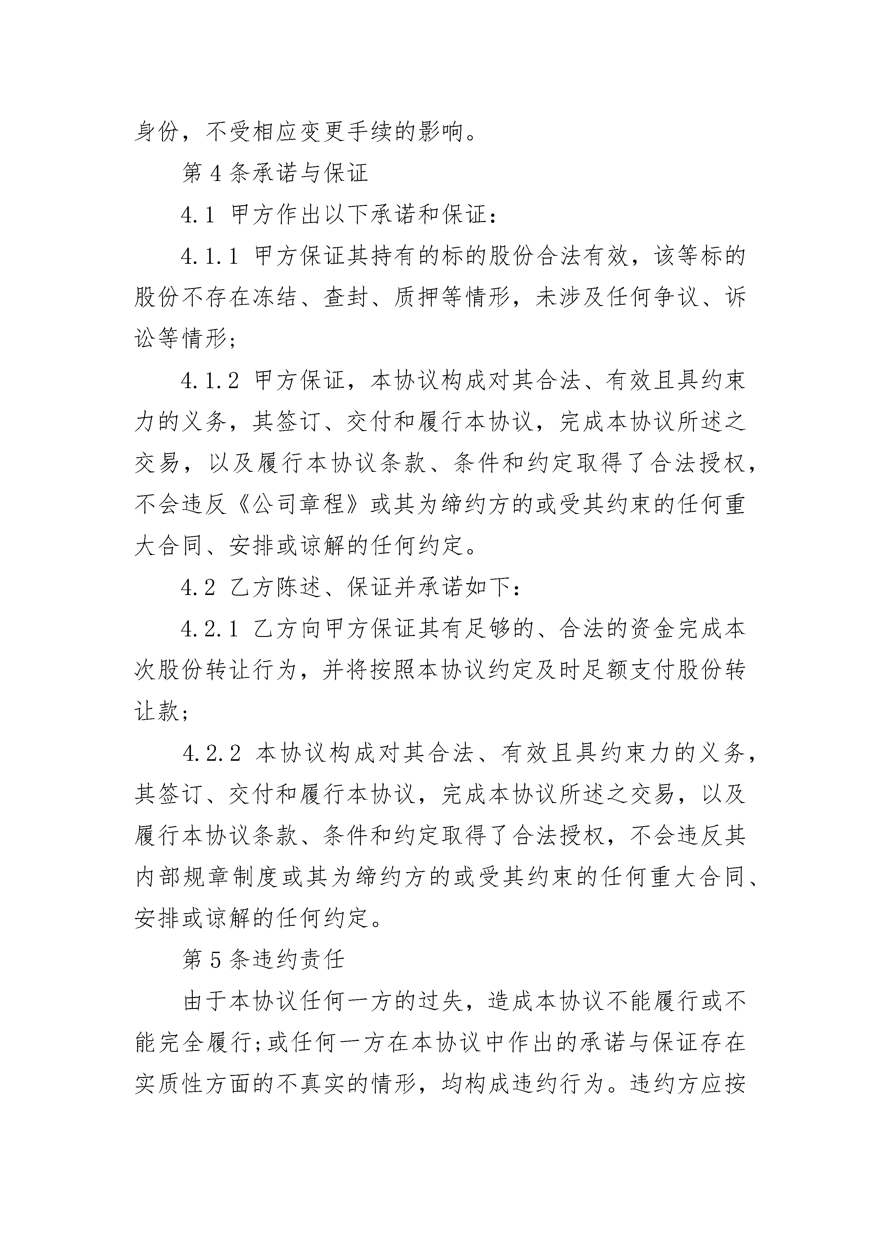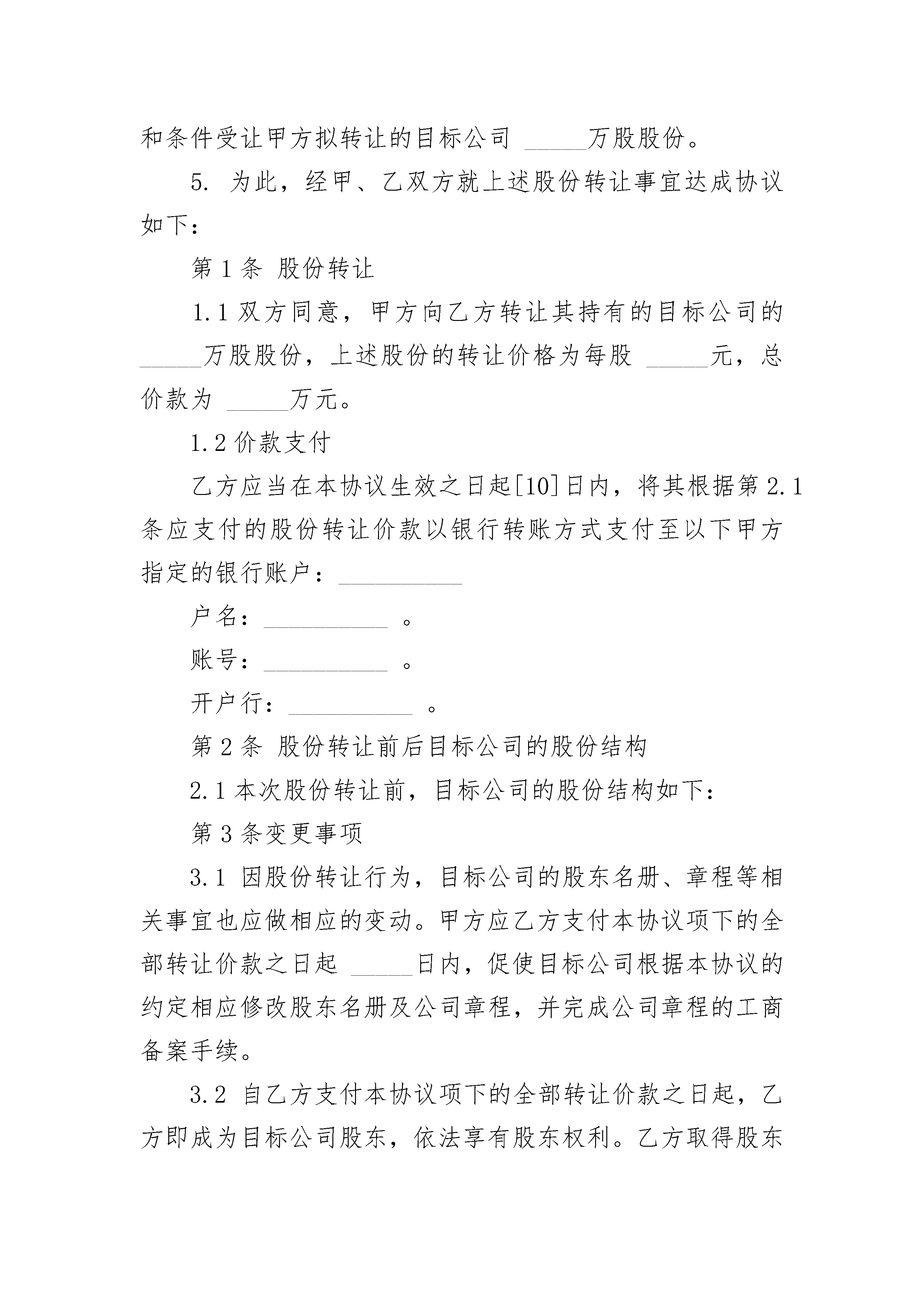 股份转让协议股份转让协议(精选23篇)股份转让协议篇1本协议由以下双方于_____年_____月_____日在___省___市___区签订:甲方(转让方):__________法定代表人:__________住所:__________乙方(受让方):__________法定代表人:__________住所:__________鉴于:__________1.____公司(下称目标公司)是一家依法成立并有效存续的____公司,其统一社会信用代码为:__________,截至本协议签署日的股份总数为:__________。2.甲方为一家依法成立并合法存续的有限责任公司,其统一社会信用代码为:__________。甲方系目标公司股东,合法持有目标公司_____万股股份,占目标公司股份总数的%;3.乙方为一家法成立并合法存续的有限责任公司,其统一社会信用代码为:__________;4.甲方拟按本协议的条款和条件将其持有的目标公司的_____万股股份转让给乙方,乙方愿意按照本协议的条款和条件受让甲方拟转让的目标公司_____万股股份。5.为此,经甲、乙双方就上述股份转让事宜达成协议如下:第1条股份转让1.1双方同意,甲方向乙方转让其持有的目标公司的_____万股股份,上述股份的转让价格为每股_____元,总价款为_____万元。1.2价款支付乙方应当在本协议生效之日起[10]日内,将其根据第2.1条应支付的股份转让价款以银行转账方式支付至以下甲方指定的银行账户:__________户名:__________。账号:__________。开户行:__________。第2条股份转让前后目标公司的股份结构2.1本次股份转让前,目标公司的股份结构如下:第3条变更事项3.1因股份转让行为,目标公司的股东名册、章程等相关事宜也应做相应的变动。甲方应乙方支付本协议项下的全部转让价款之日起_____日内,促使目标公司根据本协议的约定相应修改股东名册及公司章程,并完成公司章程的工商备案手续。3.2自乙方支付本协议项下的全部转让价款之日起,乙方即成为目标公司股东,依法享有股东权利。乙方取得股东身份,不受相应变更手续的影响。第4条承诺与保证4.1甲方作出以下承诺和保证:4.1.1甲方保证其持有的标的股份合法有效,该等标的股份不存在冻结、查封、质押等情形,未涉及任何争议、诉讼等情形;4.1.2甲方保证,本协议构成对其合法、有效且具约束力的义务,其签订、交付和履行本协议,完成本协议所述之交易,以及履行本协议条款、条件和约定取得了合法授权,不会违反《公司章程》或其为缔约方的或受其约束的任何重大合同、安排或谅解的任何约定。4.2乙方陈述、保证并承诺如下:4.2.1乙方向甲方保证其有足够的、合法的资金完成本次股份转让行为,并将按照本协议约定及时足额支付股份转让款;4.2.2本协议构成对其合法、有效且具约束力的义务,其签订、交付和履行本协议,完成本协议所述之交易,以及履行本协议条款、条件和约定取得了合法授权,不会违反其内部规章制度或其为缔约方的或受其约束的任何重大合同、安排或谅解的任何约定。第5条违约责任由于本协议任何一方的过失,造成本协议不能履行或不能完全履行;或任何一方在本协议中作出的承诺与保证存在实质性方面的不真实的情形,均构成违约行为。违约方应按过失程度承担违约责任;如各方均有过失,根据实际情况,由各方分别承担各自应负的违约责任。第6条协议的解除6.1各方协商一致,可以书面解除本协议。6.2如果因为任何一方出现严重违约行为,致使本协议无法继续履行、本协议的目的无法实现或给守约方造成重大损失的,守约方有权单方解除本协议,同时违约方应赔偿守约方的一切损失。第7条法律适用和争议解决7.1本协议的签订、解释及其在履行过程中出现的或与本协议有关的异议或争议的解决,受中华人民共和国现行有效法律的约束。7.2任何因本协议的解释或履行而产生的争议,均应首先通过友好协商方式加以解决。如协商未果,本协议任何一方有权向有管辖权的法院提起诉讼。第8条附则8.1本协议自各方签字并盖章之日起生效。8.2本协议项下的条款和条件构成各方完整和有约束力的义务,未征得其他方同意,不得对本协议的规定、条款进行修改、扩充或解除。对本协议的修改、补充,应由各方同意以书面形式作出并经合法程序批准。8.3本协议以中文作成,一式份,双方各持份,均具有同等的法律效力。甲方(盖章):__________法定代表人或授权代表(签字):__________乙方(盖章):__________法定代表人或授权代表(签字):__________股份转让协议篇2甲方:乙方:经甲、乙双方共同协商后,甲方将位于六盘水市钟山区大湾镇安乐村的“六盘水源峰煤焦有限公司”的所有股份以人民币:贰佰万元(¥20xx000.00)的价格