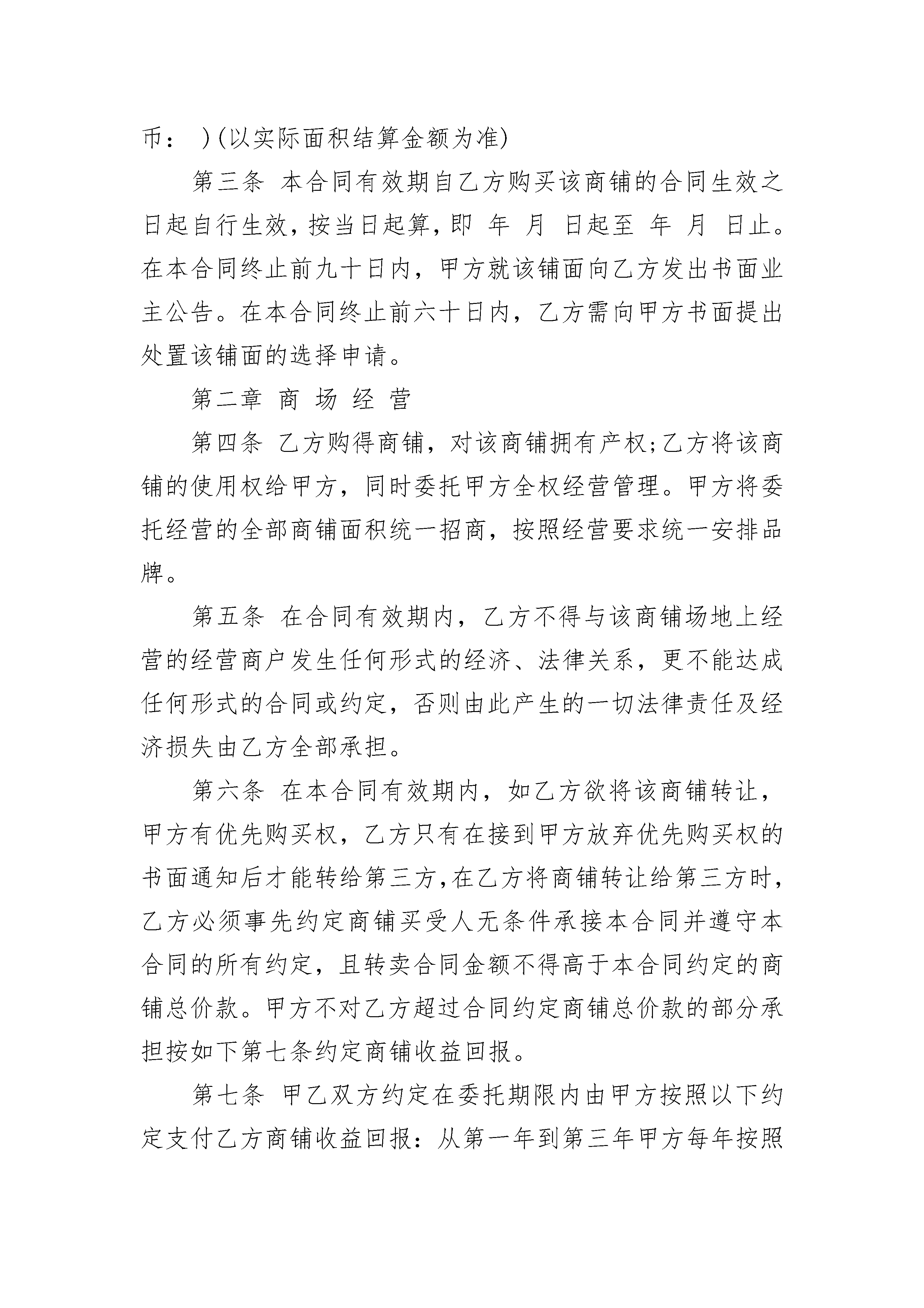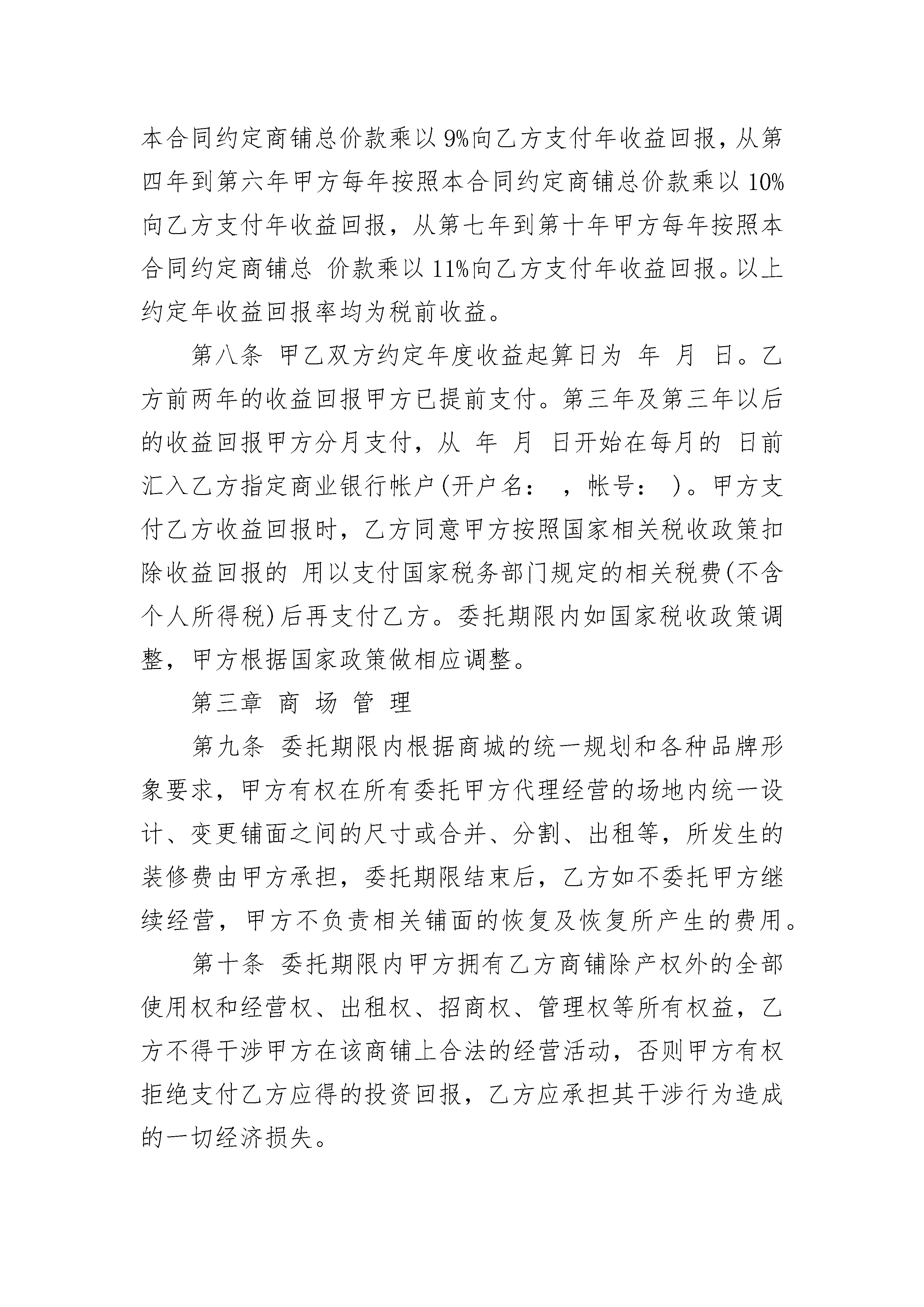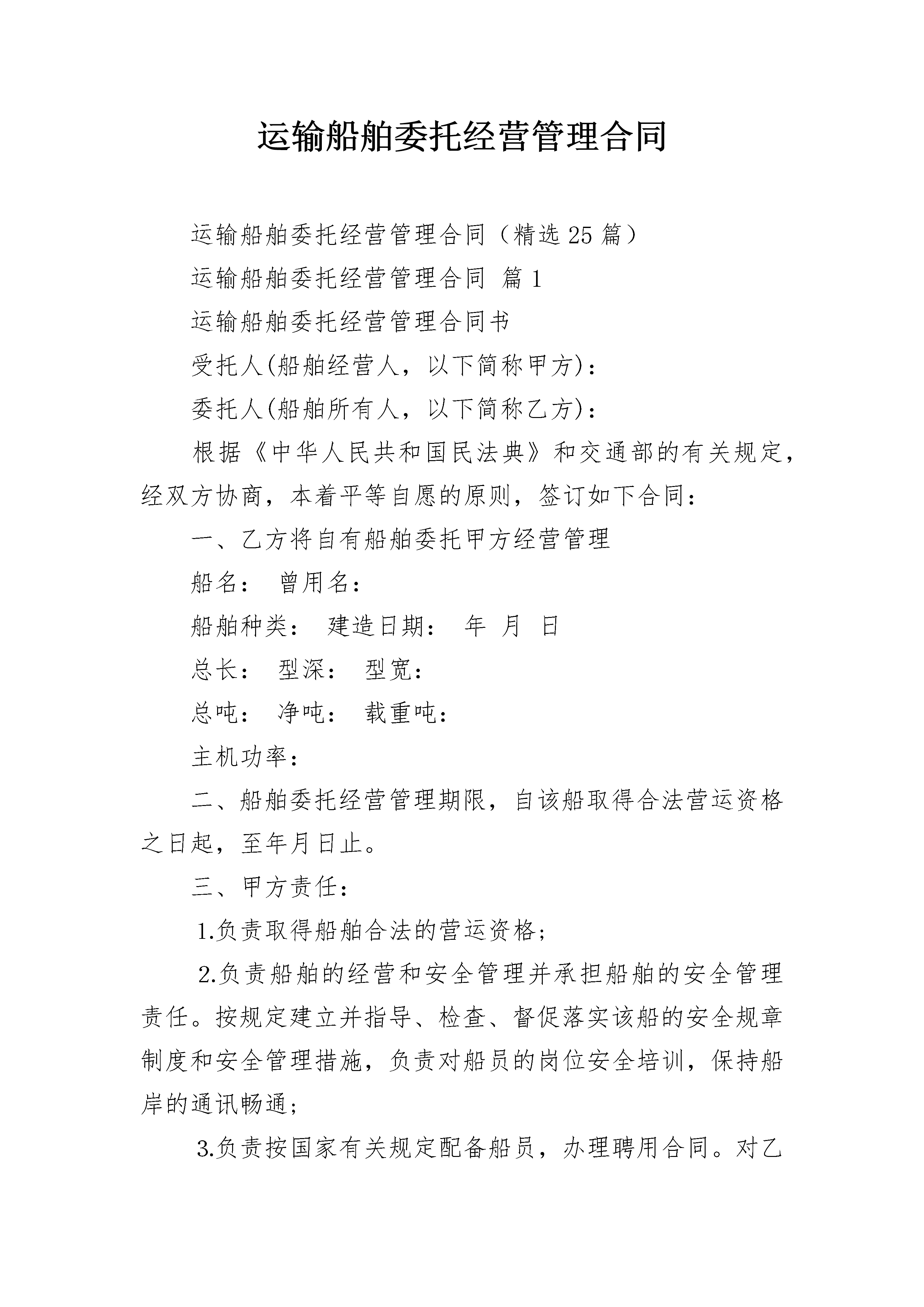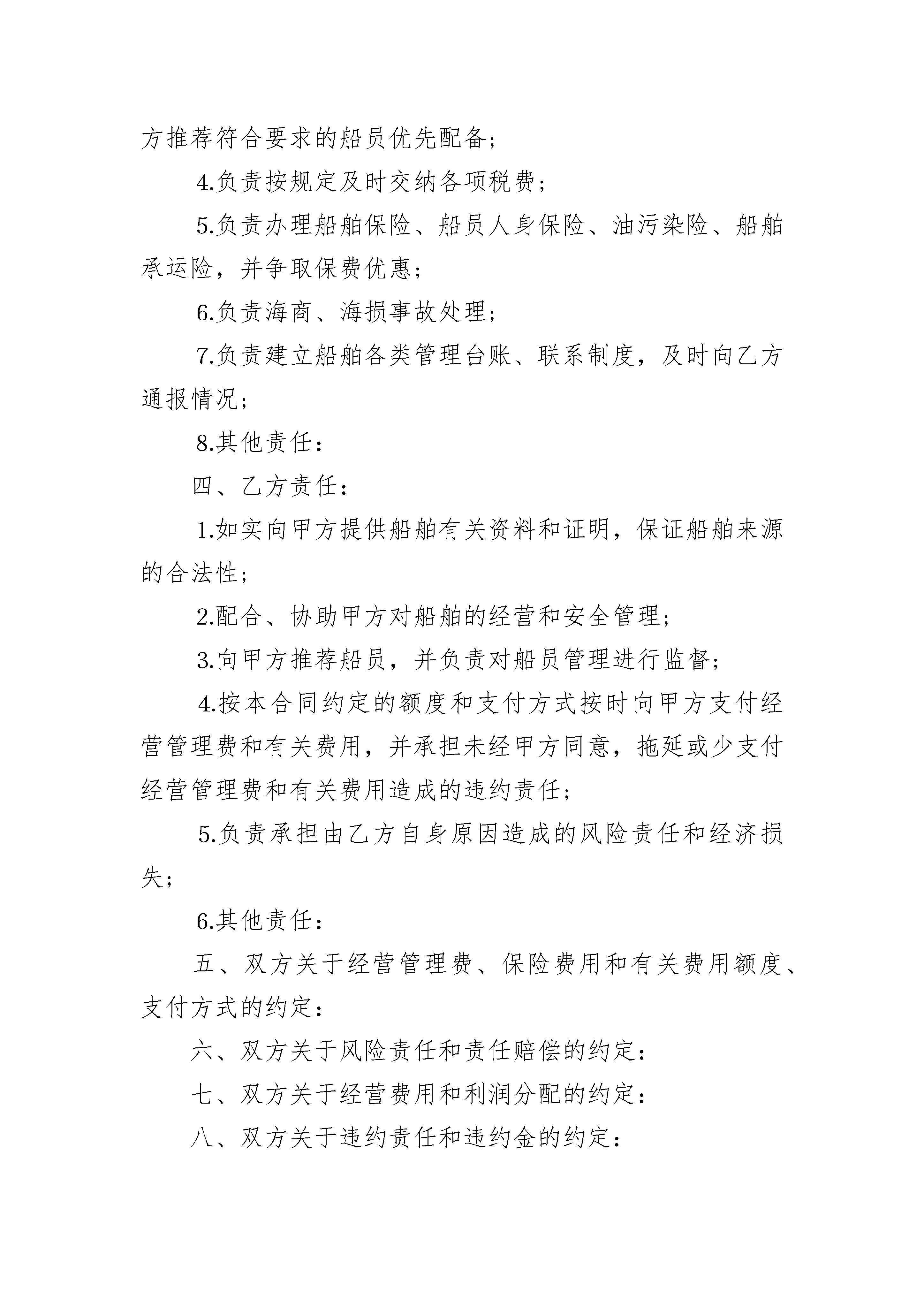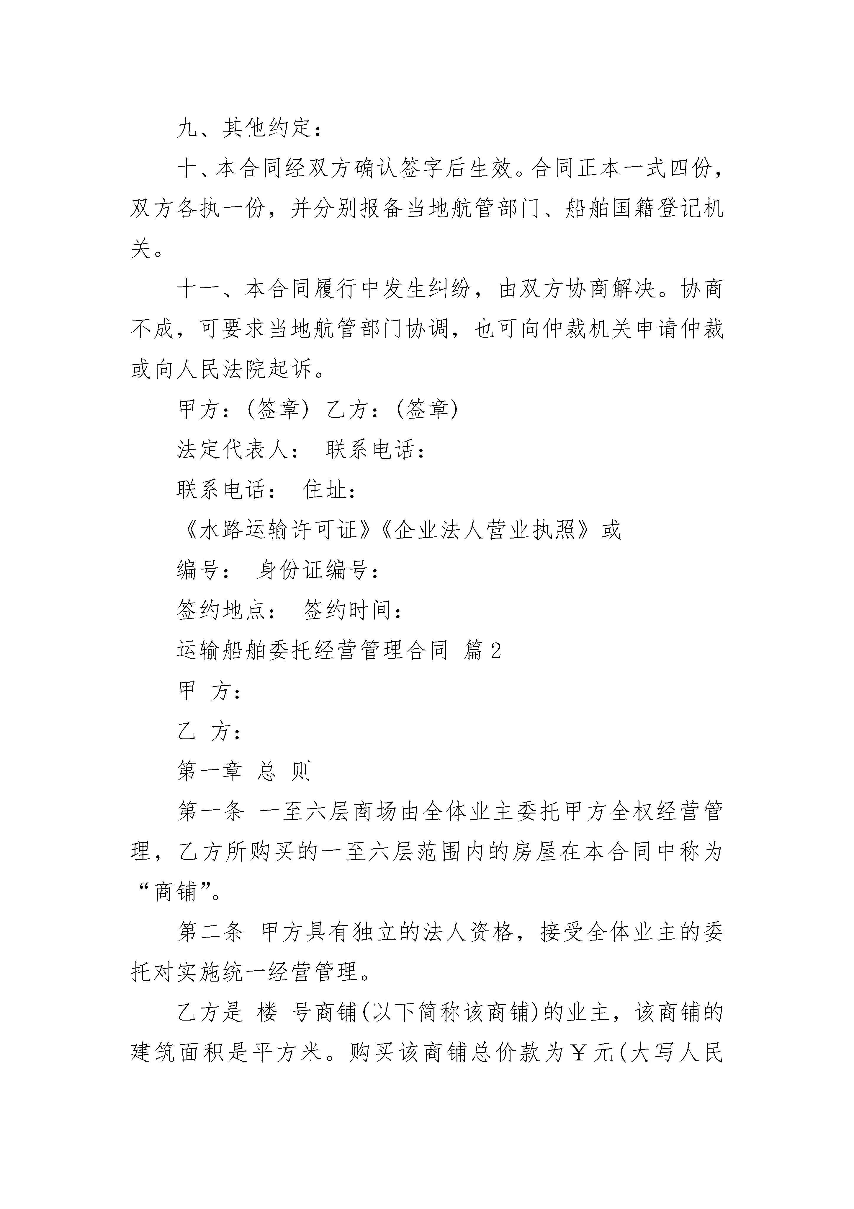 运输船舶委托经营管理合同运输船舶委托经营管理合同(精选25篇)运输船舶委托经营管理合同篇1运输船舶委托经营管理合同书受托人(船舶经营人,以下简称甲方):委托人(船舶所有人,以下简称乙方):根据《中华人民共和国民法典》和交通部的有关规定,经双方协商,本着平等自愿的原则,签订如下合同:一、乙方将自有船舶委托甲方经营管理船名:曾用名:船舶种类:建造日期:年月日总长:型深:型宽:总吨:净吨:载重吨:主机功率:二、船舶委托经营管理期限,自该船取得合法营运资格之日起,至年月日止。三、甲方责任:⒈负责取得船舶合法的营运资格;⒉负责船舶的经营和安全管理并承担船舶的安全管理责任。按规定建立并指导、检查、督促落实该船的安全规章制度和安全管理措施,负责对船员的岗位安全培训,保持船岸的通讯畅通;⒊负责按国家有关规定配备船员,办理聘用合同。对乙方推荐符合要求的船员优先配备;⒋负责按规定及时交纳各项税费;⒌负责办理船舶保险、船员人身保险、油污染险、船舶承运险,并争取保费优惠;⒍负责海商、海损事故处理;⒎负责建立船舶各类管理台账、联系制度,及时向乙方通报情况;⒏其他责任:四、乙方责任:⒈如实向甲方提供船舶有关资料和证明,保证船舶来源的合法性;⒉配合、协助甲方对船舶的经营和安全管理;⒊向甲方推荐船员,并负责对船员管理进行监督;⒋按本合同约定的额度和支付方式按时向甲方支付经营管理费和有关费用,并承担未经甲方同意,拖延或少支付经营管理费和有关费用造成的违约责任;⒌负责承担由乙方自身原因造成的风险责任和经济损失;⒍其他责任:五、双方关于经营管理费、保险费用和有关费用额度、支付方式的约定:六、双方关于风险责任和责任赔偿的约定:七、双方关于经营费用和利润分配的约定:八、双方关于违约责任和违约金的约定:九、其他约定:十、本合同经双方确认签字后生效。合同正本一式四份,双方各执一份,并分别报备当地航管部门、船舶国籍登记机关。十一、本合同履行中发生纠纷,由双方协商解决。协商不成,可要求当地航管部门协调,也可向仲裁机关申请仲裁或向人民法院起诉。甲方:(签章)乙方:(签章)法定代表人:联系电话:联系电话:住址:《水路运输许可证》《企业法人营业执照》或编号:身份证编号:签约地点:签约时间:运输船舶委托经营管理合同篇2甲方:乙方:第一章总则第一条一至六层商场由全体业主委托甲方全权经营管理,乙方所购买的一至六层范围内的房屋在本合同中称为“商铺”。第二条甲方具有独立的法人资格,接受全体业主的委托对实施统一经营管理。乙方是楼号商铺(以下简称该商铺)的业主,该商铺的建筑面积是平方米。购买该商铺总价款为¥元(大写人民币:)(以实际面积结算金额为准)第三条本合同有效期自乙方购买该商铺的合同生效之日起自行生效,按当日起算,即年月日起至年月日止。在本合同终止前九十日内,甲方就该铺面向乙方发出书面业主公告。在本合同终止前六十日内,乙方需向甲方书面提出处置该铺面的选择申请。第二章商场经营第四条乙方购得商铺,对该商铺拥有产权;乙方将该商铺的使用权给甲方,同时委托甲方全权经营管理。甲方将委托经营的全部商铺面积统一招商,按照经营要求统一安排品牌。第五条在合同有效期内,乙方不得与该商铺场地上经营的经营商户发生任何形式的经济、法律关系,更不能达成任何形式的合同或约定,否则由此产生的一切法律责任及经济损失由乙方全部承担。第六条在本合同有效期内,如乙方欲将该商铺转让,甲方有优先购买权,乙方只有在接到甲方放弃优先购买权的书面通知后才能转给第三方,在乙方将商铺转让给第三方时,乙方必须事先约定商铺买受人无条件承接本合同并遵守本合同的所有约定,且转卖合同金额不得高于本合同约定的商铺总价款。甲方不对乙方超过合同约定商铺总价款的部分承担按如下第七条约定商铺收益回报。第七条甲乙双方约定在委托期限内由甲方按照以下约定支付乙方商铺收益回报:从第一年到第三年甲方每年按照本合同约定商铺总价款乘以9%向乙方支付年收益回报,从第四年到第六年甲方每年按照本合同约定商铺总价款乘以10%向乙方支付年收益回报,从第七年到第十年甲方每年按照本合同约定商铺总价款乘以11%向乙方支付年收益回报。以上约定年收益回报率均为税前收益。第八条甲乙双方约定年度收益起算日为年月日。乙方前两年的收益回报甲方已提前支付。第三年及第三年以后的收益回报甲方分月支付,从年月日开始在每月的日前汇入乙方指定商业银行帐户(开户名:,帐号:)。甲方支付乙方收益回报时,乙方同意甲方按照国家相关税收政策扣除收益回报的用以支付国家税务部门规定的相关税费(不含个人所得税)后再支付乙方。委托期限内如国家税收政策调整,甲方根据国家政策做相应调整。第三章商场管理第九条委托期限内根据商城的统一规划和各种品牌形象要求,甲方有权在所有委托甲方代理经营的场地内统一设计、变更铺面之间的尺寸或合并、分割、出