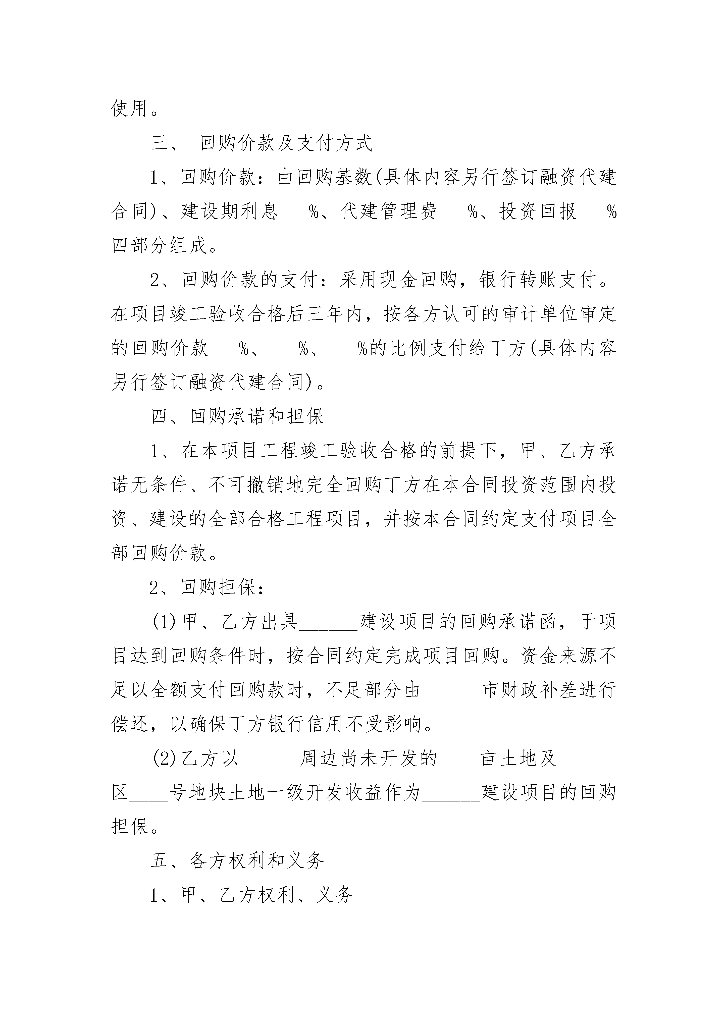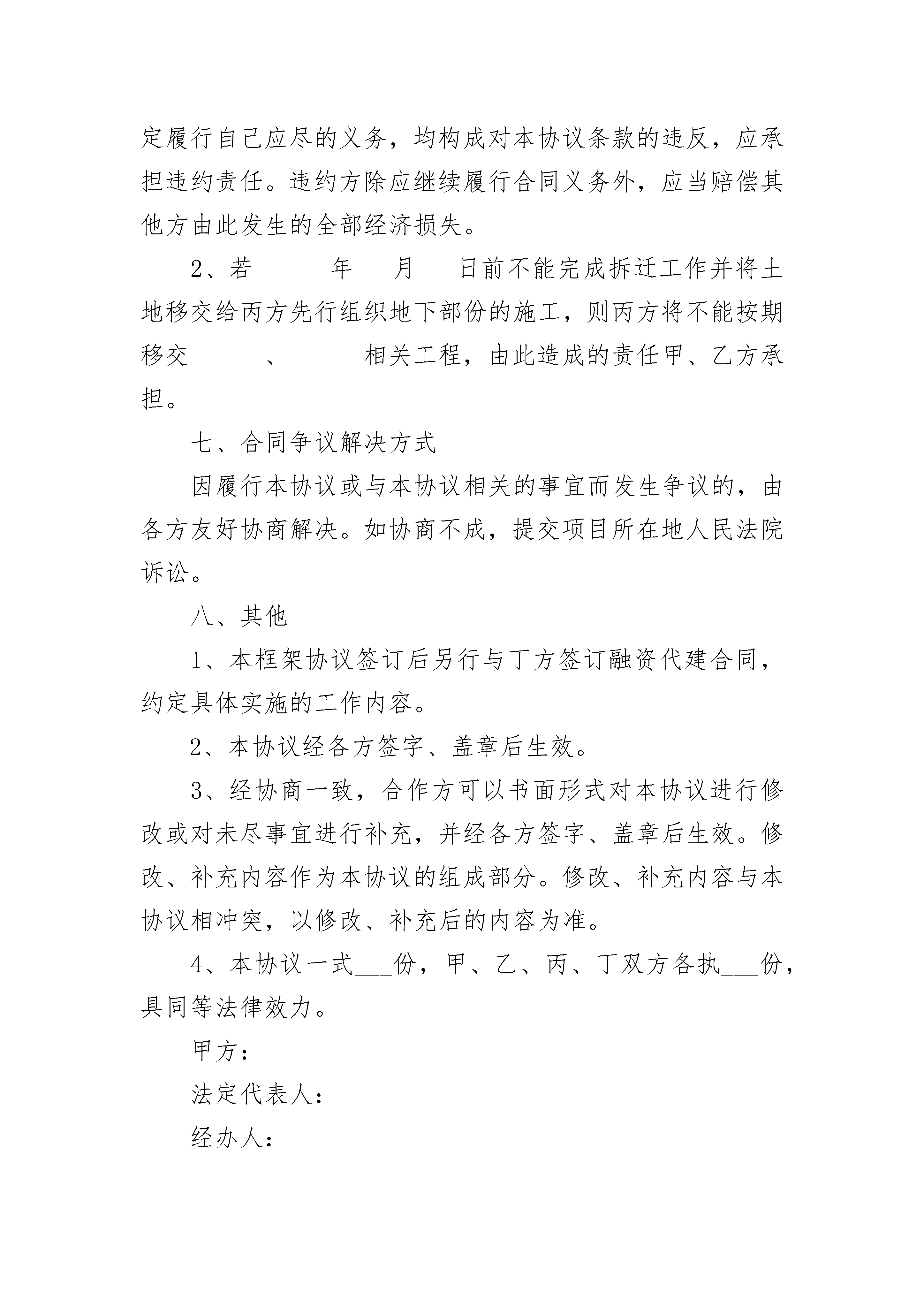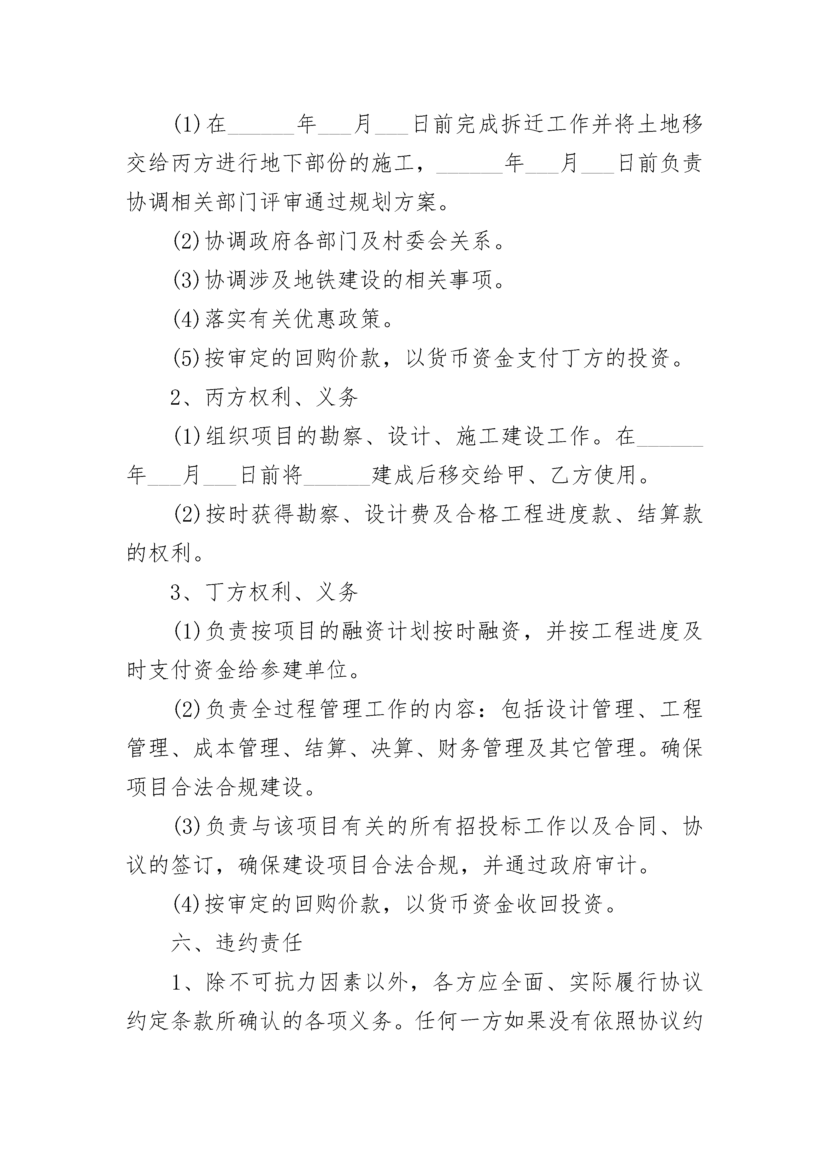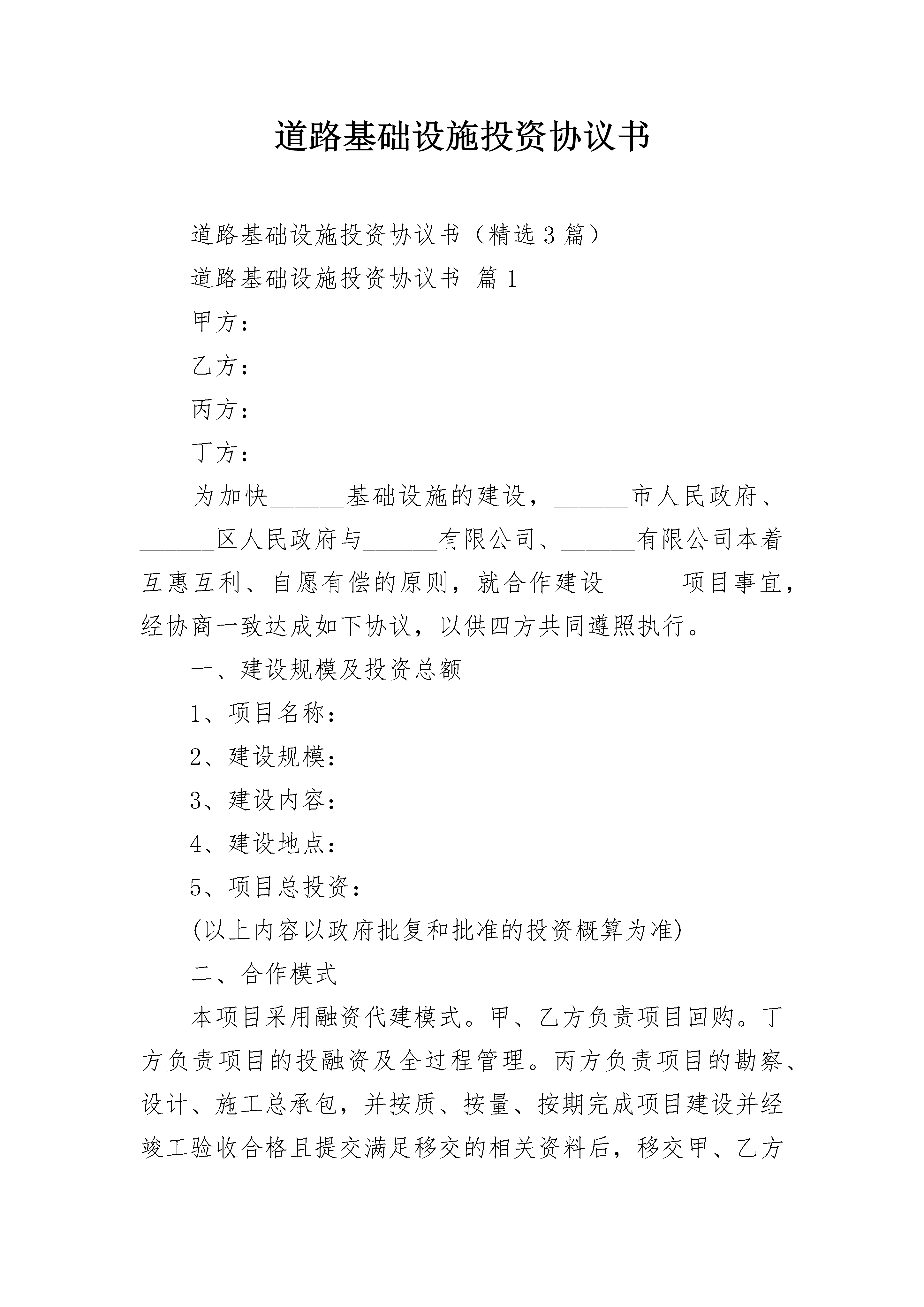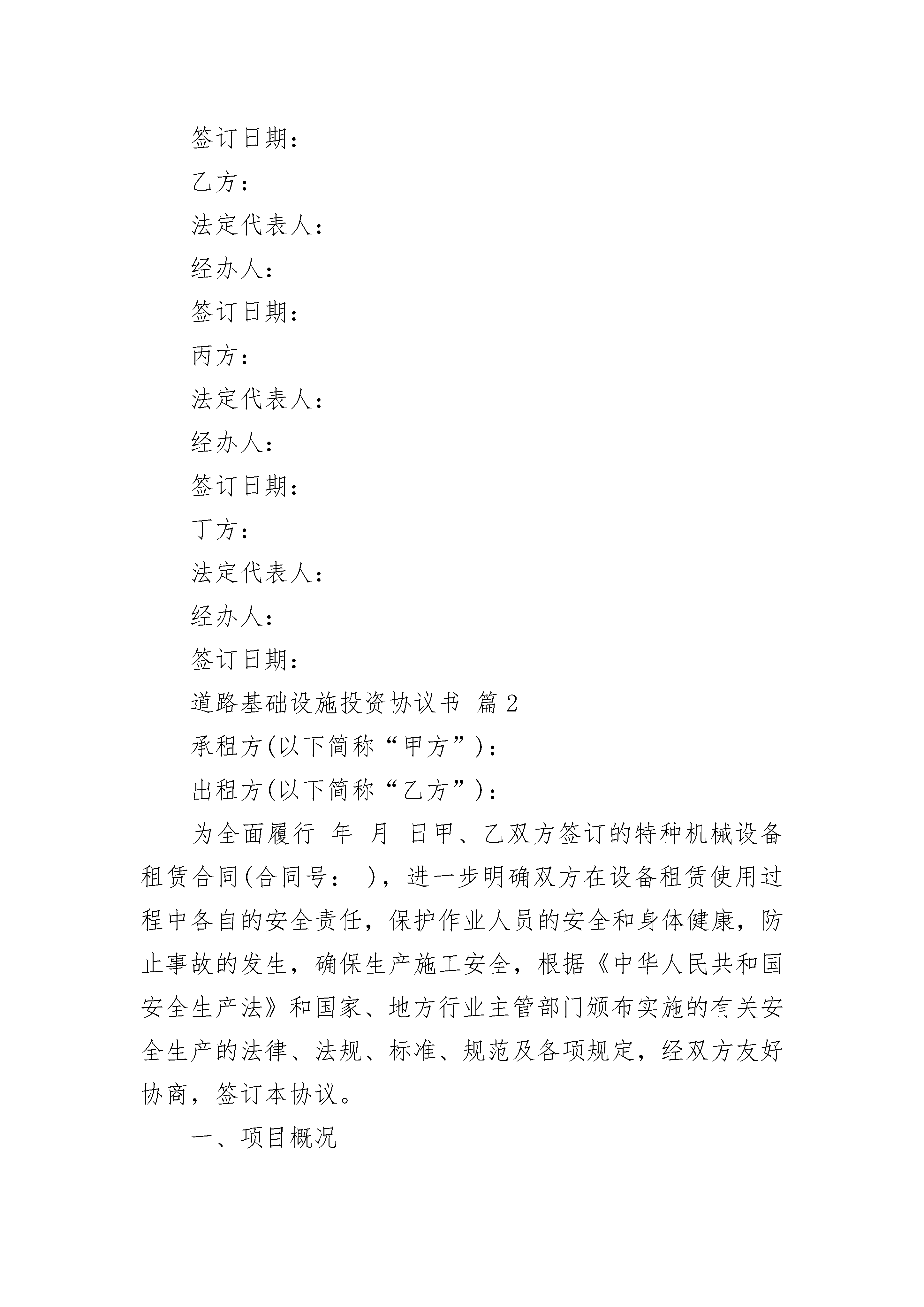 道路基础设施投资协议书道路基础设施投资协议书(精选3篇)道路基础设施投资协议书篇1甲方:乙方:丙方:丁方:为加快______基础设施的建设,______市人民政府、______区人民政府与______有限公司、______有限公司本着互惠互利、自愿有偿的原则,就合作建设______项目事宜,经协商一致达成如下协议,以供四方共同遵照执行。一、建设规模及投资总额1、项目名称:2、建设规模:3、建设内容:4、建设地点:5、项目总投资:(以上内容以政府批复和批准的投资概算为准)二、合作模式本项目采用融资代建模式。甲、乙方负责项目回购。丁方负责项目的投融资及全过程管理。丙方负责项目的勘察、设计、施工总承包,并按质、按量、按期完成项目建设并经竣工验收合格且提交满足移交的相关资料后,移交甲、乙方使用。三、回购价款及支付方式1、回购价款:由回购基数(具体内容另行签订融资代建合同)、建设期利息___%、代建管理费___%、投资回报___%四部分组成。2、回购价款的支付:采用现金回购,银行转账支付。在项目竣工验收合格后三年内,按各方认可的审计单位审定的回购价款___%、___%、___%的比例支付给丁方(具体内容另行签订融资代建合同)。四、回购承诺和担保1、在本项目工程竣工验收合格的前提下,甲、乙方承诺无条件、不可撤销地完全回购丁方在本合同投资范围内投资、建设的全部合格工程项目,并按本合同约定支付项目全部回购价款。2、回购担保:(1)甲、乙方出具______建设项目的回购承诺函,于项目达到回购条件时,按合同约定完成项目回购。资金来源不足以全额支付回购款时,不足部分由______市财政补差进行偿还,以确保丁方银行信用不受影响。(2)乙方以______周边尚未开发的____亩土地及______区____号地块土地一级开发收益作为______建设项目的回购担保。五、各方权利和义务1、甲、乙方权利、义务(1)在______年___月___日前完成拆迁工作并将土地移交给丙方进行地下部份的施工,______年___月___日前负责协调相关部门评审通过规划方案。(2)协调政府各部门及村委会关系。(3)协调涉及地铁建设的相关事项。(4)落实有关优惠政策。(5)按审定的回购价款,以货币资金支付丁方的投资。2、丙方权利、义务(1)组织项目的勘察、设计、施工建设工作。在______年___月___日前将______建成后移交给甲、乙方使用。(2)按时获得勘察、设计费及合格工程进度款、结算款的权利。3、丁方权利、义务(1)负责按项目的融资计划按时融资,并按工程进度及时支付资金给参建单位。(2)负责全过程管理工作的内容:包括设计管理、工程管理、成本管理、结算、决算、财务管理及其它管理。确保项目合法合规建设。(3)负责与该项目有关的所有招投标工作以及合同、协议的签订,确保建设项目合法合规,并通过政府审计。(4)按审定的回购价款,以货币资金收回投资。六、违约责任1、除不可抗力因素以外,各方应全面、实际履行协议约定条款所确认的各项义务。任何一方如果没有依照协议约定履行自己应尽的义务,均构成对本协议条款的违反,应承担违约责任。违约方除应继续履行合同义务外,应当赔偿其他方由此发生的全部经济损失。2、若______年___月___日前不能完成拆迁工作并将土地移交给丙方先行组织地下部份的施工,则丙方将不能按期移交______、______相关工程,由此造成的责任甲、乙方承担。七、合同争议解决方式因履行本协议或与本协议相关的事宜而发生争议的,由各方友好协商解决。如协商不成,提交项目所在地人民法院诉讼。八、其他1、本框架协议签订后另行与丁方签订融资代建合同,约定具体实施的工作内容。2、本协议经各方签字、盖章后生效。3、经协商一致,合作方可以书面形式对本协议进行修改或对未尽事宜进行补充,并经各方签字、盖章后生效。修改、补充内容作为本协议的组成部分。修改、补充内容与本协议相冲突,以修改、补充后的内容为准。4、本协议一式___份,甲、乙、丙、丁双方各执___份,具同等法律效力。甲方:法定代表人:经办人:签订日期:乙方:法定代表人:经办人:签订日期:丙方:法定代表人:经办人:签订日期:丁方:法定代表人:经办人:签订日期:道路基础设施投资协议书篇2承租方(以下简称“甲方”):出租方(以下简称“乙方”):为全面履行年月日甲、乙双方签订的特种机械设备租赁合同(合同号:),进一步明确双方在设备租赁使用过程中各自的安全责任,保护作业人员的安全和身体健康,防止事故的发生,确保生产施工安全,根据《中华人民共和国安全生产法》和国家、地方行业主管部门颁布实施的有关安全生产的法律、法规、标准、规范及各项规定,经双方友好协商,签订本协议。一、项目概况1.项目名称:2.进场日期:年月日。3.项目内容:二、安全目标1.