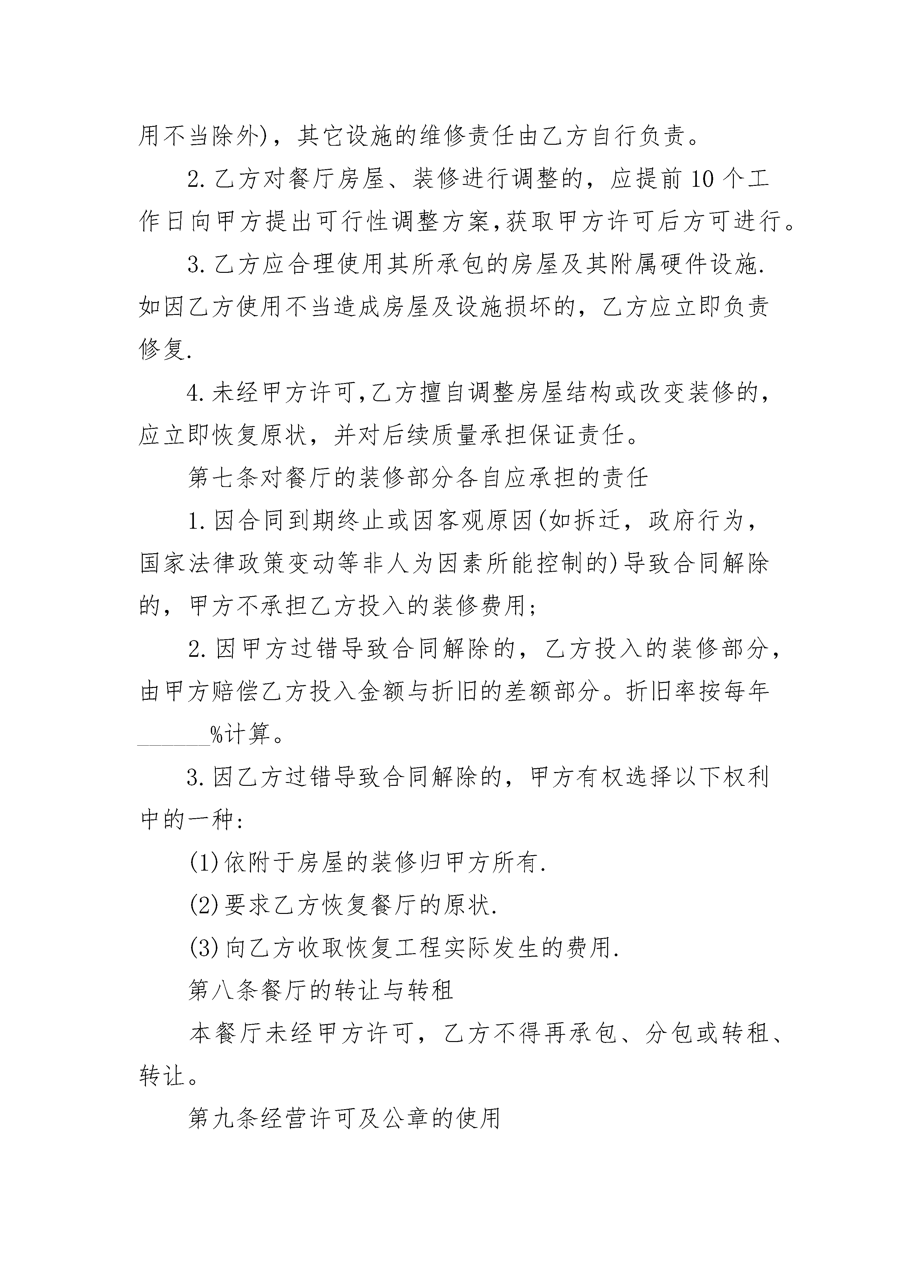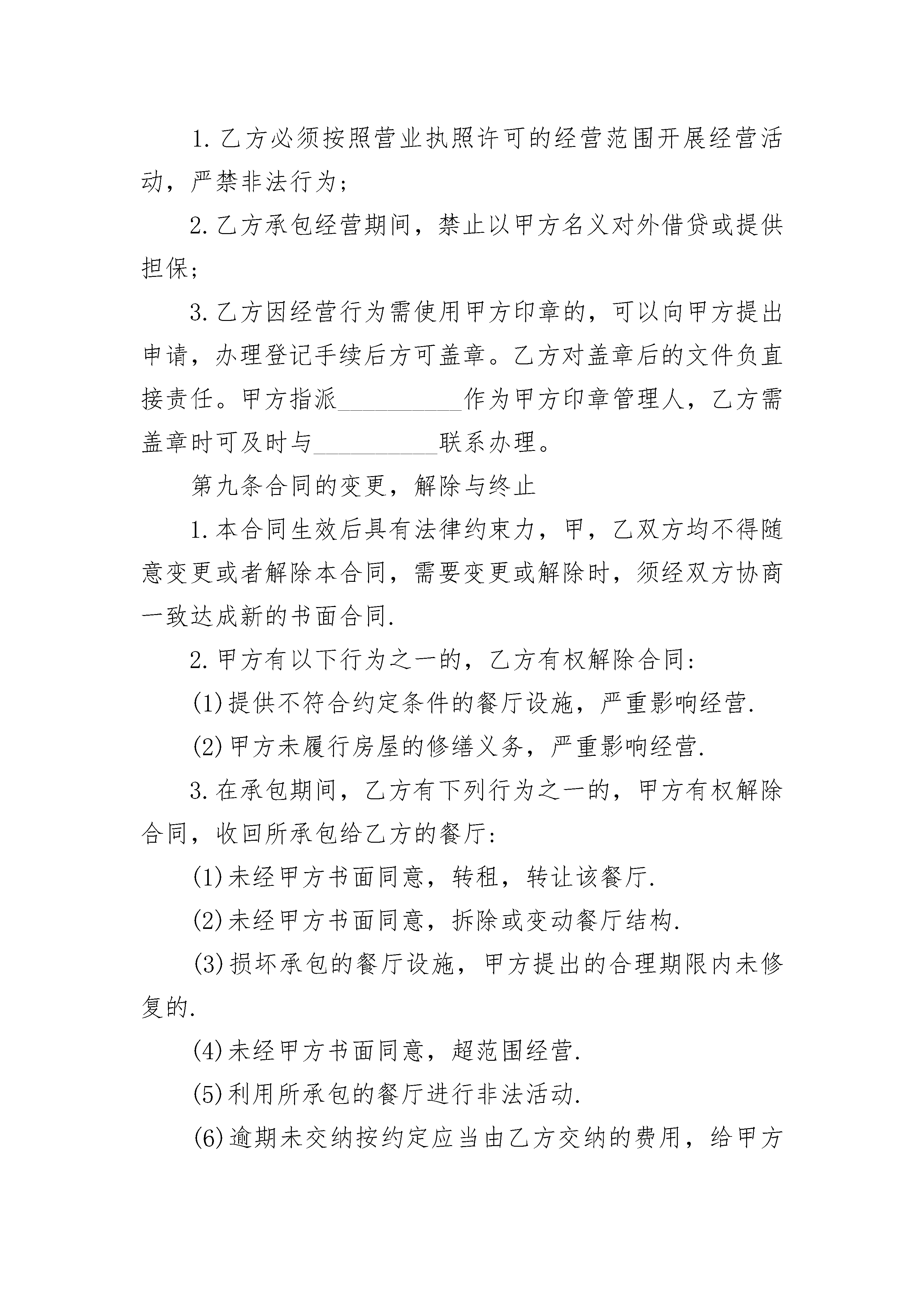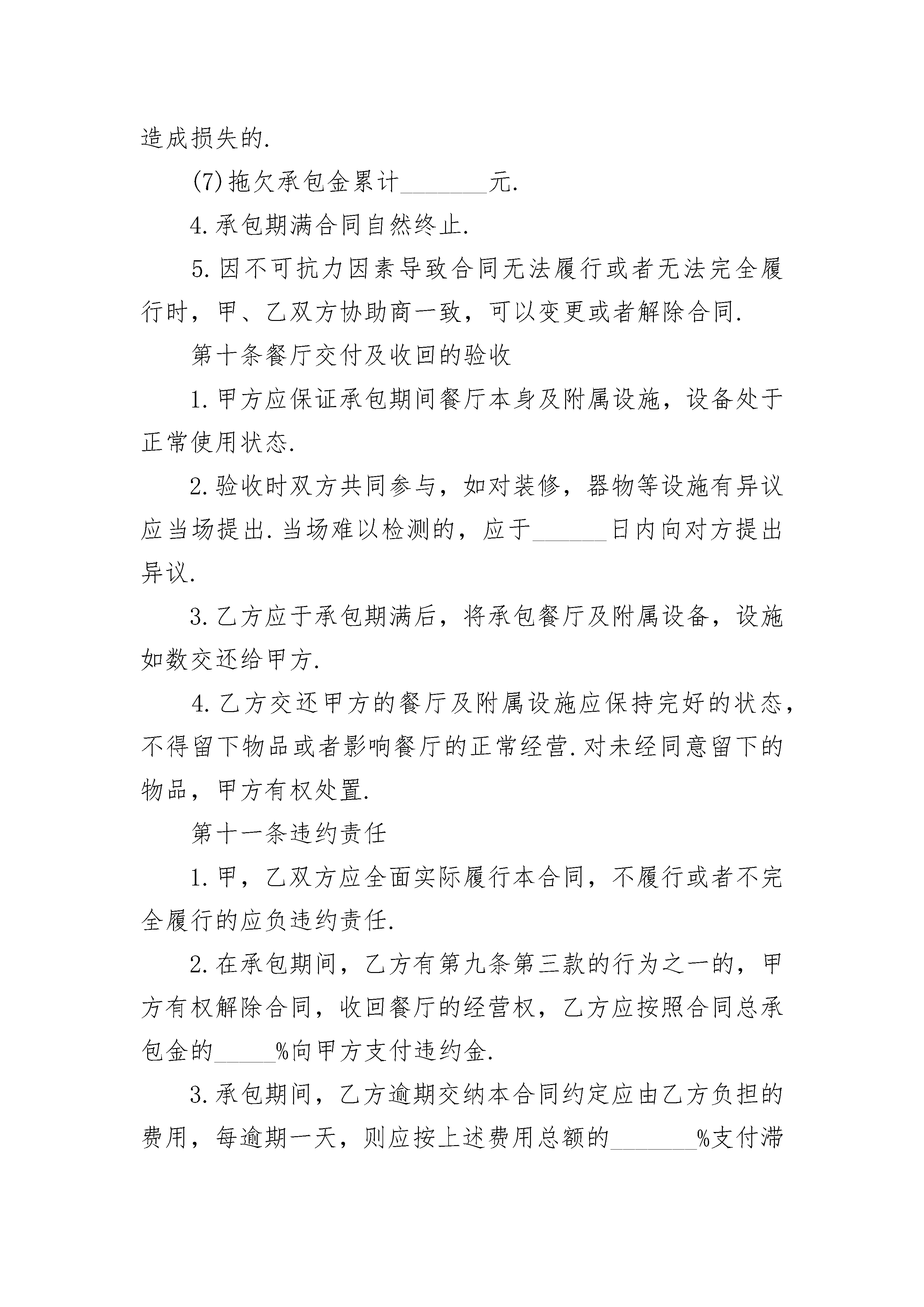 酒店承包合同酒店承包合同(通用20篇)酒店承包合同篇1发包方(甲方):南京兴嘉吉餐饮管理有限公司承包方(乙方):________________________针对南京市北京东路40-37号“兴嘉吉茶餐厅”承包经营事宜,双方根据《合同法》及有关法律法规,经协商一致,签订本合同.第一条乙方自愿承包经营南京市玄武区北京东路40-37号兴嘉吉茶餐厅(以下简称“餐厅”),该餐厅经营范围见营业执照.第二条餐厅的坐落,面积,装修,设施情况1.甲方承包给乙方的餐厅位于南京市北京东路40-37号;2.该餐厅现有装修及设施,设备情况详见合同附件;该附件作为甲方按照合同约定交付乙方使用和乙方在承包期满交还还给甲方时的验收依据。3.本合同签订后_______日内,甲乙双方共同对移交给乙方的餐厅的财产进行清点,确认。第三条承包期限,用途1.该餐厅承包期限共________年.自_____年_____月_____日至______年_____月______日止。2.承包期满,甲方有权收回该餐厅,乙方应如期交还。乙方如要求续承包,则必须在承包期满______个月之前书面通知甲方,经甲方同意后,重新签订承包合同。第四条承包金支付方式1.该餐厅年承包金为___________元(大写_____万_____仟_____佰_____拾______元整).2.承包金支付方式如下:A分二次付款,自本同生效后________天内付清,第一次应交承包金_____元;第二次到_______时止,需交_______元。B一次性付清,至本合同生效______天内全部缴清。第五条承包期间相关费用及税金1.甲方应承担的费用:(1)向房屋产权人缴纳的房屋租金。(2)非乙方原因产生的房屋维修费用。2.乙方承担以下费用:(1)本合同约定的承包金.(2)履约保证金,为年度承包金的_____%.保证金随承包金一同交付至甲方,合同解除或终止时由甲方无息退还乙方。(3)乙方承包经营期间因经营行为发生的费用,包括但不限于税费、水电费、物业费用、餐厨垃圾处理费、乙方雇佣人员的各项工资福利及社会保险费、房屋装修维护费用以及本合同其他条款约定的应当由乙方承担的费用等;(4)本合同未列明但应由乙方承担的费用。第六条餐厅房屋修缮与使用1.在承包期限内,甲方保证该房屋的使用安全(乙方使用不当除外),其它设施的维修责任由乙方自行负责。2.乙方对餐厅房屋、装修进行调整的,应提前10个工作日向甲方提出可行性调整方案,获取甲方许可后方可进行。3.乙方应合理使用其所承包的房屋及其附属硬件设施.如因乙方使用不当造成房屋及设施损坏的,乙方应立即负责修复.4.未经甲方许可,乙方擅自调整房屋结构或改变装修的,应立即恢复原状,并对后续质量承担保证责任。第七条对餐厅的装修部分各自应承担的责任1.因合同到期终止或因客观原因(如拆迁,政府行为,国家法律政策变动等非人为因素所能控制的)导致合同解除的,甲方不承担乙方投入的装修费用;2.因甲方过错导致合同解除的,乙方投入的装修部分,由甲方赔偿乙方投入金额与折旧的差额部分。折旧率按每年______%计算。3.因乙方过错导致合同解除的,甲方有权选择以下权利中的一种:(1)依附于房屋的装修归甲方所有.(2)要求乙方恢复餐厅的原状.(3)向乙方收取恢复工程实际发生的费用.第八条餐厅的转让与转租本餐厅未经甲方许可,乙方不得再承包、分包或转租、转让。第九条经营许可及公章的使用1.乙方必须按照营业执照许可的经营范围开展经营活动,严禁非法行为;2.乙方承包经营期间,禁止以甲方名义对外借贷或提供担保;3.乙方因经营行为需使用甲方印章的,可以向甲方提出申请,办理登记手续后方可盖章。乙方对盖章后的文件负直接责任。甲方指派__________作为甲方印章管理人,乙方需盖章时可及时与__________联系办理。第九条合同的变更,解除与终止1.本合同生效后具有法律约束力,甲,乙双方均不得随意变更或者解除本合同,需要变更或解除时,须经双方协商一致达成新的书面合同.2.甲方有以下行为之一的,乙方有权解除合同:(1)提供不符合约定条件的餐厅设施,严重影响经营.(2)甲方未履行房屋的修缮义务,严重影响经营.3.在承包期间,乙方有下列行为之一的,甲方有权解除合同,收回所承包给乙方的餐厅:(1)未经甲方书面同意,转租,转让该餐厅.(2)未经甲方书面同意,拆除或变动餐厅结构.(3)损坏承包的餐厅设施,甲方提出的合理期限内未修复的.(4)未经甲方书面同意,超范围经营.(5)利用所承包的餐厅进行非法活动.(6)逾期未交纳按约定应当由乙方交纳的费用,给甲方造成损失的.(7)拖欠承包金累计_______元.4.承包期满合同自然终止.5.因不可抗力因素导致合同无法履行或者无法完全履行时,甲、乙双方协助商一致,可以变更或者解除合同.第十