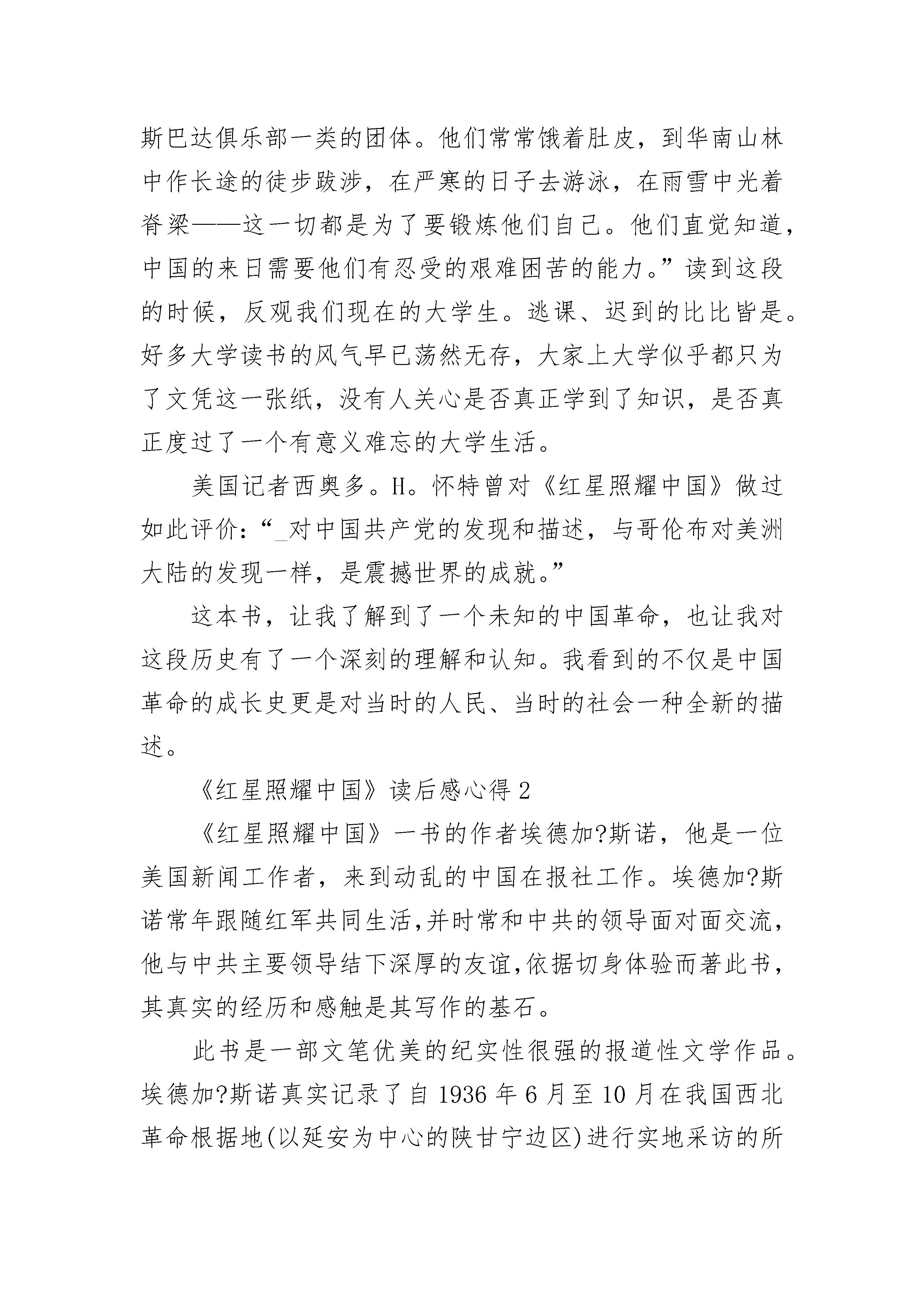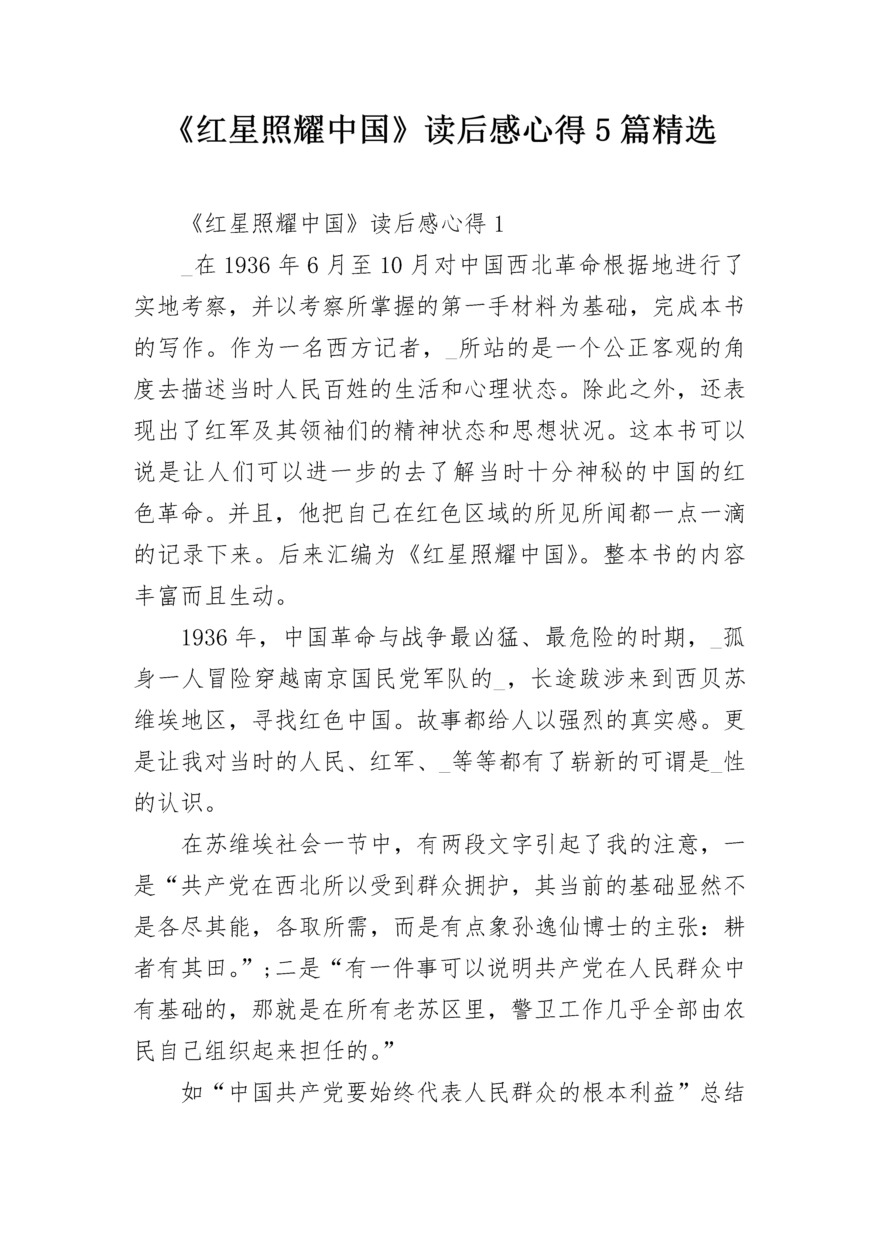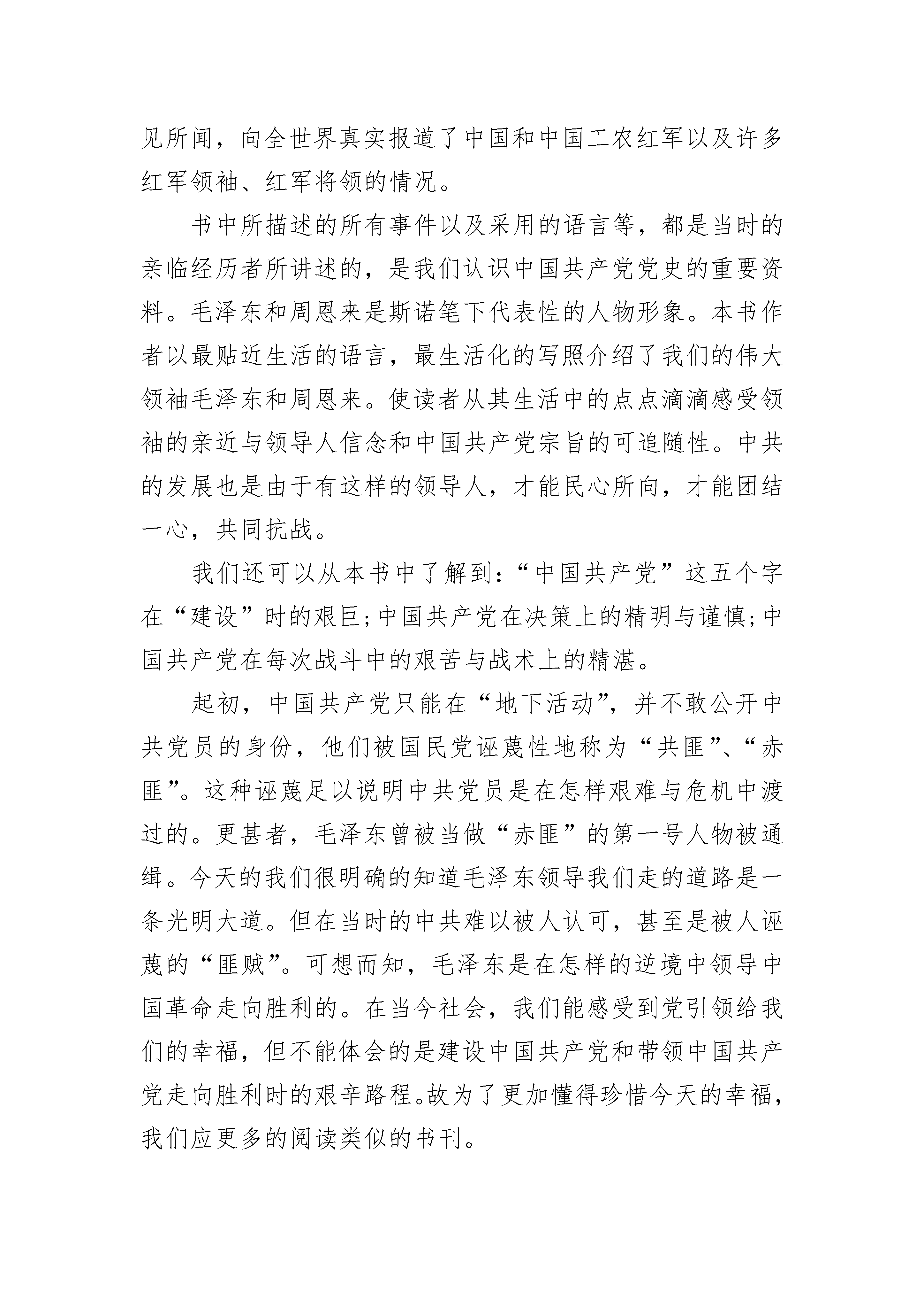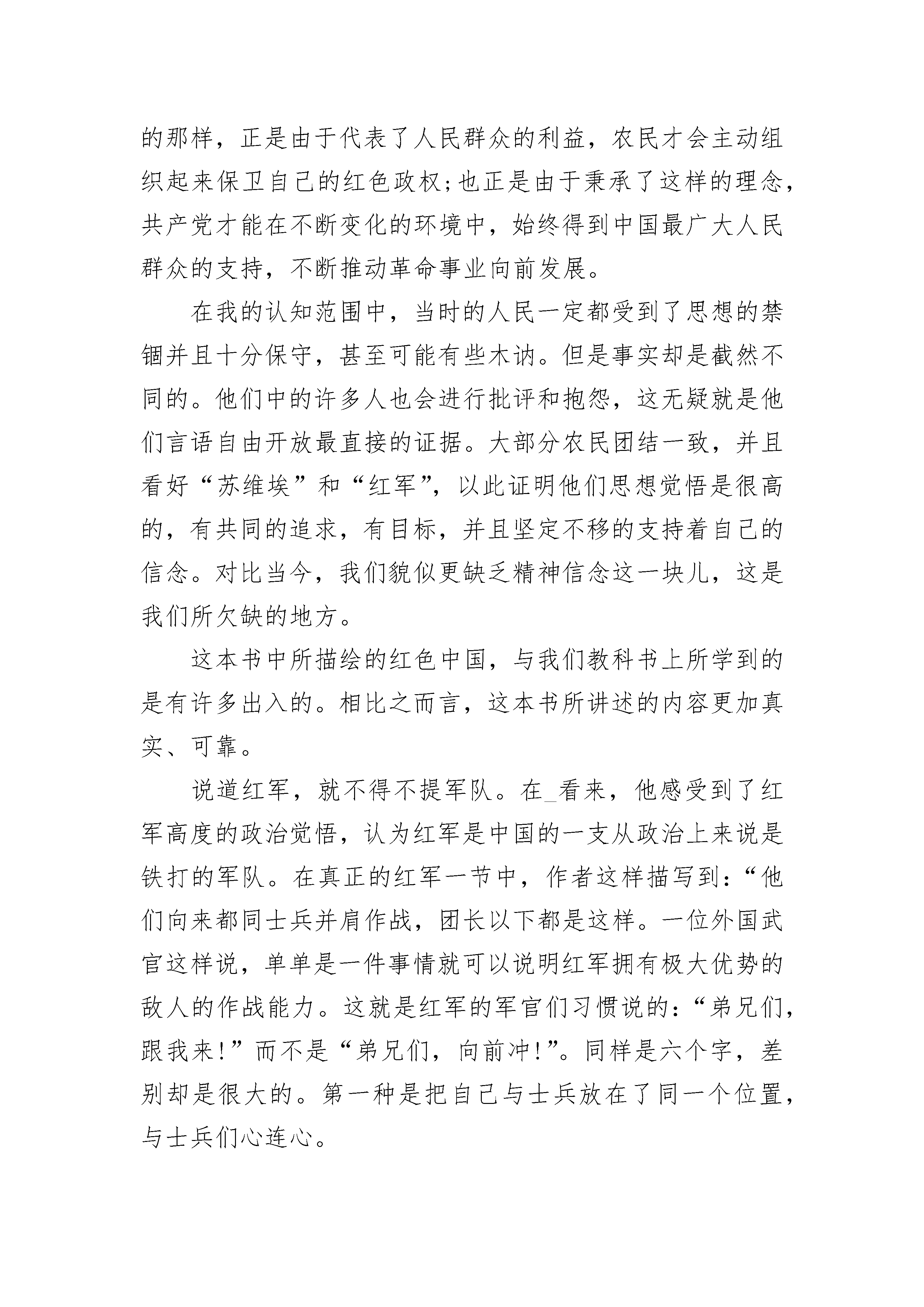 《红星照耀中国》读后感心得5篇精选《红星照耀中国》读后感心得1_在1936年6月至10月对中国西北革命根据地进行了实地考察,并以考察所掌握的第一手材料为基础,完成本书的写作。作为一名西方记者,_所站的是一个公正客观的角度去描述当时人民百姓的生活和心理状态。除此之外,还表现出了红军及其领袖们的精神状态和思想状况。这本书可以说是让人们可以进一步的去了解当时十分神秘的中国的红色革命。并且,他把自己在红色区域的所见所闻都一点一滴的记录下来。后来汇编为《红星照耀中国》。整本书的内容丰富而且生动。1936年,中国革命与战争最凶猛、最危险的时期,_孤身一人冒险穿越南京国民党军队的_,长途跋涉来到西贝苏维埃地区,寻找红色中国。故事都给人以强烈的真实感。更是让我对当时的人民、红军、_等等都有了崭新的可谓是_性的认识。在苏维埃社会一节中,有两段文字引起了我的注意,一是“共产党在西北所以受到群众拥护,其当前的基础显然不是各尽其能,各取所需,而是有点象孙逸仙博士的主张:耕者有其田。”;二是“有一件事可以说明共产党在人民群众中有基础的,那就是在所有老苏区里,警卫工作几乎全部由农民自己组织起来担任的。”如“中国共产党要始终代表人民群众的根本利益”总结的那样,正是由于代表了人民群众的利益,农民才会主动组织起来保卫自己的红色政权;也正是由于秉承了这样的理念,共产党才能在不断变化的环境中,始终得到中国最广大人民群众的支持,不断推动革命事业向前发展。在我的认知范围中,当时的人民一定都受到了思想的禁锢并且十分保守,甚至可能有些木讷。但是事实却是截然不同的。他们中的许多人也会进行批评和抱怨,这无疑就是他们言语自由开放最直接的证据。大部分农民团结一致,并且看好“苏维埃”和“红军”,以此证明他们思想觉悟是很高的,有共同的追求,有目标,并且坚定不移的支持着自己的信念。对比当今,我们貌似更缺乏精神信念这一块儿,这是我们所欠缺的地方。这本书中所描绘的红色中国,与我们教科书上所学到的是有许多出入的。相比之而言,这本书所讲述的内容更加真实、可靠。说道红军,就不得不提军队。在_看来,他感受到了红军高度的政治觉悟,认为红军是中国的一支从政治上来说是铁打的军队。在真正的红军一节中,作者这样描写到:“他们向来都同士兵并肩作战,团长以下都是这样。一位外国武官这样说,单单是一件事情就可以说明红军拥有极大优势的敌人的作战能力。这就是红军的军官们习惯说的:“弟兄们,跟我来!”而不是“弟兄们,向前冲!”。同样是六个字,差别却是很大的。第一种是把自己与士兵放在了同一个位置,与士兵们心连心。提到红军,另一个比提的就是长征了。电视里所演的长征真的是惊心动魄、惊险万分。红军通过各种巧妙的战术突破敌人的重重围堵,摆脱危险困境。无论是四度赤水河、勇夺泸定桥、飞度金沙江等等都显示了红军的有勇有谋。当时,当他们面对一些少数民族的人民时,当当地人民对他们闻所未闻,他们仍旧是勇往直前,他们的功绩、作为都帮助他们赢得了少数民族的友谊,甚至是吸引了一部分人来参军。这足以证明了中国红军在人民中的威望和感召力。红军的二万五千里长征是历一次大规模的战略转移,是一次武装巡回宣传,是一个奇迹。它体现了共产党强大的精神世界,非凡的心里素质,而这些也仅仅占了全书的一小部分。也可以说,红军的长征也仅仅占了中国革命的一小部分。提到书中关于领袖的描述,就不得不说_对_的描述中这样写道:“不可否认,你觉得他身上有一种天命的力量。你觉得这个人身上不论有什么异乎寻常的地方,都是产生于他对中国人民大众特别是农民——这些占中国人口绝大多数的贫穷饥饿、受剥削、不识字但又宽厚大度、勇敢无畏,如今还敢于造反的人们——迫切要求做了综合表述,达到了不可思议的程度。”_的经历是本书的一大重点,这在相当程度上也是一个中国革命的故事。_写到“_每天工作十三、四个小时,常常到深夜二、三点钟才休息。他的身体仿佛是铁打的。他认为这要归因于他的少年时代在父亲的田里干过苦活,要归因于他在学校读书的刻苦时期,当时他与几个志同道合的人组成斯巴达俱乐部一类的团体。他们常常饿着肚皮,到华南山林中作长途的徒步跋涉,在严寒的日子去游泳,在雨雪中光着脊梁——这一切都是为了要锻炼他们自己。他们直觉知道,中国的来日需要他们有忍受的艰难困苦的能力。”读到这段的时候,反观我们现在的大学生。逃课、迟到的比比皆是。好多大学读书的风气早已荡然无存,大家上大学似乎都只为了文凭这一张纸,没有人关心是否真正学到了知识,是否真正度过了一个有意义难忘的大学生活。美国记者西奥多。H。怀特曾对《红星照耀中国》做过如此评价:“_对中国共产党的发现和描述,与哥伦布对美洲大陆的发现一样,是震撼世界的成就。”这本书,让我了解到了一个未知的中国革命,也让我对这段历史有了一个深刻的理解和认知。我看到的不仅是中国革命的成长史更