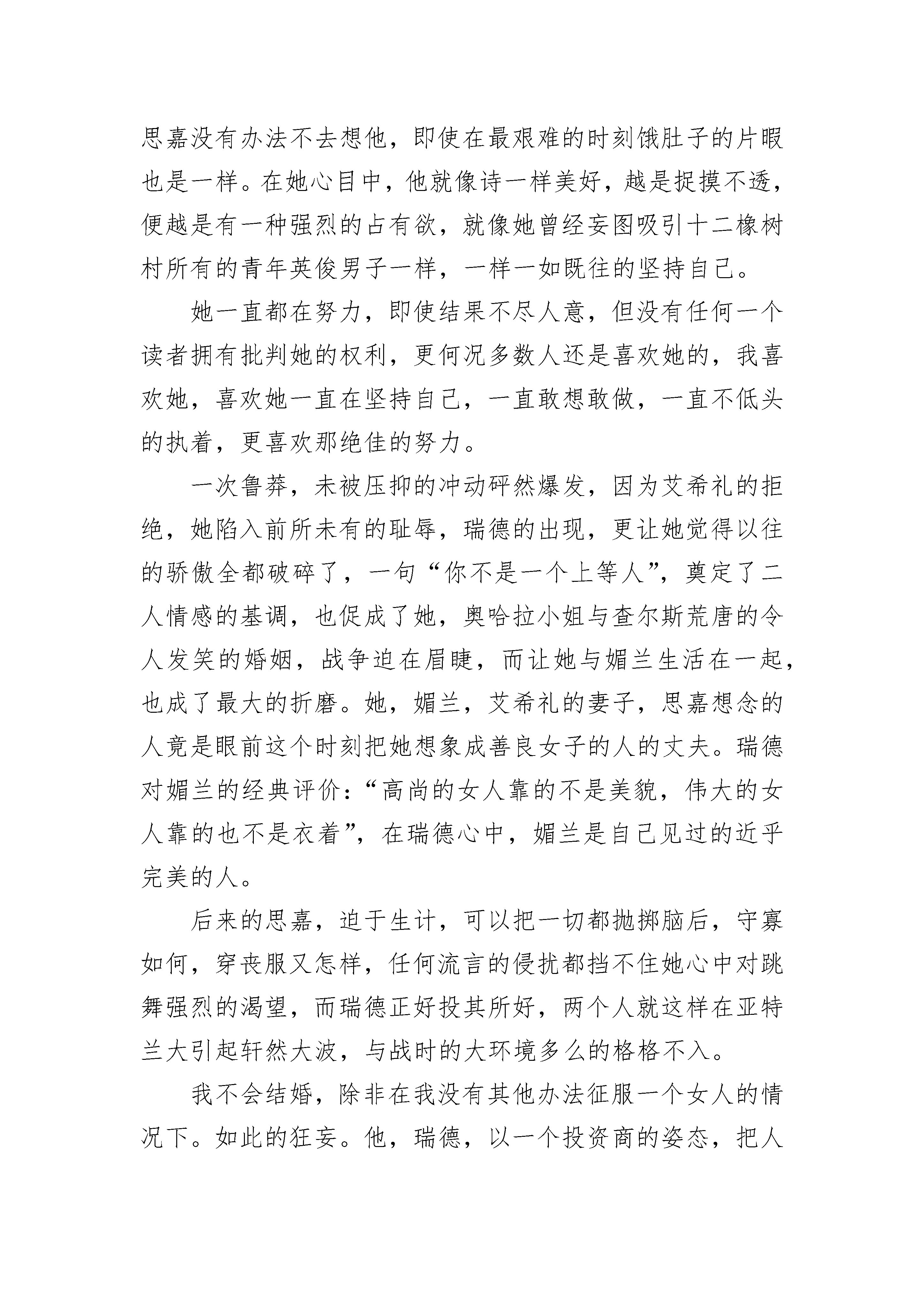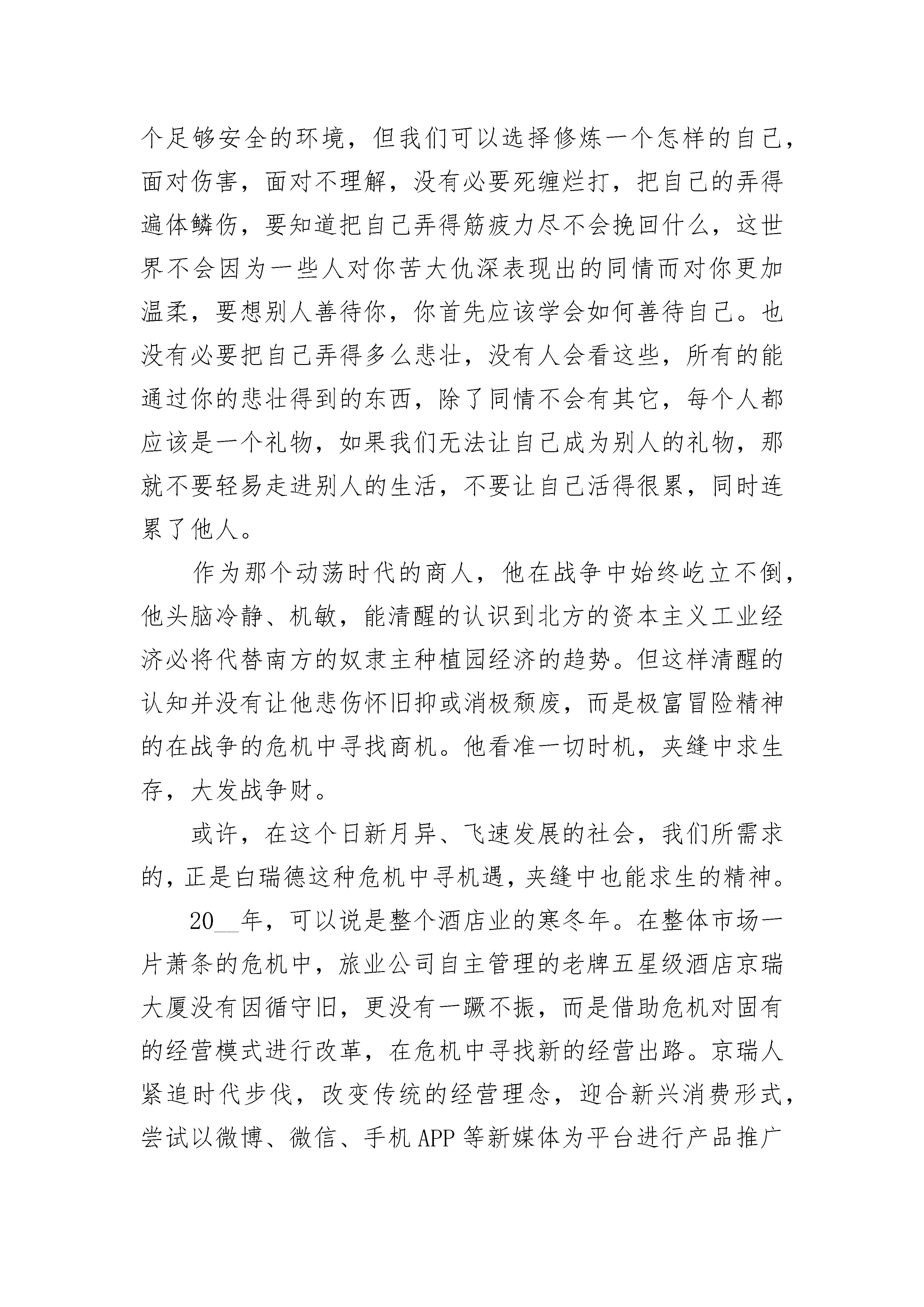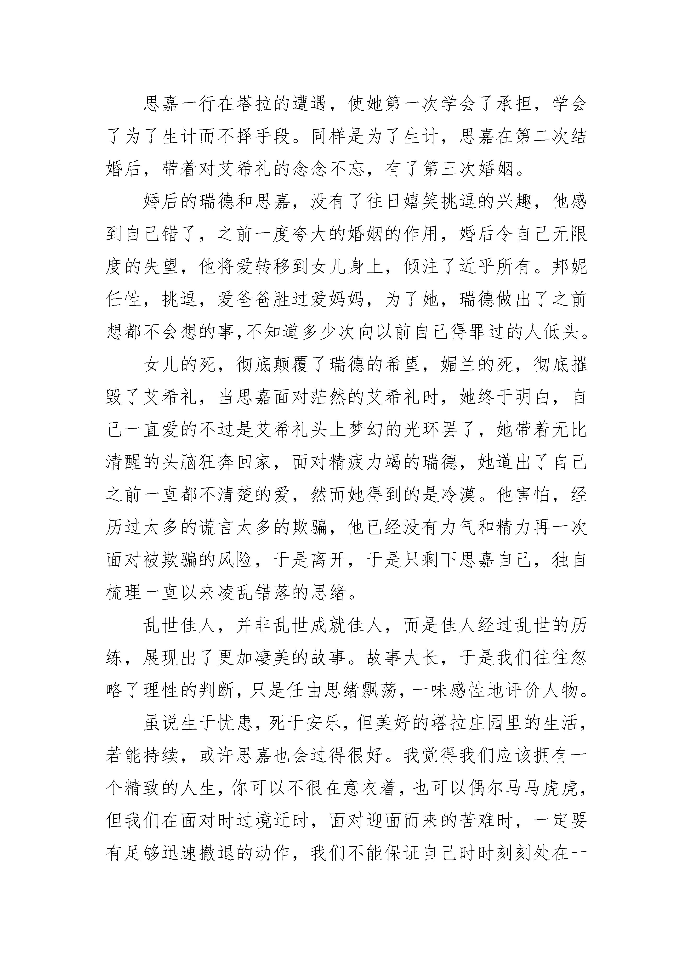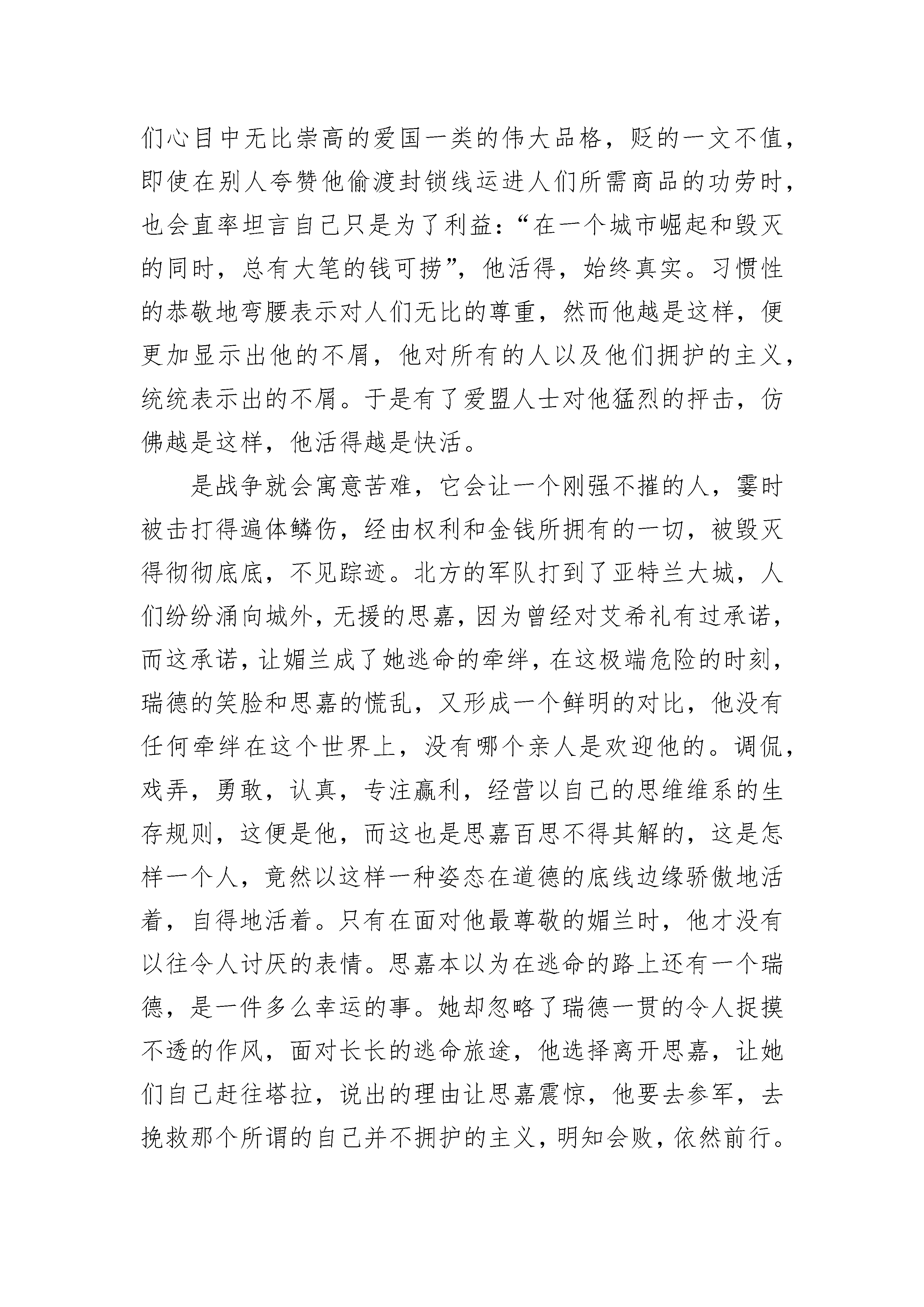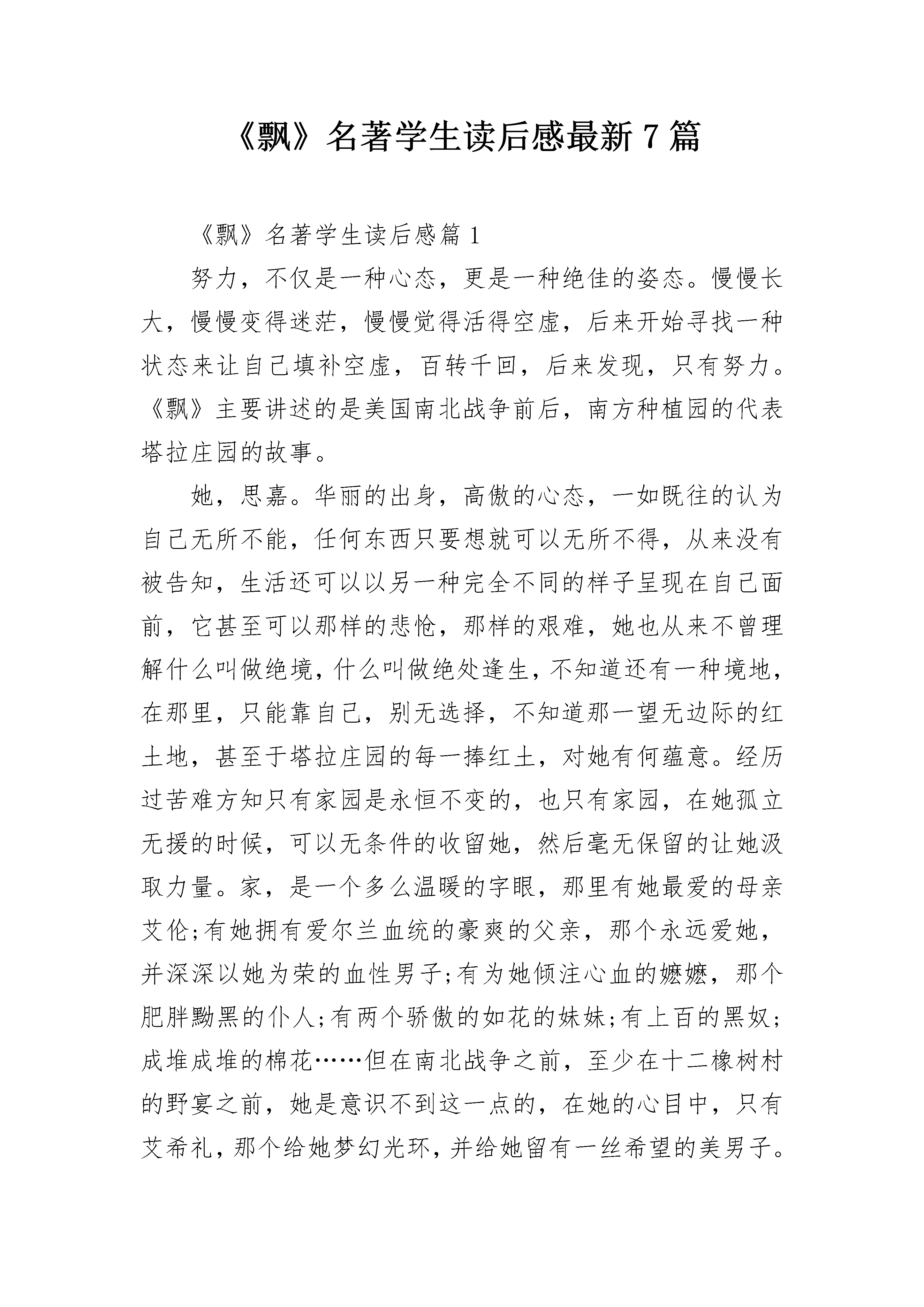 《飘》名著学生读后感最新7篇《飘》名著学生读后感篇1努力,不仅是一种心态,更是一种绝佳的姿态。慢慢长大,慢慢变得迷茫,慢慢觉得活得空虚,后来开始寻找一种状态来让自己填补空虚,百转千回,后来发现,只有努力。《飘》主要讲述的是美国南北战争前后,南方种植园的代表塔拉庄园的故事。她,思嘉。华丽的出身,高傲的心态,一如既往的认为自己无所不能,任何东西只要想就可以无所不得,从来没有被告知,生活还可以以另一种完全不同的样子呈现在自己面前,它甚至可以那样的悲怆,那样的艰难,她也从来不曾理解什么叫做绝境,什么叫做绝处逢生,不知道还有一种境地,在那里,只能靠自己,别无选择,不知道那一望无边际的红土地,甚至于塔拉庄园的每一捧红土,对她有何蕴意。经历过苦难方知只有家园是永恒不变的,也只有家园,在她孤立无援的时候,可以无条件的收留她,然后毫无保留的让她汲取力量。家,是一个多么温暖的字眼,那里有她最爱的母亲艾伦;有她拥有爱尔兰血统的豪爽的父亲,那个永远爱她,并深深以她为荣的血性男子;有为她倾注心血的嬷嬷,那个肥胖黝黑的仆人;有两个骄傲的如花的妹妹;有上百的黑奴;成堆成堆的棉花……但在南北战争之前,至少在十二橡树村的野宴之前,她是意识不到这一点的,在她的心目中,只有艾希礼,那个给她梦幻光环,并给她留有一丝希望的美男子。思嘉没有办法不去想他,即使在最艰难的时刻饿肚子的片暇也是一样。在她心目中,他就像诗一样美好,越是捉摸不透,便越是有一种强烈的占有欲,就像她曾经妄图吸引十二橡树村所有的青年英俊男子一样,一样一如既往的坚持自己。她一直都在努力,即使结果不尽人意,但没有任何一个读者拥有批判她的权利,更何况多数人还是喜欢她的,我喜欢她,喜欢她一直在坚持自己,一直敢想敢做,一直不低头的执着,更喜欢那绝佳的努力。一次鲁莽,未被压抑的冲动砰然爆发,因为艾希礼的拒绝,她陷入前所未有的耻辱,瑞德的出现,更让她觉得以往的骄傲全都破碎了,一句“你不是一个上等人”,奠定了二人情感的基调,也促成了她,奥哈拉小姐与查尔斯荒唐的令人发笑的婚姻,战争迫在眉睫,而让她与媚兰生活在一起,也成了最大的折磨。她,媚兰,艾希礼的妻子,思嘉想念的人竟是眼前这个时刻把她想象成善良女子的人的丈夫。瑞德对媚兰的经典评价:“高尚的女人靠的不是美貌,伟大的女人靠的也不是衣着”,在瑞德心中,媚兰是自己见过的近乎完美的人。后来的思嘉,迫于生计,可以把一切都抛掷脑后,守寡如何,穿丧服又怎样,任何流言的侵扰都挡不住她心中对跳舞强烈的渴望,而瑞德正好投其所好,两个人就这样在亚特兰大引起轩然大波,与战时的大环境多么的格格不入。我不会结婚,除非在我没有其他办法征服一个女人的情况下。如此的狂妄。他,瑞德,以一个投资商的姿态,把人们心目中无比崇高的爱国一类的伟大品格,贬的一文不值,即使在别人夸赞他偷渡封锁线运进人们所需商品的功劳时,也会直率坦言自己只是为了利益:“在一个城市崛起和毁灭的同时,总有大笔的钱可捞”,他活得,始终真实。习惯性的恭敬地弯腰表示对人们无比的尊重,然而他越是这样,便更加显示出他的不屑,他对所有的人以及他们拥护的主义,统统表示出的不屑。于是有了爱盟人士对他猛烈的抨击,仿佛越是这样,他活得越是快活。是战争就会寓意苦难,它会让一个刚强不摧的人,霎时被击打得遍体鳞伤,经由权利和金钱所拥有的一切,被毁灭得彻彻底底,不见踪迹。北方的军队打到了亚特兰大城,人们纷纷涌向城外,无援的思嘉,因为曾经对艾希礼有过承诺,而这承诺,让媚兰成了她逃命的牵绊,在这极端危险的时刻,瑞德的笑脸和思嘉的慌乱,又形成一个鲜明的对比,他没有任何牵绊在这个世界上,没有哪个亲人是欢迎他的。调侃,戏弄,勇敢,认真,专注赢利,经营以自己的思维维系的生存规则,这便是他,而这也是思嘉百思不得其解的,这是怎样一个人,竟然以这样一种姿态在道德的底线边缘骄傲地活着,自得地活着。只有在面对他最尊敬的媚兰时,他才没有以往令人讨厌的表情。思嘉本以为在逃命的路上还有一个瑞德,是一件多么幸运的事。她却忽略了瑞德一贯的令人捉摸不透的作风,面对长长的逃命旅途,他选择离开思嘉,让她们自己赶往塔拉,说出的理由让思嘉震惊,他要去参军,去挽救那个所谓的自己并不拥护的主义,明知会败,依然前行。思嘉一行在塔拉的遭遇,使她第一次学会了承担,学会了为了生计而不择手段。同样是为了生计,思嘉在第二次结婚后,带着对艾希礼的念念不忘,有了第三次婚姻。婚后的瑞德和思嘉,没有了往日嬉笑挑逗的兴趣,他感到自己错了,之前一度夸大的婚姻的作用,婚后令自己无限度的失望,他将爱转移到女儿身上,倾注了近乎所有。邦妮任性,挑逗,爱爸爸胜过爱妈妈,为了她,瑞德做出了之前想都不会想的事,不知道多少次向以前自己得罪过的人低头。女儿的死,彻底颠覆了瑞德的希望,媚兰的死,彻底摧毁了艾希礼,当思嘉面对茫然的艾希礼时,她终于明白,