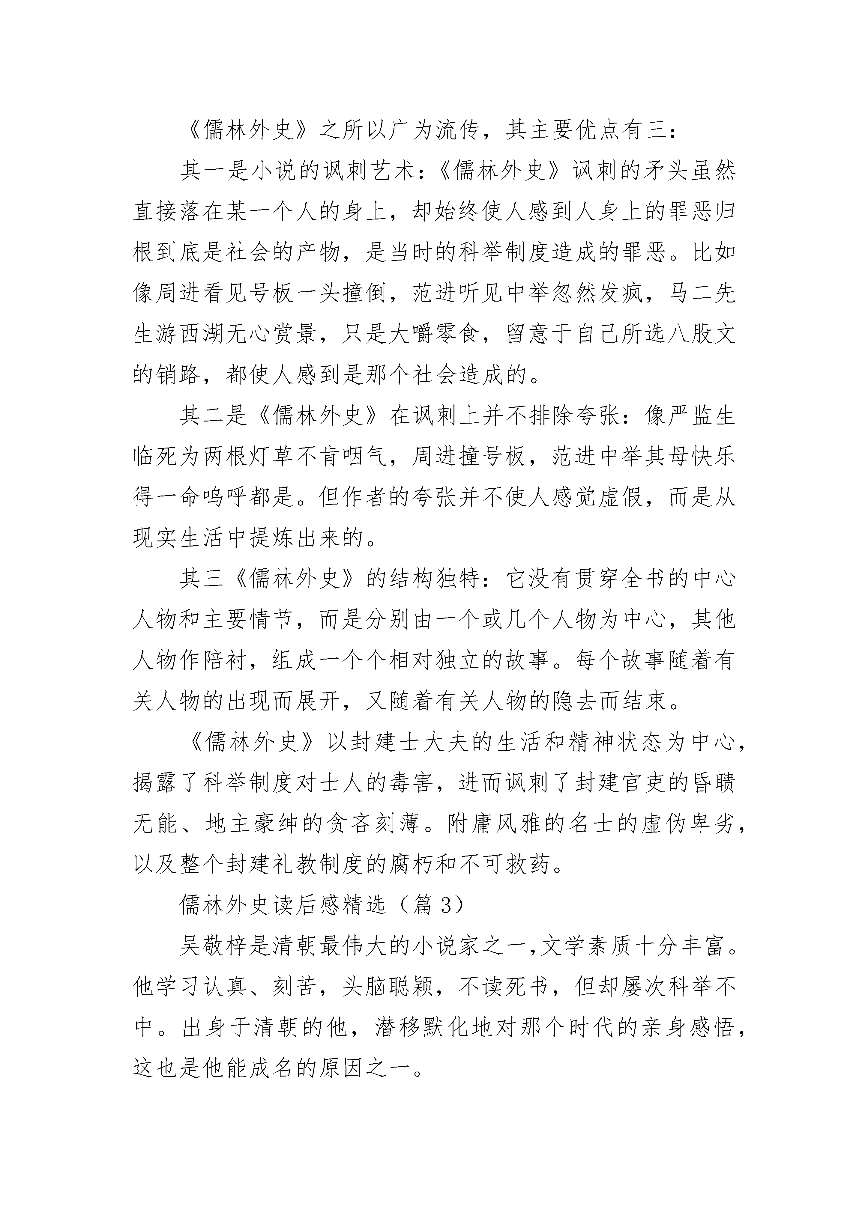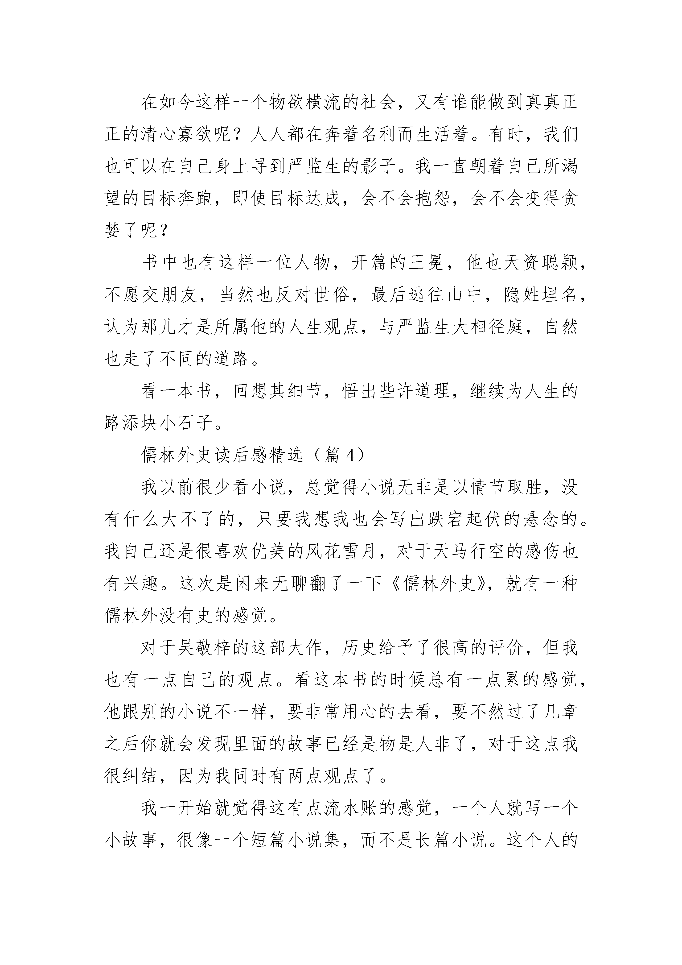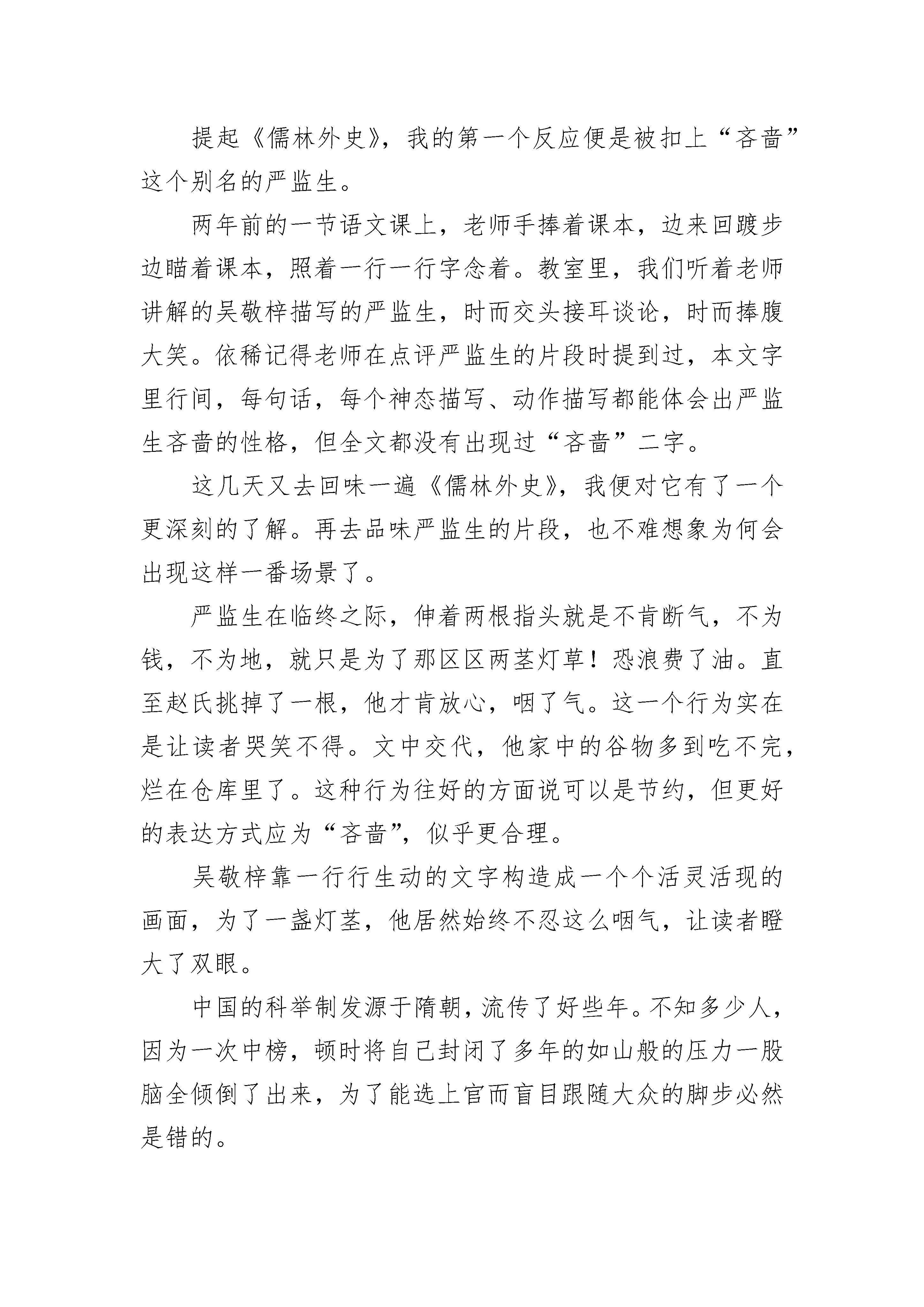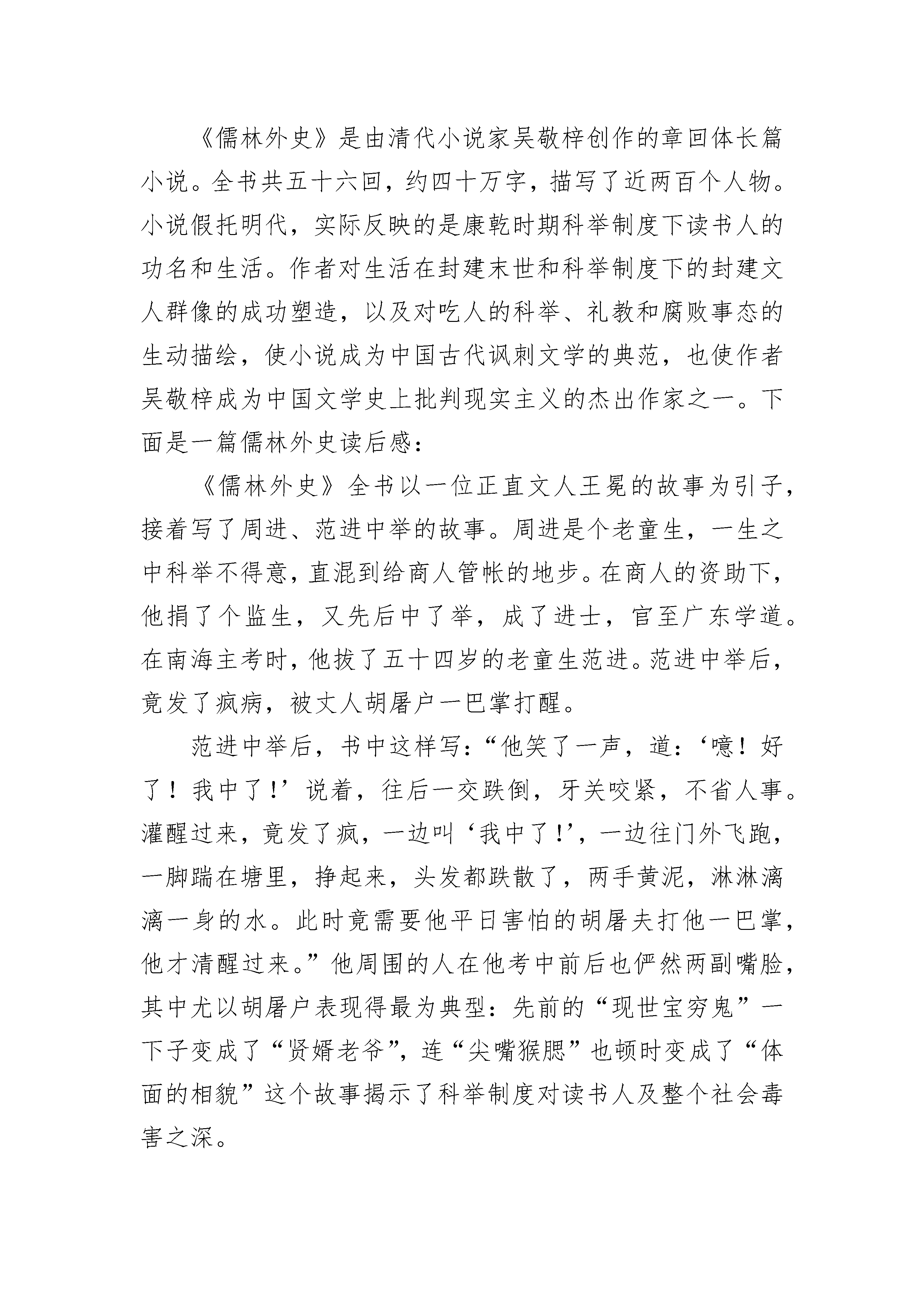 儒林外史读后感精选8篇儒林外史读后感精选(篇1)在暑假里,我读了《儒林外史》这本书。《儒林外史》是我国一部著名的古典长篇小说,它通过生动的艺术形象,反映了封建社会末期腐朽黑暗的社会现实,批判了八股科举制度,揭露了反动统治的罪恶和虚伪。小说的作者运用了周进和范进等生动的艺术形象,还运用了多种排比,比喻等的修辞手法,他用辛辣的笔触,揭露了一群统治者的腐朽和虚伪。集中概括,典型地再现了生活的真实,揭示了他们的不合理,可笑,可鄙,甚至于可恶。我读了这本书,我体会到:我们长大后,不能想书里的这些贪官一样,收取钱财,帮人做事,也不能整天游手好闲,要努力工作。我们要想飞将萧云仙一样,为国家奋斗,要与时俱进,科教兴国!自己要清正廉洁,公私分明,以身作则。我们现在要努力学习,将来为祖国出力!我还通过作者的修辞手法和好词好句中体会到:文学可以让我们陶冶情操,加强修养,使我们成长道路上充满阳光,并且使我们成长道路上充满阳光,并且滋润我们的心灵。文学是比鸟飞的还远的梦想,比花开得还美的情感,比星闪得还量的智慧,是我们到了一百岁还忘不掉的信念。文学可以丰富我们课余生活的同时提高文学功底,锻炼文字驾驭能力,使我们更聪明。儒林外史读后感精选(篇2)《儒林外史》是由清代小说家吴敬梓创作的章回体长篇小说。全书共五十六回,约四十万字,描写了近两百个人物。小说假托明代,实际反映的是康乾时期科举制度下读书人的功名和生活。作者对生活在封建末世和科举制度下的封建文人群像的成功塑造,以及对吃人的科举、礼教和腐败事态的生动描绘,使小说成为中国古代讽刺文学的典范,也使作者吴敬梓成为中国文学史上批判现实主义的杰出作家之一。下面是一篇儒林外史读后感:《儒林外史》全书以一位正直文人王冕的故事为引子,接着写了周进、范进中举的故事。周进是个老童生,一生之中科举不得意,直混到给商人管帐的地步。在商人的资助下,他捐了个监生,又先后中了举,成了进士,官至广东学道。在南海主考时,他拔了五十四岁的老童生范进。范进中举后,竟发了疯病,被丈人胡屠户一巴掌打醒。范进中举后,书中这样写:“他笑了一声,道:‘噫!好了!我中了!’说着,往后一交跌倒,牙关咬紧,不省人事。灌醒过来,竟发了疯,一边叫‘我中了!’,一边往门外飞跑,一脚踹在塘里,挣起来,头发都跌散了,两手黄泥,淋淋漓漓一身的水。此时竟需要他平日害怕的胡屠夫打他一巴掌,他才清醒过来。”他周围的人在他考中前后也俨然两副嘴脸,其中尤以胡屠户表现得最为典型:先前的“现世宝穷鬼”一下子变成了“贤婿老爷”,连“尖嘴猴腮”也顿时变成了“体面的相貌”这个故事揭示了科举制度对读书人及整个社会毒害之深。《儒林外史》之所以广为流传,其主要优点有三:其一是小说的讽刺艺术:《儒林外史》讽刺的矛头虽然直接落在某一个人的身上,却始终使人感到人身上的罪恶归根到底是社会的产物,是当时的科举制度造成的罪恶。比如像周进看见号板一头撞倒,范进听见中举忽然发疯,马二先生游西湖无心赏景,只是大嚼零食,留意于自己所选八股文的销路,都使人感到是那个社会造成的。其二是《儒林外史》在讽刺上并不排除夸张:像严监生临死为两根灯草不肯咽气,周进撞号板,范进中举其母快乐得一命呜呼都是。但作者的夸张并不使人感觉虚假,而是从现实生活中提炼出来的。其三《儒林外史》的结构独特:它没有贯穿全书的中心人物和主要情节,而是分别由一个或几个人物为中心,其他人物作陪衬,组成一个个相对独立的故事。每个故事随着有关人物的出现而展开,又随着有关人物的隐去而结束。《儒林外史》以封建士大夫的生活和精神状态为中心,揭露了科举制度对士人的毒害,进而讽刺了封建官吏的昏聩无能、地主豪绅的贪吝刻薄。附庸风雅的名士的虚伪卑劣,以及整个封建礼教制度的腐朽和不可救药。儒林外史读后感精选(篇3)吴敬梓是清朝最伟大的小说家之一,文学素质十分丰富。他学习认真、刻苦,头脑聪颖,不读死书,但却屡次科举不中。出身于清朝的他,潜移默化地对那个时代的亲身感悟,这也是他能成名的原因之一。提起《儒林外史》,我的第一个反应便是被扣上“吝啬”这个别名的严监生。两年前的一节语文课上,老师手捧着课本,边来回踱步边瞄着课本,照着一行一行字念着。教室里,我们听着老师讲解的吴敬梓描写的严监生,时而交头接耳谈论,时而捧腹大笑。依稀记得老师在点评严监生的片段时提到过,本文字里行间,每句话,每个神态描写、动作描写都能体会出严监生吝啬的性格,但全文都没有出现过“吝啬”二字。这几天又去回味一遍《儒林外史》,我便对它有了一个更深刻的了解。再去品味严监生的片段,也不难想象为何会出现这样一番场景了。严监生在临终之际,伸着两根指头就是不肯断气,不为钱,不为地,就只是为了那区区两茎灯草!恐浪费了油。直至赵氏挑掉了一根,他才肯放心,咽了气。这一个行为实在是让读者哭笑不得。文中交代,他家中的谷物多到吃不