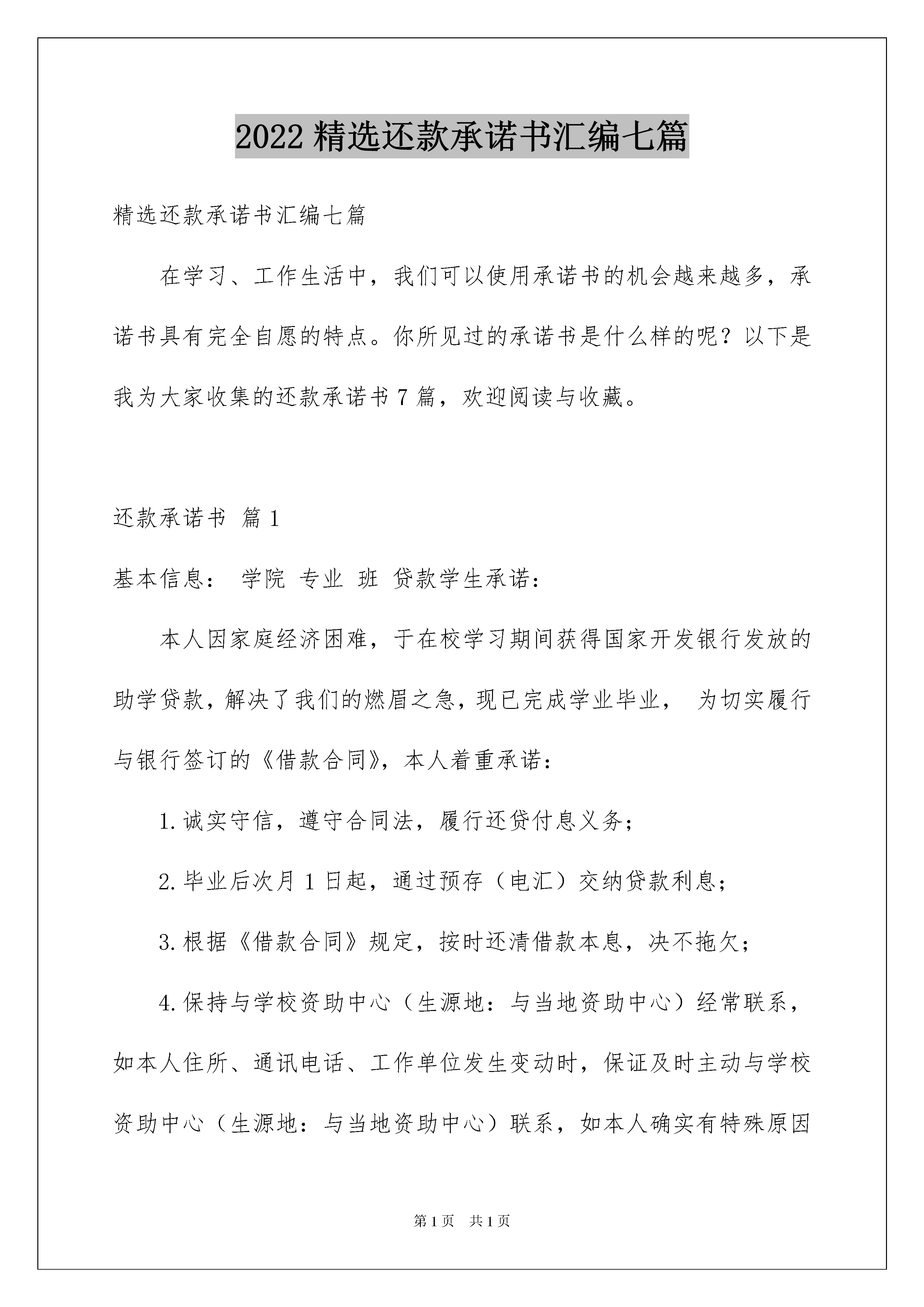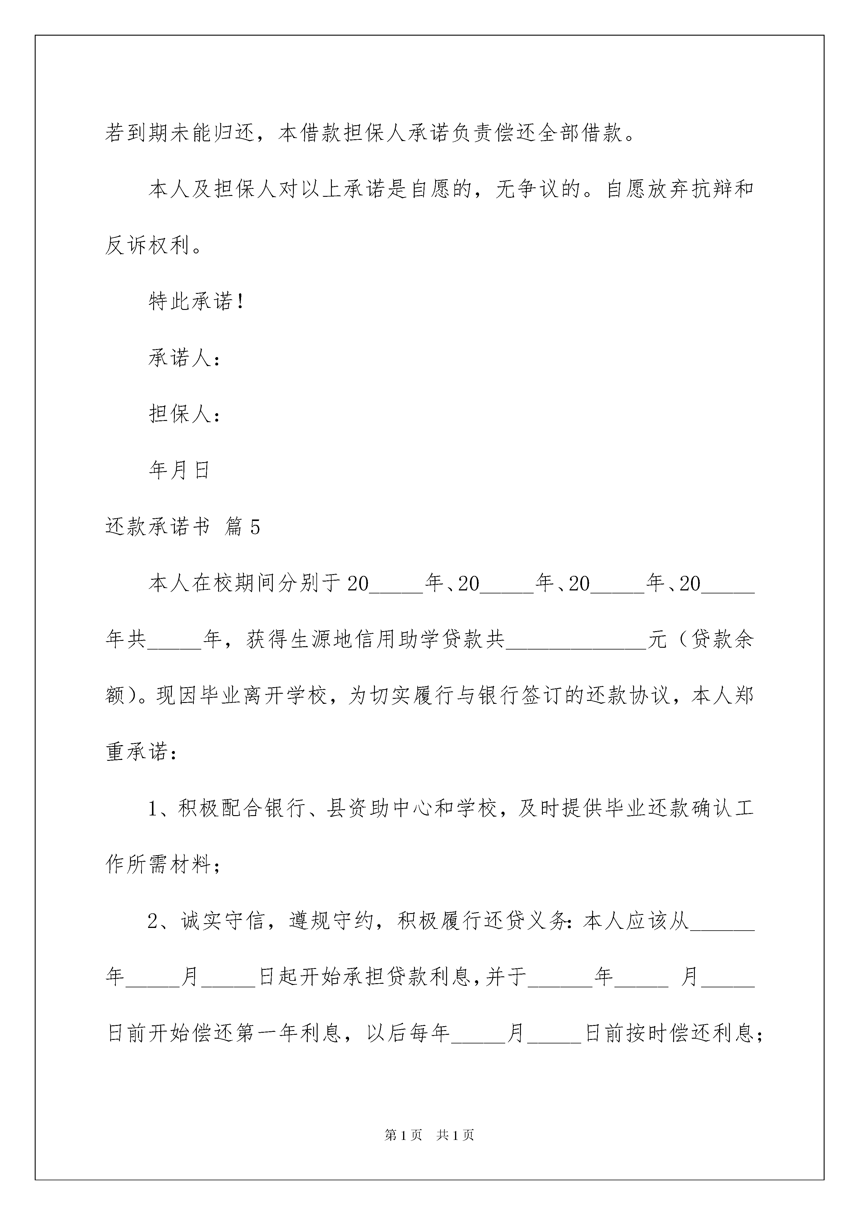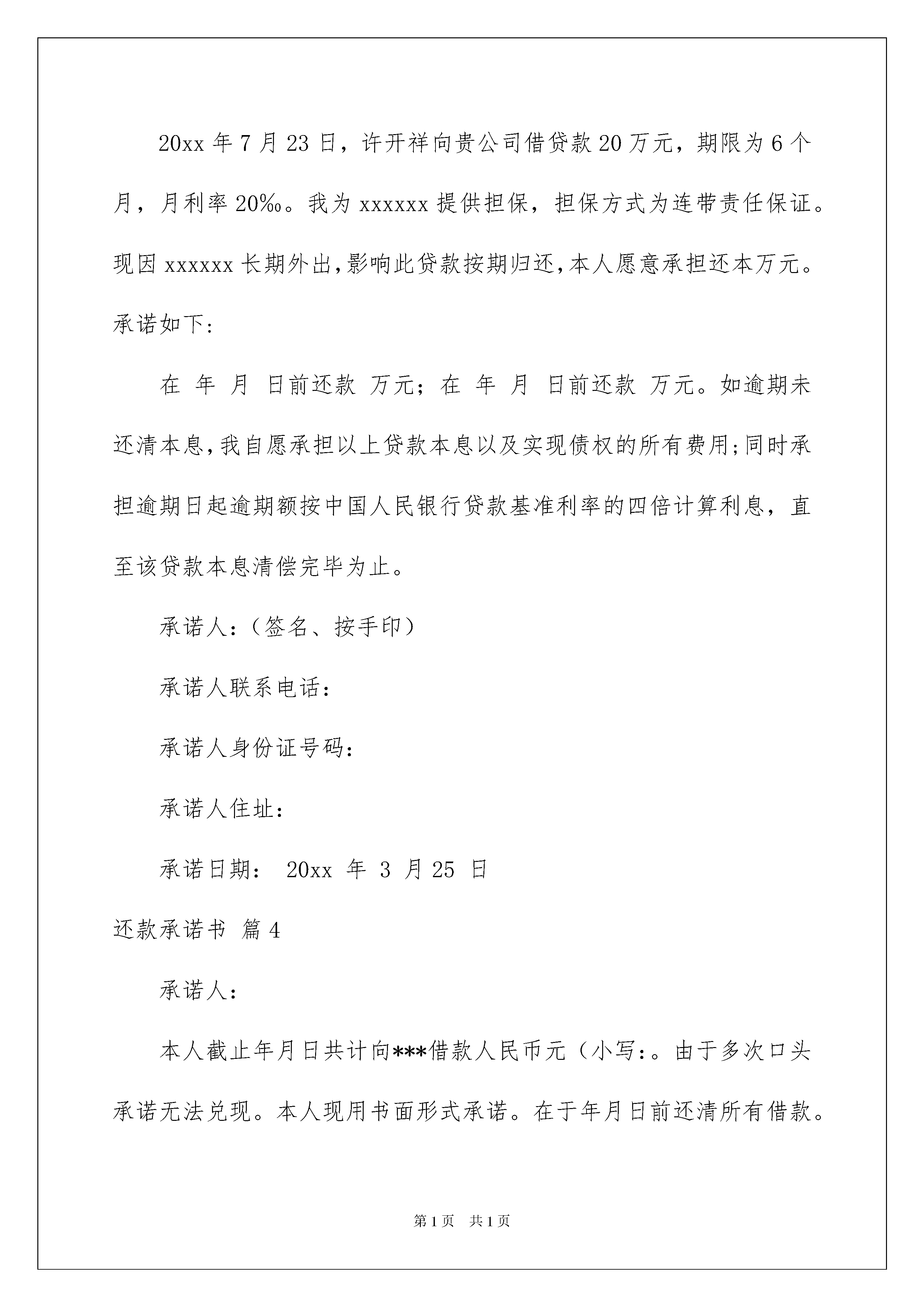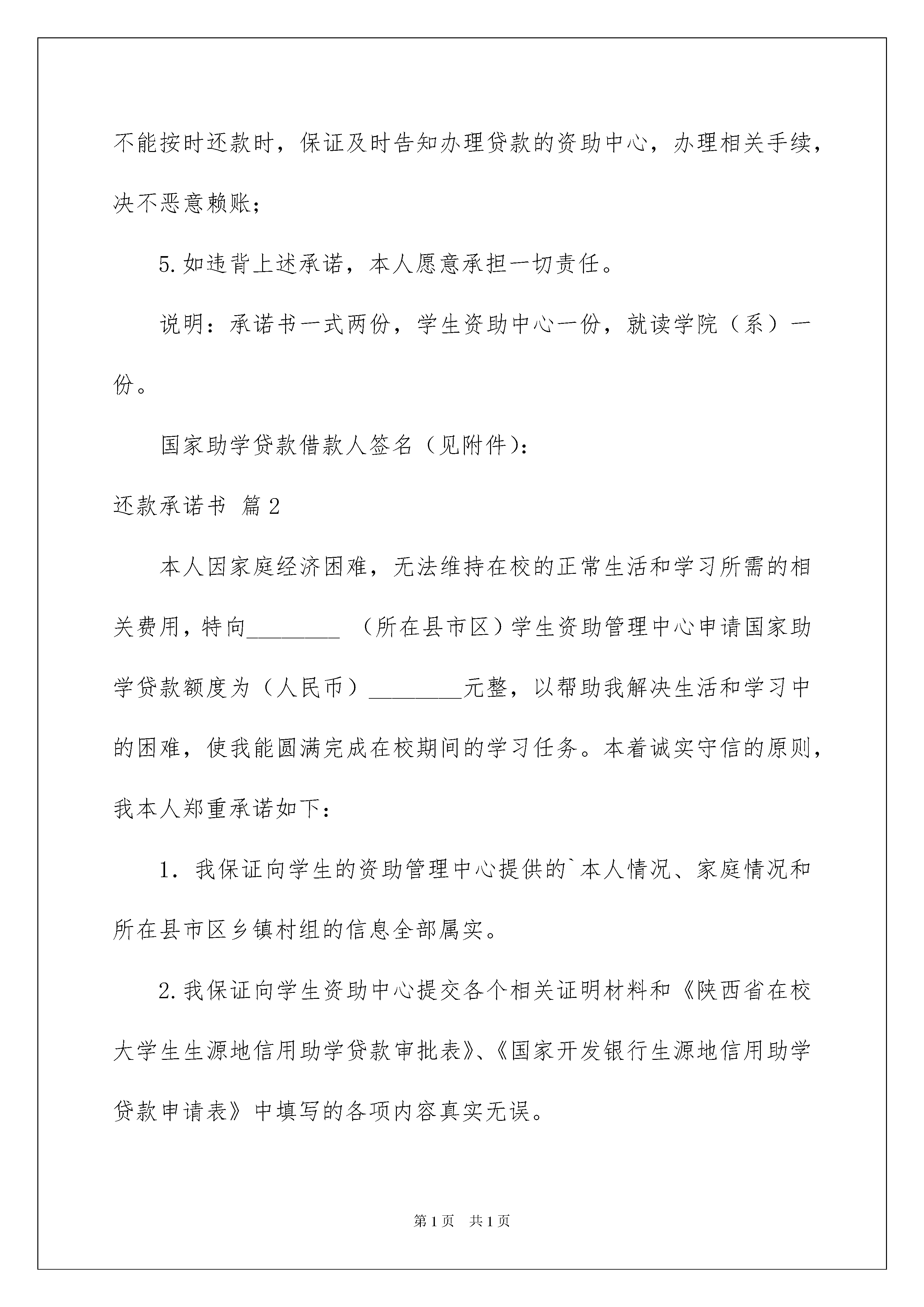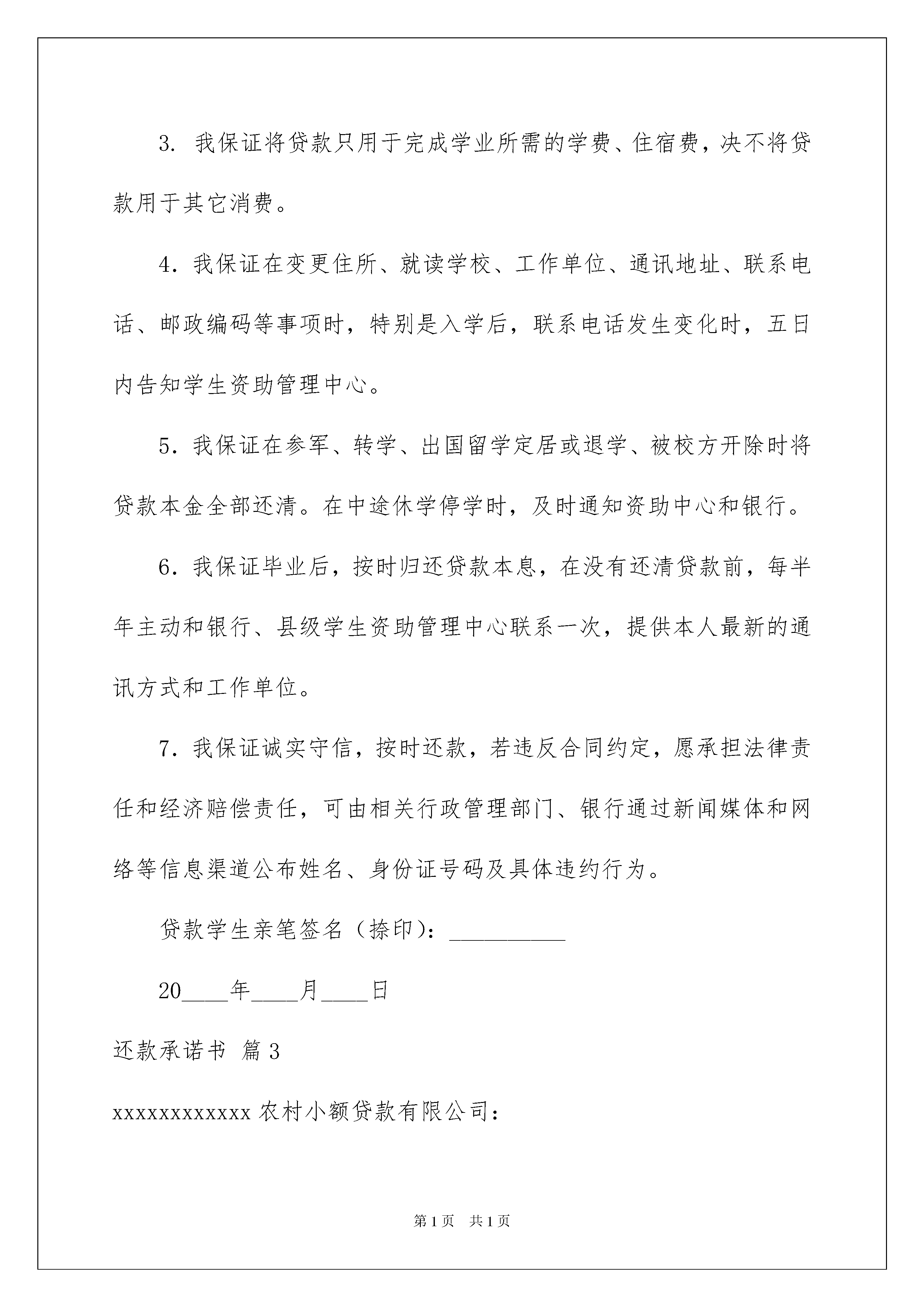 2022精选还款承诺书汇编七篇精选还款承诺书汇编七篇在学习、工作生活中,我们可以使用承诺书的机会越来越多,承诺书具有完全自愿的特点。你所见过的承诺书是什么样的呢?以下是我为大家收集的还款承诺书7篇,欢迎阅读与收藏。还款承诺书篇1基本信息:学院专业班贷款学生承诺:本人因家庭经济困难,于在校学习期间获得国家开发银行发放的助学贷款,解决了我们的燃眉之急,现已完成学业毕业,为切实履行与银行签订的《借款合同》,本人着重承诺:1.诚实守信,遵守合同法,履行还贷付息义务;2.毕业后次月1日起,通过预存(电汇)交纳贷款利息;3.根据《借款合同》规定,按时还清借款本息,决不拖欠;4.保持与学校资助中心(生源地:与当地资助中心)经常联系,如本人住所、通讯电话、工作单位发生变动时,保证及时主动与学校资助中心(生源地:与当地资助中心)联系,如本人确实有特殊原因不能按时还款时,保证及时告知办理贷款的资助中心,办理相关手续,决不恶意赖账;5.如违背上述承诺,本人愿意承担一切责任。说明:承诺书一式两份,学生资助中心一份,就读学院(系)一份。国家助学贷款借款人签名(见附件):还款承诺书篇2本人因家庭经济困难,无法维持在校的正常生活和学习所需的相关费用,特向________(所在县市区)学生资助管理中心申请国家助学贷款额度为(人民币)________元整,以帮助我解决生活和学习中的困难,使我能圆满完成在校期间的学习任务。本着诚实守信的原则,我本人郑重承诺如下:1.我保证向学生的资助管理中心提供的`本人情况、家庭情况和所在县市区乡镇村组的信息全部属实。2.我保证向学生资助中心提交各个相关证明材料和《陕西省在校大学生生源地信用助学贷款审批表》、《国家开发银行生源地信用助学贷款申请表》中填写的各项内容真实无误。3.我保证将贷款只用于完成学业所需的学费、住宿费,决不将贷款用于其它消费。4.我保证在变更住所、就读学校、工作单位、通讯地址、联系电话、邮政编码等事项时,特别是入学后,联系电话发生变化时,五日内告知学生资助管理中心。5.我保证在参军、转学、出国留学定居或退学、被校方开除时将贷款本金全部还清。在中途休学停学时,及时通知资助中心和银行。6.我保证毕业后,按时归还贷款本息,在没有还清贷款前,每半年主动和银行、县级学生资助管理中心联系一次,提供本人最新的通讯方式和工作单位。7.我保证诚实守信,按时还款,若违反合同约定,愿承担法律责任和经济赔偿责任,可由相关行政管理部门、银行通过新闻媒体和网络等信息渠道公布姓名、身份证号码及具体违约行为。贷款学生亲笔签名(捺印):__________20____年____月____日还款承诺书篇3xxxxxxxxxxxx农村小额贷款有限公司:20xx年7月23日,许开祥向贵公司借贷款20万元,期限为6个月,月利率20‰。我为xxxxxx提供担保,担保方式为连带责任保证。现因xxxxxx长期外出,影响此贷款按期归还,本人愿意承担还本万元。承诺如下:在年月日前还款万元;在年月日前还款万元。如逾期未还清本息,我自愿承担以上贷款本息以及实现债权的所有费用;同时承担逾期日起逾期额按中国人民银行贷款基准利率的四倍计算利息,直至该贷款本息清偿完毕为止。承诺人:(签名、按手印)承诺人联系电话:承诺人身份证号码:承诺人住址:承诺日期:20xx年3月25日还款承诺书篇4承诺人:本人截止年月日共计向***借款人民币元(小写:。由于多次口头承诺无法兑现。本人现用书面形式承诺。在于年月日前还清所有借款。若到期未能归还,本借款担保人承诺负责偿还全部借款。本人及担保人对以上承诺是自愿的,无争议的。自愿放弃抗辩和反诉权利。特此承诺!承诺人:担保人:年月日还款承诺书篇5本人在校期间分别于20_____年、20_____年、20_____年、20_____年共_____年,获得生源地信用助学贷款共_____________元(贷款余额)。现因毕业离开学校,为切实履行与银行签订的还款协议,本人郑重承诺:1、积极配合银行、县资助中心和学校,及时提供毕业还款确认工作所需材料;2、诚实守信,遵规守约,积极履行还贷义务:本人应该从______年_____月_____日起开始承担贷款利息,并于______年_____月_____日前开始偿还第一年利息,以后每年_____月_____日前按时偿还利息;在_____年_____月_____日开始第一次等额偿还本金,以后每年_____月_____日前按时偿还本金。3、每年12月1日前主动与贷款办理地学生资助管理中心联系一次,提供自己及家庭最新的通讯地址和联系电话,至贷款还完止;每年12