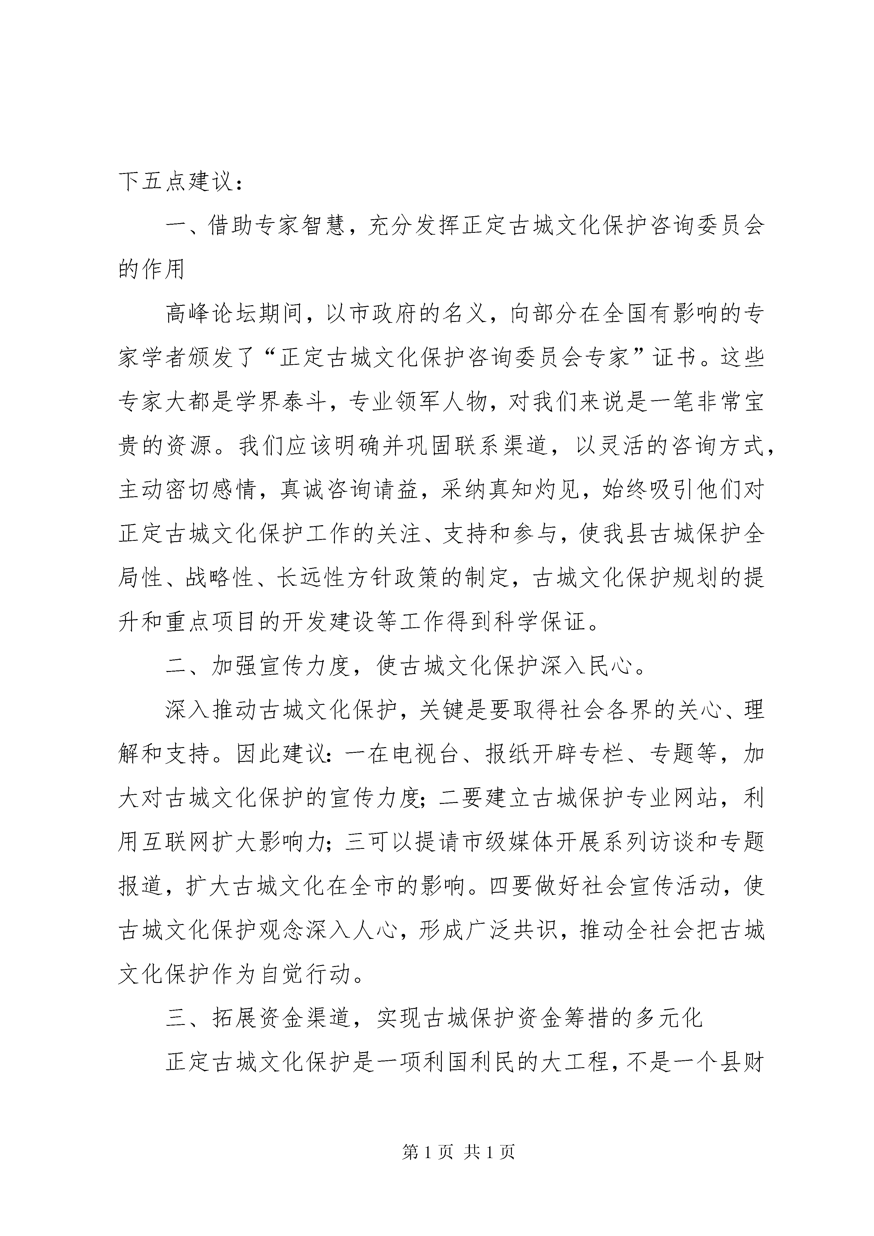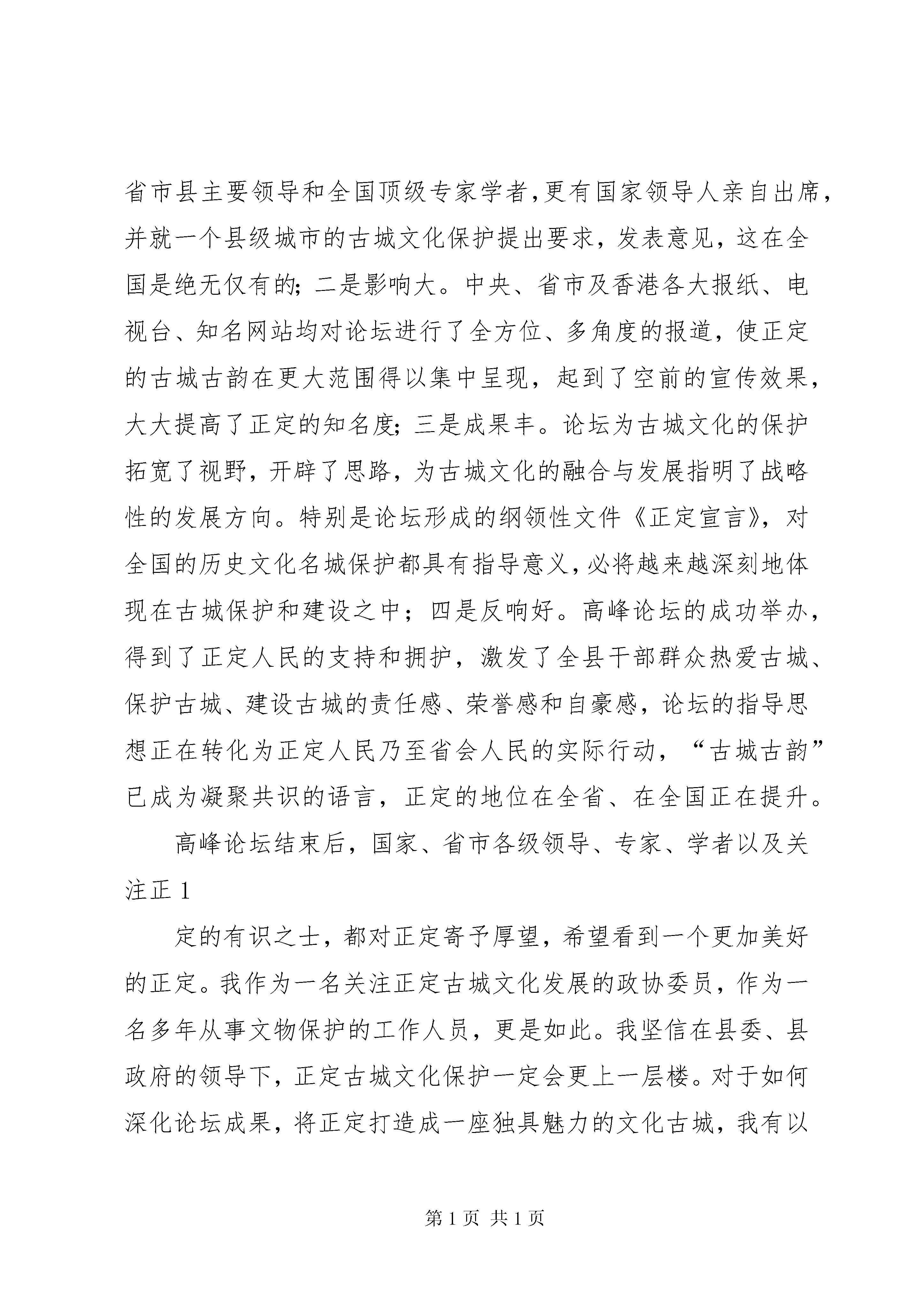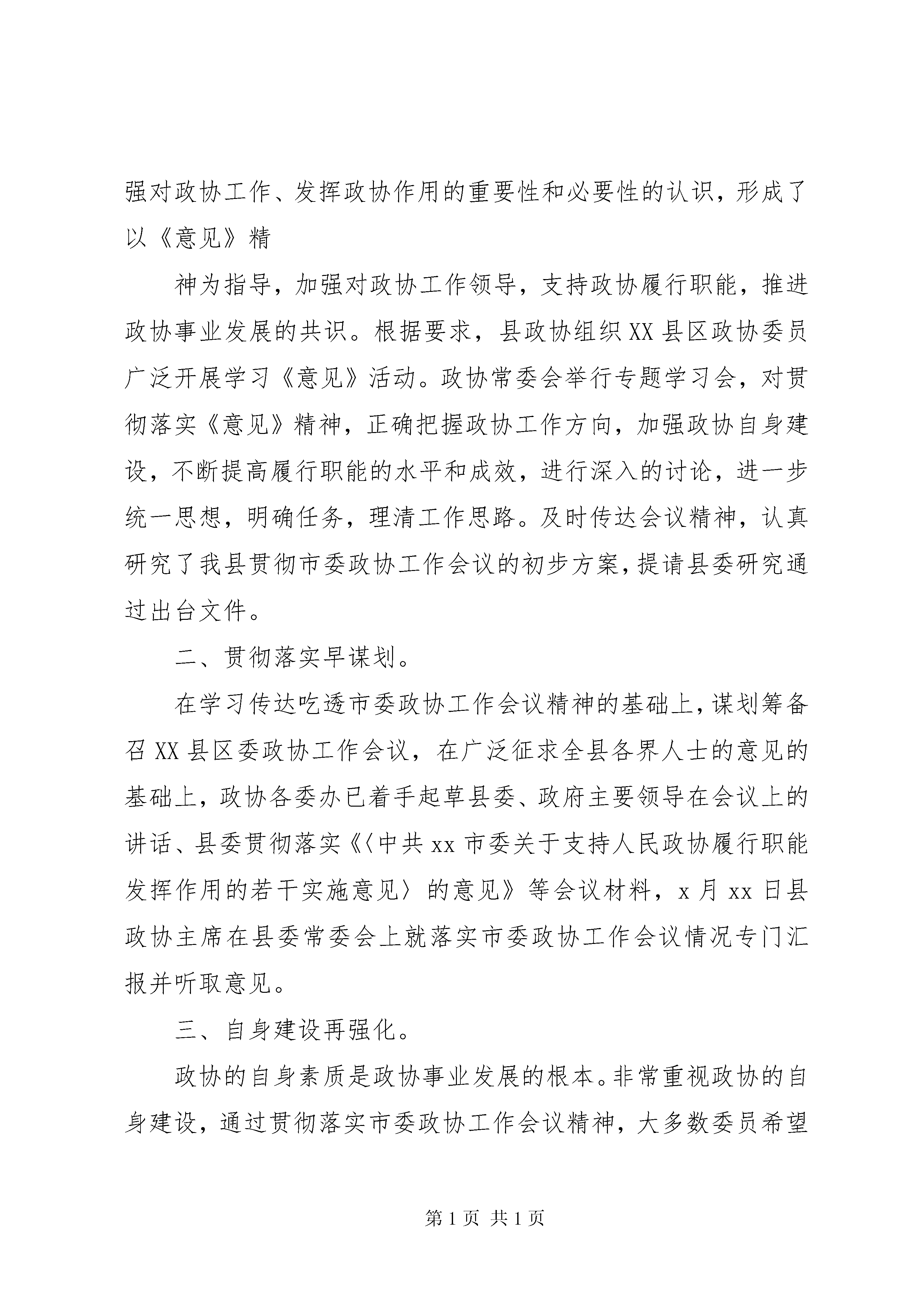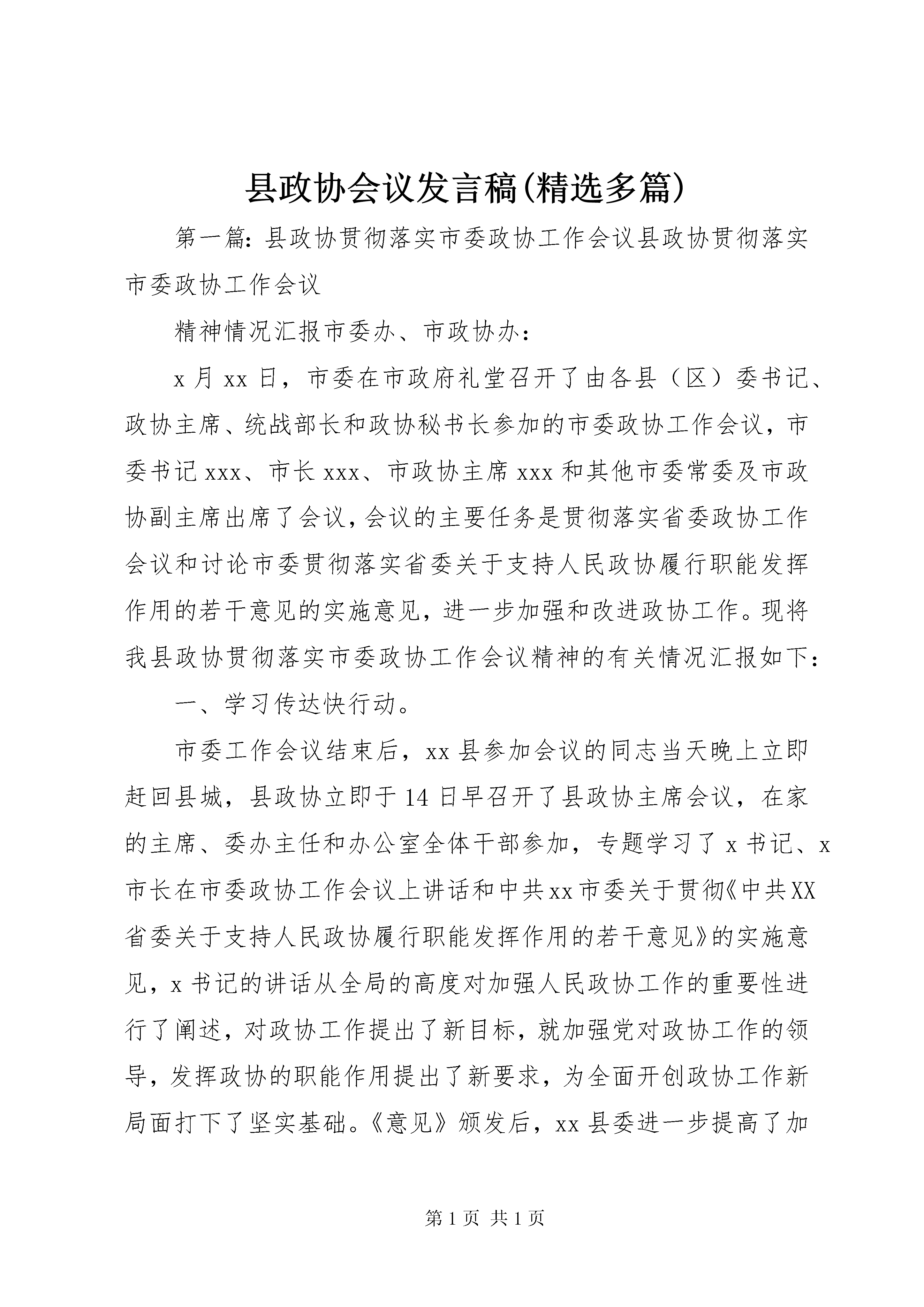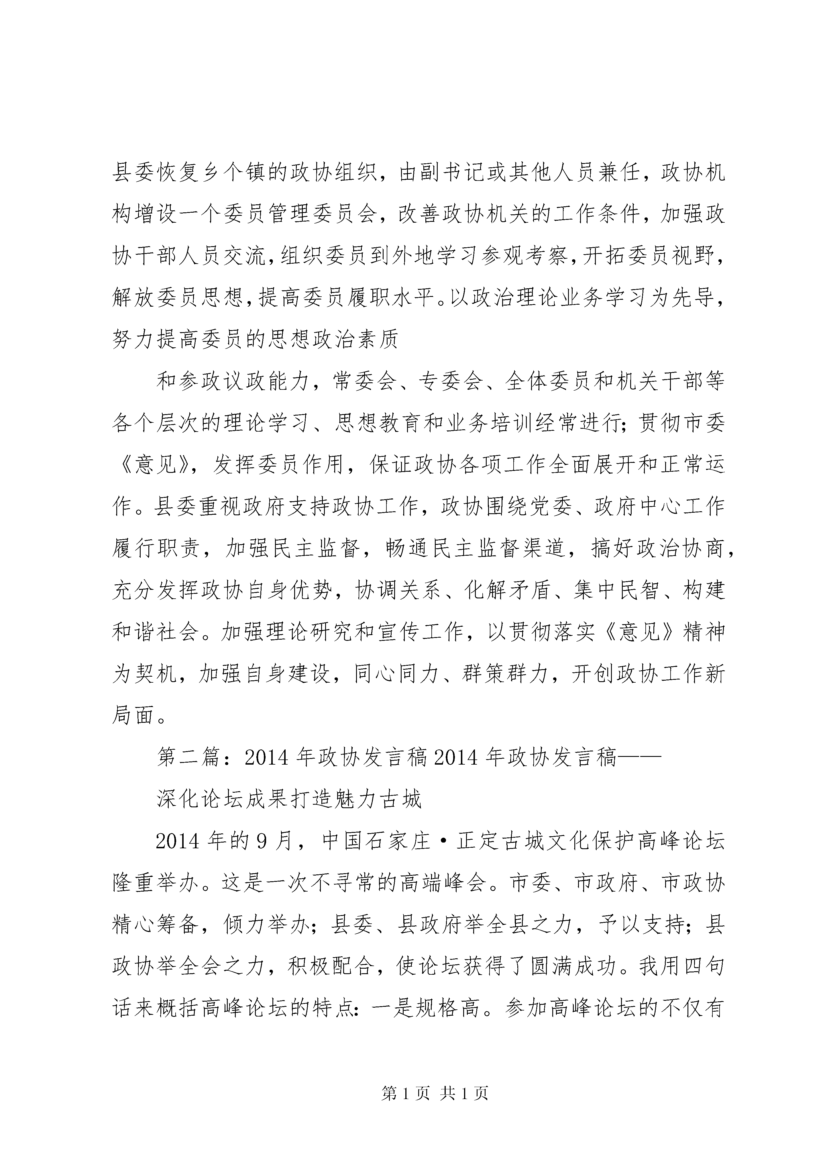 县政协会议发言稿(精选多篇)第一篇:县政协贯彻落实市委政协工作会议县政协贯彻落实市委政协工作会议精神情况汇报市委办、市政协办:x月xx日,市委在市政府礼堂召开了由各县(区)委书记、政协主席、统战部长和政协秘书长参加的市委政协工作会议,市委书记xxx、市长xxx、市政协主席xxx和其他市委常委及市政协副主席出席了会议,会议的主要任务是贯彻落实省委政协工作会议和讨论市委贯彻落实省委关于支持人民政协履行职能发挥作用的若干意见的实施意见,进一步加强和改进政协工作。现将我县政协贯彻落实市委政协工作会议精神的有关情况汇报如下:一、学习传达快行动。市委工作会议结束后,xx县参加会议的同志当天晚上立即赶回县城,县政协立即于14日早召开了县政协主席会议,在家的主席、委办主任和办公室全体干部参加,专题学习了x书记、x市长在市委政协工作会议上讲话和中共xx市委关于贯彻《中共XX省委关于支持人民政协履行职能发挥作用的若干意见》的实施意见,x书记的讲话从全局的高度对加强人民政协工作的重要性进行了阐述,对政协工作提出了新目标,就加强党对政协工作的领导,发挥政协的职能作用提出了新要求,为全面开创政协工作新局面打下了坚实基础。《意见》颁发后,xx县委进一步提高了加强对政协工作、发挥政协作用的重要性和必要性的认识,形成了以《意见》精神为指导,加强对政协工作领导,支持政协履行职能,推进政协事业发展的共识。根据要求,县政协组织XX县区政协委员广泛开展学习《意见》活动。政协常委会举行专题学习会,对贯彻落实《意见》精神,正确把握政协工作方向,加强政协自身建设,不断提高履行职能的水平和成效,进行深入的讨论,进一步统一思想,明确任务,理清工作思路。及时传达会议精神,认真研究了我县贯彻市委政协工作会议的初步方案,提请县委研究通过出台文件。二、贯彻落实早谋划。在学习传达吃透市委政协工作会议精神的基础上,谋划筹备召XX县区委政协工作会议,在广泛征求全县各界人士的意见的基础上,政协各委办已着手起草县委、政府主要领导在会议上的讲话、县委贯彻落实《〈中共xx市委关于支持人民政协履行职能发挥作用的若干实施意见〉的意见》等会议材料,x月xx日县政协主席在县委常委会上就落实市委政协工作会议情况专门汇报并听取意见。三、自身建设再强化。政协的自身素质是政协事业发展的根本。非常重视政协的自身建设,通过贯彻落实市委政协工作会议精神,大多数委员希望县委恢复乡个镇的政协组织,由副书记或其他人员兼任,政协机构增设一个委员管理委员会,改善政协机关的工作条件,加强政协干部人员交流,组织委员到外地学习参观考察,开拓委员视野,解放委员思想,提高委员履职水平。以政治理论业务学习为先导,努力提高委员的思想政治素质和参政议政能力,常委会、专委会、全体委员和机关干部等各个层次的理论学习、思想教育和业务培训经常进行;贯彻市委《意见》,发挥委员作用,保证政协各项工作全面展开和正常运作。县委重视政府支持政协工作,政协围绕党委、政府中心工作履行职责,加强民主监督,畅通民主监督渠道,搞好政治协商,充分发挥政协自身优势,协调关系、化解矛盾、集中民智、构建和谐社会。加强理论研究和宣传工作,以贯彻落实《意见》精神为契机,加强自身建设,同心同力、群策群力,开创政协工作新局面。第二篇:2014年政协发言稿2014年政协发言稿——深化论坛成果打造魅力古城2014年的9月,中国石家庄·正定古城文化保护高峰论坛隆重举办。这是一次不寻常的高端峰会。市委、市政府、市政协精心筹备,倾力举办;县委、县政府举全县之力,予以支持;县政协举全会之力,积极配合,使论坛获得了圆满成功。我用四句话来概括高峰论坛的特点:一是规格高。参加高峰论坛的不仅有省市县主要领导和全国顶级专家学者,更有国家领导人亲自出席,并就一个县级城市的古城文化保护提出要求,发表意见,这在全国是绝无仅有的;二是影响大。中央、省市及香港各大报纸、电视台、知名网站均对论坛进行了全方位、多角度的报道,使正定的古城古韵在更大范围得以集中呈现,起到了空前的宣传效果,大大提高了正定的知名度;三是成果丰。论坛为古城文化的保护拓宽了视野,开辟了思路,为古城文化的融合与发展指明了战略性的发展方向。特别是论坛形成的纲领性文件《正定宣言》,对全国的历史文化名城保护都具有指导意义,必将越来越深刻地体现在古城保护和建设之中;四是反响好。高峰论坛的成功举办,得到了正定人民的支持和拥护,激发了全县干部群众热爱古城、保护古城、建设古城的责任感、荣誉感和自豪感,论坛的指导思想正在转化为正定人民乃至省会人民的实际行动,“古城古韵”已成为凝聚共识的语言,正定的地位在全省、在全国正在提升。高峰论坛结束后,国家、省市各级领导、专家、学者以及关注正1定的有识之士,都对正定寄予厚望,希望看到一个更加美好的正定。我