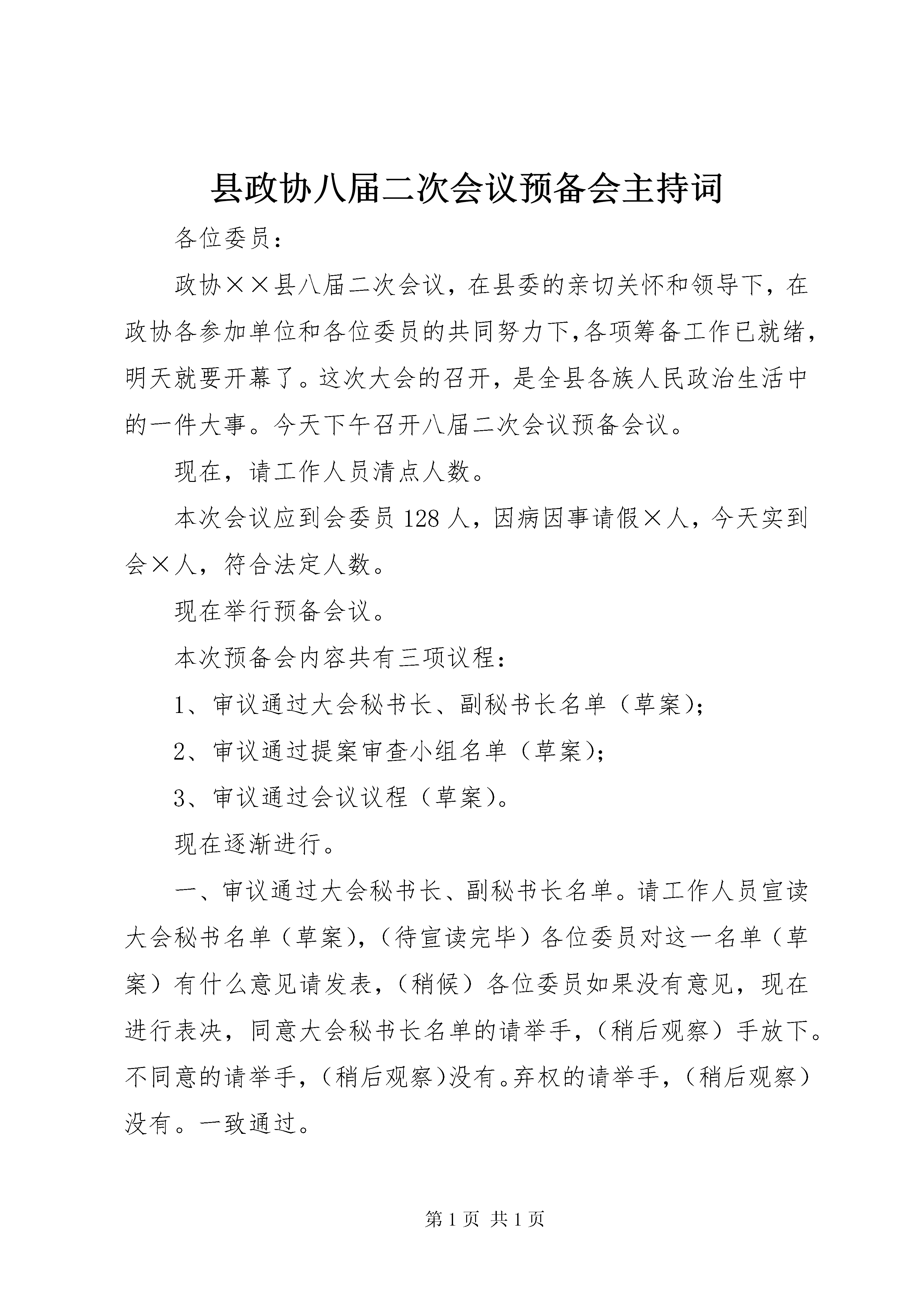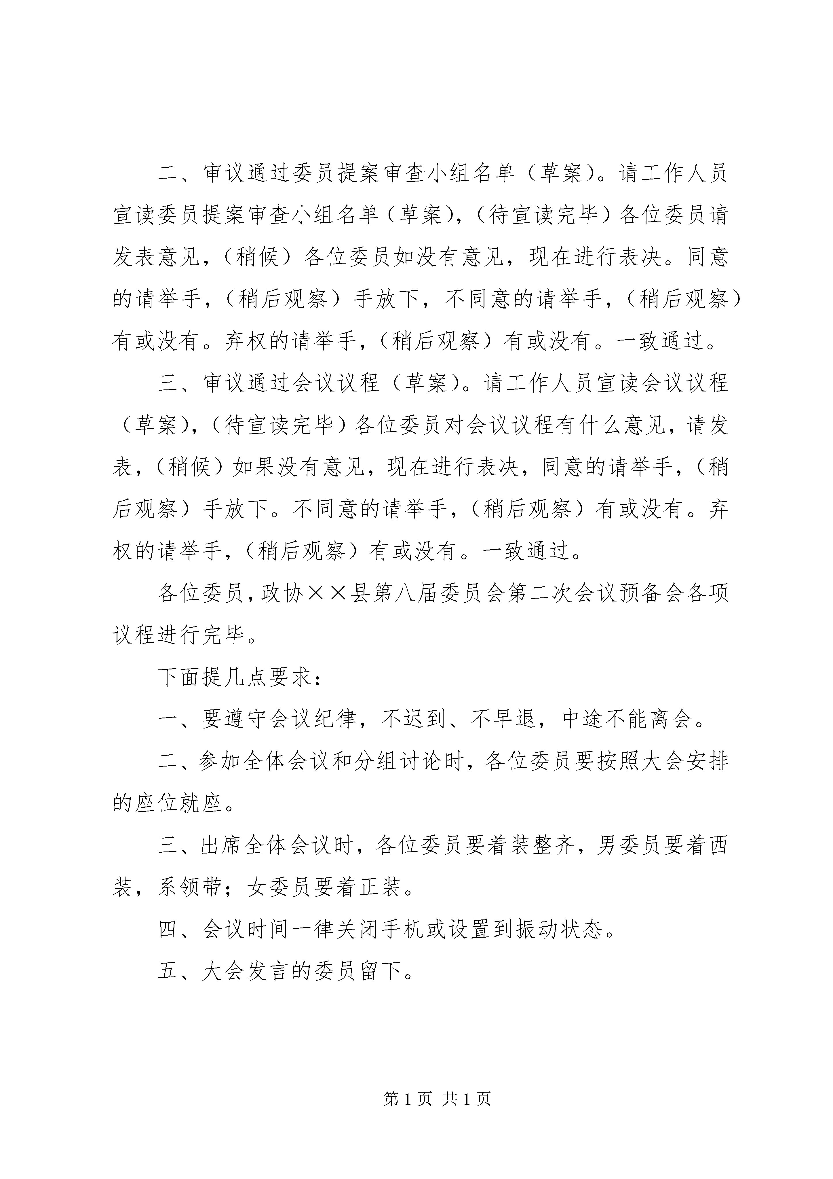 县政协八届二次会议预备会主持词各位委员:政协××县八届二次会议,在县委的亲切关怀和领导下,在政协各参加单位和各位委员的共同努力下,各项筹备工作已就绪,明天就要开幕了。这次大会的召开,是全县各族人民政治生活中的一件大事。今天下午召开八届二次会议预备会议。现在,请工作人员清点人数。本次会议应到会委员128人,因病因事请假×人,今天实到会×人,符合法定人数。现在举行预备会议。本次预备会内容共有三项议程:1、审议通过大会秘书长、副秘书长名单(草案);2、审议通过提案审查小组名单(草案);3、审议通过会议议程(草案)。现在逐渐进行。一、审议通过大会秘书长、副秘书长名单。请工作人员宣读大会秘书名单(草案),(待宣读完毕)各位委员对这一名单(草案)有什么意见请发表,(稍候)各位委员如果没有意见,现在进行表决,同意大会秘书长名单的请举手,(稍后观察)手放下。不同意的请举手,(稍后观察)没有。弃权的请举手,(稍后观察)没有。一致通过。二、审议通过委员提案审查小组名单(草案)。请工作人员宣读委员提案审查小组名单(草案),(待宣读完毕)各位委员请发表意见,(稍候)各位委员如没有意见,现在进行表决。同意的请举手,(稍后观察)手放下,不同意的请举手,(稍后观察)有或没有。弃权的请举手,(稍后观察)有或没有。一致通过。三、审议通过会议议程(草案)。请工作人员宣读会议议程(草案),(待宣读完毕)各位委员对会议议程有什么意见,请发表,(稍候)如果没有意见,现在进行表决,同意的请举手,(稍后观察)手放下。不同意的请举手,(稍后观察)有或没有。弃权的请举手,(稍后观察)有或没有。一致通过。各位委员,政协××县第八届委员会第二次会议预备会各项议程进行完毕。下面提几点要求:一、要遵守会议纪律,不迟到、不早退,中途不能离会。二、参加全体会议和分组讨论时,各位委员要按照大会安排的座位就座。三、出席全体会议时,各位委员要着装整齐,男委员要着西装,系领带;女委员要着正装。四、会议时间一律关闭手机或设置到振动状态。五、大会发言的委员留下。休会。