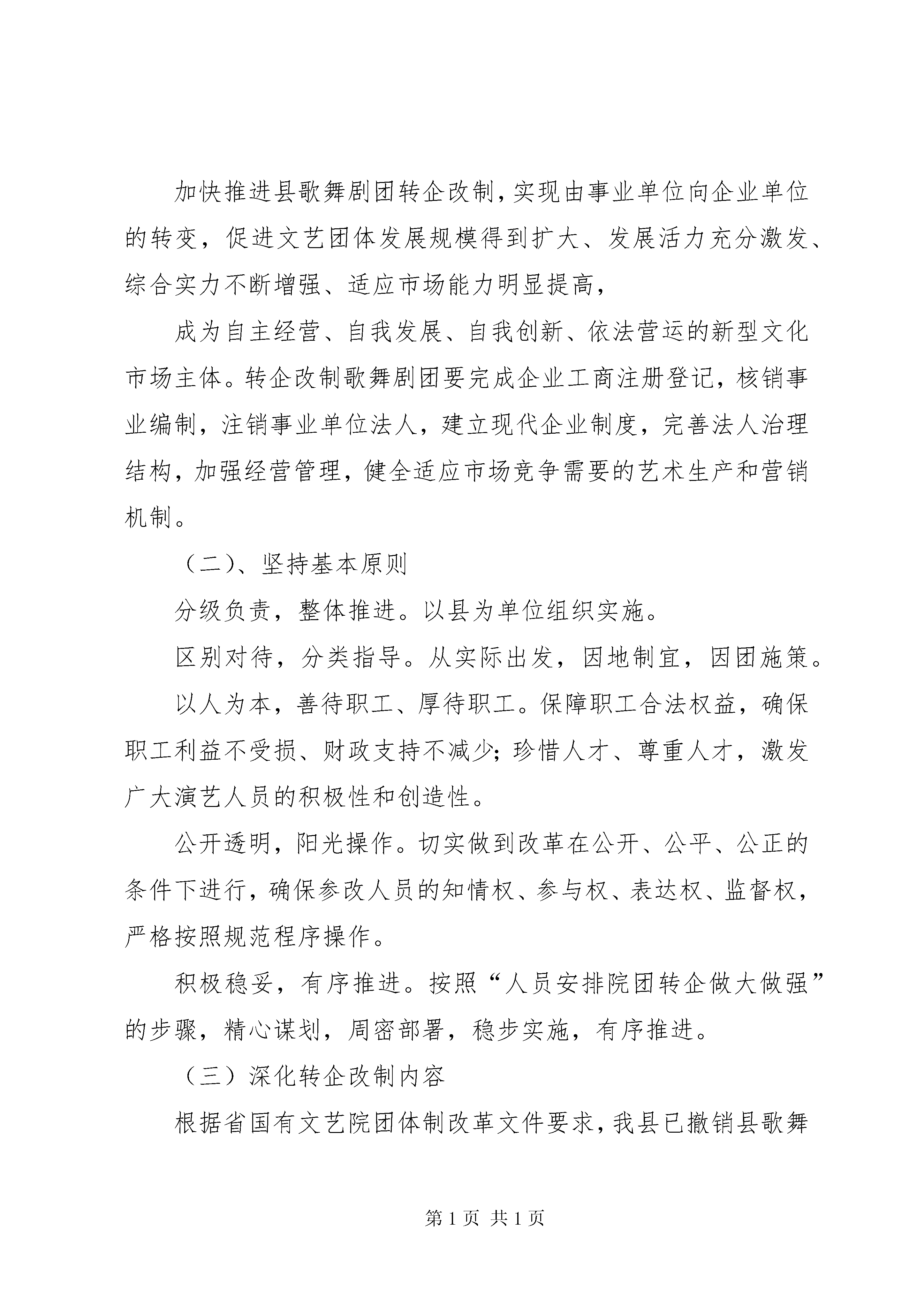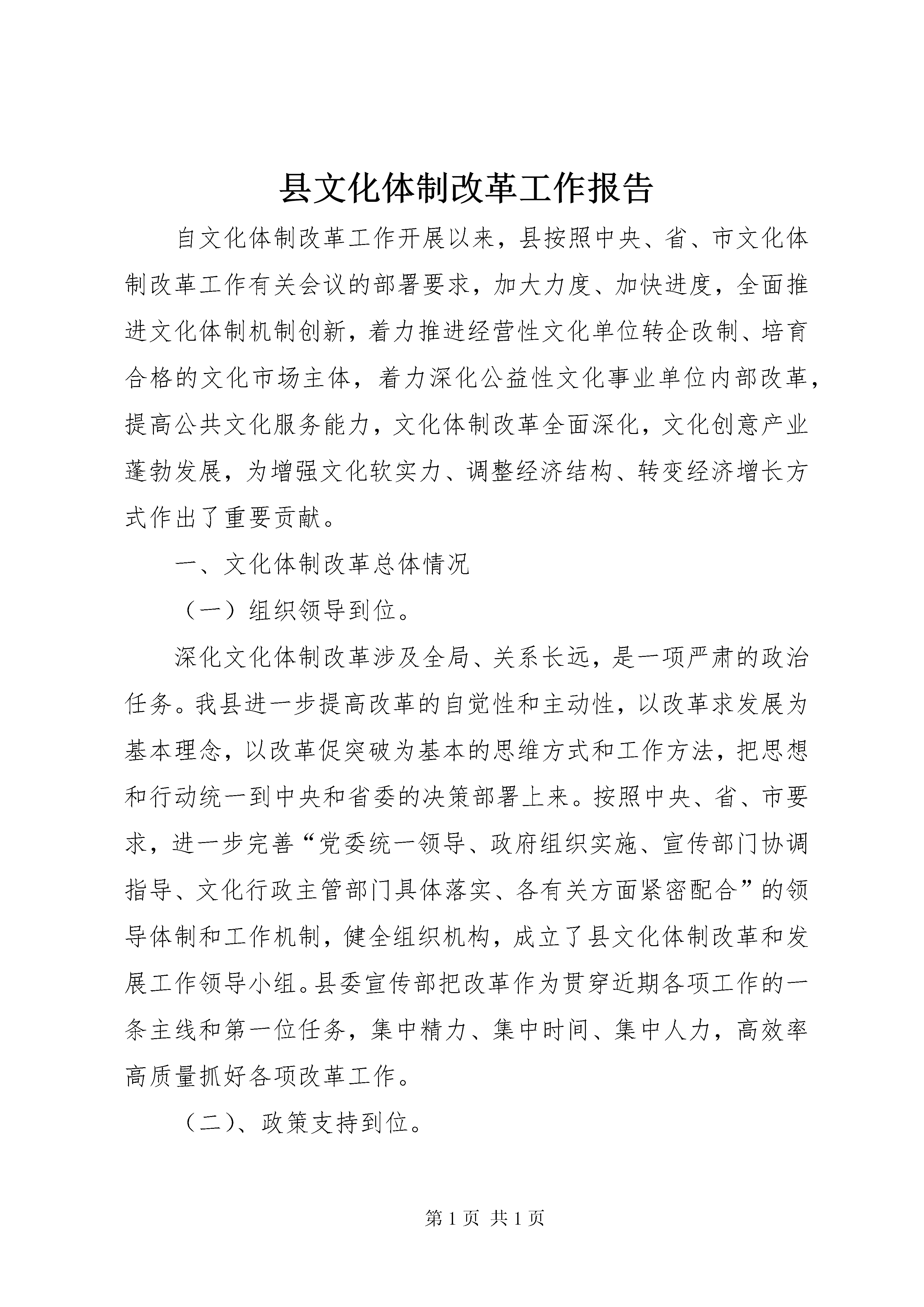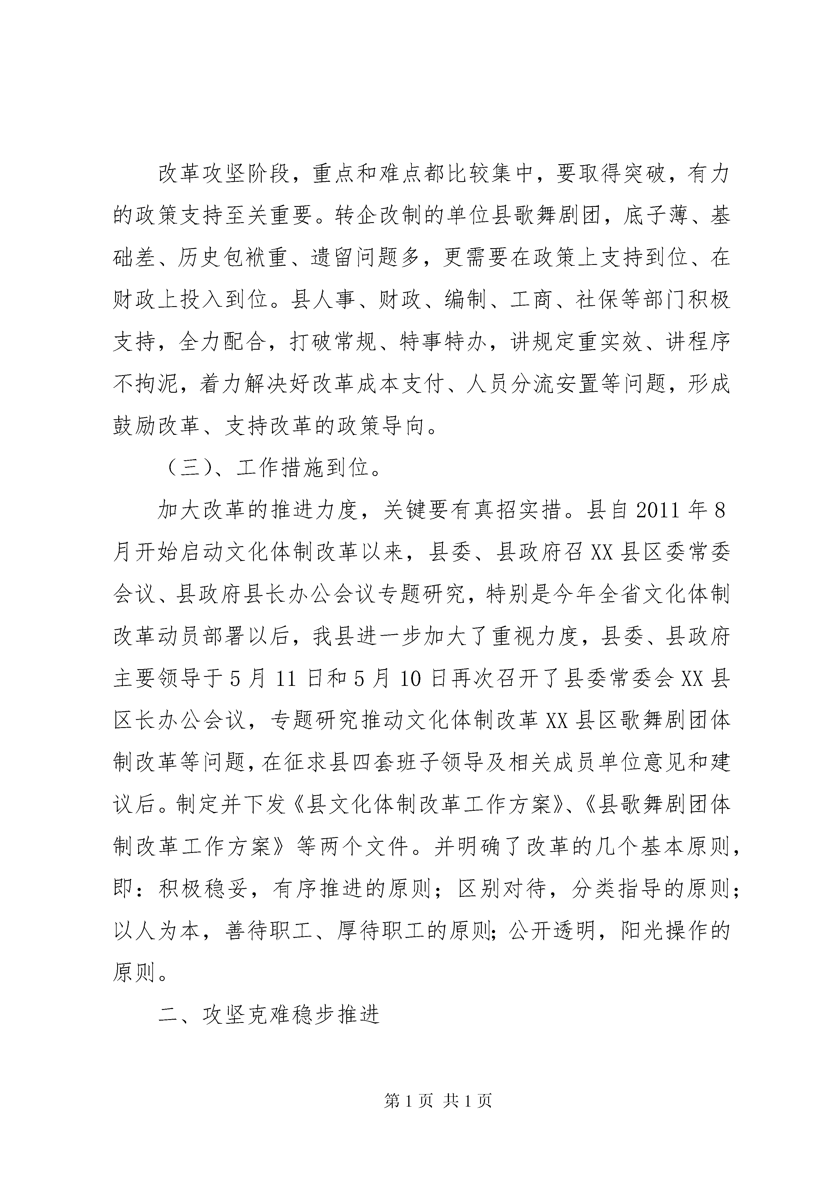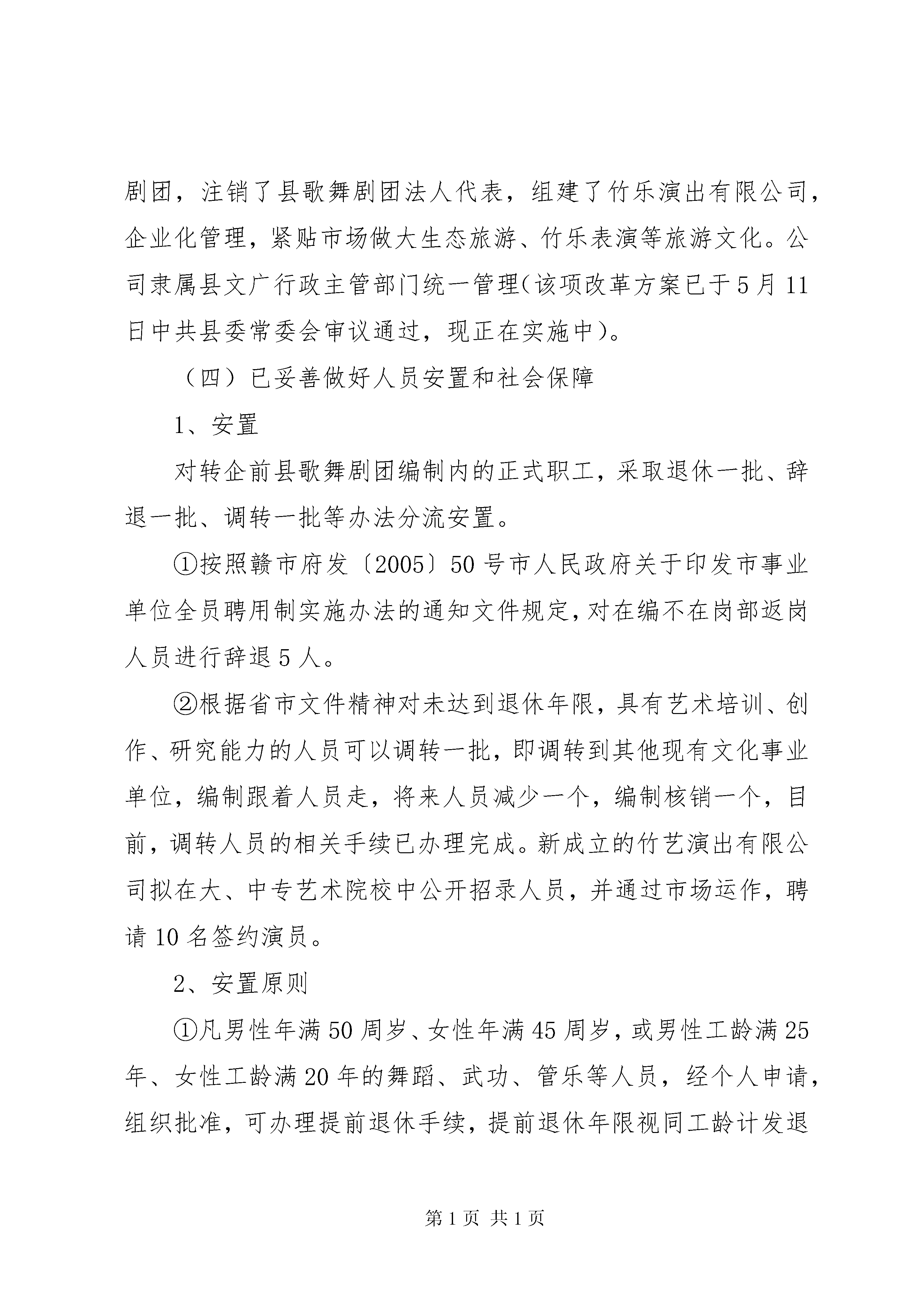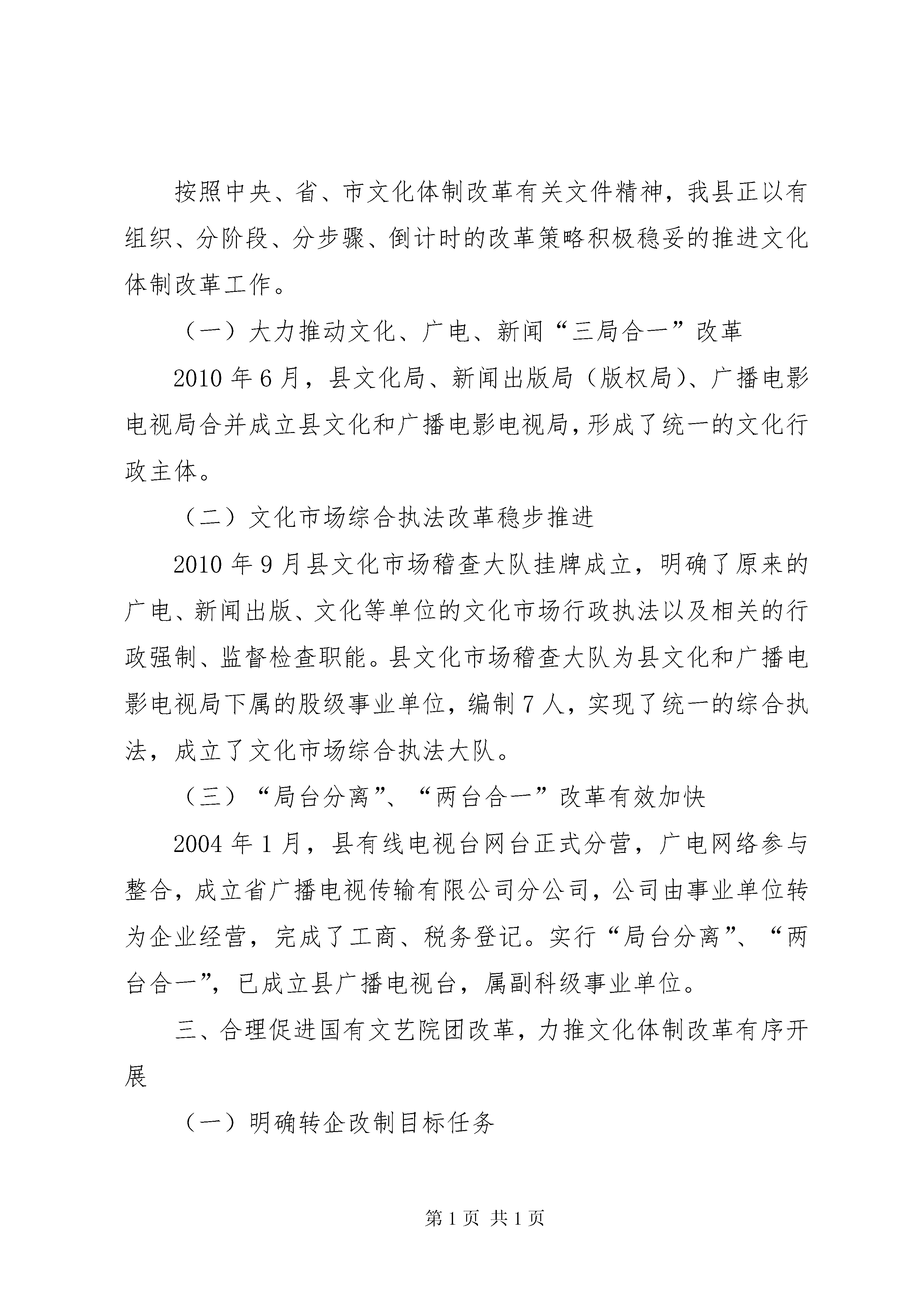 县文化体制改革工作报告自文化体制改革工作开展以来,县按照中央、省、市文化体制改革工作有关会议的部署要求,加大力度、加快进度,全面推进文化体制机制创新,着力推进经营性文化单位转企改制、培育合格的文化市场主体,着力深化公益性文化事业单位内部改革,提高公共文化服务能力,文化体制改革全面深化,文化创意产业蓬勃发展,为增强文化软实力、调整经济结构、转变经济增长方式作出了重要贡献。一、文化体制改革总体情况(一)组织领导到位。深化文化体制改革涉及全局、关系长远,是一项严肃的政治任务。我县进一步提高改革的自觉性和主动性,以改革求发展为基本理念,以改革促突破为基本的思维方式和工作方法,把思想和行动统一到中央和省委的决策部署上来。按照中央、省、市要求,进一步完善“党委统一领导、政府组织实施、宣传部门协调指导、文化行政主管部门具体落实、各有关方面紧密配合”的领导体制和工作机制,健全组织机构,成立了县文化体制改革和发展工作领导小组。县委宣传部把改革作为贯穿近期各项工作的一条主线和第一位任务,集中精力、集中时间、集中人力,高效率高质量抓好各项改革工作。(二)、政策支持到位。改革攻坚阶段,重点和难点都比较集中,要取得突破,有力的政策支持至关重要。转企改制的单位县歌舞剧团,底子薄、基础差、历史包袱重、遗留问题多,更需要在政策上支持到位、在财政上投入到位。县人事、财政、编制、工商、社保等部门积极支持,全力配合,打破常规、特事特办,讲规定重实效、讲程序不拘泥,着力解决好改革成本支付、人员分流安置等问题,形成鼓励改革、支持改革的政策导向。(三)、工作措施到位。加大改革的推进力度,关键要有真招实措。县自2011年8月开始启动文化体制改革以来,县委、县政府召XX县区委常委会议、县政府县长办公会议专题研究,特别是今年全省文化体制改革动员部署以后,我县进一步加大了重视力度,县委、县政府主要领导于5月11日和5月10日再次召开了县委常委会XX县区长办公会议,专题研究推动文化体制改革XX县区歌舞剧团体制改革等问题,在征求县四套班子领导及相关成员单位意见和建议后。制定并下发《县文化体制改革工作方案》、《县歌舞剧团体制改革工作方案》等两个文件。并明确了改革的几个基本原则,即:积极稳妥,有序推进的原则;区别对待,分类指导的原则;以人为本,善待职工、厚待职工的原则;公开透明,阳光操作的原则。二、攻坚克难稳步推进按照中央、省、市文化体制改革有关文件精神,我县正以有组织、分阶段、分步骤、倒计时的改革策略积极稳妥的推进文化体制改革工作。(一)大力推动文化、广电、新闻“三局合一”改革2010年6月,县文化局、新闻出版局(版权局)、广播电影电视局合并成立县文化和广播电影电视局,形成了统一的文化行政主体。(二)文化市场综合执法改革稳步推进2010年9月县文化市场稽查大队挂牌成立,明确了原来的广电、新闻出版、文化等单位的文化市场行政执法以及相关的行政强制、监督检查职能。县文化市场稽查大队为县文化和广播电影电视局下属的股级事业单位,编制7人,实现了统一的综合执法,成立了文化市场综合执法大队。(三)“局台分离”、“两台合一”改革有效加快2004年1月,县有线电视台网台正式分营,广电网络参与整合,成立省广播电视传输有限公司分公司,公司由事业单位转为企业经营,完成了工商、税务登记。实行“局台分离”、“两台合一”,已成立县广播电视台,属副科级事业单位。三、合理促进国有文艺院团改革,力推文化体制改革有序开展(一)明确转企改制目标任务加快推进县歌舞剧团转企改制,实现由事业单位向企业单位的转变,促进文艺团体发展规模得到扩大、发展活力充分激发、综合实力不断增强、适应市场能力明显提高,成为自主经营、自我发展、自我创新、依法营运的新型文化市场主体。转企改制歌舞剧团要完成企业工商注册登记,核销事业编制,注销事业单位法人,建立现代企业制度,完善法人治理结构,加强经营管理,健全适应市场竞争需要的艺术生产和营销机制。(二)、坚持基本原则分级负责,整体推进。以县为单位组织实施。区别对待,分类指导。从实际出发,因地制宜,因团施策。以人为本,善待职工、厚待职工。保障职工合法权益,确保职工利益不受损、财政支持不减少;珍惜人才、尊重人才,激发广大演艺人员的积极性和创造性。公开透明,阳光操作。切实做到改革在公开、公平、公正的条件下进行,确保参改人员的知情权、参与权、表达权、监督权,严格按照规范程序操作。积极稳妥,有序推进。按照“人员安排院团转企做大做强”的步骤,精心谋划,周密部署,稳步实施,有序推进。(三)深化转企改制内容根据省国有文艺院团体制改革文件要求,我县已撤销县歌舞剧团,注销了县歌舞剧团法人代表,组建了竹乐演出有限公司,企业化管理,紧贴市场做大生态旅游、竹乐表演等旅游文化。公司隶属县文广行政主管部门统一