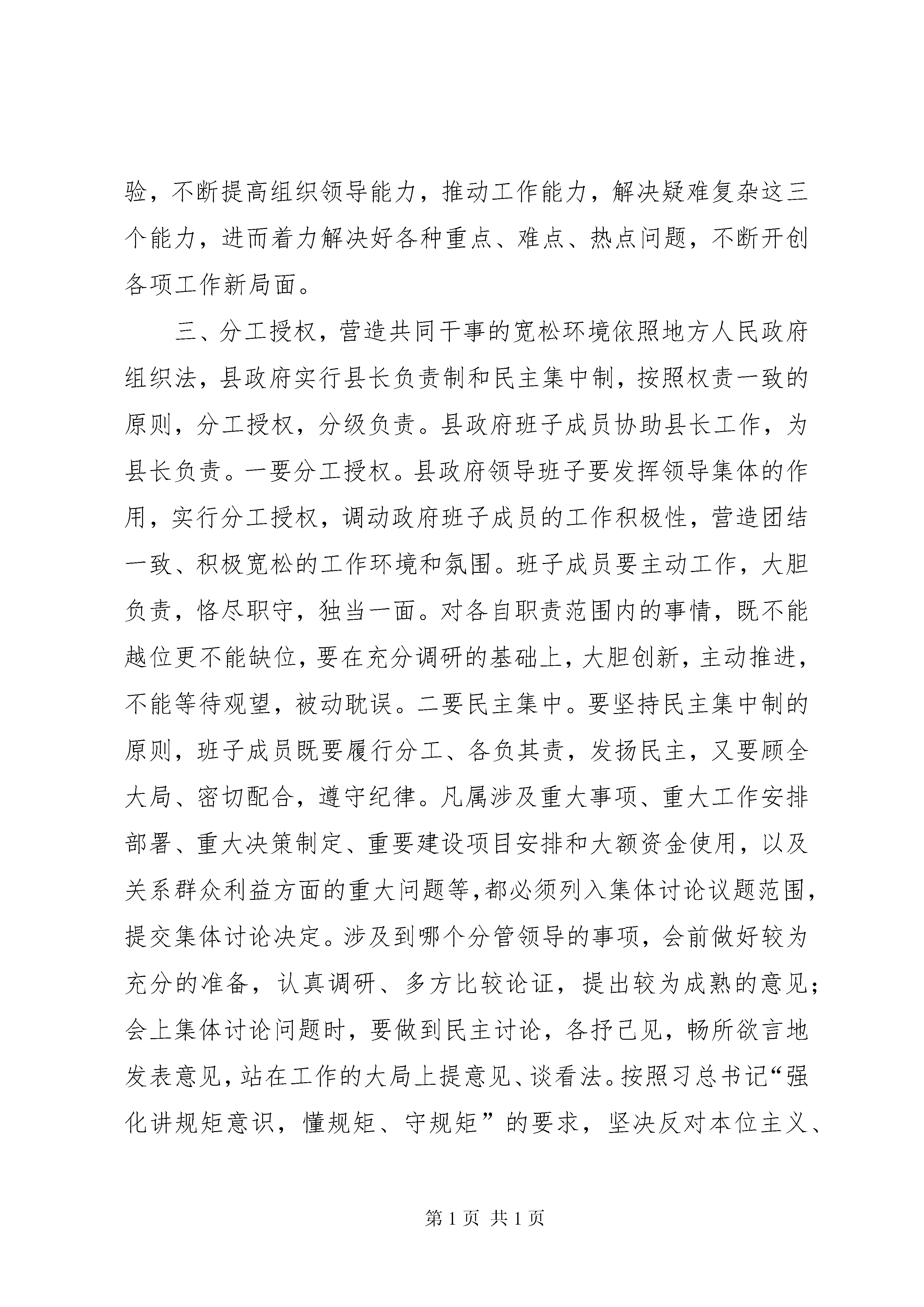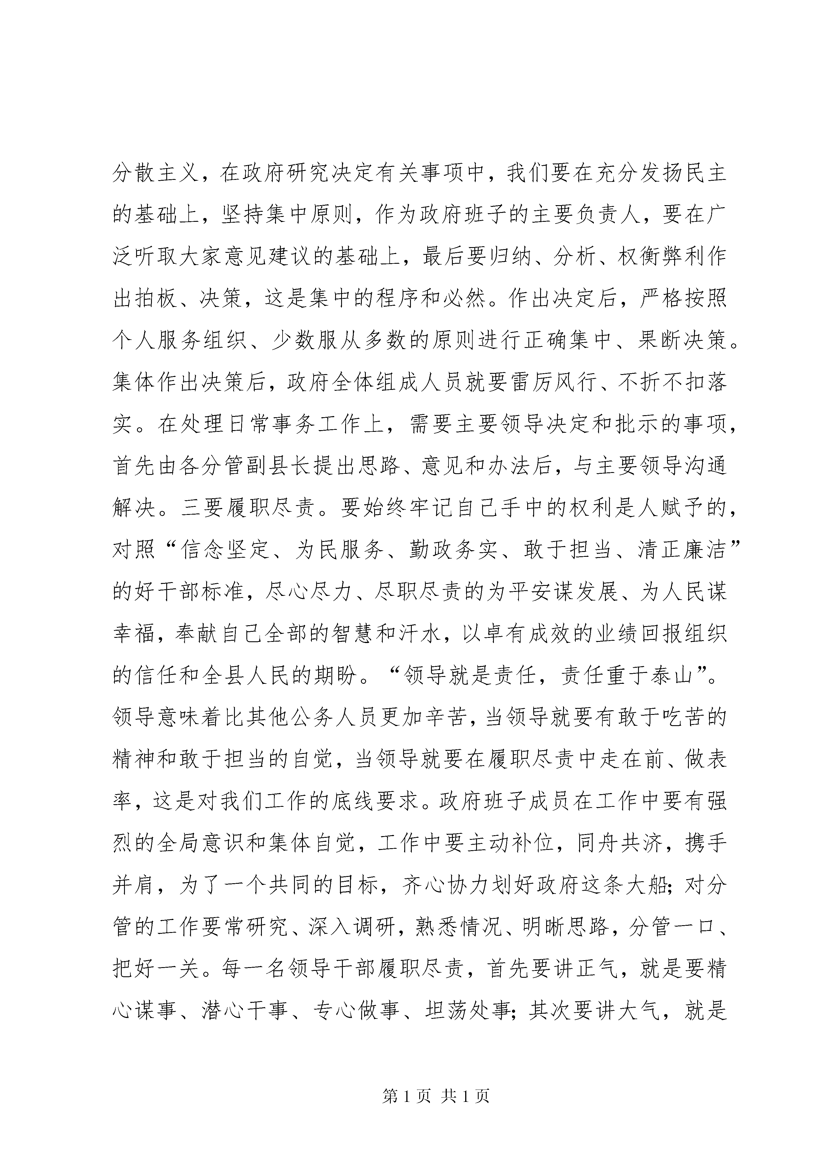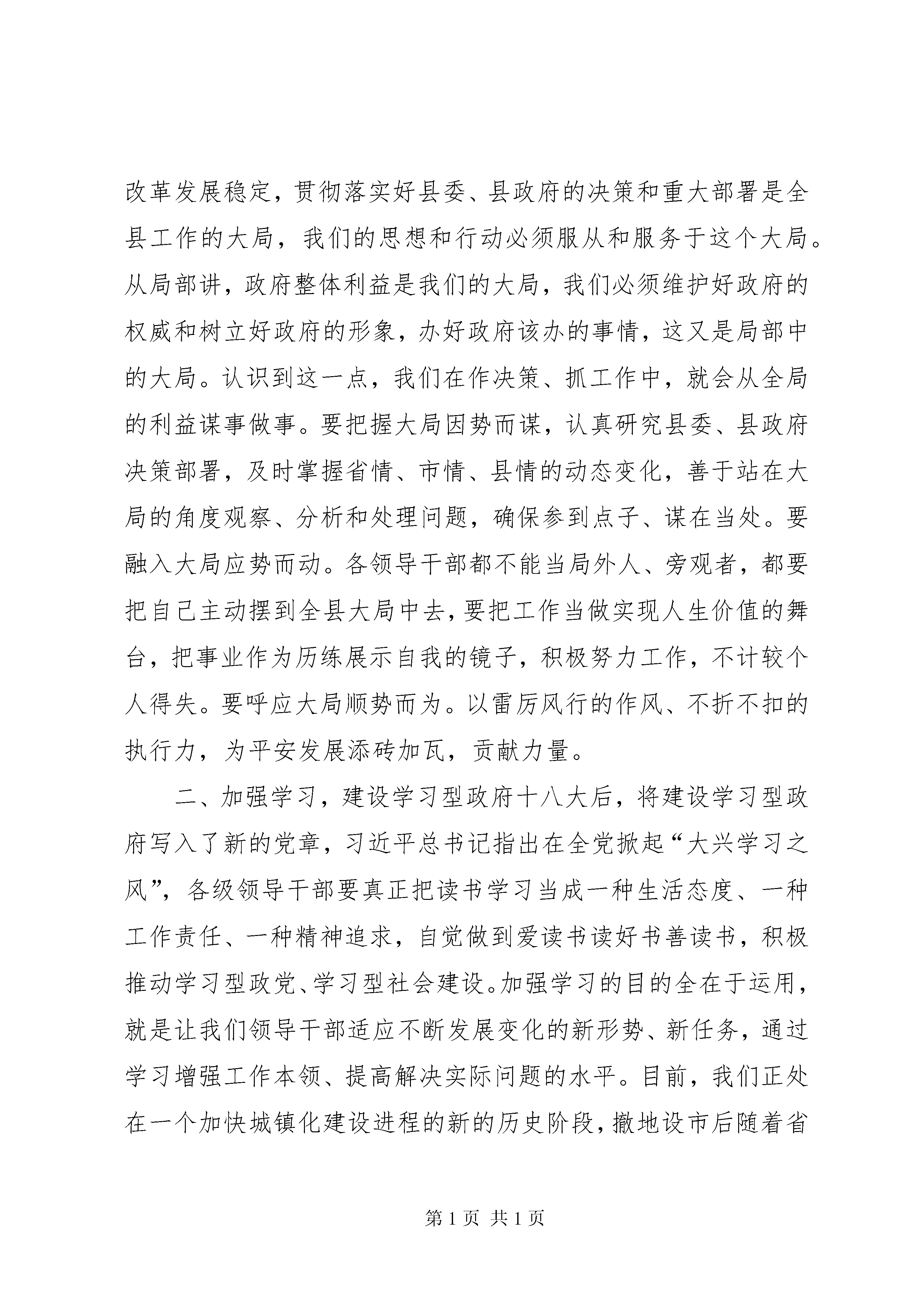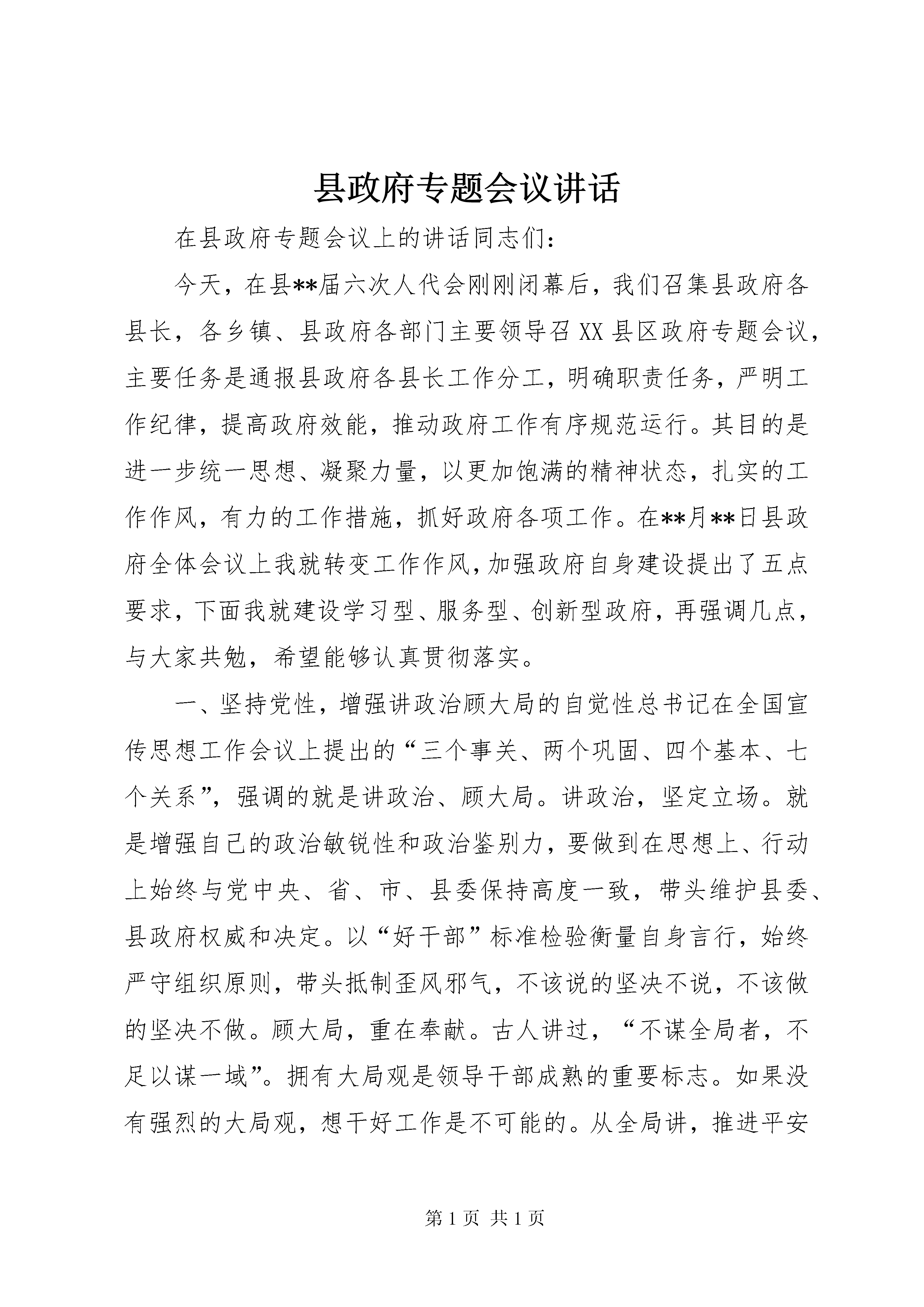 县政府专题会议讲话在县政府专题会议上的讲话同志们:今天,在县**届六次人代会刚刚闭幕后,我们召集县政府各县长,各乡镇、县政府各部门主要领导召XX县区政府专题会议,主要任务是通报县政府各县长工作分工,明确职责任务,严明工作纪律,提高政府效能,推动政府工作有序规范运行。其目的是进一步统一思想、凝聚力量,以更加饱满的精神状态,扎实的工作作风,有力的工作措施,抓好政府各项工作。在**月**日县政府全体会议上我就转变工作作风,加强政府自身建设提出了五点要求,下面我就建设学习型、服务型、创新型政府,再强调几点,与大家共勉,希望能够认真贯彻落实。一、坚持党性,增强讲政治顾大局的自觉性总书记在全国宣传思想工作会议上提出的“三个事关、两个巩固、四个基本、七个关系”,强调的就是讲政治、顾大局。讲政治,坚定立场。就是增强自己的政治敏锐性和政治鉴别力,要做到在思想上、行动上始终与党中央、省、市、县委保持高度一致,带头维护县委、县政府权威和决定。以“好干部”标准检验衡量自身言行,始终严守组织原则,带头抵制歪风邪气,不该说的坚决不说,不该做的坚决不做。顾大局,重在奉献。古人讲过,“不谋全局者,不足以谋一域”。拥有大局观是领导干部成熟的重要标志。如果没有强烈的大局观,想干好工作是不可能的。从全局讲,推进平安改革发展稳定,贯彻落实好县委、县政府的决策和重大部署是全县工作的大局,我们的思想和行动必须服从和服务于这个大局。从局部讲,政府整体利益是我们的大局,我们必须维护好政府的权威和树立好政府的形象,办好政府该办的事情,这又是局部中的大局。认识到这一点,我们在作决策、抓工作中,就会从全局的利益谋事做事。要把握大局因势而谋,认真研究县委、县政府决策部署,及时掌握省情、市情、县情的动态变化,善于站在大局的角度观察、分析和处理问题,确保参到点子、谋在当处。要融入大局应势而动。各领导干部都不能当局外人、旁观者,都要把自己主动摆到全县大局中去,要把工作当做实现人生价值的舞台,把事业作为历练展示自我的镜子,积极努力工作,不计较个人得失。要呼应大局顺势而为。以雷厉风行的作风、不折不扣的执行力,为平安发展添砖加瓦,贡献力量。二、加强学习,建设学习型政府十八大后,将建设学习型政府写入了新的党章,习近平总书记指出在全党掀起“大兴学习之风”,各级领导干部要真正把读书学习当成一种生活态度、一种工作责任、一种精神追求,自觉做到爱读书读好书善读书,积极推动学习型政党、学习型社会建设。加强学习的目的全在于运用,就是让我们领导干部适应不断发展变化的新形势、新任务,通过学习增强工作本领、提高解决实际问题的水平。目前,我们正处在一个加快城镇化建设进程的新的历史阶段,撤地设市后随着省委要求的提高,“五个”定位的明晰,职能的转变,市对县区特别是对两个核心区的工作要求、工作标准、干部能力水平等提出了新的更高的要求,我们不认真了解,就难以领会上级的精神,就难以驾驭本职工作。因此,加强学习、掌握工作所需知识,是摆在大家面前的一项十分重要的任务。如何学习,我想应从三方面抓抓。一要端正学习态度。要把加强学习作为政治任务、历史使命和重要责任。自觉把学习融入工作、融入生活,推动学习工作化、工作学习化,使学习成为工作、生活的重要组成部分。要克服“工作太忙,没有时间学习”、“学不学都一样,不影响工作”、“只要干好就行,学习没什么大用”等错误思想认识,切实端正学习态度。二要把握学习重点。要结合各自的工作实际,既要注重拓宽知识面,又要突出重点,如:现代农业知识、城市建设管理知识、工业管理知识、财税基础知识、社会管理知识、依法行政等知识,只有加强学习,才能不断提高我们的领导水平和工作能力。认真学习相关专业理论知识,培养长远眼光、增强思维能力,不断提高工作原则性、系统性、预见性和创造性,力争成为一名真正的行家里手、内行领导。三要注重学习实效。学习的目的在于应用,在于指导实践。在学习中要着眼于对实际问题的思考,通过学习认识和把握工作规律和发展规律,努力使自己站得高一些、看得远一些、想得深一些,着力提高发现问题、分析问题、研究问题、解决问题的能力和水平,认真总结实践经验,不断提高组织领导能力,推动工作能力,解决疑难复杂这三个能力,进而着力解决好各种重点、难点、热点问题,不断开创各项工作新局面。三、分工授权,营造共同干事的宽松环境依照地方人民政府组织法,县政府实行县长负责制和民主集中制,按照权责一致的原则,分工授权,分级负责。县政府班子成员协助县长工作,为县长负责。一要分工授权。县政府领导班子要发挥领导集体的作用,实行分工授权,调动政府班子成员的工作积极性,营造团结一致、积极宽松的工作环境和氛围。班子成员要主动工作,大胆负责,恪尽职守,独当一面。对各自职责范围内的事情,既不能越位更不能缺位,要在充分调研的基