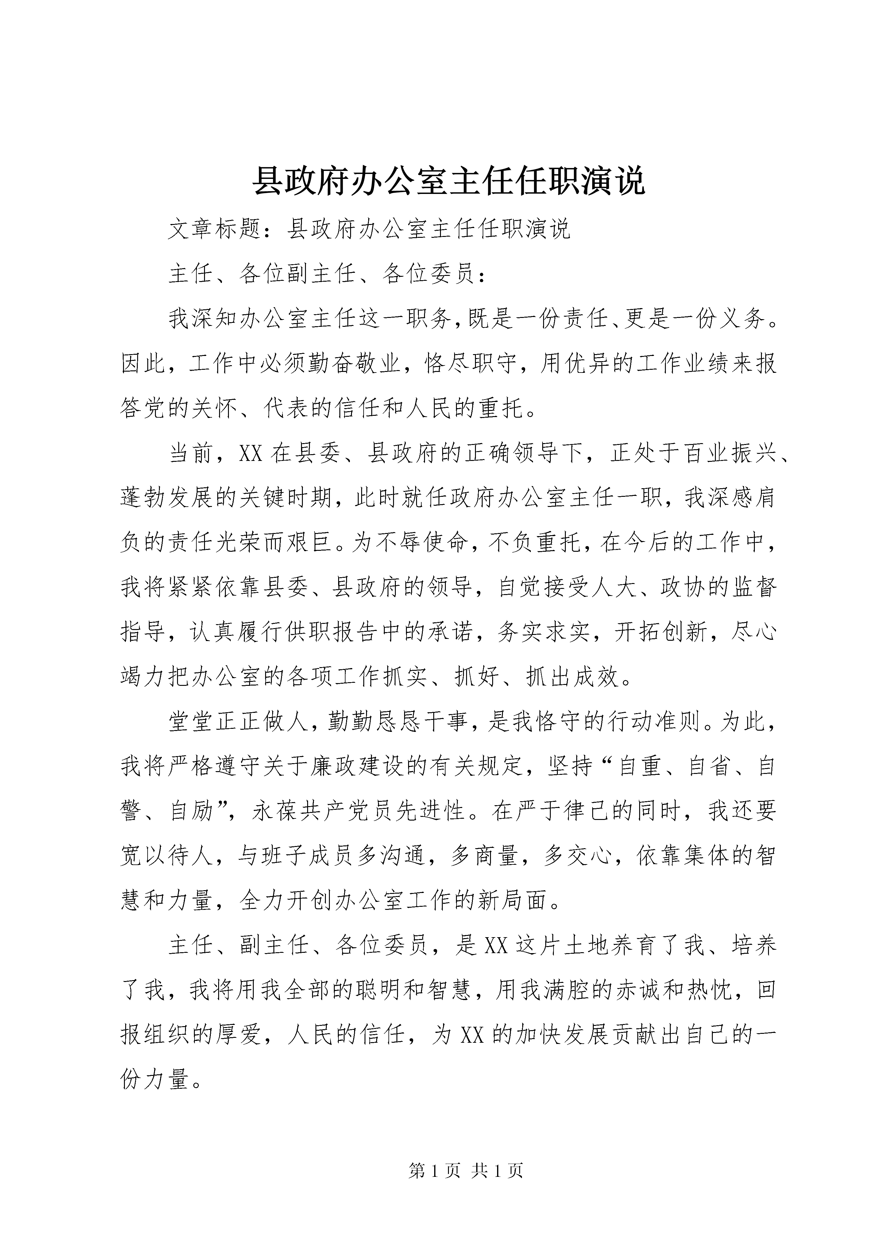 县政府办公室主任任职演说文章标题:县政府办公室主任任职演说主任、各位副主任、各位委员:我深知办公室主任这一职务,既是一份责任、更是一份义务。因此,工作中必须勤奋敬业,恪尽职守,用优异的工作业绩来报答党的关怀、代表的信任和人民的重托。当前,XX在县委、县政府的正确领导下,正处于百业振兴、蓬勃发展的关键时期,此时就任政府办公室主任一职,我深感肩负的责任光荣而艰巨。为不辱使命,不负重托,在今后的工作中,我将紧紧依靠县委、县政府的领导,自觉接受人大、政协的监督指导,认真履行供职报告中的承诺,务实求实,开拓创新,尽心竭力把办公室的各项工作抓实、抓好、抓出成效。堂堂正正做人,勤勤恳恳干事,是我恪守的行动准则。为此,我将严格遵守关于廉政建设的有关规定,坚持“自重、自省、自警、自励”,永葆共产党员先进性。在严于律己的同时,我还要宽以待人,与班子成员多沟通,多商量,多交心,依靠集体的智慧和力量,全力开创办公室工作的新局面。主任、副主任、各位委员,是XX这片土地养育了我、培养了我,我将用我全部的聪明和智慧,用我满腔的赤诚和热忱,回报组织的厚爱,人民的信任,为XX的加快发展贡献出自己的一份力量。《县政府办公室主任任职演说》来源于文秘114网,欢迎阅读县政府办公室主任任职演说。