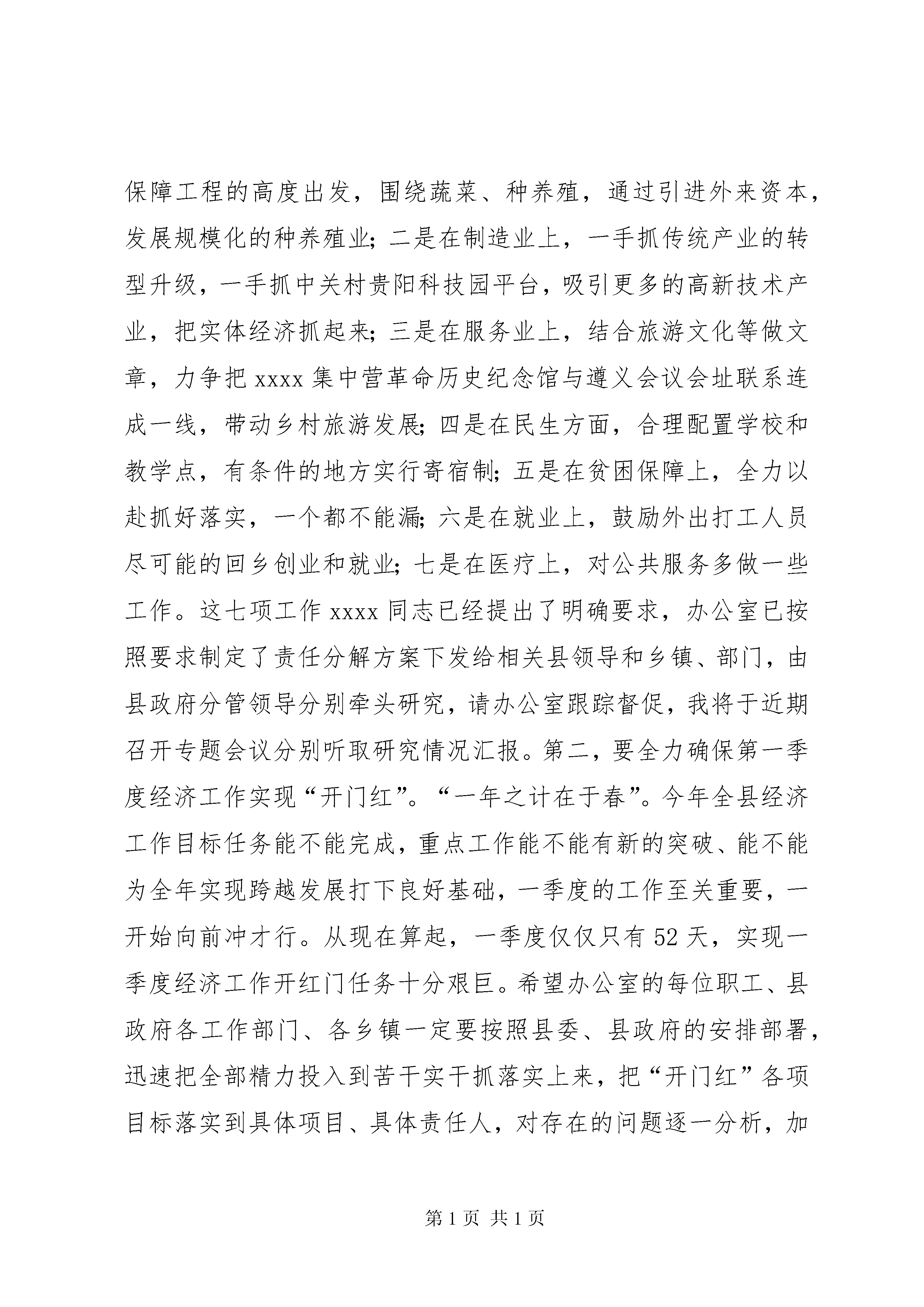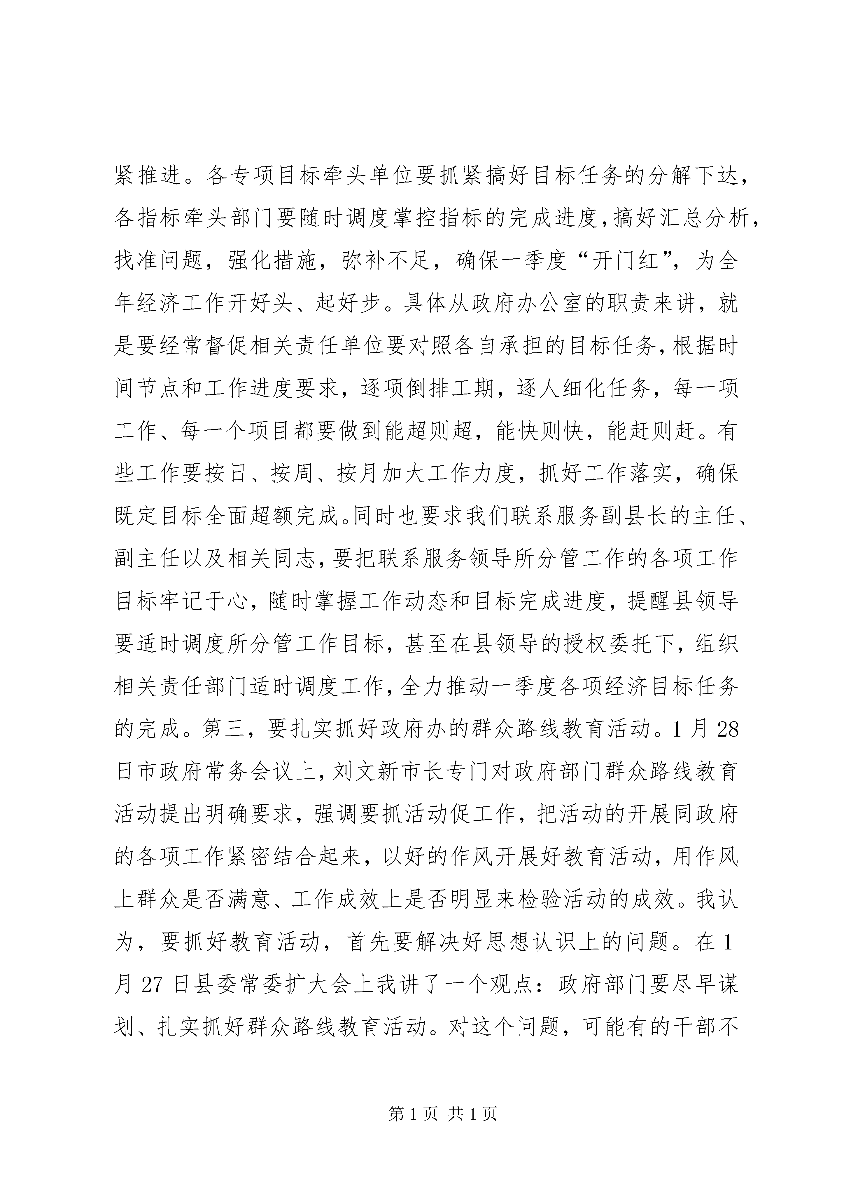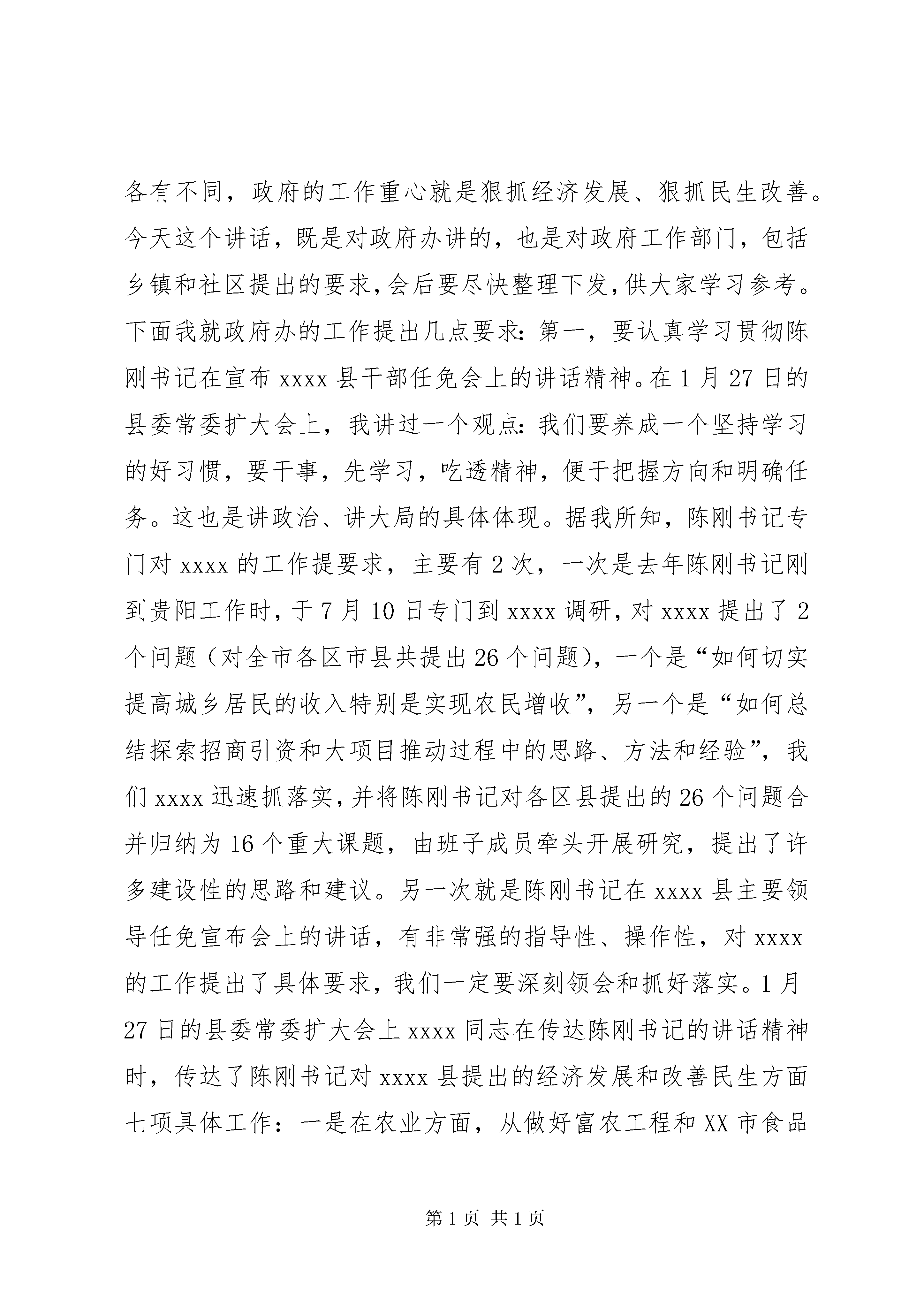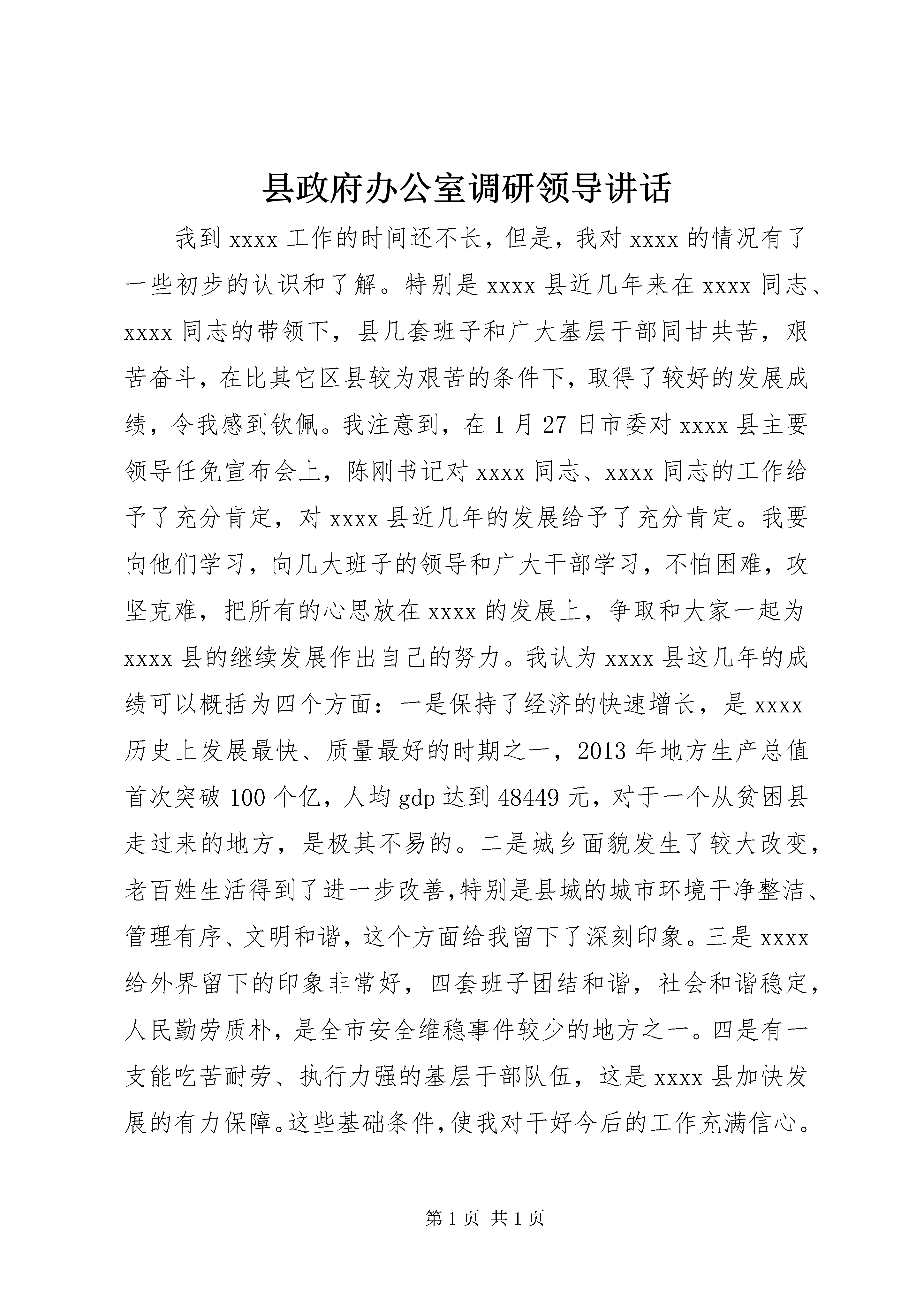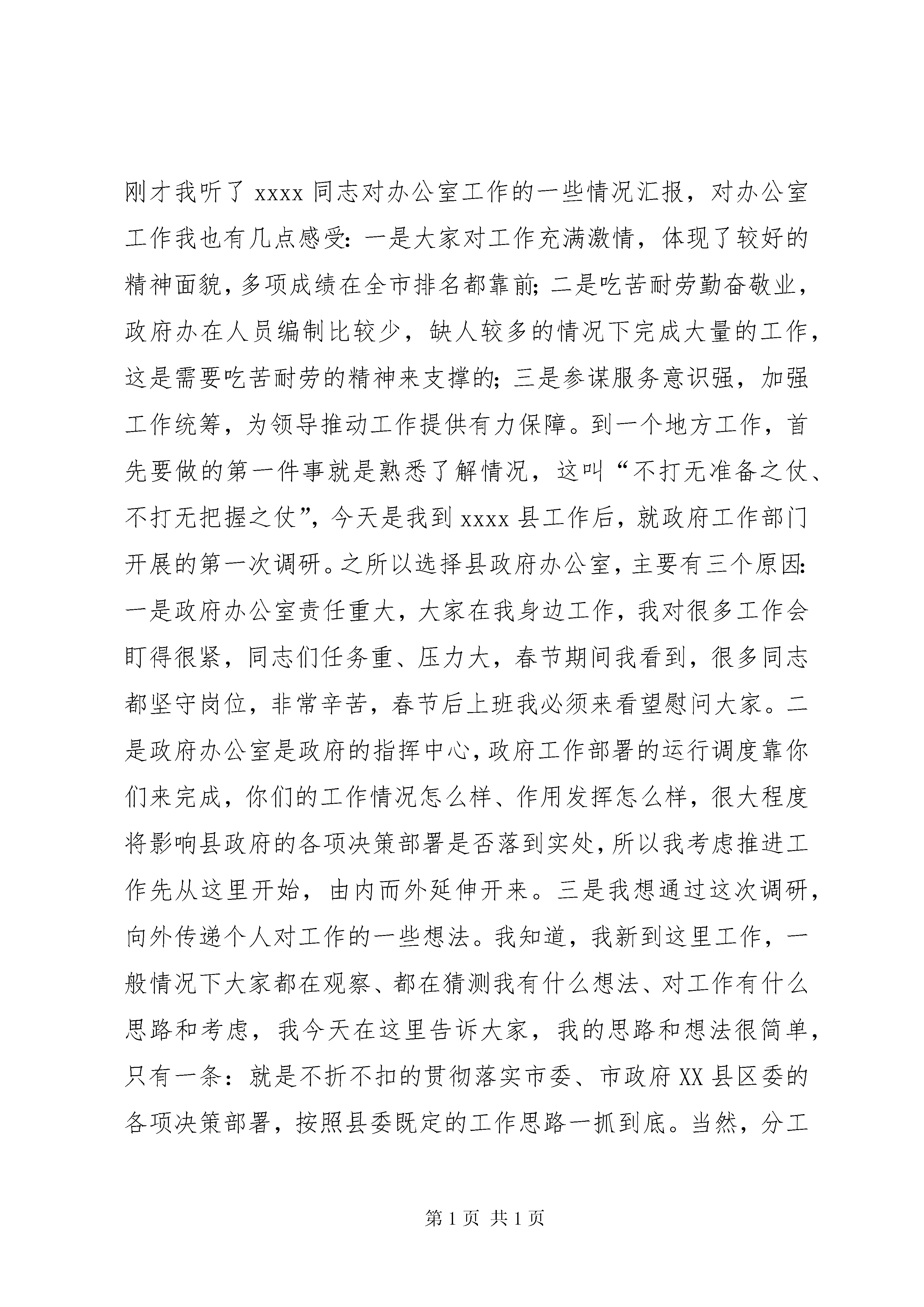 县政府办公室调研领导讲话我到xxxx工作的时间还不长,但是,我对xxxx的情况有了一些初步的认识和了解。特别是xxxx县近几年来在xxxx同志、xxxx同志的带领下,县几套班子和广大基层干部同甘共苦,艰苦奋斗,在比其它区县较为艰苦的条件下,取得了较好的发展成绩,令我感到钦佩。我注意到,在1月27日市委对xxxx县主要领导任免宣布会上,陈刚书记对xxxx同志、xxxx同志的工作给予了充分肯定,对xxxx县近几年的发展给予了充分肯定。我要向他们学习,向几大班子的领导和广大干部学习,不怕困难,攻坚克难,把所有的心思放在xxxx的发展上,争取和大家一起为xxxx县的继续发展作出自己的努力。我认为xxxx县这几年的成绩可以概括为四个方面:一是保持了经济的快速增长,是xxxx历史上发展最快、质量最好的时期之一,2013年地方生产总值首次突破100个亿,人均gdp达到48449元,对于一个从贫困县走过来的地方,是极其不易的。二是城乡面貌发生了较大改变,老百姓生活得到了进一步改善,特别是县城的城市环境干净整洁、管理有序、文明和谐,这个方面给我留下了深刻印象。三是xxxx给外界留下的印象非常好,四套班子团结和谐,社会和谐稳定,人民勤劳质朴,是全市安全维稳事件较少的地方之一。四是有一支能吃苦耐劳、执行力强的基层干部队伍,这是xxxx县加快发展的有力保障。这些基础条件,使我对干好今后的工作充满信心。刚才我听了xxxx同志对办公室工作的一些情况汇报,对办公室工作我也有几点感受:一是大家对工作充满激情,体现了较好的精神面貌,多项成绩在全市排名都靠前;二是吃苦耐劳勤奋敬业,政府办在人员编制比较少,缺人较多的情况下完成大量的工作,这是需要吃苦耐劳的精神来支撑的;三是参谋服务意识强,加强工作统筹,为领导推动工作提供有力保障。到一个地方工作,首先要做的第一件事就是熟悉了解情况,这叫“不打无准备之仗、不打无把握之仗”,今天是我到xxxx县工作后,就政府工作部门开展的第一次调研。之所以选择县政府办公室,主要有三个原因:一是政府办公室责任重大,大家在我身边工作,我对很多工作会盯得很紧,同志们任务重、压力大,春节期间我看到,很多同志都坚守岗位,非常辛苦,春节后上班我必须来看望慰问大家。二是政府办公室是政府的指挥中心,政府工作部署的运行调度靠你们来完成,你们的工作情况怎么样、作用发挥怎么样,很大程度将影响县政府的各项决策部署是否落到实处,所以我考虑推进工作先从这里开始,由内而外延伸开来。三是我想通过这次调研,向外传递个人对工作的一些想法。我知道,我新到这里工作,一般情况下大家都在观察、都在猜测我有什么想法、对工作有什么思路和考虑,我今天在这里告诉大家,我的思路和想法很简单,只有一条:就是不折不扣的贯彻落实市委、市政府XX县区委的各项决策部署,按照县委既定的工作思路一抓到底。当然,分工各有不同,政府的工作重心就是狠抓经济发展、狠抓民生改善。今天这个讲话,既是对政府办讲的,也是对政府工作部门,包括乡镇和社区提出的要求,会后要尽快整理下发,供大家学习参考。下面我就政府办的工作提出几点要求:第一,要认真学习贯彻陈刚书记在宣布xxxx县干部任免会上的讲话精神。在1月27日的县委常委扩大会上,我讲过一个观点:我们要养成一个坚持学习的好习惯,要干事,先学习,吃透精神,便于把握方向和明确任务。这也是讲政治、讲大局的具体体现。据我所知,陈刚书记专门对xxxx的工作提要求,主要有2次,一次是去年陈刚书记刚到贵阳工作时,于7月10日专门到xxxx调研,对xxxx提出了2个问题(对全市各区市县共提出26个问题),一个是“如何切实提高城乡居民的收入特别是实现农民增收”,另一个是“如何总结探索招商引资和大项目推动过程中的思路、方法和经验”,我们xxxx迅速抓落实,并将陈刚书记对各区县提出的26个问题合并归纳为16个重大课题,由班子成员牵头开展研究,提出了许多建设性的思路和建议。另一次就是陈刚书记在xxxx县主要领导任免宣布会上的讲话,有非常强的指导性、操作性,对xxxx的工作提出了具体要求,我们一定要深刻领会和抓好落实。1月27日的县委常委扩大会上xxxx同志在传达陈刚书记的讲话精神时,传达了陈刚书记对xxxx县提出的经济发展和改善民生方面七项具体工作:一是在农业方面,从做好富农工程和XX市食品保障工程的高度出发,围绕蔬菜、种养殖,通过引进外来资本,发展规模化的种养殖业;二是在制造业上,一手抓传统产业的转型升级,一手抓中关村贵阳科技园平台,吸引更多的高新技术产业,把实体经济抓起来;三是在服务业上,结合旅游文化等做文章,力争把xxxx集中营革命历史纪念馆与遵义会议会址联系连成一线,带动乡村旅游发展;四是在民生方面,合理配置学校和教学点,有条件的地方实行寄宿制;五是在贫困保障