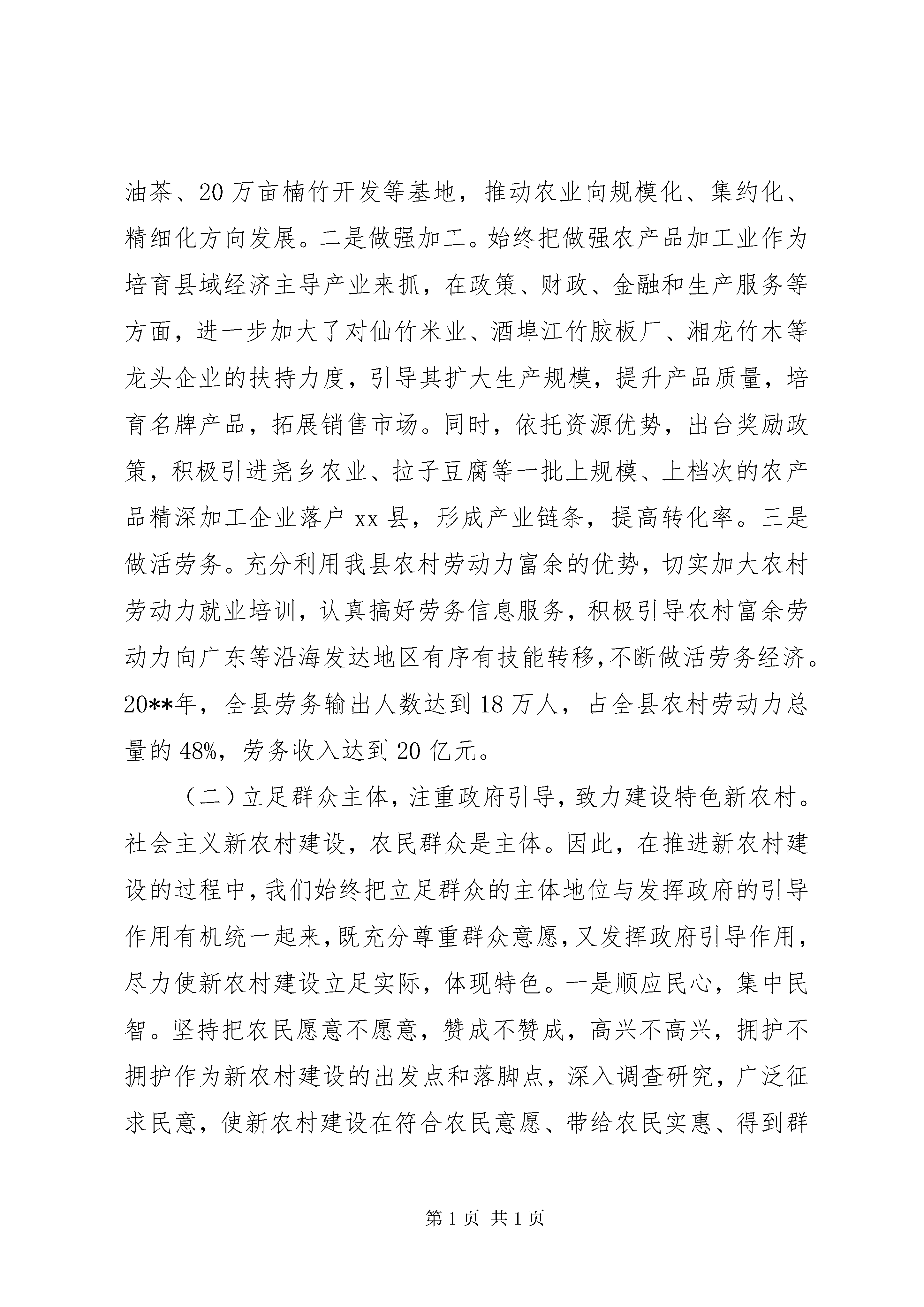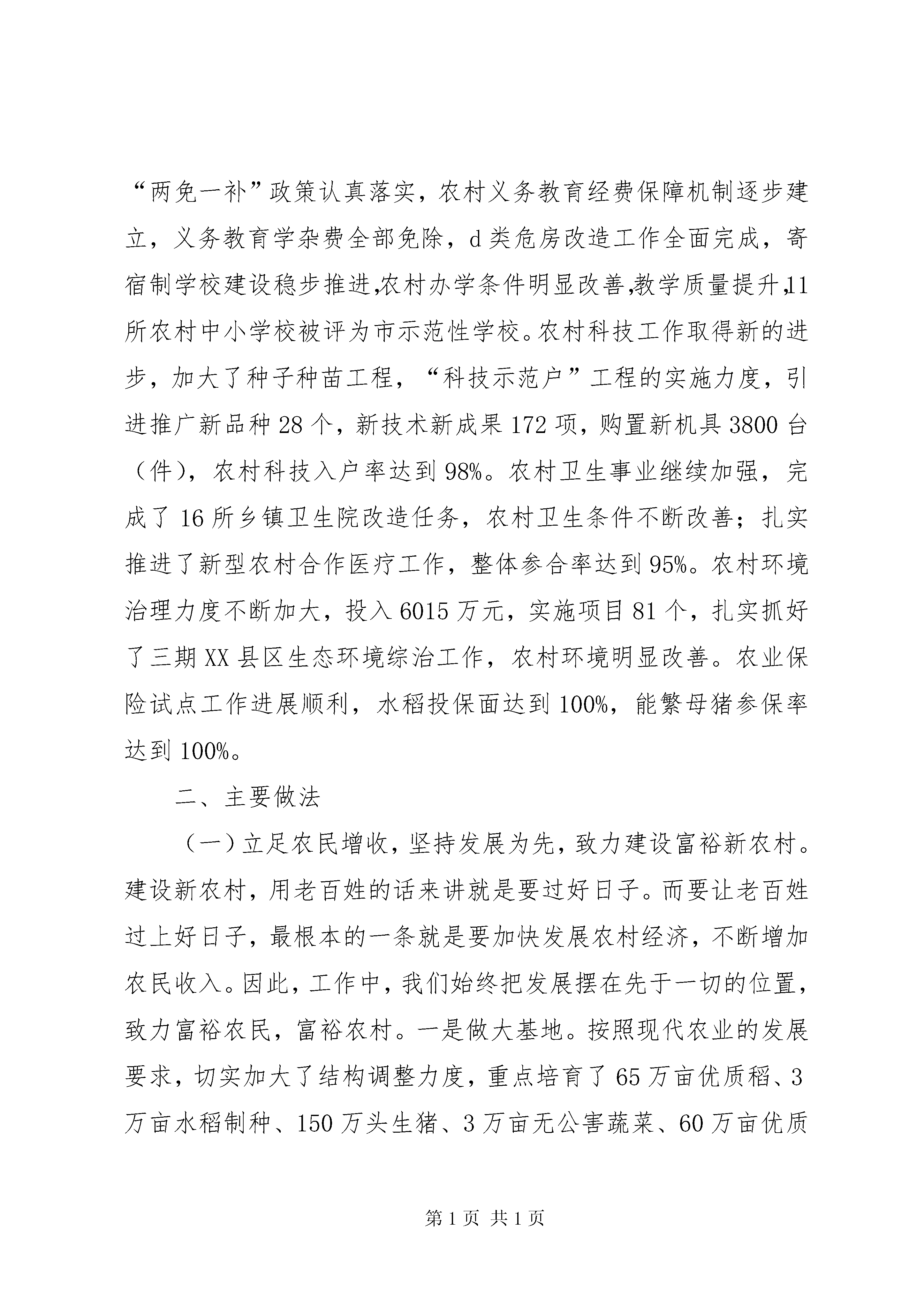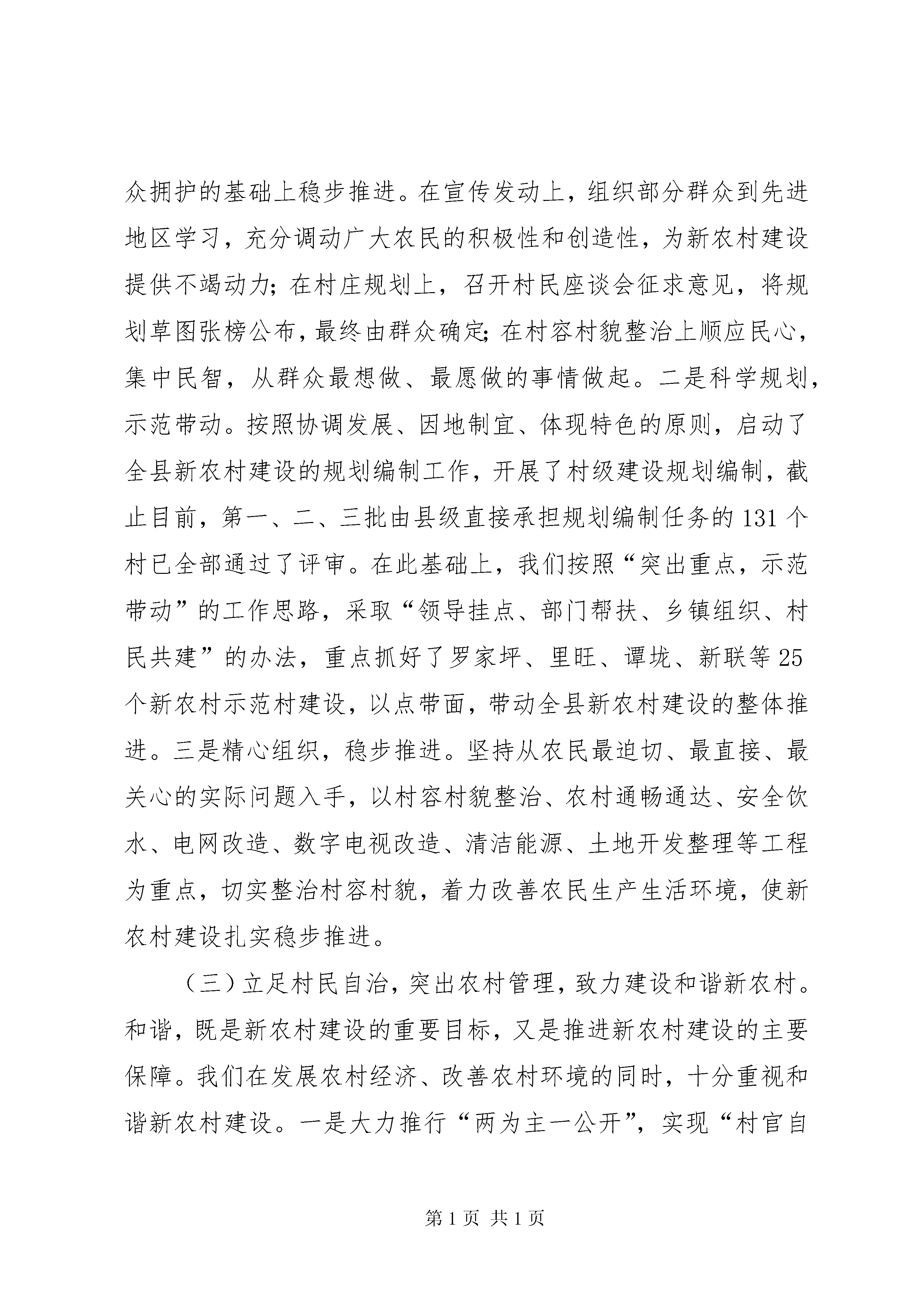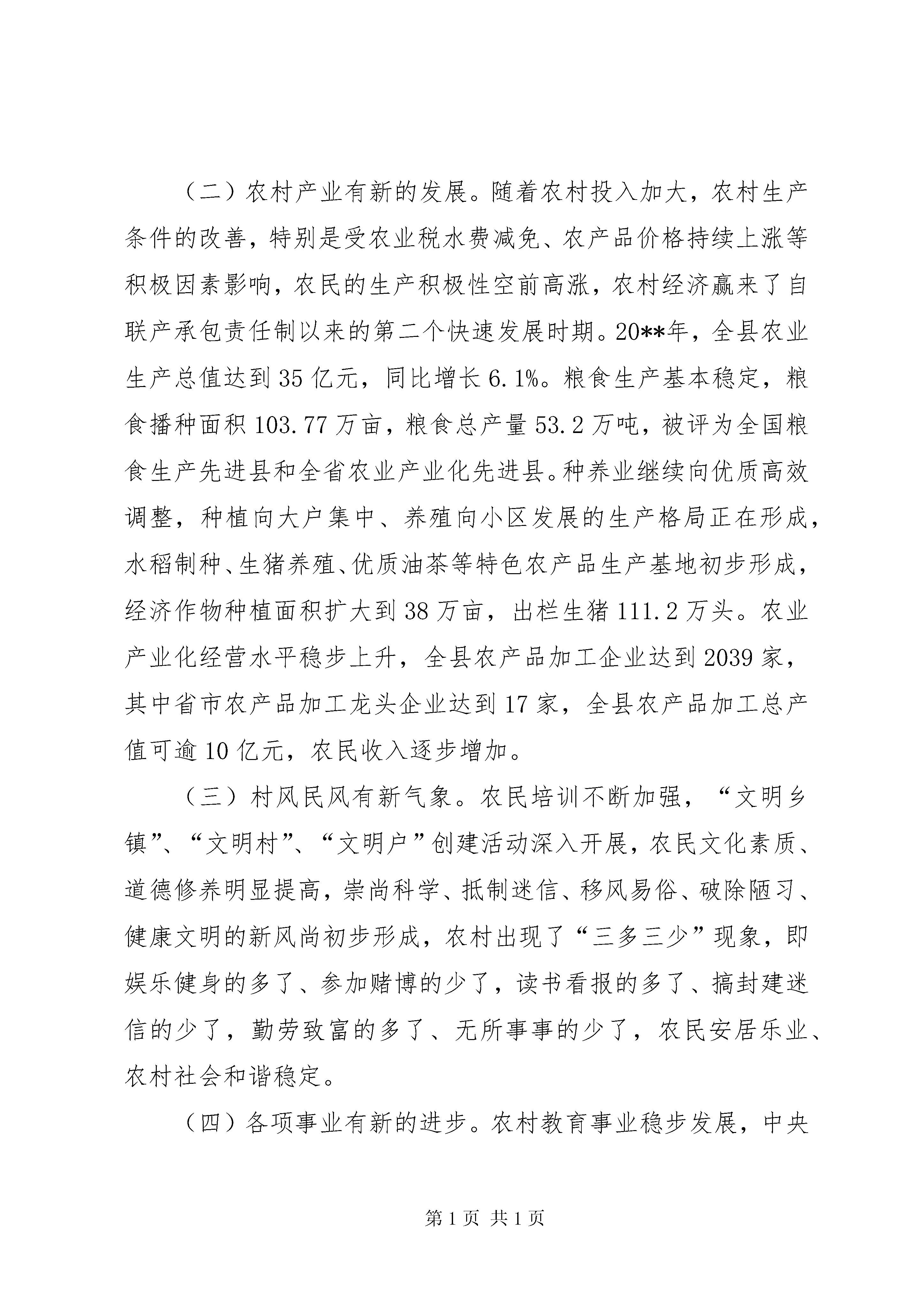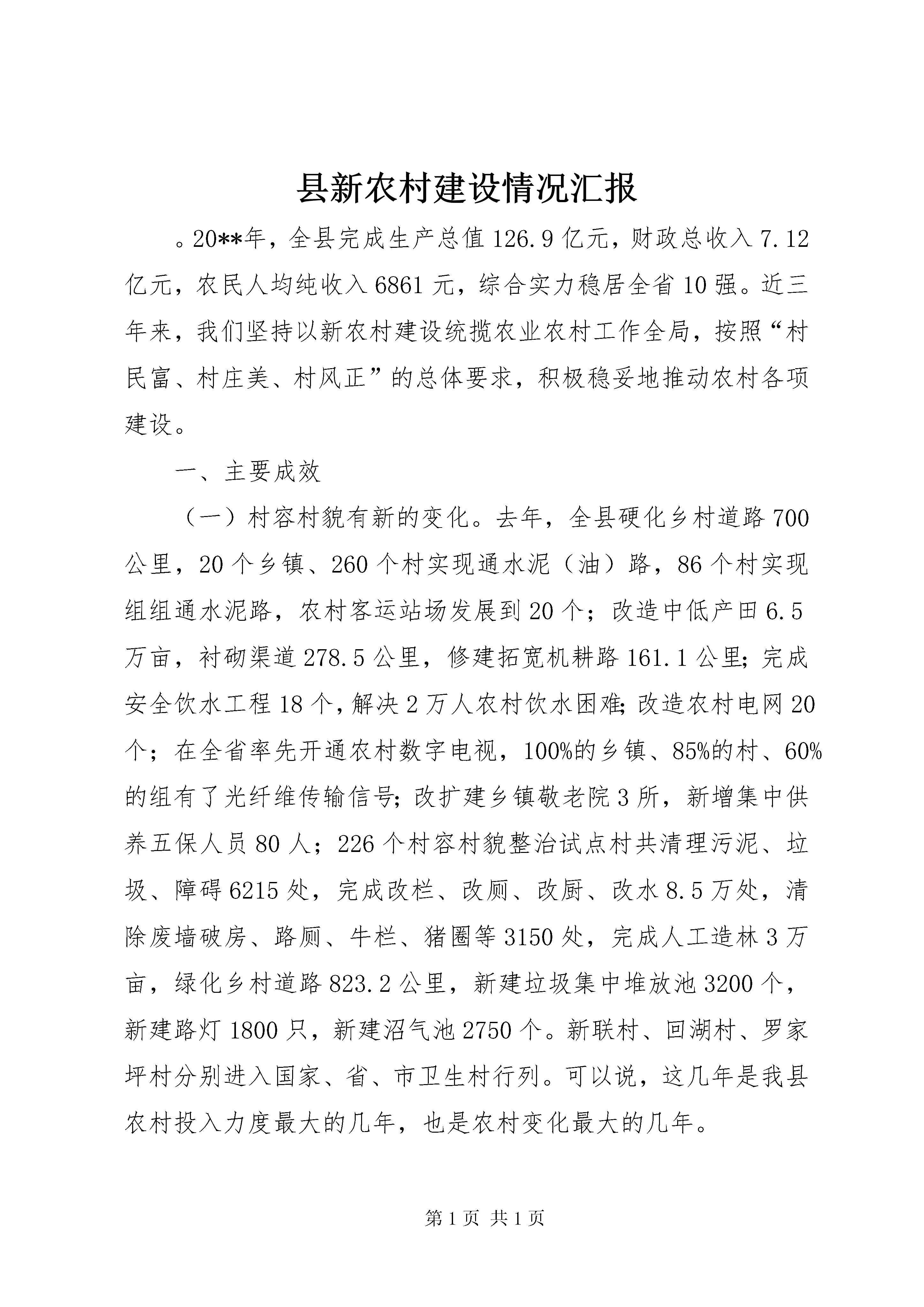县新农村建设情况汇报。20**年,全县完成生产总值126.9亿元,财政总收入7.12亿元,农民人均纯收入6861元,综合实力稳居全省10强。近三年来,我们坚持以新农村建设统揽农业农村工作全局,按照“村民富、村庄美、村风正”的总体要求,积极稳妥地推动农村各项建设。一、主要成效(一)村容村貌有新的变化。去年,全县硬化乡村道路700公里,20个乡镇、260个村实现通水泥(油)路,86个村实现组组通水泥路,农村客运站场发展到20个;改造中低产田6.5万亩,衬砌渠道278.5公里,修建拓宽机耕路161.1公里;完成安全饮水工程18个,解决2万人农村饮水困难;改造农村电网20个;在全省率先开通农村数字电视,100%的乡镇、85%的村、60%的组有了光纤维传输信号;改扩建乡镇敬老院3所,新增集中供养五保人员80人;226个村容村貌整治试点村共清理污泥、垃圾、障碍6215处,完成改栏、改厕、改厨、改水8.5万处,清除废墙破房、路厕、牛栏、猪圈等3150处,完成人工造林3万亩,绿化乡村道路823.2公里,新建垃圾集中堆放池3200个,新建路灯1800只,新建沼气池2750个。新联村、回湖村、罗家坪村分别进入国家、省、市卫生村行列。可以说,这几年是我县农村投入力度最大的几年,也是农村变化最大的几年。(二)农村产业有新的发展。随着农村投入加大,农村生产条件的改善,特别是受农业税水费减免、农产品价格持续上涨等积极因素影响,农民的生产积极性空前高涨,农村经济赢来了自联产承包责任制以来的第二个快速发展时期。20**年,全县农业生产总值达到35亿元,同比增长6.1%。粮食生产基本稳定,粮食播种面积103.77万亩,粮食总产量53.2万吨,被评为全国粮食生产先进县和全省农业产业化先进县。种养业继续向优质高效调整,种植向大户集中、养殖向小区发展的生产格局正在形成,水稻制种、生猪养殖、优质油茶等特色农产品生产基地初步形成,经济作物种植面积扩大到38万亩,出栏生猪111.2万头。农业产业化经营水平稳步上升,全县农产品加工企业达到2039家,其中省市农产品加工龙头企业达到17家,全县农产品加工总产值可逾10亿元,农民收入逐步增加。(三)村风民风有新气象。农民培训不断加强,“文明乡镇”、“文明村”、“文明户”创建活动深入开展,农民文化素质、道德修养明显提高,崇尚科学、抵制迷信、移风易俗、破除陋习、健康文明的新风尚初步形成,农村出现了“三多三少”现象,即娱乐健身的多了、参加赌博的少了,读书看报的多了、搞封建迷信的少了,勤劳致富的多了、无所事事的少了,农民安居乐业、农村社会和谐稳定。(四)各项事业有新的进步。农村教育事业稳步发展,中央“两免一补”政策认真落实,农村义务教育经费保障机制逐步建立,义务教育学杂费全部免除,d类危房改造工作全面完成,寄宿制学校建设稳步推进,农村办学条件明显改善,教学质量提升,11所农村中小学校被评为市示范性学校。农村科技工作取得新的进步,加大了种子种苗工程,“科技示范户”工程的实施力度,引进推广新品种28个,新技术新成果172项,购置新机具3800台(件),农村科技入户率达到98%。农村卫生事业继续加强,完成了16所乡镇卫生院改造任务,农村卫生条件不断改善;扎实推进了新型农村合作医疗工作,整体参合率达到95%。农村环境治理力度不断加大,投入6015万元,实施项目81个,扎实抓好了三期XX县区生态环境综治工作,农村环境明显改善。农业保险试点工作进展顺利,水稻投保面达到100%,能繁母猪参保率达到100%。二、主要做法(一)立足农民增收,坚持发展为先,致力建设富裕新农村。建设新农村,用老百姓的话来讲就是要过好日子。而要让老百姓过上好日子,最根本的一条就是要加快发展农村经济,不断增加农民收入。因此,工作中,我们始终把发展摆在先于一切的位置,致力富裕农民,富裕农村。一是做大基地。按照现代农业的发展要求,切实加大了结构调整力度,重点培育了65万亩优质稻、3万亩水稻制种、150万头生猪、3万亩无公害蔬菜、60万亩优质油茶、20万亩楠竹开发等基地,推动农业向规模化、集约化、精细化方向发展。二是做强加工。始终把做强农产品加工业作为培育县域经济主导产业来抓,在政策、财政、金融和生产服务等方面,进一步加大了对仙竹米业、酒埠江竹胶板厂、湘龙竹木等龙头企业的扶持力度,引导其扩大生产规模,提升产品质量,培育名牌产品,拓展销售市场。同时,依托资源优势,出台奖励政策,积极引进尧乡农业、拉子豆腐等一批上规模、上档次的农产品精深加工企业落户xx县,形成产业链条,提高转化率。三是做活劳务。充分利用我县农村劳动力富余的优势,切实加大农村劳动力就业培训,认真搞好劳务信息服务,积极引导农村富余劳动力向广东等沿海发达地区有序有技能转移,不断做活劳务经济。20**年