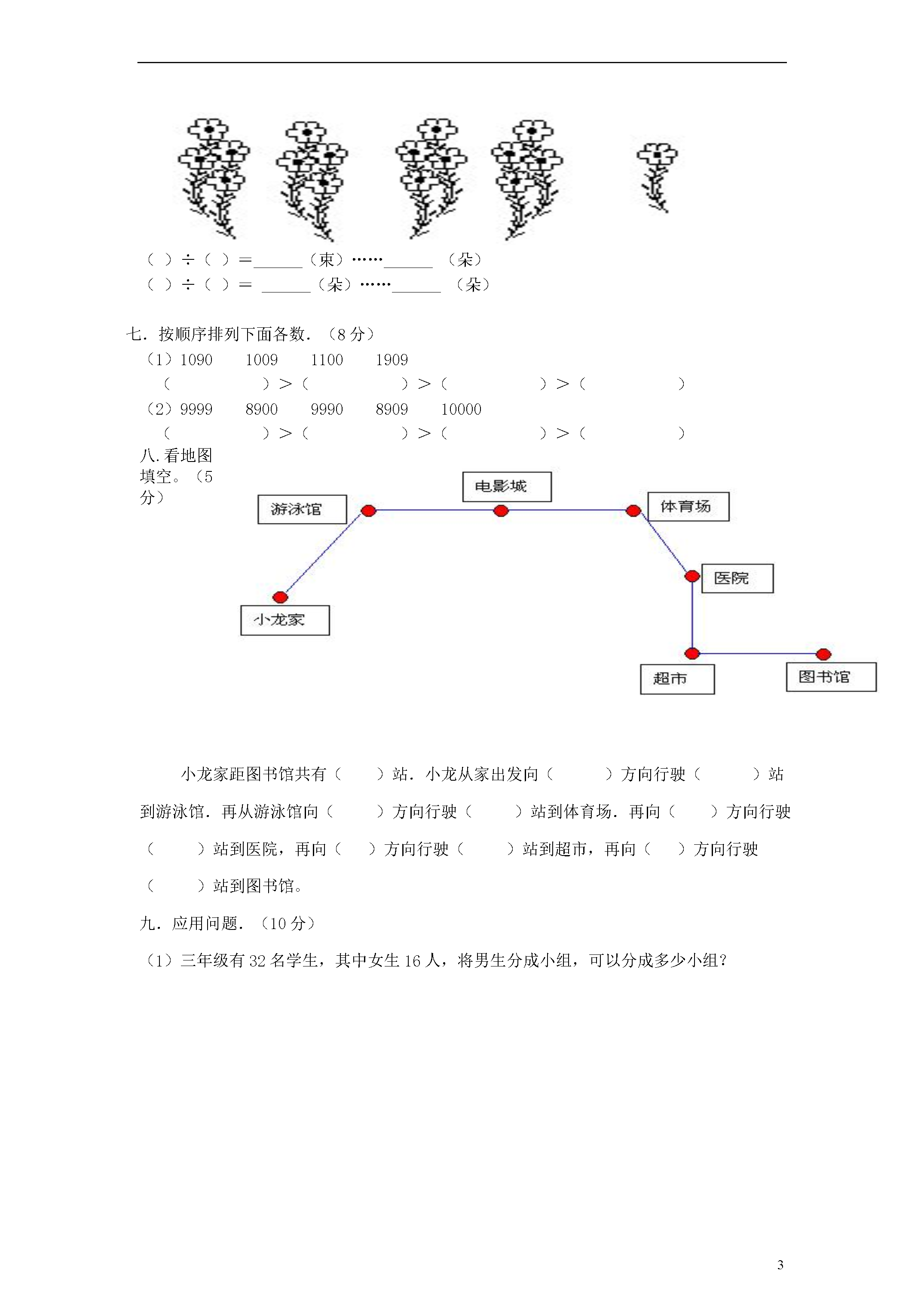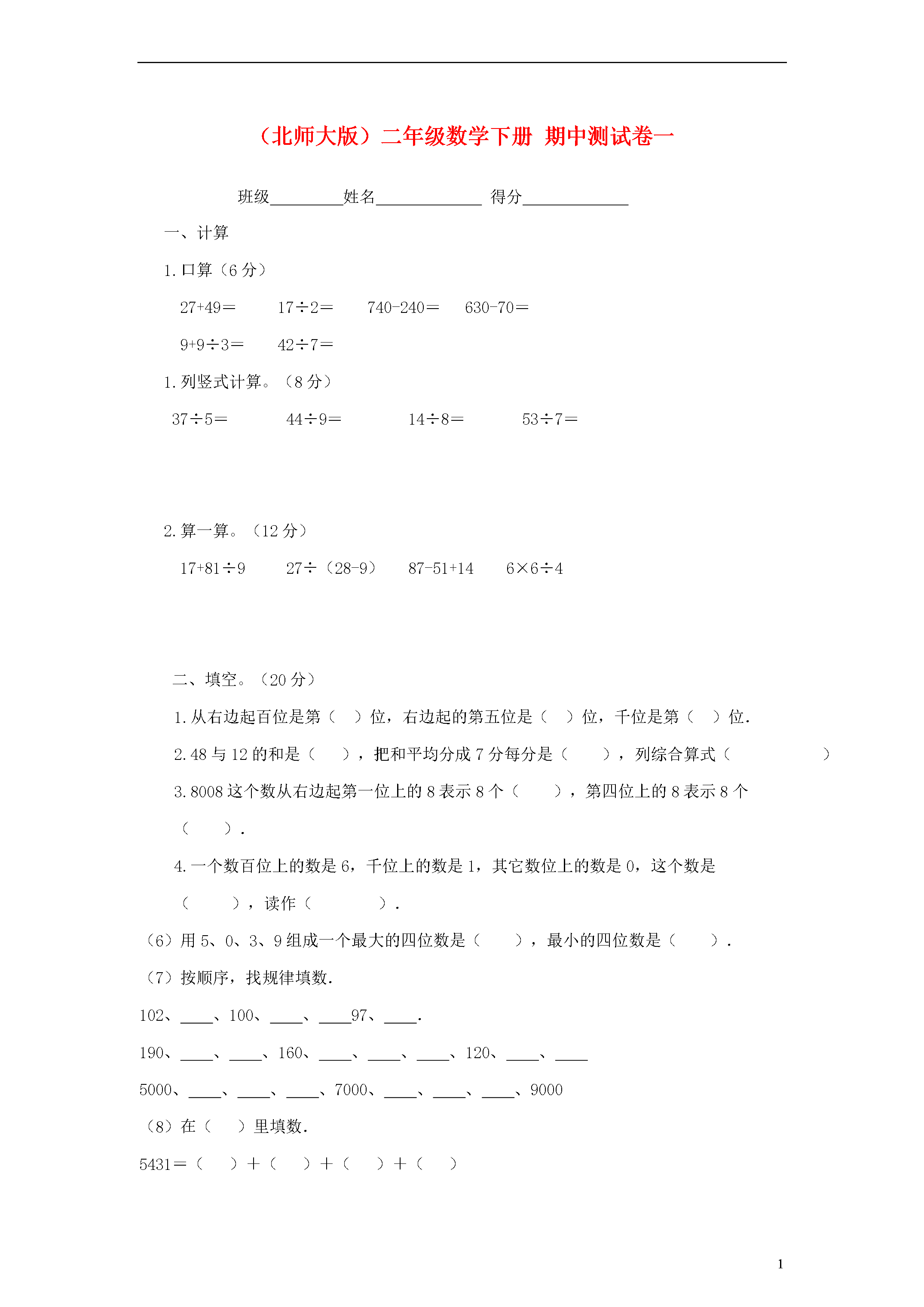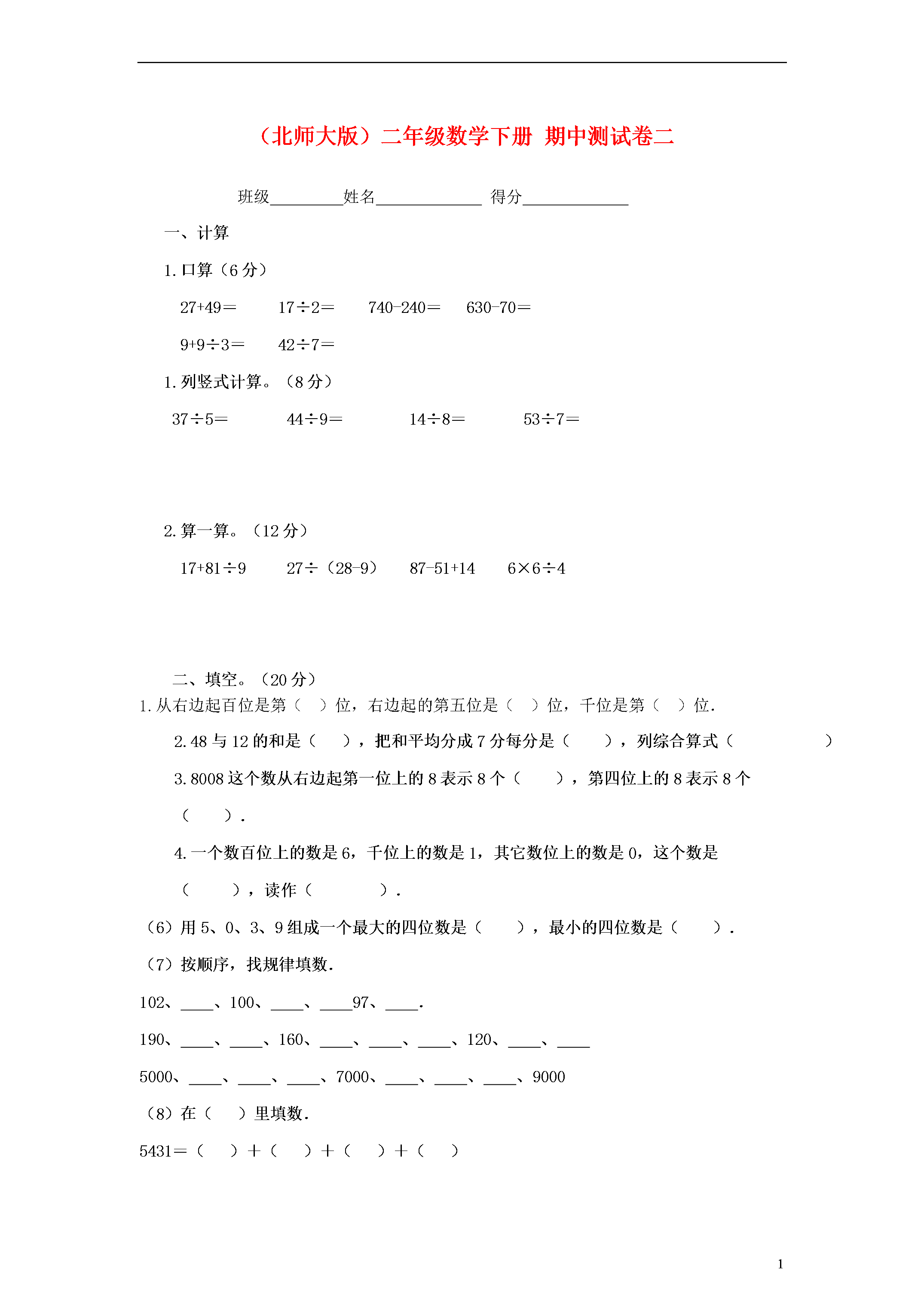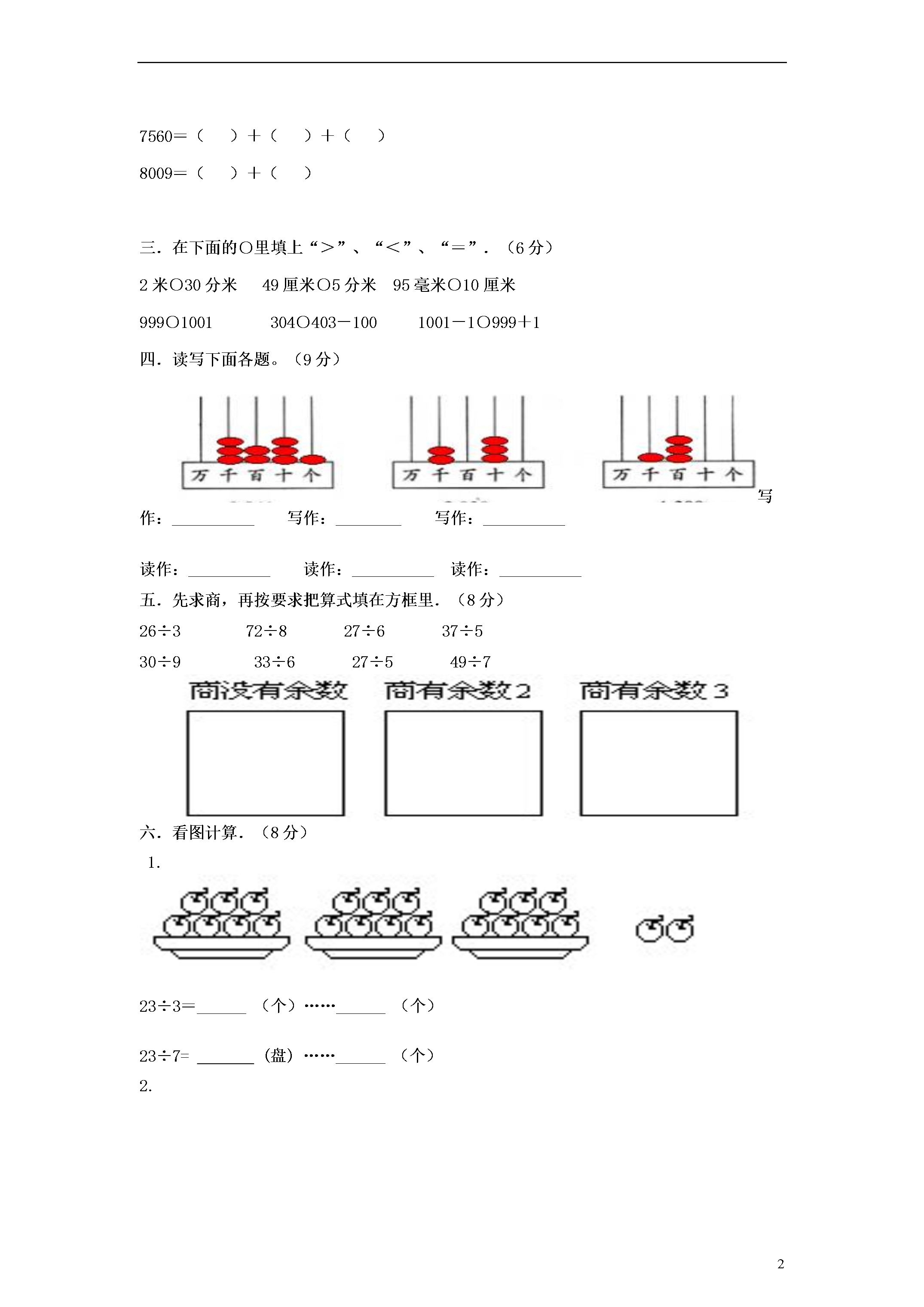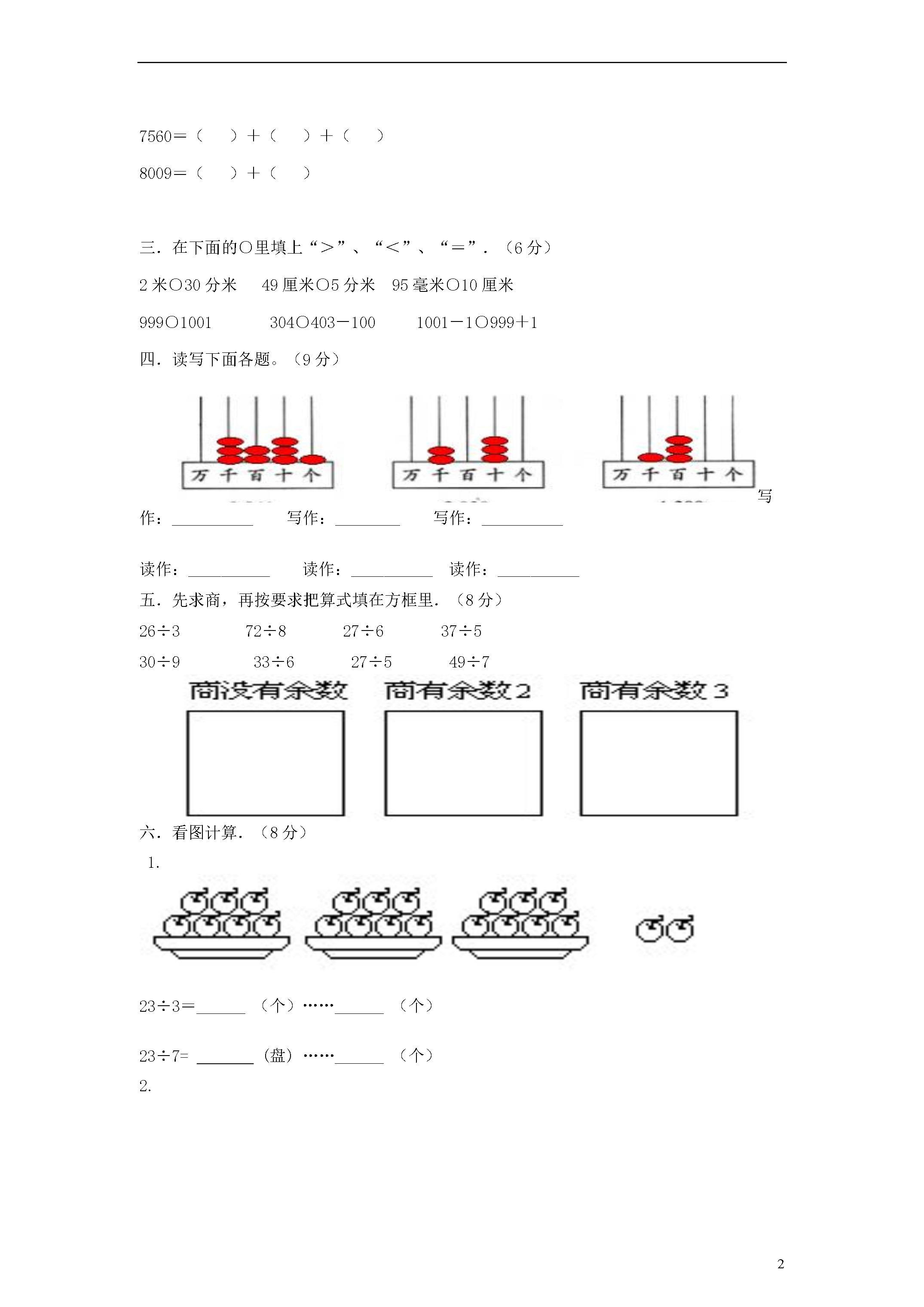 4(北师大版)二年级数学下册期中测试卷一班级姓名得分一、计算1.口算(6分)27+49=17÷2=740-240=630-70=9+9÷3=42÷7=1.列竖式计算。(8分)37÷5=44÷9=14÷8=53÷7=2.算一算。(12分)17+81÷927÷(28-9)87-51+146×6÷4二、填空。(20分)1.从右边起百位是第()位,右边起的第五位是()位,千位是第()位.2.48与12的和是(),把和平均分成7分每分是(),列综合算式()3.8008这个数从右边起第一位上的8表示8个(),第四位上的8表示8个().4.一个数百位上的数是6,千位上的数是1,其它数位上的数是0,这个数是(),读作().(6)用5、0、3、9组成一个最大的四位数是(),最小的四位数是().(7)按顺序,找规律填数.102、、100、、97、.190、、、160、、、、120、、5000、、、、7000、、、、9000(8)在()里填数.5431=()+()+()+()7560=()+()+()8009=()+()三.在下面的○里填上“>”、“<”、“=”.(6分)2米○30分米49厘米○5分米95毫米○10厘米999○1001304○403-1001001-1○999+1四.读写下面各题。(9分)写作:_____写作:____写作:_____读作:_____读作:_____读作:_____五.先求商,再按要求把算式填在方框里.(8分)26÷372÷827÷637÷530÷933÷627÷549÷7六.看图计算.(8分)1.23÷3=______(个)……______(个)23÷7=(盘)……______(个)2.()÷()=______(束)……______(朵)()÷()=______(朵)……______(朵)七.按顺序排列下面各数.(8分)(1)1090100911001909()>()>()>()(2)999989009990890910000()>()>()>()八.看地图填空。(5分)小龙家距图书馆共有()站.小龙从家出发向()方向行驶()站到游泳馆.再从游泳馆向()方向行驶()站到体育场.再向()方向行驶()站到医院,再向()方向行驶()站到超市,再向()方向行驶()站到图书馆。九.应用问题.(10分)(1)三年级有32名学生,其中女生16人,将男生分成小组,可以分成多少小组?(2)一个皮球6元,王老师带了35元钱去买皮球,他最多可买多少个皮球?4(北师大版)二年级数学下册期中测试卷二班级姓名得分一、计算1.口算(6分)27+49=17÷2=740-240=630-70=9+9÷3=42÷7=1.列竖式计算。(8分)37÷5=44÷9=14÷8=53÷7=2.算一算。(12分)17+81÷927÷(28-9)87-51+146×6÷4二、填空。(20分)1.从右边起百位是第()位,右边起的第五位是()位,千位是第()位.2.48与12的和是(),把和平均分成7分每分是(),列综合算式()3.8008这个数从右边起第一位上的8表示8个(),第四位上的8表示8个().4.一个数百位上的数是6,千位上的数是1,其它数位上的数是0,这个数是(),读作().(6)用5、0、3、9组成一个最大的四位数是(),最小的四位数是().(7)按顺序,找规律填数.102、、100、、97、.190、、、160、、、、120、、5000、、、、7000、、、、9000(8)在()里填数.5431=()+()+()+()7560=()+()+()8009=()+()三.在下面的○里填上“>”、“<”、“=”.(6分)2米○30分米49厘米○5分米95毫米○10厘米999○1001304○403-1001001-1○999+1四.读写下面各题。(9分)写作:_____写作:____写作:_____读作:_____读作:_____读作:_____五.先求商,再按要求把算式填在方框里.(8分)26÷372÷827÷637÷530÷933÷627÷549÷7六.看图计算.(8分)1.23÷3=______(个)……______(个)23÷7=(盘)……______(个)2.()÷()=______(束)……______(朵)()÷()=______(朵)……______(朵)七.按顺序排列下面各数.(8分)(1)1090100911001909()>()>()>()(2)999989009990890910000()>()>()>()八.看地图填空。(5分)小龙家距图书馆共有()站.小龙从家出发向()方向行驶()站到游泳馆.再从游泳馆向()方向行驶()站到体育场.再向()方向行驶()站到医院,再向()方向行驶()站到超市,再向()方向行驶()站到图书馆。九.应