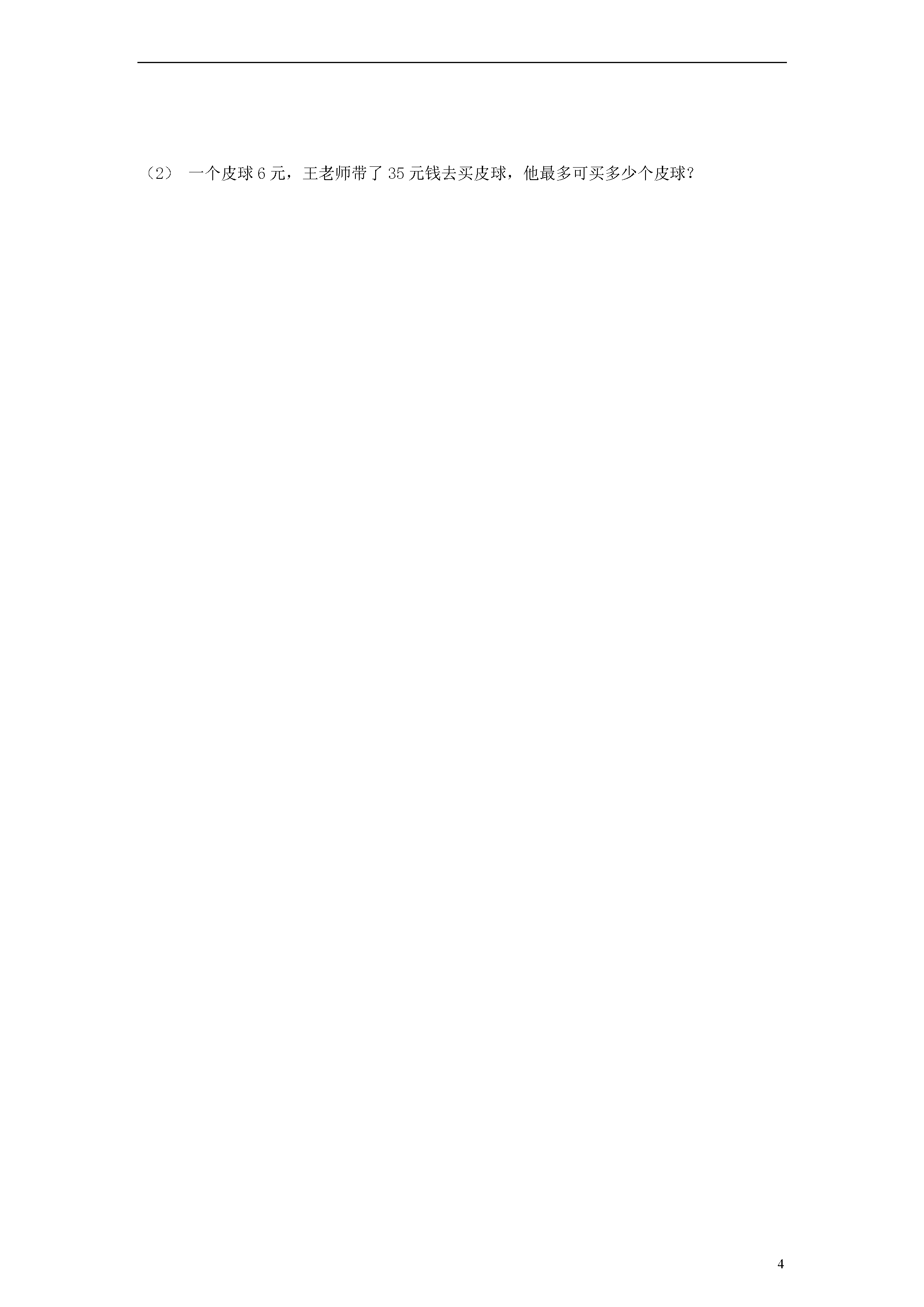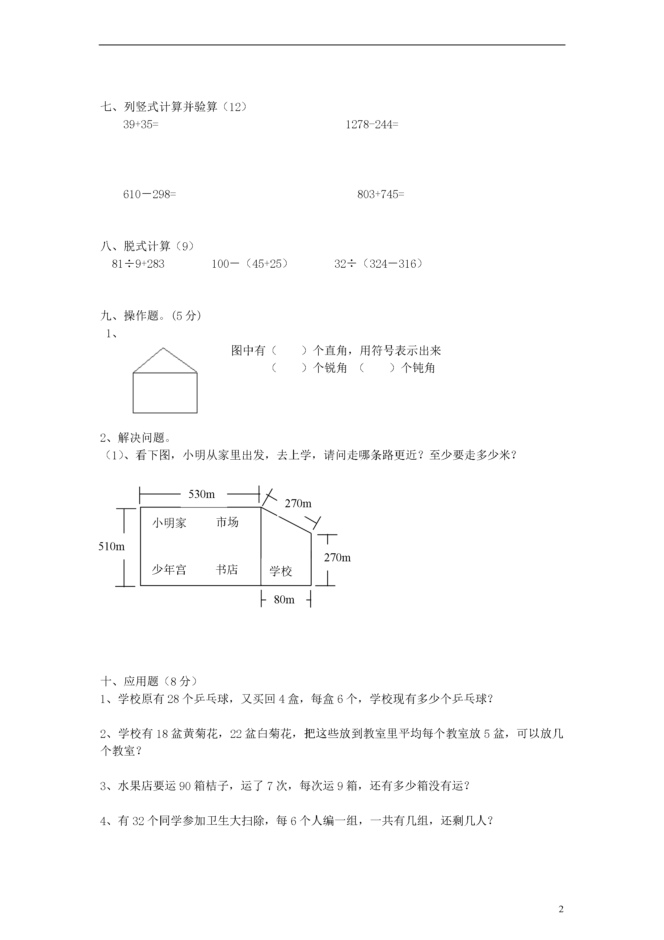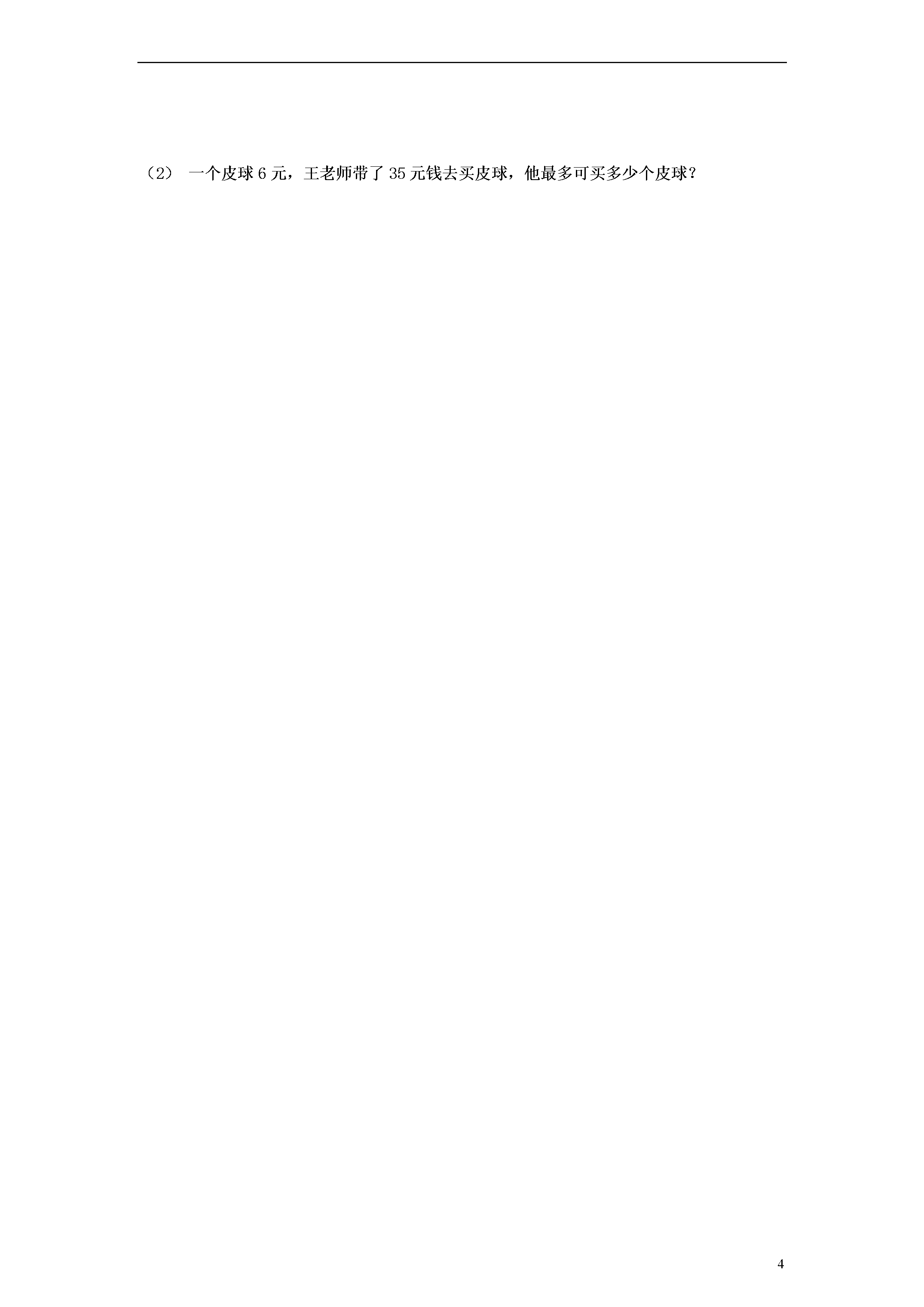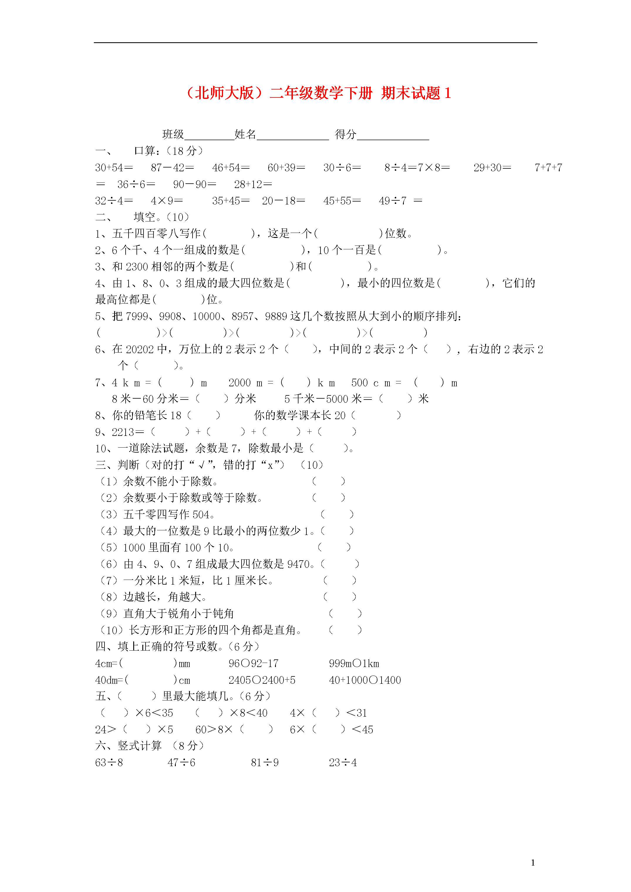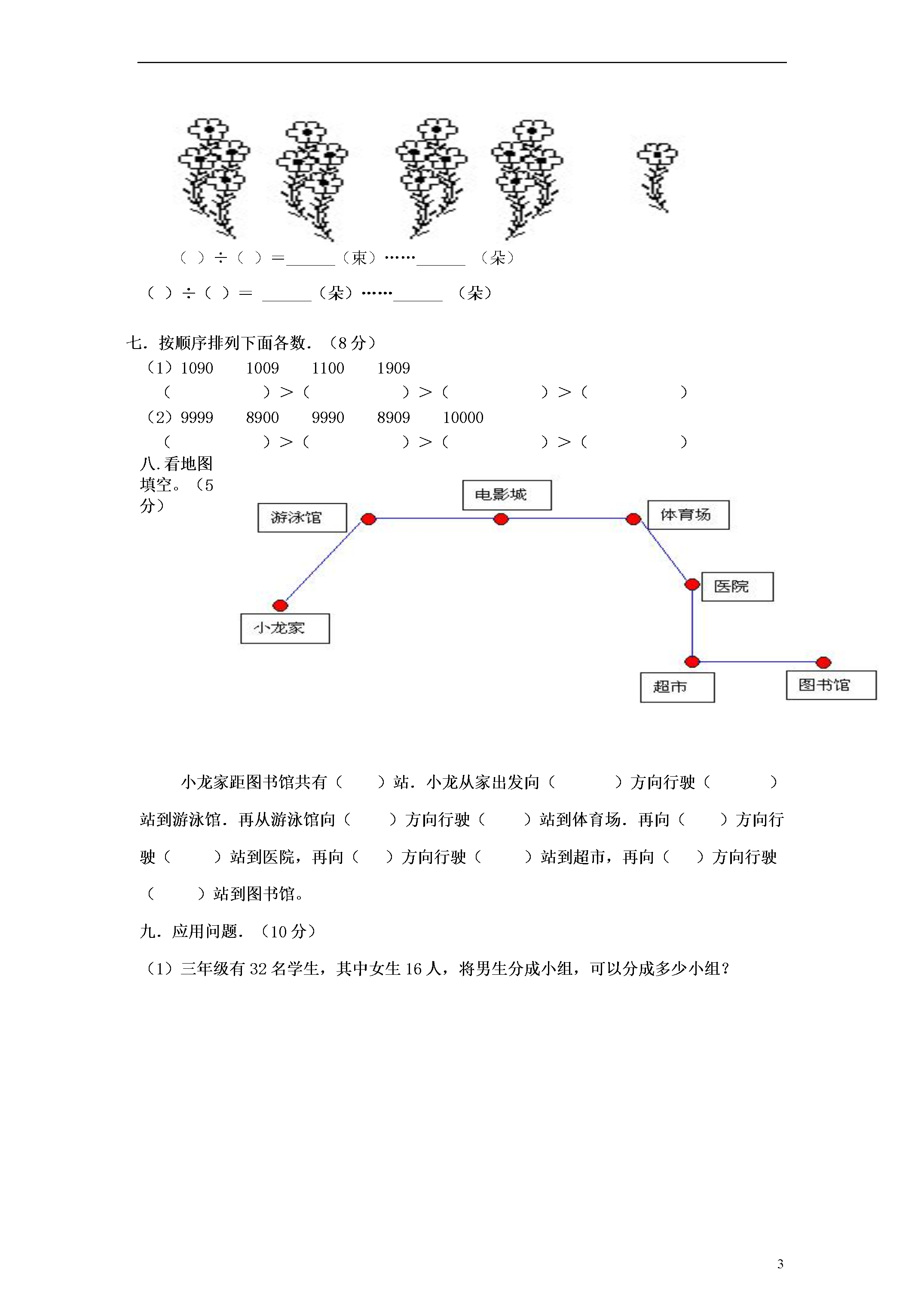 4(北师大版)二年级数学下册期中测试卷一班级姓名得分一、计算1.口算(6分)27+49=17÷2=740-240=630-70=9+9÷3=42÷7=1.列竖式计算。(8分)37÷5=44÷9=14÷8=53÷7=2.算一算。(12分)17+81÷927÷(28-9)87-51+146×6÷4二、填空。(20分)1.从右边起百位是第()位,右边起的第五位是()位,千位是第()位.2.48与12的和是(),把和平均分成7分每分是(),列综合算式()3.8008这个数从右边起第一位上的8表示8个(),第四位上的8表示8个().4.一个数百位上的数是6,千位上的数是1,其它数位上的数是0,这个数是(),读作().(6)用5、0、3、9组成一个最大的四位数是(),最小的四位数是().(7)按顺序,找规律填数.102、、100、、97、.190、、、160、、、、120、、5000、、、、7000、、、、9000(8)在()里填数.5431=()+()+()+()7560=()+()+()8009=()+()三.在下面的○里填上“>”、“<”、“=”.(6分)2米○30分米49厘米○5分米95毫米○10厘米999○1001304○403-1001001-1○999+1四.读写下面各题。(9分)写作:_____写作:____写作:_____读作:_____读作:_____读作:_____五.先求商,再按要求把算式填在方框里.(8分)26÷372÷827÷637÷530÷933÷627÷549÷7六.看图计算.(8分)1.23÷3=______(个)……______(个)23÷7=(盘)……______(个)2.()÷()=______(束)……______(朵)()÷()=______(朵)……______(朵)七.按顺序排列下面各数.(8分)(1)1090100911001909()>()>()>()(2)999989009990890910000()>()>()>()八.看地图填空。(5分)小龙家距图书馆共有()站.小龙从家出发向()方向行驶()站到游泳馆.再从游泳馆向()方向行驶()站到体育场.再向()方向行驶()站到医院,再向()方向行驶()站到超市,再向()方向行驶()站到图书馆。九.应用问题.(10分)(1)三年级有32名学生,其中女生16人,将男生分成小组,可以分成多少小组?(2)一个皮球6元,王老师带了35元钱去买皮球,他最多可买多少个皮球?4(北师大版)二年级数学下册期中测试卷二班级姓名得分一、计算1.口算(6分)27+49=17÷2=740-240=630-70=9+9÷3=42÷7=1.列竖式计算。(8分)37÷5=44÷9=14÷8=53÷7=2.算一算。(12分)17+81÷927÷(28-9)87-51+146×6÷4二、填空。(20分)1.从右边起百位是第()位,右边起的第五位是()位,千位是第()位.2.48与12的和是(),把和平均分成7分每分是(),列综合算式()3.8008这个数从右边起第一位上的8表示8个(),第四位上的8表示8个().4.一个数百位上的数是6,千位上的数是1,其它数位上的数是0,这个数是(),读作().(6)用5、0、3、9组成一个最大的四位数是(),最小的四位数是().(7)按顺序,找规律填数.102、、100、、97、.190、、、160、、、、120、、5000、、、、7000、、、、9000(8)在()里填数.5431=()+()+()+()7560=()+()+()8009=()+()三.在下面的○里填上“>”、“<”、“=”.(6分)2米○30分米49厘米○5分米95毫米○10厘米999○1001304○403-1001001-1○999+1四.读写下面各题。(9分)写作:_____写作:____写作:_____读作:_____读作:_____读作:_____五.先求商,再按要求把算式填在方框里.(8分)26÷372÷827÷637÷530÷933÷627÷549÷7六.看图计算.(8分)1.23÷3=______(个)……______(个)23÷7=(盘)……______(个)2.()÷()=______(束)……______(朵)()÷()=______(朵)……______(朵)七.按顺序排列下面各数.(8分)(1)1090100911001909()>()>()>()(2)999989009990890910000()>()>()>()八.看地图填空。(5分)小龙家距图书馆共有()站.小龙从家出发向()方向行驶()站到游泳馆.再从游泳馆向()方向行驶()站到体育场.再向()方向行驶()站到医院,再向()方向行驶()站到超市,再向()方向行驶()站到图书馆。九.应