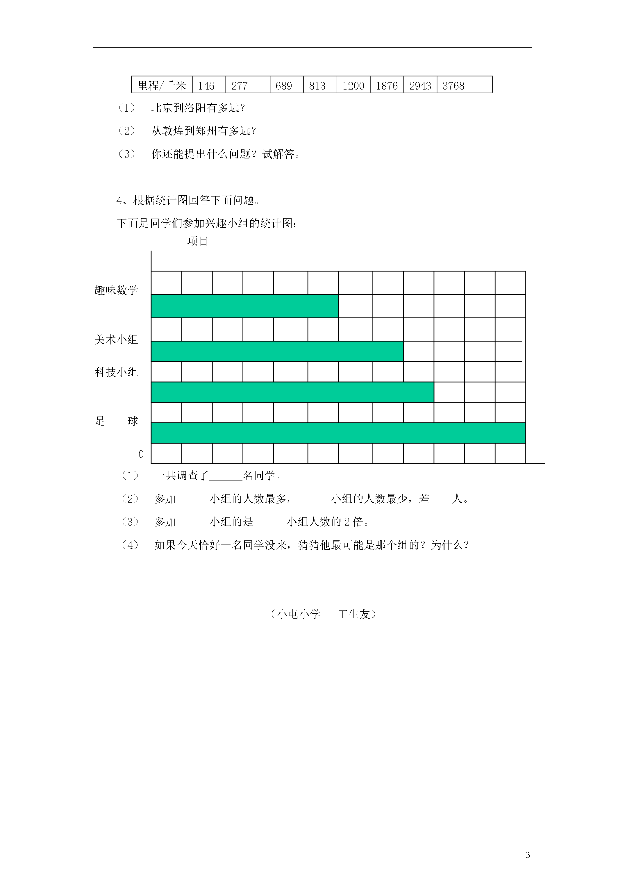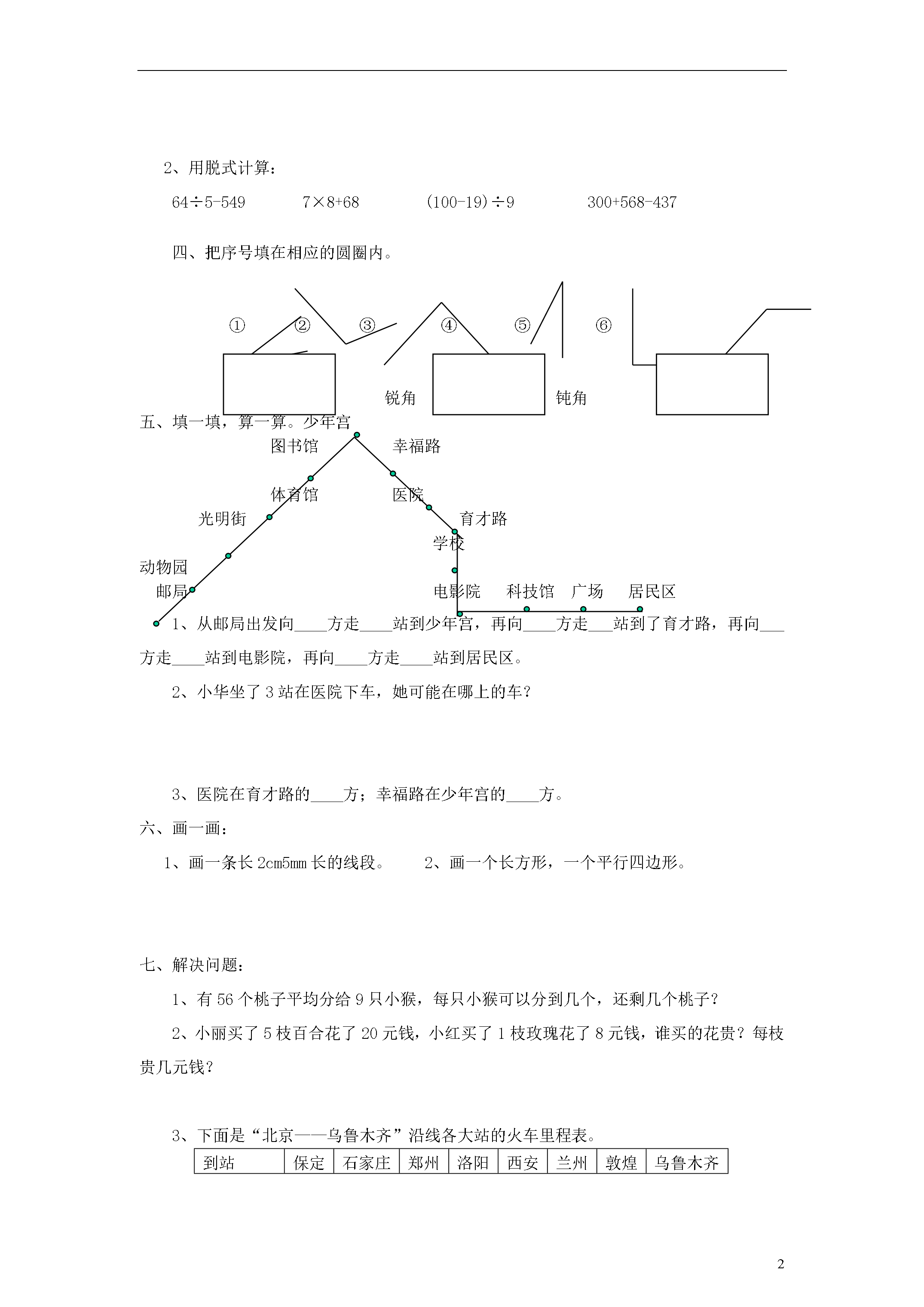3(北师大版)二年级数学下册期末测试姓名年级一、填空:1、一个数从右起第二位是()位,第五位是()位。2、一个四位数,它的千位上是8,十位上是5,其它数位上是0,这个数是()。3、一个一个地数,398后面连续三个数是()、()、()。4、()dm=1m100cm=()m=()dm5、用8,3,0,0四个数字组成的四位数中,最大的是(),最小的是(),只读一个零的是(),一个零不读的是()。6、写出下列各数:(1)六百零九()(2)两千零八十()(3)五百五十千米()(4)一万年()(5)6个千8个百组成()。(6)三位数中最小的数()(7)动物园共有一千零七十八种动物。()7、按从大到小的顺序排列下面各数。580056288324108()<()<()<()<()8、一个火柴盒长6();一把尺子长2();一段铁路长1000()。二、判断,对的打“”,错的打“”。1、1999添上1就是2000。()2、课桌的高80mm左右。()3、一个数的最高位是千位,这个数是一个五位数。()4、平行四边形的四个角都是直角。()5、当你看《中国地图》时,你的左边就是地图的西方。()6、300厘米的长度相当于3米的长度。()计算:1、用竖式计算:(任选取两题验算)258+136=602-445=126+356+408=800-(125+368)=2、用脱式计算:64÷5-5497×8+68(100-19)÷9300+568-437四、把序号填在相应的圆圈内。①②③④⑤⑥直角锐角钝角五、填一填,算一算。少年宫图书馆幸福路体育馆医院光明街育才路学校动物园邮局电影院科技馆广场居民区1、从邮局出发向____方走____站到少年宫,再向____方走___站到了育才路,再向___方走____站到电影院,再向____方走____站到居民区。2、小华坐了3站在医院下车,她可能在哪上的车?3、医院在育才路的____方;幸福路在少年宫的____方。六、画一画:1、画一条长2cm5mm长的线段。2、画一个长方形,一个平行四边形。七、解决问题:1、有56个桃子平均分给9只小猴,每只小猴可以分到几个,还剩几个桃子?2、小丽买了5枝百合花了20元钱,小红买了1枝玫瑰花了8元钱,谁买的花贵?每枝贵几元钱?3、下面是“北京——乌鲁木齐”沿线各大站的火车里程表。到站保定石家庄郑州洛阳西安兰州敦煌乌鲁木齐里程/千米1462776898131200187629433768北京到洛阳有多远?从敦煌到郑州有多远?你还能提出什么问题?试解答。4、根据统计图回答下面问题。下面是同学们参加兴趣小组的统计图:项目趣味数学美术小组科技小组足球人数0123456789101112一共调查了______名同学。参加______小组的人数最多,______小组的人数最少,差____人。参加______小组的是______小组人数的2倍。如果今天恰好一名同学没来,猜猜他最可能是那个组的?为什么?(小屯小学王生友)