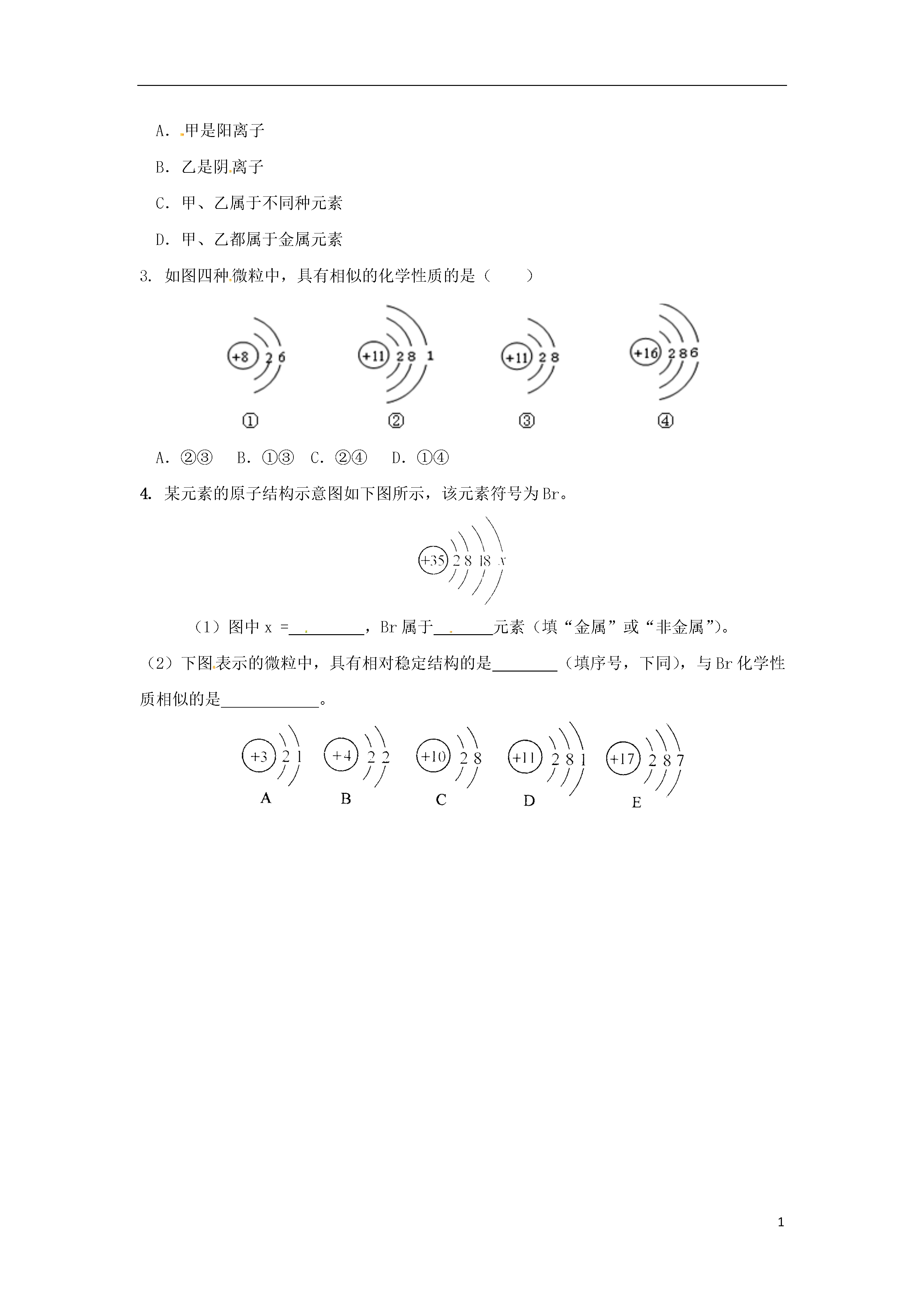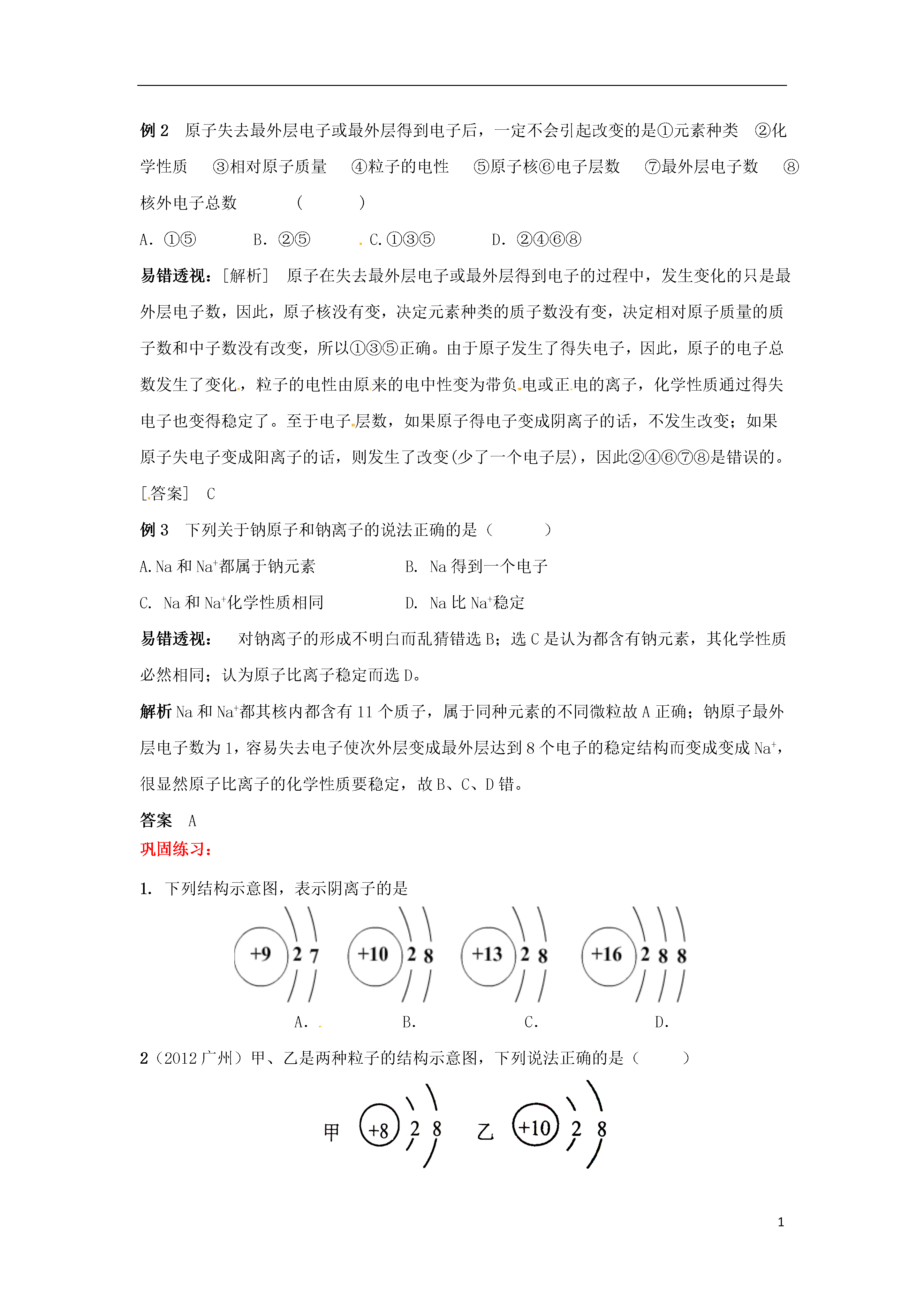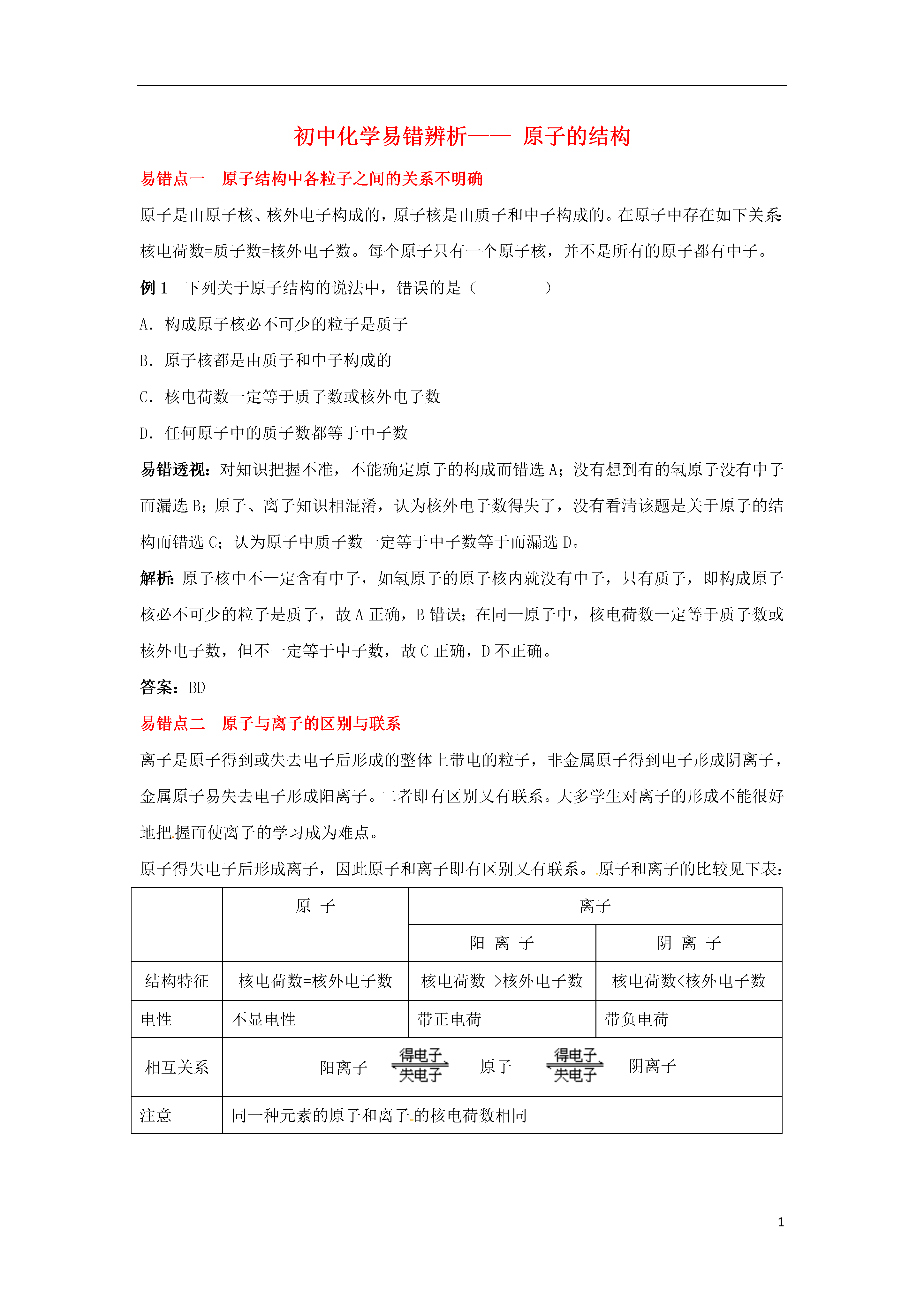 1初中化学易错辨析——原子的结构易错点一原子结构中各粒子之间的关系不明确原子是由原子核、核外电子构成的,原子核是由质子和中子构成的。在原子中存在如下关系:核电荷数=质子数=核外电子数。每个原子只有一个原子核,并不是所有的原子都有中子。例1下列关于原子结构的说法中,错误的是()A.构成原子核必不可少的粒子是质子B.原子核都是由质子和中子构成的C.核电荷数一定等于质子数或核外电子数D.任何原子中的质子数都等于中子数易错透视:对知识把握不准,不能确定原子的构成而错选A;没有想到有的氢原子没有中子而漏选B;原子、离子知识相混淆,认为核外电子数得失了,没有看清该题是关于原子的结构而错选C;认为原子中质子数一定等于中子数等于而漏选D。解析:原子核中不一定含有中子,如氢原子的原子核内就没有中子,只有质子,即构成原子核必不可少的粒子是质子,故A正确,B错误;在同一原子中,核电荷数一定等于质子数或核外电子数,但不一定等于中子数,故C正确,D不正确。答案:BD易错点二原子与离子的区别与联系离子是原子得到或失去电子后形成的整体上带电的粒子,非金属原子得到电子形成阴离子,金属原子易失去电子形成阳离子。二者即有区别又有联系。大多学生对离子的形成不能很好地把握而使离子的学习成为难点。原子得失电子后形成离子,因此原子和离子即有区别又有联系。原子和离子的比较见下表:原子离子阳离子阴离子结构特征核电荷数=核外电子数核电荷数>核外电子数核电荷数<核外电子数电性不显电性带正电荷带负电荷相互关系阳离子原子阴离子注意同一种元素的原子和离子的核电荷数相同例2原子失去最外层电子或最外层得到电子后,一定不会引起改变的是①元素种类②化学性质③相对原子质量④粒子的电性⑤原子核⑥电子层数⑦最外层电子数⑧核外电子总数()A.①⑤B.②⑤C.①③⑤D.②④⑥⑧易错透视:[解析]原子在失去最外层电子或最外层得到电子的过程中,发生变化的只是最外层电子数,因此,原子核没有变,决定元素种类的质子数没有变,决定相对原子质量的质子数和中子数没有改变,所以①③⑤正确。由于原子发生了得失电子,因此,原子的电子总数发生了变化,粒子的电性由原来的电中性变为带负电或正电的离子,化学性质通过得失电子也变得稳定了。至于电子层数,如果原子得电子变成阴离子的话,不发生改变;如果原子失电子变成阳离子的话,则发生了改变(少了一个电子层),因此②④⑥⑦⑧是错误的。[答案]C例3下列关于钠原子和钠离子的说法正确的是()A.Na和Na+都属于钠元素B.Na得到一个电子C.Na和Na+化学性质相同D.Na比Na+稳定易错透视:对钠离子的形成不明白而乱猜错选B;选C是认为都含有钠元素,其化学性质必然相同;认为原子比离子稳定而选D。解析Na和Na+都其核内都含有11个质子,属于同种元素的不同微粒故A正确;钠原子最外层电子数为1,容易失去电子使次外层变成最外层达到8个电子的稳定结构而变成变成Na+,很显然原子比离子的化学性质要稳定,故B、C、D错。答案A巩固练习:1.下列结构示意图,表示阴离子的是A.B.C.D.2(2012广州)甲、乙是两种粒子的结构示意图,下列说法正确的是()A.甲是阳离子B.乙是阴离子C.甲、乙属于不同种元素D.甲、乙都属于金属元素3.如图四种微粒中,具有相似的化学性质的是()A.②③B.①③C.②④D.①④4.某元素的原子结构示意图如下图所示,该元素符号为Br。(1)图中x=,Br属于元素(填“金属”或“非金属”)。(2)下图表示的微粒中,具有相对稳定结构的是(填序号,下同),与Br化学性质相似的是。参考答案1.D2.C3.D4.(1)7;非金属;(2)CE