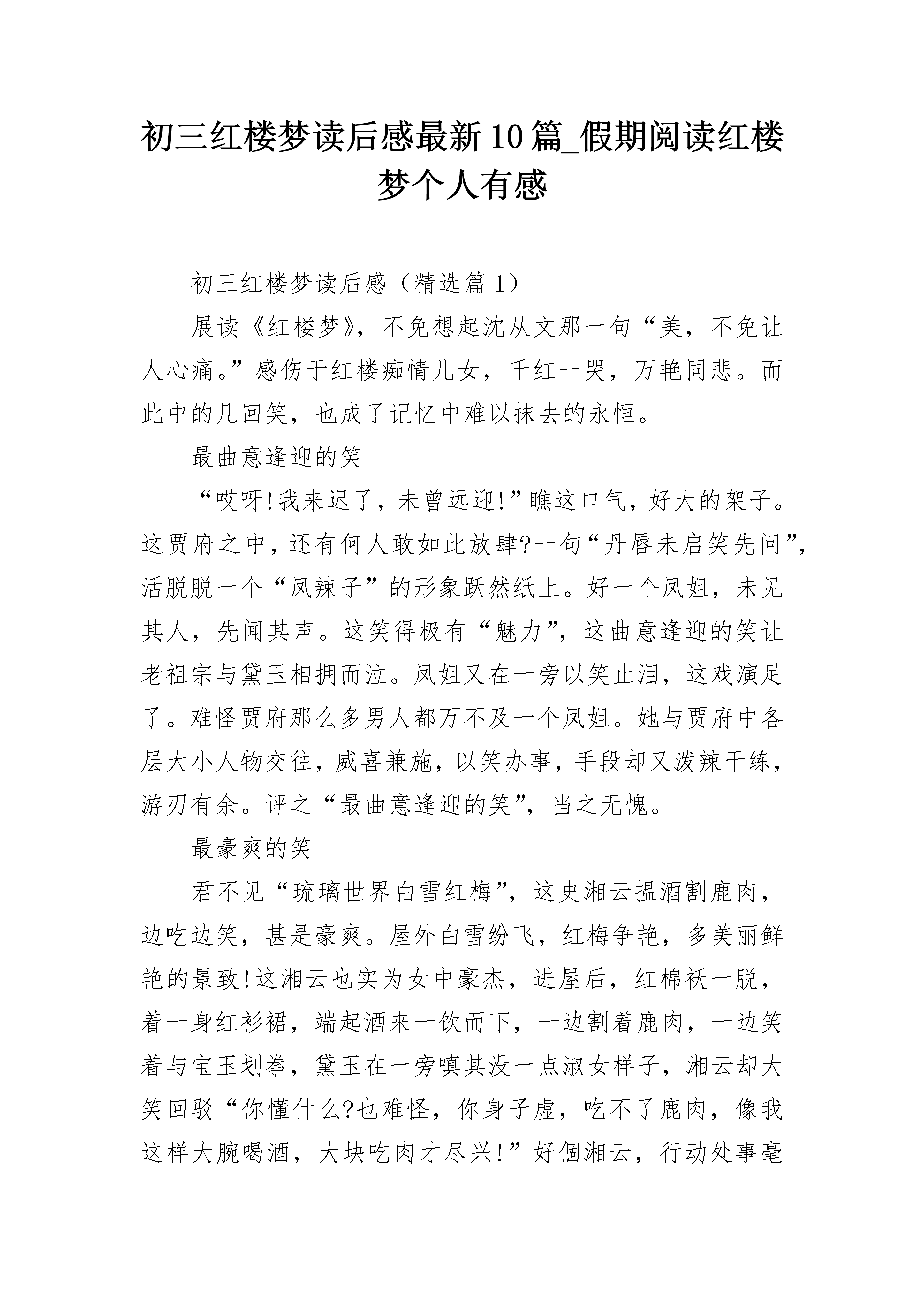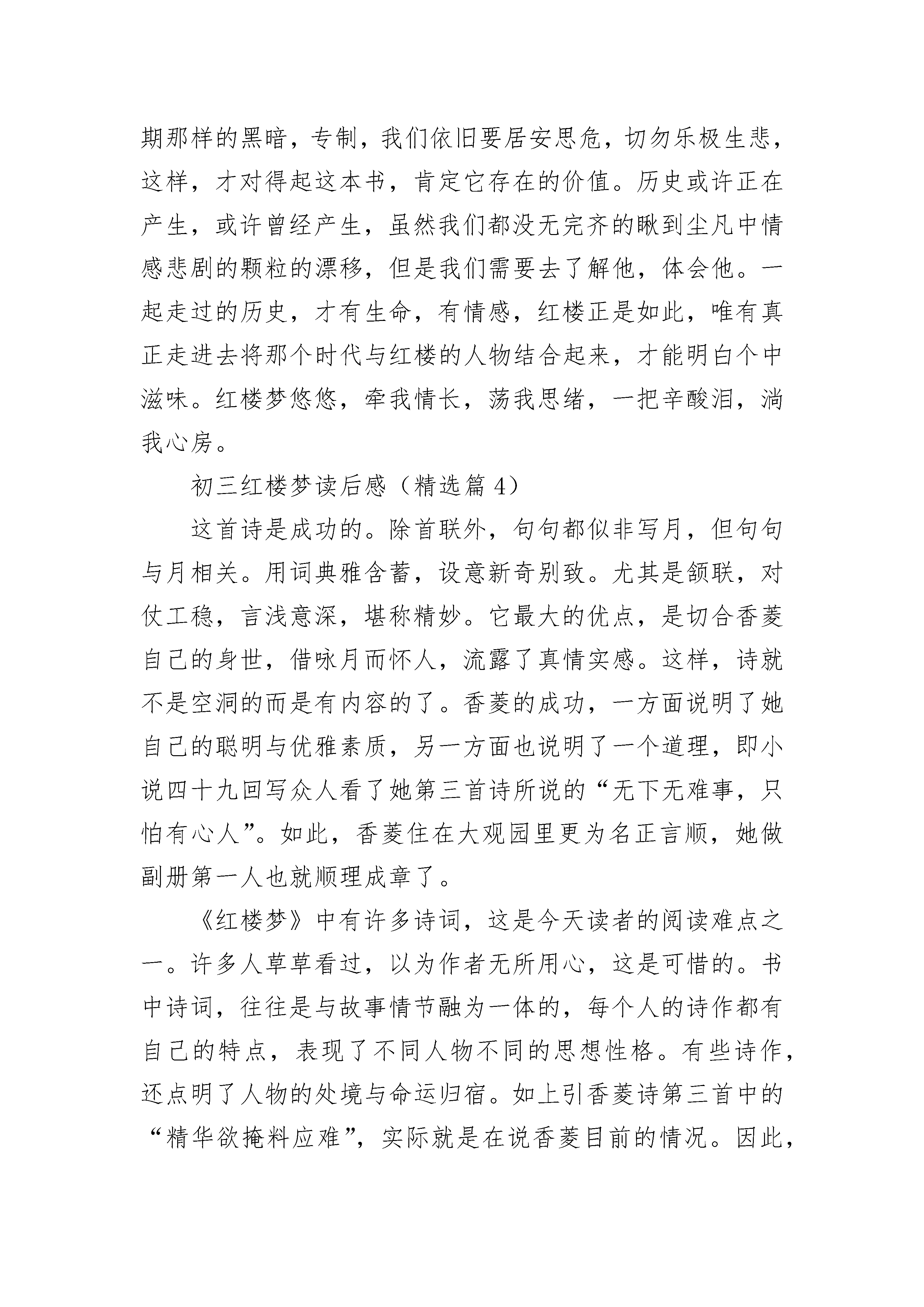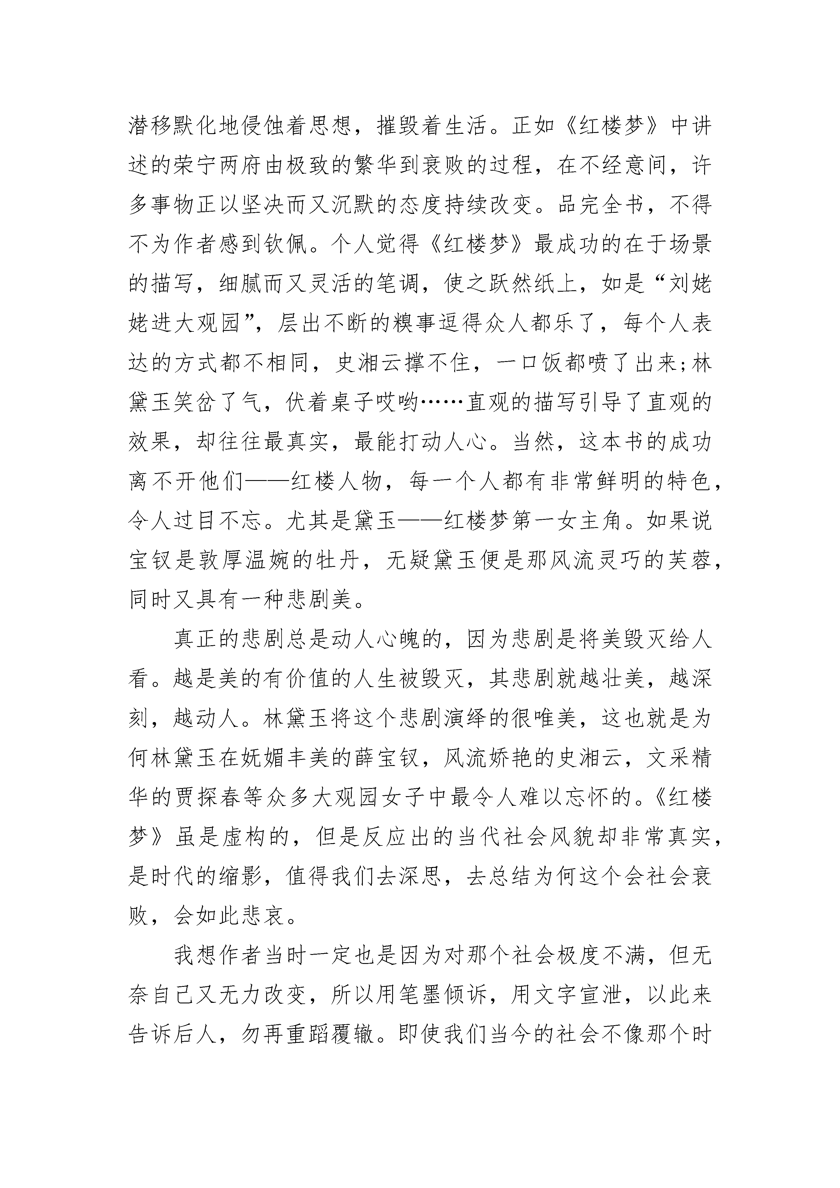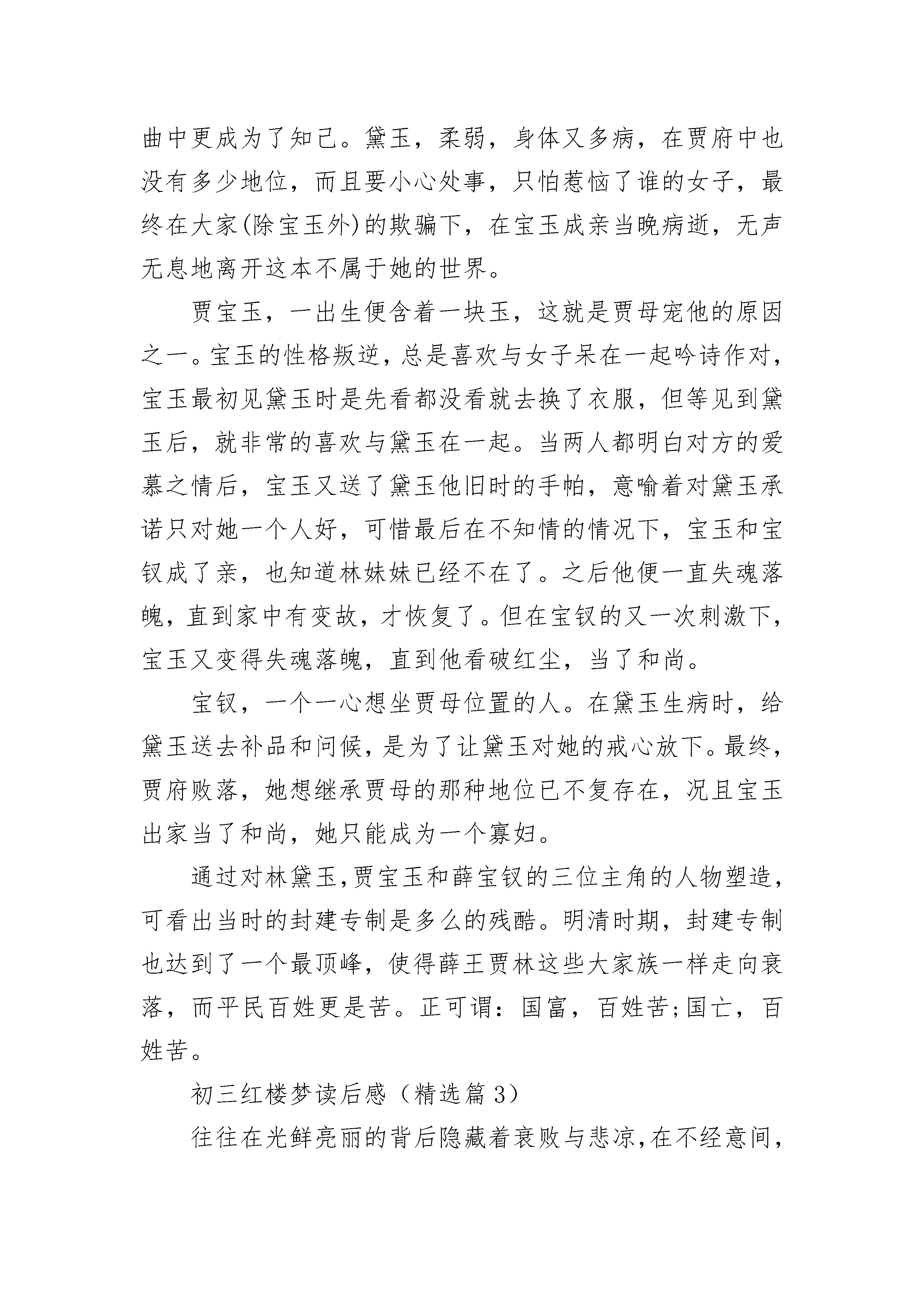初三红楼梦读后感最新10篇_假期阅读红楼梦个人有感初三红楼梦读后感(精选篇1)展读《红楼梦》,不免想起沈从文那一句“美,不免让人心痛。”感伤于红楼痴情儿女,千红一哭,万艳同悲。而此中的几回笑,也成了记忆中难以抹去的永恒。最曲意逢迎的笑“哎呀!我来迟了,未曾远迎!”瞧这口气,好大的架子。这贾府之中,还有何人敢如此放肆?一句“丹唇未启笑先问”,活脱脱一个“凤辣子”的形象跃然纸上。好一个凤姐,未见其人,先闻其声。这笑得极有“魅力”,这曲意逢迎的笑让老祖宗与黛玉相拥而泣。凤姐又在一旁以笑止泪,这戏演足了。难怪贾府那么多男人都万不及一个凤姐。她与贾府中各层大小人物交往,威喜兼施,以笑办事,手段却又泼辣干练,游刃有余。评之“最曲意逢迎的笑”,当之无愧。最豪爽的笑君不见“琉璃世界白雪红梅”,这史湘云揾酒割鹿肉,边吃边笑,甚是豪爽。屋外白雪纷飞,红梅争艳,多美丽鲜艳的景致!这湘云也实为女中豪杰,进屋后,红棉袄一脱,着一身红衫裙,端起酒来一饮而下,一边割着鹿肉,一边笑着与宝玉划拳,黛玉在一旁嗔其没一点淑女样子,湘云却大笑回驳“你懂什么?也难怪,你身子虚,吃不了鹿肉,像我这样大腕喝酒,大块吃肉才尽兴!”好個湘云,行动处事毫无淑女,步步小心之态,而是豪迈大气,如大丈夫般,天真可爱,这笑极具感染力,评之“最豪爽的笑,”一笑解千愁。最难释怀的笑此书中最让我难以忘却的,不是黛玉的哭,而是她凄美的笑,她在临死前焚稿断痴情的最无奈,最心疼的笑,笑中带泪,那是最后的挣扎吗?是回光返照?黛玉如痴傻般呓语“宝玉你好······”说罢,口吐鲜血,呆呆笑着,泪尽而亡,这笑中隐含了多少的痛!黛玉的笑,让我为之泣泪,也终于明白了鲁迅先生说的“悲剧是有价值的东西毁灭给人看的。”《红楼梦》从开篇至结尾,字字血泪,胜过杜鹃啼血,鲛人泣珠,实乃彻头彻尾大悲之剧!多少烟花坠落无痕!红楼儿女正如这灿烂烟火,了无痕迹。从这永恒不朽的笑中悟出人生之悲,感谢《红楼梦》,让我悟出悲痛而更加珍惜人生!初三红楼梦读后感(精选篇2)明清时期的经济由于闭关锁国从最顶端逐渐的走向衰败。而《红楼梦》中的薛王贾林四大家族便见证了由繁华走向衰落,甚至家破人亡的全过程。林黛玉,是因为母亲病逝。她的外祖母(即贾母)听闻此事,心中对黛玉产生了可怜又疼爱之情,想将黛玉接到自己身边,给她一些依靠和安慰。黛玉在贾母的千呼万唤之后才离开父亲来到了贾府。黛玉的母亲曾告诫她在贾府中的生活,要多加留心。所以黛玉在贾府中的生活可堪称为步步惊心。黛玉刚开始对宝玉是不愿靠近,怕这个一直受宠的宝玉会为自己添麻烦。但后来两个人相知相熟之后,特别是在吟诗作曲中更成为了知己。黛玉,柔弱,身体又多病,在贾府中也没有多少地位,而且要小心处事,只怕惹恼了谁的女子,最终在大家(除宝玉外)的欺骗下,在宝玉成亲当晚病逝,无声无息地离开这本不属于她的世界。贾宝玉,一出生便含着一块玉,这就是贾母宠他的原因之一。宝玉的性格叛逆,总是喜欢与女子呆在一起吟诗作对,宝玉最初见黛玉时是先看都没看就去换了衣服,但等见到黛玉后,就非常的喜欢与黛玉在一起。当两人都明白对方的爱慕之情后,宝玉又送了黛玉他旧时的手帕,意喻着对黛玉承诺只对她一个人好,可惜最后在不知情的情况下,宝玉和宝钗成了亲,也知道林妹妹已经不在了。之后他便一直失魂落魄,直到家中有变故,才恢复了。但在宝钗的又一次刺激下,宝玉又变得失魂落魄,直到他看破红尘,当了和尚。宝钗,一个一心想坐贾母位置的人。在黛玉生病时,给黛玉送去补品和问候,是为了让黛玉对她的戒心放下。最终,贾府败落,她想继承贾母的那种地位已不复存在,况且宝玉出家当了和尚,她只能成为一个寡妇。通过对林黛玉,贾宝玉和薛宝钗的三位主角的人物塑造,可看出当时的封建专制是多么的残酷。明清时期,封建专制也达到了一个最顶峰,使得薛王贾林这些大家族一样走向衰落,而平民百姓更是苦。正可谓:国富,百姓苦;国亡,百姓苦。初三红楼梦读后感(精选篇3)往往在光鲜亮丽的背后隐藏着衰败与悲凉,在不经意间,潜移默化地侵蚀着思想,摧毁着生活。正如《红楼梦》中讲述的荣宁两府由极致的繁华到衰败的过程,在不经意间,许多事物正以坚决而又沉默的态度持续改变。品完全书,不得不为作者感到钦佩。个人觉得《红楼梦》最成功的在于场景的描写,细腻而又灵活的笔调,使之跃然纸上,如是“刘姥姥进大观园”,层出不断的糗事逗得众人都乐了,每个人表达的方式都不相同,史湘云撑不住,一口饭都喷了出来;林黛玉笑岔了气,伏着桌子哎哟……直观的描写引导了直观的效果,却往往最真实,最能打动人心。当然,这本书的成功离不开他们——红楼人物,每一个人都有非常鲜明的特色,令人过目不忘。尤其是黛玉——红楼梦第一女主角。如果说宝钗是敦厚温婉的牡丹,无疑黛玉便是那风流灵巧的芙蓉,同时又具有一种悲剧美。真正的悲剧总是动人心魄的,因为悲剧是将美