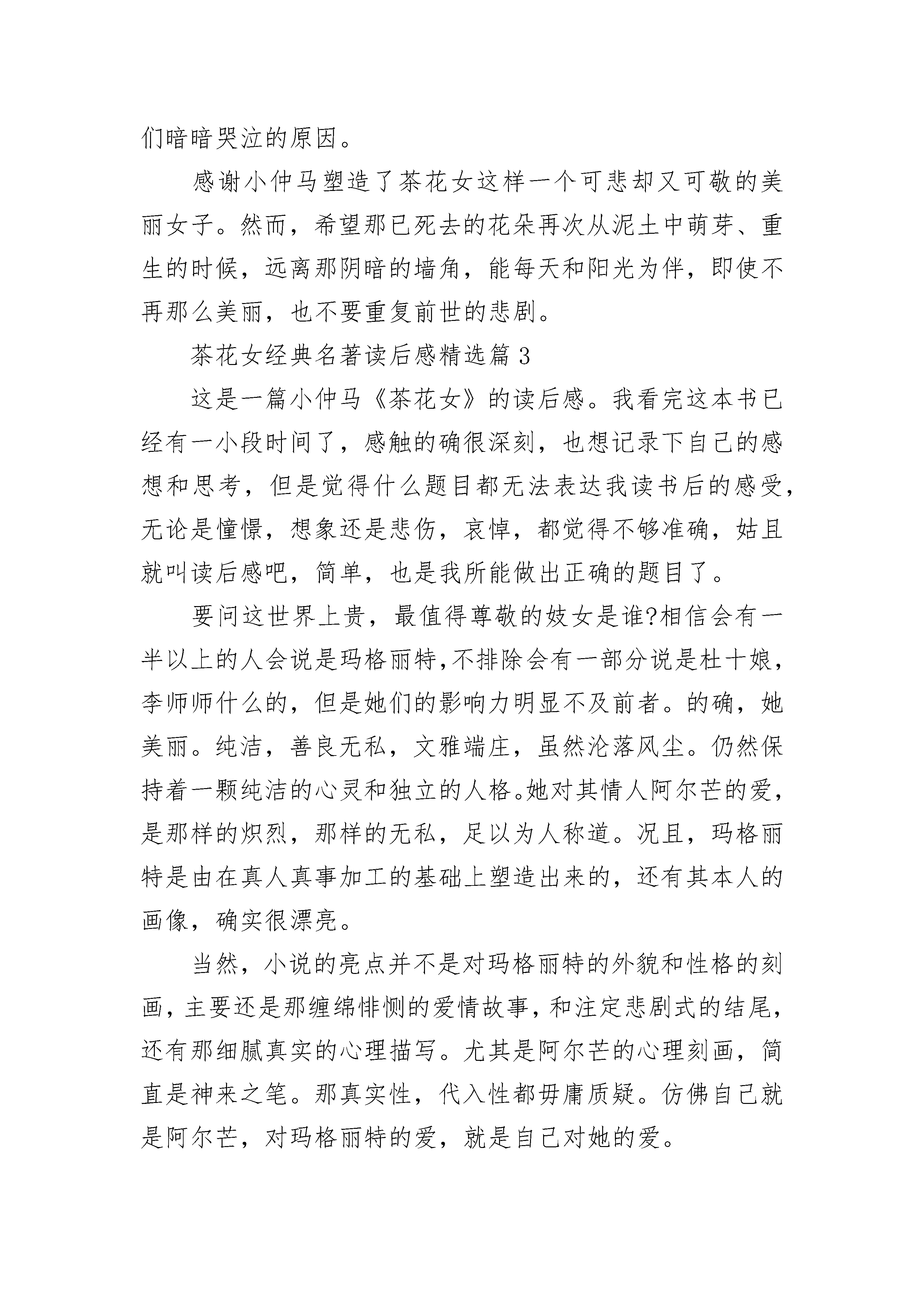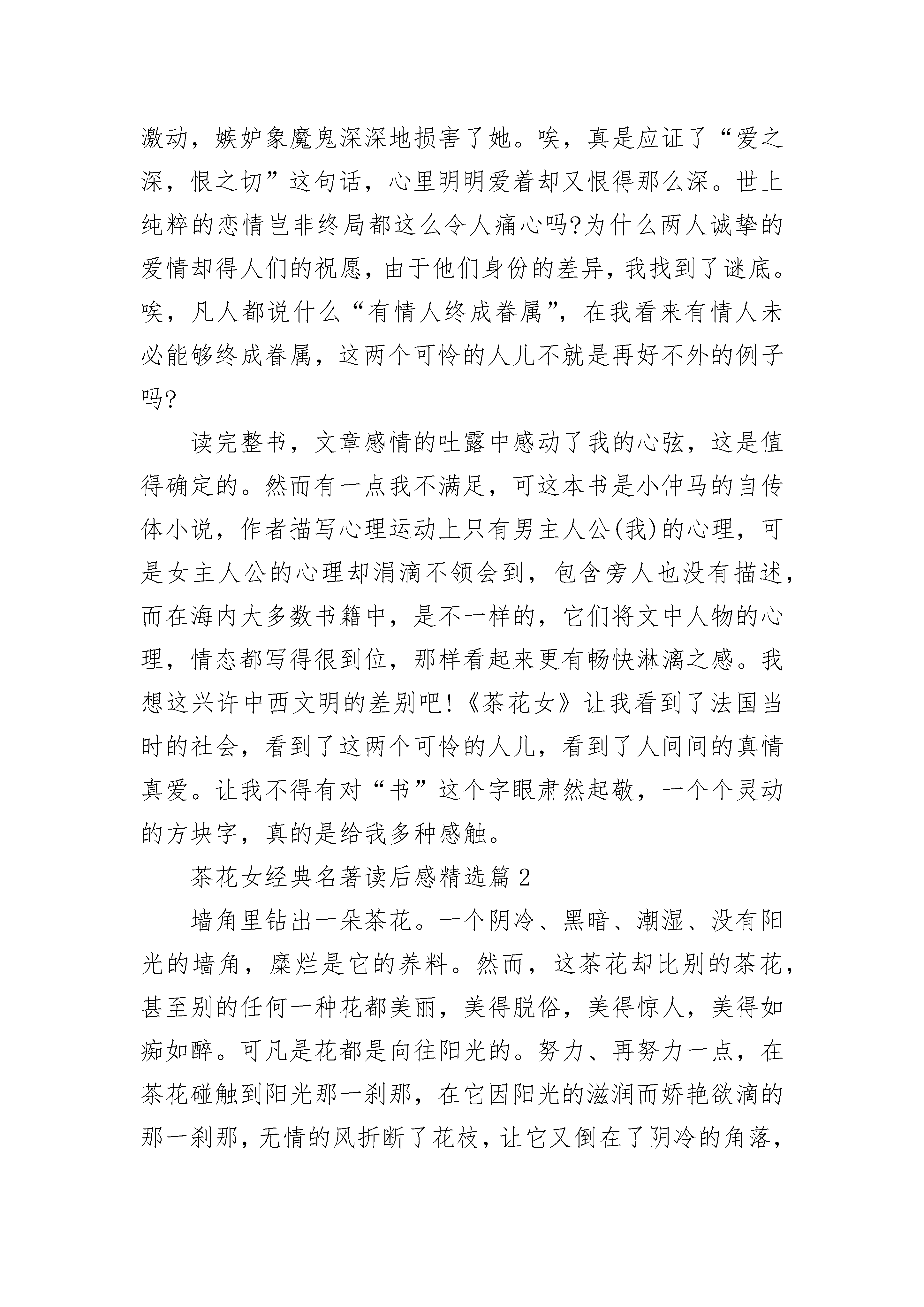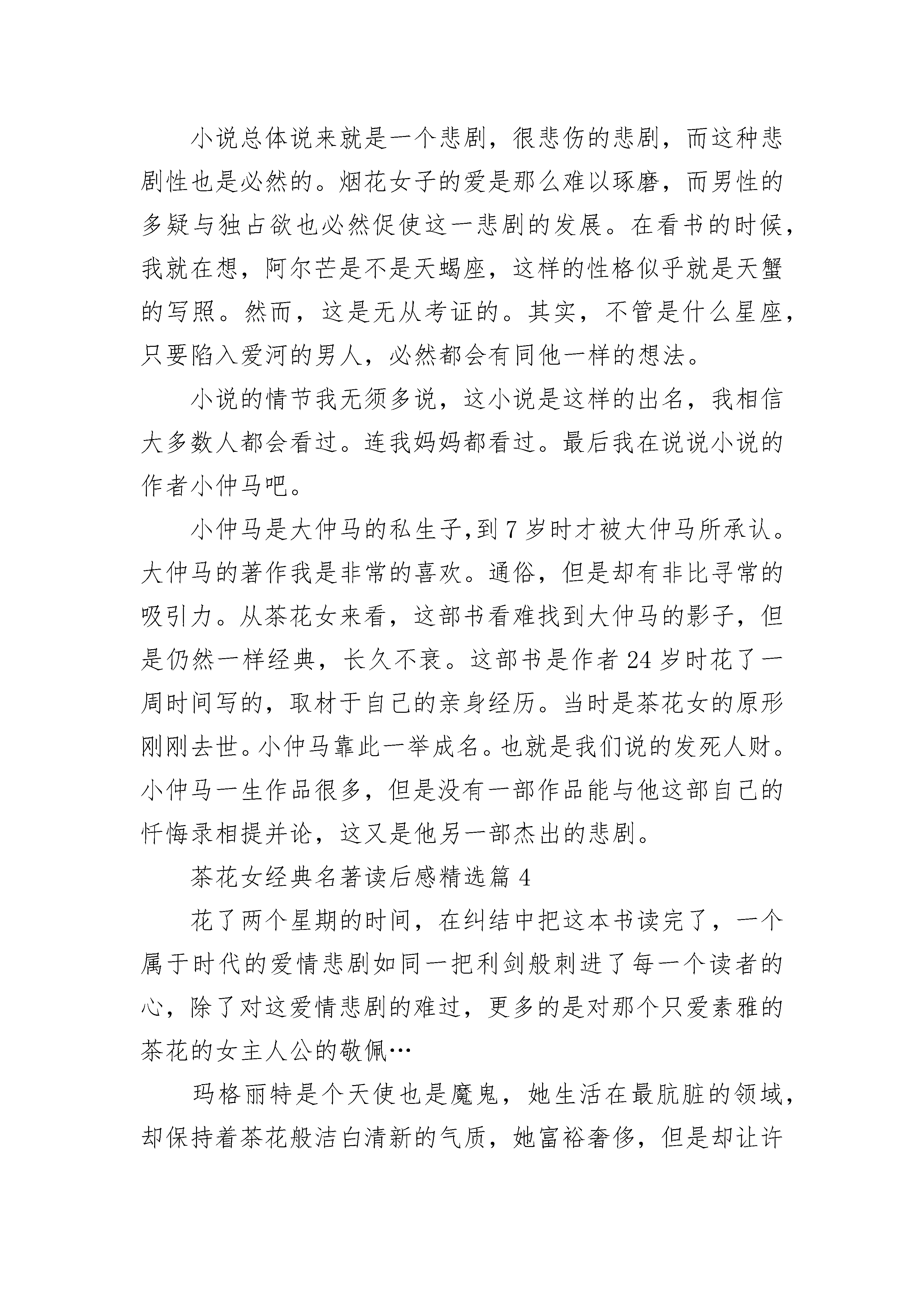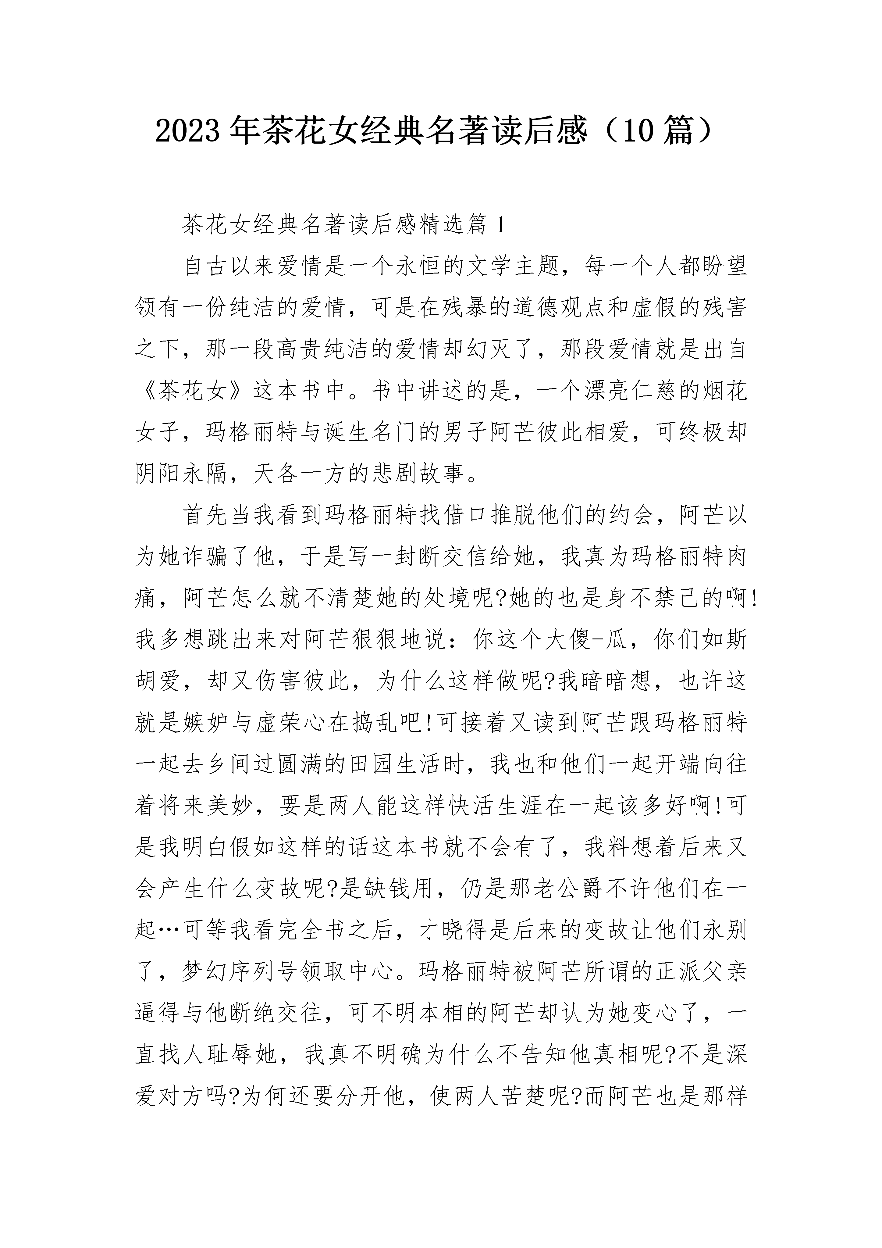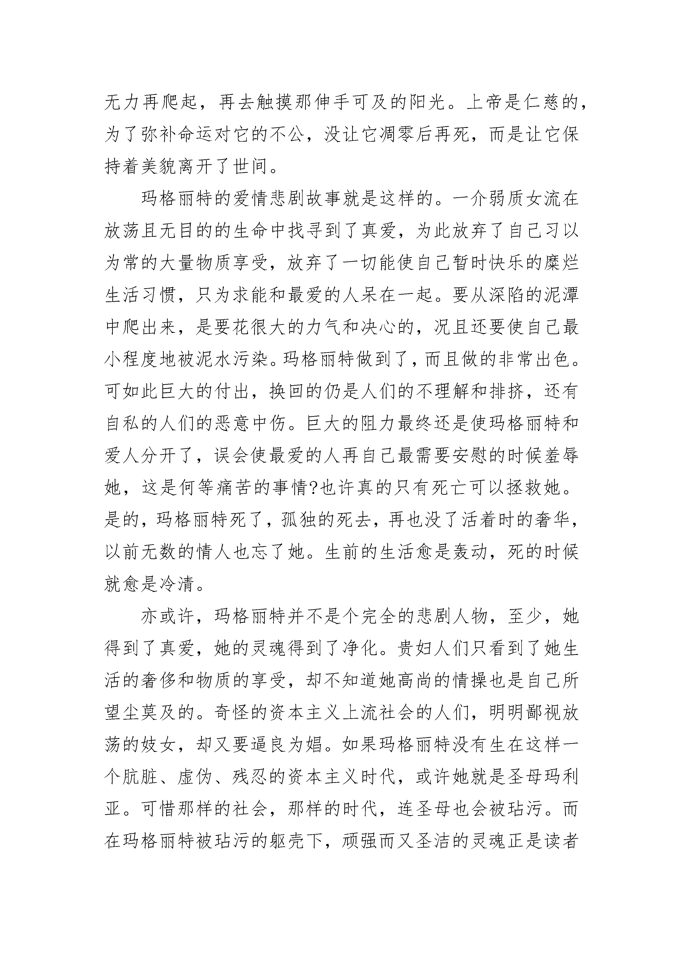 2023年茶花女经典名著读后感(10篇)茶花女经典名著读后感精选篇1自古以来爱情是一个永恒的文学主题,每一个人都盼望领有一份纯洁的爱情,可是在残暴的道德观点和虚假的残害之下,那一段高贵纯洁的爱情却幻灭了,那段爱情就是出自《茶花女》这本书中。书中讲述的是,一个漂亮仁慈的烟花女子,玛格丽特与诞生名门的男子阿芒彼此相爱,可终极却阴阳永隔,天各一方的悲剧故事。首先当我看到玛格丽特找借口推脱他们的约会,阿芒以为她诈骗了他,于是写一封断交信给她,我真为玛格丽特肉痛,阿芒怎么就不清楚她的处境呢?她的也是身不禁己的啊!我多想跳出来对阿芒狠狠地说:你这个大傻-瓜,你们如斯胡爱,却又伤害彼此,为什么这样做呢?我暗暗想,也许这就是嫉妒与虚荣心在捣乱吧!可接着又读到阿芒跟玛格丽特一起去乡间过圆满的田园生活时,我也和他们一起开端向往着将来美妙,要是两人能这样快活生涯在一起该多好啊!可是我明白假如这样的话这本书就不会有了,我料想着后来又会产生什么变故呢?是缺钱用,仍是那老公爵不许他们在一起…可等我看完全书之后,才晓得是后来的变故让他们永别了,梦幻序列号领取中心。玛格丽特被阿芒所谓的正派父亲逼得与他断绝交往,可不明本相的阿芒却认为她变心了,一直找人耻辱她,我真不明确为什么不告知他真相呢?不是深爱对方吗?为何还要分开他,使两人苦楚呢?而阿芒也是那样激动,嫉妒象魔鬼深深地损害了她。唉,真是应证了“爱之深,恨之切”这句话,心里明明爱着却又恨得那么深。世上纯粹的恋情岂非终局都这么令人痛心吗?为什么两人诚挚的爱情却得人们的祝愿,由于他们身份的差异,我找到了谜底。唉,凡人都说什么“有情人终成眷属”,在我看来有情人未必能够终成眷属,这两个可怜的人儿不就是再好不外的例子吗?读完整书,文章感情的吐露中感动了我的心弦,这是值得确定的。然而有一点我不满足,可这本书是小仲马的自传体小说,作者描写心理运动上只有男主人公(我)的心理,可是女主人公的心理却涓滴不领会到,包含旁人也没有描述,而在海内大多数书籍中,是不一样的,它们将文中人物的心理,情态都写得很到位,那样看起来更有畅快淋漓之感。我想这兴许中西文明的差别吧!《茶花女》让我看到了法国当时的社会,看到了这两个可怜的人儿,看到了人间间的真情真爱。让我不得有对“书”这个字眼肃然起敬,一个个灵动的方块字,真的是给我多种感触。茶花女经典名著读后感精选篇2墙角里钻出一朵茶花。一个阴冷、黑暗、潮湿、没有阳光的墙角,糜烂是它的养料。然而,这茶花却比别的茶花,甚至别的任何一种花都美丽,美得脱俗,美得惊人,美得如痴如醉。可凡是花都是向往阳光的。努力、再努力一点,在茶花碰触到阳光那一刹那,在它因阳光的滋润而娇艳欲滴的那一刹那,无情的风折断了花枝,让它又倒在了阴冷的角落,无力再爬起,再去触摸那伸手可及的阳光。上帝是仁慈的,为了弥补命运对它的不公,没让它凋零后再死,而是让它保持着美貌离开了世间。玛格丽特的爱情悲剧故事就是这样的。一介弱质女流在放荡且无目的的生命中找寻到了真爱,为此放弃了自己习以为常的大量物质享受,放弃了一切能使自己暂时快乐的糜烂生活习惯,只为求能和最爱的人呆在一起。要从深陷的泥潭中爬出来,是要花很大的力气和决心的,况且还要使自己最小程度地被泥水污染。玛格丽特做到了,而且做的非常出色。可如此巨大的付出,换回的仍是人们的不理解和排挤,还有自私的人们的恶意中伤。巨大的阻力最终还是使玛格丽特和爱人分开了,误会使最爱的人再自己最需要安慰的时候羞辱她,这是何等痛苦的事情?也许真的只有死亡可以拯救她。是的,玛格丽特死了,孤独的死去,再也没了活着时的奢华,以前无数的情人也忘了她。生前的生活愈是轰动,死的时候就愈是冷清。亦或许,玛格丽特并不是个完全的悲剧人物,至少,她得到了真爱,她的灵魂得到了净化。贵妇人们只看到了她生活的奢侈和物质的享受,却不知道她高尚的情操也是自己所望尘莫及的。奇怪的资本主义上流社会的人们,明明鄙视放荡的妓女,却又要逼良为娼。如果玛格丽特没有生在这样一个肮脏、虚伪、残忍的资本主义时代,或许她就是圣母玛利亚。可惜那样的社会,那样的时代,连圣母也会被玷污。而在玛格丽特被玷污的躯壳下,顽强而又圣洁的灵魂正是读者们暗暗哭泣的原因。感谢小仲马塑造了茶花女这样一个可悲却又可敬的美丽女子。然而,希望那已死去的花朵再次从泥土中萌芽、重生的时候,远离那阴暗的墙角,能每天和阳光为伴,即使不再那么美丽,也不要重复前世的悲剧。茶花女经典名著读后感精选篇3这是一篇小仲马《茶花女》的读后感。我看完这本书已经有一小段时间了,感触的确很深刻,也想记录下自己的感想和思考,但是觉得什么题目都无法表达我读书后的感受,无论是憧憬,想象还是悲伤,哀悼,都觉得不够准确,姑且就叫读后感吧,简单,也是我所能做出正确的题目了。要问这世界上贵,最值得尊敬的妓女是谁?相信会有一半以上的