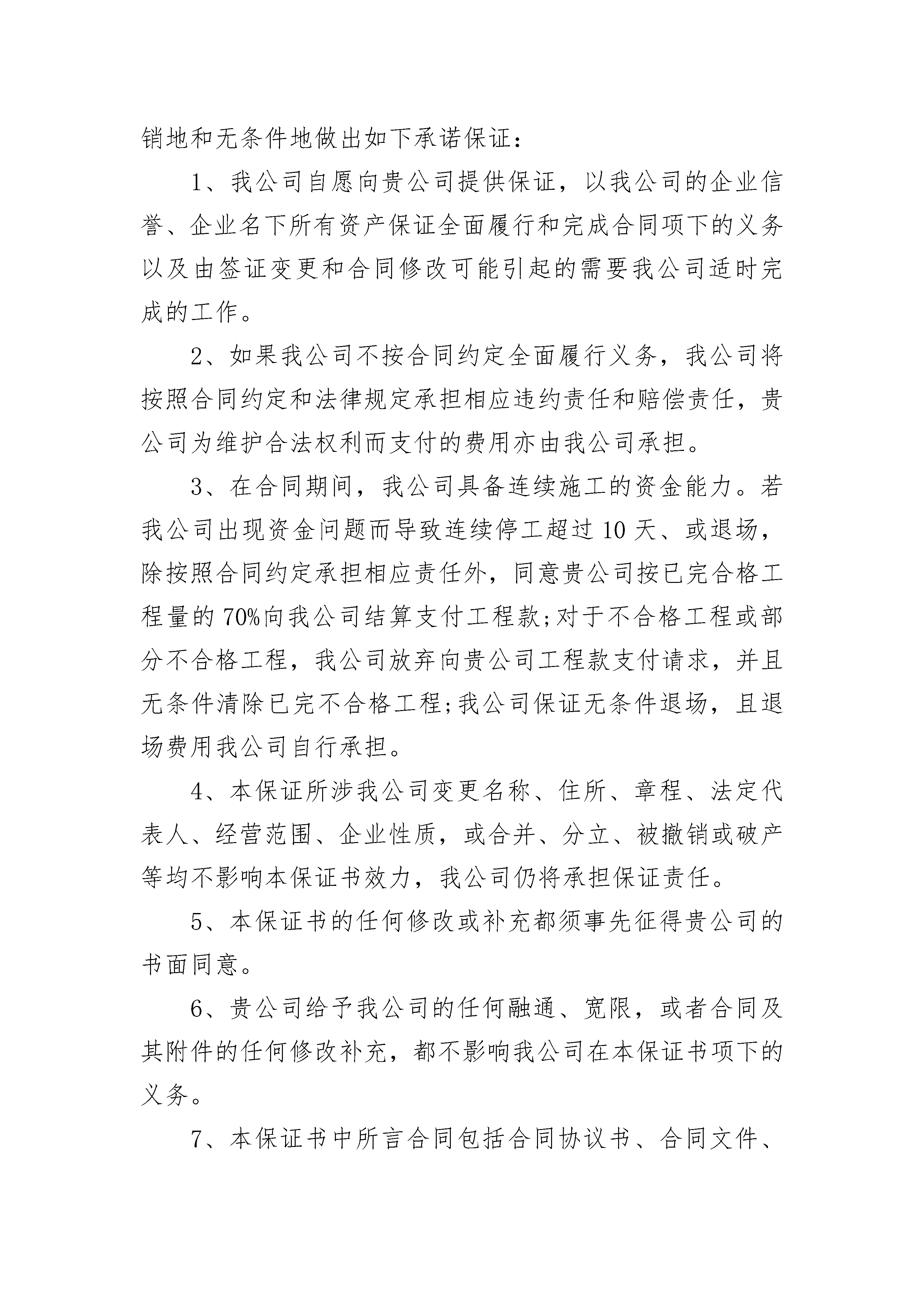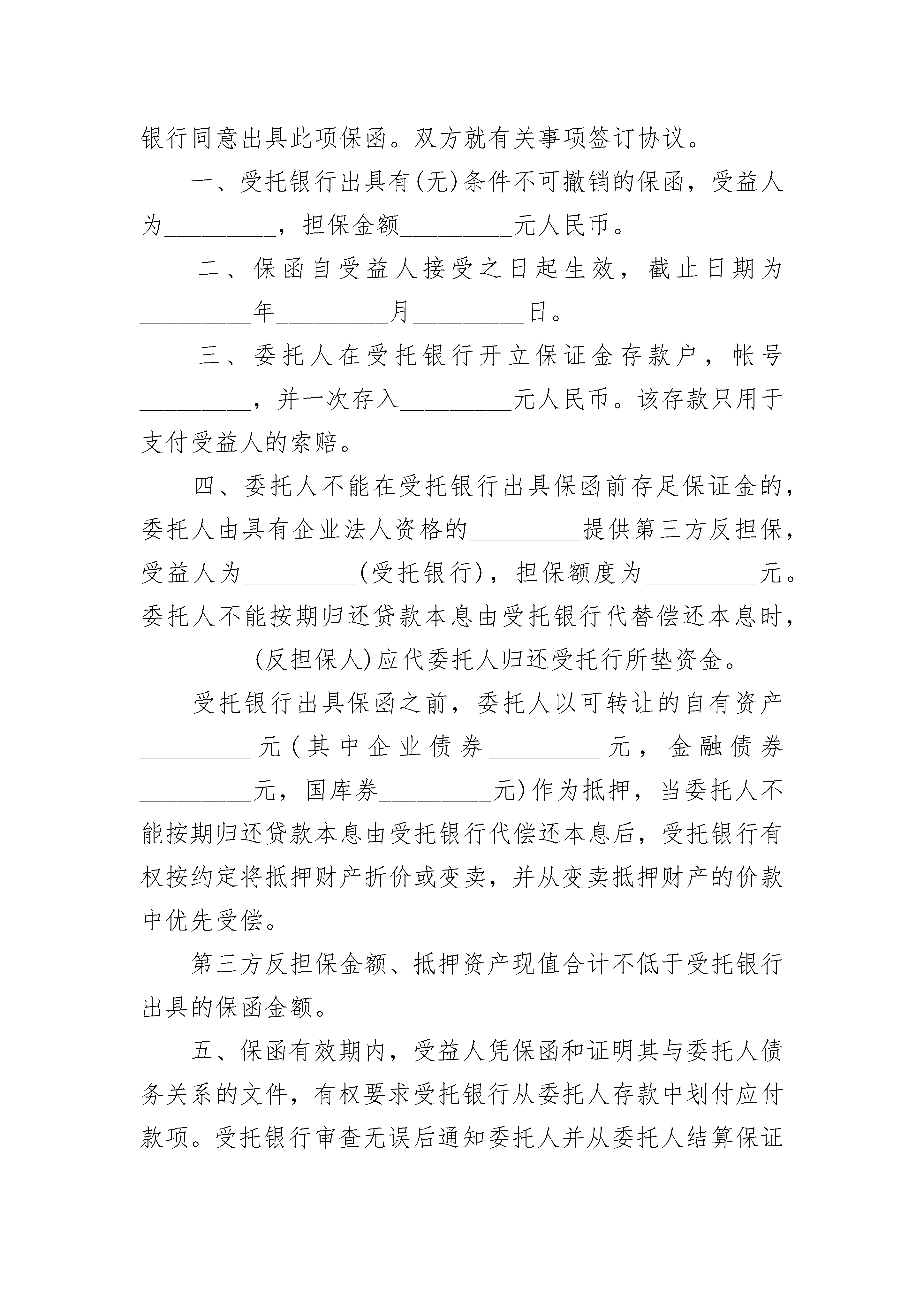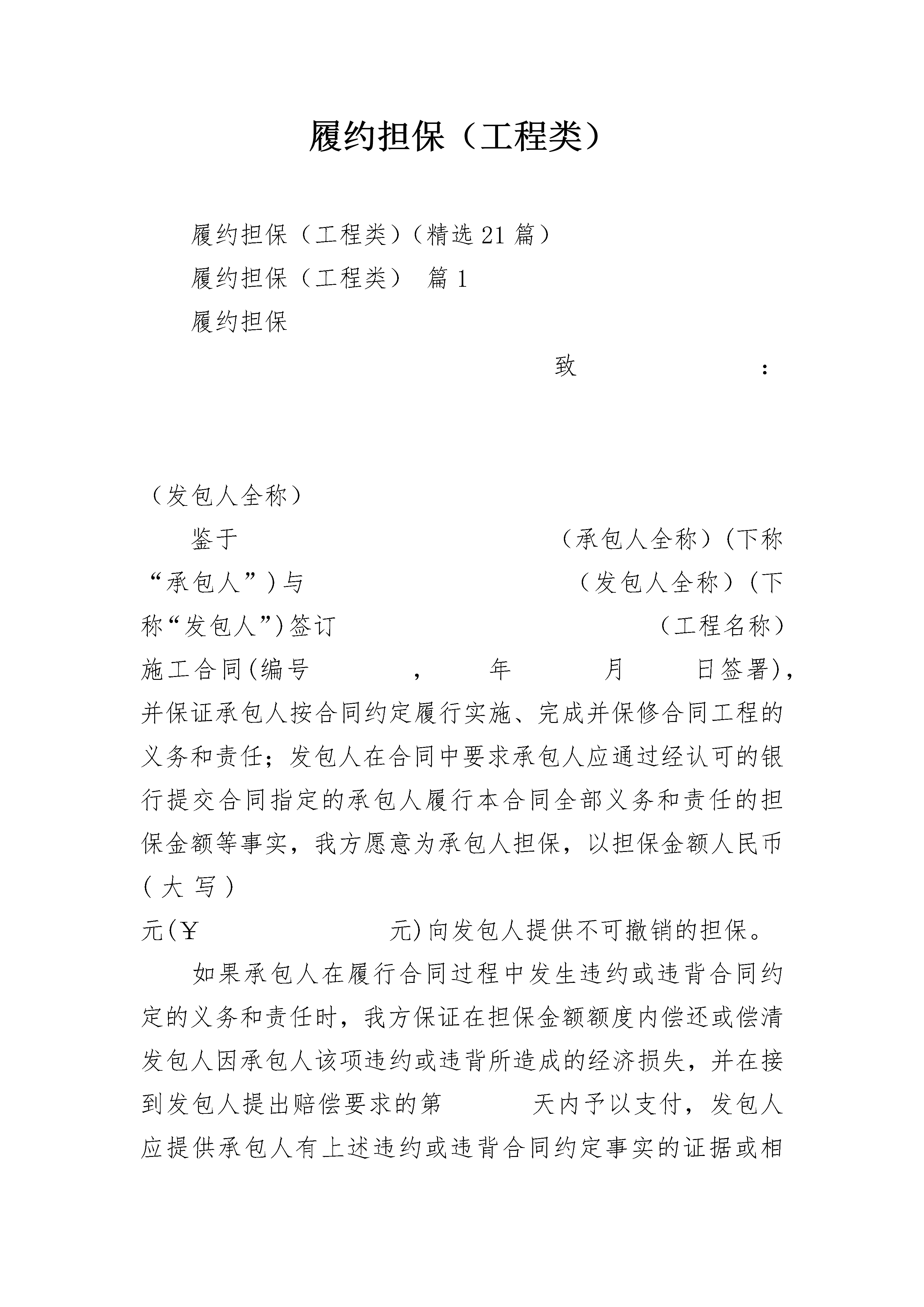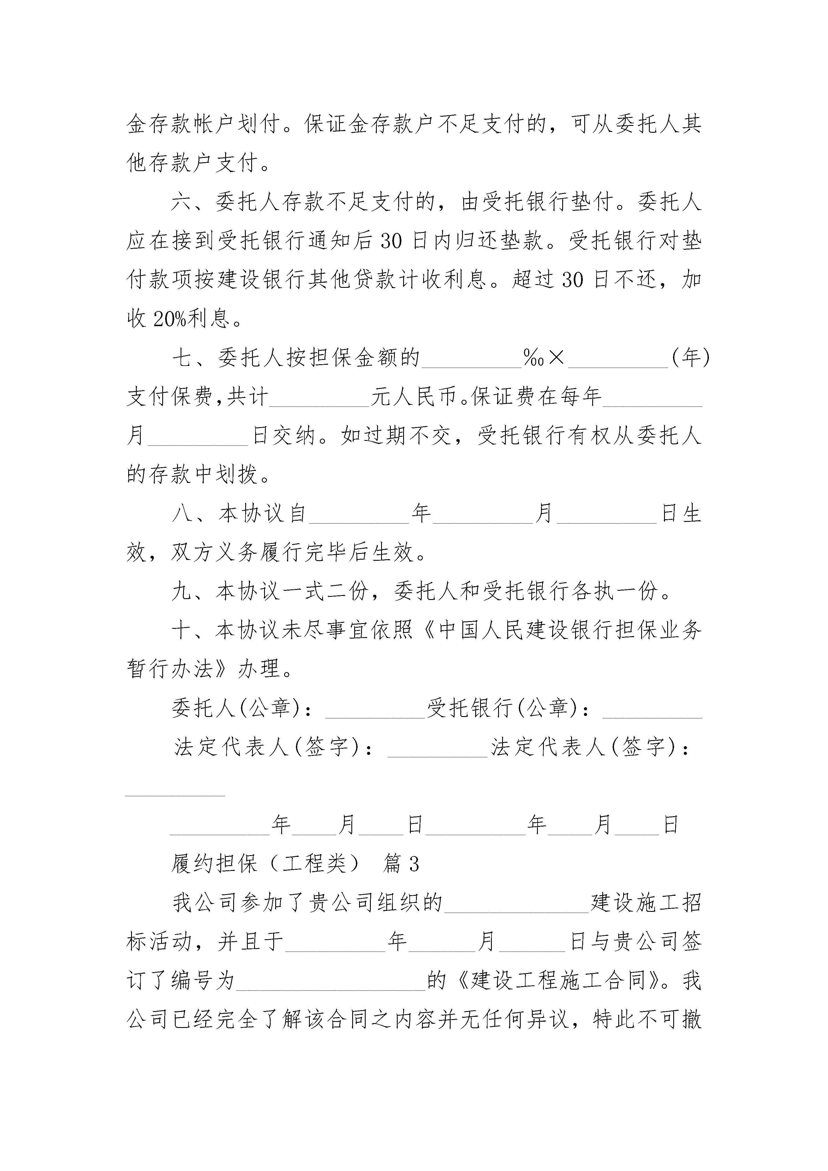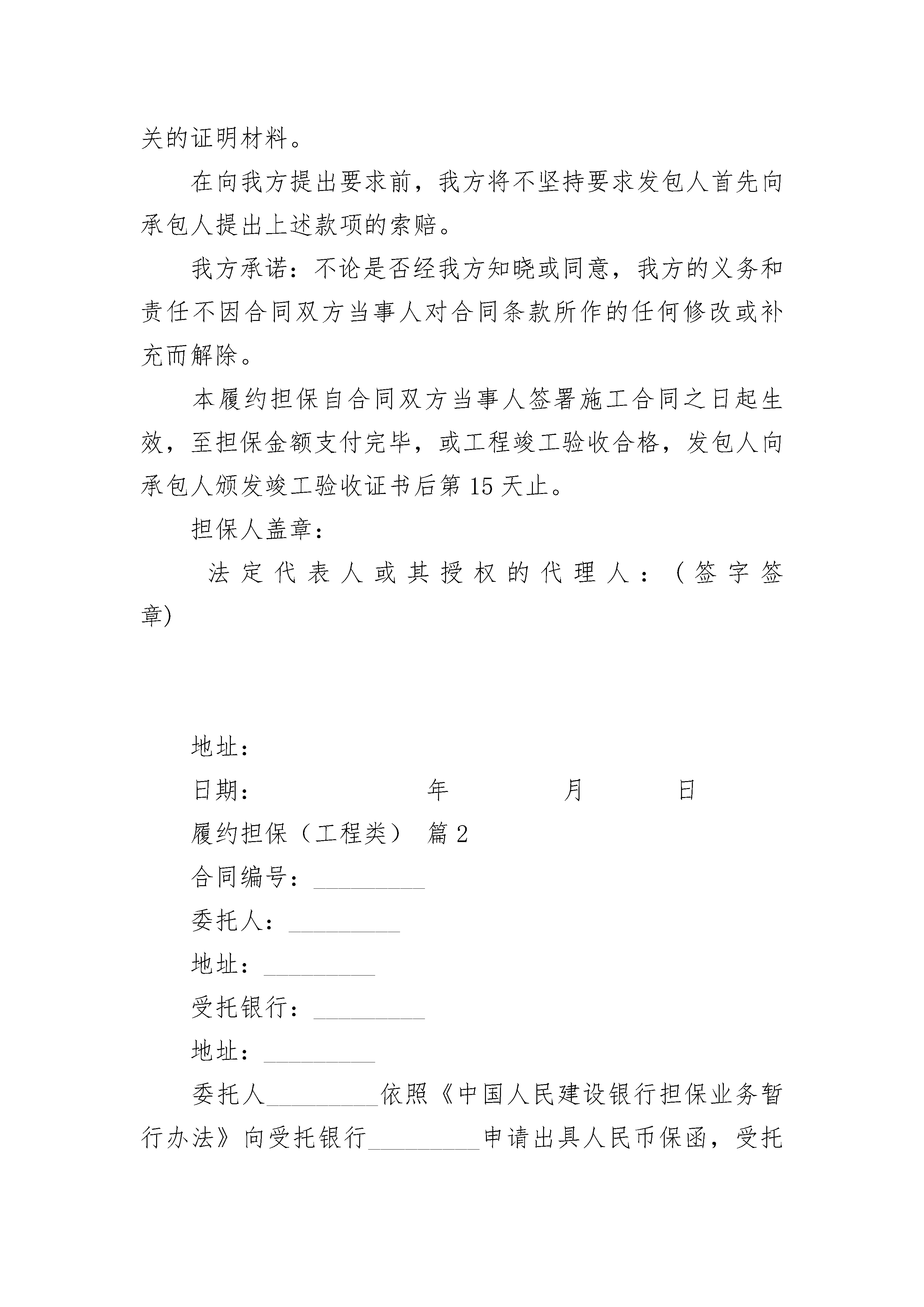 履约担保(工程类)履约担保(工程类)(精选21篇)履约担保(工程类)篇1履约担保致:(发包人全称)鉴于(承包人全称)(下称“承包人”)与(发包人全称)(下称“发包人”)签订(工程名称)施工合同(编号,年月日签署),并保证承包人按合同约定履行实施、完成并保修合同工程的义务和责任;发包人在合同中要求承包人应通过经认可的银行提交合同指定的承包人履行本合同全部义务和责任的担保金额等事实,我方愿意为承包人担保,以担保金额人民币(大写)元(¥元)向发包人提供不可撤销的担保。如果承包人在履行合同过程中发生违约或违背合同约定的义务和责任时,我方保证在担保金额额度内偿还或偿清发包人因承包人该项违约或违背所造成的经济损失,并在接到发包人提出赔偿要求的第天内予以支付,发包人应提供承包人有上述违约或违背合同约定事实的证据或相关的证明材料。在向我方提出要求前,我方将不坚持要求发包人首先向承包人提出上述款项的索赔。我方承诺:不论是否经我方知晓或同意,我方的义务和责任不因合同双方当事人对合同条款所作的任何修改或补充而解除。本履约担保自合同双方当事人签署施工合同之日起生效,至担保金额支付完毕,或工程竣工验收合格,发包人向承包人颁发竣工验收证书后第15天止。担保人盖章:法定代表人或其授权的代理人:(签字签章)地址:日期:年月日履约担保(工程类)篇2合同编号:_________委托人:_________地址:_________受托银行:_________地址:_________委托人_________依照《中国人民建设银行担保业务暂行办法》向受托银行_________申请出具人民币保函,受托银行同意出具此项保函。双方就有关事项签订协议。一、受托银行出具有(无)条件不可撤销的保函,受益人为_________,担保金额_________元人民币。二、保函自受益人接受之日起生效,截止日期为_________年_________月_________日。三、委托人在受托银行开立保证金存款户,帐号_________,并一次存入_________元人民币。该存款只用于支付受益人的索赔。四、委托人不能在受托银行出具保函前存足保证金的,委托人由具有企业法人资格的_________提供第三方反担保,受益人为_________(受托银行),担保额度为_________元。委托人不能按期归还贷款本息由受托银行代替偿还本息时,_________(反担保人)应代委托人归还受托行所垫资金。受托银行出具保函之前,委托人以可转让的自有资产_________元(其中企业债券_________元,金融债券_________元,国库券_________元)作为抵押,当委托人不能按期归还贷款本息由受托银行代偿还本息后,受托银行有权按约定将抵押财产折价或变卖,并从变卖抵押财产的价款中优先受偿。第三方反担保金额、抵押资产现值合计不低于受托银行出具的保函金额。五、保函有效期内,受益人凭保函和证明其与委托人债务关系的文件,有权要求受托银行从委托人存款中划付应付款项。受托银行审查无误后通知委托人并从委托人结算保证金存款帐户划付。保证金存款户不足支付的,可从委托人其他存款户支付。六、委托人存款不足支付的,由受托银行垫付。委托人应在接到受托银行通知后30日内归还垫款。受托银行对垫付款项按建设银行其他贷款计收利息。超过30日不还,加收20%利息。七、委托人按担保金额的_________‰×_________(年)支付保费,共计_________元人民币。保证费在每年_________月_________日交纳。如过期不交,受托银行有权从委托人的存款中划拨。八、本协议自_________年_________月_________日生效,双方义务履行完毕后生效。九、本协议一式二份,委托人和受托银行各执一份。十、本协议未尽事宜依照《中国人民建设银行担保业务暂行办法》办理。委托人(公章):_________受托银行(公章):_________法定代表人(签字):_________法定代表人(签字):__________________年____月____日_________年____月____日履约担保(工程类)篇3我公司参加了贵公司组织的_____________建设施工招标活动,并且于_________年______月______日与