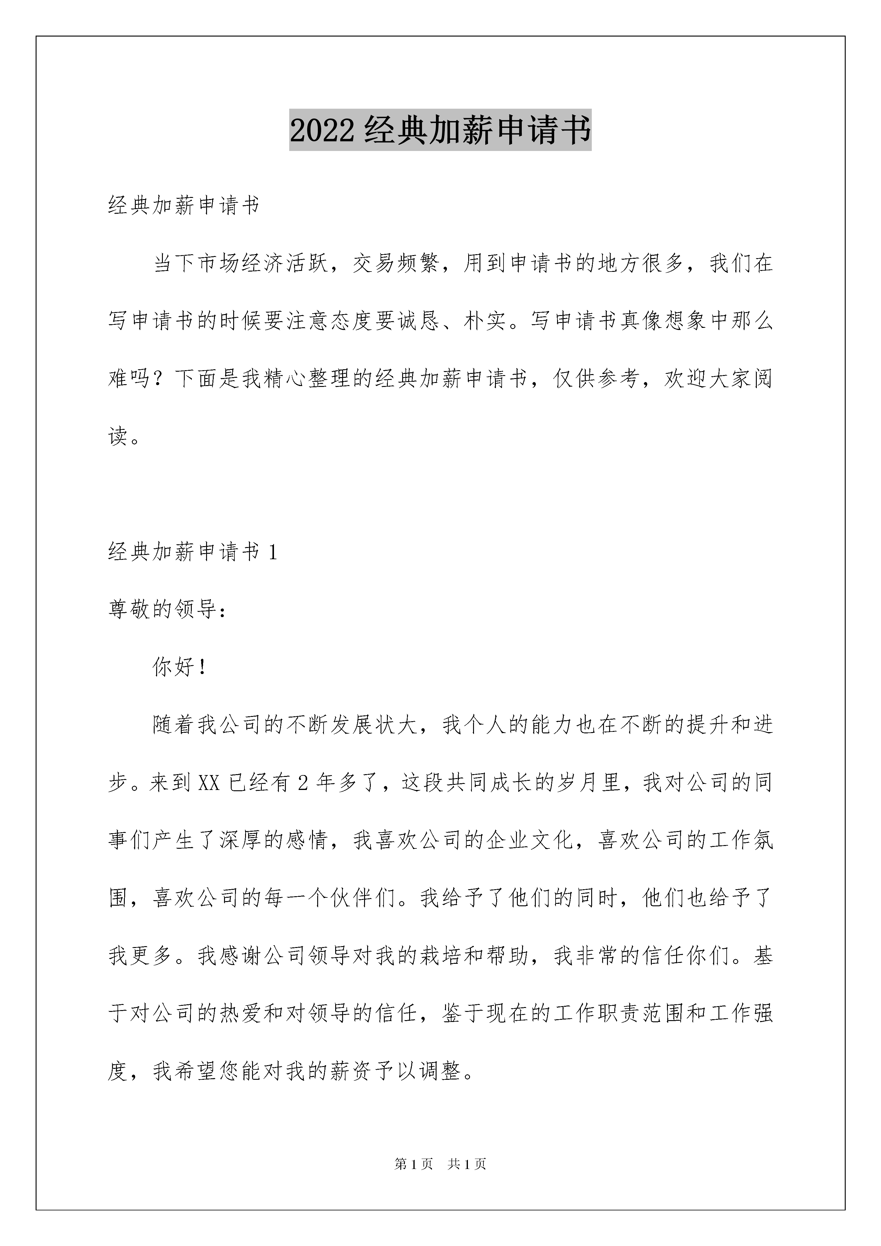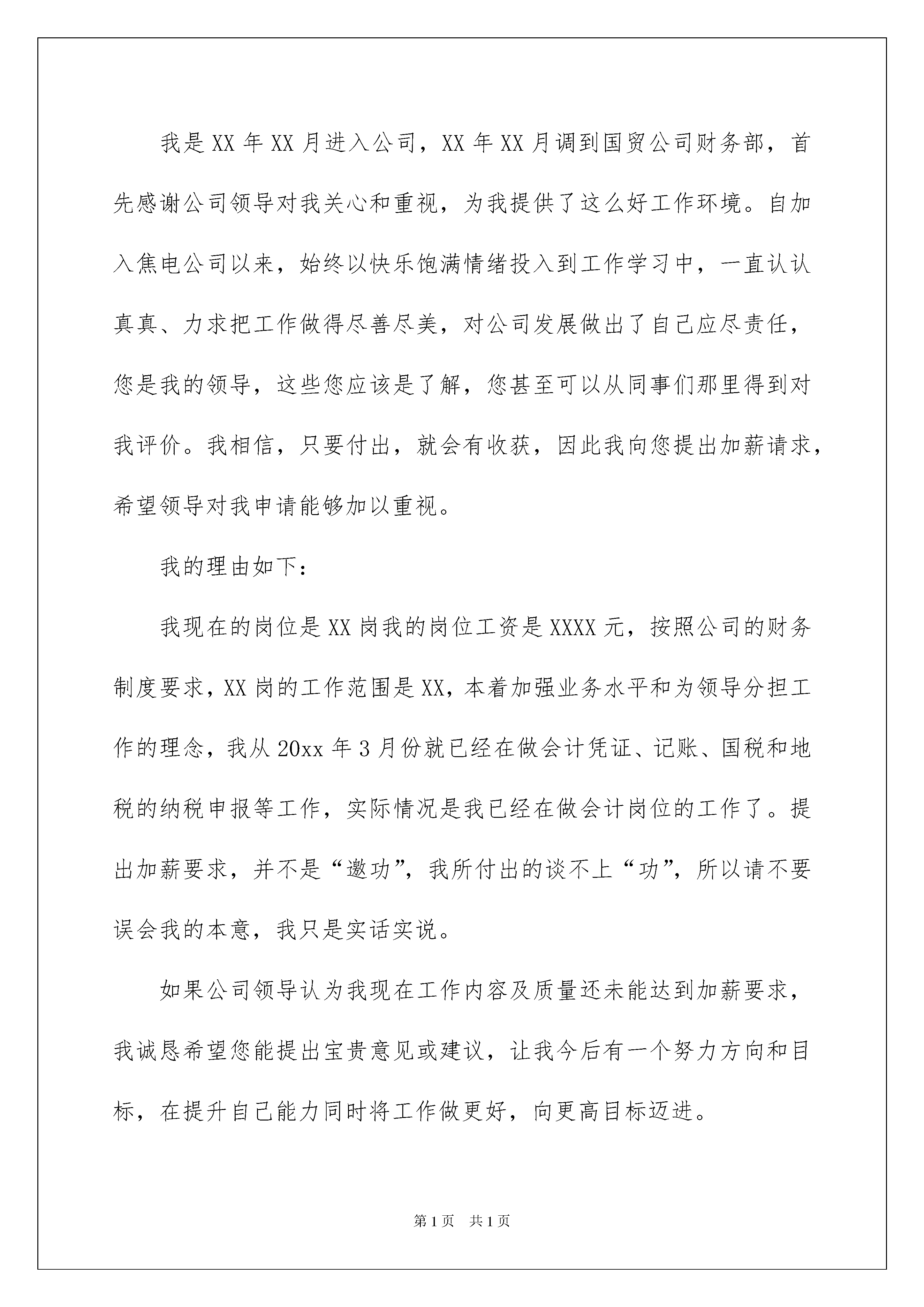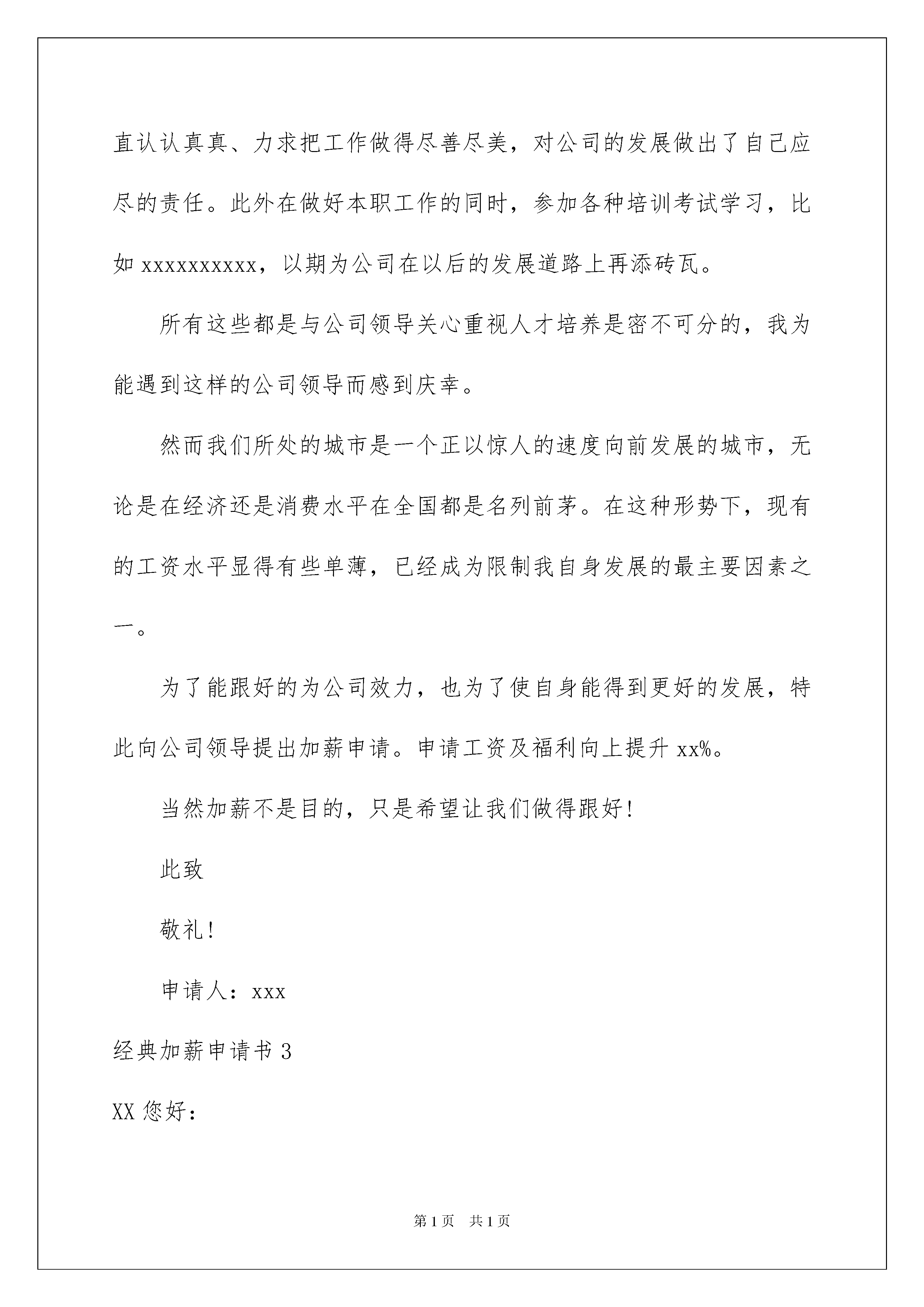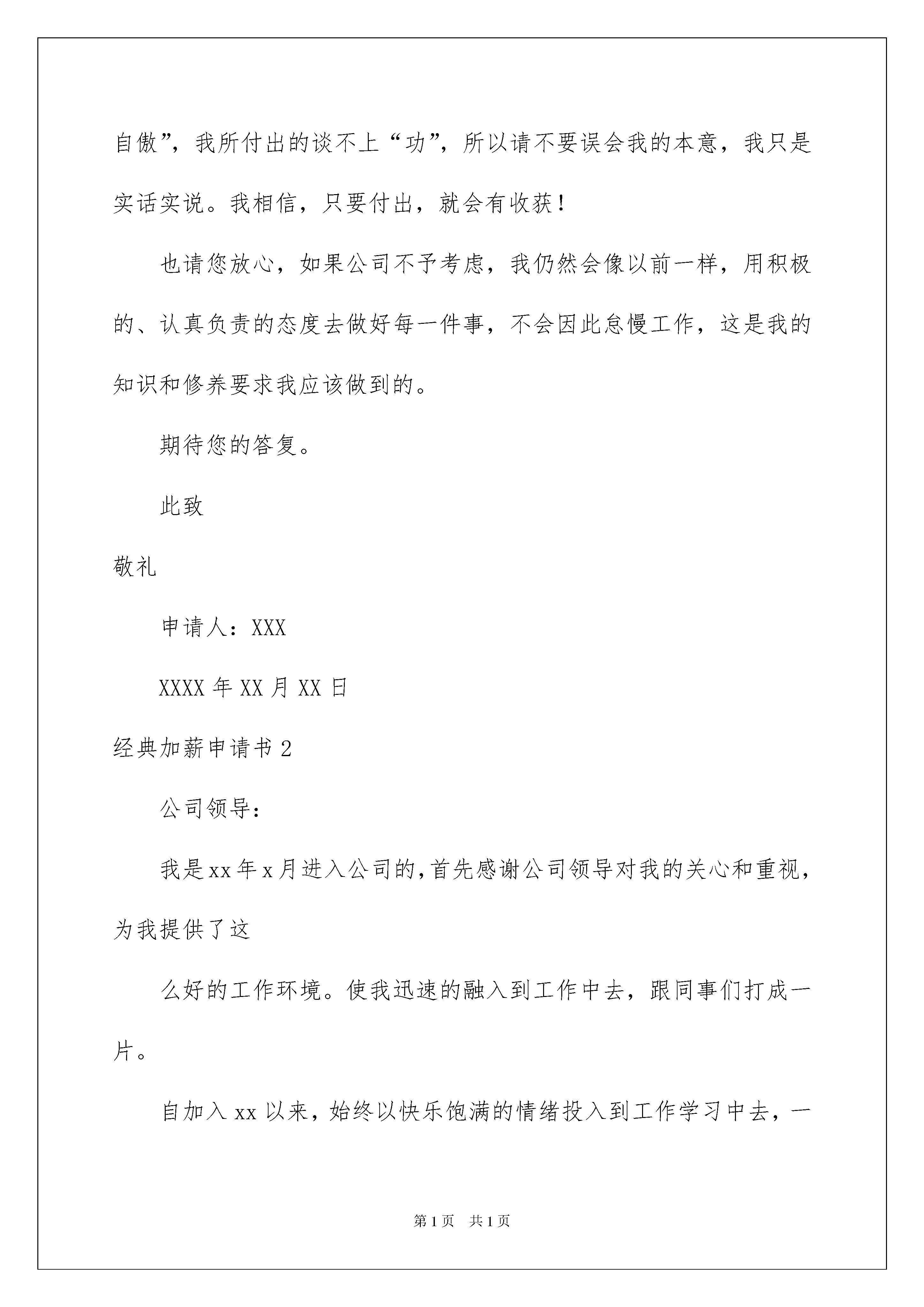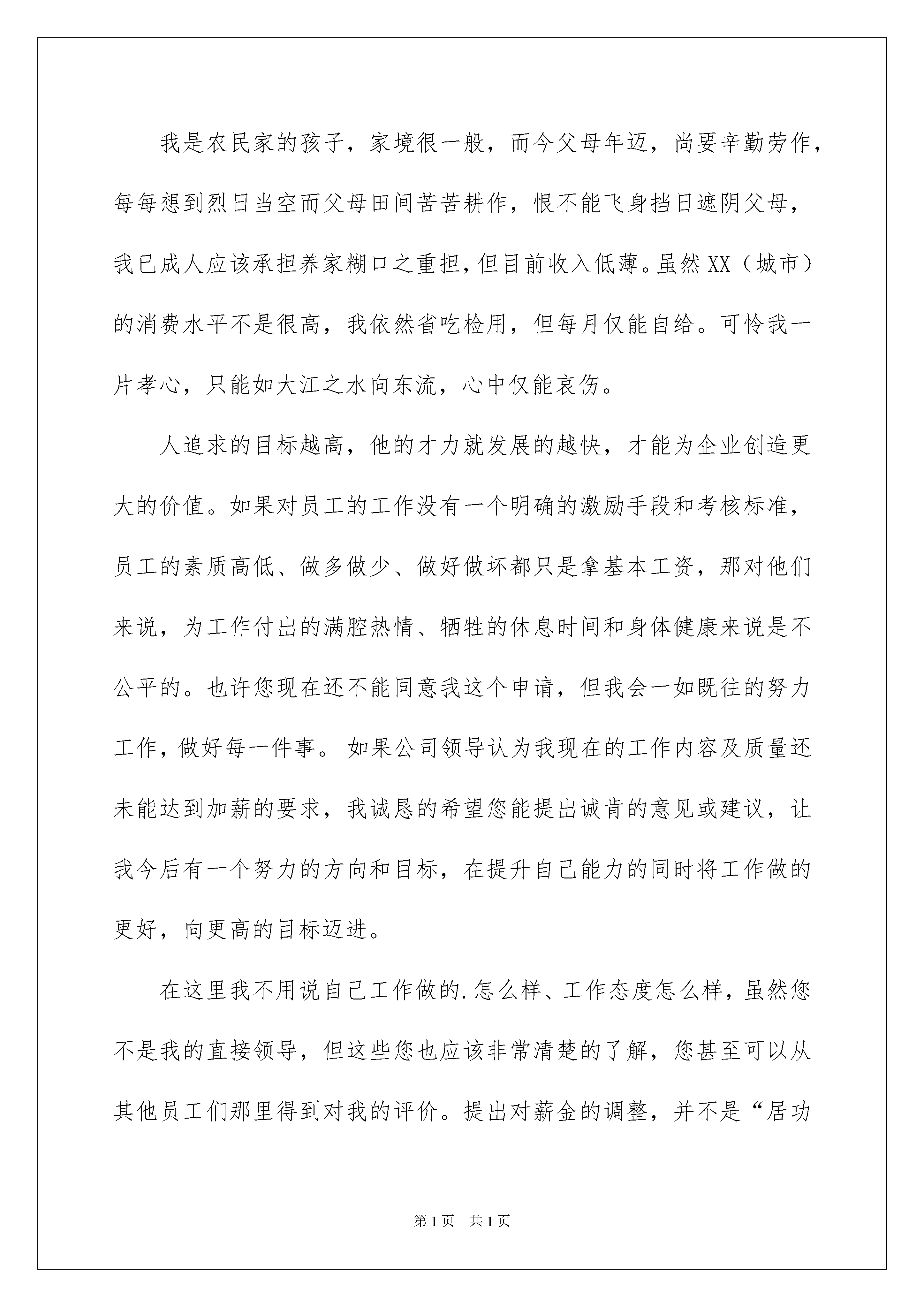2022经典加薪申请书经典加薪申请书当下市场经济活跃,交易频繁,用到申请书的地方很多,我们在写申请书的时候要注意态度要诚恳、朴实。写申请书真像想象中那么难吗?下面是我精心整理的经典加薪申请书,仅供参考,欢迎大家阅读。经典加薪申请书1尊敬的领导:你好!随着我公司的不断发展状大,我个人的能力也在不断的提升和进步。来到XX已经有2年多了,这段共同成长的岁月里,我对公司的同事们产生了深厚的感情,我喜欢公司的企业文化,喜欢公司的工作氛围,喜欢公司的每一个伙伴们。我给予了他们的同时,他们也给予了我更多。我感谢公司领导对我的栽培和帮助,我非常的信任你们。基于对公司的热爱和对领导的信任,鉴于现在的工作职责范围和工作强度,我希望您能对我的薪资予以调整。我是农民家的孩子,家境很一般,而今父母年迈,尚要辛勤劳作,每每想到烈日当空而父母田间苦苦耕作,恨不能飞身挡日遮阴父母,我已成人应该承担养家糊口之重担,但目前收入低薄。虽然XX(城市)的消费水平不是很高,我依然省吃检用,但每月仅能自给。可怜我一片孝心,只能如大江之水向东流,心中仅能哀伤。人追求的目标越高,他的才力就发展的越快,才能为企业创造更大的价值。如果对员工的工作没有一个明确的激励手段和考核标准,员工的素质高低、做多做少、做好做坏都只是拿基本工资,那对他们来说,为工作付出的满腔热情、牺牲的休息时间和身体健康来说是不公平的。也许您现在还不能同意我这个申请,但我会一如既往的努力工作,做好每一件事。如果公司领导认为我现在的工作内容及质量还未能达到加薪的要求,我诚恳的希望您能提出诚肯的意见或建议,让我今后有一个努力的方向和目标,在提升自己能力的同时将工作做的更好,向更高的目标迈进。在这里我不用说自己工作做的.怎么样、工作态度怎么样,虽然您不是我的直接领导,但这些您也应该非常清楚的了解,您甚至可以从其他员工们那里得到对我的评价。提出对薪金的调整,并不是“居功自傲”,我所付出的谈不上“功”,所以请不要误会我的本意,我只是实话实说。我相信,只要付出,就会有收获!也请您放心,如果公司不予考虑,我仍然会像以前一样,用积极的、认真负责的态度去做好每一件事,不会因此怠慢工作,这是我的知识和修养要求我应该做到的。期待您的答复。此致敬礼申请人:XXXXXXX年XX月XX日经典加薪申请书2公司领导:我是xx年x月进入公司的,首先感谢公司领导对我的关心和重视,为我提供了这么好的工作环境。使我迅速的融入到工作中去,跟同事们打成一片。自加入xx以来,始终以快乐饱满的情绪投入到工作学习中去,一直认认真真、力求把工作做得尽善尽美,对公司的发展做出了自己应尽的责任。此外在做好本职工作的同时,参加各种培训考试学习,比如xxxxxxxxxx,以期为公司在以后的发展道路上再添砖瓦。所有这些都是与公司领导关心重视人才培养是密不可分的,我为能遇到这样的公司领导而感到庆幸。然而我们所处的城市是一个正以惊人的速度向前发展的城市,无论是在经济还是消费水平在全国都是名列前茅。在这种形势下,现有的工资水平显得有些单薄,已经成为限制我自身发展的最主要因素之一。为了能跟好的为公司效力,也为了使自身能得到更好的发展,特此向公司领导提出加薪申请。申请工资及福利向上提升xx%。当然加薪不是目的,只是希望让我们做得跟好!此致敬礼!申请人:xxx经典加薪申请书3XX您好:我是XX年XX月进入公司,XX年XX月调到国贸公司财务部,首先感谢公司领导对我关心和重视,为我提供了这么好工作环境。自加入焦电公司以来,始终以快乐饱满情绪投入到工作学习中,一直认认真真、力求把工作做得尽善尽美,对公司发展做出了自己应尽责任,您是我的领导,这些您应该是了解,您甚至可以从同事们那里得到对我评价。我相信,只要付出,就会有收获,因此我向您提出加薪请求,希望领导对我申请能够加以重视。我的理由如下:我现在的岗位是XX岗我的岗位工资是XXXX元,按照公司的财务制度要求,XX岗的工作范围是XX,本着加强业务水平和为领导分担工作的理念,我从20xx年3月份就已经在做会计凭证、记账、国税和地税的纳税申报等工作,实际情况是我已经在做会计岗位的工作了。提出加薪要求,并不是“邀功”,我所付出的谈不上“功”,所以请不要误会我的本意,我只是实话实说。如果公司领导认为我现在工作内容及质量还未能达到加薪要求,我诚恳希望您能提出宝贵意见或建议,让我今后有一个努力方向和目标,在提升自己能力同时将工作做更好,向更高目标迈进。也请您放心,如果公司不予考虑,我仍然会像以前一样,用积极、认真负责态度去做好每一件事,不会因此怠慢工作,薪水虽然很重要但这不是我惟一的追求。此致敬礼
