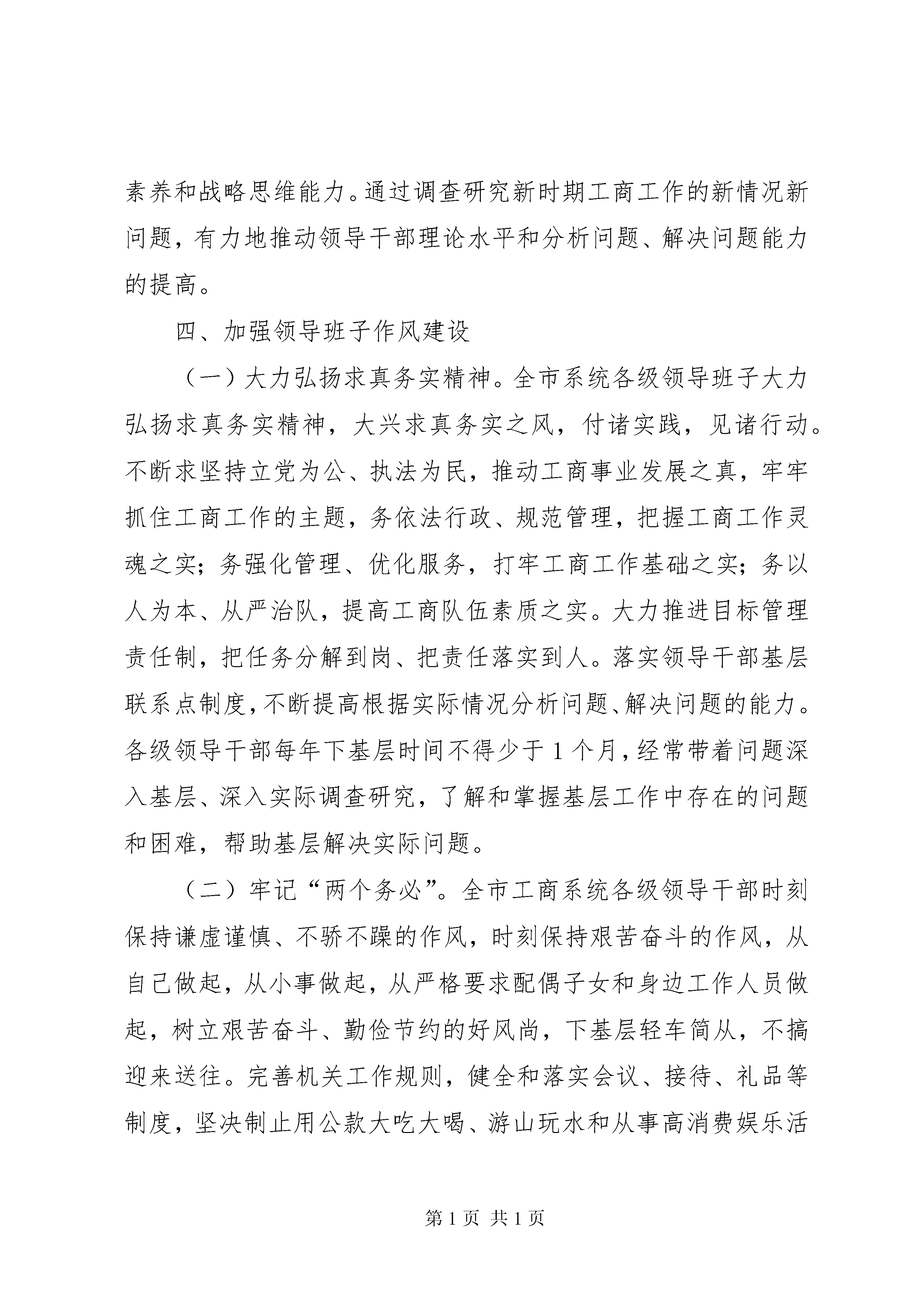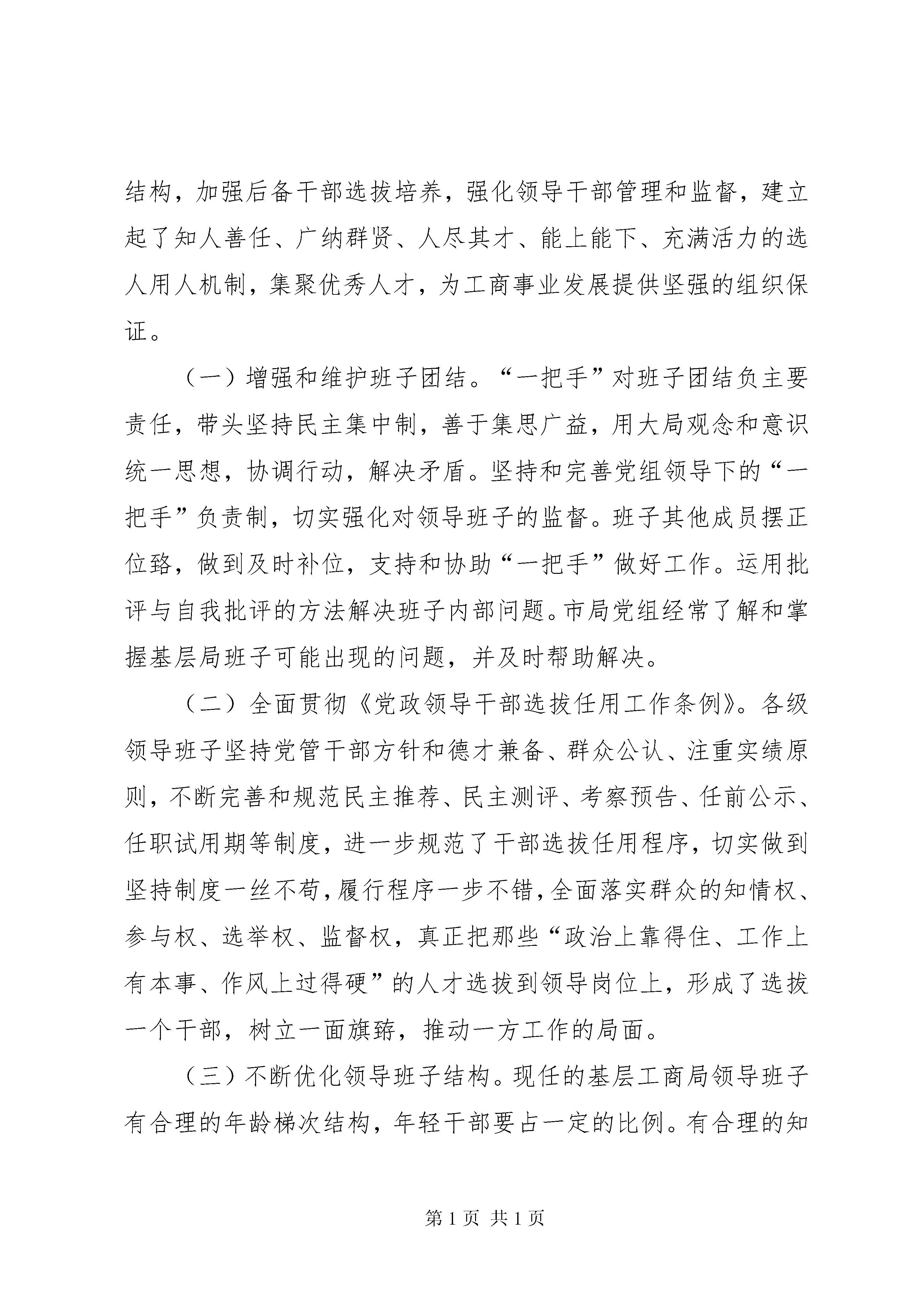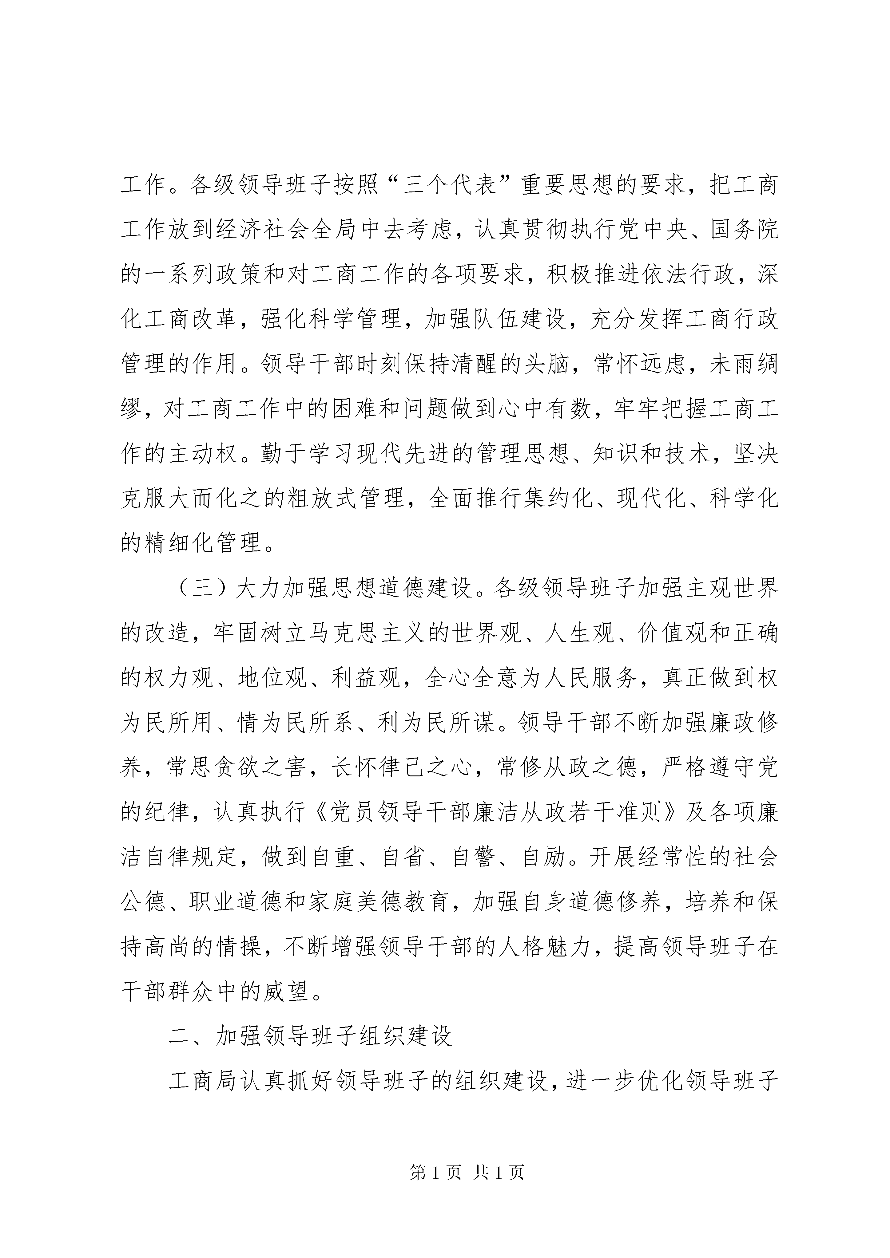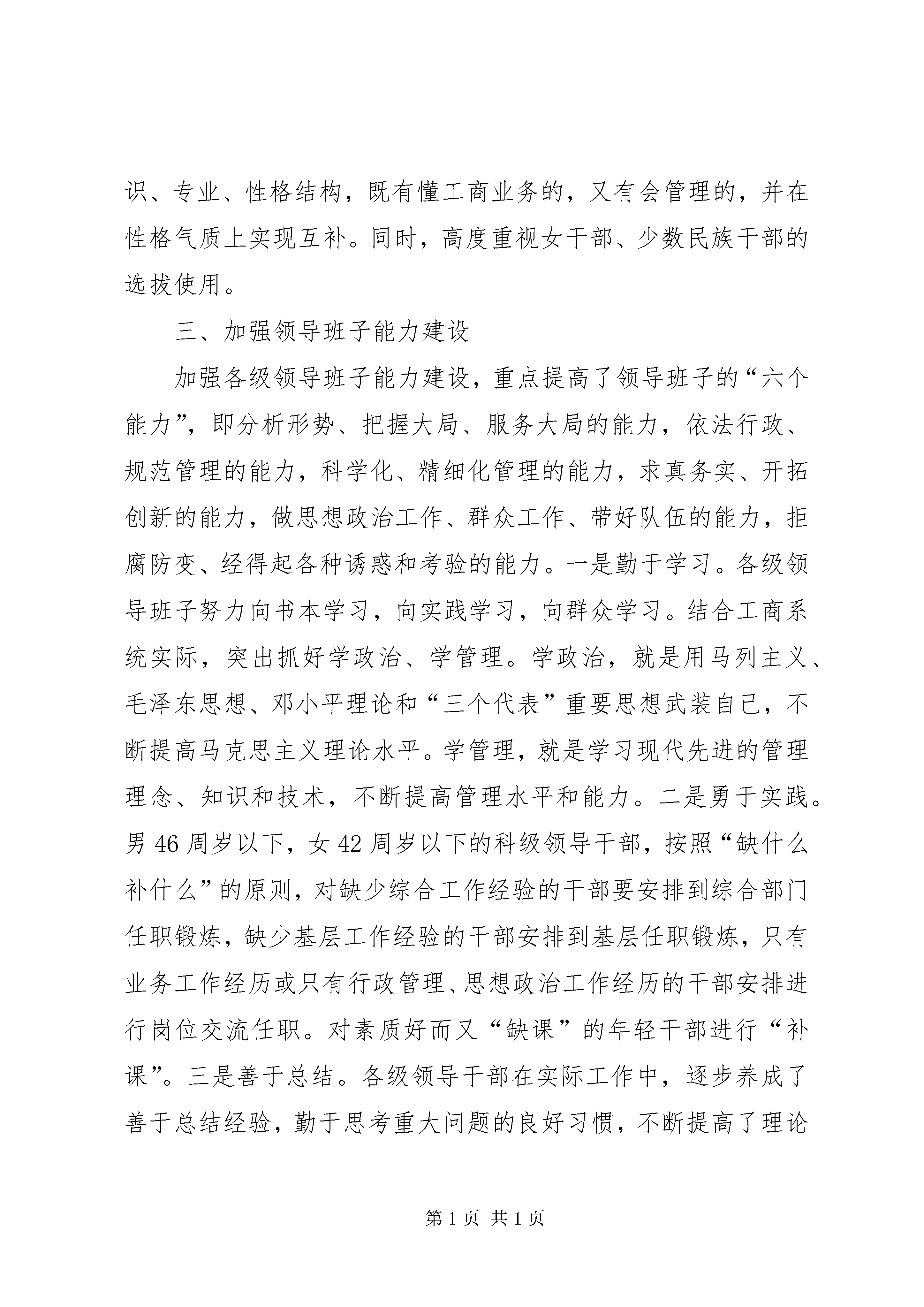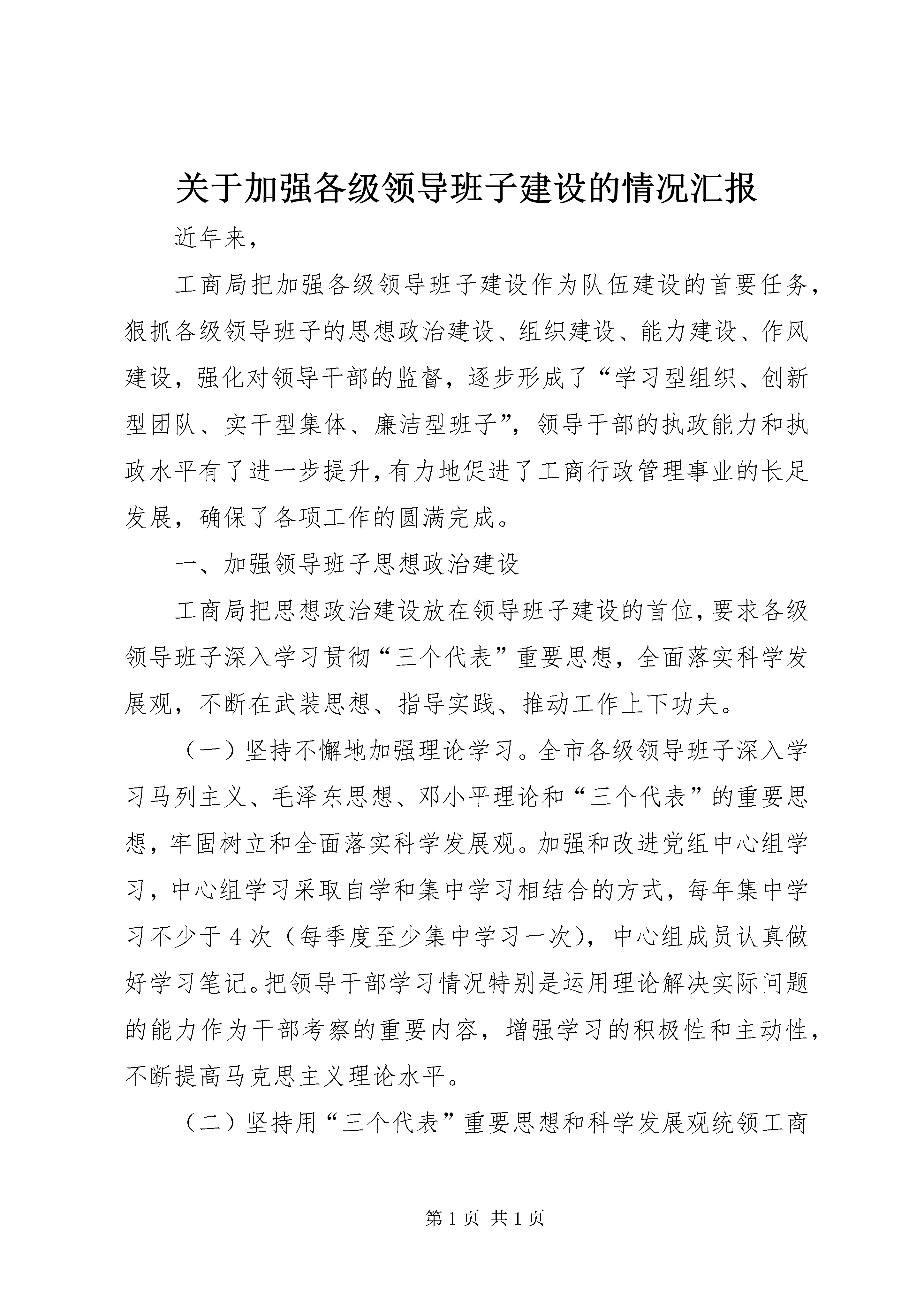 关于加强各级领导班子建设的情况汇报近年来,工商局把加强各级领导班子建设作为队伍建设的首要任务,狠抓各级领导班子的思想政治建设、组织建设、能力建设、作风建设,强化对领导干部的监督,逐步形成了“学习型组织、创新型团队、实干型集体、廉洁型班子”,领导干部的执政能力和执政水平有了进一步提升,有力地促进了工商行政管理事业的长足发展,确保了各项工作的圆满完成。一、加强领导班子思想政治建设工商局把思想政治建设放在领导班子建设的首位,要求各级领导班子深入学习贯彻“三个代表”重要思想,全面落实科学发展观,不断在武装思想、指导实践、推动工作上下功夫。(一)坚持不懈地加强理论学习。全市各级领导班子深入学习马列主义、毛泽东思想、邓小平理论和“三个代表”的重要思想,牢固树立和全面落实科学发展观。加强和改进党组中心组学习,中心组学习采取自学和集中学习相结合的方式,每年集中学习不少于4次(每季度至少集中学习一次),中心组成员认真做好学习笔记。把领导干部学习情况特别是运用理论解决实际问题的能力作为干部考察的重要内容,增强学习的积极性和主动性,不断提高马克思主义理论水平。(二)坚持用“三个代表”重要思想和科学发展观统领工商工作。各级领导班子按照“三个代表”重要思想的要求,把工商工作放到经济社会全局中去考虑,认真贯彻执行党中央、国务院的一系列政策和对工商工作的各项要求,积极推进依法行政,深化工商改革,强化科学管理,加强队伍建设,充分发挥工商行政管理的作用。领导干部时刻保持清醒的头脑,常怀远虑,未雨绸缪,对工商工作中的困难和问题做到心中有数,牢牢把握工商工作的主动权。勤于学习现代先进的管理思想、知识和技术,坚决克服大而化之的粗放式管理,全面推行集约化、现代化、科学化的精细化管理。(三)大力加强思想道德建设。各级领导班子加强主观世界的改造,牢固树立马克思主义的世界观、人生观、价值观和正确的权力观、地位观、利益观,全心全意为人民服务,真正做到权为民所用、情为民所系、利为民所谋。领导干部不断加强廉政修养,常思贪欲之害,长怀律己之心,常修从政之德,严格遵守党的纪律,认真执行《党员领导干部廉洁从政若干准则》及各项廉洁自律规定,做到自重、自省、自警、自励。开展经常性的社会公德、职业道德和家庭美德教育,加强自身道德修养,培养和保持高尚的情操,不断增强领导干部的人格魅力,提高领导班子在干部群众中的威望。二、加强领导班子组织建设工商局认真抓好领导班子的组织建设,进一步优化领导班子结构,加强后备干部选拔培养,强化领导干部管理和监督,建立起了知人善任、广纳群贤、人尽其才、能上能下、充满活力的选人用人机制,集聚优秀人才,为工商事业发展提供坚强的组织保证。(一)增强和维护班子团结。“一把手”对班子团结负主要责任,带头坚持民主集中制,善于集思广益,用大局观念和意识统一思想,协调行动,解决矛盾。坚持和完善党组领导下的“一把手”负责制,切实强化对领导班子的监督。班子其他成员摆正位臵,做到及时补位,支持和协助“一把手”做好工作。运用批评与自我批评的方法解决班子内部问题。市局党组经常了解和掌握基层局班子可能出现的问题,并及时帮助解决。(二)全面贯彻《党政领导干部选拔任用工作条例》。各级领导班子坚持党管干部方针和德才兼备、群众公认、注重实绩原则,不断完善和规范民主推荐、民主测评、考察预告、任前公示、任职试用期等制度,进一步规范了干部选拔任用程序,切实做到坚持制度一丝不苟,履行程序一步不错,全面落实群众的知情权、参与权、选举权、监督权,真正把那些“政治上靠得住、工作上有本事、作风上过得硬”的人才选拔到领导岗位上,形成了选拔一个干部,树立一面旗臶,推动一方工作的局面。(三)不断优化领导班子结构。现任的基层工商局领导班子有合理的年龄梯次结构,年轻干部要占一定的比例。有合理的知识、专业、性格结构,既有懂工商业务的,又有会管理的,并在性格气质上实现互补。同时,高度重视女干部、少数民族干部的选拔使用。三、加强领导班子能力建设加强各级领导班子能力建设,重点提高了领导班子的“六个能力”,即分析形势、把握大局、服务大局的能力,依法行政、规范管理的能力,科学化、精细化管理的能力,求真务实、开拓创新的能力,做思想政治工作、群众工作、带好队伍的能力,拒腐防变、经得起各种诱惑和考验的能力。一是勤于学习。各级领导班子努力向书本学习,向实践学习,向群众学习。结合工商系统实际,突出抓好学政治、学管理。学政治,就是用马列主义、毛泽东思想、邓小平理论和“三个代表”重要思想武装自己,不断提高马克思主义理论水平。学管理,就是学习现代先进的管理理念、知识和技术,不断提高管理水平和能力。二是勇于实践。男46周岁以下,女42周岁以下的科级领导干部,按照“缺什么补什么”的原则,对缺少综合工作经验的干部要安排到综合部门任职锻