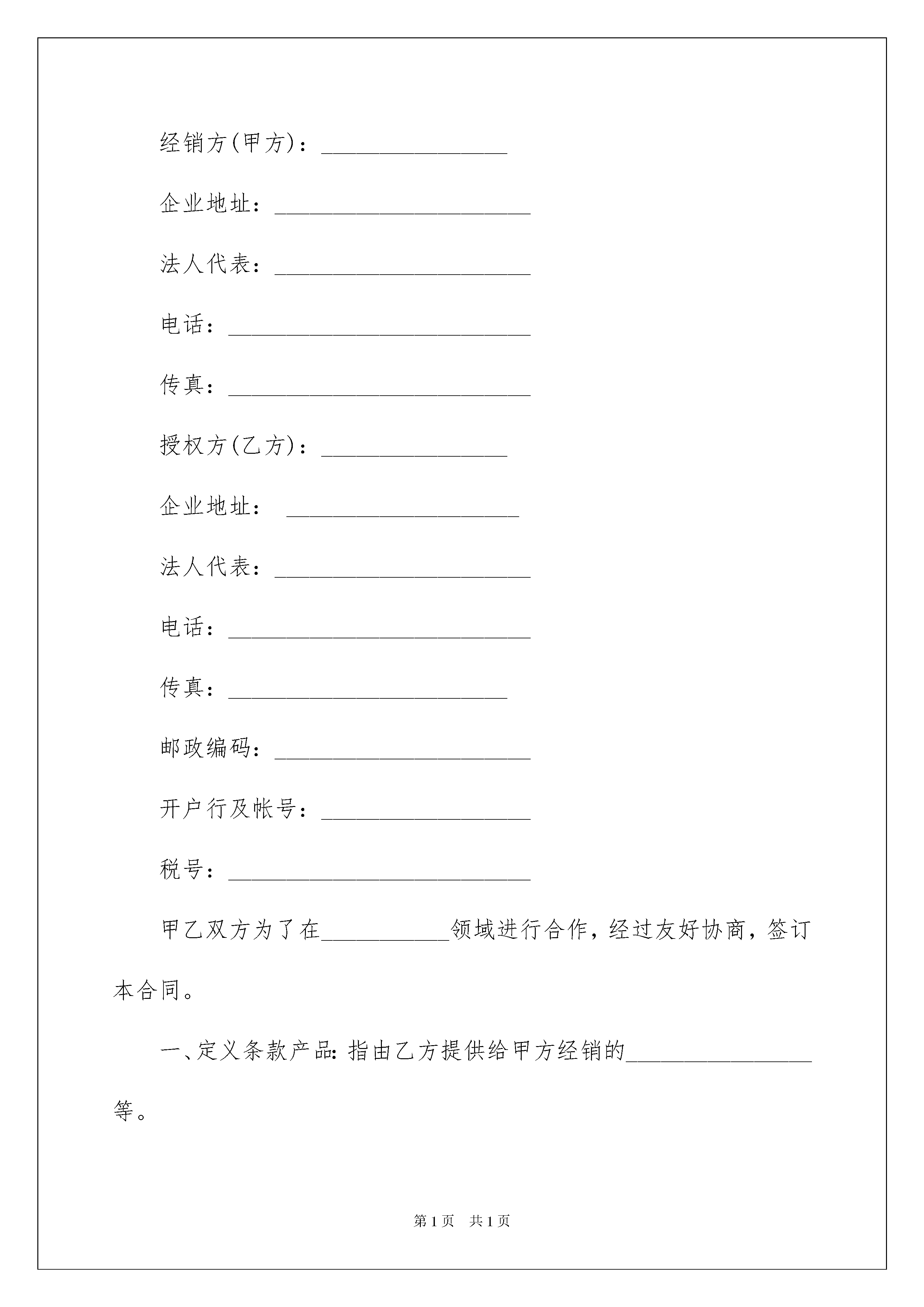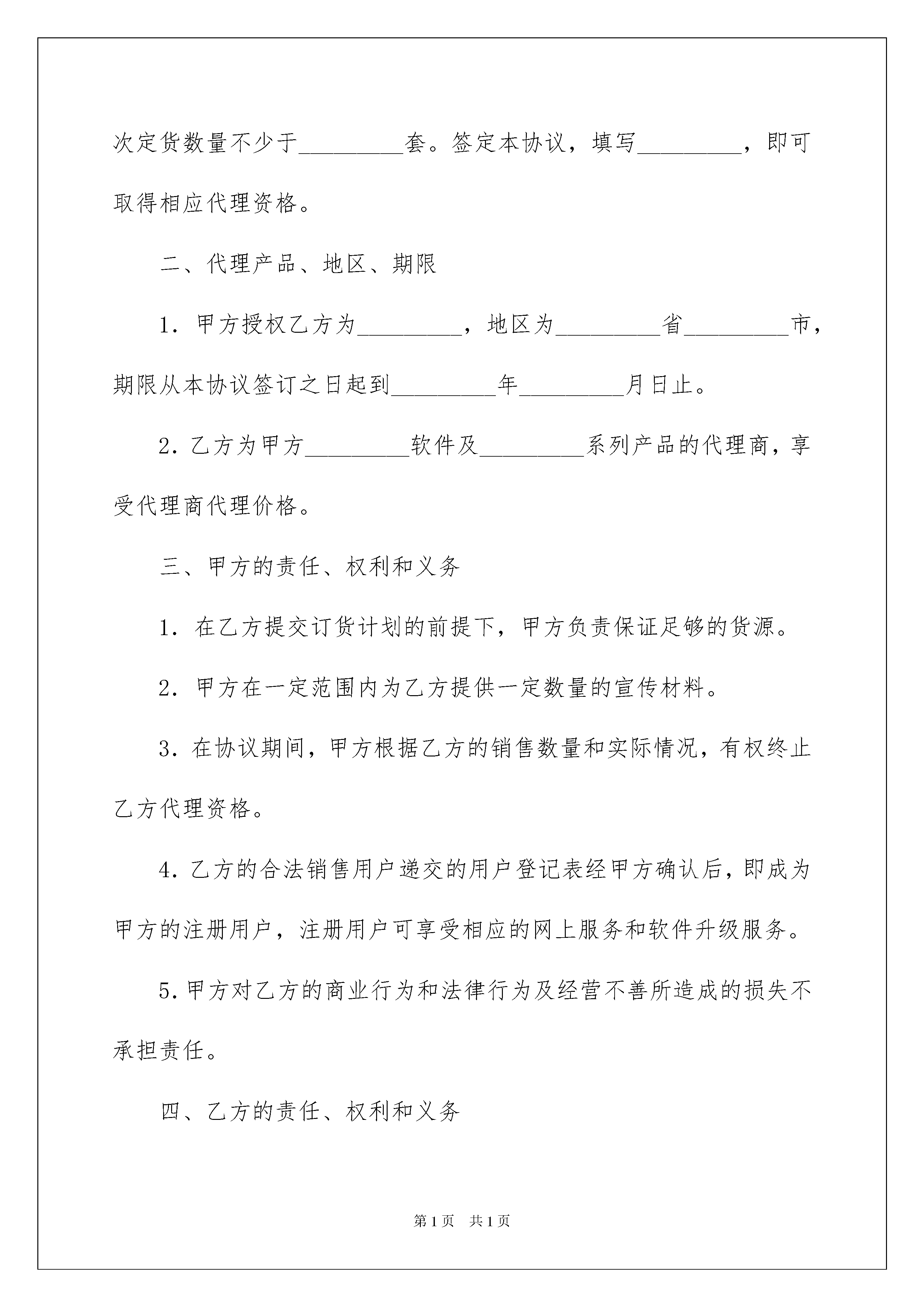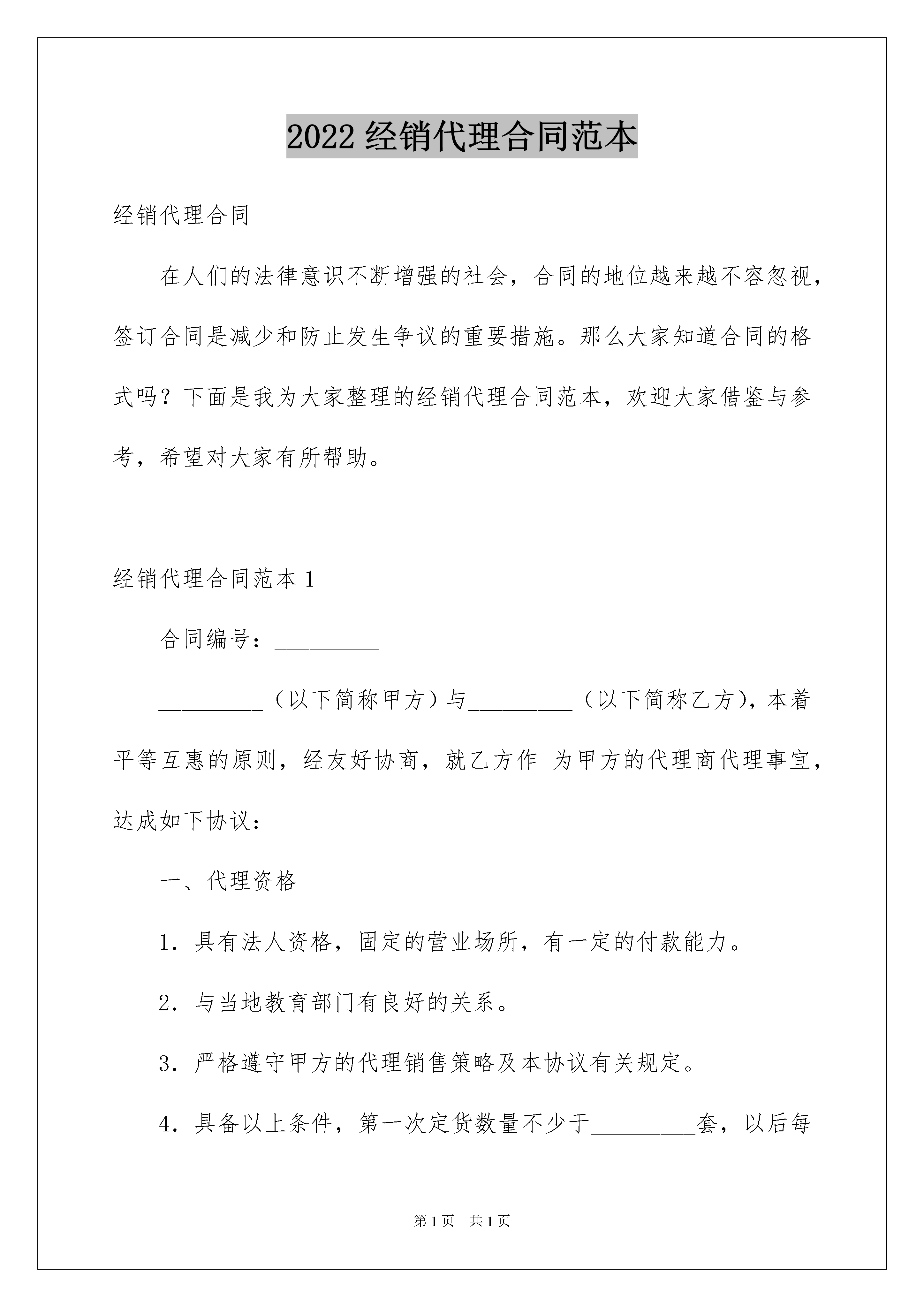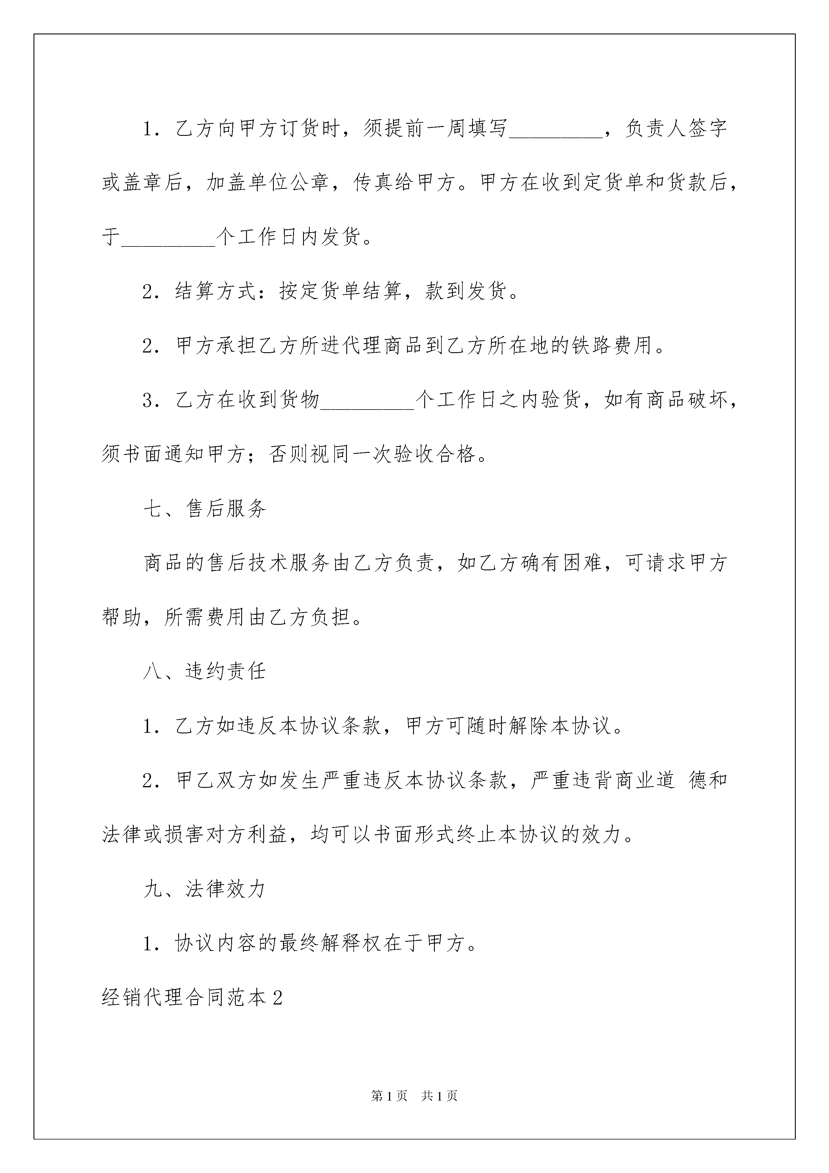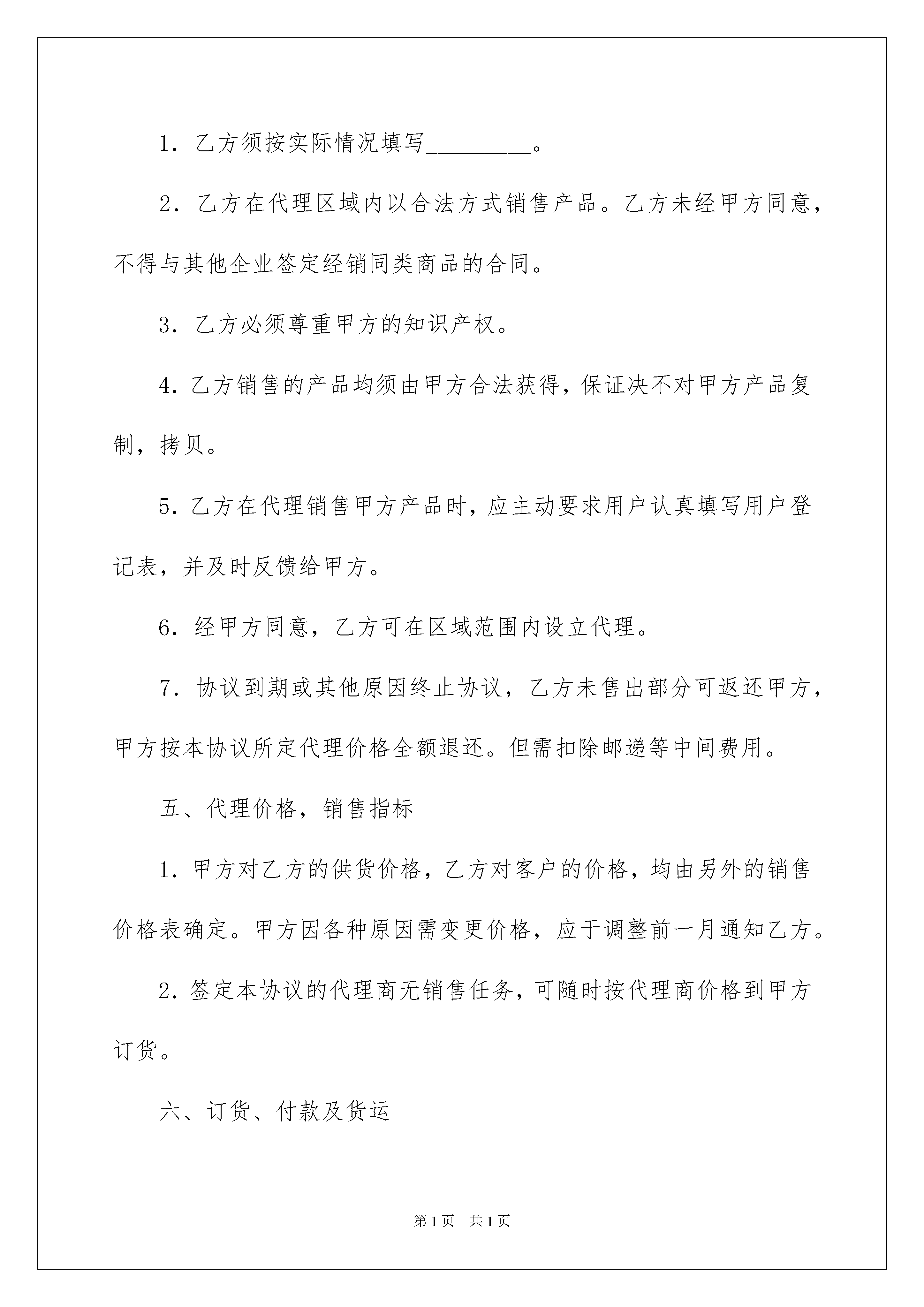 2022经销代理合同范本经销代理合同在人们的法律意识不断增强的社会,合同的地位越来越不容忽视,签订合同是减少和防止发生争议的重要措施。那么大家知道合同的格式吗?下面是我为大家整理的经销代理合同范本,欢迎大家借鉴与参考,希望对大家有所帮助。经销代理合同范本1合同编号:__________________(以下简称甲方)与_________(以下简称乙方),本着平等互惠的原则,经友好协商,就乙方作为甲方的代理商代理事宜,达成如下协议:一、代理资格1.具有法人资格,固定的营业场所,有一定的付款能力。2.与当地教育部门有良好的关系。3.严格遵守甲方的代理销售策略及本协议有关规定。4.具备以上条件,第一次定货数量不少于_________套,以后每次定货数量不少于_________套。签定本协议,填写_________,即可取得相应代理资格。二、代理产品、地区、期限1.甲方授权乙方为_________,地区为_________省_________市,期限从本协议签订之日起到_________年_________月日止。2.乙方为甲方_________软件及_________系列产品的代理商,享受代理商代理价格。三、甲方的责任、权利和义务1.在乙方提交订货计划的前提下,甲方负责保证足够的货源。2.甲方在一定范围内为乙方提供一定数量的宣传材料。3.在协议期间,甲方根据乙方的销售数量和实际情况,有权终止乙方代理资格。4.乙方的合法销售用户递交的用户登记表经甲方确认后,即成为甲方的注册用户,注册用户可享受相应的网上服务和软件升级服务。5.甲方对乙方的商业行为和法律行为及经营不善所造成的损失不承担责任。四、乙方的责任、权利和义务1.乙方须按实际情况填写_________。2.乙方在代理区域内以合法方式销售产品。乙方未经甲方同意,不得与其他企业签定经销同类商品的合同。3.乙方必须尊重甲方的知识产权。4.乙方销售的产品均须由甲方合法获得,保证决不对甲方产品复制,拷贝。5.乙方在代理销售甲方产品时,应主动要求用户认真填写用户登记表,并及时反馈给甲方。6.经甲方同意,乙方可在区域范围内设立代理。7.协议到期或其他原因终止协议,乙方未售出部分可返还甲方,甲方按本协议所定代理价格全额退还。但需扣除邮递等中间费用。五、代理价格,销售指标1.甲方对乙方的供货价格,乙方对客户的价格,均由另外的销售价格表确定。甲方因各种原因需变更价格,应于调整前一月通知乙方。2.签定本协议的代理商无销售任务,可随时按代理商价格到甲方订货。六、订货、付款及货运1.乙方向甲方订货时,须提前一周填写_________,负责人签字或盖章后,加盖单位公章,传真给甲方。甲方在收到定货单和货款后,于_________个工作日内发货。2.结算方式:按定货单结算,款到发货。2.甲方承担乙方所进代理商品到乙方所在地的铁路费用。3.乙方在收到货物_________个工作日之内验货,如有商品破坏,须书面通知甲方;否则视同一次验收合格。七、售后服务商品的售后技术服务由乙方负责,如乙方确有困难,可请求甲方帮助,所需费用由乙方负担。八、违约责任1.乙方如违反本协议条款,甲方可随时解除本协议。2.甲乙双方如发生严重违反本协议条款,严重违背商业道德和法律或损害对方利益,均可以书面形式终止本协议的效力。九、法律效力1.协议内容的最终解释权在于甲方。经销代理合同范本2经销方(甲方):________________企业地址:______________________法人代表:______________________电话:__________________________传真:__________________________授权方(乙方):________________企业地址:____________________法人代表:______________________电话:__________________________传真:________________________邮政编码:______________________开户行及帐号:__________________税号:__________________________甲乙双方为了在___________领域进行合作,经过友好协商,签订本合同。一、定义条款产品:指由乙方提供给甲方经销的________________等。二、经销权在合同的有效期间内,乙方授予甲方_________产品在_________地区的经销权和其它产品的一般经销权。甲方应保证将乙方产品以一种乙方允许的附加值销售