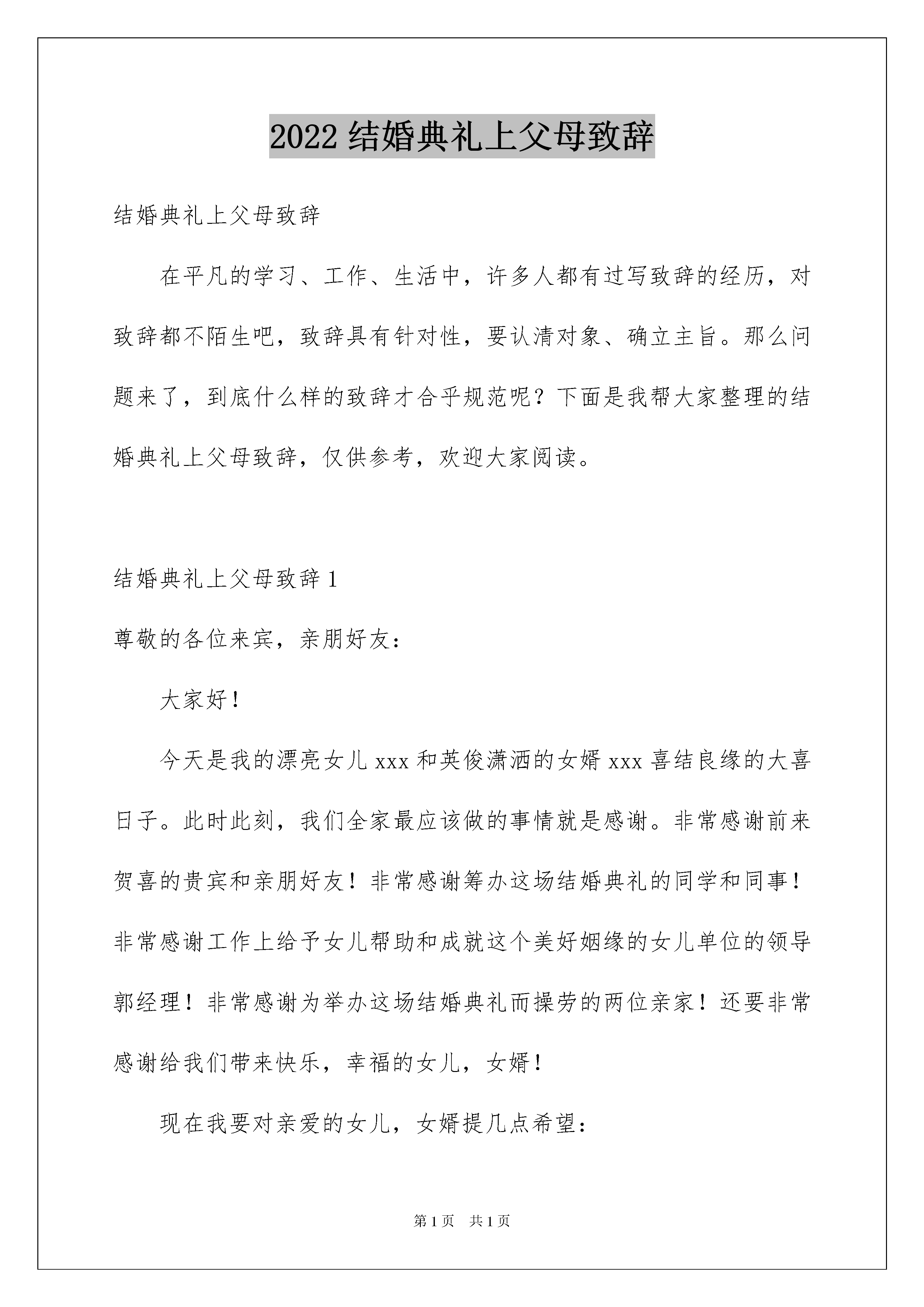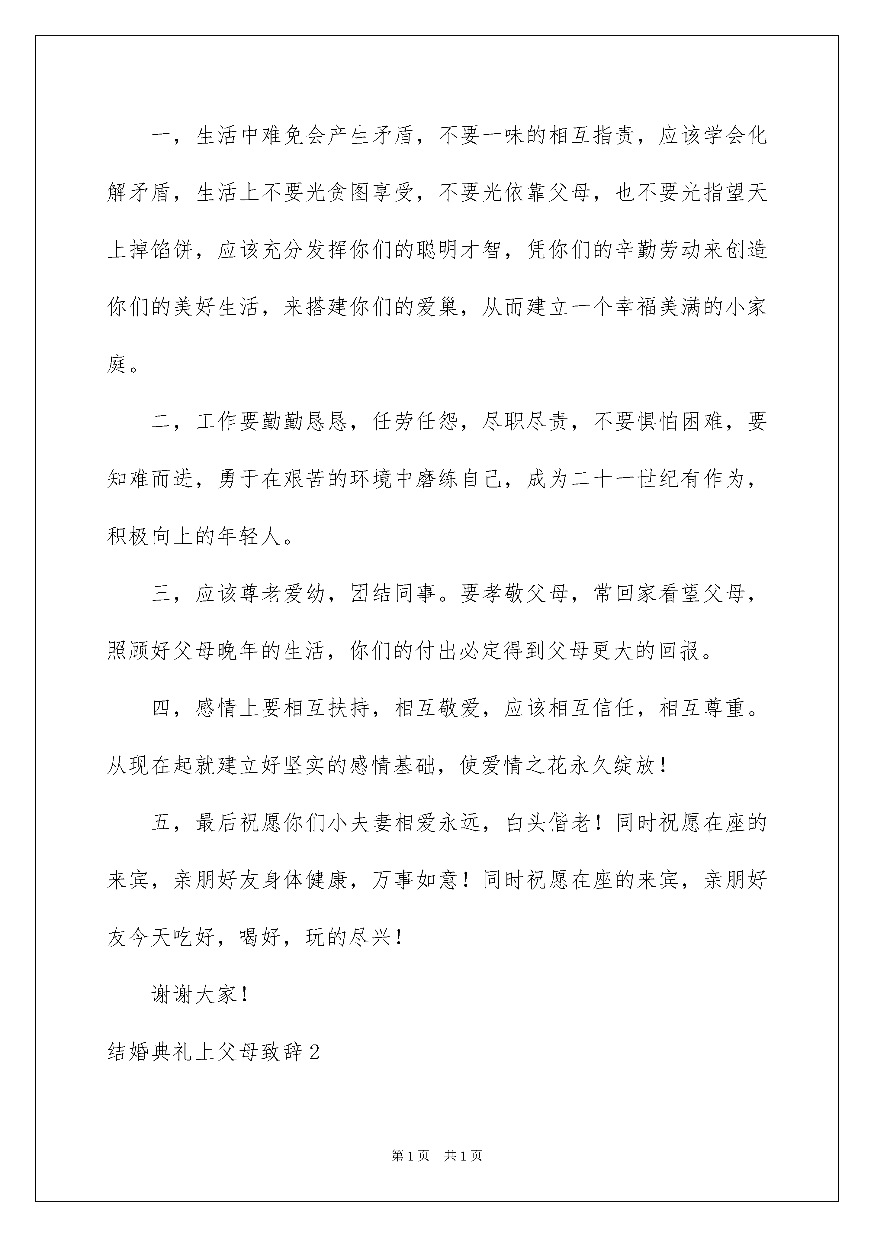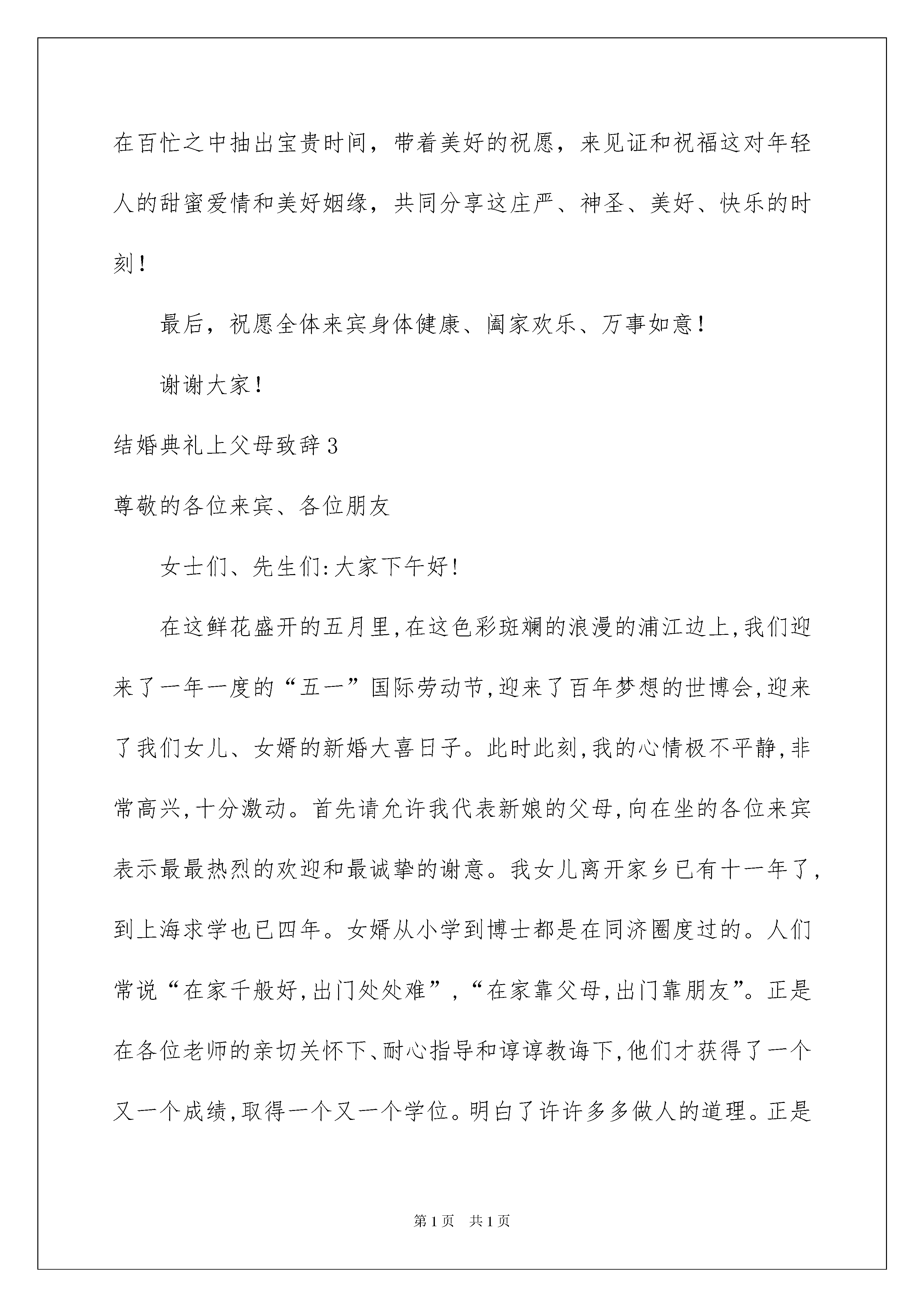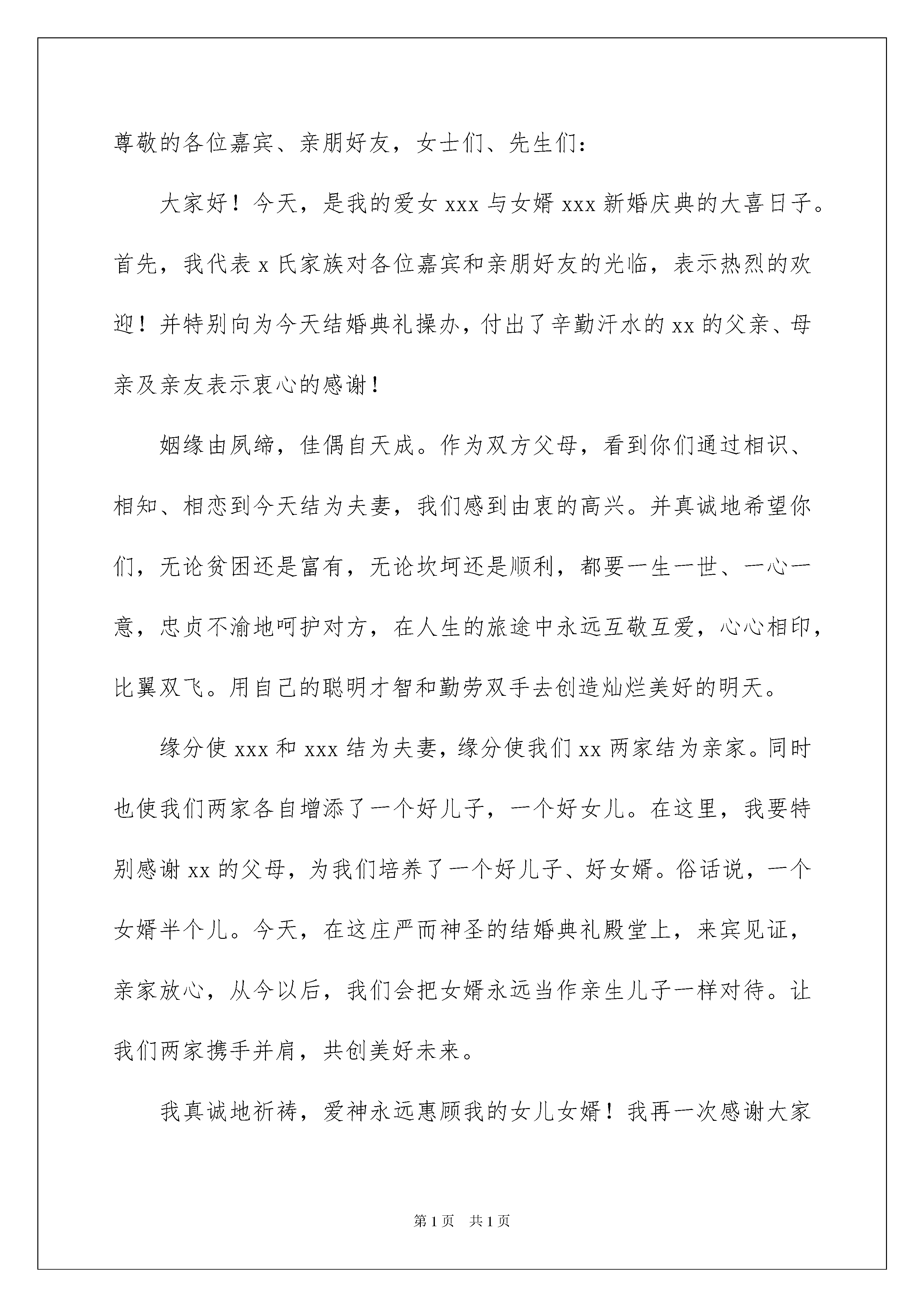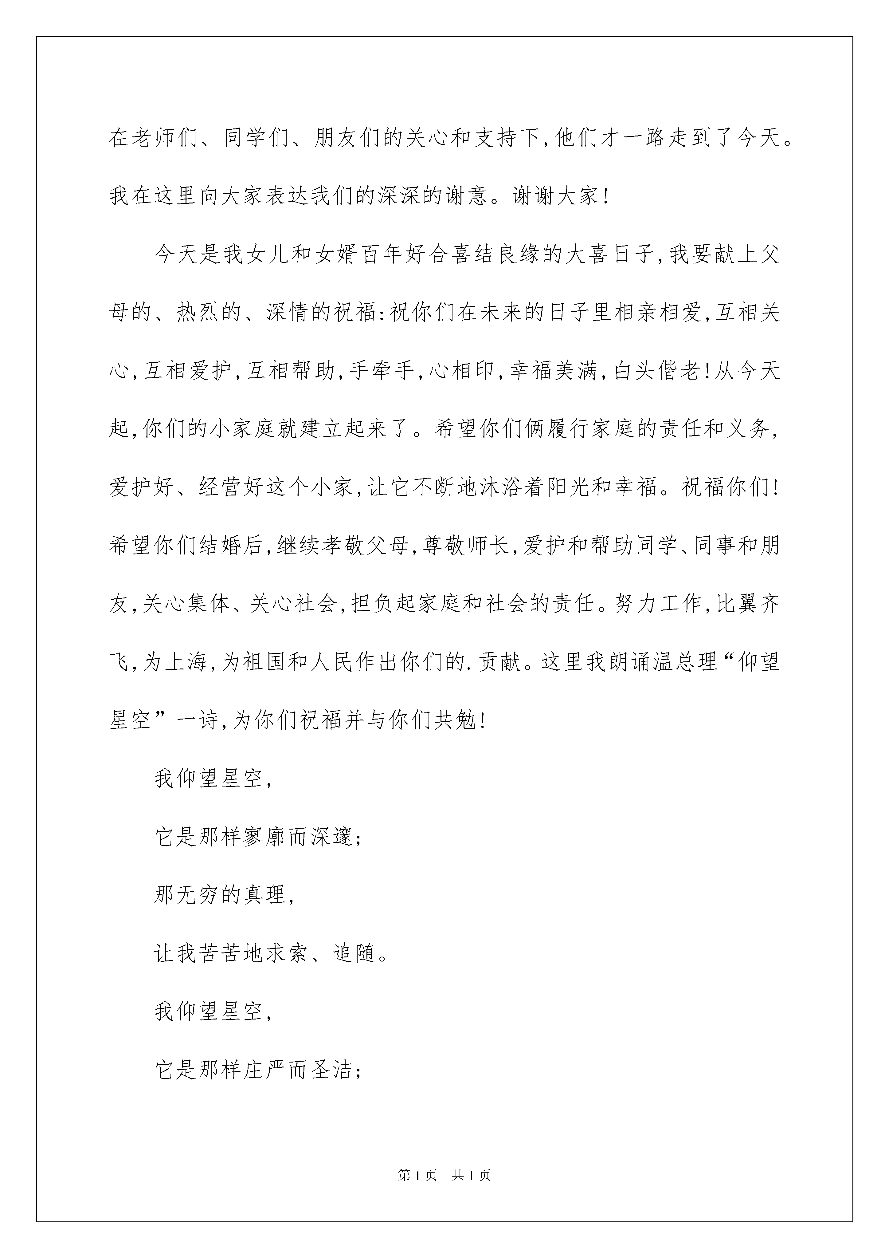 2022结婚典礼上父母致辞结婚典礼上父母致辞在平凡的学习、工作、生活中,许多人都有过写致辞的经历,对致辞都不陌生吧,致辞具有针对性,要认清对象、确立主旨。那么问题来了,到底什么样的致辞才合乎规范呢?下面是我帮大家整理的结婚典礼上父母致辞,仅供参考,欢迎大家阅读。结婚典礼上父母致辞1尊敬的各位来宾,亲朋好友:大家好!今天是我的漂亮女儿xxx和英俊潇洒的女婿xxx喜结良缘的大喜日子。此时此刻,我们全家最应该做的事情就是感谢。非常感谢前来贺喜的贵宾和亲朋好友!非常感谢筹办这场结婚典礼的同学和同事!非常感谢工作上给予女儿帮助和成就这个美好姻缘的女儿单位的领导郭经理!非常感谢为举办这场结婚典礼而操劳的两位亲家!还要非常感谢给我们带来快乐,幸福的女儿,女婿!现在我要对亲爱的女儿,女婿提几点希望:一,生活中难免会产生矛盾,不要一味的相互指责,应该学会化解矛盾,生活上不要光贪图享受,不要光依靠父母,也不要光指望天上掉馅饼,应该充分发挥你们的聪明才智,凭你们的辛勤劳动来创造你们的美好生活,来搭建你们的爱巢,从而建立一个幸福美满的小家庭。二,工作要勤勤恳恳,任劳任怨,尽职尽责,不要惧怕困难,要知难而进,勇于在艰苦的环境中磨练自己,成为二十一世纪有作为,积极向上的年轻人。三,应该尊老爱幼,团结同事。要孝敬父母,常回家看望父母,照顾好父母晚年的生活,你们的付出必定得到父母更大的回报。四,感情上要相互扶持,相互敬爱,应该相互信任,相互尊重。从现在起就建立好坚实的感情基础,使爱情之花永久绽放!五,最后祝愿你们小夫妻相爱永远,白头偕老!同时祝愿在座的来宾,亲朋好友身体健康,万事如意!同时祝愿在座的来宾,亲朋好友今天吃好,喝好,玩的尽兴!谢谢大家!结婚典礼上父母致辞2尊敬的各位嘉宾、亲朋好友,女士们、先生们:大家好!今天,是我的爱女xxx与女婿xxx新婚庆典的大喜日子。首先,我代表x氏家族对各位嘉宾和亲朋好友的光临,表示热烈的欢迎!并特别向为今天结婚典礼操办,付出了辛勤汗水的xx的父亲、母亲及亲友表示衷心的感谢!姻缘由夙缔,佳偶自天成。作为双方父母,看到你们通过相识、相知、相恋到今天结为夫妻,我们感到由衷的高兴。并真诚地希望你们,无论贫困还是富有,无论坎坷还是顺利,都要一生一世、一心一意,忠贞不渝地呵护对方,在人生的旅途中永远互敬互爱,心心相印,比翼双飞。用自己的聪明才智和勤劳双手去创造灿烂美好的明天。缘分使xxx和xxx结为夫妻,缘分使我们xx两家结为亲家。同时也使我们两家各自增添了一个好儿子,一个好女儿。在这里,我要特别感谢xx的父母,为我们培养了一个好儿子、好女婿。俗话说,一个女婿半个儿。今天,在这庄严而神圣的结婚典礼殿堂上,来宾见证,亲家放心,从今以后,我们会把女婿永远当作亲生儿子一样对待。让我们两家携手并肩,共创美好未来。我真诚地祈祷,爱神永远惠顾我的女儿女婿!我再一次感谢大家在百忙之中抽出宝贵时间,带着美好的祝愿,来见证和祝福这对年轻人的甜蜜爱情和美好姻缘,共同分享这庄严、神圣、美好、快乐的时刻!最后,祝愿全体来宾身体健康、阖家欢乐、万事如意!谢谢大家!结婚典礼上父母致辞3尊敬的各位来宾、各位朋友女士们、先生们:大家下午好!在这鲜花盛开的五月里,在这色彩斑斓的浪漫的浦江边上,我们迎来了一年一度的“五一”国际劳动节,迎来了百年梦想的世博会,迎来了我们女儿、女婿的新婚大喜日子。此时此刻,我的心情极不平静,非常高兴,十分激动。首先请允许我代表新娘的父母,向在坐的各位来宾表示最最热烈的欢迎和最诚挚的谢意。我女儿离开家乡已有十一年了,到上海求学也已四年。女婿从小学到博士都是在同济圈度过的。人们常说“在家千般好,出门处处难”,“在家靠父母,出门靠朋友”。正是在各位老师的亲切关怀下、耐心指导和谆谆教诲下,他们才获得了一个又一个成绩,取得一个又一个学位。明白了许许多多做人的道理。正是在老师们、同学们、朋友们的关心和支持下,他们才一路走到了今天。我在这里向大家表达我们的深深的谢意。谢谢大家!今天是我女儿和女婿百年好合喜结良缘的大喜日子,我要献上父母的、热烈的、深情的祝福:祝你们在未来的日子里相亲相爱,互相关心,互相爱护,互相帮助,手牵手,心相印,幸福美满,白头偕老!从今天起,你们的小家庭就建立起来了。希望你们俩履行家庭的责任和义务,爱护好、经营好这个小家,让它不断地沐浴着阳光和幸福。祝福你们!希望你们结婚后,继续孝敬父母,尊敬师长,爱护和帮助同学、同事和朋友,关心集体、关心社会,担负起家庭和社会的责任。努力工作,比翼齐飞,为上海,为祖国和人民作出你们的.贡献。这里我朗诵温总理“仰望星空”一诗,为你们祝福并与你