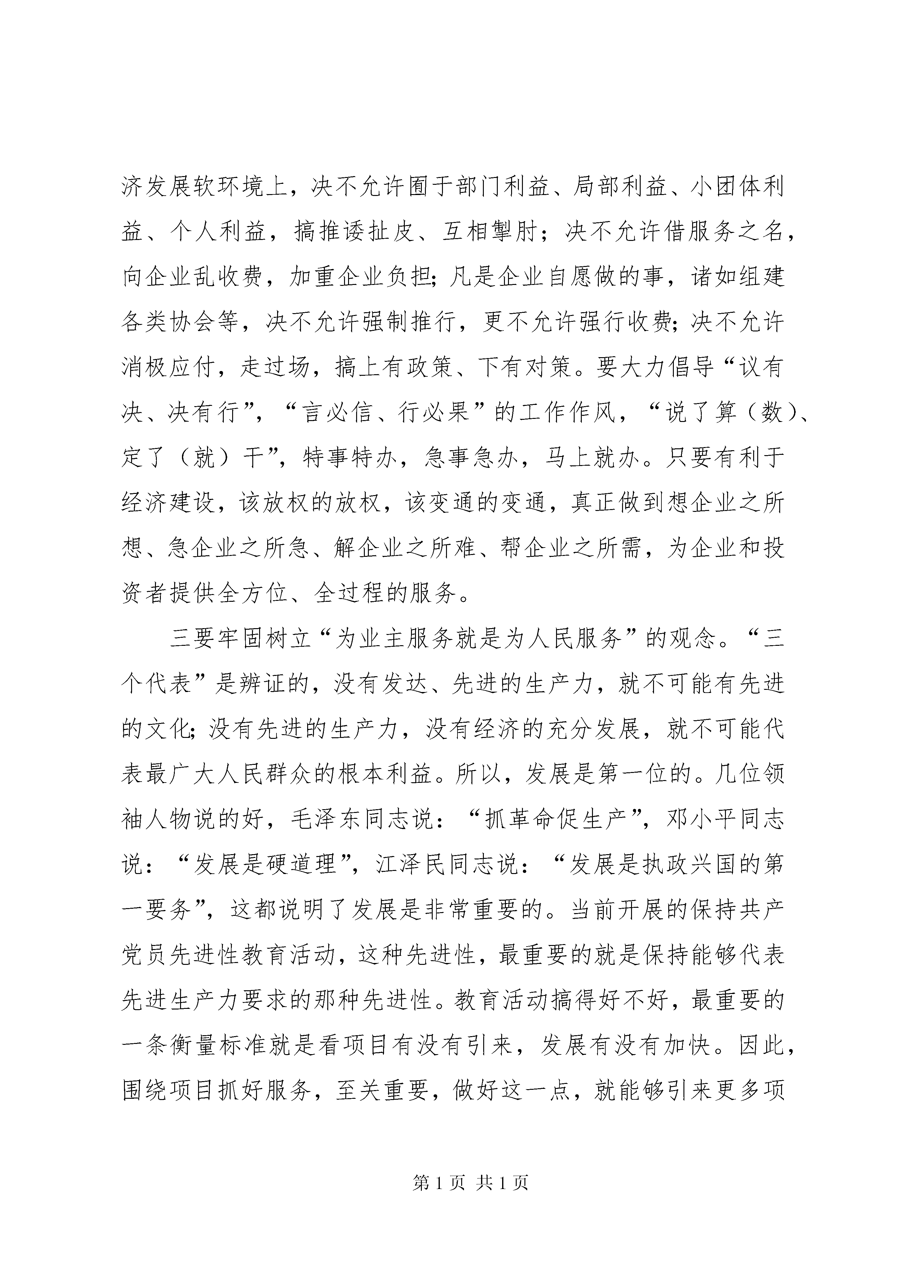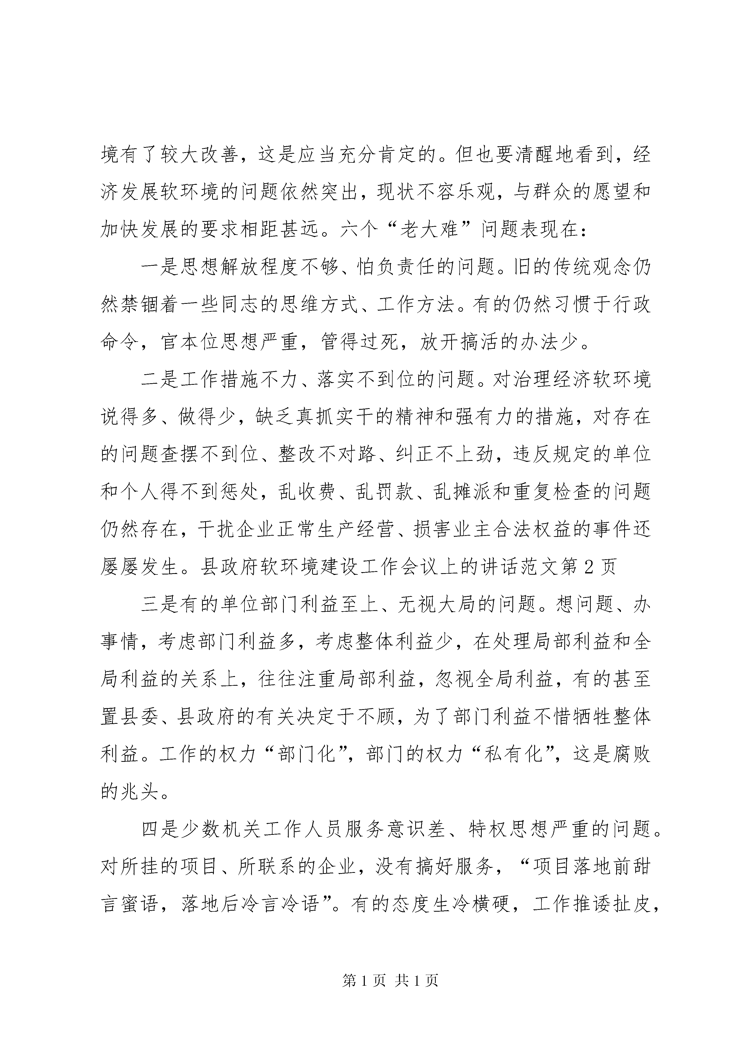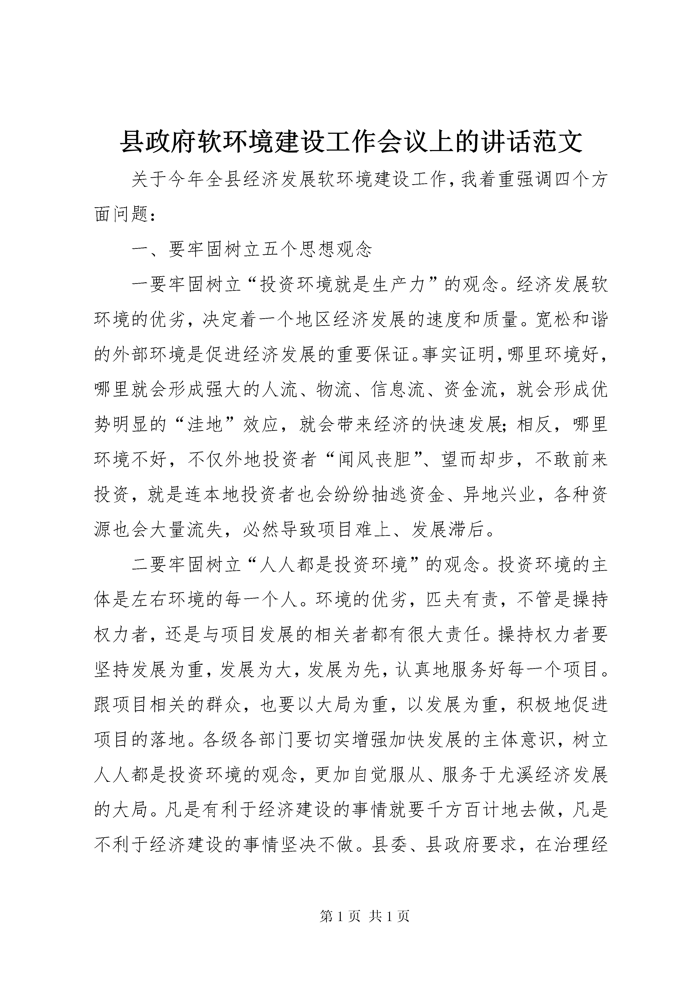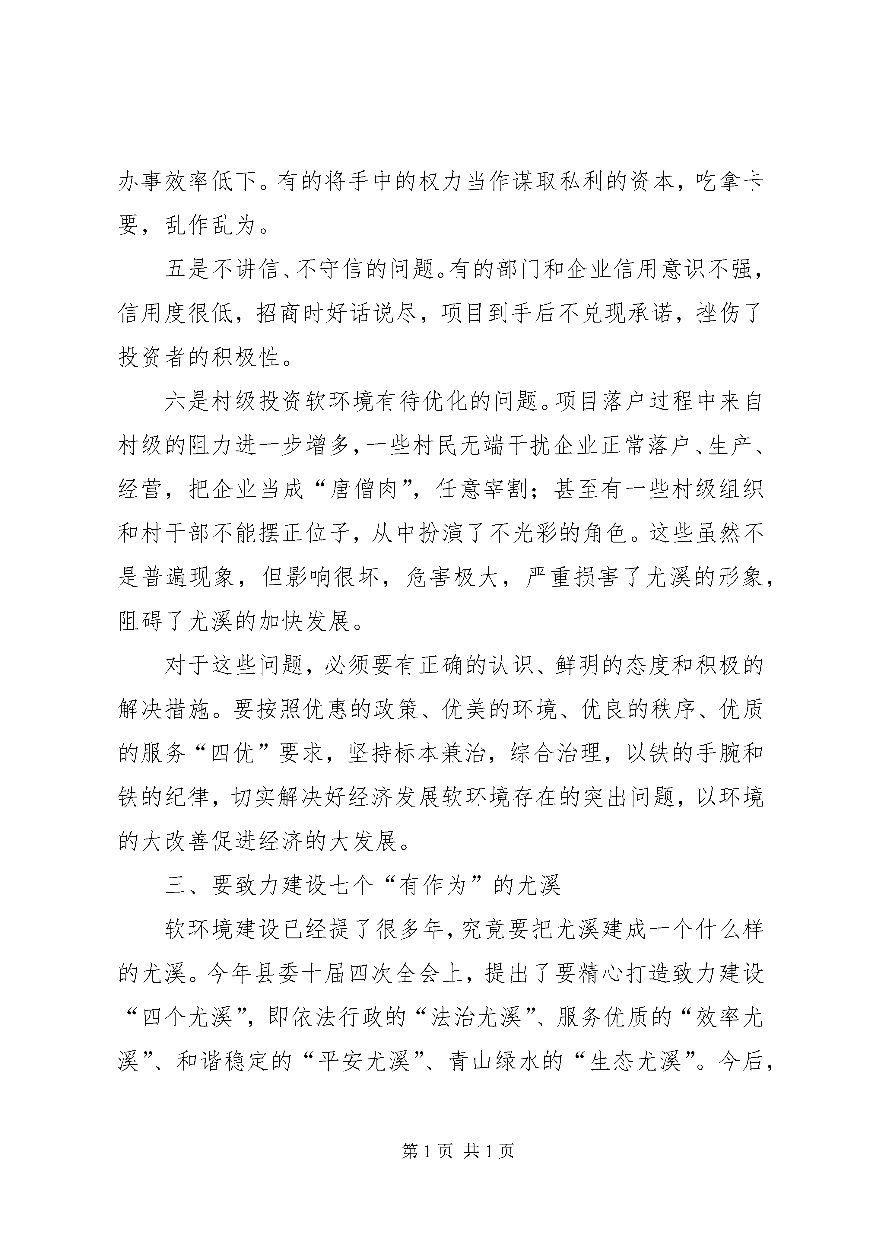 县政府软环境建设工作会议上的讲话范文关于今年全县经济发展软环境建设工作,我着重强调四个方面问题:一、要牢固树立五个思想观念一要牢固树立“投资环境就是生产力”的观念。经济发展软环境的优劣,决定着一个地区经济发展的速度和质量。宽松和谐的外部环境是促进经济发展的重要保证。事实证明,哪里环境好,哪里就会形成强大的人流、物流、信息流、资金流,就会形成优势明显的“洼地”效应,就会带来经济的快速发展;相反,哪里环境不好,不仅外地投资者“闻风丧胆”、望而却步,不敢前来投资,就是连本地投资者也会纷纷抽逃资金、异地兴业,各种资源也会大量流失,必然导致项目难上、发展滞后。二要牢固树立“人人都是投资环境”的观念。投资环境的主体是左右环境的每一个人。环境的优劣,匹夫有责,不管是操持权力者,还是与项目发展的相关者都有很大责任。操持权力者要坚持发展为重,发展为大,发展为先,认真地服务好每一个项目。跟项目相关的群众,也要以大局为重,以发展为重,积极地促进项目的落地。各级各部门要切实增强加快发展的主体意识,树立人人都是投资环境的观念,更加自觉服从、服务于尤溪经济发展的大局。凡是有利于经济建设的事情就要千方百计地去做,凡是不利于经济建设的事情坚决不做。县委、县政府要求,在治理经济发展软环境上,决不允许囿于部门利益、局部利益、小团体利益、个人利益,搞推诿扯皮、互相掣肘;决不允许借服务之名,向企业乱收费,加重企业负担;凡是企业自愿做的事,诸如组建各类协会等,决不允许强制推行,更不允许强行收费;决不允许消极应付,走过场,搞上有政策、下有对策。要大力倡导“议有决、决有行”,“言必信、行必果”的工作作风,“说了算(数)、定了(就)干”,特事特办,急事急办,马上就办。只要有利于经济建设,该放权的放权,该变通的变通,真正做到想企业之所想、急企业之所急、解企业之所难、帮企业之所需,为企业和投资者提供全方位、全过程的服务。三要牢固树立“为业主服务就是为人民服务”的观念。“三个代表”是辨证的,没有发达、先进的生产力,就不可能有先进的文化;没有先进的生产力,没有经济的充分发展,就不可能代表最广大人民群众的根本利益。所以,发展是第一位的。几位领袖人物说的好,毛泽东同志说:“抓革命促生产”,邓小平同志说:“发展是硬道理”,江泽民同志说:“发展是执政兴国的第一要务”,这都说明了发展是非常重要的。当前开展的保持共产党员先进性教育活动,这种先进性,最重要的就是保持能够代表先进生产力要求的那种先进性。教育活动搞得好不好,最重要的一条衡量标准就是看项目有没有引来,发展有没有加快。因此,围绕项目抓好服务,至关重要,做好这一点,就能够引来更多项目,就能够加快尤溪的发展,就能够为代表最广大人民群众的根本利益积蓄一些实力、财力,我们就有更多的能力为群众排忧解难、办实事。四要牢固树立“不抓好软环境就是失职,抓不好软环境就是不称职,破坏软环境就是‘犯罪’”的观念。政风行风测评就是反映出你那个环境好不好、优不优的问题,对测评的结果,各部门领导都要真正予以重视。去年在测评中处在末位的科局、股室,如果还处在末位,属于科局的,局长就不能再当了;属于股室的,股长就要调整,就不能留在这个部门了。工作人员要人家给你留“面子”,首先自己要给业主留足“面子”。不要以为自己做了很多工作就会得到人家的谅解,实际上你还有许多做不够的地方没有引起重视,没有认真抓好整改,人家照样不会谅解你的。处于末位的部门和领导,一定要有一个“争上游”的意识,要有那种扎实整改的作风,找准差距,抓好整改。五要牢固树立“引进来新项目,更要服务好原项目”的观念。今年“三个一”项目要实行“引管一体”的新机制,确保提高项目落地的成功率,不能引一个凉一个。一定要办好现有的企业,项目是哪个人引进的、挂钩的、联系的,你就一定要扶持到底。要知道,办好现有的企业是营造良好投资软环境的需要。二、要到位解决六个“老大难”问题现在,通过全县各级各部门的共同努力,我县经济发展软环境有了较大改善,这是应当充分肯定的。但也要清醒地看到,经济发展软环境的问题依然突出,现状不容乐观,与群众的愿望和加快发展的要求相距甚远。六个“老大难”问题表现在:一是思想解放程度不够、怕负责任的问题。旧的传统观念仍然禁锢着一些同志的思维方式、工作方法。有的仍然习惯于行政命令,官本位思想严重,管得过死,放开搞活的办法少。二是工作措施不力、落实不到位的问题。对治理经济软环境说得多、做得少,缺乏真抓实干的精神和强有力的措施,对存在的问题查摆不到位、整改不对路、纠正不上劲,违反规定的单位和个人得不到惩处,乱收费、乱罚款、乱摊派和重复检查的问题仍然存在,干扰企业正常生产经营、损害业主合法权益的事件还屡屡发生。县政府软环境建设工作会议上的讲话范文三是有的单位部门利益至上、无视大局的问题