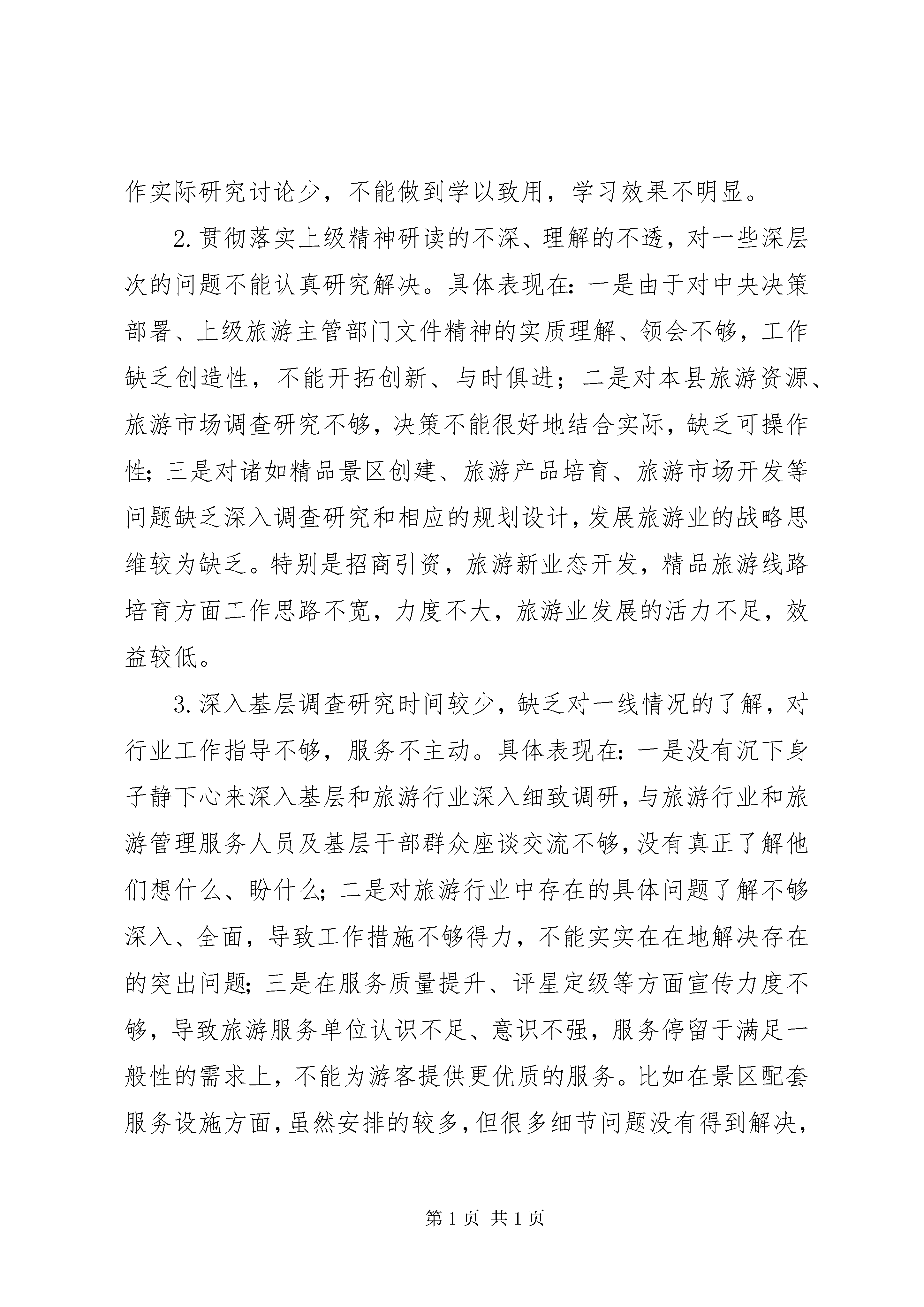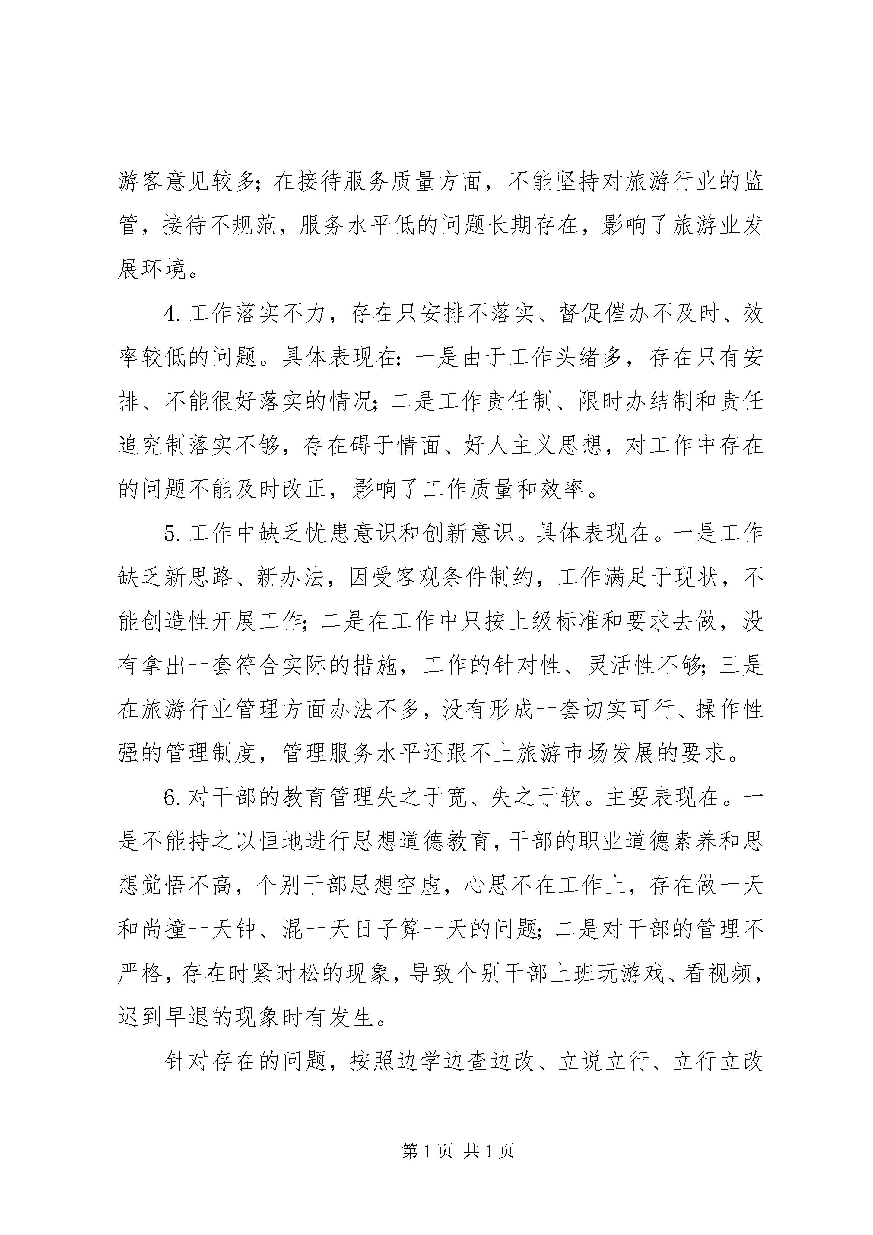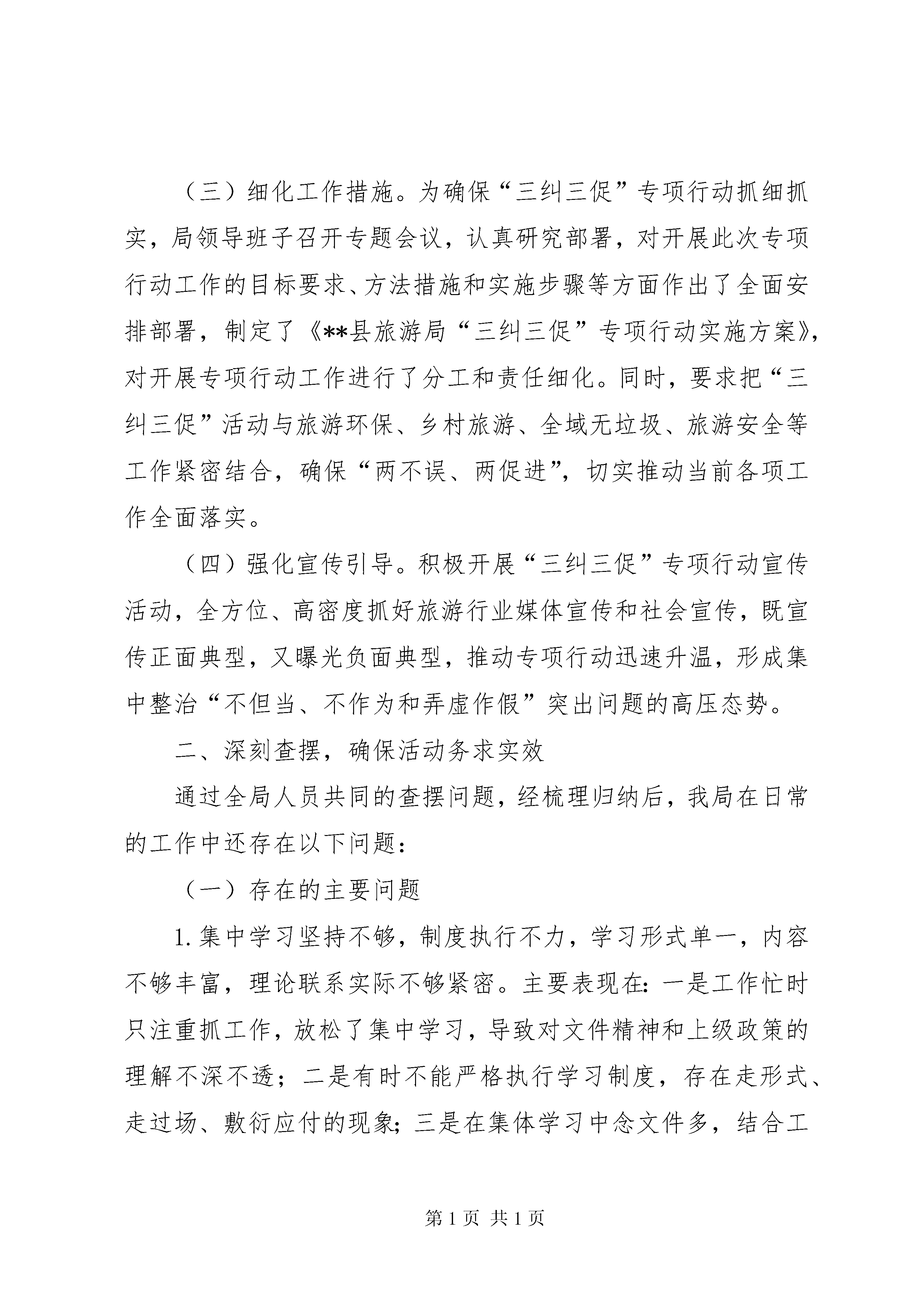县旅游局三纠三促专项行动自查报告自中共**县委办公室《关于印发**县开展“三纠三促”专项行动实施方案的通知》(民办发〔2017〕124号)下发后,我局高度重视,立即召开局务会议专题研究,重点围绕政策执行、责任担当、办事效率和工作作风四个方面,坚持实事求是的原则,采取即查即改、边查边纠、长效监督等方式迅速开展专项行动,确保行动取得实实在在的效果,现自查情况报告如下。一、加强组织领导,切实落实工作责任(一)深入传达学习。自《**县开展“三纠三促”专项行动实施方案》下发后,我局迅速行动,局长宋轩同志及时召集县旅游局、县文旅中心、**景区办、**景区办全体领导干部,召开专题学习会议,逐字逐句带头领学了《实施方案》,对“三纠三促”专项行动的重要性、必要性、工作重点、方法步骤和工作要求进行了全面解读和强调,全局干部职工的“四个意识”得到了进一步增强,政治敏锐性进一步提高。(二)落实工作责任。为了确保专项治理活动扎实有效开展,切实把专项行动的各项要求落到实处,我局成立了由局长任组长,分管领导为副组长的三纠三促专项领导小组,全面领导专项整治工作。成立督导组,专项督查专项整治,局属各单位也组建相应机构,强化组织领导,抓好工作落实,对专项整治工作重视不够、推进不力的,将进行严肃问责。(三)细化工作措施。为确保“三纠三促”专项行动抓细抓实,局领导班子召开专题会议,认真研究部署,对开展此次专项行动工作的目标要求、方法措施和实施步骤等方面作出了全面安排部署,制定了《**县旅游局“三纠三促”专项行动实施方案》,对开展专项行动工作进行了分工和责任细化。同时,要求把“三纠三促”活动与旅游环保、乡村旅游、全域无垃圾、旅游安全等工作紧密结合,确保“两不误、两促进”,切实推动当前各项工作全面落实。(四)强化宣传引导。积极开展“三纠三促”专项行动宣传活动,全方位、高密度抓好旅游行业媒体宣传和社会宣传,既宣传正面典型,又曝光负面典型,推动专项行动迅速升温,形成集中整治“不但当、不作为和弄虚作假”突出问题的高压态势。二、深刻查摆,确保活动务求实效通过全局人员共同的查摆问题,经梳理归纳后,我局在日常的工作中还存在以下问题:(一)存在的主要问题1.集中学习坚持不够,制度执行不力,学习形式单一,内容不够丰富,理论联系实际不够紧密。主要表现在:一是工作忙时只注重抓工作,放松了集中学习,导致对文件精神和上级政策的理解不深不透;二是有时不能严格执行学习制度,存在走形式、走过场、敷衍应付的现象;三是在集体学习中念文件多,结合工作实际研究讨论少,不能做到学以致用,学习效果不明显。2.贯彻落实上级精神研读的不深、理解的不透,对一些深层次的问题不能认真研究解决。具体表现在:一是由于对中央决策部署、上级旅游主管部门文件精神的实质理解、领会不够,工作缺乏创造性,不能开拓创新、与时俱进;二是对本县旅游资源、旅游市场调查研究不够,决策不能很好地结合实际,缺乏可操作性;三是对诸如精品景区创建、旅游产品培育、旅游市场开发等问题缺乏深入调查研究和相应的规划设计,发展旅游业的战略思维较为缺乏。特别是招商引资,旅游新业态开发,精品旅游线路培育方面工作思路不宽,力度不大,旅游业发展的活力不足,效益较低。3.深入基层调查研究时间较少,缺乏对一线情况的了解,对行业工作指导不够,服务不主动。具体表现在:一是没有沉下身子静下心来深入基层和旅游行业深入细致调研,与旅游行业和旅游管理服务人员及基层干部群众座谈交流不够,没有真正了解他们想什么、盼什么;二是对旅游行业中存在的具体问题了解不够深入、全面,导致工作措施不够得力,不能实实在在地解决存在的突出问题;三是在服务质量提升、评星定级等方面宣传力度不够,导致旅游服务单位认识不足、意识不强,服务停留于满足一般性的需求上,不能为游客提供更优质的服务。比如在景区配套服务设施方面,虽然安排的较多,但很多细节问题没有得到解决,游客意见较多;在接待服务质量方面,不能坚持对旅游行业的监管,接待不规范,服务水平低的问题长期存在,影响了旅游业发展环境。4.工作落实不力,存在只安排不落实、督促催办不及时、效率较低的问题。具体表现在:一是由于工作头绪多,存在只有安排、不能很好落实的情况;二是工作责任制、限时办结制和责任追究制落实不够,存在碍于情面、好人主义思想,对工作中存在的问题不能及时改正,影响了工作质量和效率。5.工作中缺乏忧患意识和创新意识。具体表现在。一是工作缺乏新思路、新办法,因受客观条件制约,工作满足于现状,不能创造性开展工作;二是在工作中只按上级标准和要求去做,没有拿出一套符合实际的措施,工作的针对性、灵活性不够;三是在旅游行业管理方面办法不多,没有形成一套切实可行、操作性强的管理制度,管理服务水平还跟不上旅游市场发展的要求。6.对干部的教育管理失之于宽、