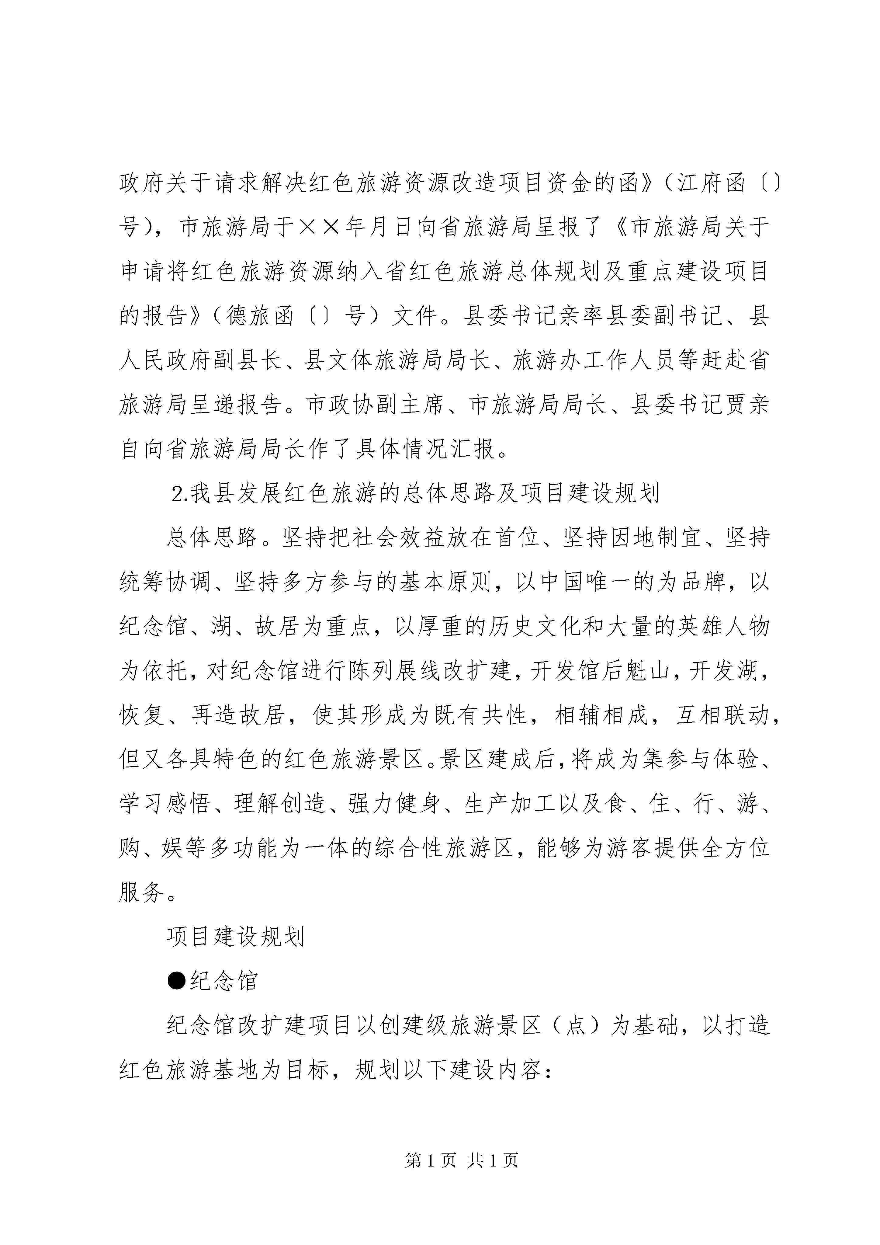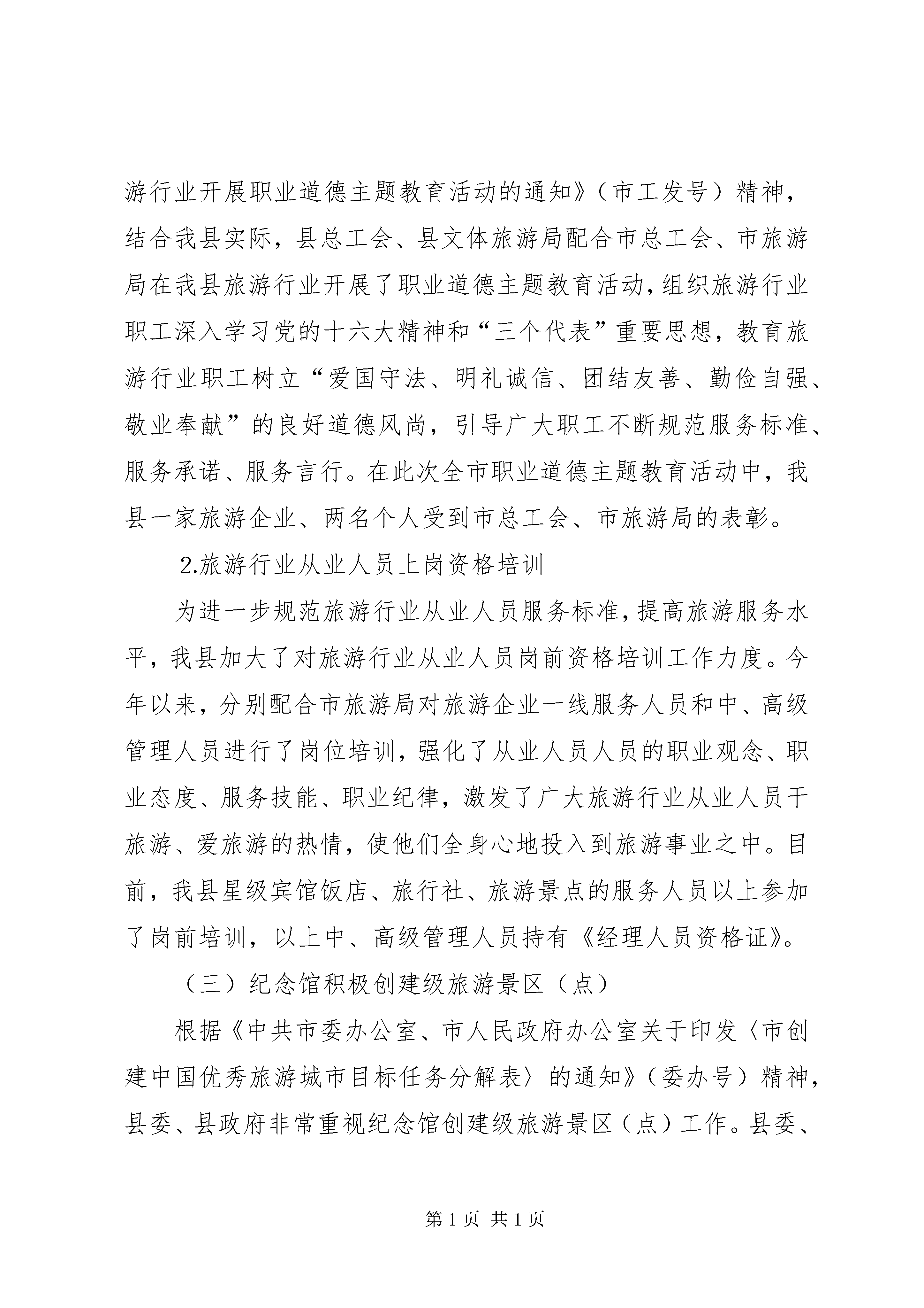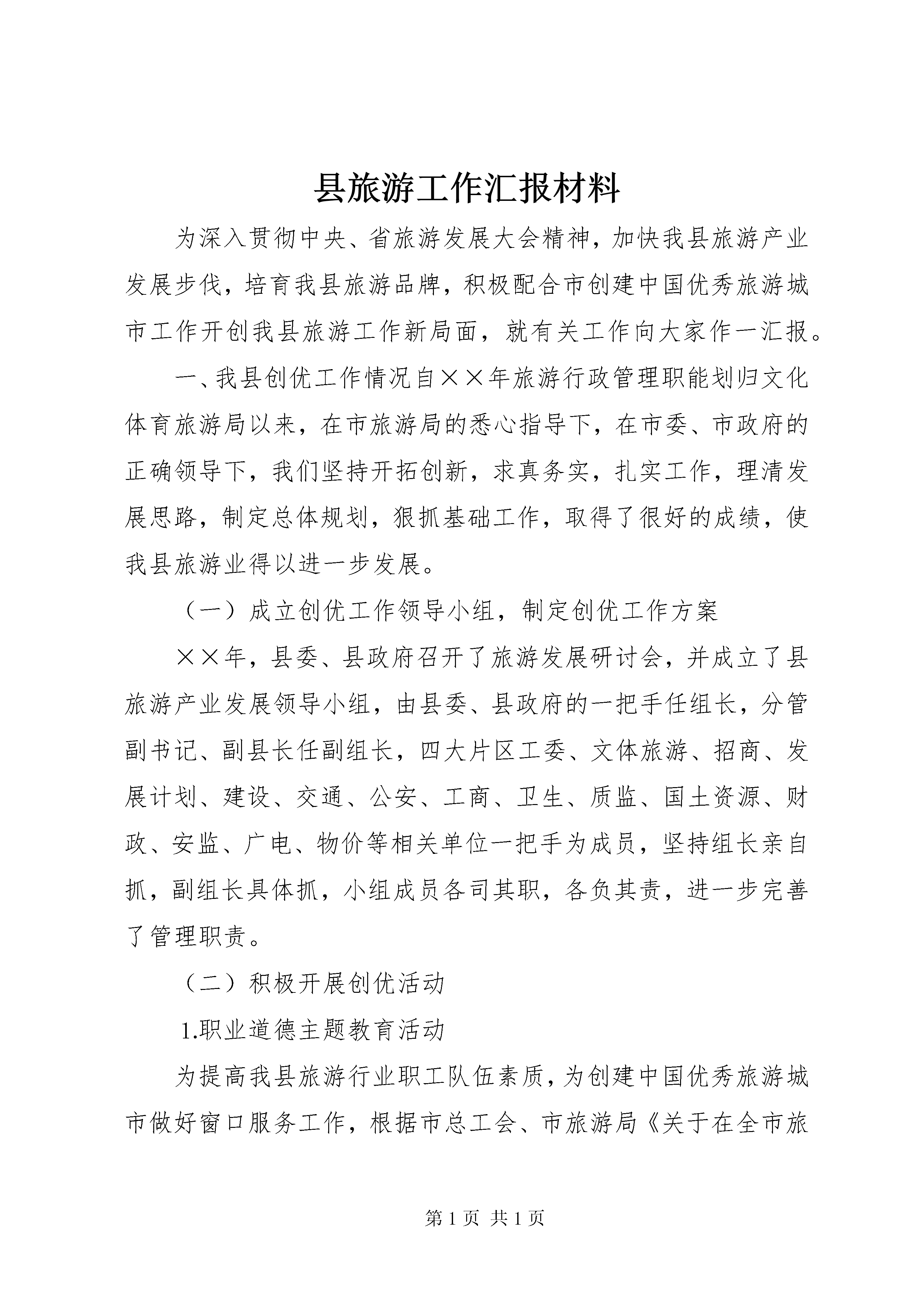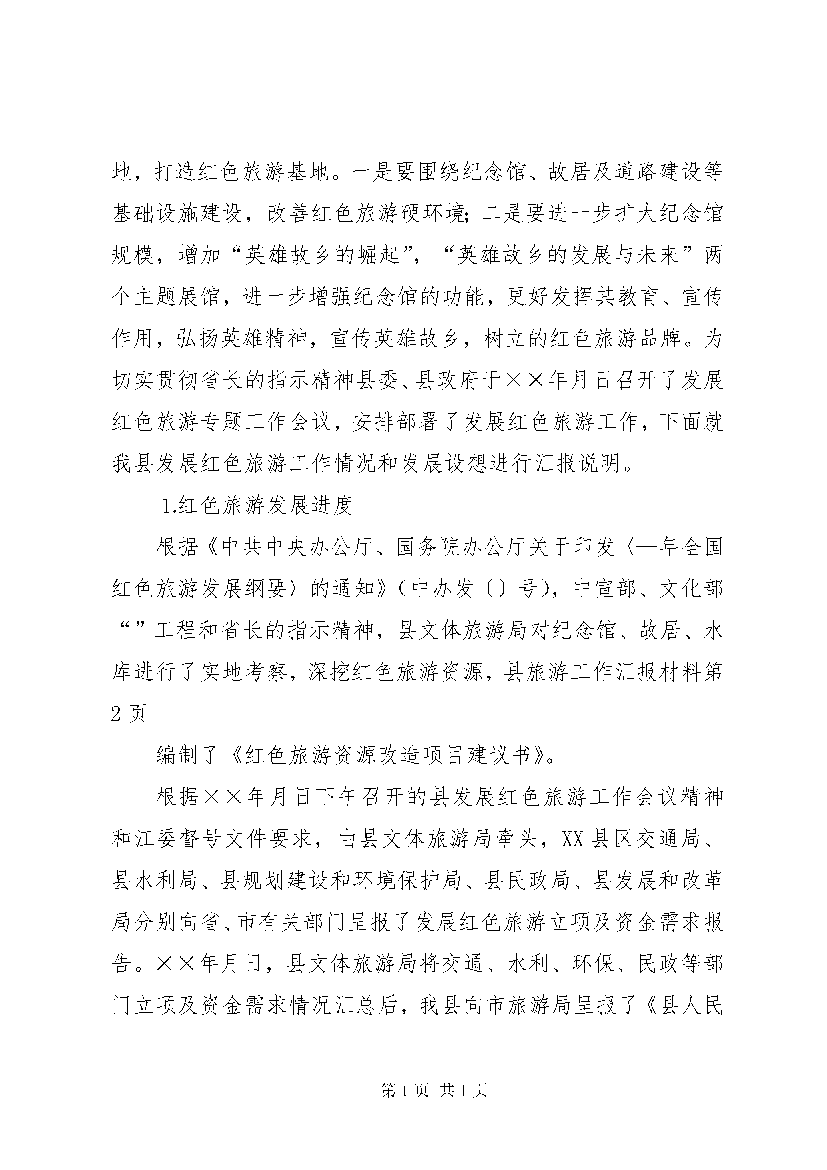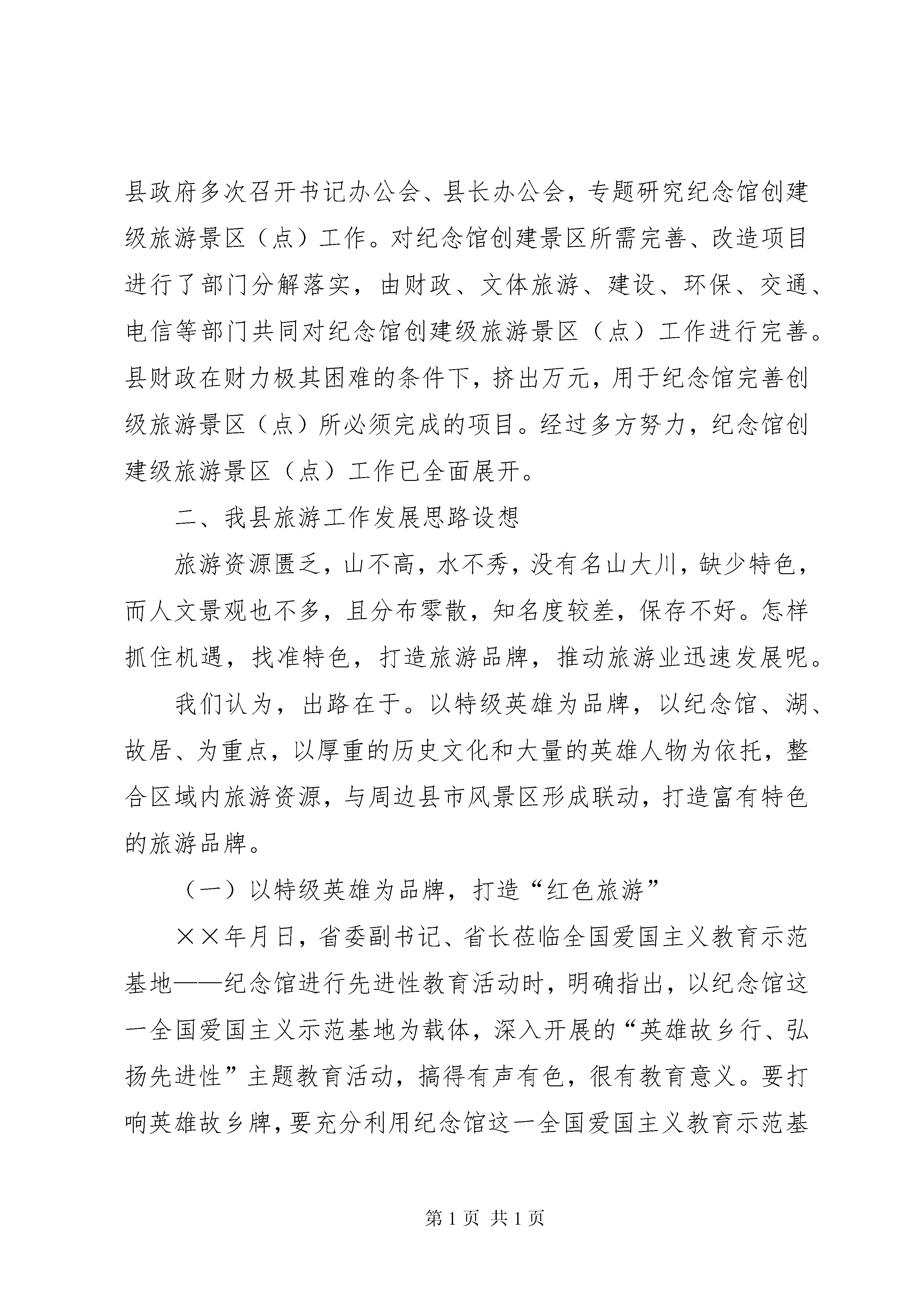 县旅游工作汇报材料为深入贯彻中央、省旅游发展大会精神,加快我县旅游产业发展步伐,培育我县旅游品牌,积极配合市创建中国优秀旅游城市工作开创我县旅游工作新局面,就有关工作向大家作一汇报。一、我县创优工作情况自××年旅游行政管理职能划归文化体育旅游局以来,在市旅游局的悉心指导下,在市委、市政府的正确领导下,我们坚持开拓创新,求真务实,扎实工作,理清发展思路,制定总体规划,狠抓基础工作,取得了很好的成绩,使我县旅游业得以进一步发展。(一)成立创优工作领导小组,制定创优工作方案××年,县委、县政府召开了旅游发展研讨会,并成立了县旅游产业发展领导小组,由县委、县政府的一把手任组长,分管副书记、副县长任副组长,四大片区工委、文体旅游、招商、发展计划、建设、交通、公安、工商、卫生、质监、国土资源、财政、安监、广电、物价等相关单位一把手为成员,坚持组长亲自抓,副组长具体抓,小组成员各司其职,各负其责,进一步完善了管理职责。(二)积极开展创优活动⒈职业道德主题教育活动为提高我县旅游行业职工队伍素质,为创建中国优秀旅游城市做好窗口服务工作,根据市总工会、市旅游局《关于在全市旅游行业开展职业道德主题教育活动的通知》(市工发号)精神,结合我县实际,县总工会、县文体旅游局配合市总工会、市旅游局在我县旅游行业开展了职业道德主题教育活动,组织旅游行业职工深入学习党的十六大精神和“三个代表”重要思想,教育旅游行业职工树立“爱国守法、明礼诚信、团结友善、勤俭自强、敬业奉献”的良好道德风尚,引导广大职工不断规范服务标准、服务承诺、服务言行。在此次全市职业道德主题教育活动中,我县一家旅游企业、两名个人受到市总工会、市旅游局的表彰。⒉旅游行业从业人员上岗资格培训为进一步规范旅游行业从业人员服务标准,提高旅游服务水平,我县加大了对旅游行业从业人员岗前资格培训工作力度。今年以来,分别配合市旅游局对旅游企业一线服务人员和中、高级管理人员进行了岗位培训,强化了从业人员人员的职业观念、职业态度、服务技能、职业纪律,激发了广大旅游行业从业人员干旅游、爱旅游的热情,使他们全身心地投入到旅游事业之中。目前,我县星级宾馆饭店、旅行社、旅游景点的服务人员以上参加了岗前培训,以上中、高级管理人员持有《经理人员资格证》。(三)纪念馆积极创建级旅游景区(点)根据《中共市委办公室、市人民政府办公室关于印发〈市创建中国优秀旅游城市目标任务分解表〉的通知》(委办号)精神,县委、县政府非常重视纪念馆创建级旅游景区(点)工作。县委、县政府多次召开书记办公会、县长办公会,专题研究纪念馆创建级旅游景区(点)工作。对纪念馆创建景区所需完善、改造项目进行了部门分解落实,由财政、文体旅游、建设、环保、交通、电信等部门共同对纪念馆创建级旅游景区(点)工作进行完善。县财政在财力极其困难的条件下,挤出万元,用于纪念馆完善创级旅游景区(点)所必须完成的项目。经过多方努力,纪念馆创建级旅游景区(点)工作已全面展开。二、我县旅游工作发展思路设想旅游资源匮乏,山不高,水不秀,没有名山大川,缺少特色,而人文景观也不多,且分布零散,知名度较差,保存不好。怎样抓住机遇,找准特色,打造旅游品牌,推动旅游业迅速发展呢。我们认为,出路在于。以特级英雄为品牌,以纪念馆、湖、故居、为重点,以厚重的历史文化和大量的英雄人物为依托,整合区域内旅游资源,与周边县市风景区形成联动,打造富有特色的旅游品牌。(一)以特级英雄为品牌,打造“红色旅游”××年月日,省委副书记、省长莅临全国爱国主义教育示范基地——纪念馆进行先进性教育活动时,明确指出,以纪念馆这一全国爱国主义示范基地为载体,深入开展的“英雄故乡行、弘扬先进性”主题教育活动,搞得有声有色,很有教育意义。要打响英雄故乡牌,要充分利用纪念馆这一全国爱国主义教育示范基地,打造红色旅游基地。一是要围绕纪念馆、故居及道路建设等基础设施建设,改善红色旅游硬环境;二是要进一步扩大纪念馆规模,增加“英雄故乡的崛起”,“英雄故乡的发展与未来”两个主题展馆,进一步增强纪念馆的功能,更好发挥其教育、宣传作用,弘扬英雄精神,宣传英雄故乡,树立的红色旅游品牌。为切实贯彻省长的指示精神县委、县政府于××年月日召开了发展红色旅游专题工作会议,安排部署了发展红色旅游工作,下面就我县发展红色旅游工作情况和发展设想进行汇报说明。⒈红色旅游发展进度根据《中共中央办公厅、国务院办公厅关于印发〈—年全国红色旅游发展纲要〉的通知》(中办发〔〕号),中宣部、文化部“”工程和省长的指示精神,县文体旅游局对纪念馆、故居、水库进行了实地考察,深挖红色旅游资源,县旅游工作汇报材料编制了《红色旅游资源改造项目建议书》。根据××年月日下午召开的县发展红色旅游工作会议精神和江委督号文件要求,由县文体旅游局牵头,XX县区交通局