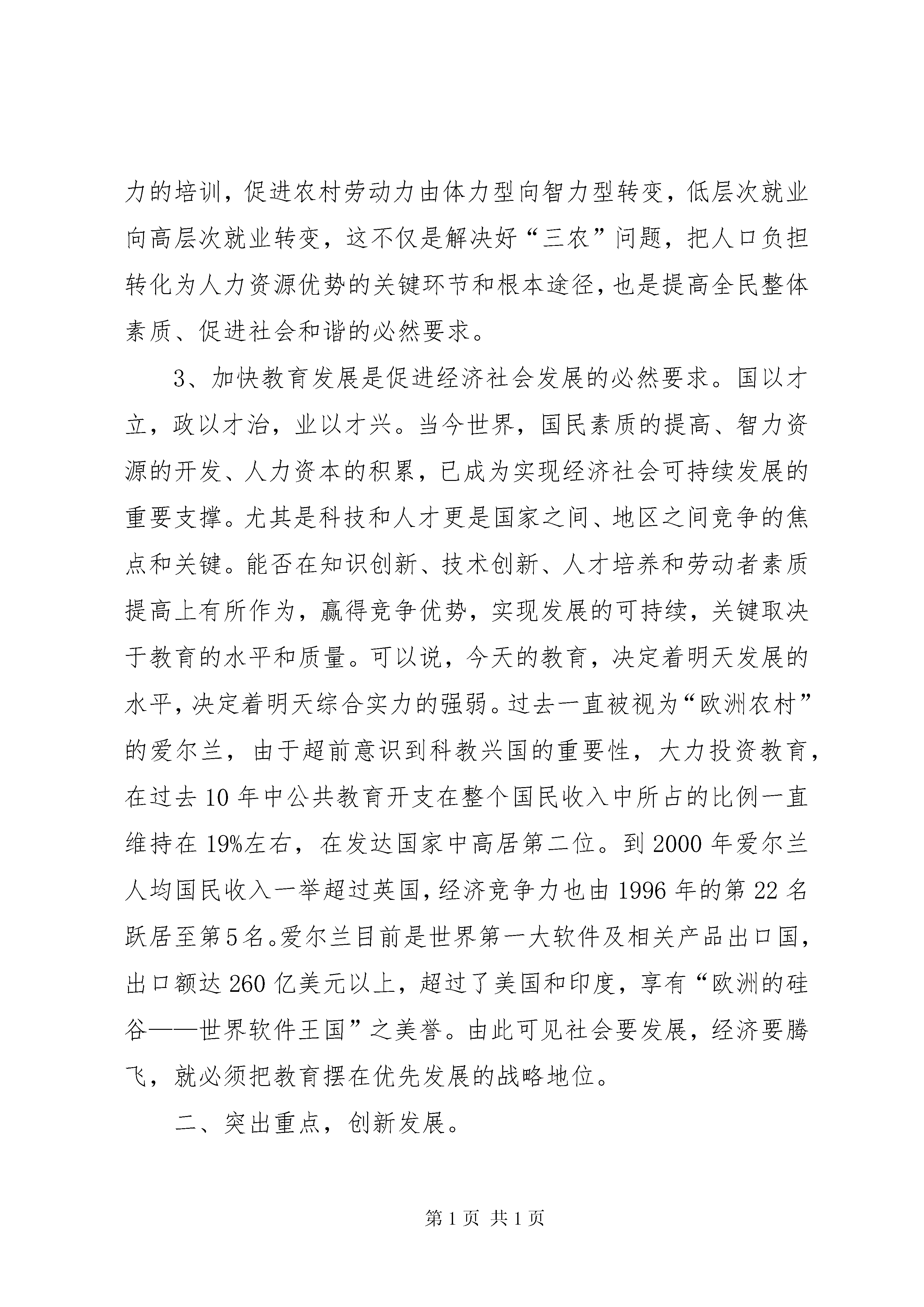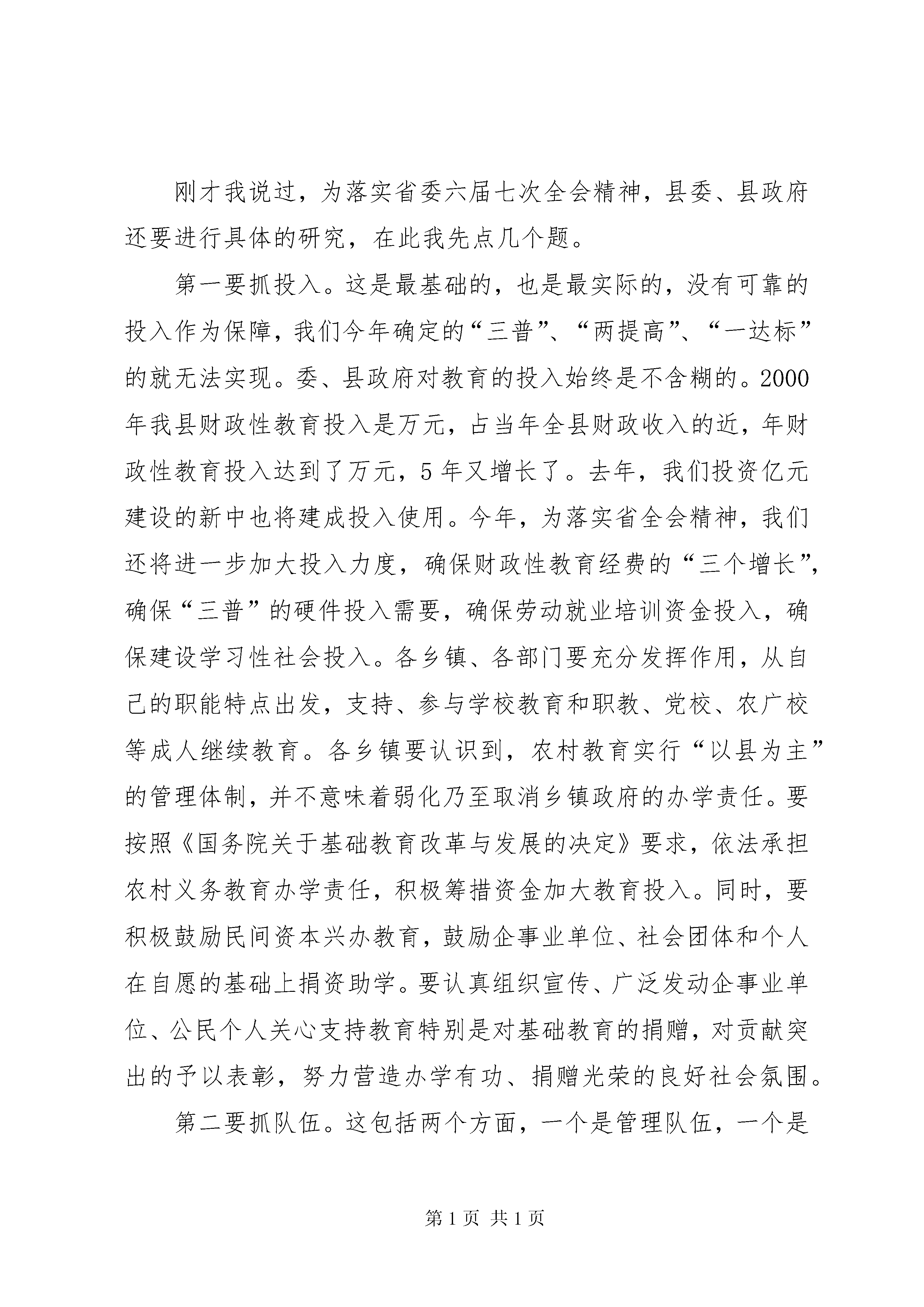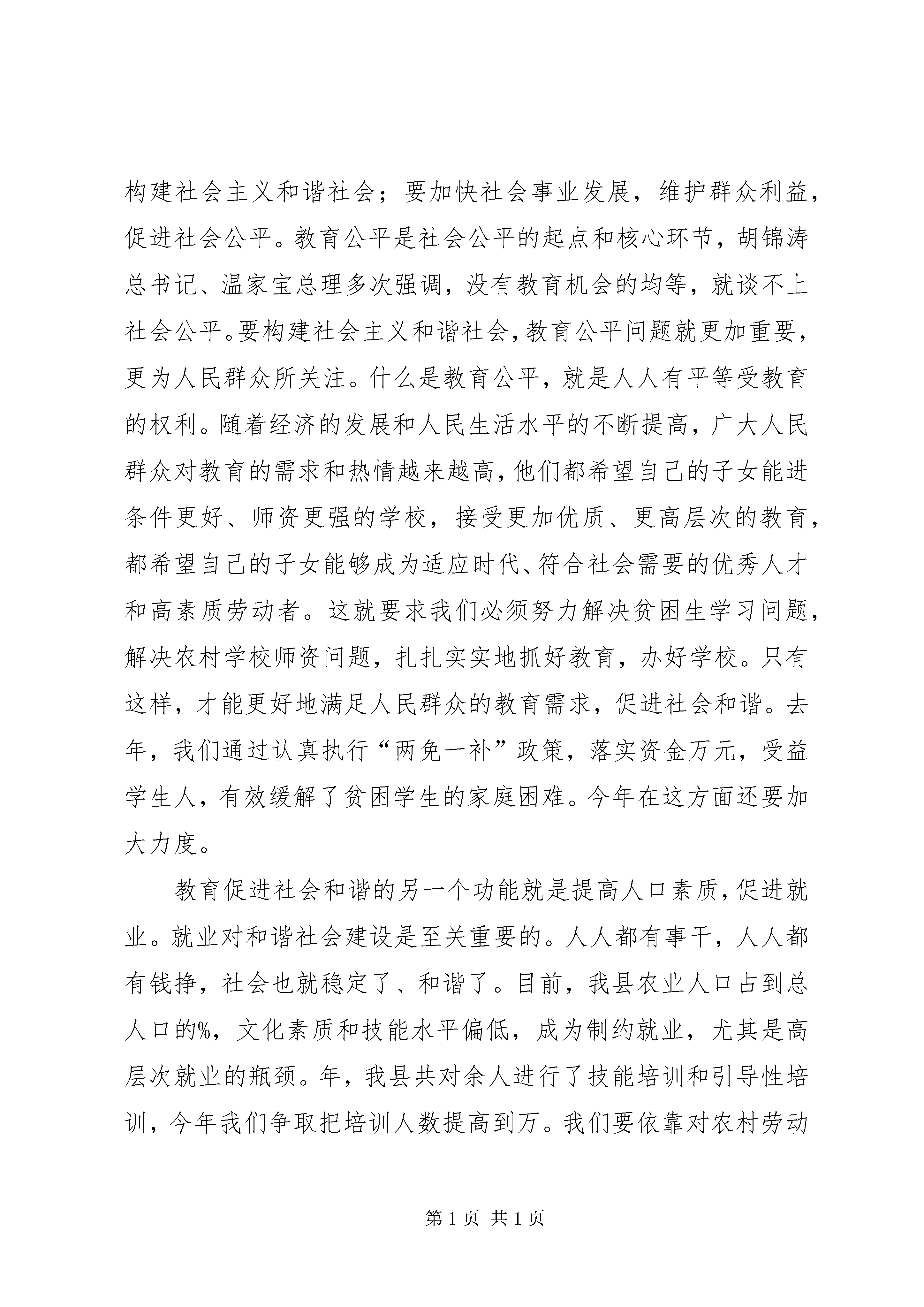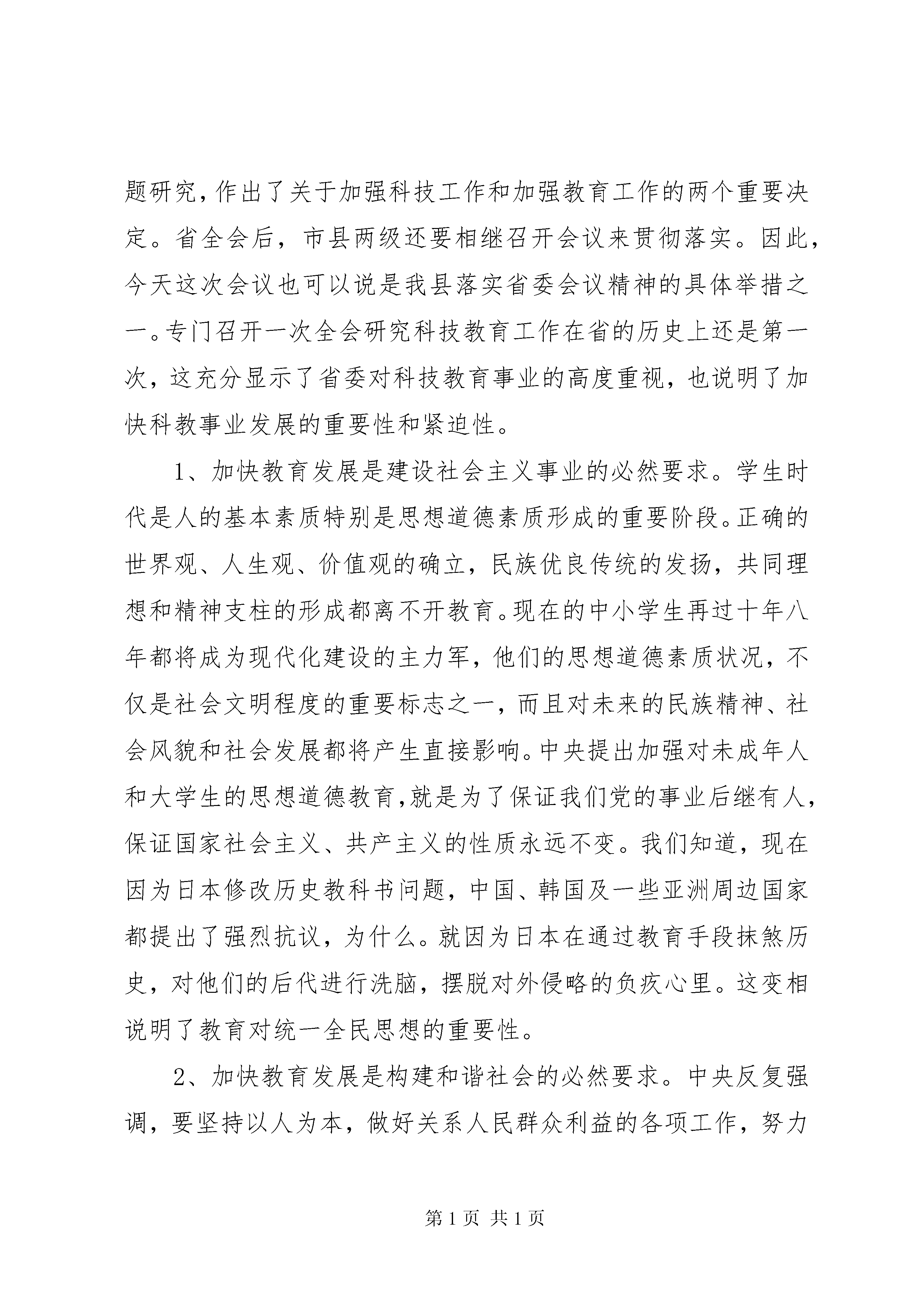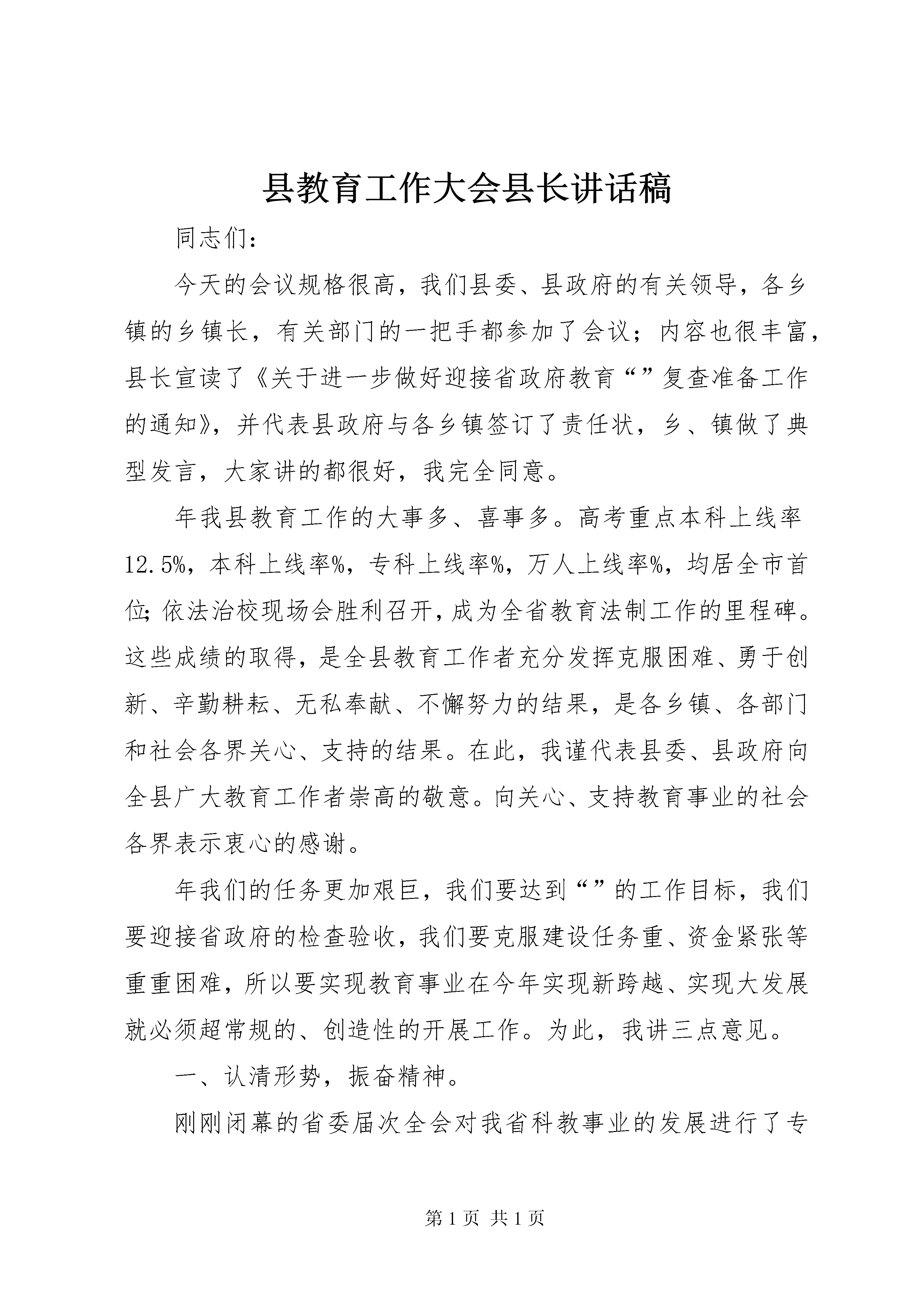 县教育工作大会县长讲话稿同志们:今天的会议规格很高,我们县委、县政府的有关领导,各乡镇的乡镇长,有关部门的一把手都参加了会议;内容也很丰富,县长宣读了《关于进一步做好迎接省政府教育“”复查准备工作的通知》,并代表县政府与各乡镇签订了责任状,乡、镇做了典型发言,大家讲的都很好,我完全同意。年我县教育工作的大事多、喜事多。高考重点本科上线率12.5%,本科上线率%,专科上线率%,万人上线率%,均居全市首位;依法治校现场会胜利召开,成为全省教育法制工作的里程碑。这些成绩的取得,是全县教育工作者充分发挥克服困难、勇于创新、辛勤耕耘、无私奉献、不懈努力的结果,是各乡镇、各部门和社会各界关心、支持的结果。在此,我谨代表县委、县政府向全县广大教育工作者崇高的敬意。向关心、支持教育事业的社会各界表示衷心的感谢。年我们的任务更加艰巨,我们要达到“”的工作目标,我们要迎接省政府的检查验收,我们要克服建设任务重、资金紧张等重重困难,所以要实现教育事业在今年实现新跨越、实现大发展就必须超常规的、创造性的开展工作。为此,我讲三点意见。一、认清形势,振奋精神。刚刚闭幕的省委届次全会对我省科教事业的发展进行了专题研究,作出了关于加强科技工作和加强教育工作的两个重要决定。省全会后,市县两级还要相继召开会议来贯彻落实。因此,今天这次会议也可以说是我县落实省委会议精神的具体举措之一。专门召开一次全会研究科技教育工作在省的历史上还是第一次,这充分显示了省委对科技教育事业的高度重视,也说明了加快科教事业发展的重要性和紧迫性。1、加快教育发展是建设社会主义事业的必然要求。学生时代是人的基本素质特别是思想道德素质形成的重要阶段。正确的世界观、人生观、价值观的确立,民族优良传统的发扬,共同理想和精神支柱的形成都离不开教育。现在的中小学生再过十年八年都将成为现代化建设的主力军,他们的思想道德素质状况,不仅是社会文明程度的重要标志之一,而且对未来的民族精神、社会风貌和社会发展都将产生直接影响。中央提出加强对未成年人和大学生的思想道德教育,就是为了保证我们党的事业后继有人,保证国家社会主义、共产主义的性质永远不变。我们知道,现在因为日本修改历史教科书问题,中国、韩国及一些亚洲周边国家都提出了强烈抗议,为什么。就因为日本在通过教育手段抹煞历史,对他们的后代进行洗脑,摆脱对外侵略的负疚心里。这变相说明了教育对统一全民思想的重要性。2、加快教育发展是构建和谐社会的必然要求。中央反复强调,要坚持以人为本,做好关系人民群众利益的各项工作,努力构建社会主义和谐社会;要加快社会事业发展,维护群众利益,促进社会公平。教育公平是社会公平的起点和核心环节,胡锦涛总书记、温家宝总理多次强调,没有教育机会的均等,就谈不上社会公平。要构建社会主义和谐社会,教育公平问题就更加重要,更为人民群众所关注。什么是教育公平,就是人人有平等受教育的权利。随着经济的发展和人民生活水平的不断提高,广大人民群众对教育的需求和热情越来越高,他们都希望自己的子女能进条件更好、师资更强的学校,接受更加优质、更高层次的教育,都希望自己的子女能够成为适应时代、符合社会需要的优秀人才和高素质劳动者。这就要求我们必须努力解决贫困生学习问题,解决农村学校师资问题,扎扎实实地抓好教育,办好学校。只有这样,才能更好地满足人民群众的教育需求,促进社会和谐。去年,我们通过认真执行“两免一补”政策,落实资金万元,受益学生人,有效缓解了贫困学生的家庭困难。今年在这方面还要加大力度。教育促进社会和谐的另一个功能就是提高人口素质,促进就业。就业对和谐社会建设是至关重要的。人人都有事干,人人都有钱挣,社会也就稳定了、和谐了。目前,我县农业人口占到总人口的%,文化素质和技能水平偏低,成为制约就业,尤其是高层次就业的瓶颈。年,我县共对余人进行了技能培训和引导性培训,今年我们争取把培训人数提高到万。我们要依靠对农村劳动力的培训,促进农村劳动力由体力型向智力型转变,低层次就业向高层次就业转变,这不仅是解决好“三农”问题,把人口负担转化为人力资源优势的关键环节和根本途径,也是提高全民整体素质、促进社会和谐的必然要求。3、加快教育发展是促进经济社会发展的必然要求。国以才立,政以才治,业以才兴。当今世界,国民素质的提高、智力资源的开发、人力资本的积累,已成为实现经济社会可持续发展的重要支撑。尤其是科技和人才更是国家之间、地区之间竞争的焦点和关键。能否在知识创新、技术创新、人才培养和劳动者素质提高上有所作为,赢得竞争优势,实现发展的可持续,关键取决于教育的水平和质量。可以说,今天的教育,决定着明天发展的水平,决定着明天综合实力的强弱。过去一直被视为“欧洲农村”的爱尔兰,由于超前意识到科教兴国的重要性,大力投资教育,在过去10年中公共教育开支在整