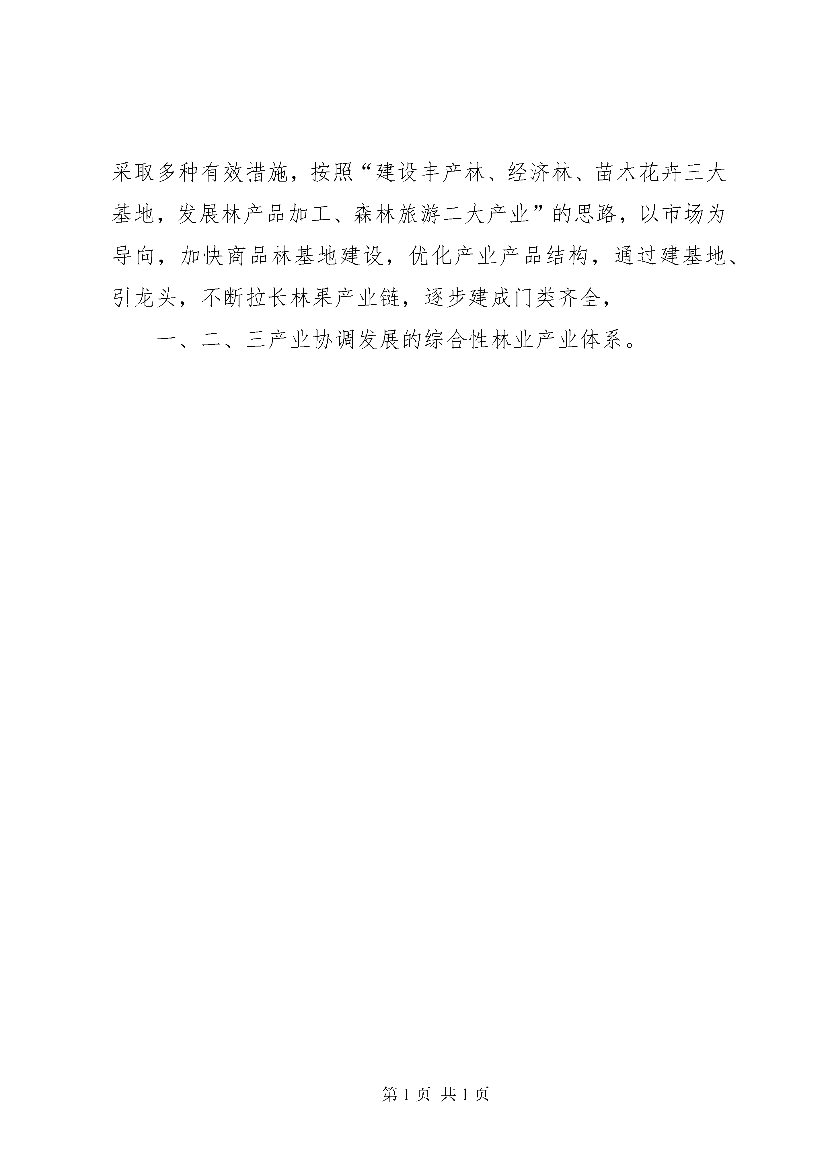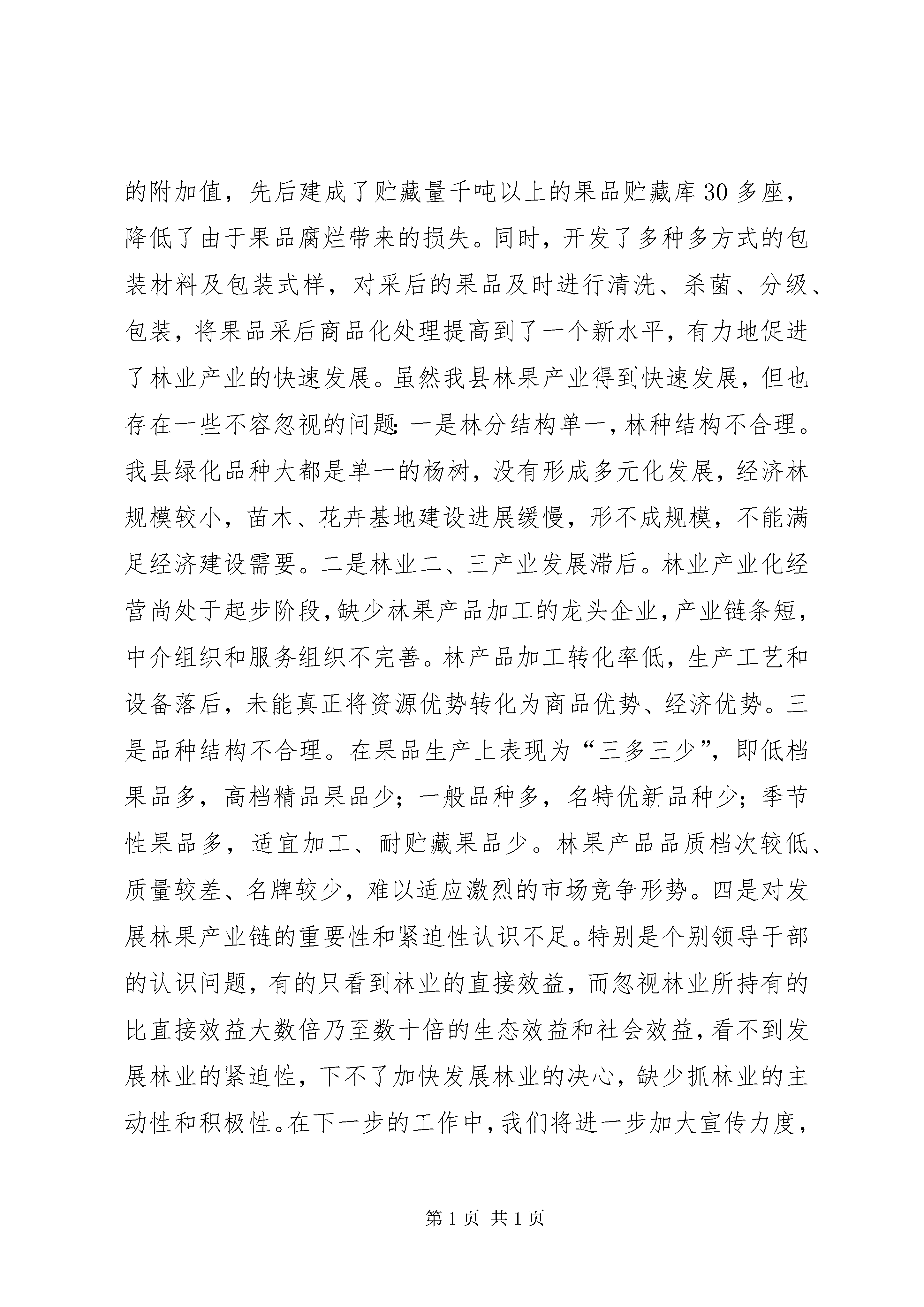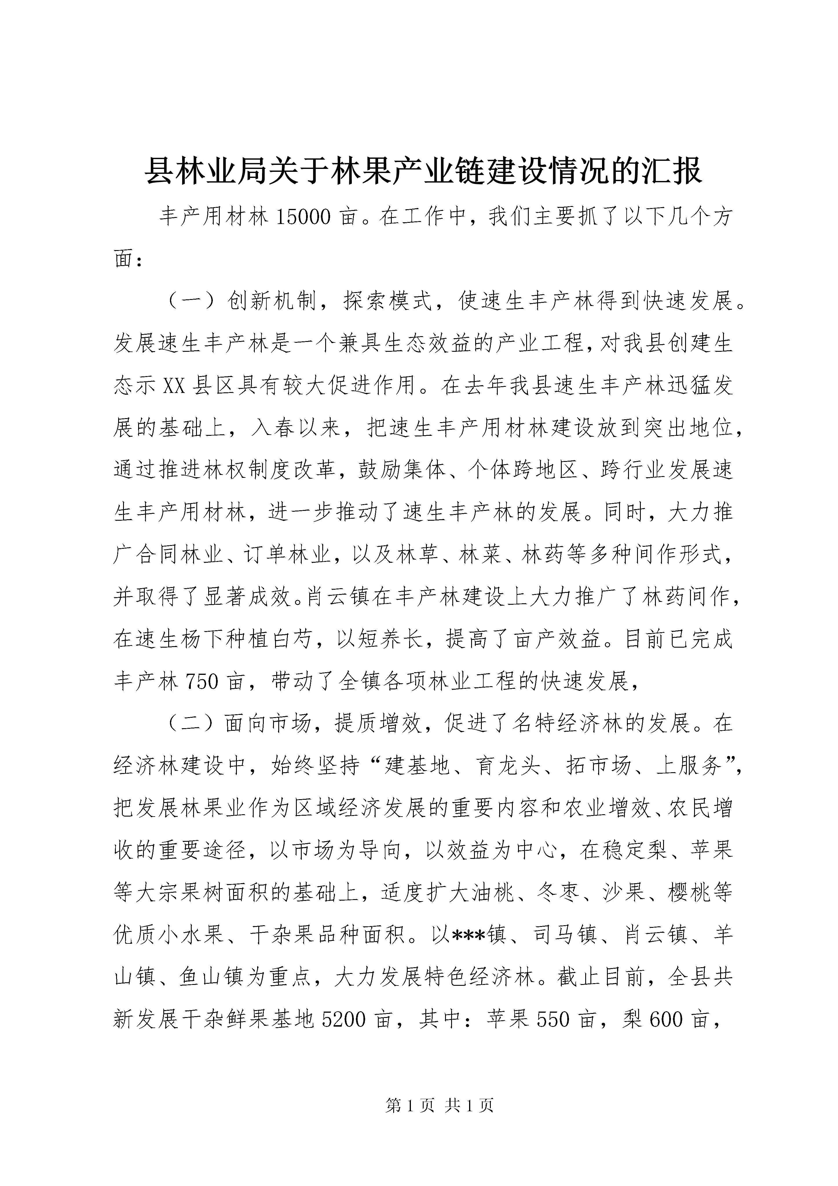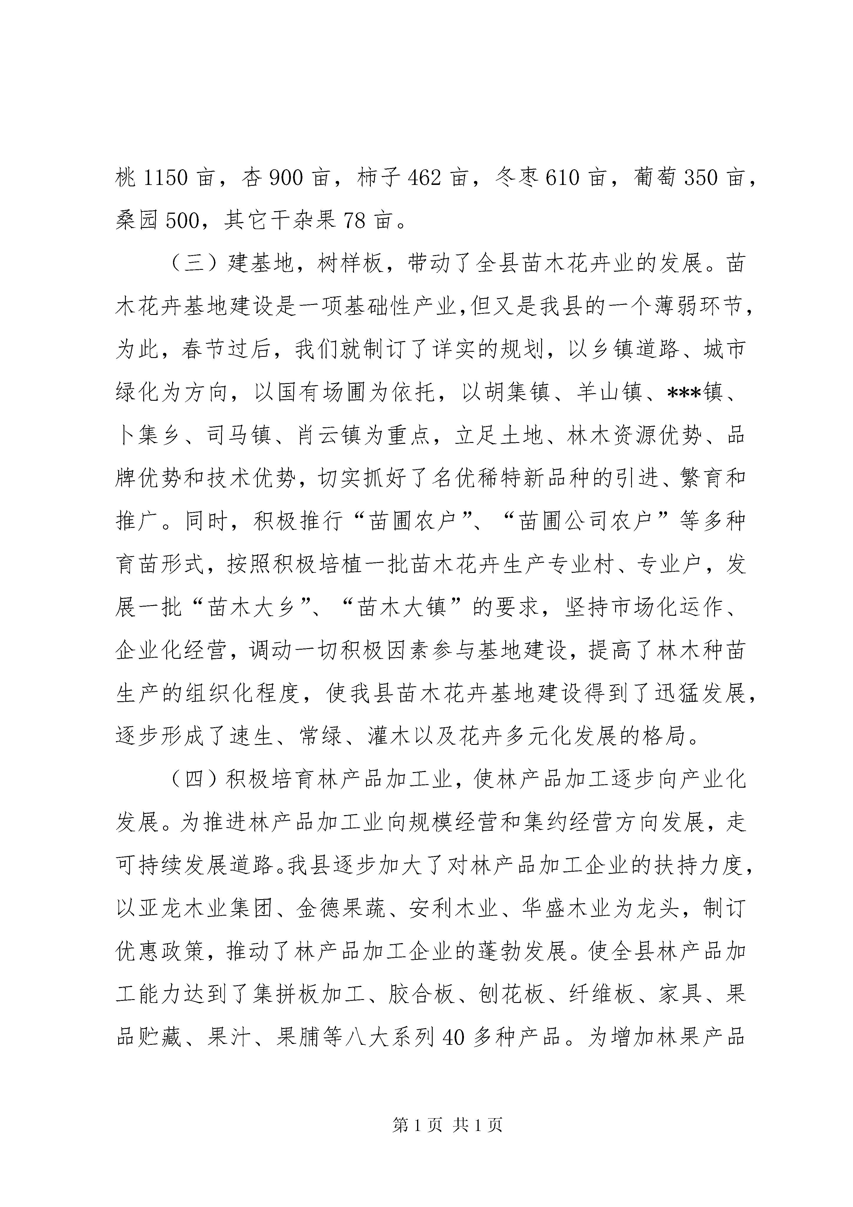 县林业局关于林果产业链建设情况的汇报丰产用材林15000亩。在工作中,我们主要抓了以下几个方面:(一)创新机制,探索模式,使速生丰产林得到快速发展。发展速生丰产林是一个兼具生态效益的产业工程,对我县创建生态示XX县区具有较大促进作用。在去年我县速生丰产林迅猛发展的基础上,入春以来,把速生丰产用材林建设放到突出地位,通过推进林权制度改革,鼓励集体、个体跨地区、跨行业发展速生丰产用材林,进一步推动了速生丰产林的发展。同时,大力推广合同林业、订单林业,以及林草、林菜、林药等多种间作形式,并取得了显著成效。肖云镇在丰产林建设上大力推广了林药间作,在速生杨下种植白芍,以短养长,提高了亩产效益。目前已完成丰产林750亩,带动了全镇各项林业工程的快速发展,(二)面向市场,提质增效,促进了名特经济林的发展。在经济林建设中,始终坚持“建基地、育龙头、拓市场、上服务”,把发展林果业作为区域经济发展的重要内容和农业增效、农民增收的重要途径,以市场为导向,以效益为中心,在稳定梨、苹果等大宗果树面积的基础上,适度扩大油桃、冬枣、沙果、樱桃等优质小水果、干杂果品种面积。以***镇、司马镇、肖云镇、羊山镇、鱼山镇为重点,大力发展特色经济林。截止目前,全县共新发展干杂鲜果基地5200亩,其中:苹果550亩,梨600亩,桃1150亩,杏900亩,柿子462亩,冬枣610亩,葡萄350亩,桑园500,其它干杂果78亩。(三)建基地,树样板,带动了全县苗木花卉业的发展。苗木花卉基地建设是一项基础性产业,但又是我县的一个薄弱环节,为此,春节过后,我们就制订了详实的规划,以乡镇道路、城市绿化为方向,以国有场圃为依托,以胡集镇、羊山镇、***镇、卜集乡、司马镇、肖云镇为重点,立足土地、林木资源优势、品牌优势和技术优势,切实抓好了名优稀特新品种的引进、繁育和推广。同时,积极推行“苗圃农户”、“苗圃公司农户”等多种育苗形式,按照积极培植一批苗木花卉生产专业村、专业户,发展一批“苗木大乡”、“苗木大镇”的要求,坚持市场化运作、企业化经营,调动一切积极因素参与基地建设,提高了林木种苗生产的组织化程度,使我县苗木花卉基地建设得到了迅猛发展,逐步形成了速生、常绿、灌木以及花卉多元化发展的格局。(四)积极培育林产品加工业,使林产品加工逐步向产业化发展。为推进林产品加工业向规模经营和集约经营方向发展,走可持续发展道路。我县逐步加大了对林产品加工企业的扶持力度,以亚龙木业集团、金德果蔬、安利木业、华盛木业为龙头,制订优惠政策,推动了林产品加工企业的蓬勃发展。使全县林产品加工能力达到了集拼板加工、胶合板、刨花板、纤维板、家具、果品贮藏、果汁、果脯等八大系列40多种产品。为增加林果产品的附加值,先后建成了贮藏量千吨以上的果品贮藏库30多座,降低了由于果品腐烂带来的损失。同时,开发了多种多方式的包装材料及包装式样,对采后的果品及时进行清洗、杀菌、分级、包装,将果品采后商品化处理提高到了一个新水平,有力地促进了林业产业的快速发展。虽然我县林果产业得到快速发展,但也存在一些不容忽视的问题:一是林分结构单一,林种结构不合理。我县绿化品种大都是单一的杨树,没有形成多元化发展,经济林规模较小,苗木、花卉基地建设进展缓慢,形不成规模,不能满足经济建设需要。二是林业二、三产业发展滞后。林业产业化经营尚处于起步阶段,缺少林果产品加工的龙头企业,产业链条短,中介组织和服务组织不完善。林产品加工转化率低,生产工艺和设备落后,未能真正将资源优势转化为商品优势、经济优势。三是品种结构不合理。在果品生产上表现为“三多三少”,即低档果品多,高档精品果品少;一般品种多,名特优新品种少;季节性果品多,适宜加工、耐贮藏果品少。林果产品品质档次较低、质量较差、名牌较少,难以适应激烈的市场竞争形势。四是对发展林果产业链的重要性和紧迫性认识不足。特别是个别领导干部的认识问题,有的只看到林业的直接效益,而忽视林业所持有的比直接效益大数倍乃至数十倍的生态效益和社会效益,看不到发展林业的紧迫性,下不了加快发展林业的决心,缺少抓林业的主动性和积极性。在下一步的工作中,我们将进一步加大宣传力度,采取多种有效措施,按照“建设丰产林、经济林、苗木花卉三大基地,发展林产品加工、森林旅游二大产业”的思路,以市场为导向,加快商品林基地建设,优化产业产品结构,通过建基地、引龙头,不断拉长林果产业链,逐步建成门类齐全,一、二、三产业协调发展的综合性林业产业体系。