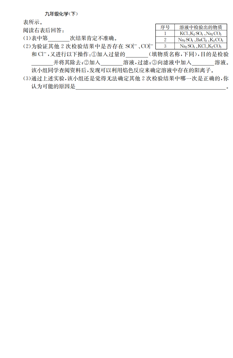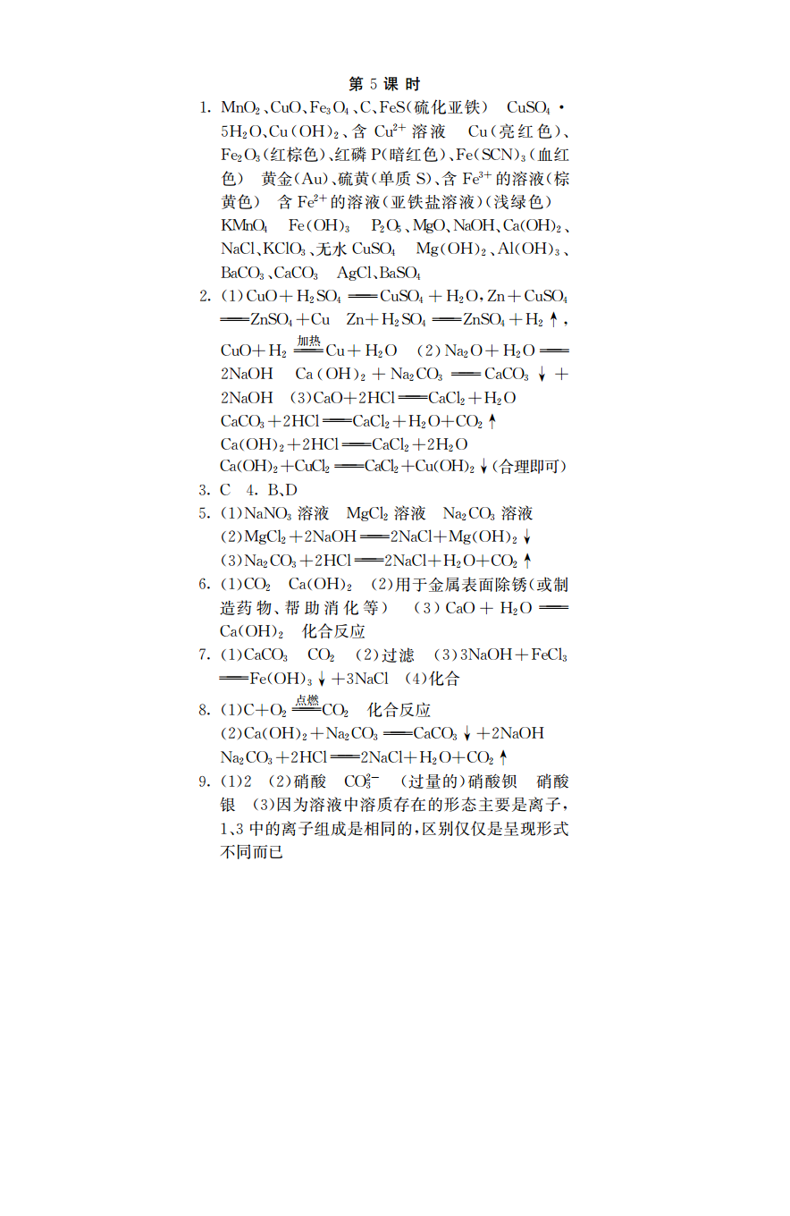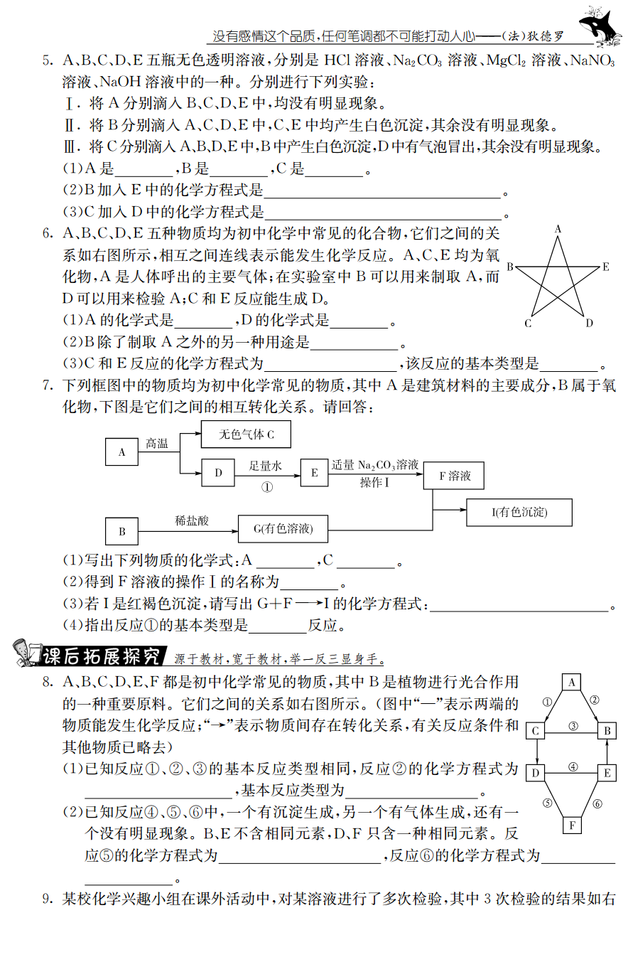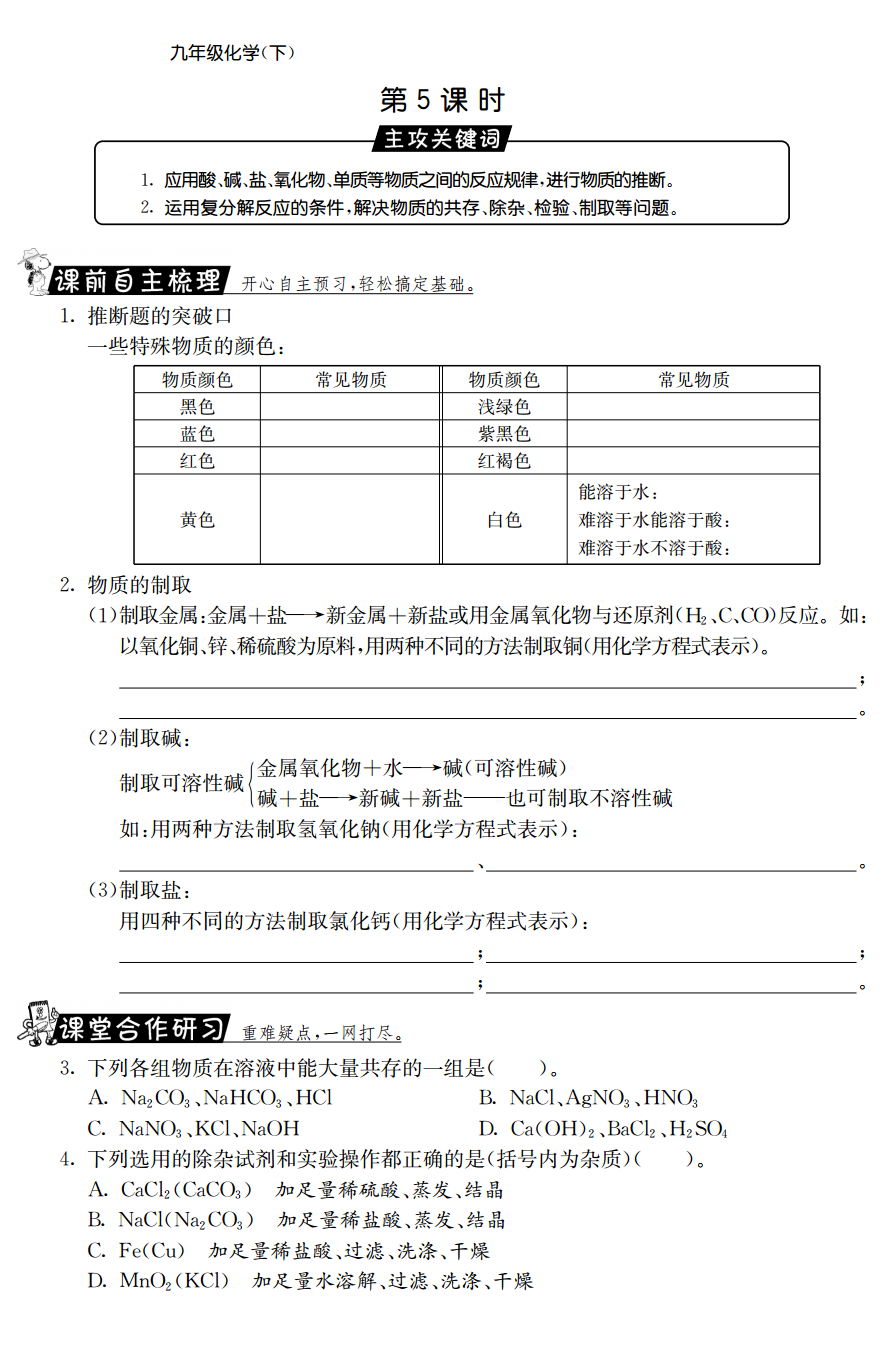 九年级化学(下)第5课时1.应用酸、碱、盐、氧化物、单质等物质之间的反应规律,进行物质的推断。2.运用复分解反应的条件,解决物质的共存、除杂、检验、制取等问题。开心自主预习,轻松搞定基础。1.推断题的突破口一些特殊物质的颜色:物质颜色常见物质物质颜色常见物质黑色浅绿色蓝色紫黑色红色红褐色能溶于水:黄色白色难溶于水能溶于酸:难溶于水不溶于酸:2.物质的制取(1)制取金属:金属+盐→新金属+新盐或用金属氧化物与还原剂(H2、C、CO)反应。如:以氧化铜、锌、稀硫酸为原料,用两种不同的方法制取铜(用化学方程式表示)。;。(2)制取碱:金属氧化物+水→碱(可溶性碱)制取可溶性碱{碱+盐→新碱+新盐———也可制取不溶性碱如:用两种方法制取氢氧化钠(用化学方程式表示):、。(3)制取盐:用四种不同的方法制取氯化钙(用化学方程式表示):;;;。重难疑点,一网打尽。3.下列各组物质在溶液中能大量共存的一组是()。A.Na2CO3、NaHCO3、HClB.NaCl、AgNO3、HNO3C.NaNO3、KCl、NaOHD.Ca(OH)2、BaCl2、H2SO44.下列选用的除杂试剂和实验操作都正确的是(括号内为杂质)()。A.CaCl2(CaCO3)加足量稀硫酸、蒸发、结晶B.NaCl(Na2CO3)加足量稀盐酸、蒸发、结晶C.Fe(Cu)加足量稀盐酸、过滤、洗涤、干燥D.MnO2(KCl)加足量水溶解、过滤、洗涤、干燥没有感情这个品质,任何笔调都不可能打动人心———(法)狄德罗5.A、B、C、D、E五瓶无色透明溶液,分别是HCl溶液、Na2CO3溶液、MgCl2溶液、NaNO3溶液、NaOH溶液中的一种。分别进行下列实验:Ⅰ.将A分别滴入B、C、D、E中,均没有明显现象。Ⅱ.将B分别滴入A、C、D、E中,C、E中均产生白色沉淀,其余没有明显现象。Ⅲ.将C分别滴入A、B、D、E中,B中产生白色沉淀,D中有气泡冒出,其余没有明显现象。(1)A是,B是,C是。(2)B加入E中的化学方程式是。(3)C加入D中的化学方程式是。6.A、B、C、D、E五种物质均为初中化学中常见的化合物,它们之间的关系如右图所示,相互之间连线表示能发生化学反应。A、C、E均为氧化物,A是人体呼出的主要气体;在实验室中B可以用来制取A,而D可以用来检验A;C和E反应能生成D。(1)A的化学式是,D的化学式是。(2)B除了制取A之外的另一种用途是。(3)C和E反应的化学方程式为,该反应的基本类型是。7.下列框图中的物质均为初中化学常见的物质,其中A是建筑材料的主要成分,B属于氧化物,下图是它们之间的相互转化关系。请回答:(1)写出下列物质的化学式:A,C。(2)得到F溶液的操作Ⅰ的名称为。(3)若I是红褐色沉淀,请写出G+F→I的化学方程式:。(4)指出反应①的基本类型是反应。源于教材,宽于教材,举一反三显身手。8.A、B、C、D、E、F都是初中化学常见的物质,其中B是植物进行光合作用的一种重要原料。它们之间的关系如右图所示。(图中“—”表示两端的物质能发生化学反应;“→”表示物质间存在转化关系,有关反应条件和其他物质已略去)(1)已知反应①、②、③的基本反应类型相同,反应②的化学方程式为,基本反应类型为。(2)已知反应④、⑤、⑥中,一个有沉淀生成,另一个有气体生成,还有一个没有明显现象。B、E不含相同元素,D、F只含一种相同元素。反应⑤的化学方程式为,反应⑥的化学方程式为。9.某校化学兴趣小组在课外活动中,对某溶液进行了多次检验,其中3次检验的结果如右九年级化学(下)表所示。序号溶液中检验出的物质阅读右表后回答:1KCl、K2SO4、Na2CO3()表中第次结果肯定不准确。12Na2SO4、BaCl2、K2CO32-2-(2)为验证其他2次检验结果中是否存在SO4、CO33Na2SO4、KCl、K2CO3和Cl-,又进行以下操作:①加入过量的(填物质名称,下同),目的是检验并将其除去;②加入溶液,过滤;③向滤液中加入溶液。该小组同学查阅资料后,发现可以利用焰色反应来确定溶液中存在的阳离子。(3)通过上述实验,该小组还是觉得无法确定其他2次检验结果中哪一次是正确的,你认为可能的原因是。第5课时1.MnO2、CuO、Fe3O4、C、FeS(硫化亚铁)CuSO4·2+5H2O、Cu(OH)2、含Cu溶液Cu(亮红色)、Fe2O3(红棕色)、红磷P(暗红色)、Fe(SCN)3(血红色)黄金(Au)、硫黄(单质S)、含Fe3+的溶液(棕黄色)含Fe2+的溶液(亚铁盐溶液)(浅绿色)KMnO4Fe(OH)3P2O5、MgO、NaOH、Ca(OH)2、NaCl、KClO3、无水CuSO4Mg(OH)2、Al(OH)3、BaCO3、CaCO3AgCl、BaSO42.(1)CuO