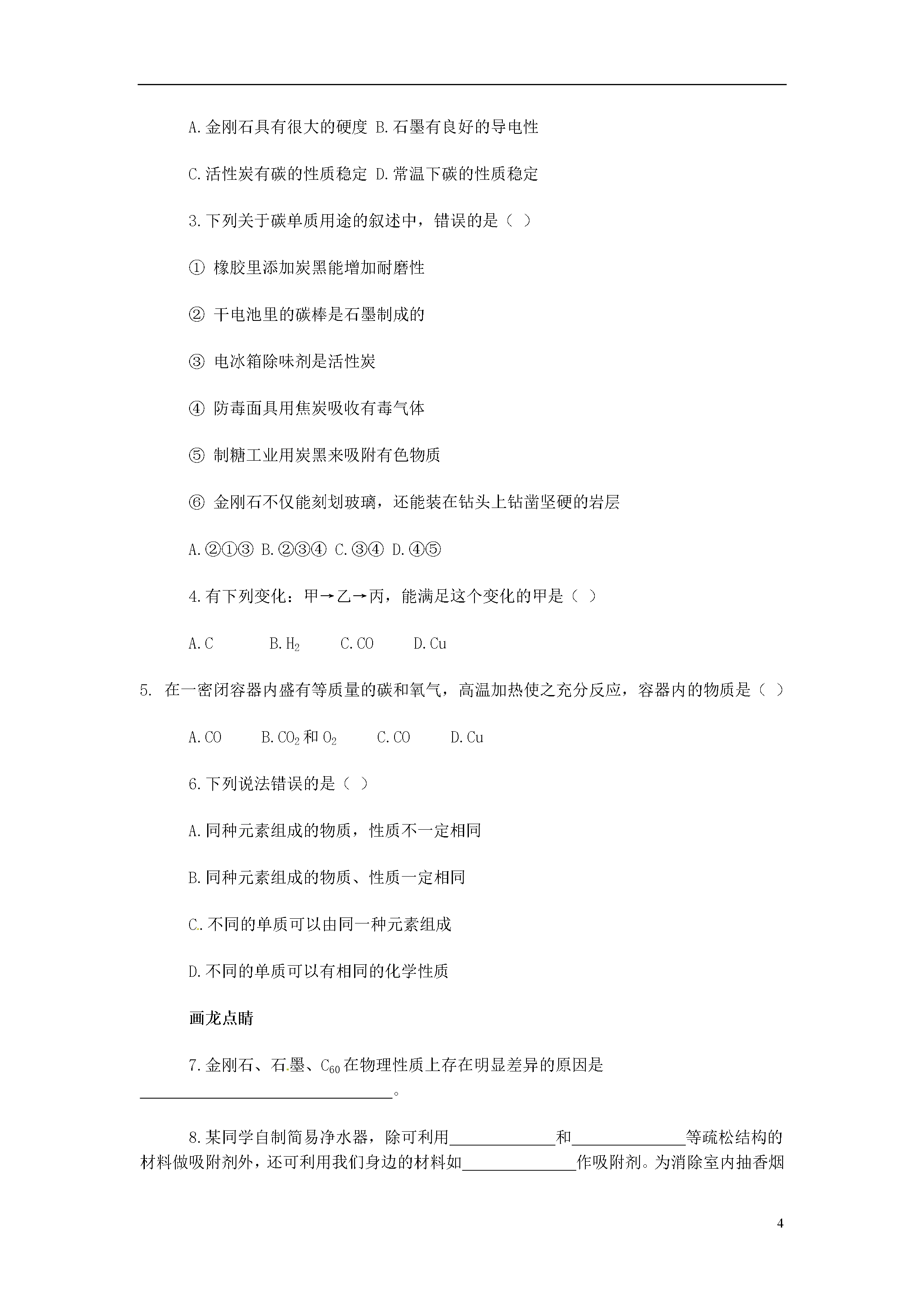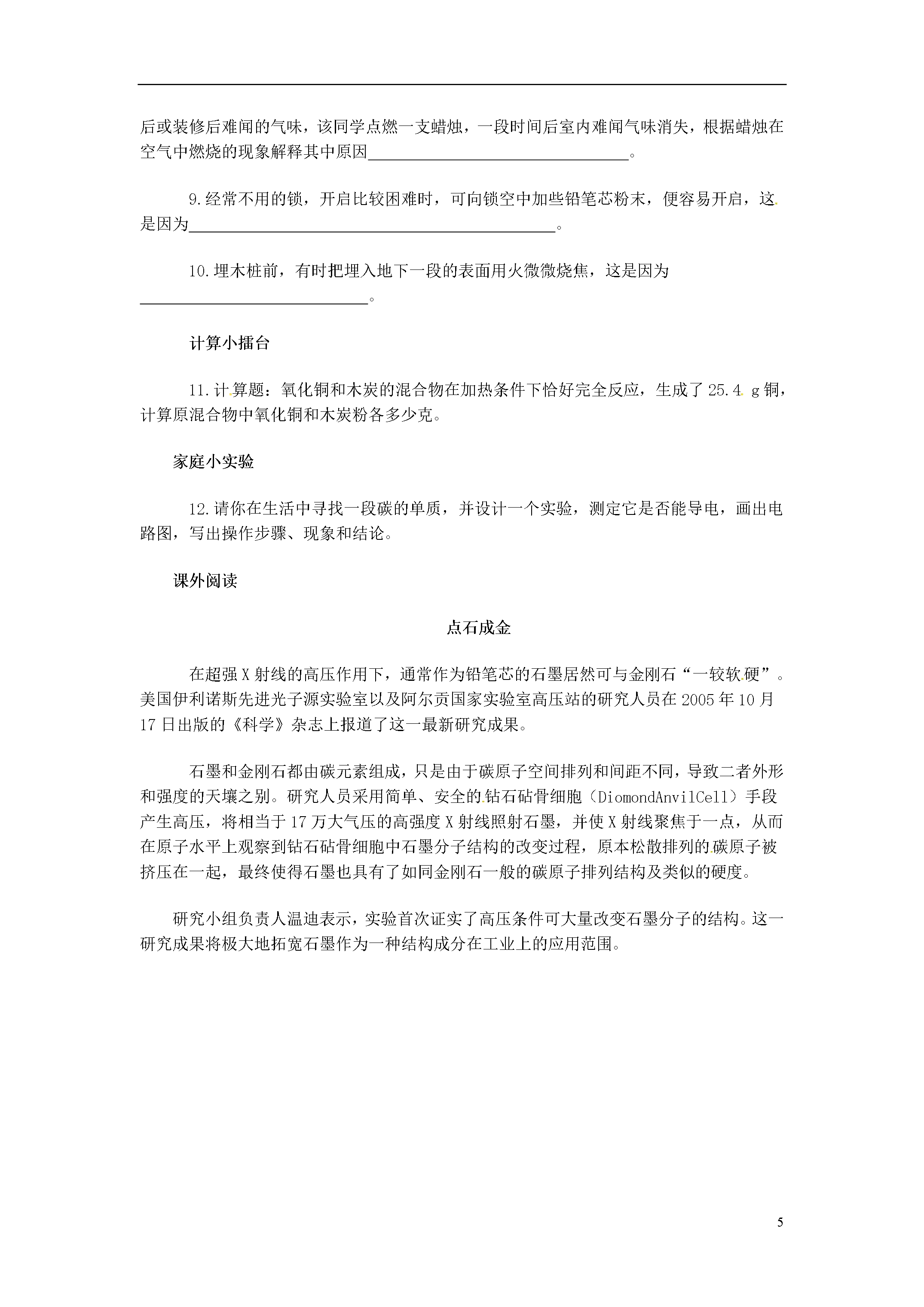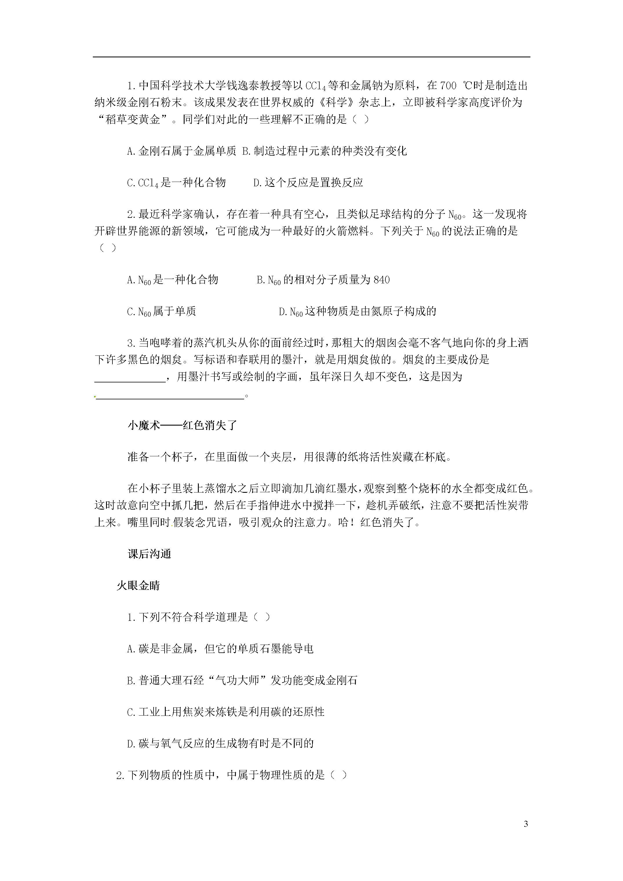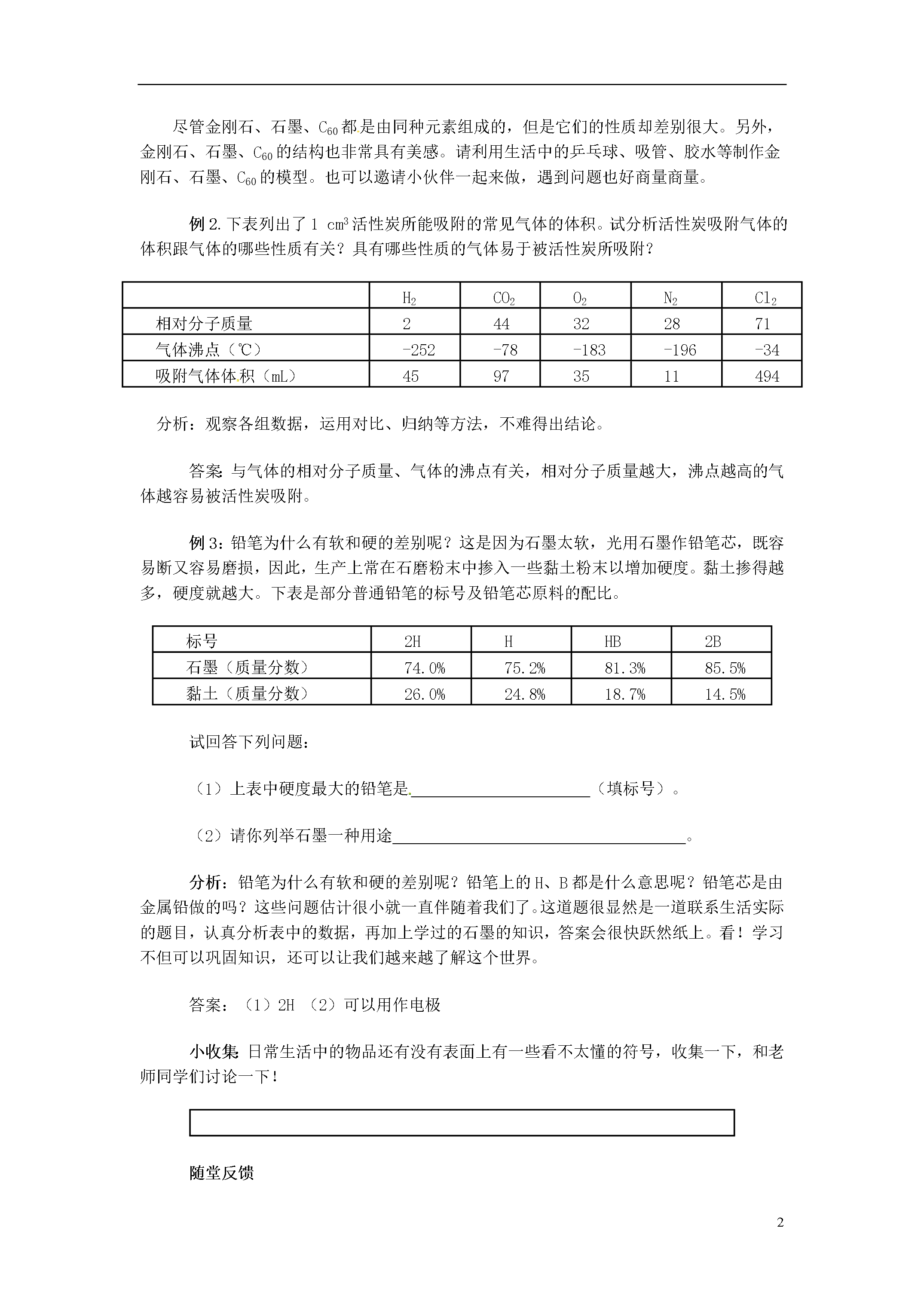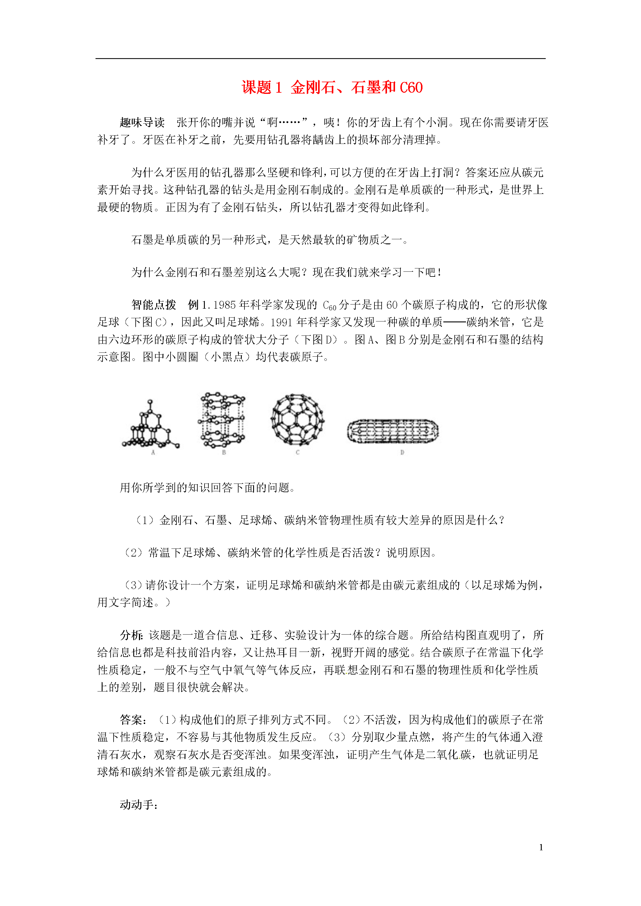 5课题1金刚石、石墨和C60趣味导读张开你的嘴并说“啊……”,咦!你的牙齿上有个小洞。现在你需要请牙医补牙了。牙医在补牙之前,先要用钻孔器将龋齿上的损坏部分清理掉。为什么牙医用的钻孔器那么坚硬和锋利,可以方便的在牙齿上打洞?答案还应从碳元素开始寻找。这种钻孔器的钻头是用金刚石制成的。金刚石是单质碳的一种形式,是世界上最硬的物质。正因为有了金刚石钻头,所以钻孔器才变得如此锋利。石墨是单质碳的另一种形式,是天然最软的矿物质之一。为什么金刚石和石墨差别这么大呢?现在我们就来学习一下吧!智能点拨例1.1985年科学家发现的C60分子是由60个碳原子构成的,它的形状像足球(下图C),因此又叫足球烯。1991年科学家又发现一种碳的单质──碳纳米管,它是由六边环形的碳原子构成的管状大分子(下图D)。图A、图B分别是金刚石和石墨的结构示意图。图中小圆圈(小黑点)均代表碳原子。用你所学到的知识回答下面的问题。(1)金刚石、石墨、足球烯、碳纳米管物理性质有较大差异的原因是什么?(2)常温下足球烯、碳纳米管的化学性质是否活泼?说明原因。(3)请你设计一个方案,证明足球烯和碳纳米管都是由碳元素组成的(以足球烯为例,用文字简述。)分析:该题是一道合信息、迁移、实验设计为一体的综合题。所给结构图直观明了,所给信息也都是科技前沿内容,又让热耳目一新,视野开阔的感觉。结合碳原子在常温下化学性质稳定,一般不与空气中氧气等气体反应,再联想金刚石和石墨的物理性质和化学性质上的差别,题目很快就会解决。答案:(1)构成他们的原子排列方式不同。(2)不活泼,因为构成他们的碳原子在常温下性质稳定,不容易与其他物质发生反应。(3)分别取少量点燃,将产生的气体通入澄清石灰水,观察石灰水是否变浑浊。如果变浑浊,证明产生气体是二氧化碳,也就证明足球烯和碳纳米管都是碳元素组成的。动动手:尽管金刚石、石墨、C60都是由同种元素组成的,但是它们的性质却差别很大。另外,金刚石、石墨、C60的结构也非常具有美感。请利用生活中的乒乓球、吸管、胶水等制作金刚石、石墨、C60的模型。也可以邀请小伙伴一起来做,遇到问题也好商量商量。例2.下表列出了1cm3活性炭所能吸附的常见气体的体积。试分析活性炭吸附气体的体积跟气体的哪些性质有关?具有哪些性质的气体易于被活性炭所吸附?H2CO2O2N2Cl2相对分子质量244322871气体沸点(℃)-252-78-183-196-34吸附气体体积(mL)45973511494分析:观察各组数据,运用对比、归纳等方法,不难得出结论。答案:与气体的相对分子质量、气体的沸点有关,相对分子质量越大,沸点越高的气体越容易被活性炭吸附。例3:铅笔为什么有软和硬的差别呢?这是因为石墨太软,光用石墨作铅笔芯,既容易断又容易磨损,因此,生产上常在石磨粉末中掺入一些黏土粉末以增加硬度。黏土掺得越多,硬度就越大。下表是部分普通铅笔的标号及铅笔芯原料的配比。标号2HHHB2B石墨(质量分数)74.0%75.2%81.3%85.5%黏土(质量分数)26.0%24.8%18.7%14.5%试回答下列问题:(1)上表中硬度最大的铅笔是(填标号)。(2)请你列举石墨一种用途。分析:铅笔为什么有软和硬的差别呢?铅笔上的H、B都是什么意思呢?铅笔芯是由金属铅做的吗?这些问题估计很小就一直伴随着我们了。这道题很显然是一道联系生活实际的题目,认真分析表中的数据,再加上学过的石墨的知识,答案会很快跃然纸上。看!学习不但可以巩固知识,还可以让我们越来越了解这个世界。答案:(1)2H(2)可以用作电极小收集:日常生活中的物品还有没有表面上有一些看不太懂的符号,收集一下,和老师同学们讨论一下!随堂反馈1.中国科学技术大学钱逸泰教授等以CCl4等和金属钠为原料,在700℃时是制造出纳米级金刚石粉末。该成果发表在世界权威的《科学》杂志上,立即被科学家高度评价为“稻草变黄金”。同学们对此的一些理解不正确的是()A.金刚石属于金属单质B.制造过程中元素的种类没有变化C.CCl4是一种化合物D.这个反应是置换反应2.最近科学家确认,存在着一种具有空心,且类似足球结构的分子N60。这一发现将开辟世界能源的新领域,它可能成为一种最好的火箭燃料。下列关于N60的说法正确的是()A.N60是一种化合物B.N60的相对分子质量为840C.N60属于单质D.N60这种物质是由氮原子构成的3.当咆哮着的蒸汽机头从你的面前经过时,那粗大的烟囱会毫不客气地向你的身上洒下许多黑色的烟炱。写标语和春联用的墨汁,就是用烟炱做的。烟炱的主要成份是,用墨汁书写或绘制的字画,虽年深日久却不变色,这是因为。小魔术──红色消失了准备一个杯子,在里面做一个夹层,用很薄的纸将活性炭藏在杯底。在小杯子里装上蒸馏水之后立即滴加几滴红墨水,观察到整个烧杯的水