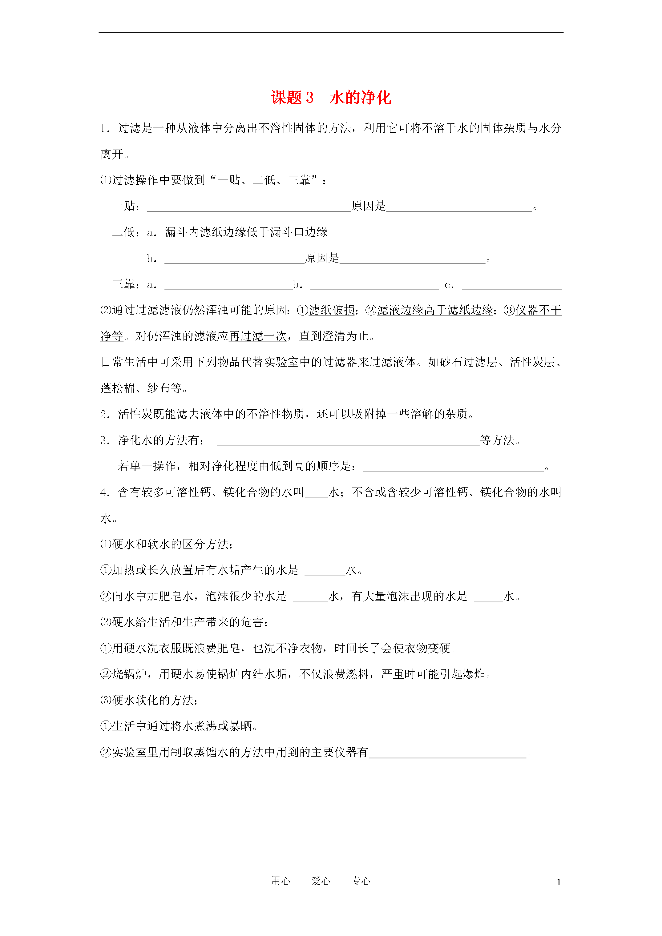 1用心爱心专心课题3水的净化1.过滤是一种从液体中分离出不溶性固体的方法,利用它可将不溶于水的固体杂质与水分离开。www.zk5u.com中考资源网⑴过滤操作中要做到“一贴、二低、三靠”:一贴:原因是。www.zk5u.com中考资源网二低:a.漏斗内滤纸边缘低于漏斗口边缘b.原因是。www.zk5u.com中考资源网三靠:a.b.c.⑵通过过滤滤液仍然浑浊可能的原因:①滤纸破损;②滤液边缘高于滤纸边缘;③仪器不干净等。www.zk5u.com中考资源网对仍浑浊的滤液应再过滤一次,直到澄清为止。www.zk5u.com中考资源网日常生活中可采用下列物品代替实验室中的过滤器来过滤液体。www.zk5u.com中考资源网如砂石过滤层、活性炭层、蓬松棉、纱布等。www.zk5u.com中考资源网2.活性炭既能滤去液体中的不溶性物质,还可以吸附掉一些溶解的杂质。www.zk5u.com中考资源网3.净化水的方法有:等方法。www.zk5u.com中考资源网若单一操作,相对净化程度由低到高的顺序是:。www.zk5u.com中考资源网4.含有较多可溶性钙、镁化合物的水叫水;不含或含较少可溶性钙、镁化合物的水叫水。www.zk5u.com中考资源网⑴硬水和软水的区分方法:①加热或长久放置后有水垢产生的水是水。www.zk5u.com中考资源网www.zk5u.com中考资源网②向水中加肥皂水,泡沫很少的水是水,有大量泡沫出现的水是水。www.zk5u.com中考资源网⑵硬水给生活和生产带来的危害:①用硬水洗衣服既浪费肥皂,也洗不净衣物,时间长了会使衣物变硬。www.zk5u.com中考资源网②烧锅炉,用硬水易使锅炉内结水垢,不仅浪费燃料,严重时可能引起爆炸。www.zk5u.com中考资源网⑶硬水软化的方法:①生活中通过将水煮沸或暴晒。www.zk5u.com中考资源网②实验室里用制取蒸馏水的方法中用到的主要仪器有。www.zk5u.com中考资源网
