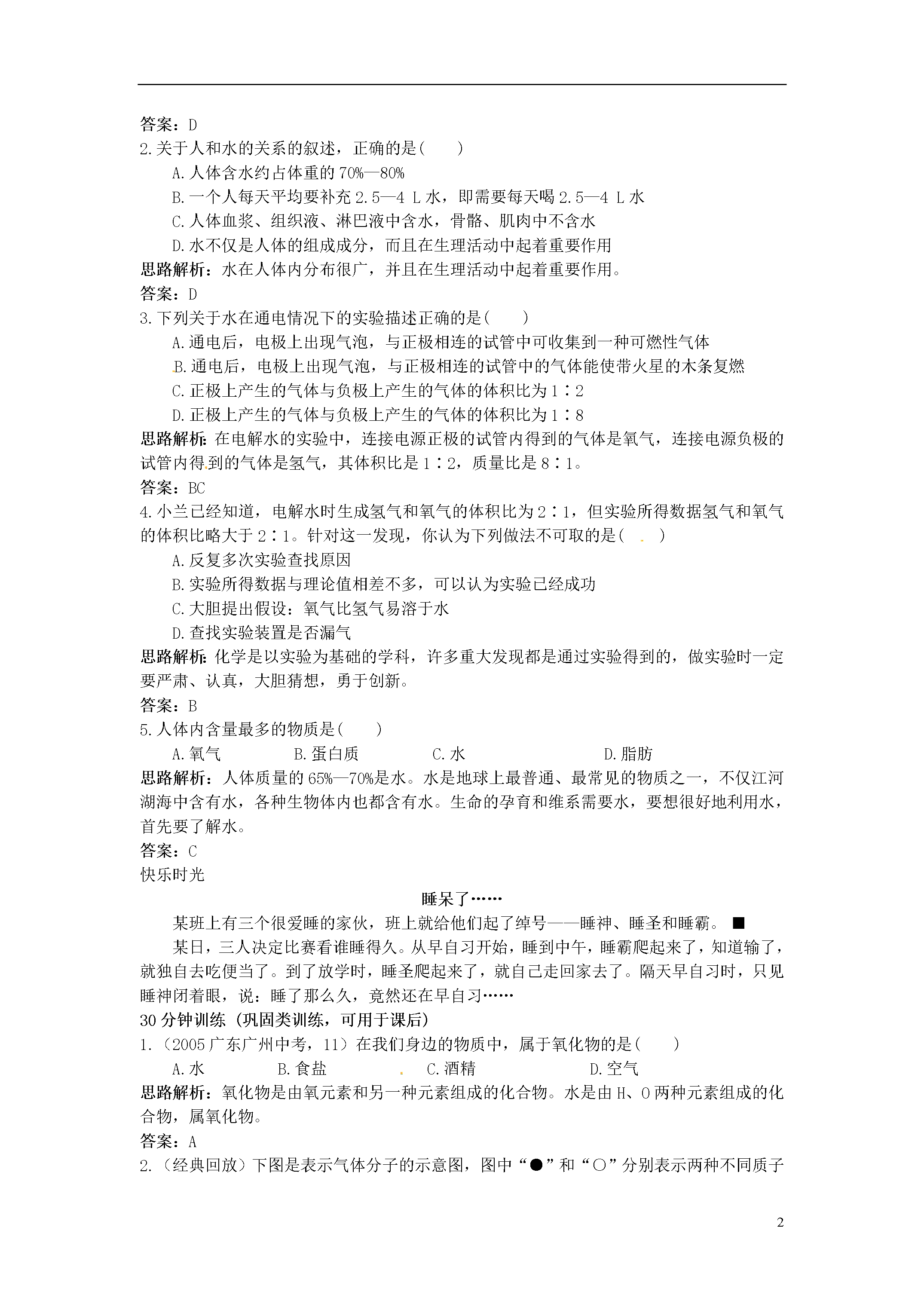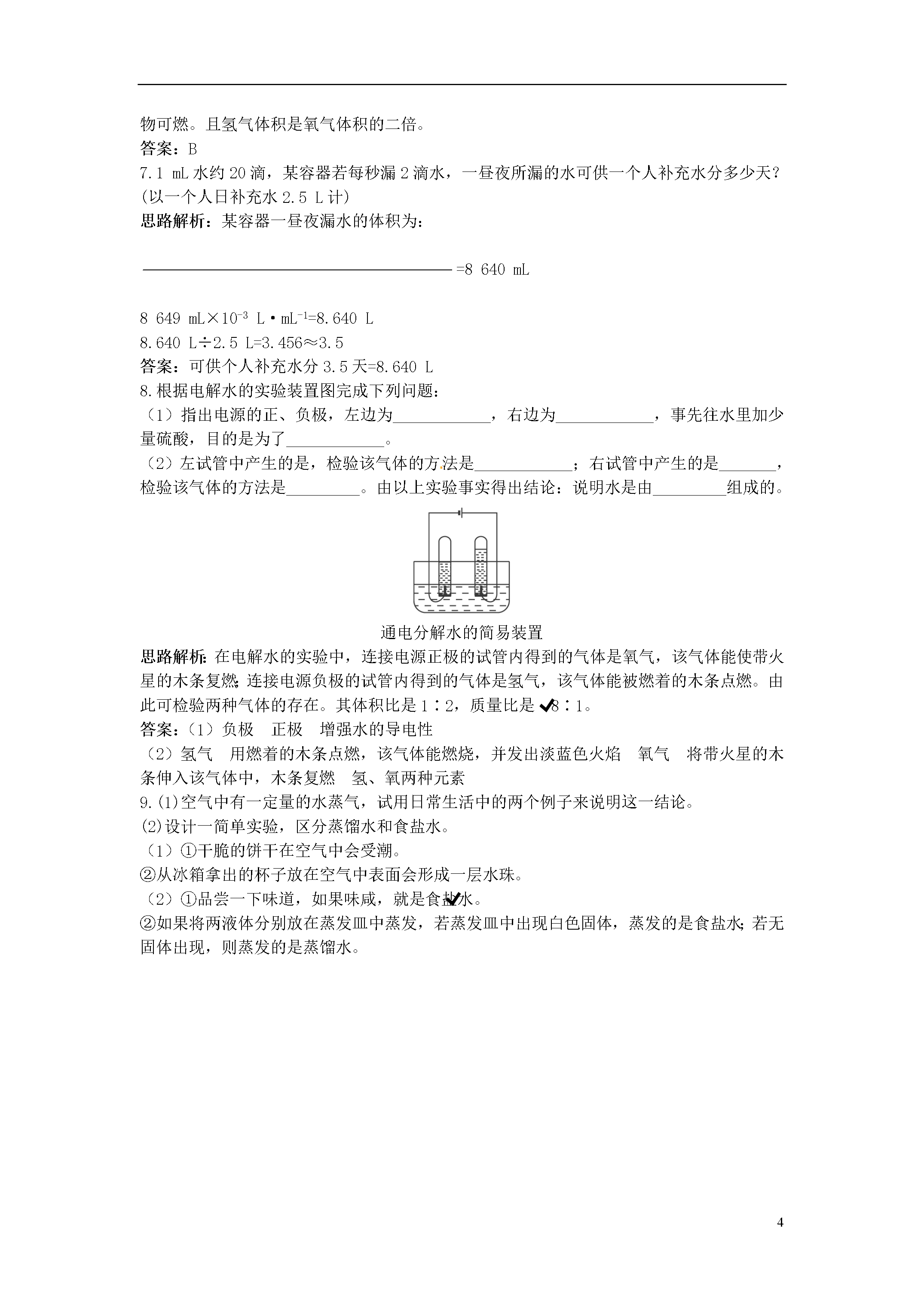 4第三单元自然界的水课题1水的组成5分钟训练(预习类训练,可用于课前)1.水是由_________和_________组成的,水属于纯净物、化合物、氧化物。思路解析:本题考查水的组成。答案:氢元素氧元素2.下列叙述正确的是()A.水是由氢气和氧气组成的B.水分子是由氢单质和一个氧原子组成的C.水是由两个氢元素和一个氧元素组成的D.水是由氢元素和氧元素组成的思路解析:本题主要从宏观和微观角度考查水的组成基本知识。对于水的组成,从宏观角度讲,水是由氢元素和氧元素组成的;从微观角度讲,一个水分子是由两个氢原子和一个氧原子构成的。答案:D3.在电解水的实验中,正确的实验现象是()A.通电后,两个电极上都有气泡产生;过一段时间后,发现两个玻璃管内气体的体积比约为2∶1B.负、正两极分别有氢气和氧气,而且体积比约为2∶1C.水是由氢、氧两元素组成的D.水发生分解反应,在插入正极的玻璃管内产生的是氢气思路解析:实验现象是凭我们的感官感觉到的,如眼看、鼻闻、触摸等。而选项A所描述的,确实是我们通过眼睛看到的,并做了直接描写,所以是题目所要求的答案。而B选项所描述为负、正两极分别有氢气和氧气,且它们的体积分别是2∶1,只能通过我们进一步的实验,得出的结论,而不应算作实验现象,所以不能是题目的答案。而C、D选项都是通过实验现象得出的结论,所以它们都不是本题的答案。答案:A4.纯净的水是____________色,____________气味,____________味道的____________体。在1标准大气压下,水的凝固点为____________℃,沸点为___________℃。水在___________℃时的密度最大,为___________g·cm-3。水结冰时体积,所以冰的密度(填“大于”“小于”或“等于”)水的密度,___________冰能在水面上。思路解析:本题考查水的基本物理性质。答案:无无无液010041增大小于浮10分钟训练(强化类训练,可用于课中)1.(经典回放)关于电解水实验的叙述中氢气表现出的化学性质是()A.产生的氢气无色、无味B.试管中能收集到氢气,说明氢气难溶于水C.氢气的密度小于空气,收集氢气后试管口应向下放置D.将收集氢气的试管移近火焰,可以听到尖锐的爆鸣声思路解析:氢气是一种无色、无味的气体单质,由氢元素组成。氢气是相同情况下密度最小的气体,难溶于水。纯净的氢气能够在空气中安静地燃烧,产生淡蓝色火焰,产物是水。A、B、C均描述了氢气的物理性质。答案:D2.关于人和水的关系的叙述,正确的是()A.人体含水约占体重的70%—80%B.一个人每天平均要补充2.5—4L水,即需要每天喝2.5—4L水C.人体血浆、组织液、淋巴液中含水,骨骼、肌肉中不含水D.水不仅是人体的组成成分,而且在生理活动中起着重要作用思路解析:水在人体内分布很广,并且在生理活动中起着重要作用。答案:D3.下列关于水在通电情况下的实验描述正确的是()A.通电后,电极上出现气泡,与正极相连的试管中可收集到一种可燃性气体B.通电后,电极上出现气泡,与正极相连的试管中的气体能使带火星的木条复燃C.正极上产生的气体与负极上产生的气体的体积比为1∶2D.正极上产生的气体与负极上产生的气体的体积比为1∶8思路解析:在电解水的实验中,连接电源正极的试管内得到的气体是氧气,连接电源负极的试管内得到的气体是氢气,其体积比是1∶2,质量比是8∶1。答案:BC4.小兰已经知道,电解水时生成氢气和氧气的体积比为2∶1,但实验所得数据氢气和氧气的体积比略大于2∶1。针对这一发现,你认为下列做法不可取的是()A.反复多次实验查找原因B.实验所得数据与理论值相差不多,可以认为实验已经成功C.大胆提出假设:氧气比氢气易溶于水D.查找实验装置是否漏气思路解析:化学是以实验为基础的学科,许多重大发现都是通过实验得到的,做实验时一定要严肃、认真,大胆猜想,勇于创新。答案:B5.人体内含量最多的物质是()A.氧气B.蛋白质C.水D.脂肪思路解析:人体质量的65%—70%是水。水是地球上最普通、最常见的物质之一,不仅江河湖海中含有水,各种生物体内也都含有水。生命的孕育和维系需要水,要想很好地利用水,首先要了解水。答案:C快乐时光睡呆了……某班上有三个很爱睡的家伙,班上就给他们起了绰号——睡神、睡圣和睡霸。某日,三人决定比赛看谁睡得久。从早自习开始,睡到中午,睡霸爬起来了,知道输了,就独自去吃便当了。到了放学时,睡圣爬起来了,就自己走回家去了。隔天早自习时,只见睡神闭着眼,说:睡了那么久,竟然还在早自习……30分钟训练(巩固类训练,可用于课后)1.(2005广东广州中考,11)在我们身边的物质中,属于氧化物的是()A.水B.食盐C.酒精D.空气思路解析:氧化物是由氧元素和另一种元素