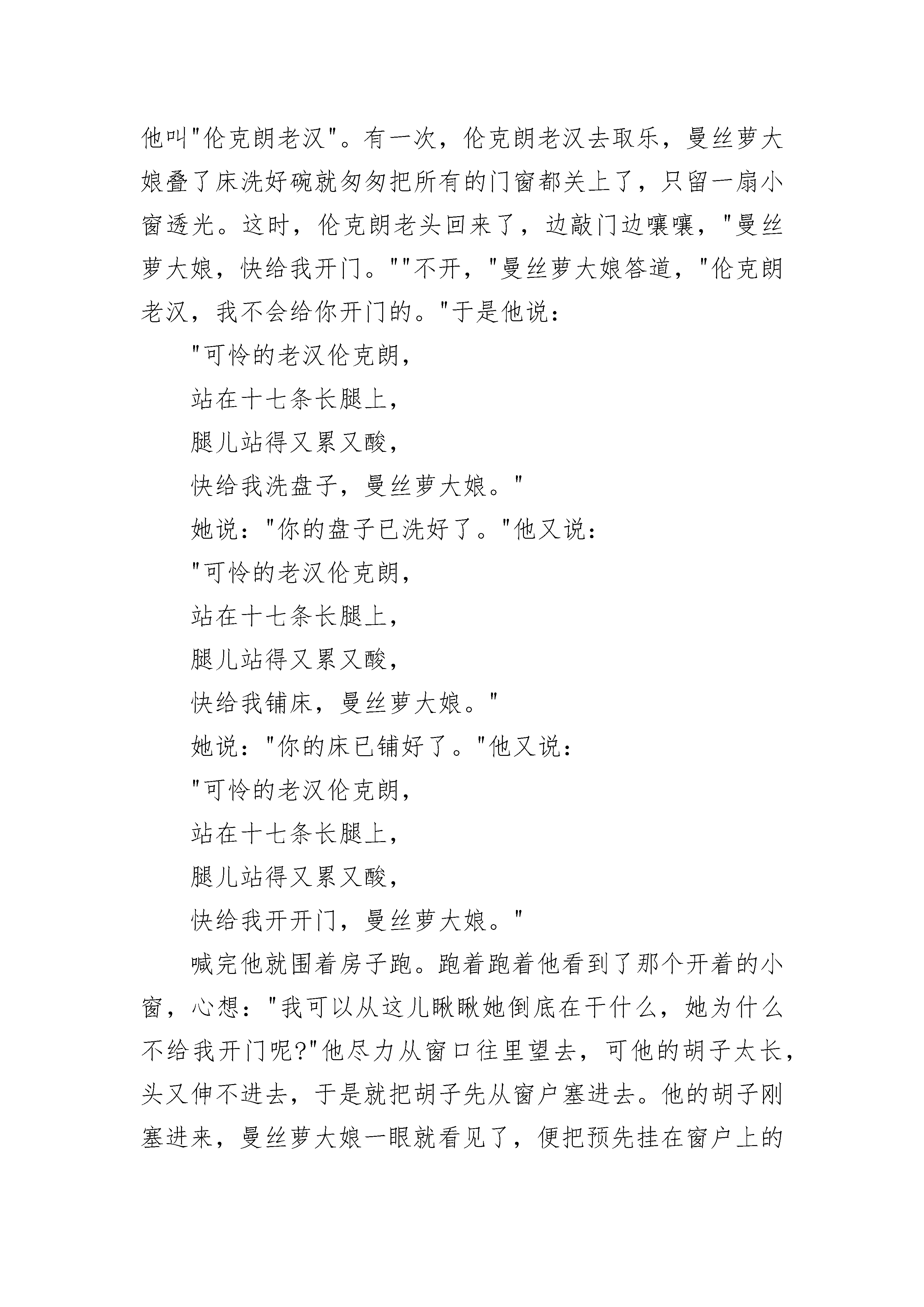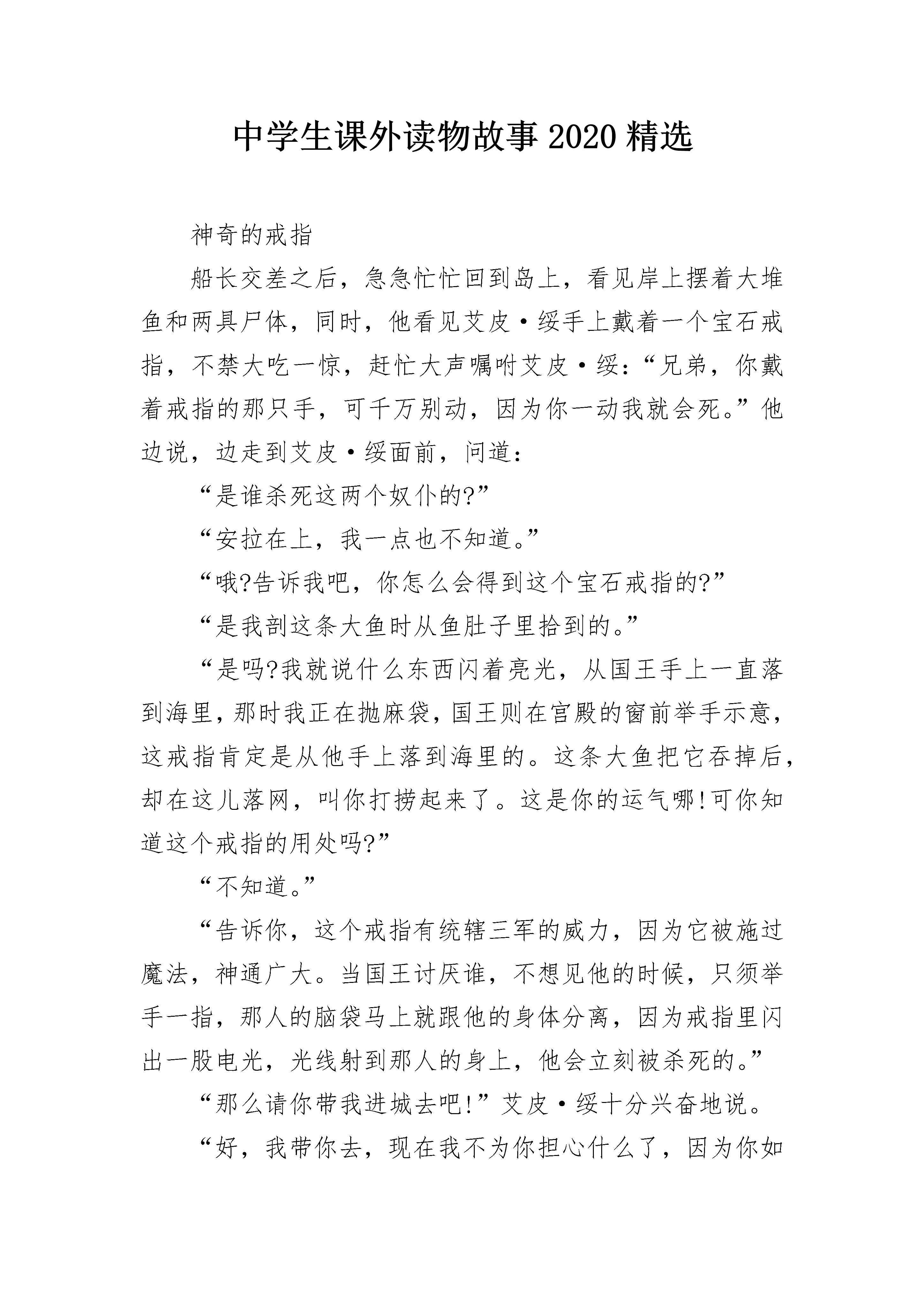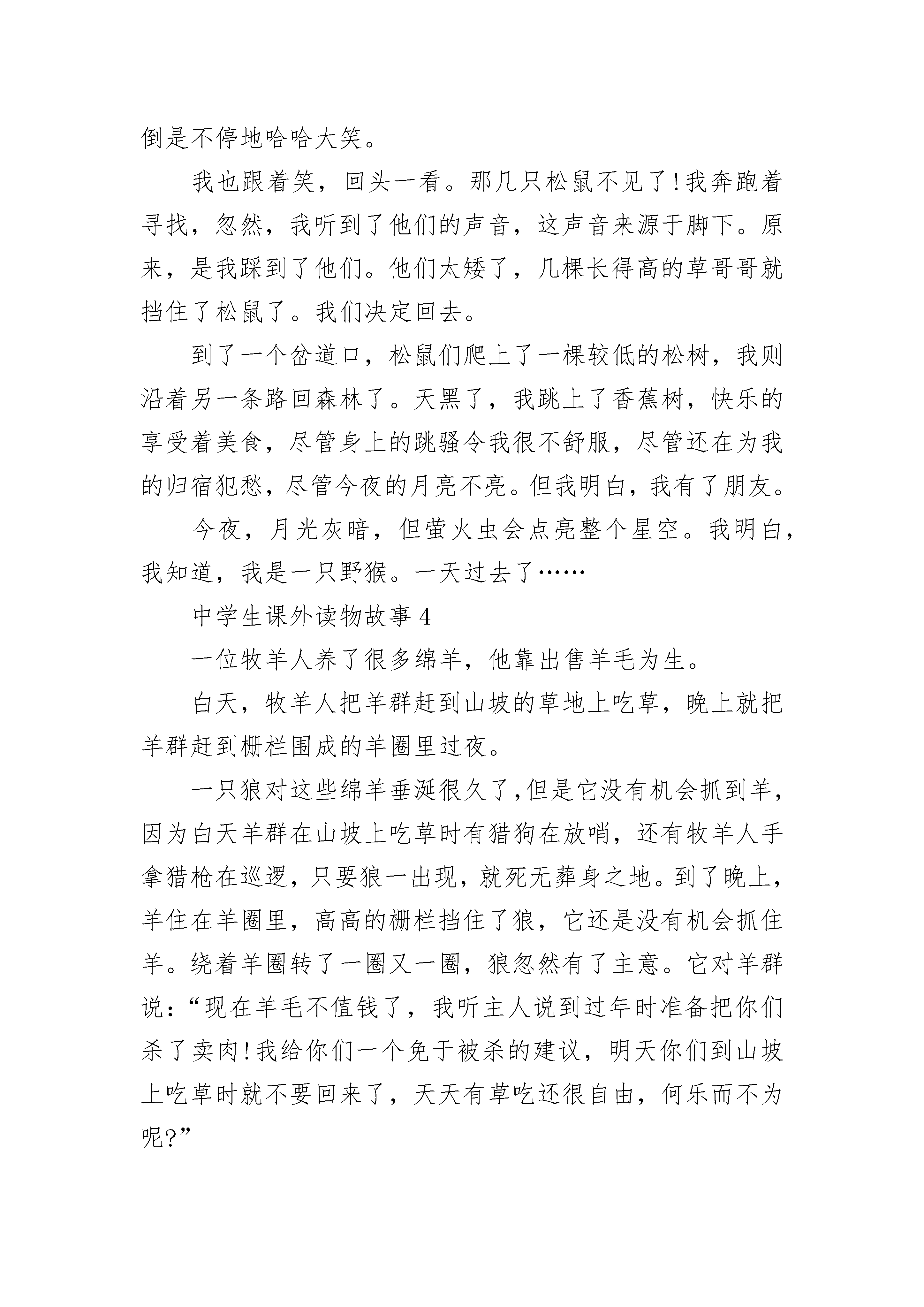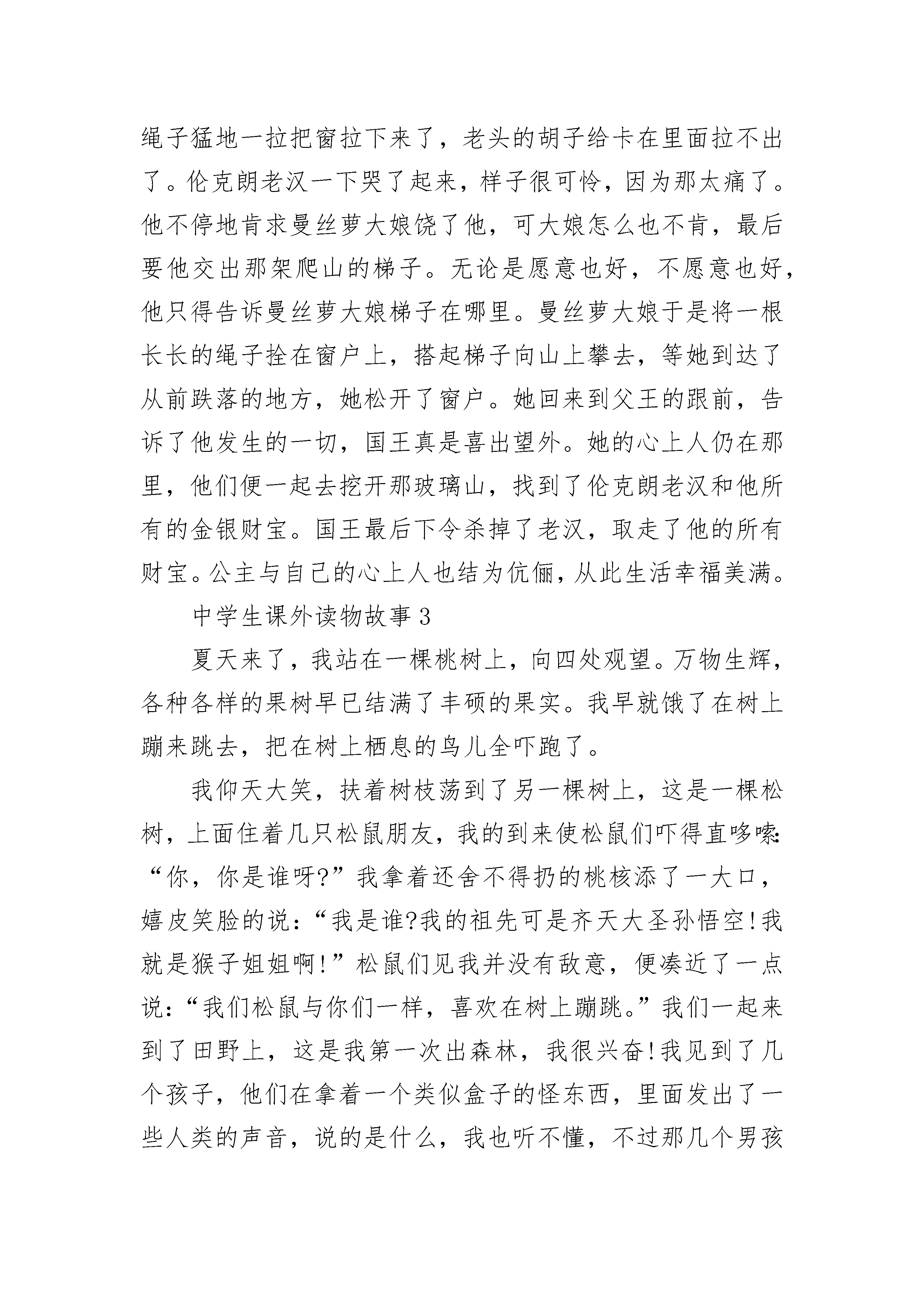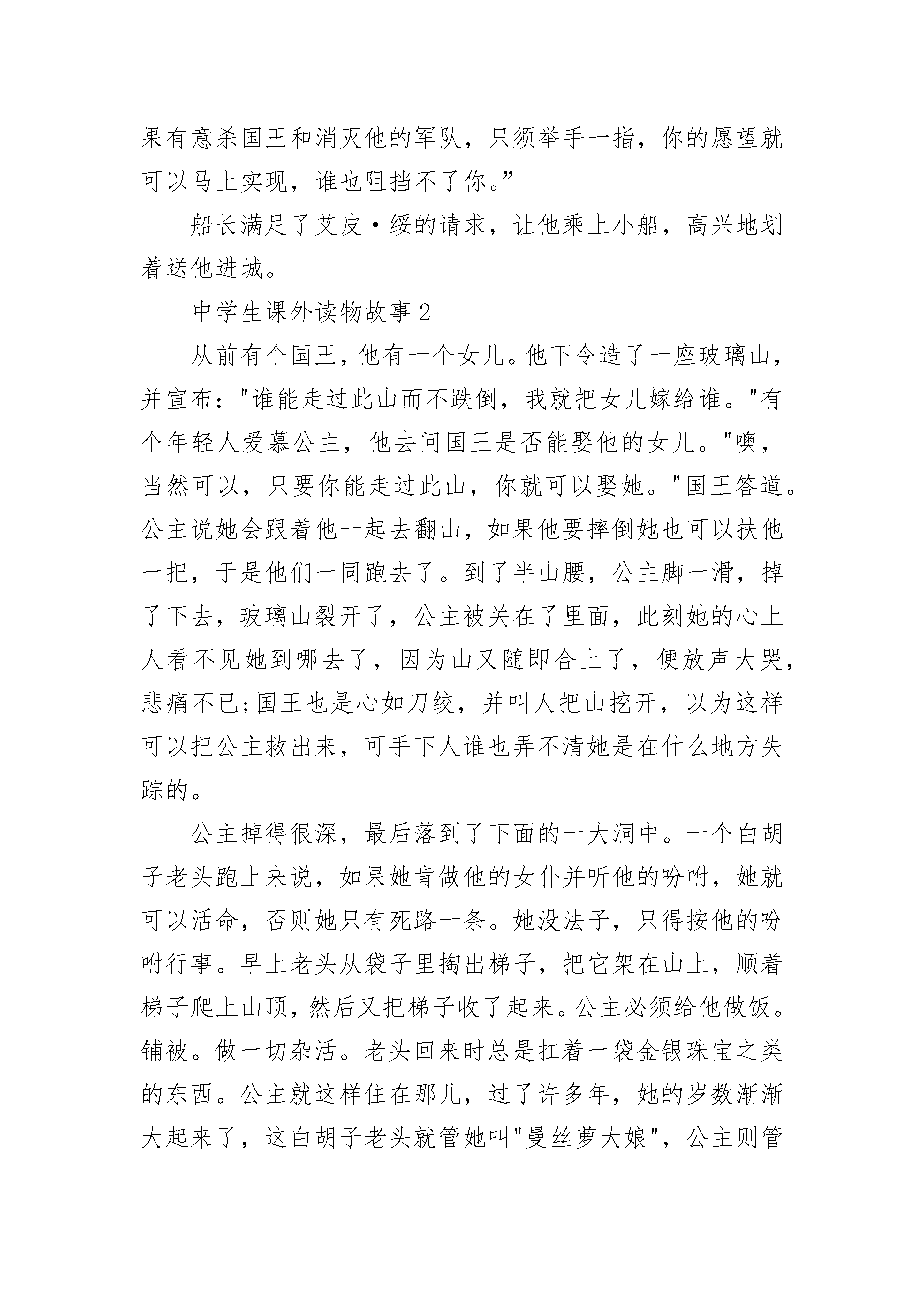 中学生课外读物故事2020精选神奇的戒指船长交差之后,急急忙忙回到岛上,看见岸上摆着大堆鱼和两具尸体,同时,他看见艾皮·绥手上戴着一个宝石戒指,不禁大吃一惊,赶忙大声嘱咐艾皮·绥:“兄弟,你戴着戒指的那只手,可千万别动,因为你一动我就会死。”他边说,边走到艾皮·绥面前,问道:“是谁杀死这两个奴仆的?”“安拉在上,我一点也不知道。”“哦?告诉我吧,你怎么会得到这个宝石戒指的?”“是我剖这条大鱼时从鱼肚子里拾到的。”“是吗?我就说什么东西闪着亮光,从国王手上一直落到海里,那时我正在抛麻袋,国王则在宫殿的窗前举手示意,这戒指肯定是从他手上落到海里的。这条大鱼把它吞掉后,却在这儿落网,叫你打捞起来了。这是你的运气哪!可你知道这个戒指的用处吗?”“不知道。”“告诉你,这个戒指有统辖三军的威力,因为它被施过魔法,神通广大。当国王讨厌谁,不想见他的时候,只须举手一指,那人的脑袋马上就跟他的身体分离,因为戒指里闪出一股电光,光线射到那人的身上,他会立刻被杀死的。”“那么请你带我进城去吧!”艾皮·绥十分兴奋地说。“好,我带你去,现在我不为你担心什么了,因为你如果有意杀国王和消灭他的军队,只须举手一指,你的愿望就可以马上实现,谁也阻挡不了你。”船长满足了艾皮·绥的请求,让他乘上小船,高兴地划着送他进城。中学生课外读物故事2从前有个国王,他有一个女儿。他下令造了一座玻璃山,并宣布:"谁能走过此山而不跌倒,我就把女儿嫁给谁。"有个年轻人爱慕公主,他去问国王是否能娶他的女儿。"噢,当然可以,只要你能走过此山,你就可以娶她。"国王答道。公主说她会跟着他一起去翻山,如果他要摔倒她也可以扶他一把,于是他们一同跑去了。到了半山腰,公主脚一滑,掉了下去,玻璃山裂开了,公主被关在了里面,此刻她的心上人看不见她到哪去了,因为山又随即合上了,便放声大哭,悲痛不已;国王也是心如刀绞,并叫人把山挖开,以为这样可以把公主救出来,可手下人谁也弄不清她是在什么地方失踪的。公主掉得很深,最后落到了下面的一大洞中。一个白胡子老头跑上来说,如果她肯做他的女仆并听他的吩咐,她就可以活命,否则她只有死路一条。她没法子,只得按他的吩咐行事。早上老头从袋子里掏出梯子,把它架在山上,顺着梯子爬上山顶,然后又把梯子收了起来。公主必须给他做饭。铺被。做一切杂活。老头回来时总是扛着一袋金银珠宝之类的东西。公主就这样住在那儿,过了许多年,她的岁数渐渐大起来了,这白胡子老头就管她叫"曼丝萝大娘",公主则管他叫"伦克朗老汉"。有一次,伦克朗老汉去取乐,曼丝萝大娘叠了床洗好碗就匆匆把所有的门窗都关上了,只留一扇小窗透光。这时,伦克朗老头回来了,边敲门边嚷嚷,"曼丝萝大娘,快给我开门。""不开,"曼丝萝大娘答道,"伦克朗老汉,我不会给你开门的。"于是他说:"可怜的老汉伦克朗,站在十七条长腿上,腿儿站得又累又酸,快给我洗盘子,曼丝萝大娘。"她说:"你的盘子已洗好了。"他又说:"可怜的老汉伦克朗,站在十七条长腿上,腿儿站得又累又酸,快给我铺床,曼丝萝大娘。"她说:"你的床已铺好了。"他又说:"可怜的老汉伦克朗,站在十七条长腿上,腿儿站得又累又酸,快给我开开门,曼丝萝大娘。"喊完他就围着房子跑。跑着跑着他看到了那个开着的小窗,心想:"我可以从这儿瞅瞅她倒底在干什么,她为什么不给我开门呢?"他尽力从窗口往里望去,可他的胡子太长,头又伸不进去,于是就把胡子先从窗户塞进去。他的胡子刚塞进来,曼丝萝大娘一眼就看见了,便把预先挂在窗户上的绳子猛地一拉把窗拉下来了,老头的胡子给卡在里面拉不出了。伦克朗老汉一下哭了起来,样子很可怜,因为那太痛了。他不停地肯求曼丝萝大娘饶了他,可大娘怎么也不肯,最后要他交出那架爬山的梯子。无论是愿意也好,不愿意也好,他只得告诉曼丝萝大娘梯子在哪里。曼丝萝大娘于是将一根长长的绳子拴在窗户上,搭起梯子向山上攀去,等她到达了从前跌落的地方,她松开了窗户。她回来到父王的跟前,告诉了他发生的一切,国王真是喜出望外。她的心上人仍在那里,他们便一起去挖开那玻璃山,找到了伦克朗老汉和他所有的金银财宝。国王最后下令杀掉了老汉,取走了他的所有财宝。公主与自己的心上人也结为伉俪,从此生活幸福美满。中学生课外读物故事3夏天来了,我站在一棵桃树上,向四处观望。万物生辉,各种各样的果树早已结满了丰硕的果实。我早就饿了在树上蹦来跳去,把在树上栖息的鸟儿全吓跑了。我仰天大笑,扶着树枝荡到了另一棵树上,这是一棵松树,上面住着几只松鼠朋友,我的到来使松鼠们吓得直哆嗦:“你,你是谁呀?”我拿着还舍不得扔的桃核添了一大口,嬉皮笑脸的说:“我是谁?我的祖先可是齐天大圣孙悟空!我就是猴子姐姐啊!”松鼠们见我并没有敌意,便凑近了一点说:“我们松鼠与你们一样,喜欢在树上蹦跳。”我们一起来到了田野上,这是我第一次出森林,我很兴奋!我见到了几个