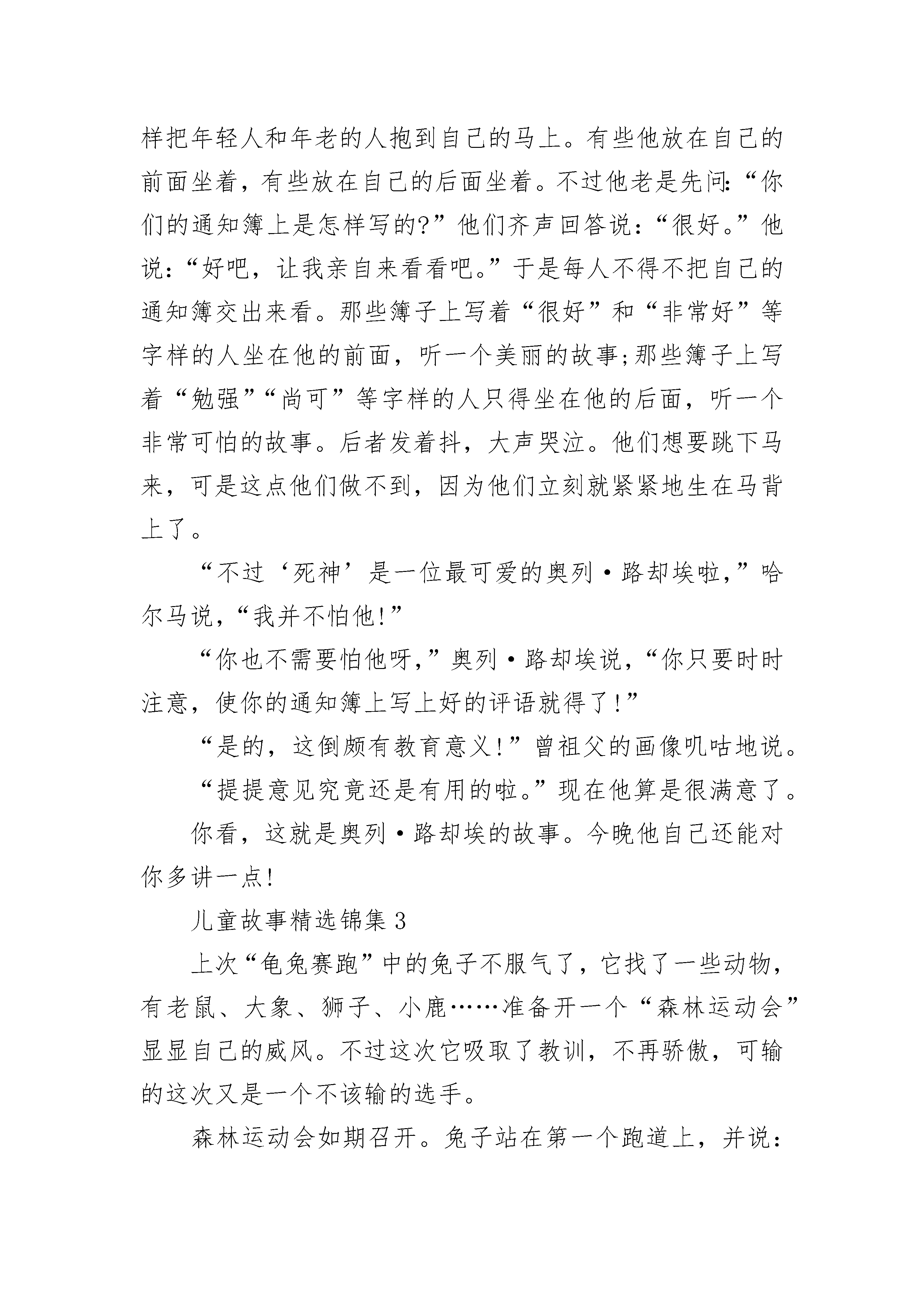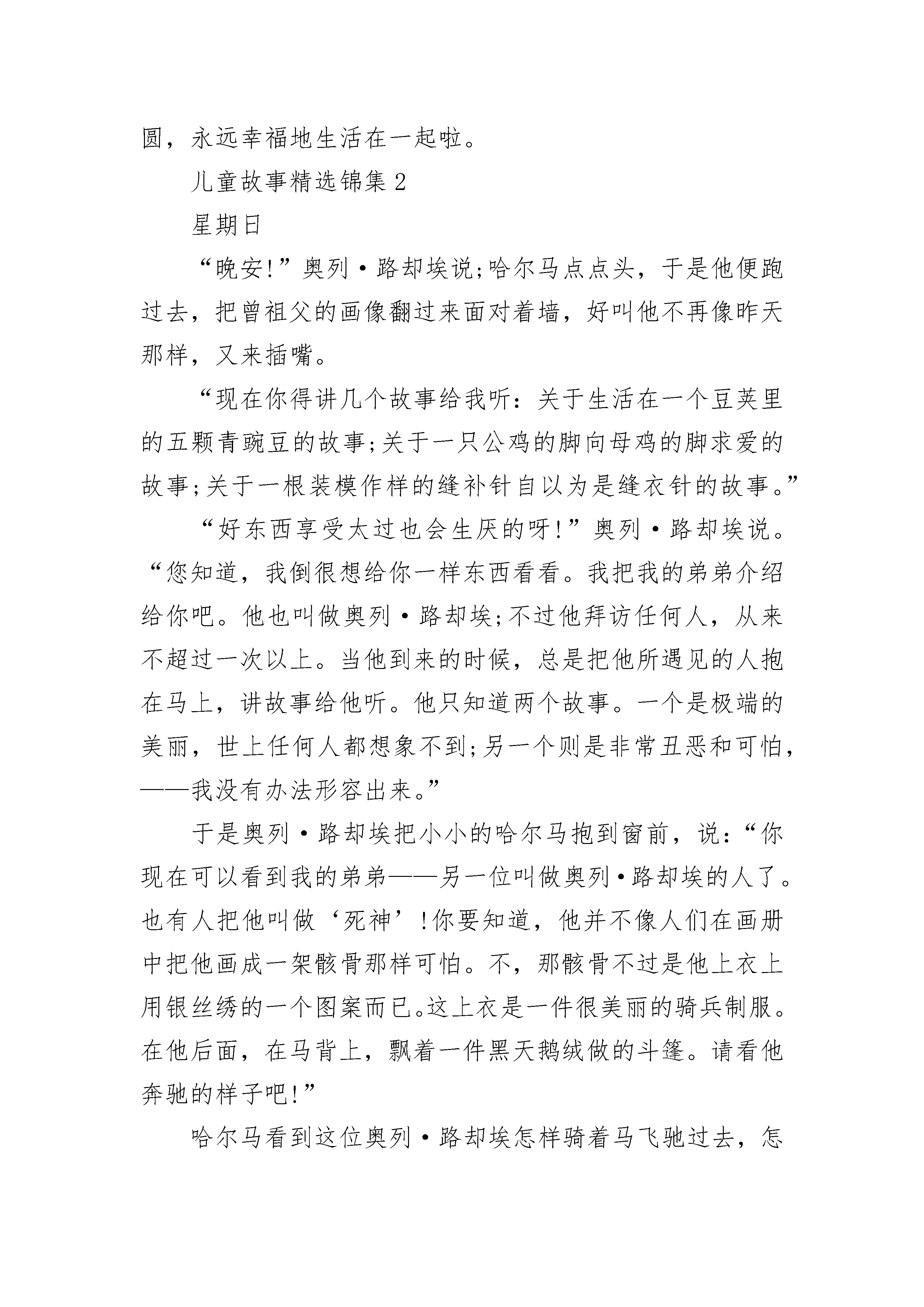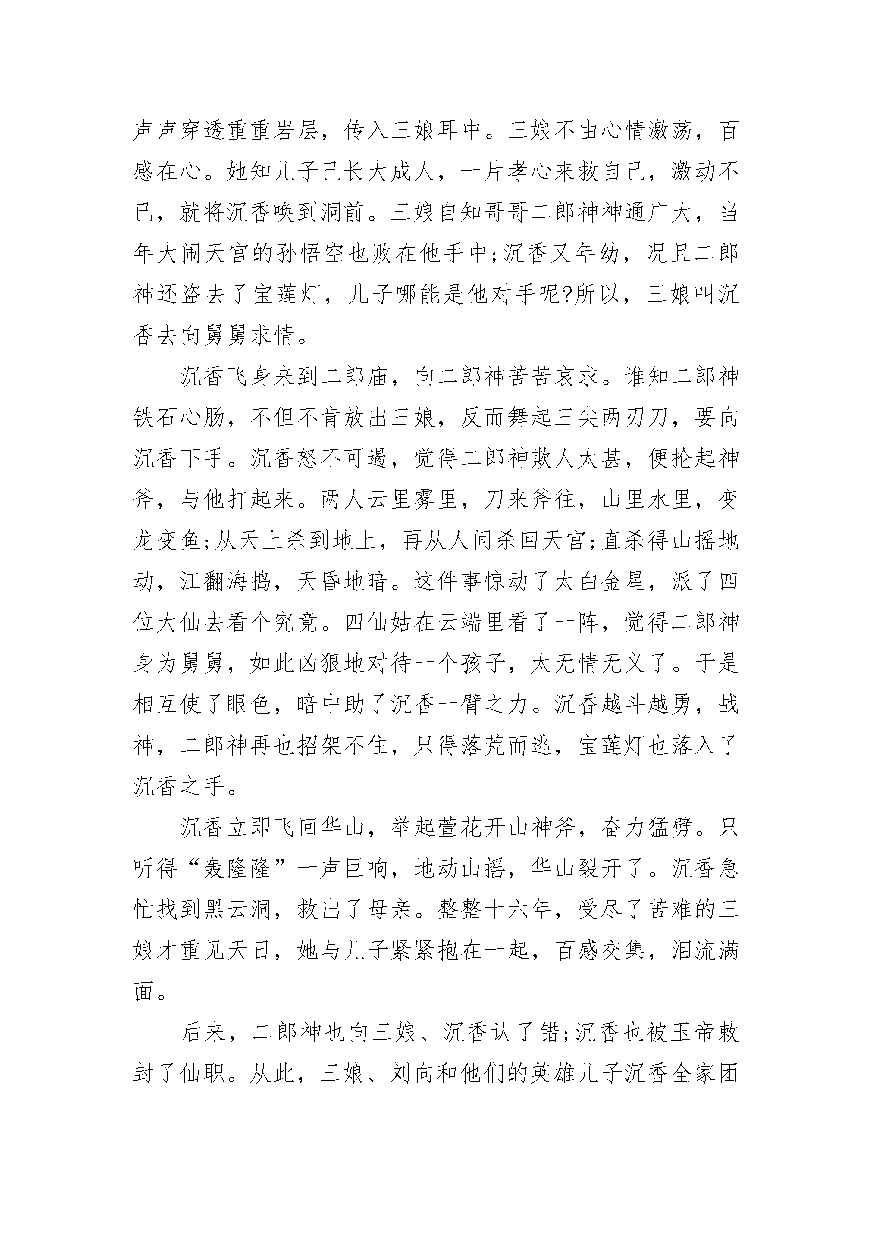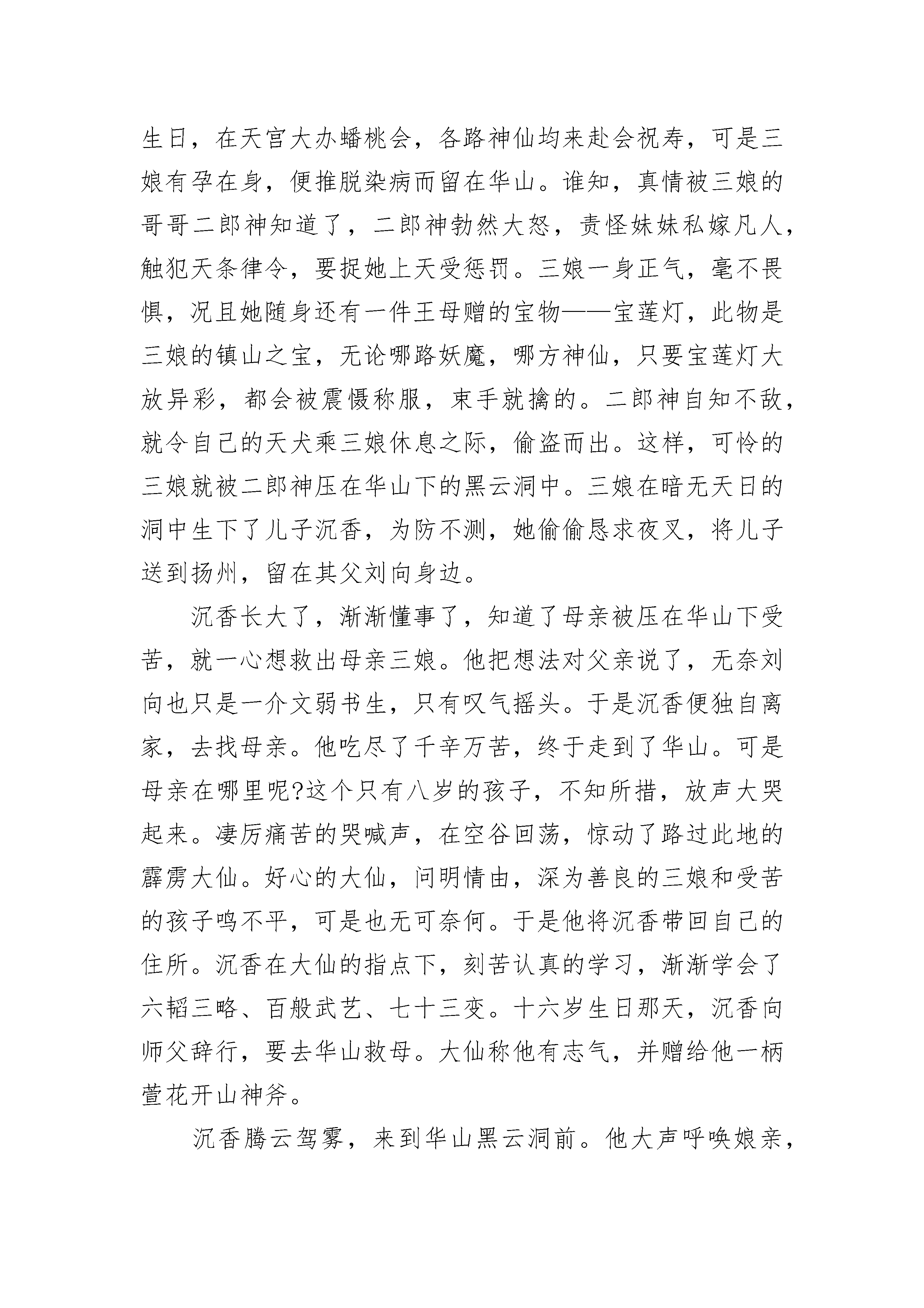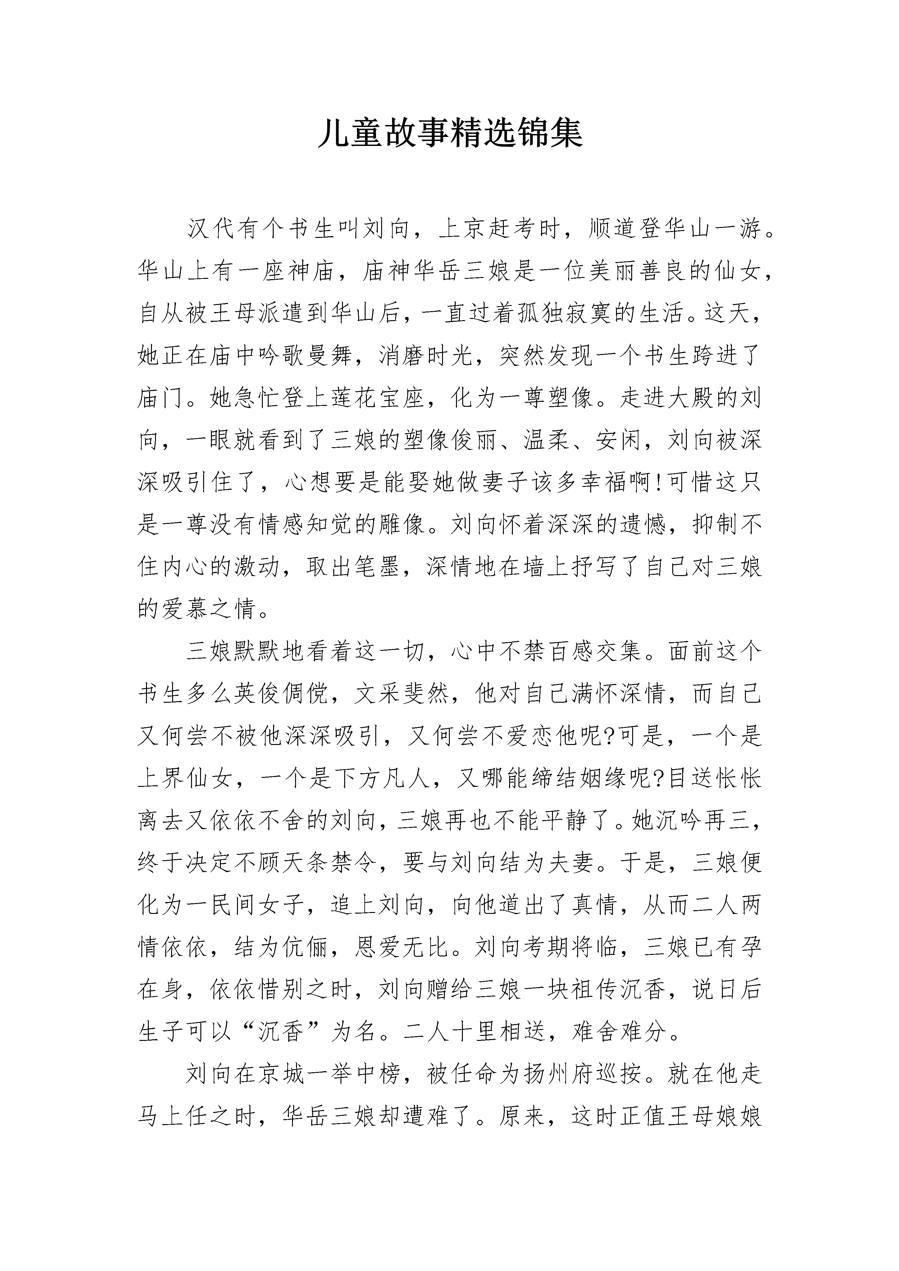 儿童故事精选锦集汉代有个书生叫刘向,上京赶考时,顺道登华山一游。华山上有一座神庙,庙神华岳三娘是一位美丽善良的仙女,自从被王母派遣到华山后,一直过着孤独寂寞的生活。这天,她正在庙中吟歌曼舞,消磨时光,突然发现一个书生跨进了庙门。她急忙登上莲花宝座,化为一尊塑像。走进大殿的刘向,一眼就看到了三娘的塑像俊丽、温柔、安闲,刘向被深深吸引住了,心想要是能娶她做妻子该多幸福啊!可惜这只是一尊没有情感知觉的雕像。刘向怀着深深的遗憾,抑制不住内心的激动,取出笔墨,深情地在墙上抒写了自己对三娘的爱慕之情。三娘默默地看着这一切,心中不禁百感交集。面前这个书生多么英俊倜傥,文采斐然,他对自己满怀深情,而自己又何尝不被他深深吸引,又何尝不爱恋他呢?可是,一个是上界仙女,一个是下方凡人,又哪能缔结姻缘呢?目送怅怅离去又依依不舍的刘向,三娘再也不能平静了。她沉吟再三,终于决定不顾天条禁令,要与刘向结为夫妻。于是,三娘便化为一民间女子,追上刘向,向他道出了真情,从而二人两情依依,结为伉俪,恩爱无比。刘向考期将临,三娘已有孕在身,依依惜别之时,刘向赠给三娘一块祖传沉香,说日后生子可以“沉香”为名。二人十里相送,难舍难分。刘向在京城一举中榜,被任命为扬州府巡按。就在他走马上任之时,华岳三娘却遭难了。原来,这时正值王母娘娘生日,在天宫大办蟠桃会,各路神仙均来赴会祝寿,可是三娘有孕在身,便推脱染病而留在华山。谁知,真情被三娘的哥哥二郎神知道了,二郎神勃然大怒,责怪妹妹私嫁凡人,触犯天条律令,要捉她上天受惩罚。三娘一身正气,毫不畏惧,况且她随身还有一件王母赠的宝物——宝莲灯,此物是三娘的镇山之宝,无论哪路妖魔,哪方神仙,只要宝莲灯大放异彩,都会被震慑称服,束手就擒的。二郎神自知不敌,就令自己的天犬乘三娘休息之际,偷盗而出。这样,可怜的三娘就被二郎神压在华山下的黑云洞中。三娘在暗无天日的洞中生下了儿子沉香,为防不测,她偷偷恳求夜叉,将儿子送到扬州,留在其父刘向身边。沉香长大了,渐渐懂事了,知道了母亲被压在华山下受苦,就一心想救出母亲三娘。他把想法对父亲说了,无奈刘向也只是一介文弱书生,只有叹气摇头。于是沉香便独自离家,去找母亲。他吃尽了千辛万苦,终于走到了华山。可是母亲在哪里呢?这个只有八岁的孩子,不知所措,放声大哭起来。凄厉痛苦的哭喊声,在空谷回荡,惊动了路过此地的霹雳大仙。好心的大仙,问明情由,深为善良的三娘和受苦的孩子鸣不平,可是也无可奈何。于是他将沉香带回自己的住所。沉香在大仙的指点下,刻苦认真的学习,渐渐学会了六韬三略、百般武艺、七十三变。十六岁生日那天,沉香向师父辞行,要去华山救母。大仙称他有志气,并赠给他一柄萱花开山神斧。沉香腾云驾雾,来到华山黑云洞前。他大声呼唤娘亲,声声穿透重重岩层,传入三娘耳中。三娘不由心情激荡,百感在心。她知儿子已长大成人,一片孝心来救自己,激动不已,就将沉香唤到洞前。三娘自知哥哥二郎神神通广大,当年大闹天宫的孙悟空也败在他手中;沉香又年幼,况且二郎神还盗去了宝莲灯,儿子哪能是他对手呢?所以,三娘叫沉香去向舅舅求情。沉香飞身来到二郎庙,向二郎神苦苦哀求。谁知二郎神铁石心肠,不但不肯放出三娘,反而舞起三尖两刃刀,要向沉香下手。沉香怒不可遏,觉得二郎神欺人太甚,便抡起神斧,与他打起来。两人云里雾里,刀来斧往,山里水里,变龙变鱼;从天上杀到地上,再从人间杀回天宫;直杀得山摇地动,江翻海捣,天昏地暗。这件事惊动了太白金星,派了四位大仙去看个究竟。四仙姑在云端里看了一阵,觉得二郎神身为舅舅,如此凶狠地对待一个孩子,太无情无义了。于是相互使了眼色,暗中助了沉香一臂之力。沉香越斗越勇,战神,二郎神再也招架不住,只得落荒而逃,宝莲灯也落入了沉香之手。沉香立即飞回华山,举起萱花开山神斧,奋力猛劈。只听得“轰隆隆”一声巨响,地动山摇,华山裂开了。沉香急忙找到黑云洞,救出了母亲。整整十六年,受尽了苦难的三娘才重见天日,她与儿子紧紧抱在一起,百感交集,泪流满面。后来,二郎神也向三娘、沉香认了错;沉香也被玉帝敕封了仙职。从此,三娘、刘向和他们的英雄儿子沉香全家团圆,永远幸福地生活在一起啦。儿童故事精选锦集2星期日“晚安!”奥列·路却埃说;哈尔马点点头,于是他便跑过去,把曾祖父的画像翻过来面对着墙,好叫他不再像昨天那样,又来插嘴。“现在你得讲几个故事给我听:关于生活在一个豆荚里的五颗青豌豆的故事;关于一只公鸡的脚向母鸡的脚求爱的故事;关于一根装模作样的缝补针自以为是缝衣针的故事。”“好东西享受太过也会生厌的呀!”奥列·路却埃说。“您知道,我倒很想给你一样东西看看。我把我的弟弟介绍给你吧。他也叫做奥列·路却埃;不过他拜访任何人,从来不超过一次以上。当他到来的时候,总是把他所遇见的人抱在马上,讲故事给他听。他只知道两个故事。一个是极端的美丽,世上任何人都想