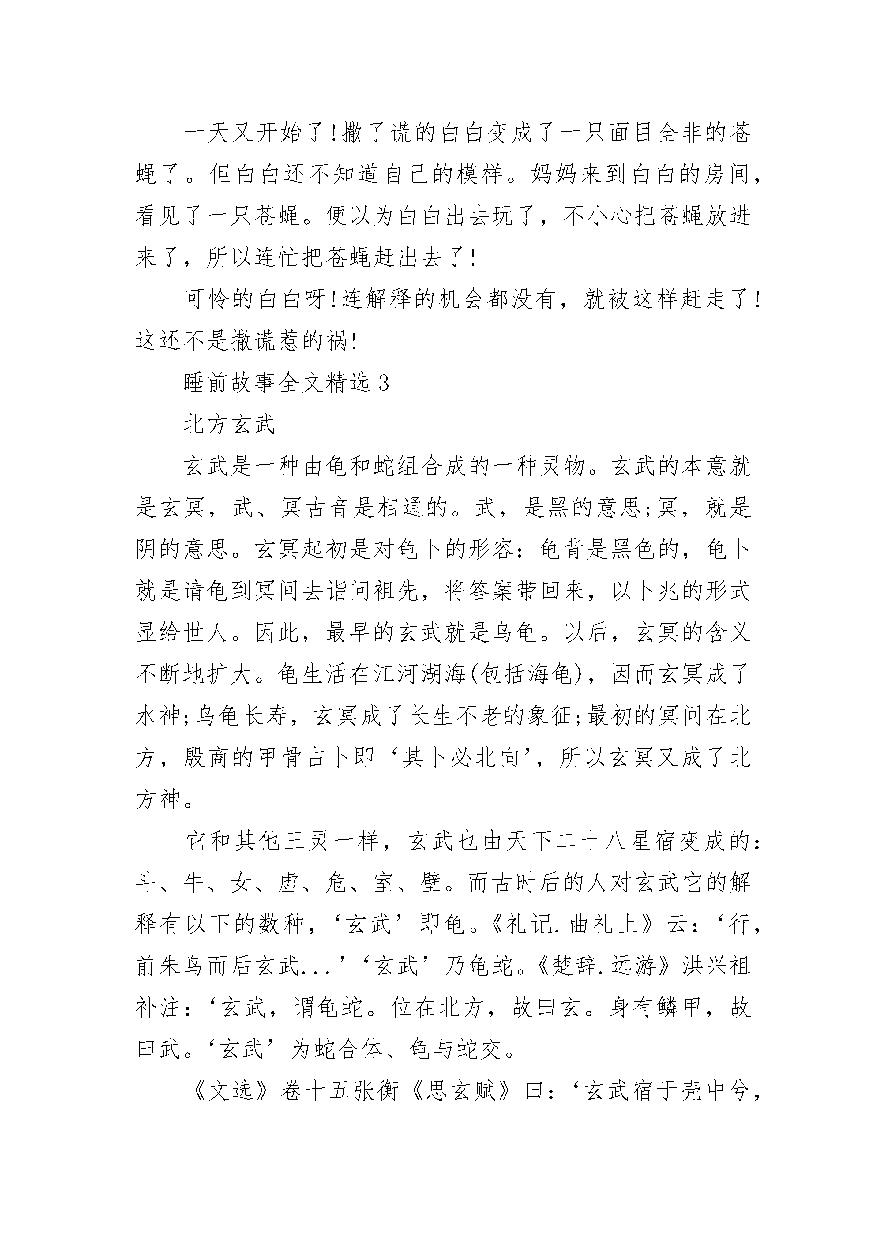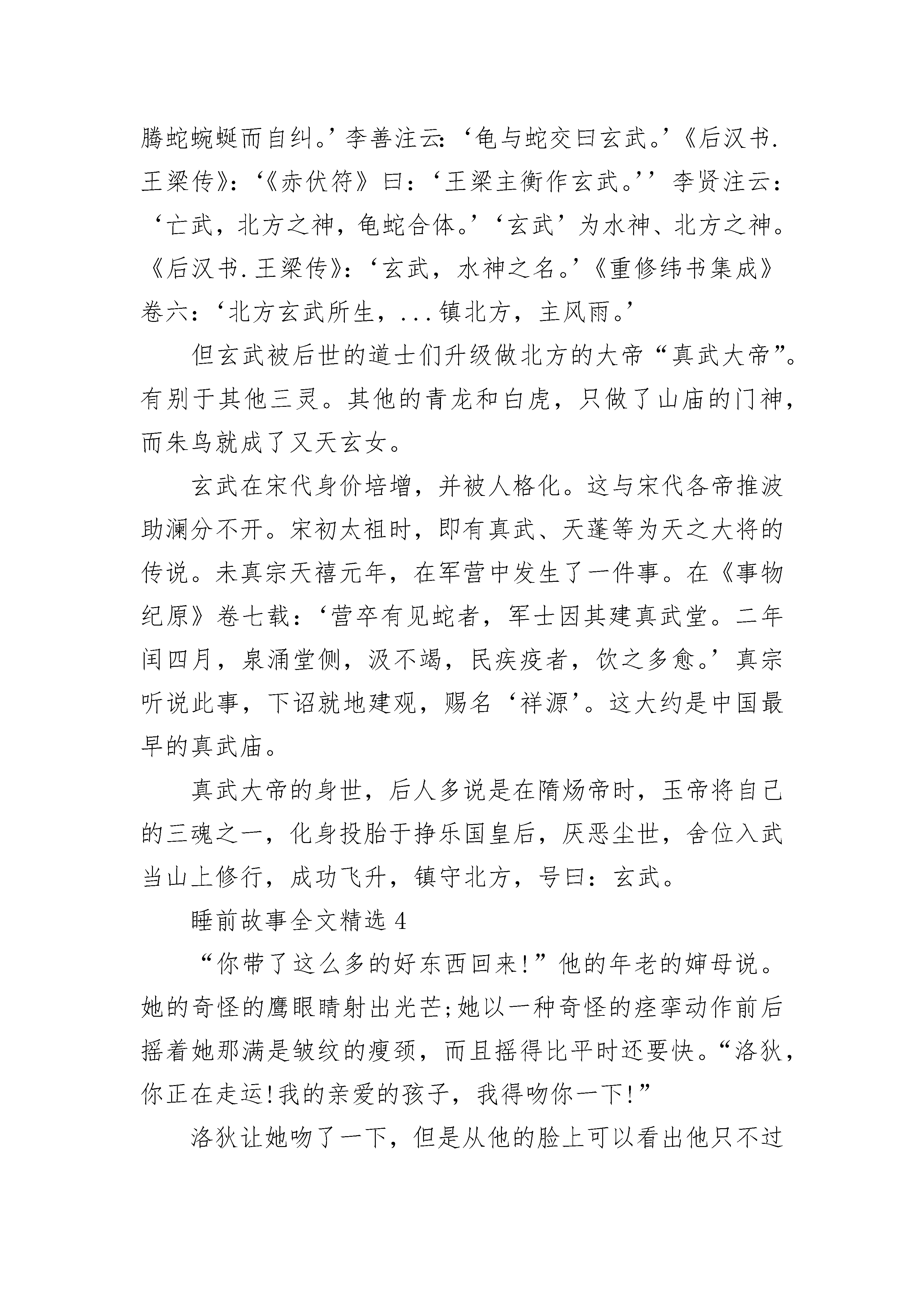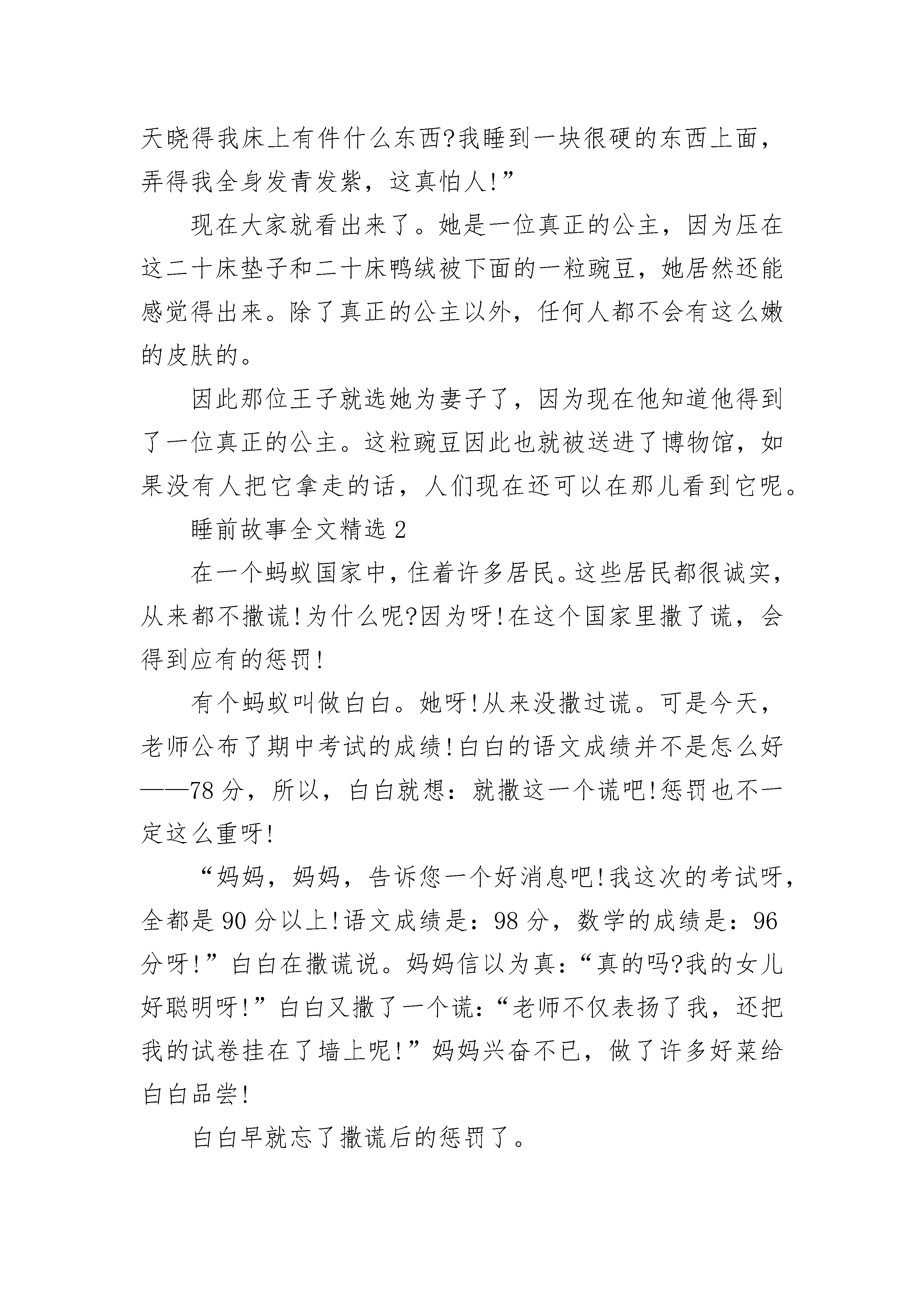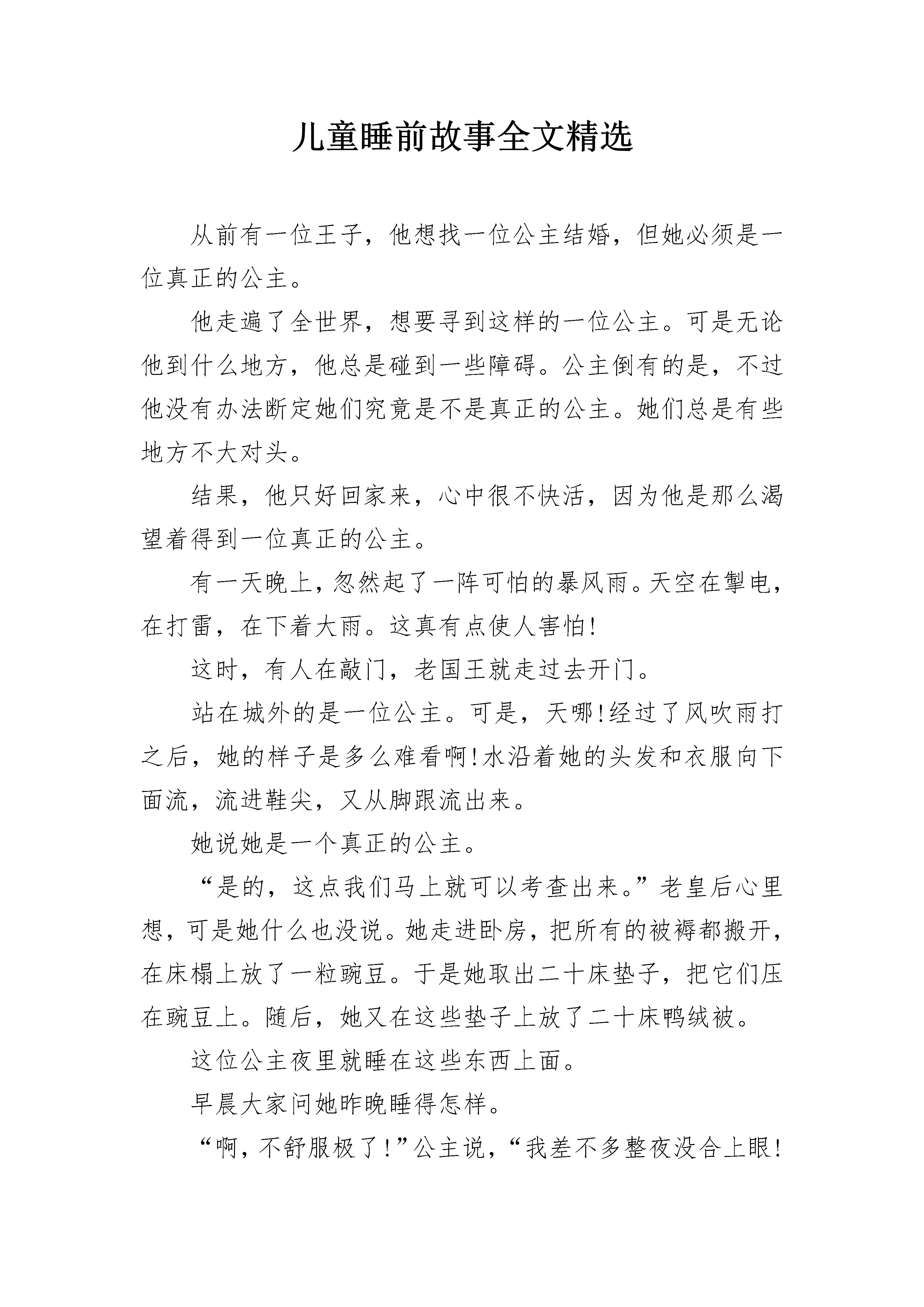 儿童睡前故事全文精选从前有一位王子,他想找一位公主结婚,但她必须是一位真正的公主。他走遍了全世界,想要寻到这样的一位公主。可是无论他到什么地方,他总是碰到一些障碍。公主倒有的是,不过他没有办法断定她们究竟是不是真正的公主。她们总是有些地方不大对头。结果,他只好回家来,心中很不快活,因为他是那么渴望着得到一位真正的公主。有一天晚上,忽然起了一阵可怕的暴风雨。天空在掣电,在打雷,在下着大雨。这真有点使人害怕!这时,有人在敲门,老国王就走过去开门。站在城外的是一位公主。可是,天哪!经过了风吹雨打之后,她的样子是多么难看啊!水沿着她的头发和衣服向下面流,流进鞋尖,又从脚跟流出来。她说她是一个真正的公主。“是的,这点我们马上就可以考查出来。”老皇后心里想,可是她什么也没说。她走进卧房,把所有的被褥都搬开,在床榻上放了一粒豌豆。于是她取出二十床垫子,把它们压在豌豆上。随后,她又在这些垫子上放了二十床鸭绒被。这位公主夜里就睡在这些东西上面。早晨大家问她昨晚睡得怎样。“啊,不舒服极了!”公主说,“我差不多整夜没合上眼!天晓得我床上有件什么东西?我睡到一块很硬的东西上面,弄得我全身发青发紫,这真怕人!”现在大家就看出来了。她是一位真正的公主,因为压在这二十床垫子和二十床鸭绒被下面的一粒豌豆,她居然还能感觉得出来。除了真正的公主以外,任何人都不会有这么嫩的皮肤的。因此那位王子就选她为妻子了,因为现在他知道他得到了一位真正的公主。这粒豌豆因此也就被送进了博物馆,如果没有人把它拿走的话,人们现在还可以在那儿看到它呢。睡前故事全文精选2在一个蚂蚁国家中,住着许多居民。这些居民都很诚实,从来都不撒谎!为什么呢?因为呀!在这个国家里撒了谎,会得到应有的惩罚!有个蚂蚁叫做白白。她呀!从来没撒过谎。可是今天,老师公布了期中考试的成绩!白白的语文成绩并不是怎么好——78分,所以,白白就想:就撒这一个谎吧!惩罚也不一定这么重呀!“妈妈,妈妈,告诉您一个好消息吧!我这次的考试呀,全都是90分以上!语文成绩是:98分,数学的成绩是:96分呀!”白白在撒谎说。妈妈信以为真:“真的吗?我的女儿好聪明呀!”白白又撒了一个谎:“老师不仅表扬了我,还把我的试卷挂在了墙上呢!”妈妈兴奋不已,做了许多好菜给白白品尝!白白早就忘了撒谎后的惩罚了。一天又开始了!撒了谎的白白变成了一只面目全非的苍蝇了。但白白还不知道自己的模样。妈妈来到白白的房间,看见了一只苍蝇。便以为白白出去玩了,不小心把苍蝇放进来了,所以连忙把苍蝇赶出去了!可怜的白白呀!连解释的机会都没有,就被这样赶走了!这还不是撒谎惹的祸!睡前故事全文精选3北方玄武玄武是一种由龟和蛇组合成的一种灵物。玄武的本意就是玄冥,武、冥古音是相通的。武,是黑的意思;冥,就是阴的意思。玄冥起初是对龟卜的形容:龟背是黑色的,龟卜就是请龟到冥间去诣问袓先,将答案带回来,以卜兆的形式显给世人。因此,最早的玄武就是乌龟。以后,玄冥的含义不断地扩大。龟生活在江河湖海(包括海龟),因而玄冥成了水神;乌龟长寿,玄冥成了长生不老的象征;最初的冥间在北方,殷商的甲骨占卜即‘其卜必北向’,所以玄冥又成了北方神。它和其他三灵一样,玄武也由天下二十八星宿变成的:斗、牛、女、虚、危、室、壁。而古时后的人对玄武它的解释有以下的数种,‘玄武’即龟。《礼记.曲礼上》云:‘行,前朱鸟而后玄武...’‘玄武’乃龟蛇。《楚辞.远游》洪兴祖补注:‘玄武,谓龟蛇。位在北方,故曰玄。身有鳞甲,故曰武。‘玄武’为蛇合体、龟与蛇交。《文选》卷十五张衡《思玄赋》曰:‘玄武宿于壳中兮,腾蛇蜿蜒而自纠。’李善注云:‘龟与蛇交曰玄武。’《后汉书.王梁传》:‘《赤伏符》曰:‘王梁主衡作玄武。’’李贤注云:‘亡武,北方之神,龟蛇合体。’‘玄武’为水神、北方之神。《后汉书.王梁传》:‘玄武,水神之名。’《重修纬书集成》卷六:‘北方玄武所生,...镇北方,主风雨。’但玄武被后世的道士们升级做北方的大帝“真武大帝”。有别于其他三灵。其他的青龙和白虎,只做了山庙的门神,而朱鸟就成了又天玄女。玄武在宋代身价培增,并被人格化。这与宋代各帝推波助澜分不开。宋初太祖时,即有真武、天蓬等为天之大将的传说。未真宗天禧元年,在军营中发生了一件事。在《事物纪原》卷七载:‘营卒有见蛇者,军士因其建真武堂。二年闰四月,泉涌堂侧,汲不竭,民疾疫者,饮之多愈。’真宗听说此事,下诏就地建观,赐名‘祥源’。这大约是中国最早的真武庙。真武大帝的身世,后人多说是在隋炀帝时,玉帝将自己的三魂之一,化身投胎于挣乐国皇后,厌恶尘世,舍位入武当山上修行,成功飞升,镇守北方,号曰:玄武。睡前故事全文精选4“你带了这么多的好东西回来!”他的年老的婶母说。她的奇怪的鹰眼睛射出光芒;她以一种奇怪的痉挛动作前后摇着她那满是皱纹的瘦颈,而且摇得比平时还要快