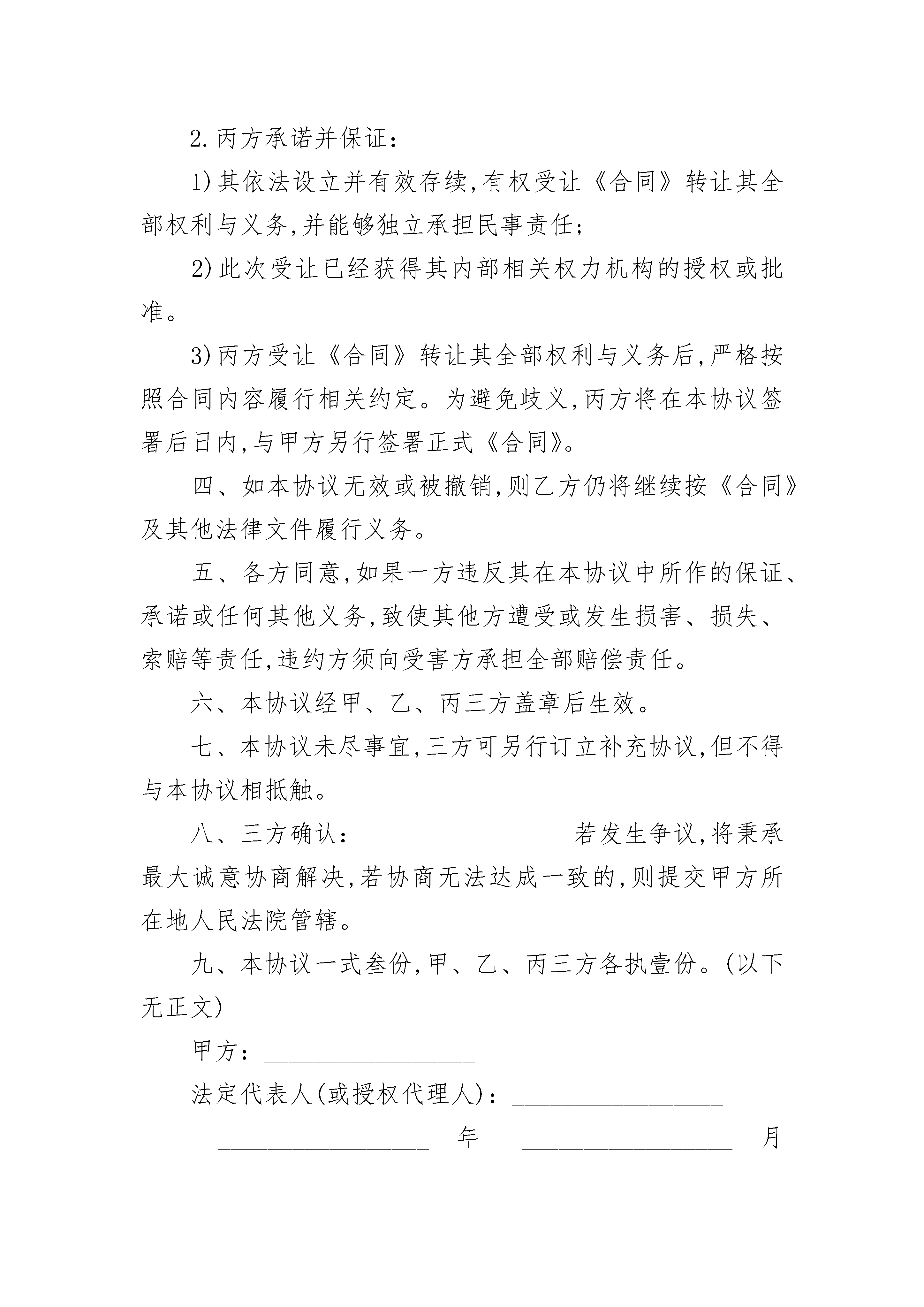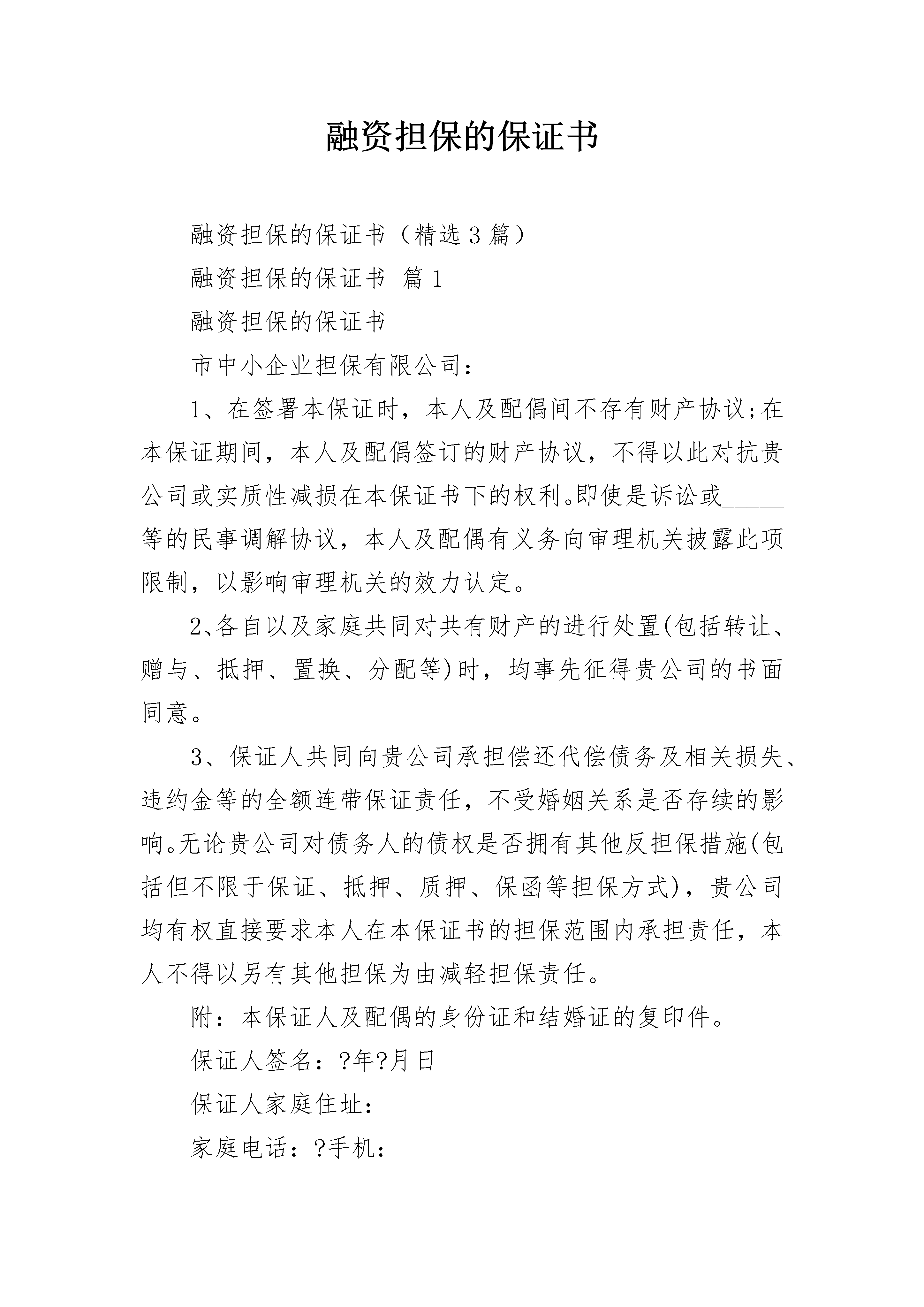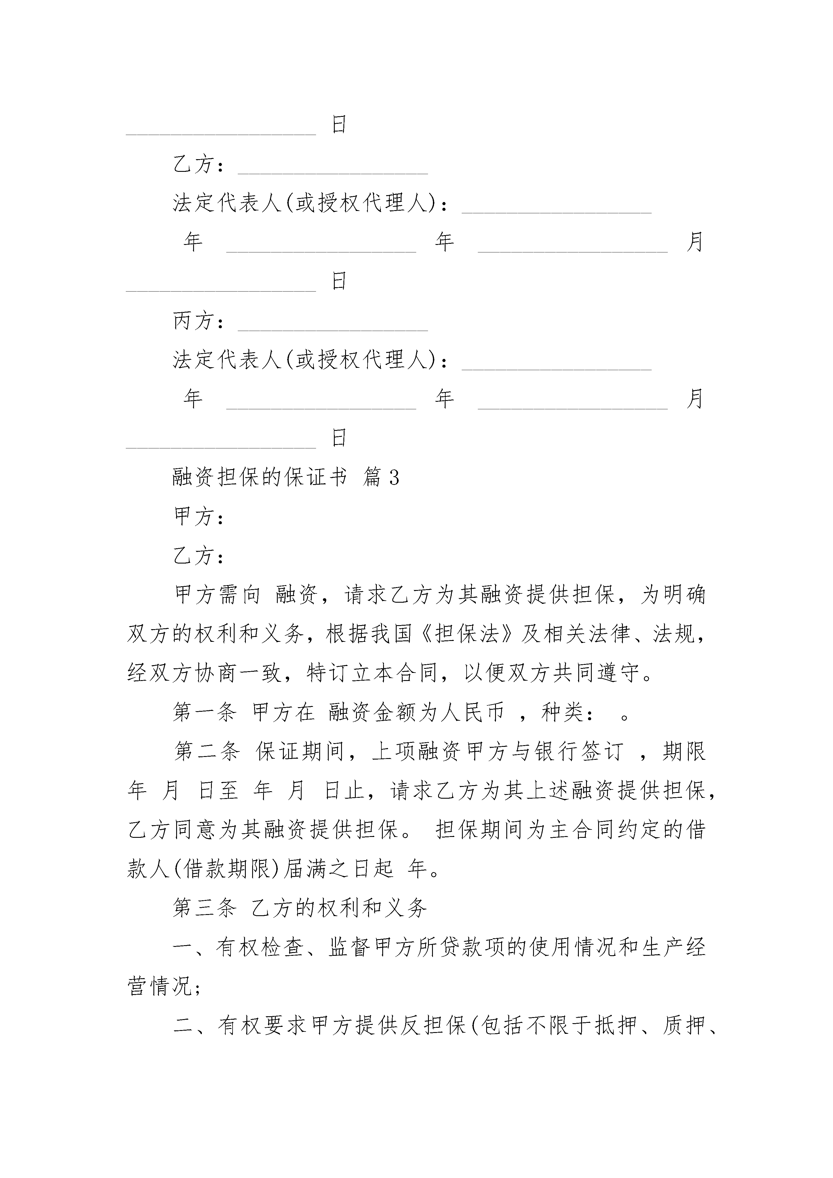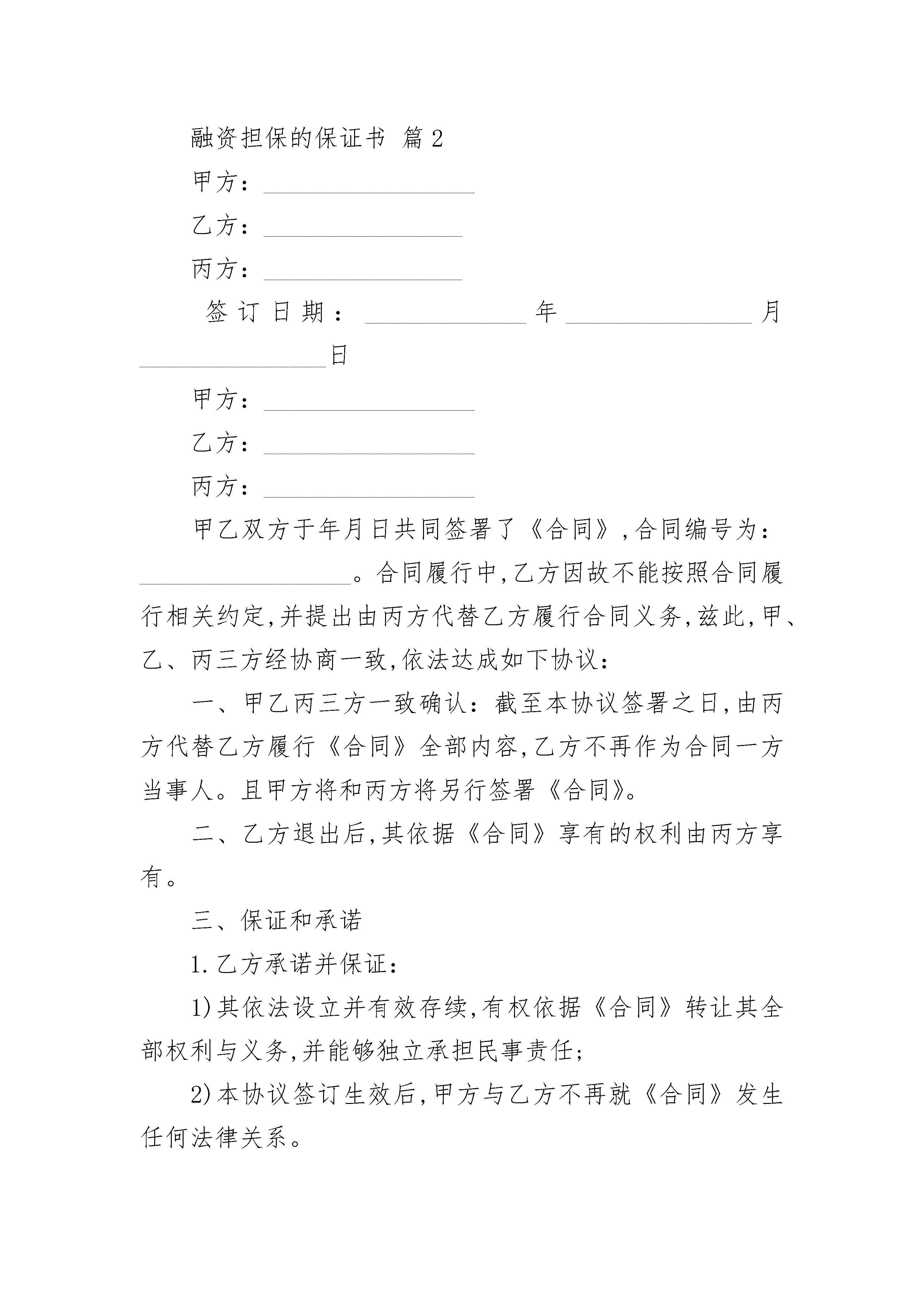 融资担保的保证书融资担保的保证书(精选3篇)融资担保的保证书篇1融资担保的保证书市中小企业担保有限公司:1、在签署本保证时,本人及配偶间不存有财产协议;在本保证期间,本人及配偶签订的财产协议,不得以此对抗贵公司或实质性减损在本保证书下的权利。即使是诉讼或_____等的民事调解协议,本人及配偶有义务向审理机关披露此项限制,以影响审理机关的效力认定。2、各自以及家庭共同对共有财产的进行处置(包括转让、赠与、抵押、置换、分配等)时,均事先征得贵公司的书面同意。3、保证人共同向贵公司承担偿还代偿债务及相关损失、违约金等的全额连带保证责任,不受婚姻关系是否存续的影响。无论贵公司对债务人的债权是否拥有其他反担保措施(包括但不限于保证、抵押、质押、保函等担保方式),贵公司均有权直接要求本人在本保证书的担保范围内承担责任,本人不得以另有其他担保为由减轻担保责任。附:本保证人及配偶的身份证和结婚证的复印件。保证人签名:?年?月日保证人家庭住址:家庭电话:?手机:融资担保的保证书篇2甲方:_________________乙方:________________丙方:________________签订日期:_____________年_______________月_______________日甲方:_________________乙方:_________________丙方:_________________甲乙双方于年月日共同签署了《合同》,合同编号为:_________________。合同履行中,乙方因故不能按照合同履行相关约定,并提出由丙方代替乙方履行合同义务,兹此,甲、乙、丙三方经协商一致,依法达成如下协议:一、甲乙丙三方一致确认:截至本协议签署之日,由丙方代替乙方履行《合同》全部内容,乙方不再作为合同一方当事人。且甲方将和丙方将另行签署《合同》。二、乙方退出后,其依据《合同》享有的权利由丙方享有。三、保证和承诺1.乙方承诺并保证:1)其依法设立并有效存续,有权依据《合同》转让其全部权利与义务,并能够独立承担民事责任;2)本协议签订生效后,甲方与乙方不再就《合同》发生任何法律关系。2.丙方承诺并保证:1)其依法设立并有效存续,有权受让《合同》转让其全部权利与义务,并能够独立承担民事责任;2)此次受让已经获得其内部相关权力机构的授权或批准。3)丙方受让《合同》转让其全部权利与义务后,严格按照合同内容履行相关约定。为避免歧义,丙方将在本协议签署后日内,与甲方另行签署正式《合同》。四、如本协议无效或被撤销,则乙方仍将继续按《合同》及其他法律文件履行义务。五、各方同意,如果一方违反其在本协议中所作的保证、承诺或任何其他义务,致使其他方遭受或发生损害、损失、索赔等责任,违约方须向受害方承担全部赔偿责任。六、本协议经甲、乙、丙三方盖章后生效。七、本协议未尽事宜,三方可另行订立补充协议,但不得与本协议相抵触。八、三方确认:_________________若发生争议,将秉承最大诚意协商解决,若协商无法达成一致的,则提交甲方所在地人民法院管辖。九、本协议一式叁份,甲、乙、丙三方各执壹份。(以下无正文)甲方:_________________法定代表人(或授权代理人):__________________________________年_________________月_________________日乙方:_________________法定代表人(或授权代理人):_________________年_________________年_________________月_________________日丙方:_________________法定代表人(或授权代理人):_________________年_________________年_________________月_________________日融资担保的保证书篇3甲方:乙方:甲方需向融资,请求乙方为其融资提供担保,为明确双方的权利和义务,根据我国《担保法》及相关法律、法规,经双方协商一致,特订立本合同,以便双方共同遵守。第一条甲方在融资金额为人民币,种类:。第二条保证期间,上项融资甲方与银行签订,期限年月日至年月日止,请求乙方为其上述融资提供担保,乙方同意为其融资提供担保。担保期间为主合同约定的借款人(借款期限)届满之日起年。第三条乙方的权利和义务一、有权检查、监督甲方所贷款项的使用情况和生产经营情况;二、有权要求甲方提供反担保(包括不限于抵押、质押、保证);三、甲方如不能按期偿还贷款,从乙方代为偿还之日起,乙方即有权要求甲方或反担保人承担连带责任,并有权依法处置抵押物、质押物后优先受偿;四、乙方按担保金额一次性向甲方收取担保手续费,收费标准为年息%;(不足一个月