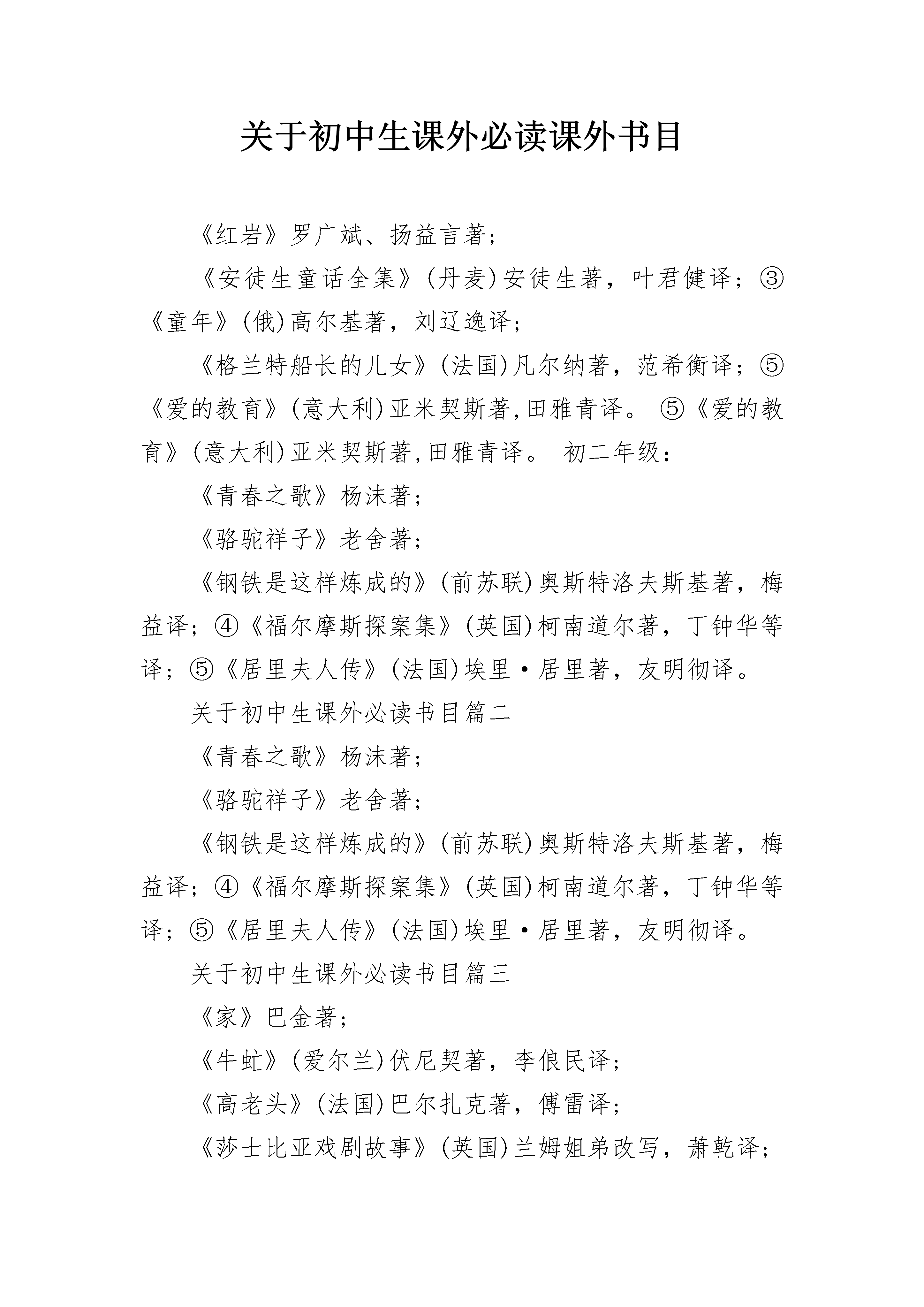 关于初中生课外必读课外书目《红岩》罗广斌、扬益言著;《安徒生童话全集》(丹麦)安徒生著,叶君健译;③《童年》(俄)高尔基著,刘辽逸译;《格兰特船长的儿女》(法国)凡尔纳著,范希衡译;⑤《爱的教育》(意大利)亚米契斯著,田雅青译。⑤《爱的教育》(意大利)亚米契斯著,田雅青译。初二年级:《青春之歌》杨沫著;《骆驼祥子》老舍著;《钢铁是这样炼成的》(前苏联)奥斯特洛夫斯基著,梅益译;④《福尔摩斯探案集》(英国)柯南道尔著,丁钟华等译;⑤《居里夫人传》(法国)埃里·居里著,友明彻译。关于初中生课外必读书目篇二《青春之歌》杨沫著;《骆驼祥子》老舍著;《钢铁是这样炼成的》(前苏联)奥斯特洛夫斯基著,梅益译;④《福尔摩斯探案集》(英国)柯南道尔著,丁钟华等译;⑤《居里夫人传》(法国)埃里·居里著,友明彻译。关于初中生课外必读书目篇三《家》巴金著;《牛虻》(爱尔兰)伏尼契著,李俍民译;《高老头》(法国)巴尔扎克著,傅雷译;《莎士比亚戏剧故事》(英国)兰姆姐弟改写,萧乾译;《中国科学院院士自述(青少年版)》上海教育出版社编。关于初中生课外必读书目