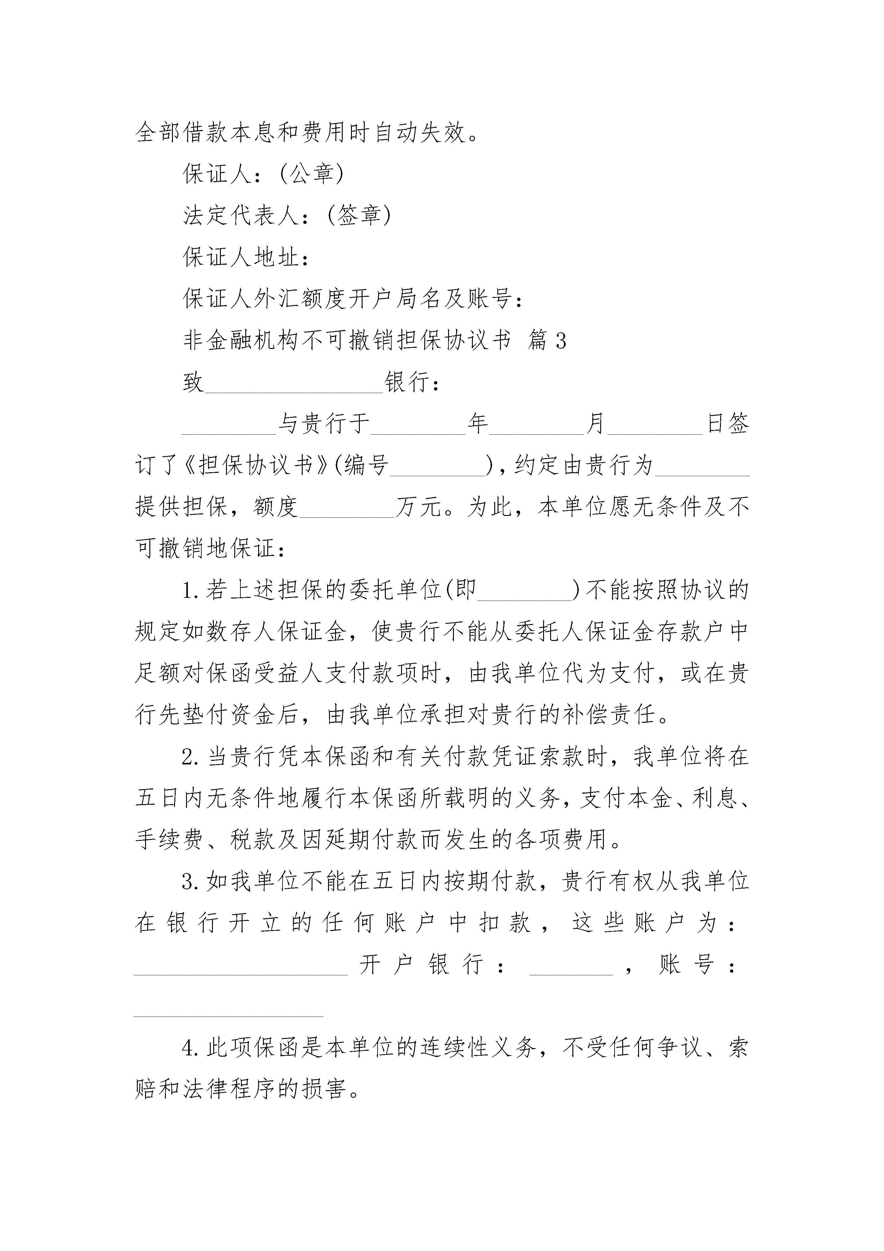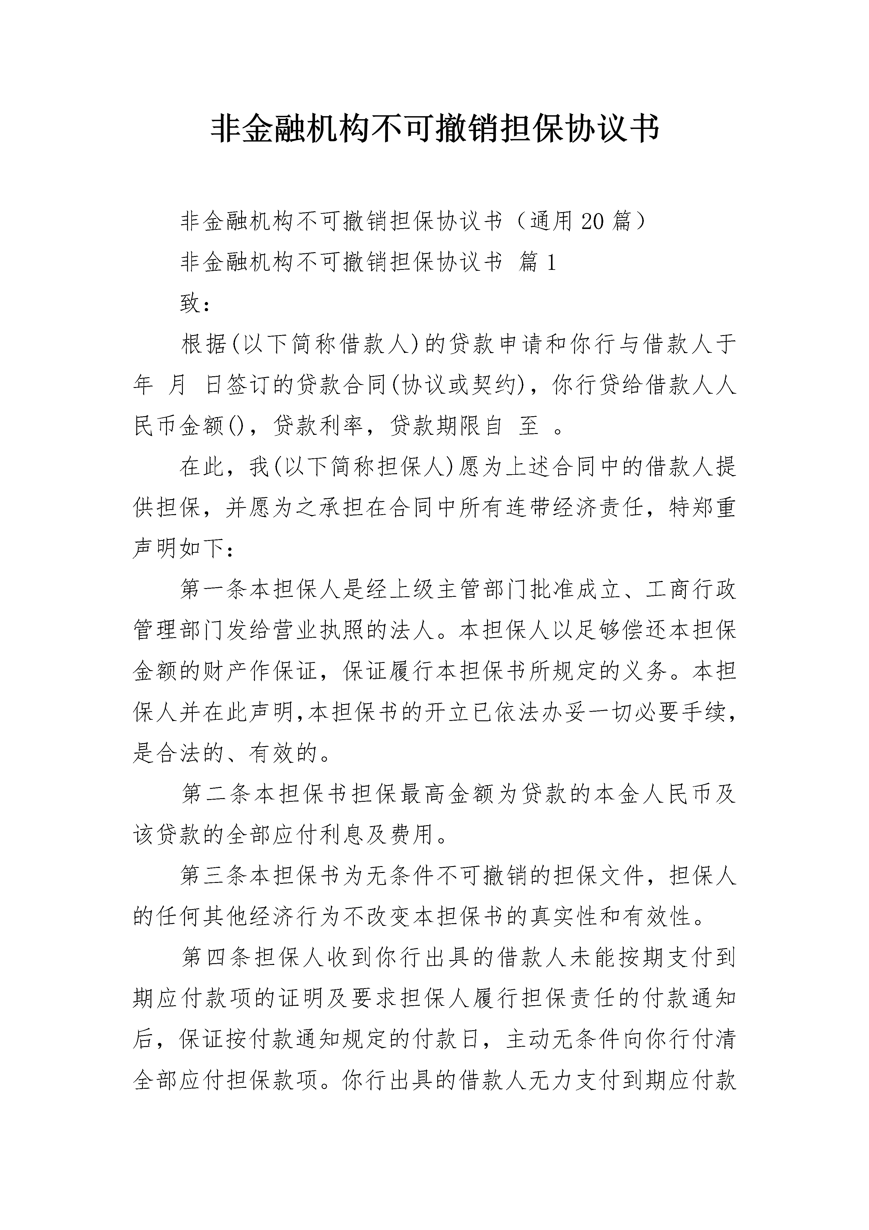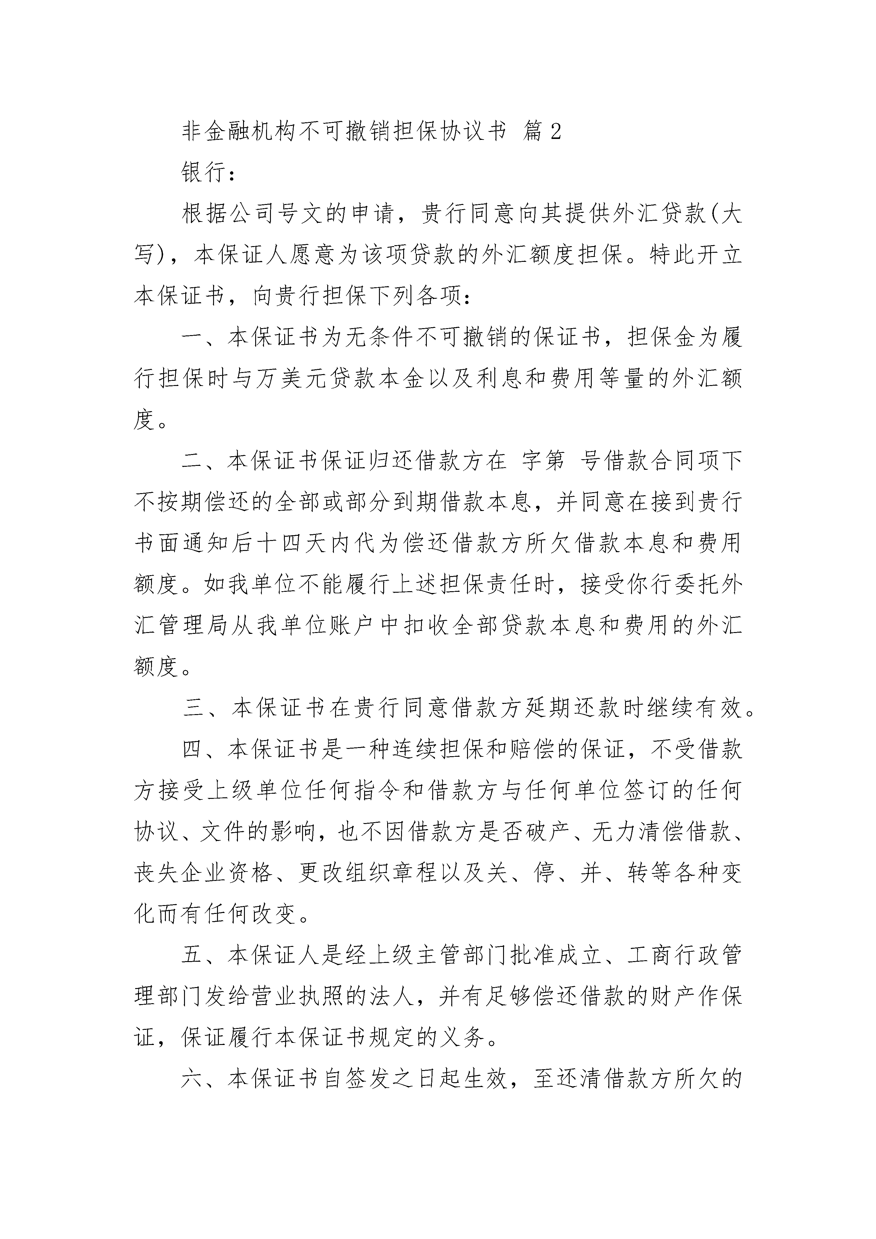 非金融机构不可撤销担保协议书非金融机构不可撤销担保协议书(通用20篇)非金融机构不可撤销担保协议书篇1致:根据(以下简称借款人)的贷款申请和你行与借款人于年月日签订的贷款合同(协议或契约),你行贷给借款人人民币金额(),贷款利率,贷款期限自至。在此,我(以下简称担保人)愿为上述合同中的借款人提供担保,并愿为之承担在合同中所有连带经济责任,特郑重声明如下:第一条本担保人是经上级主管部门批准成立、工商行政管理部门发给营业执照的法人。本担保人以足够偿还本担保金额的财产作保证,保证履行本担保书所规定的义务。本担保人并在此声明,本担保书的开立已依法办妥一切必要手续,是合法的、有效的。第二条本担保书担保最高金额为贷款的本金人民币及该贷款的全部应付利息及费用。第三条本担保书为无条件不可撤销的担保文件,担保人的任何其他经济行为不改变本担保书的真实性和有效性。第四条担保人收到你行出具的借款人未能按期支付到期应付款项的证明及要求担保人履行担保责任的付款通知后,保证按付款通知规定的付款日,主动无条件向你行付清全部应付担保款项。你行出具的借款人无力支付到期应付款项的证明和要求担保人履行担保责任的付款通知是终结性的,对借款人和担保人均有约束力。第五条本担保书不受借款人上级单位任何指令的制约,不受借款人与任何单位签订的任何协议、文件的制约,也不受借款人破产、无力清偿借款、丧失企业资格、更改组织章程及关、停、并、转等各种变化的制约,本担保书始终有效。只要担保的贷款本金不增加,你行对本担保贷款的合同任何修改或变通执行,均不改变担保人对贷款本息、费用偿付的担保责任。第六条担保人若未按你行通知期限偿款,担保人在此授权你行直接借记担保人账户,账号附后。第七条担保人如遇撤销、改组、破产或其他原因,失去担保资格和能力时,须提前3个月主动通知你行并推荐继承担保人,经你行确认继承担保人后,担保人协助办理担保责任转移手续。在转移担保责任未办妥前,担保人仍承担担保责任。第八条本担保书自签发之日起生效,至借款人或担保人偿清全部借款本息时自动失效。担保人(盖章):法定代表人(盖章):担保人地址:担保人电话:担保人:年月日非金融机构不可撤销担保协议书篇2银行:根据公司号文的申请,贵行同意向其提供外汇贷款(大写),本保证人愿意为该项贷款的外汇额度担保。特此开立本保证书,向贵行担保下列各项:一、本保证书为无条件不可撤销的保证书,担保金为履行担保时与万美元贷款本金以及利息和费用等量的外汇额度。二、本保证书保证归还借款方在字第号借款合同项下不按期偿还的全部或部分到期借款本息,并同意在接到贵行书面通知后十四天内代为偿还借款方所欠借款本息和费用额度。如我单位不能履行上述担保责任时,接受你行委托外汇管理局从我单位账户中扣收全部贷款本息和费用的外汇额度。三、本保证书在贵行同意借款方延期还款时继续有效。四、本保证书是一种连续担保和赔偿的保证,不受借款方接受上级单位任何指令和借款方与任何单位签订的任何协议、文件的影响,也不因借款方是否破产、无力清偿借款、丧失企业资格、更改组织章程以及关、停、并、转等各种变化而有任何改变。五、本保证人是经上级主管部门批准成立、工商行政管理部门发给营业执照的法人,并有足够偿还借款的财产作保证,保证履行本保证书规定的义务。六、本保证书自签发之日起生效,至还清借款方所欠的全部借款本息和费用时自动失效。保证人:(公章)法定代表人:(签章)保证人地址:保证人外汇额度开户局名及账号:非金融机构不可撤销担保协议书篇3致_______________银行:________与贵行于________年________月________日签订了《担保协议书》(编号________),约定由贵行为________提供担保,额度________万元。为此,本单位愿无条件及不可撤销地保证:1.若上述担保的委托单位(即________)不能按照协议的规定如数存人保证金,使贵行不能从委托人保证金存款户中足额对保函受益人支付款项时,由我单位代为支付,或在贵行先垫付资金后,由我单位承担对贵行的补偿责任。2.当贵行凭本保函和有关付款凭证索款时,我单位将在五日内无条件地履行本保函所载明的义务,支付本金、利息、手续费、税款及因延期付款而发生的各项费用。3.如我单位不能在五日内按期付款,贵行有权从我单位在银行开立的任何账户中扣款,这些账户为:__________________开户银行:_______,账号:________________4.此项保函是本单位的连续性义务,不受任何争议、索赔和法律程序的损害。本保函的担保责任将随本单位已付款金额而相对递减。5.本保函自即日起生效,至被担保人的债务履行完毕后失效。反担保单位:(公章)_____________法定代表人:(签字)_________________