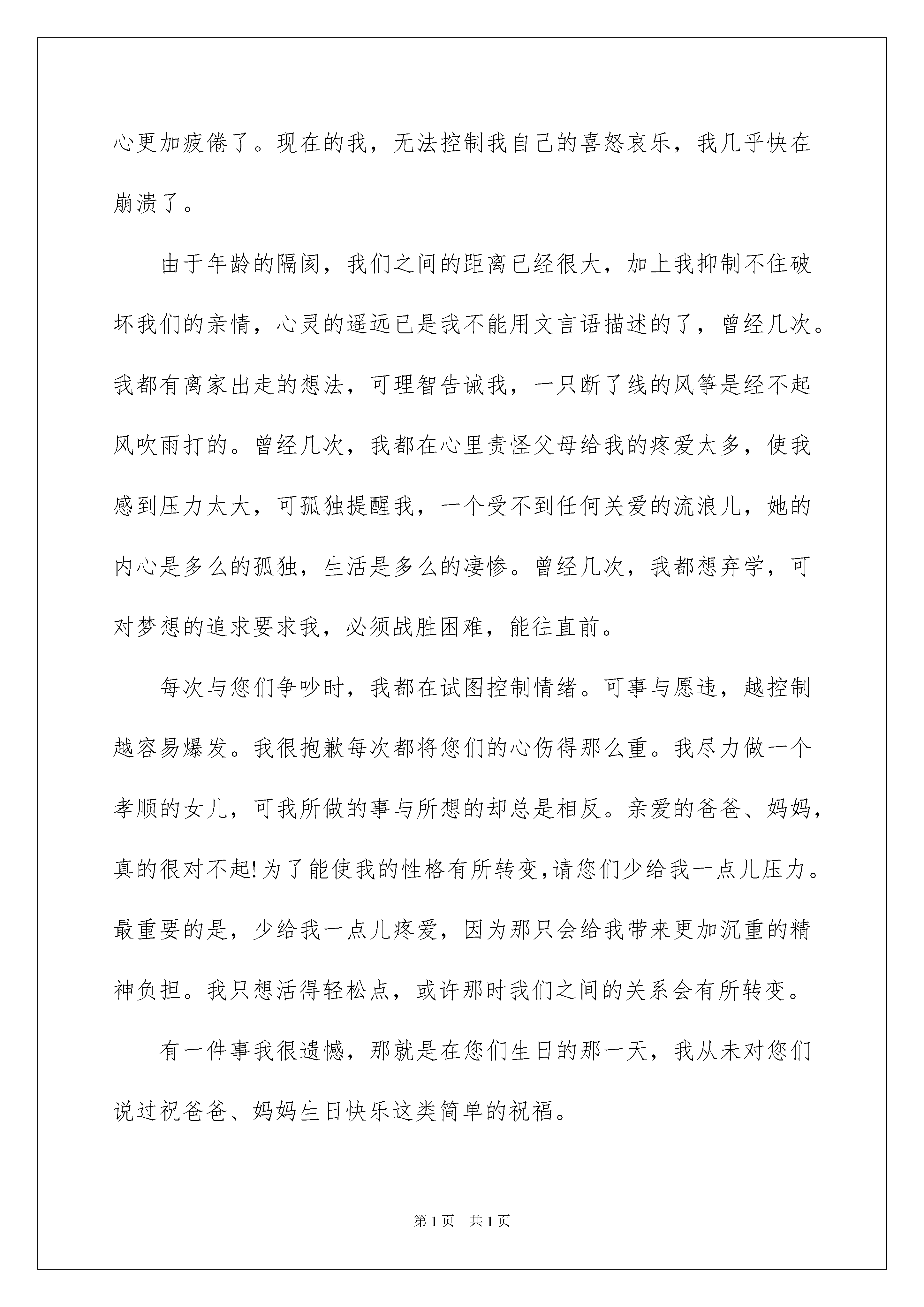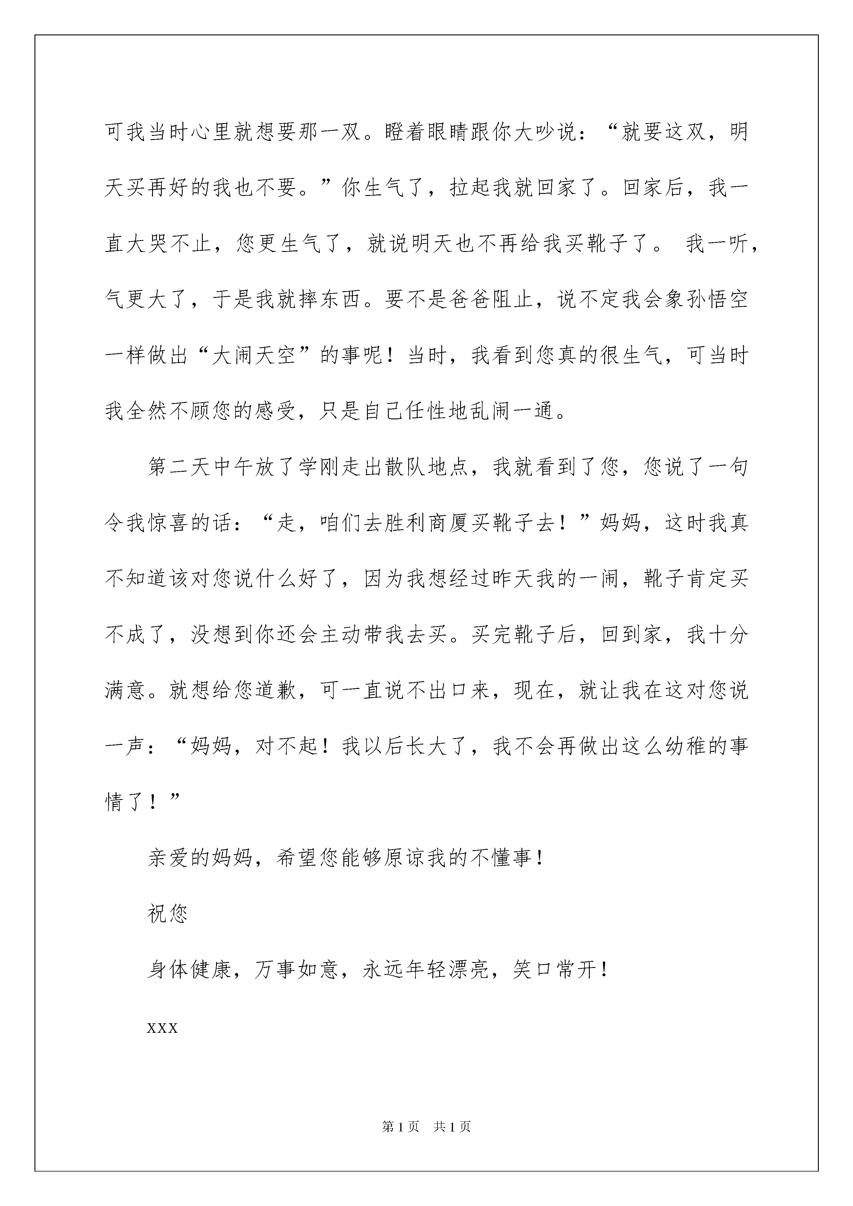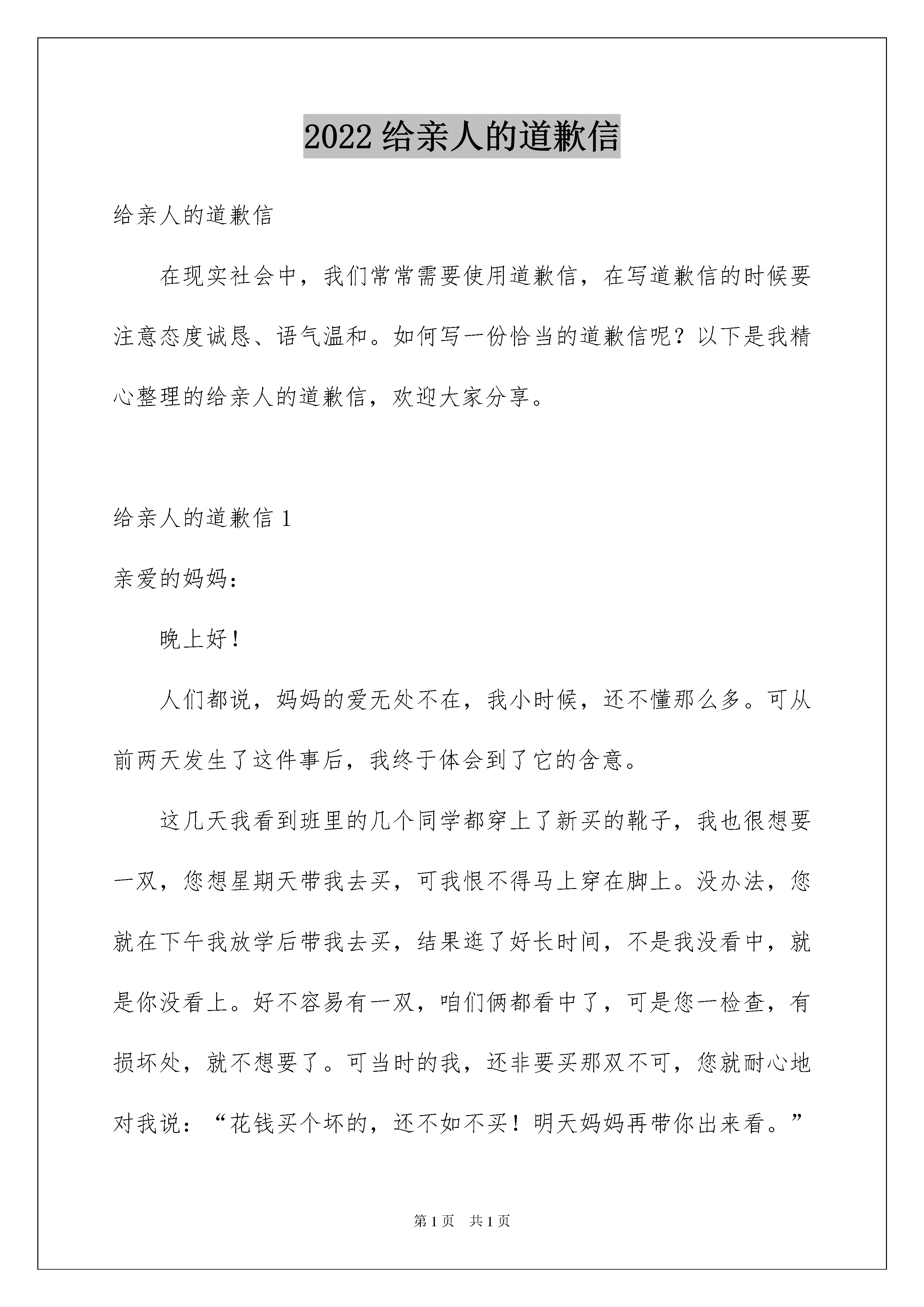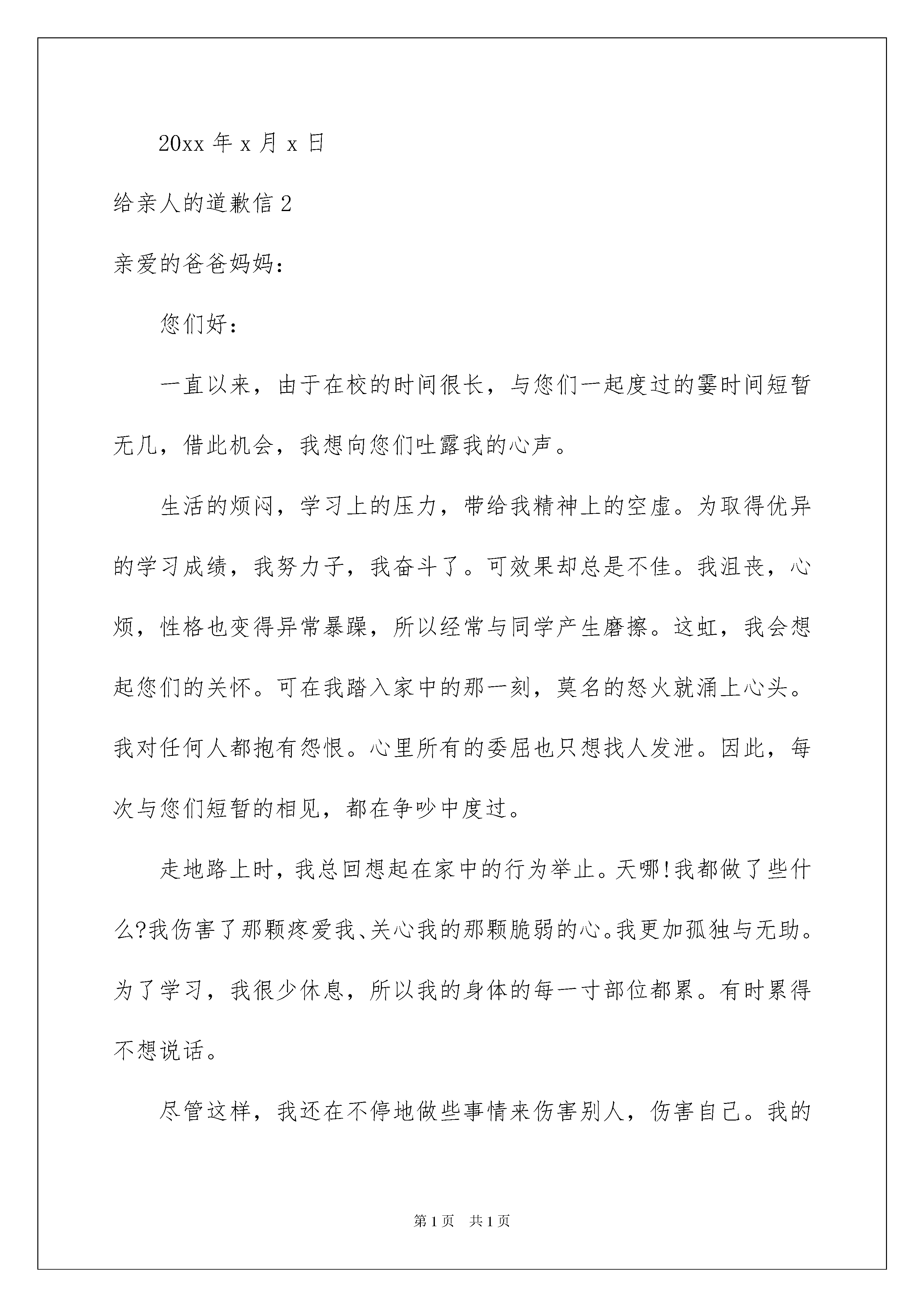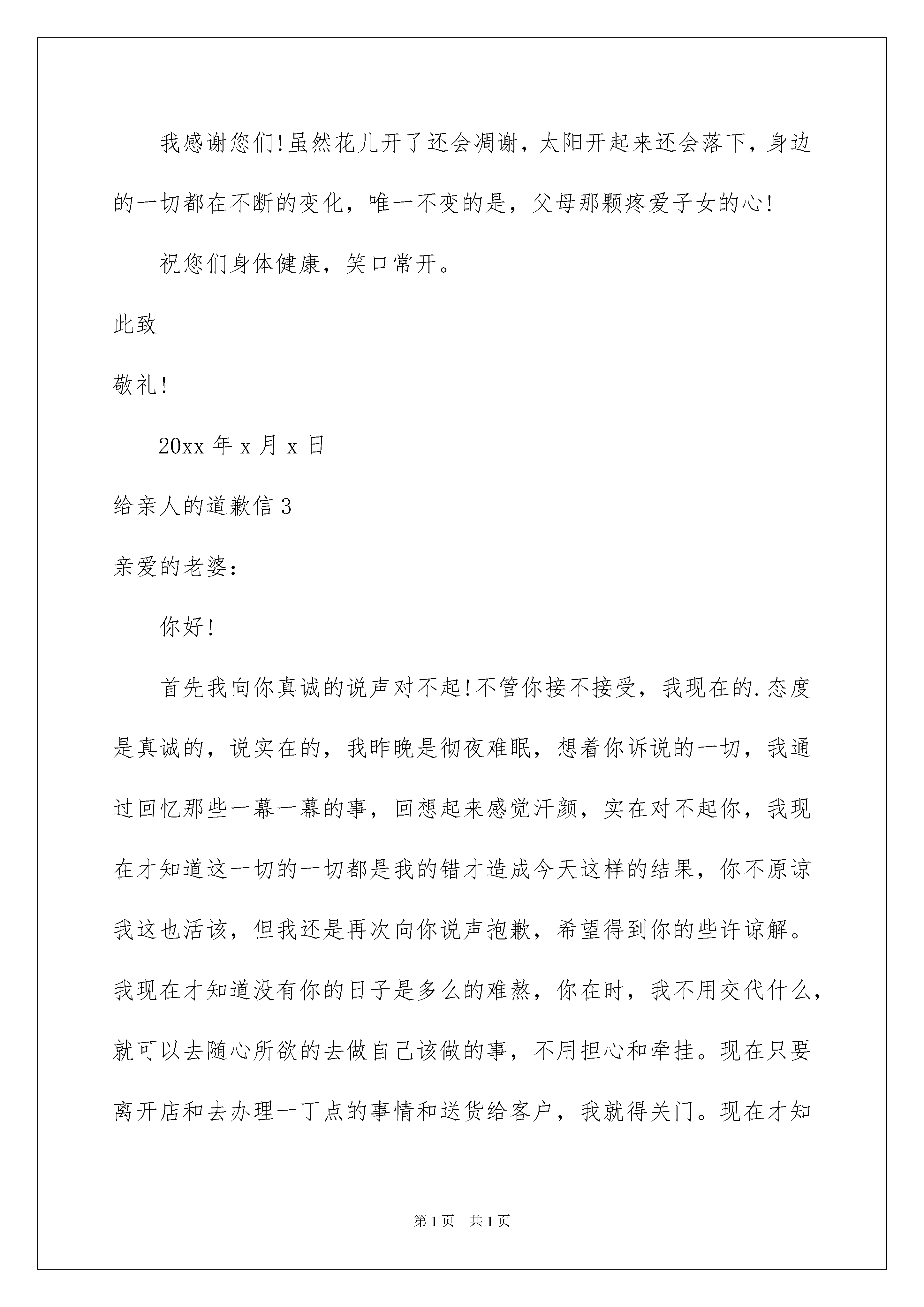 2022给亲人的道歉信给亲人的道歉信在现实社会中,我们常常需要使用道歉信,在写道歉信的时候要注意态度诚恳、语气温和。如何写一份恰当的道歉信呢?以下是我精心整理的给亲人的道歉信,欢迎大家分享。给亲人的道歉信1亲爱的妈妈:晚上好!人们都说,妈妈的爱无处不在,我小时候,还不懂那么多。可从前两天发生了这件事后,我终于体会到了它的含意。这几天我看到班里的几个同学都穿上了新买的靴子,我也很想要一双,您想星期天带我去买,可我恨不得马上穿在脚上。没办法,您就在下午我放学后带我去买,结果逛了好长时间,不是我没看中,就是你没看上。好不容易有一双,咱们俩都看中了,可是您一检查,有损坏处,就不想要了。可当时的我,还非要买那双不可,您就耐心地对我说:“花钱买个坏的,还不如不买!明天妈妈再带你出来看。”可我当时心里就想要那一双。瞪着眼睛跟你大吵说:“就要这双,明天买再好的我也不要。”你生气了,拉起我就回家了。回家后,我一直大哭不止,您更生气了,就说明天也不再给我买靴子了。我一听,气更大了,于是我就摔东西。要不是爸爸阻止,说不定我会象孙悟空一样做出“大闹天空”的事呢!当时,我看到您真的很生气,可当时我全然不顾您的感受,只是自己任性地乱闹一通。第二天中午放了学刚走出散队地点,我就看到了您,您说了一句令我惊喜的话:“走,咱们去胜利商厦买靴子去!”妈妈,这时我真不知道该对您说什么好了,因为我想经过昨天我的一闹,靴子肯定买不成了,没想到你还会主动带我去买。买完靴子后,回到家,我十分满意。就想给您道歉,可一直说不出口来,现在,就让我在这对您说一声:“妈妈,对不起!我以后长大了,我不会再做出这么幼稚的事情了!”亲爱的妈妈,希望您能够原谅我的不懂事!祝您身体健康,万事如意,永远年轻漂亮,笑口常开!xxx20xx年x月x日给亲人的道歉信2亲爱的爸爸妈妈:您们好:一直以来,由于在校的时间很长,与您们一起度过的霎时间短暂无几,借此机会,我想向您们吐露我的心声。生活的烦闷,学习上的压力,带给我精神上的空虚。为取得优异的学习成绩,我努力子,我奋斗了。可效果却总是不佳。我沮丧,心烦,性格也变得异常暴躁,所以经常与同学产生磨擦。这虹,我会想起您们的关怀。可在我踏入家中的那一刻,莫名的怒火就涌上心头。我对任何人都抱有怨恨。心里所有的委屈也只想找人发泄。因此,每次与您们短暂的相见,都在争吵中度过。走地路上时,我总回想起在家中的行为举止。天哪!我都做了些什么?我伤害了那颗疼爱我、关心我的那颗脆弱的心。我更加孤独与无助。为了学习,我很少休息,所以我的身体的每一寸部位都累。有时累得不想说话。尽管这样,我还在不停地做些事情来伤害别人,伤害自己。我的心更加疲倦了。现在的我,无法控制我自己的喜怒哀乐,我几乎快在崩溃了。由于年龄的隔阂,我们之间的距离已经很大,加上我抑制不住破坏我们的亲情,心灵的遥远已是我不能用文言语描述的了,曾经几次。我都有离家出走的想法,可理智告诫我,一只断了线的风筝是经不起风吹雨打的。曾经几次,我都在心里责怪父母给我的疼爱太多,使我感到压力太大,可孤独提醒我,一个受不到任何关爱的流浪儿,她的内心是多么的孤独,生活是多么的凄惨。曾经几次,我都想弃学,可对梦想的追求要求我,必须战胜困难,能往直前。每次与您们争吵时,我都在试图控制情绪。可事与愿违,越控制越容易爆发。我很抱歉每次都将您们的心伤得那么重。我尽力做一个孝顺的女儿,可我所做的事与所想的却总是相反。亲爱的爸爸、妈妈,真的很对不起!为了能使我的性格有所转变,请您们少给我一点儿压力。最重要的是,少给我一点儿疼爱,因为那只会给我带来更加沉重的精神负担。我只想活得轻松点,或许那时我们之间的关系会有所转变。有一件事我很遗憾,那就是在您们生日的那一天,我从未对您们说过祝爸爸、妈妈生日快乐这类简单的祝福。我感谢您们!虽然花儿开了还会凋谢,太阳开起来还会落下,身边的一切都在不断的变化,唯一不变的是,父母那颗疼爱子女的心!祝您们身体健康,笑口常开。此致敬礼!20xx年x月x日给亲人的道歉信3亲爱的老婆:你好!首先我向你真诚的说声对不起!不管你接不接受,我现在的.态度是真诚的,说实在的,我昨晚是彻夜难眠,想着你诉说的一切,我通过回忆那些一幕一幕的事,回想起来感觉汗颜,实在对不起你,我现在才知道这一切的一切都是我的错才造成今天这样的结果,你不原谅我这也活该,但我还是再次向你说声抱歉,希望得到你的些许谅解。我现在才知道没有你的日子是多么的难熬,你在时,我不用交代什么,就可以去随心所欲的去做自己该做的事,不用担心和牵挂。现在只要离开店和去办理一丁点的事情和送货给客户,我就得关门。现在才知道,你的重要