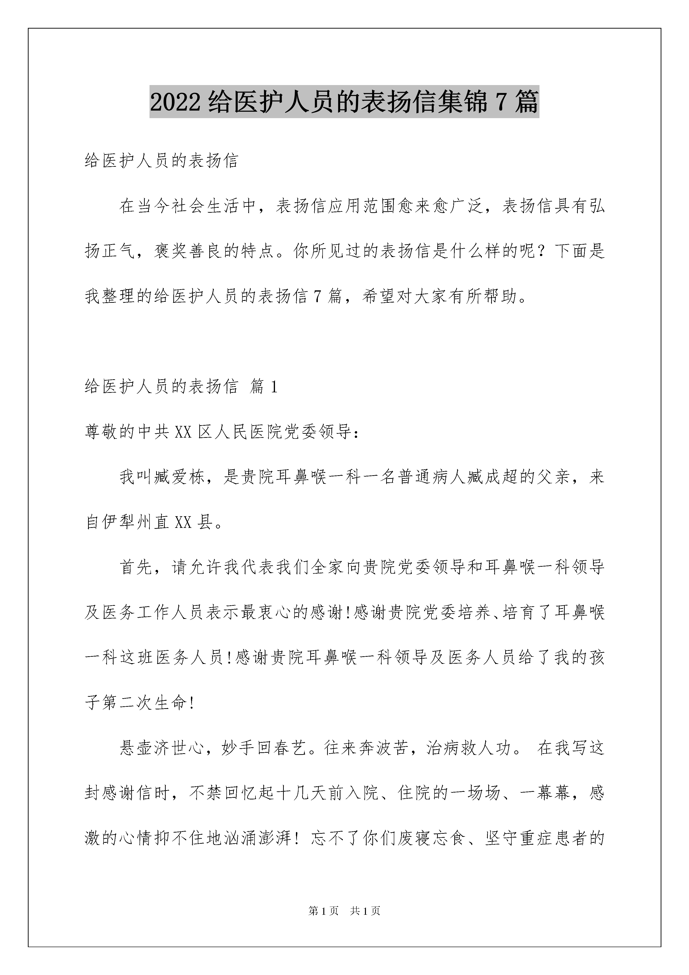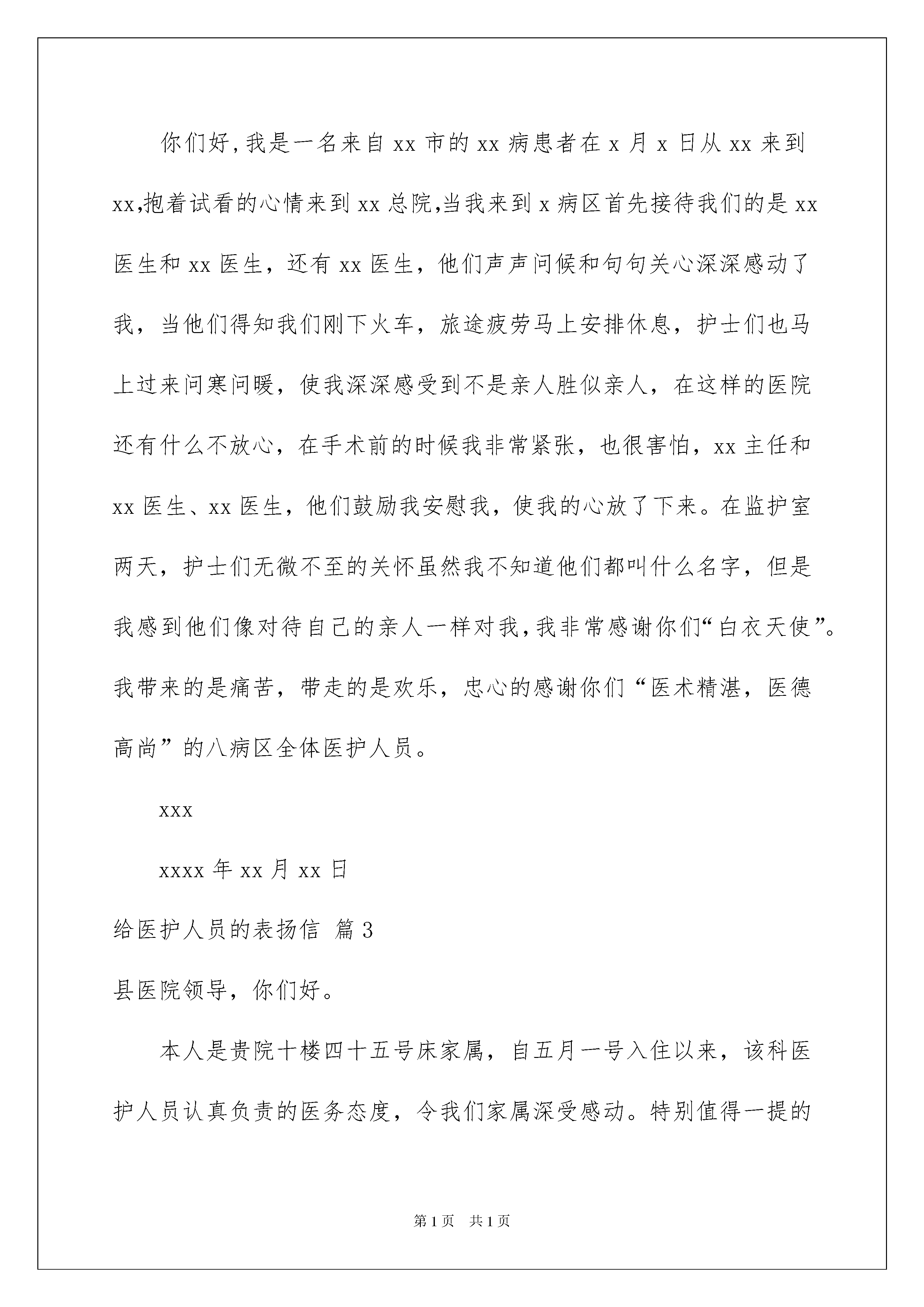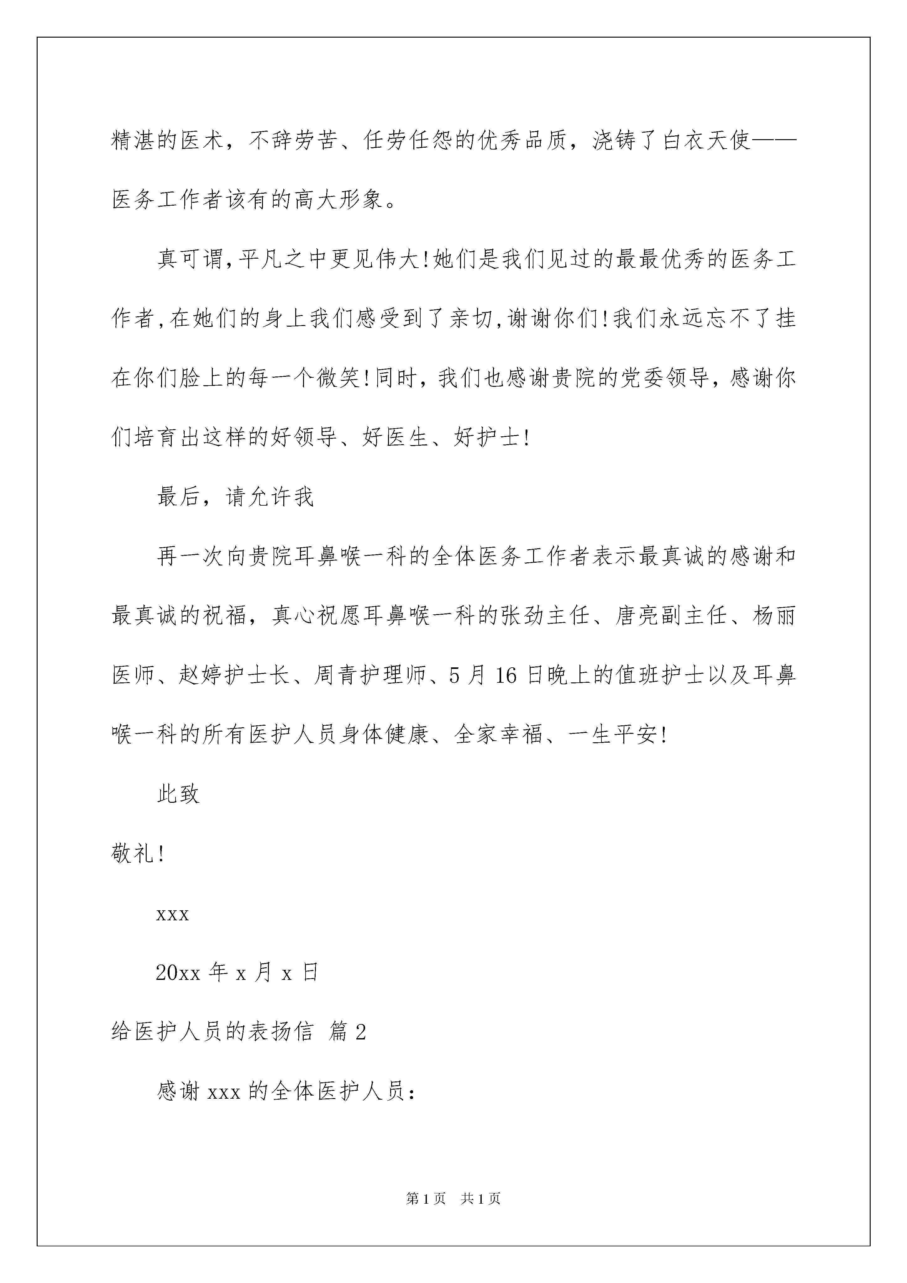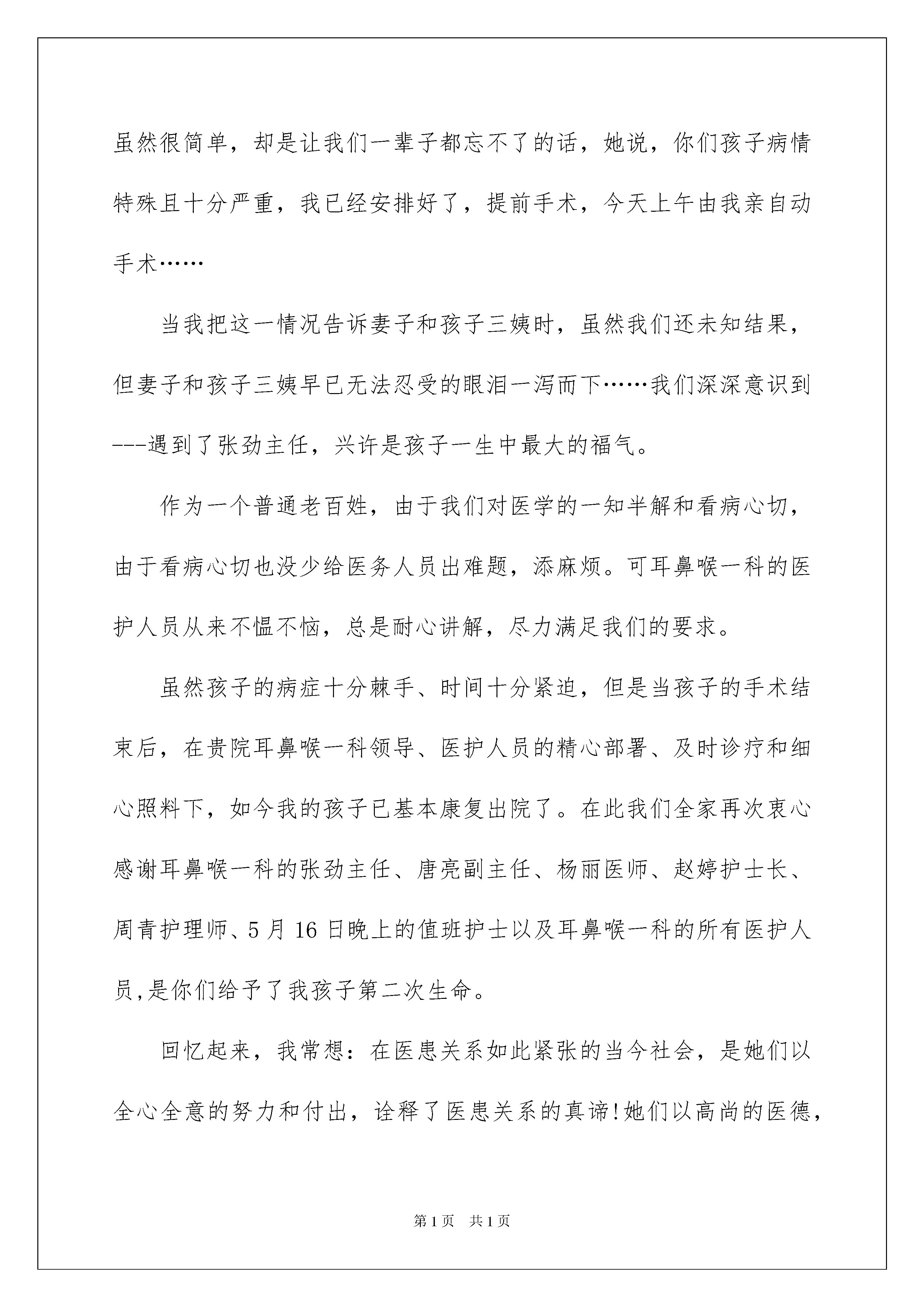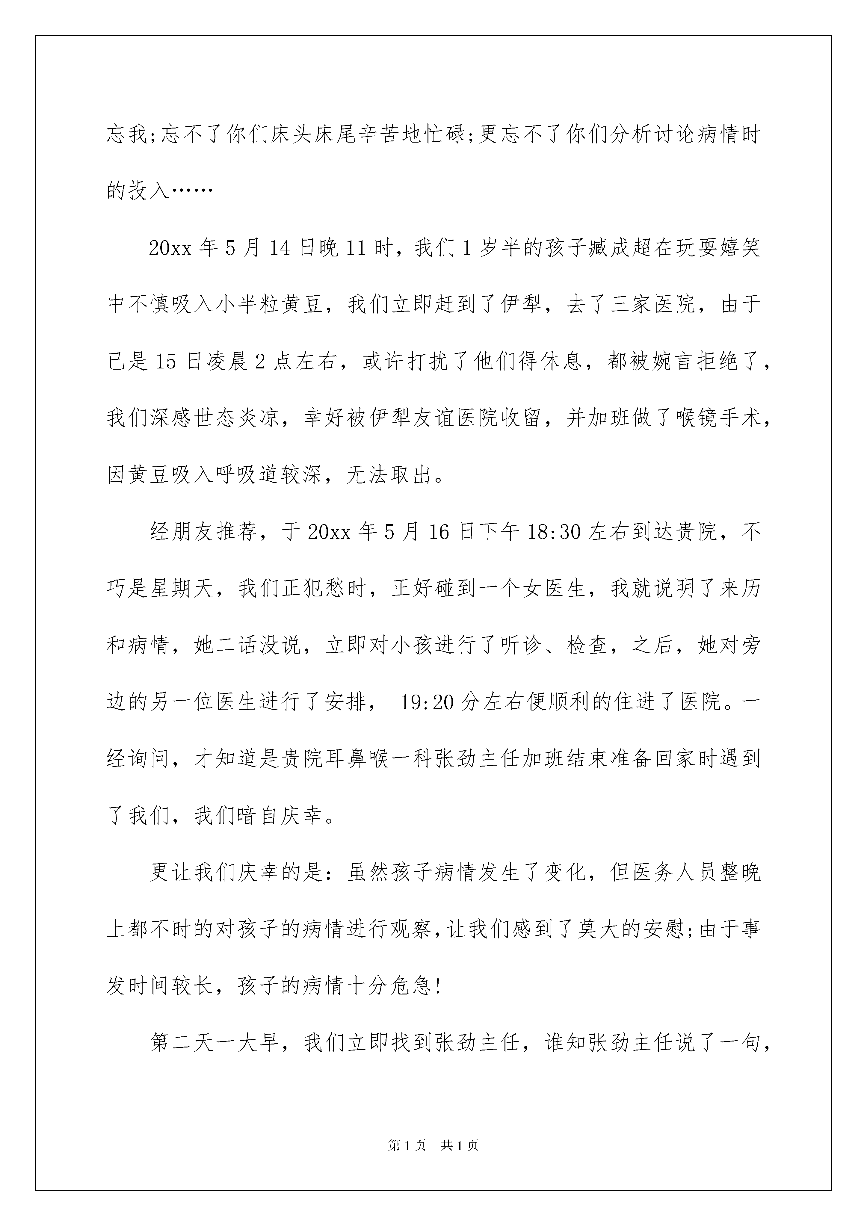 2022给医护人员的表扬信集锦7篇给医护人员的表扬信在当今社会生活中,表扬信应用范围愈来愈广泛,表扬信具有弘扬正气,褒奖善良的特点。你所见过的表扬信是什么样的呢?下面是我整理的给医护人员的表扬信7篇,希望对大家有所帮助。给医护人员的表扬信篇1尊敬的中共XX区人民医院党委领导:我叫臧爱栋,是贵院耳鼻喉一科一名普通病人臧成超的父亲,来自伊犁州直XX县。首先,请允许我代表我们全家向贵院党委领导和耳鼻喉一科领导及医务工作人员表示最衷心的感谢!感谢贵院党委培养、培育了耳鼻喉一科这班医务人员!感谢贵院耳鼻喉一科领导及医务人员给了我的孩子第二次生命!悬壶济世心,妙手回春艺。往来奔波苦,治病救人功。在我写这封感谢信时,不禁回忆起十几天前入院、住院的一场场、一幕幕,感激的心情抑不住地汹涌澎湃!忘不了你们废寝忘食、坚守重症患者的忘我;忘不了你们床头床尾辛苦地忙碌;更忘不了你们分析讨论病情时的投入……20xx年5月14日晚11时,我们1岁半的孩子臧成超在玩耍嬉笑中不慎吸入小半粒黄豆,我们立即赶到了伊犁,去了三家医院,由于已是15日凌晨2点左右,或许打扰了他们得休息,都被婉言拒绝了,我们深感世态炎凉,幸好被伊犁友谊医院收留,并加班做了喉镜手术,因黄豆吸入呼吸道较深,无法取出。经朋友推荐,于20xx年5月16日下午18:30左右到达贵院,不巧是星期天,我们正犯愁时,正好碰到一个女医生,我就说明了来历和病情,她二话没说,立即对小孩进行了听诊、检查,之后,她对旁边的另一位医生进行了安排,19:20分左右便顺利的住进了医院。一经询问,才知道是贵院耳鼻喉一科张劲主任加班结束准备回家时遇到了我们,我们暗自庆幸。更让我们庆幸的是:虽然孩子病情发生了变化,但医务人员整晚上都不时的对孩子的病情进行观察,让我们感到了莫大的安慰;由于事发时间较长,孩子的病情十分危急!第二天一大早,我们立即找到张劲主任,谁知张劲主任说了一句,虽然很简单,却是让我们一辈子都忘不了的话,她说,你们孩子病情特殊且十分严重,我已经安排好了,提前手术,今天上午由我亲自动手术……当我把这一情况告诉妻子和孩子三姨时,虽然我们还未知结果,但妻子和孩子三姨早已无法忍受的眼泪一泻而下……我们深深意识到---遇到了张劲主任,兴许是孩子一生中最大的福气。作为一个普通老百姓,由于我们对医学的一知半解和看病心切,由于看病心切也没少给医务人员出难题,添麻烦。可耳鼻喉一科的医护人员从来不愠不恼,总是耐心讲解,尽力满足我们的要求。虽然孩子的病症十分棘手、时间十分紧迫,但是当孩子的手术结束后,在贵院耳鼻喉一科领导、医护人员的精心部署、及时诊疗和细心照料下,如今我的孩子已基本康复出院了。在此我们全家再次衷心感谢耳鼻喉一科的张劲主任、唐亮副主任、杨丽医师、赵婷护士长、周青护理师、5月16日晚上的值班护士以及耳鼻喉一科的所有医护人员,是你们给予了我孩子第二次生命。回忆起来,我常想:在医患关系如此紧张的当今社会,是她们以全心全意的努力和付出,诠释了医患关系的真谛!她们以高尚的医德,精湛的医术,不辞劳苦、任劳任怨的优秀品质,浇铸了白衣天使——医务工作者该有的高大形象。真可谓,平凡之中更见伟大!她们是我们见过的最最优秀的医务工作者,在她们的身上我们感受到了亲切,谢谢你们!我们永远忘不了挂在你们脸上的每一个微笑!同时,我们也感谢贵院的党委领导,感谢你们培育出这样的好领导、好医生、好护士!最后,请允许我再一次向贵院耳鼻喉一科的全体医务工作者表示最真诚的感谢和最真诚的祝福,真心祝愿耳鼻喉一科的张劲主任、唐亮副主任、杨丽医师、赵婷护士长、周青护理师、5月16日晚上的值班护士以及耳鼻喉一科的所有医护人员身体健康、全家幸福、一生平安!此致敬礼!xxx20xx年x月x日给医护人员的表扬信篇2感谢xxx的全体医护人员:你们好,我是一名来自xx市的xx病患者在x月x日从xx来到xx,抱着试看的心情来到xx总院,当我来到x病区首先接待我们的是xx医生和xx医生,还有xx医生,他们声声问候和句句关心深深感动了我,当他们得知我们刚下火车,旅途疲劳马上安排休息,护士们也马上过来问寒问暖,使我深深感受到不是亲人胜似亲人,在这样的医院还有什么不放心,在手术前的时候我非常紧张,也很害怕,xx主任和xx医生、xx医生,他们鼓励我安慰我,使我的心放了下来。在监护室两天,护士们无微不至的关怀虽然我不知道他们都叫什么名字,但是我感到他们像对待自己的亲人一样对我,我非常感谢你们“白衣天使”。我带来的是痛苦,带走的是欢乐,忠心的感谢你们“医术精湛,医德高尚”的八病区全体医护人员。xxxxxxx年xx月xx日给医护人员的表扬信